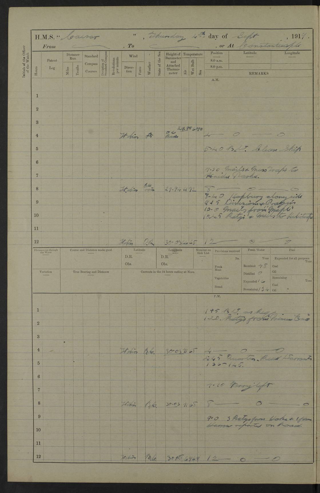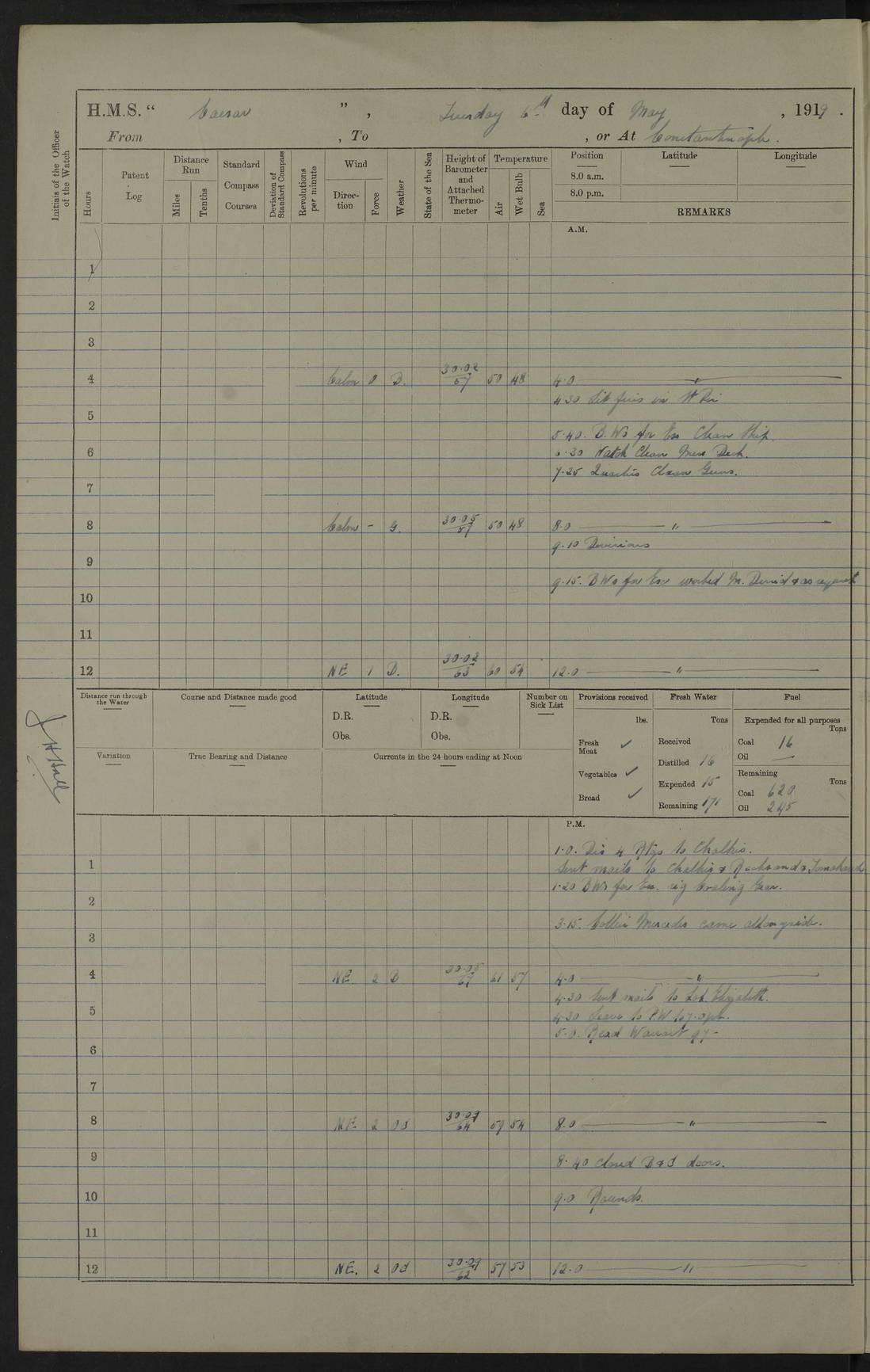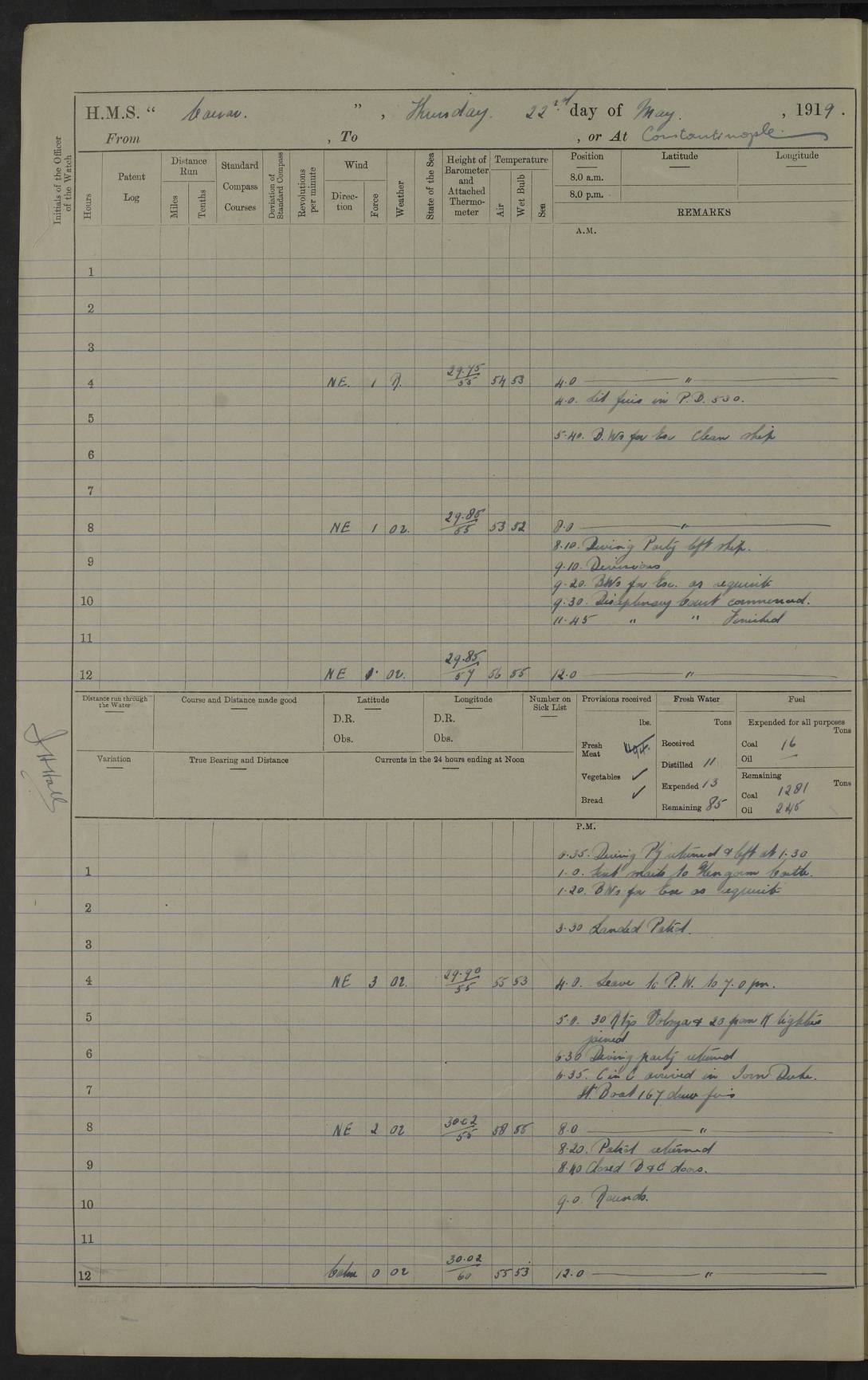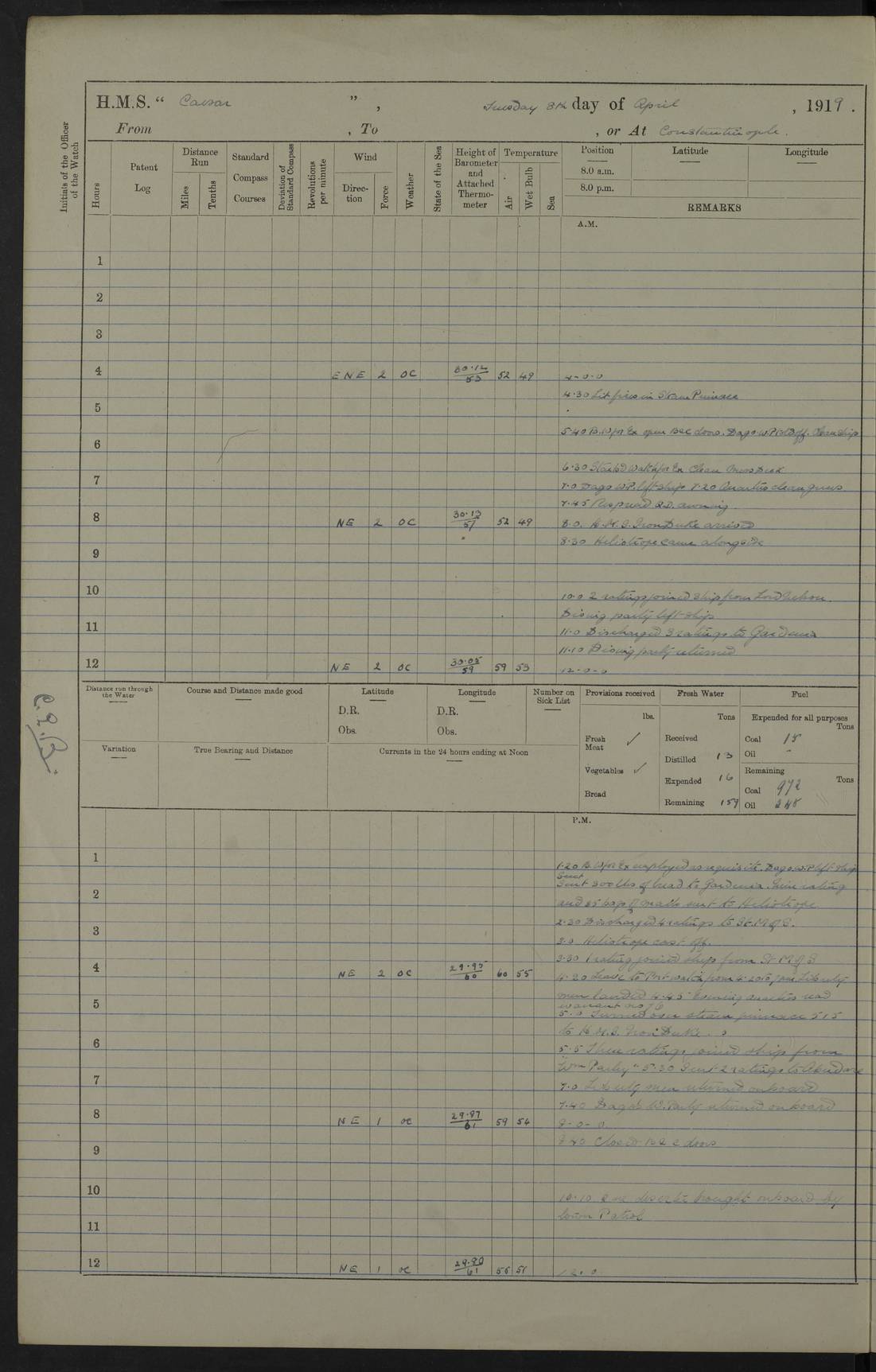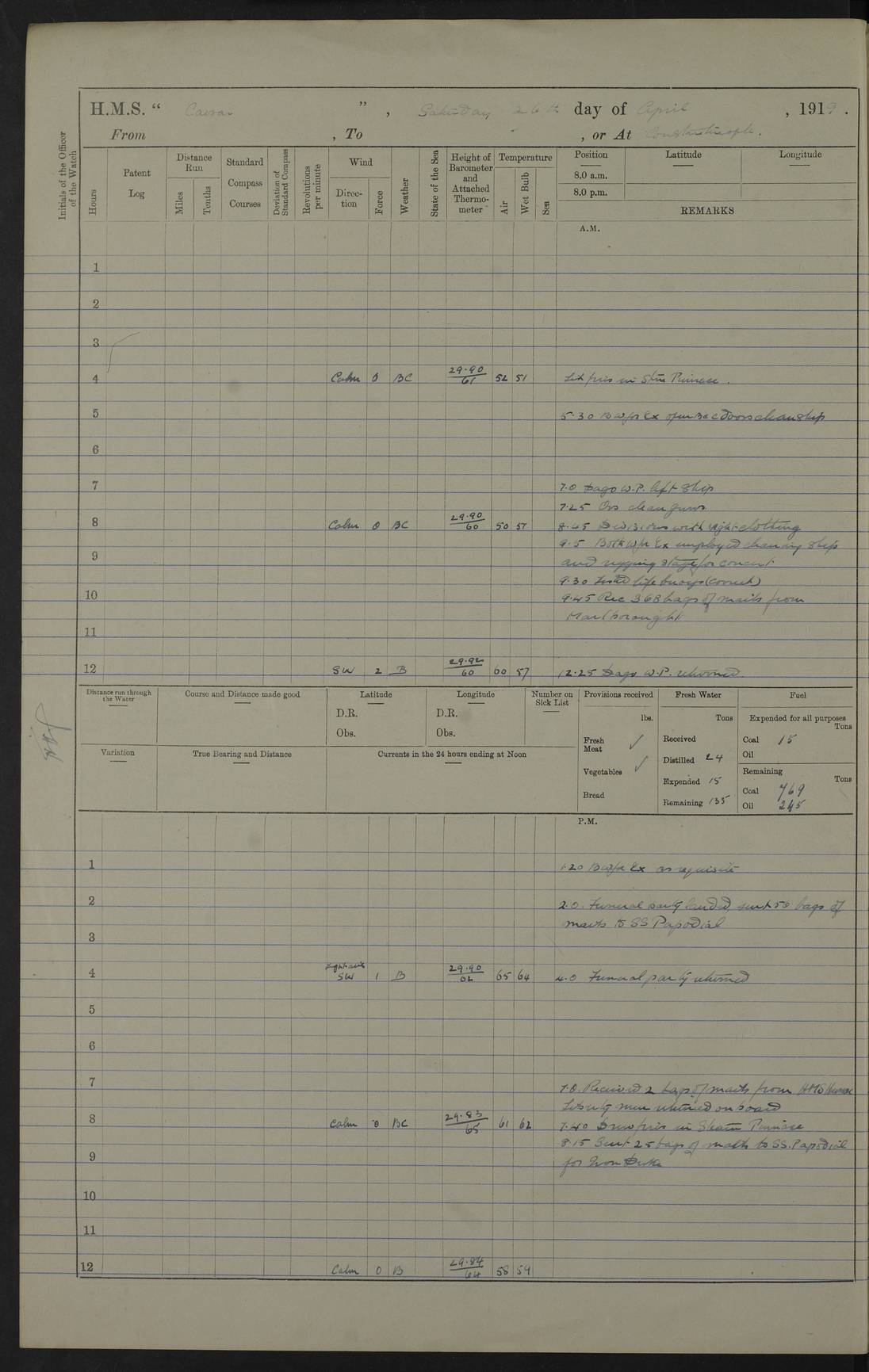 4edebb7b14d0450578000168: (https://s3.amazonaws.com:443/oldweather/ADM53-36589/0003_1.jpg) 1 November 1918 At Malta Lat 35.89, Long 14.52 [Somerset Wharf] 11.15am: Engineers Store Party returned on Board. 0.45pm: Paid Monthly Money. 1.0pm: Mr Goss, Gunner rejoined Ship from RN Hospital. 2.30pm: Gave Special leave to Port Watch untill 7.0am and Port Watch of Boys untill 6.0pm. Hands Made [sic] and Mend Clothes. 2.40pm: Landed liberty Men and Boys. 3.50pm: Provision Boat came alongside. 4.10pm: (4) Recovered Patients rejoined Ship from RN Hospital. 4.30pm: Landed liberty Men and Patrol. 6.0pm: Liberty Boys Returned on Board. 6.30pm: Canteen Party landed untill 10.0pm and Read Warrant No (24). 10.0pm: Canteen Party returned on Board. 11.50pm: Patrol returned on Board. [Provisions received: Fresh Meat 300 lbs, Vegetables 1000 lbs, Bread 450 lbs] 4edebb7c14d0450578000169: (https://s3.amazonaws.com:443/oldweather/ADM53-36589/0004_0.jpg) 2 November 1918 At Malta Lat 35.89, Long 14.52 [Hamilton Wharf] 7.15am: Shifted Berths from Somerset Wharf, to Hamilton Wharf. 8.0am: Tested life Buoys Correct. 8.45am: BW for x Told off Special Parties, Remainder of Hands employed as Requisite, and Landed Picket house Party. 9.10am: Held Court Martial on Board. 10.30am: Court Martial Finished. Noon: Picket House Party returned. 1.20pm: BW for x. Told off Special Parties. Remainder of Hands employed getting in Paymasters Stores and as Requisite. Lost overboard by accident Boat Hooks, Steel, Pattern (345), 2 in Number. 4.20pm: Hands to Fire Stations. 4.35pm: Read Warrant No 25 and gave Special leave to Starboard Watch untill 7.0am. 5.0pm: Landed liberty Men and Victualling Yard Lighter left Ship. 6.30pm: Canteen Party landed untill 10.0pm. [Provisions received: Fresh Meat 260 lbs, Bread 900 lbs] 4edebb7c14d045057800016a: (https://s3.amazonaws.com:443/oldweather/ADM53-36589/0004_1.jpg) 3 November 1918 At Malta Lat 35.89, Long 14.52 [Hamilton Wharf] 9.0am: Landed Church Parties, Wesleyans (14), Presbyterians (10). 9.30am: Divisions. 9.50am: Landed Roman Catholics (15). 10.10am: Discharged (5) Ratings to RN Hospital. 11.35am: All Church Parties returned on Board. 1.0pm: Gave Special leave to Port Watch untill 7.0am and Both Watches of Boys untill 5.30pm. 1.15pm: Landed liberty Men and Boys. 5.30pm: Liberty Boys returned on Board. 6.30pm: Canteen Party landed untill 10.0pm. 8.40pm: Closed B and C Doors. 10.0pm: Canteen Party returned on Board. [Number on sick list: 5] [Provisions received: Fresh Meat 280 lbs] 4edebb7c14d045057800016b: (https://s3.amazonaws.com:443/oldweather/ADM53-36589/0005_0.jpg) 4 November 1918 At Malta Lat 35.89, Long 14.52 [Hamilton Wharf] 6.50am: BW for x Told off Special Parties, remainder of Hands employed as Requisite. 7.0am: Liberty men returned on Board. 8.5am: Provision lighter came alongside. 8.10am: BW for x, Told off Special Parties, remainder of Hands employed Provisioning Ship and as requisite. 8.45am: Landed (1) Carpenter rating for Examination. 3.45pm: (2) Recovered Patients joined Ship from RN Hospital. 4.10pm: Received 8 Bags of Mails from Egmont, and Gave Special leave to Starboard Watch till 7.0am. 5.0pm: Landed Liberty Men and Patrol. 6.0pm: Hands employed getting in and stowing away Provisions. Midnight: Patrol returned on Board. [Weather fine, noon temperature 74F] 4edebb7c14d045057800016c: (https://s3.amazonaws.com:443/oldweather/ADM53-36589/0005_1.jpg) 5 November 1918 At Malta Lat 35.89, Long 14.52 [Hamilton Wharf] 6.45am: BW for x. Told off Special Parties. Remainder of Hands employed getting in and stowing away Provisions. 8.30am: Landed Hospital Party and Picket House Party. 11.0am: Landed (35) Rifles to Naval Ordinance for exchange. Noon: Picket House Party returned. 1.20pm: Landed (2) Ratings for Dental Treatment. 2.25pm: (35) Exchanged Rifles came on Board. 3.40pm: (2) Recovered Patients rejoined Ship from RN Hospital and disinfected Bedding. 4.0pm: Gave Special leave to Port Watch untill 7.0am. Starboard Watch employed stowing Provisions. 4.30pm: Landed Liberty men. Starboard Watch employed stowing away Provisions and Read Warrant No (26). [Provisions received: Fresh Meat 530 lbs, Bread 1000 lbs] 4edebb7c14d045057800016d: (https://s3.amazonaws.com:443/oldweather/ADM53-36589/0006_0.jpg) 6 November 1918 At Malta Lat 35.89, Long 14.52 [Hamilton Wharf] 6.50am: BW for x. Told off Special Parties, Remainder of Port Watch stowing Provisions, Starboard Watch drawing Quarter Deck Awning. 9.0am: Hands employed Provisioning Ship. 4.0pm: Gave Special leave to Starboard Watch untill 7.0am. 4.30pm: Landed liberty Men. Port Watch employed stowing away Provisions. 6.30pm: Canteen Party landed until 10.0pm. 10.0pm: Canteen Party returned on Board. [Number on sick list: 5] [Provisions received: Fresh Meat 250 lbs, Vegetables 1000 lbs, Bread 450 lbs] [Fuel Remaining: Coal 244 tons, Oil 332 tons] 4edebb7c14d045057800016e: (https://s3.amazonaws.com:443/oldweather/ADM53-36589/0006_1.jpg) 7 November 1918 At Malta Lat 35.89, Long 14.52 [No 4 Buoy] 6.30am: BW for x. Told off Special Parties. Remainder of Hands employed prepairing [preparing] Ship to Shift Berths, from Hamilton Wharf to No 4 Buoy. 7.0am: Liberty men returned on Board. 8.50am: Secured Ship to No 4 Buoy and Coal Lighters came alongside. 9.10am: Commenced Coaling Native labour. Hands employed Drawing Stores and as Requisite. 11.50am: Dockyard Parties returned. 1.40pm: BW for x Told off Special Parties, remainder of Hands employed as Requisite. 4.30pm: Gave Special leave to Port Watch untill 7.0am. 4.45pm: Landed liberty men and Patrol and Read Warrant No (27). 7.30pm: Completed Coaling (1481) Tons. 8.40pm: Watch employed sweeping down. 11.50pm: Patrol returned on Board. [Number on sick list: 6] [Provisions received: Fresh Meat 280 lbs, Bread 300 lbs] [Fuel Remaining: Coal 1716 tons, Oil 332 tons] 4edebb7c14d045057800016f: (https://s3.amazonaws.com:443/oldweather/ADM53-36589/0007_0.jpg) 8 November 1918 At Malta Lat 35.89, Long 