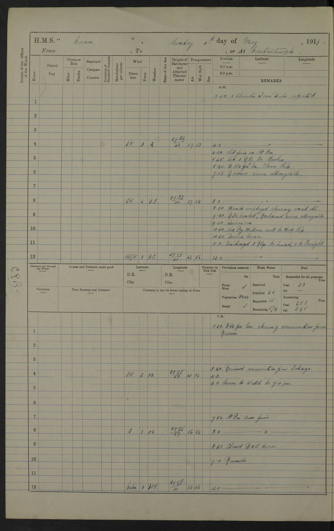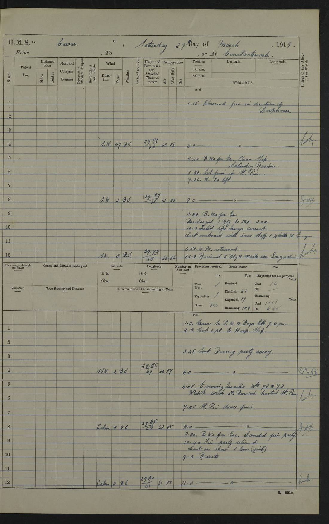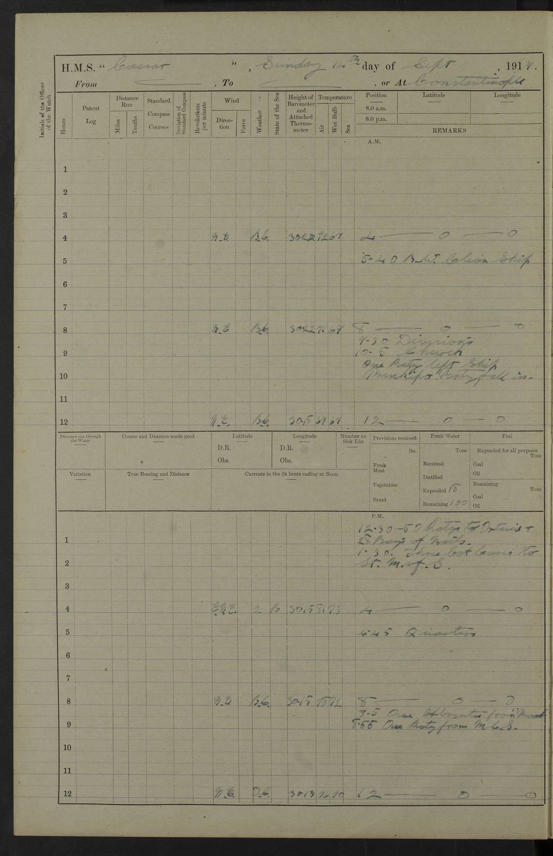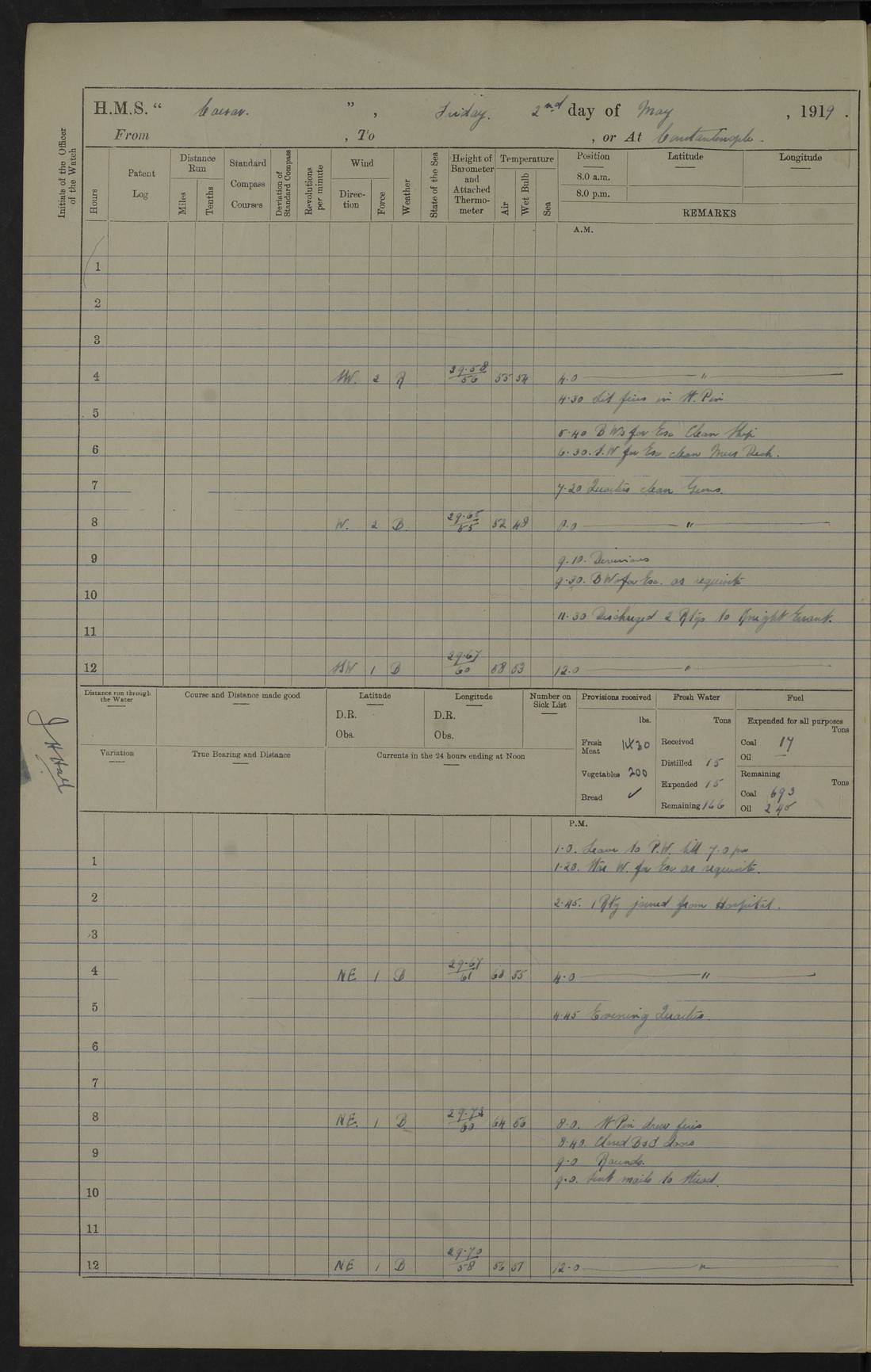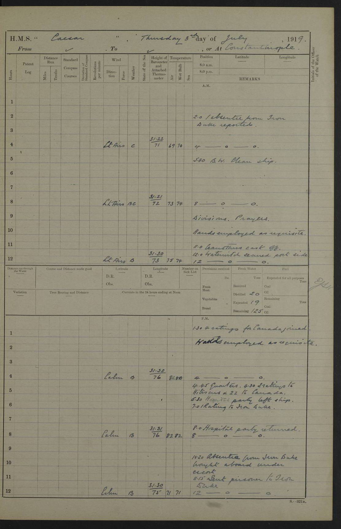 4edebb7b14d0450578000168: (https://s3.amazonaws.com:443/oldweather/ADM53-36589/0003_1.jpg) 1 November 1918 At Malta Lat 35.89, Long 14.52 [Somerset Wharf] 11.15am: Engineers Store Party returned on Board. 0.45pm: Paid Monthly Money. 1.0pm: Mr Goss, Gunner rejoined Ship from RN Hospital. 2.30pm: Gave Special leave to Port Watch untill 7.0am and Port Watch of Boys untill 6.0pm. Hands Made [sic] and Mend Clothes. 2.40pm: Landed liberty Men and Boys. 3.50pm: Provision Boat came alongside. 4.10pm: (4) Recovered Patients rejoined Ship from RN Hospital. 4.30pm: Landed liberty Men and Patrol. 6.0pm: Liberty Boys Returned on Board. 6.30pm: Canteen Party landed untill 10.0pm and Read Warrant No (24). 10.0pm: Canteen Party returned on Board. 11.50pm: Patrol returned on Board. [Provisions received: Fresh Meat 300 lbs, Vegetables 1000 lbs, Bread 450 lbs] 4edebb7c14d0450578000169: (https://s3.amazonaws.com:443/oldweather/ADM53-36589/0004_0.jpg) 2 November 1918 At Malta Lat 35.89, Long 14.52 [Hamilton Wharf] 7.15am: Shifted Berths from Somerset Wharf, to Hamilton Wharf. 8.0am: Tested life Buoys Correct. 8.45am: BW for x Told off Special Parties, Remainder of Hands employed as Requisite, and Landed Picket house Party. 9.10am: Held Court Martial on Board. 10.30am: Court Martial Finished. Noon: Picket House Party returned. 1.20pm: BW for x. Told off Special Parties. Remainder of Hands employed getting in Paymasters Stores and as Requisite. Lost overboard by accident Boat Hooks, Steel, Pattern (345), 2 in Number. 4.20pm: Hands to Fire Stations. 4.35pm: Read Warrant No 25 and gave Special leave to Starboard Watch untill 7.0am. 5.0pm: Landed liberty Men and Victualling Yard Lighter left Ship. 6.30pm: Canteen Party landed untill 10.0pm. [Provisions received: Fresh Meat 260 lbs, Bread 900 lbs] 4edebb7c14d045057800016a: (https://s3.amazonaws.com:443/oldweather/ADM53-36589/0004_1.jpg) 3 November 1918 At Malta Lat 35.89, Long 14.52 [Hamilton Wharf] 9.0am: Landed Church Parties, Wesleyans (14), Presbyterians (10). 9.30am: Divisions. 9.50am: Landed Roman Catholics (15). 10.10am: Discharged (5) Ratings to RN Hospital. 11.35am: All Church Parties returned on Board. 1.0pm: Gave Special leave to Port Watch untill 7.0am and Both Watches of Boys untill 5.30pm. 1.15pm: Landed liberty Men and Boys. 5.30pm: Liberty Boys returned on Board. 6.30pm: Canteen Party landed untill 10.0pm. 8.40pm: Closed B and C Doors. 10.0pm: Canteen Party returned on Board. [Number on sick list: 5] [Provisions received: Fresh Meat 280 lbs] 4edebb7c14d045057800016b: (https://s3.amazonaws.com:443/oldweather/ADM53-36589/0005_0.jpg) 4 November 1918 At Malta Lat 35.89, Long 14.52 [Hamilton Wharf] 6.50am: BW for x Told off Special Parties, remainder of Hands employed as Requisite. 7.0am: Liberty men returned on Board. 8.5am: Provision lighter came alongside. 8.10am: BW for x, Told off Special Parties, remainder of Hands employed Provisioning Ship and as requisite. 8.45am: Landed (1) Carpenter rating for Examination. 3.45pm: (2) Recovered Patients joined Ship from RN Hospital. 4.10pm: Received 8 Bags of Mails from Egmont, and Gave Special leave to Starboard Watch till 7.0am. 5.0pm: Landed Liberty Men and Patrol. 6.0pm: Hands employed getting in and stowing away Provisions. Midnight: Patrol returned on Board. [Weather fine, noon temperature 74F] 4edebb7c14d045057800016c: (https://s3.amazonaws.com:443/oldweather/ADM53-36589/0005_1.jpg) 5 November 1918 At Malta Lat 35.89, Long 14.52 [Hamilton Wharf] 6.45am: BW for x. Told off Special Parties. Remainder of Hands employed getting in and stowing away Provisions. 8.30am: Landed Hospital Party and Picket House Party. 11.0am: Landed (35) Rifles to Naval Ordinance for exchange. Noon: Picket House Party returned. 1.20pm: Landed (2) Ratings for Dental Treatment. 2.25pm: (35) Exchanged Rifles came on Board. 3.40pm: (2) Recovered Patients rejoined Ship from RN Hospital and disinfected Bedding. 4.0pm: Gave Special leave to Port Watch untill 7.0am. Starboard Watch employed stowing Provisions. 4.30pm: Landed Liberty men. Starboard Watch employed stowing away Provisions and Read Warrant No (26). [Provisions received: Fresh Meat 530 lbs, Bread 1000 lbs] 4edebb7c14d045057800016d: (https://s3.amazonaws.com:443/oldweather/ADM53-36589/0006_0.jpg) 6 November 1918 At Malta Lat 35.89, Long 14.52 [Hamilton Wharf] 6.50am: BW for x. Told off Special Parties, Remainder of Port Watch stowing Provisions, Starboard Watch drawing Quarter Deck Awning. 9.0am: Hands employed Provisioning Ship. 4.0pm: Gave Special leave to Starboard Watch untill 7.0am. 4.30pm: Landed liberty Men. Port Watch employed stowing away Provisions. 6.30pm: Canteen Party landed until 10.0pm. 10.0pm: Canteen Party returned on Board. [Number on sick list: 5] [Provisions received: Fresh Meat 250 lbs, Vegetables 1000 lbs, Bread 450 lbs] [Fuel Remaining: Coal 244 tons, Oil 332 tons] 4edebb7c14d045057800016e: (https://s3.amazonaws.com:443/oldweather/ADM53-36589/0006_1.jpg) 7 November 1918 At Malta Lat 35.89, Long 14.52 [No 4 Buoy] 6.30am: BW for x. Told off Special Parties. Remainder of Hands employed prepairing [preparing] Ship to Shift Berths, from Hamilton Wharf to No 4 Buoy. 7.0am: Liberty men returned on Board. 8.50am: Secured Ship to No 4 Buoy and Coal Lighters came alongside. 9.10am: Commenced Coaling Native labour. Hands employed Drawing Stores and as Requisite. 11.50am: Dockyard Parties returned. 1.40pm: BW for x Told off Special Parties, remainder of Hands employed as Requisite. 4.30pm: Gave Special leave to Port Watch untill 7.0am. 4.45pm: Landed liberty men and Patrol and Read Warrant No (27). 7.30pm: Completed Coaling (1481) Tons. 8.40pm: Watch employed sweeping down. 11.50pm: Patrol returned on Board. [Number on sick list: 6] [Provisions received: Fresh Meat 280 lbs, Bread 300 lbs] [Fuel Remaining: Coal 1716 tons, Oil 332 tons] 4edebb7c14d045057800016f: (https://s3.amazonaws.com:443/oldweather/ADM53-36589/0007_0.jpg) 8 November 1918 At Malta Lat 35.89, Long 