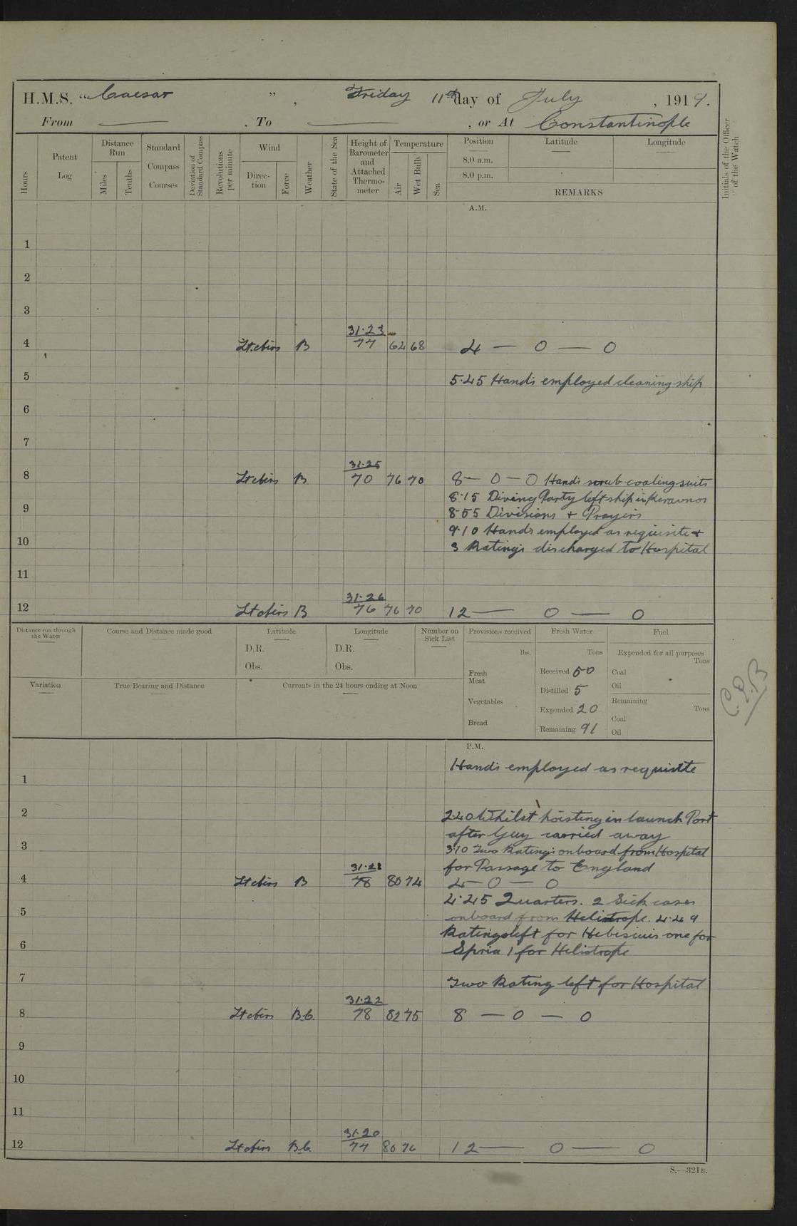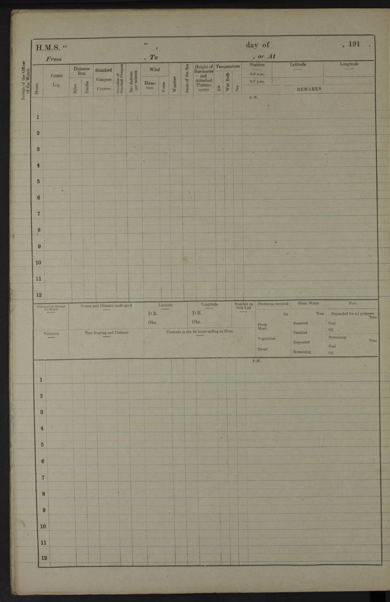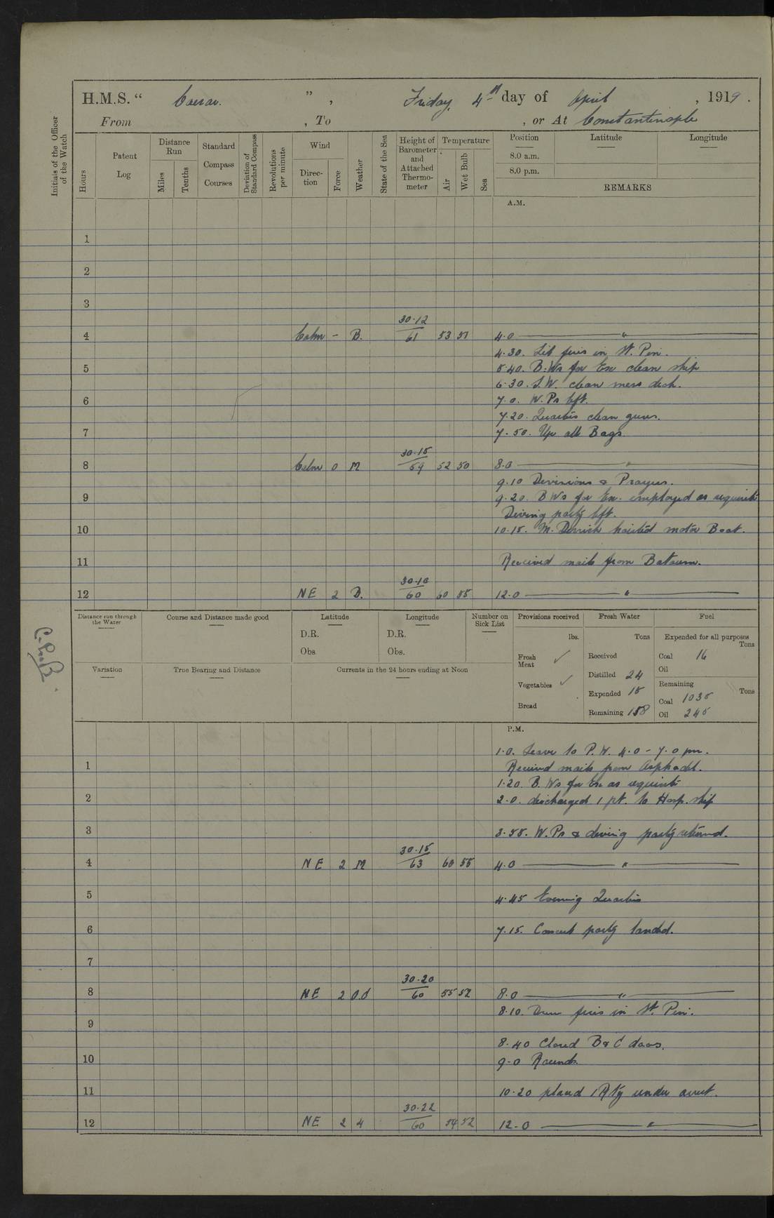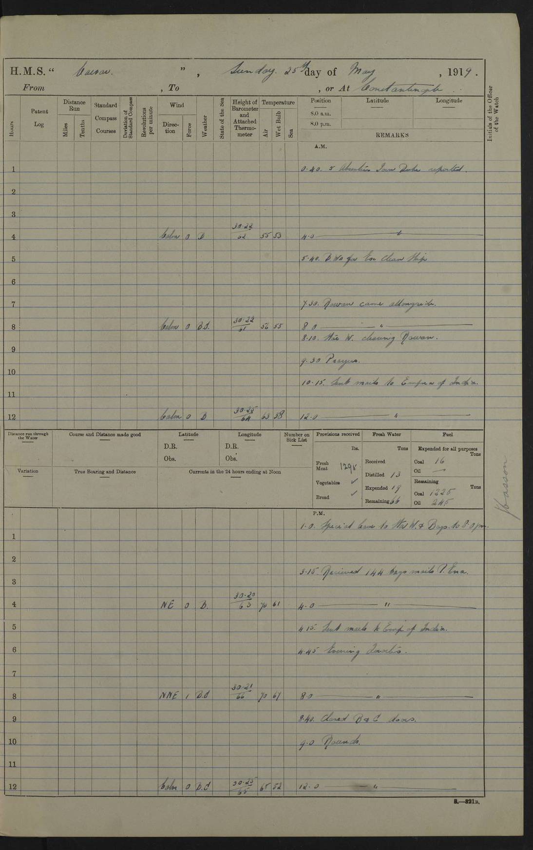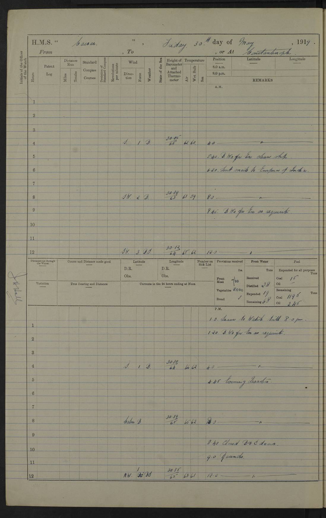 4edebb7b14d0450578000168: (https://s3.amazonaws.com:443/oldweather/ADM53-36589/0003_1.jpg) 1 November 1918 At Malta Lat 35.89, Long 14.52 [Somerset Wharf] 11.15am: Engineers Store Party returned on Board. 0.45pm: Paid Monthly Money. 1.0pm: Mr Goss, Gunner rejoined Ship from RN Hospital. 2.30pm: Gave Special leave to Port Watch untill 7.0am and Port Watch of Boys untill 6.0pm. Hands Made [sic] and Mend Clothes. 2.40pm: Landed liberty Men and Boys. 3.50pm: Provision Boat came alongside. 4.10pm: (4) Recovered Patients rejoined Ship from RN Hospital. 4.30pm: Landed liberty Men and Patrol. 6.0pm: Liberty Boys Returned on Board. 6.30pm: Canteen Party landed untill 10.0pm and Read Warrant No (24). 10.0pm: Canteen Party returned on Board. 11.50pm: Patrol returned on Board. [Provisions received: Fresh Meat 300 lbs, Vegetables 1000 lbs, Bread 450 lbs] 4edebb7c14d0450578000169: (https://s3.amazonaws.com:443/oldweather/ADM53-36589/0004_0.jpg) 2 November 1918 At Malta Lat 35.89, Long 14.52 [Hamilton Wharf] 7.15am: Shifted Berths from Somerset Wharf, to Hamilton Wharf. 8.0am: Tested life Buoys Correct. 8.45am: BW for x Told off Special Parties, Remainder of Hands employed as Requisite, and Landed Picket house Party. 9.10am: Held Court Martial on Board. 10.30am: Court Martial Finished. Noon: Picket House Party returned. 1.20pm: BW for x. Told off Special Parties. Remainder of Hands employed getting in Paymasters Stores and as Requisite. Lost overboard by accident Boat Hooks, Steel, Pattern (345), 2 in Number. 4.20pm: Hands to Fire Stations. 4.35pm: Read Warrant No 25 and gave Special leave to Starboard Watch untill 7.0am. 5.0pm: Landed liberty Men and Victualling Yard Lighter left Ship. 6.30pm: Canteen Party landed untill 10.0pm. [Provisions received: Fresh Meat 260 lbs, Bread 900 lbs] 4edebb7c14d045057800016a: (https://s3.amazonaws.com:443/oldweather/ADM53-36589/0004_1.jpg) 3 November 1918 At Malta Lat 35.89, Long 14.52 [Hamilton Wharf] 9.0am: Landed Church Parties, Wesleyans (14), Presbyterians (10). 9.30am: Divisions. 9.50am: Landed Roman Catholics (15). 10.10am: Discharged (5) Ratings to RN Hospital. 11.35am: All Church Parties returned on Board. 1.0pm: Gave Special leave to Port Watch untill 7.0am and Both Watches of Boys untill 5.30pm. 1.15pm: Landed liberty Men and Boys. 5.30pm: Liberty Boys returned on Board. 6.30pm: Canteen Party landed untill 10.0pm. 8.40pm: Closed B and C Doors. 10.0pm: Canteen Party returned on Board. [Number on sick list: 5] [Provisions received: Fresh Meat 280 lbs] 4edebb7c14d045057800016b: (https://s3.amazonaws.com:443/oldweather/ADM53-36589/0005_0.jpg) 4 November 1918 At Malta Lat 35.89, Long 14.52 [Hamilton Wharf] 6.50am: BW for x Told off Special Parties, remainder of Hands employed as Requisite. 7.0am: Liberty men returned on Board. 8.5am: Provision lighter came alongside. 8.10am: BW for x, Told off Special Parties, remainder of Hands employed Provisioning Ship and as requisite. 8.45am: Landed (1) Carpenter rating for Examination. 3.45pm: (2) Recovered Patients joined Ship from RN Hospital. 4.10pm: Received 8 Bags of Mails from Egmont, and Gave Special leave to Starboard Watch till 7.0am. 5.0pm: Landed Liberty Men and Patrol. 6.0pm: Hands employed getting in and stowing away Provisions. Midnight: Patrol returned on Board. [Weather fine, noon temperature 74F] 4edebb7c14d045057800016c: (https://s3.amazonaws.com:443/oldweather/ADM53-36589/0005_1.jpg) 5 November 1918 At Malta Lat 35.89, Long 14.52 [Hamilton Wharf] 6.45am: BW for x. Told off Special Parties. Remainder of Hands employed getting in and stowing away Provisions. 8.30am: Landed Hospital Party and Picket House Party. 11.0am: Landed (35) Rifles to Naval Ordinance for exchange. Noon: Picket House Party returned. 1.20pm: Landed (2) Ratings for Dental Treatment. 2.25pm: (35) Exchanged Rifles came on Board. 3.40pm: (2) Recovered Patients rejoined Ship from RN Hospital and disinfected Bedding. 4.0pm: Gave Special leave to Port Watch untill 7.0am. Starboard Watch employed stowing Provisions. 4.30pm: Landed Liberty men. Starboard Watch employed stowing away Provisions and Read Warrant No (26). [Provisions received: Fresh Meat 530 lbs, Bread 1000 lbs] 4edebb7c14d045057800016d: (https://s3.amazonaws.com:443/oldweather/ADM53-36589/0006_0.jpg) 6 November 1918 At Malta Lat 35.89, Long 14.52 [Hamilton Wharf] 6.50am: BW for x. Told off Special Parties, Remainder of Port Watch stowing Provisions, Starboard Watch drawing Quarter Deck Awning. 9.0am: Hands employed Provisioning Ship. 4.0pm: Gave Special leave to Starboard Watch untill 7.0am. 4.30pm: Landed liberty Men. Port Watch employed stowing away Provisions. 6.30pm: Canteen Party landed until 10.0pm. 10.0pm: Canteen Party returned on Board. [Number on sick list: 5] [Provisions received: Fresh Meat 250 lbs, Vegetables 1000 lbs, Bread 450 lbs] [Fuel Remaining: Coal 244 tons, Oil 332 tons] 4edebb7c14d045057800016e: (https://s3.amazonaws.com:443/oldweather/ADM53-36589/0006_1.jpg) 7 November 1918 At Malta Lat 35.89, Long 14.52 [No 4 Buoy] 6.30am: BW for x. Told off Special Parties. Remainder of Hands employed prepairing [preparing] Ship to Shift Berths, from Hamilton Wharf to No 4 Buoy. 7.0am: Liberty men returned on Board. 8.50am: Secured Ship to No 4 Buoy and Coal Lighters came alongside. 9.10am: Commenced Coaling Native labour. Hands employed Drawing Stores and as Requisite. 11.50am: Dockyard Parties returned. 1.40pm: BW for x Told off Special Parties, remainder of Hands employed as Requisite. 4.30pm: Gave Special leave to Port Watch untill 7.0am. 4.45pm: Landed liberty men and Patrol and Read Warrant No (27). 7.30pm: Completed Coaling (1481) Tons. 8.40pm: Watch employed sweeping down. 11.50pm: Patrol returned on Board. [Number on sick list: 6] [Provisions received: Fresh Meat 280 lbs, Bread 300 lbs] [Fuel Remaining: Coal 1716 tons, Oil 332 tons] 4edebb7c14d045057800016f: (https://s3.amazonaws.com:443/oldweather/ADM53-36589/0007_0.jpg) 8 November 1918 At Malta Lat 35.89, Long 