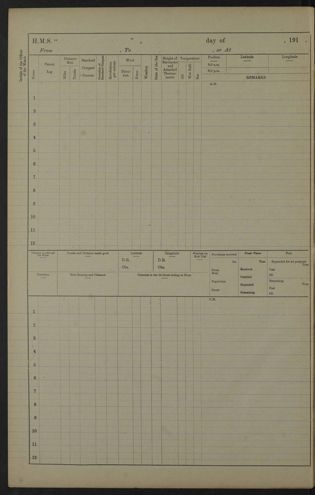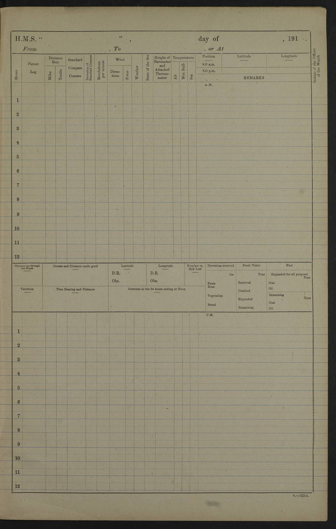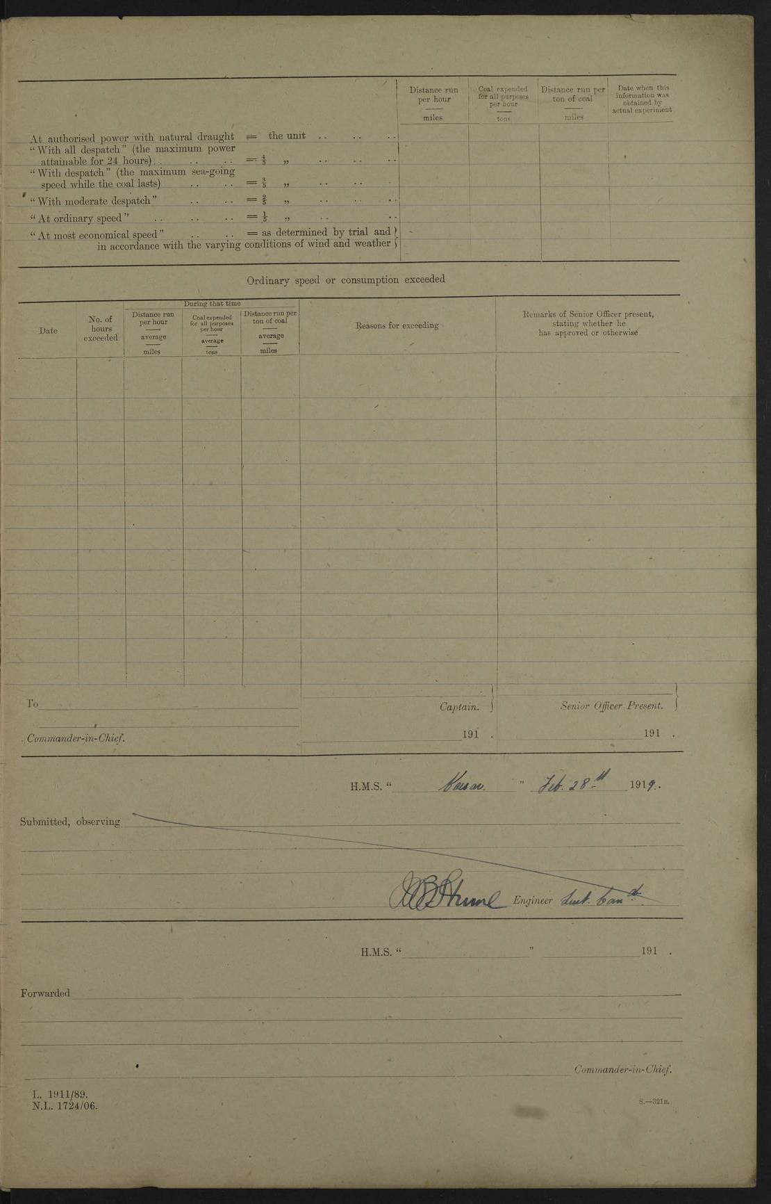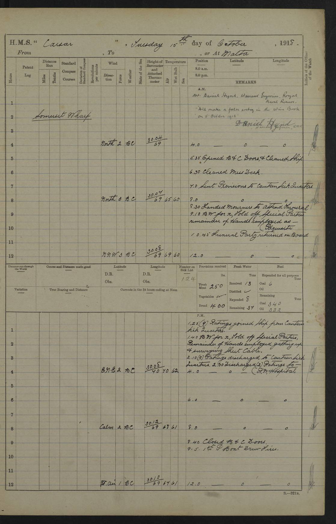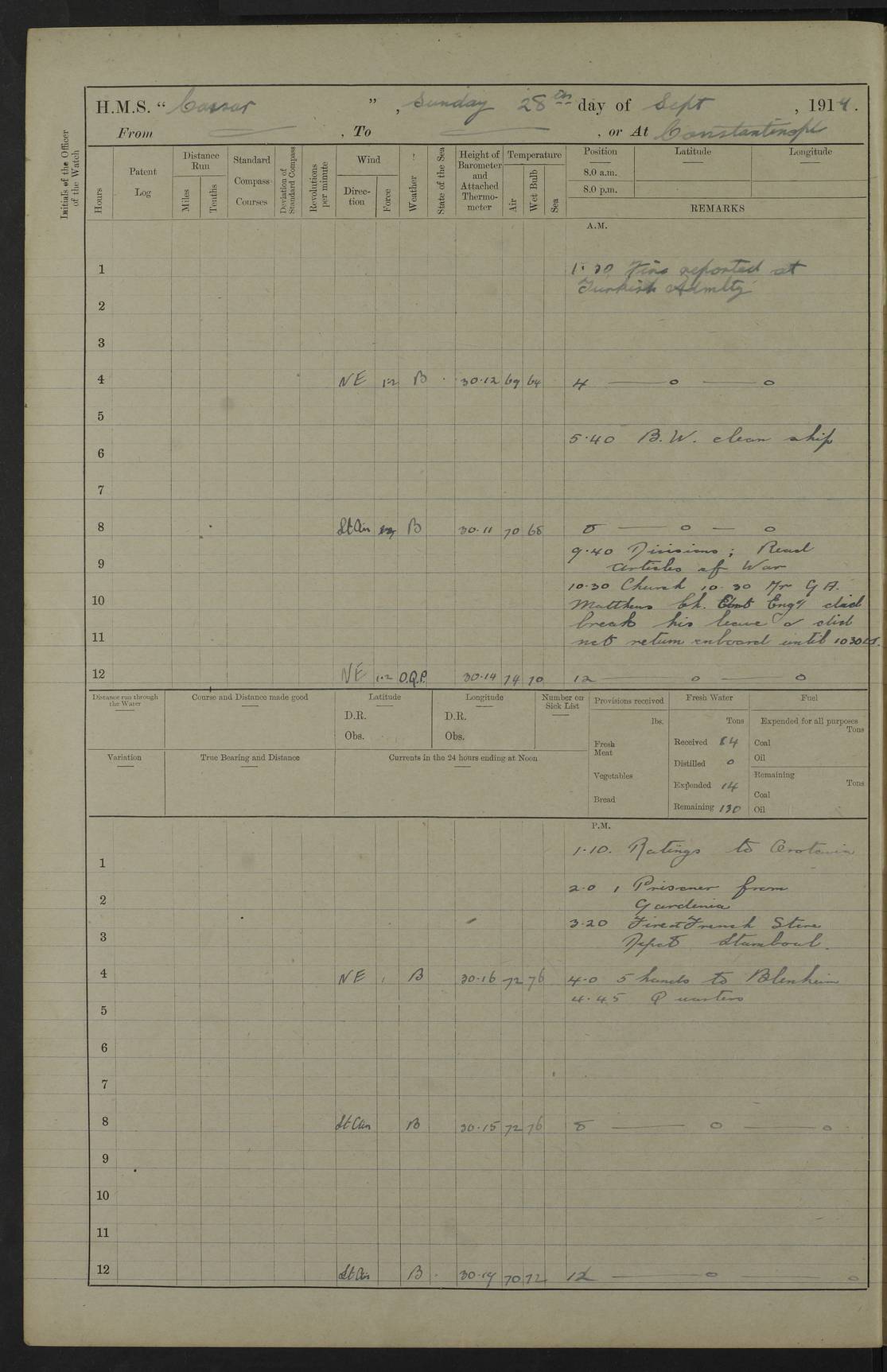 4edebb7b14d0450578000168: (https://s3.amazonaws.com:443/oldweather/ADM53-36589/0003_1.jpg) 1 November 1918 At Malta Lat 35.89, Long 14.52 [Somerset Wharf] 11.15am: Engineers Store Party returned on Board. 0.45pm: Paid Monthly Money. 1.0pm: Mr Goss, Gunner rejoined Ship from RN Hospital. 2.30pm: Gave Special leave to Port Watch untill 7.0am and Port Watch of Boys untill 6.0pm. Hands Made [sic] and Mend Clothes. 2.40pm: Landed liberty Men and Boys. 3.50pm: Provision Boat came alongside. 4.10pm: (4) Recovered Patients rejoined Ship from RN Hospital. 4.30pm: Landed liberty Men and Patrol. 6.0pm: Liberty Boys Returned on Board. 6.30pm: Canteen Party landed untill 10.0pm and Read Warrant No (24). 10.0pm: Canteen Party returned on Board. 11.50pm: Patrol returned on Board. [Provisions received: Fresh Meat 300 lbs, Vegetables 1000 lbs, Bread 450 lbs] 4edebb7c14d0450578000169: (https://s3.amazonaws.com:443/oldweather/ADM53-36589/0004_0.jpg) 2 November 1918 At Malta Lat 35.89, Long 14.52 [Hamilton Wharf] 7.15am: Shifted Berths from Somerset Wharf, to Hamilton Wharf. 8.0am: Tested life Buoys Correct. 8.45am: BW for x Told off Special Parties, Remainder of Hands employed as Requisite, and Landed Picket house Party. 9.10am: Held Court Martial on Board. 10.30am: Court Martial Finished. Noon: Picket House Party returned. 1.20pm: BW for x. Told off Special Parties. Remainder of Hands employed getting in Paymasters Stores and as Requisite. Lost overboard by accident Boat Hooks, Steel, Pattern (345), 2 in Number. 4.20pm: Hands to Fire Stations. 4.35pm: Read Warrant No 25 and gave Special leave to Starboard Watch untill 7.0am. 5.0pm: Landed liberty Men and Victualling Yard Lighter left Ship. 6.30pm: Canteen Party landed untill 10.0pm. [Provisions received: Fresh Meat 260 lbs, Bread 900 lbs] 4edebb7c14d045057800016a: (https://s3.amazonaws.com:443/oldweather/ADM53-36589/0004_1.jpg) 3 November 1918 At Malta Lat 35.89, Long 14.52 [Hamilton Wharf] 9.0am: Landed Church Parties, Wesleyans (14), Presbyterians (10). 9.30am: Divisions. 9.50am: Landed Roman Catholics (15). 10.10am: Discharged (5) Ratings to RN Hospital. 11.35am: All Church Parties returned on Board. 1.0pm: Gave Special leave to Port Watch untill 7.0am and Both Watches of Boys untill 5.30pm. 1.15pm: Landed liberty Men and Boys. 5.30pm: Liberty Boys returned on Board. 6.30pm: Canteen Party landed untill 10.0pm. 8.40pm: Closed B and C Doors. 10.0pm: Canteen Party returned on Board. [Number on sick list: 5] [Provisions received: Fresh Meat 280 lbs] 4edebb7c14d045057800016b: (https://s3.amazonaws.com:443/oldweather/ADM53-36589/0005_0.jpg) 4 November 1918 At Malta Lat 35.89, Long 14.52 [Hamilton Wharf] 6.50am: BW for x Told off Special Parties, remainder of Hands employed as Requisite. 7.0am: Liberty men returned on Board. 8.5am: Provision lighter came alongside. 8.10am: BW for x, Told off Special Parties, remainder of Hands employed Provisioning Ship and as requisite. 8.45am: Landed (1) Carpenter rating for Examination. 3.45pm: (2) Recovered Patients joined Ship from RN Hospital. 4.10pm: Received 8 Bags of Mails from Egmont, and Gave Special leave to Starboard Watch till 7.0am. 5.0pm: Landed Liberty Men and Patrol. 6.0pm: Hands employed getting in and stowing away Provisions. Midnight: Patrol returned on Board. [Weather fine, noon temperature 74F] 4edebb7c14d045057800016c: (https://s3.amazonaws.com:443/oldweather/ADM53-36589/0005_1.jpg) 5 November 1918 At Malta Lat 35.89, Long 14.52 [Hamilton Wharf] 6.45am: BW for x. Told off Special Parties. Remainder of Hands employed getting in and stowing away Provisions. 8.30am: Landed Hospital Party and Picket House Party. 11.0am: Landed (35) Rifles to Naval Ordinance for exchange. Noon: Picket House Party returned. 1.20pm: Landed (2) Ratings for Dental Treatment. 2.25pm: (35) Exchanged Rifles came on Board. 3.40pm: (2) Recovered Patients rejoined Ship from RN Hospital and disinfected Bedding. 4.0pm: Gave Special leave to Port Watch untill 7.0am. Starboard Watch employed stowing Provisions. 4.30pm: Landed Liberty men. Starboard Watch employed stowing away Provisions and Read Warrant No (26). [Provisions received: Fresh Meat 530 lbs, Bread 1000 lbs] 4edebb7c14d045057800016d: (https://s3.amazonaws.com:443/oldweather/ADM53-36589/0006_0.jpg) 6 November 1918 At Malta Lat 35.89, Long 14.52 [Hamilton Wharf] 6.50am: BW for x. Told off Special Parties, Remainder of Port Watch stowing Provisions, Starboard Watch drawing Quarter Deck Awning. 9.0am: Hands employed Provisioning Ship. 4.0pm: Gave Special leave to Starboard Watch untill 7.0am. 4.30pm: Landed liberty Men. Port Watch employed stowing away Provisions. 6.30pm: Canteen Party landed until 10.0pm. 10.0pm: Canteen Party returned on Board. [Number on sick list: 5] [Provisions received: Fresh Meat 250 lbs, Vegetables 1000 lbs, Bread 450 lbs] [Fuel Remaining: Coal 244 tons, Oil 332 tons] 4edebb7c14d045057800016e: (https://s3.amazonaws.com:443/oldweather/ADM53-36589/0006_1.jpg) 7 November 1918 At Malta Lat 35.89, Long 14.52 [No 4 Buoy] 6.30am: BW for x. Told off Special Parties. Remainder of Hands employed prepairing [preparing] Ship to Shift Berths, from Hamilton Wharf to No 4 Buoy. 7.0am: Liberty men returned on Board. 8.50am: Secured Ship to No 4 Buoy and Coal Lighters came alongside. 9.10am: Commenced Coaling Native labour. Hands employed Drawing Stores and as Requisite. 11.50am: Dockyard Parties returned. 1.40pm: BW for x Told off Special Parties, remainder of Hands employed as Requisite. 4.30pm: Gave Special leave to Port Watch untill 7.0am. 4.45pm: Landed liberty men and Patrol and Read Warrant No (27). 7.30pm: Completed Coaling (1481) Tons. 8.40pm: Watch employed sweeping down. 11.50pm: Patrol returned on Board. [Number on sick list: 6] [Provisions received: Fresh Meat 280 lbs, Bread 300 lbs] [Fuel Remaining: Coal 1716 tons, Oil 332 tons] 4edebb7c14d045057800016f: (https://s3.amazonaws.com:443/oldweather/ADM53-36589/0007_0.jpg) 8 November 1918 At Malta Lat 35.89, Long 