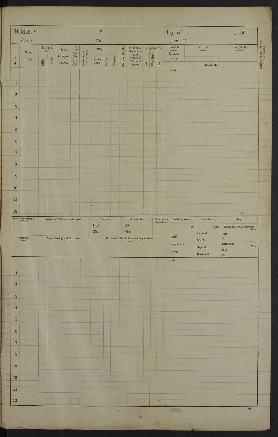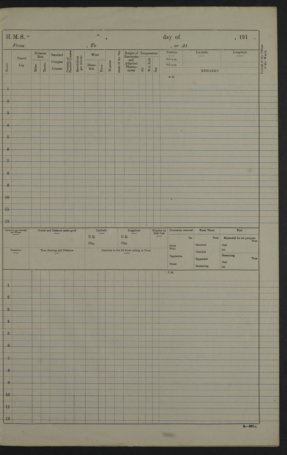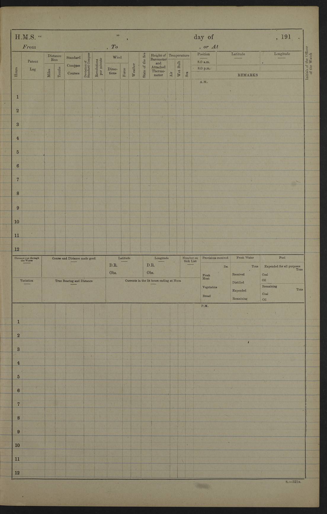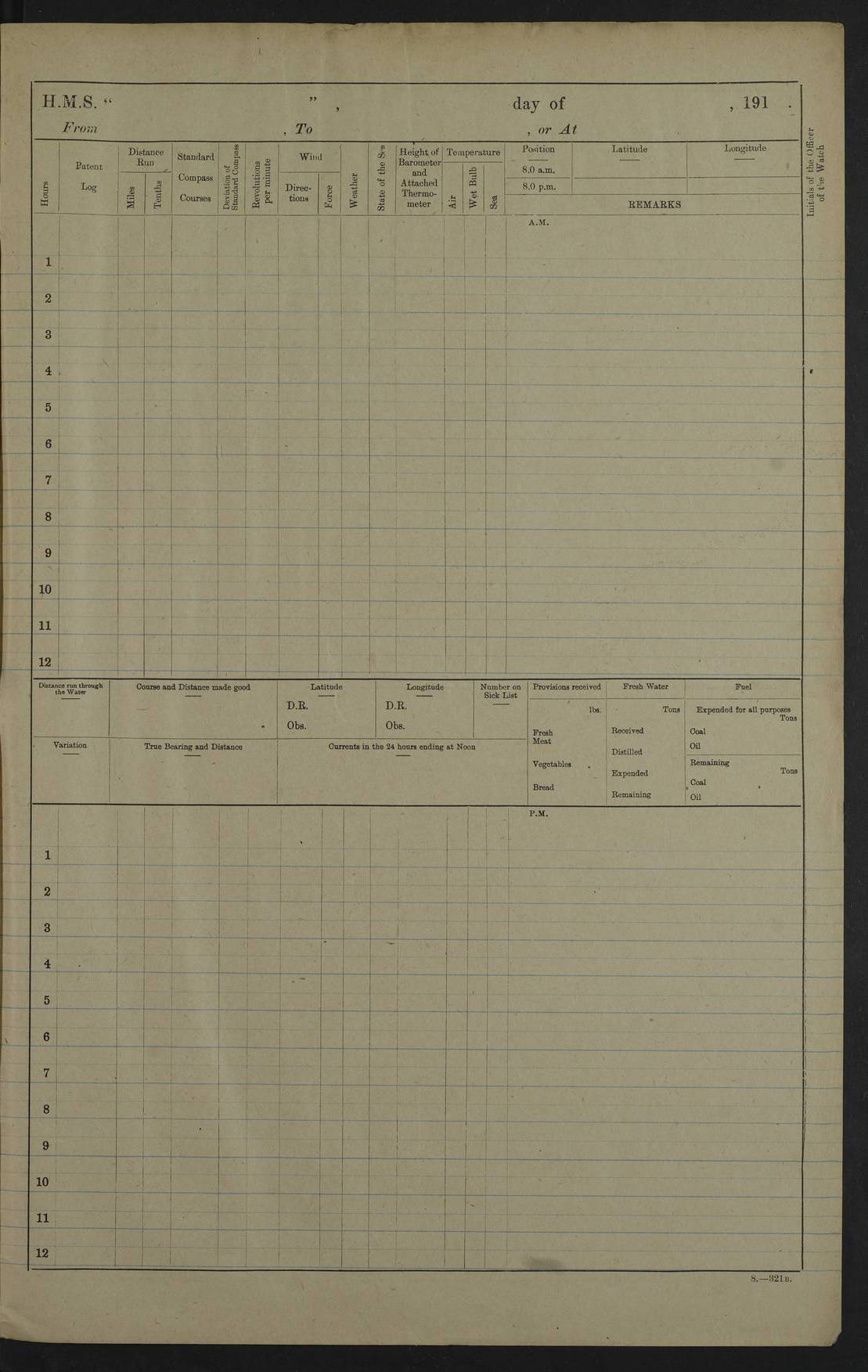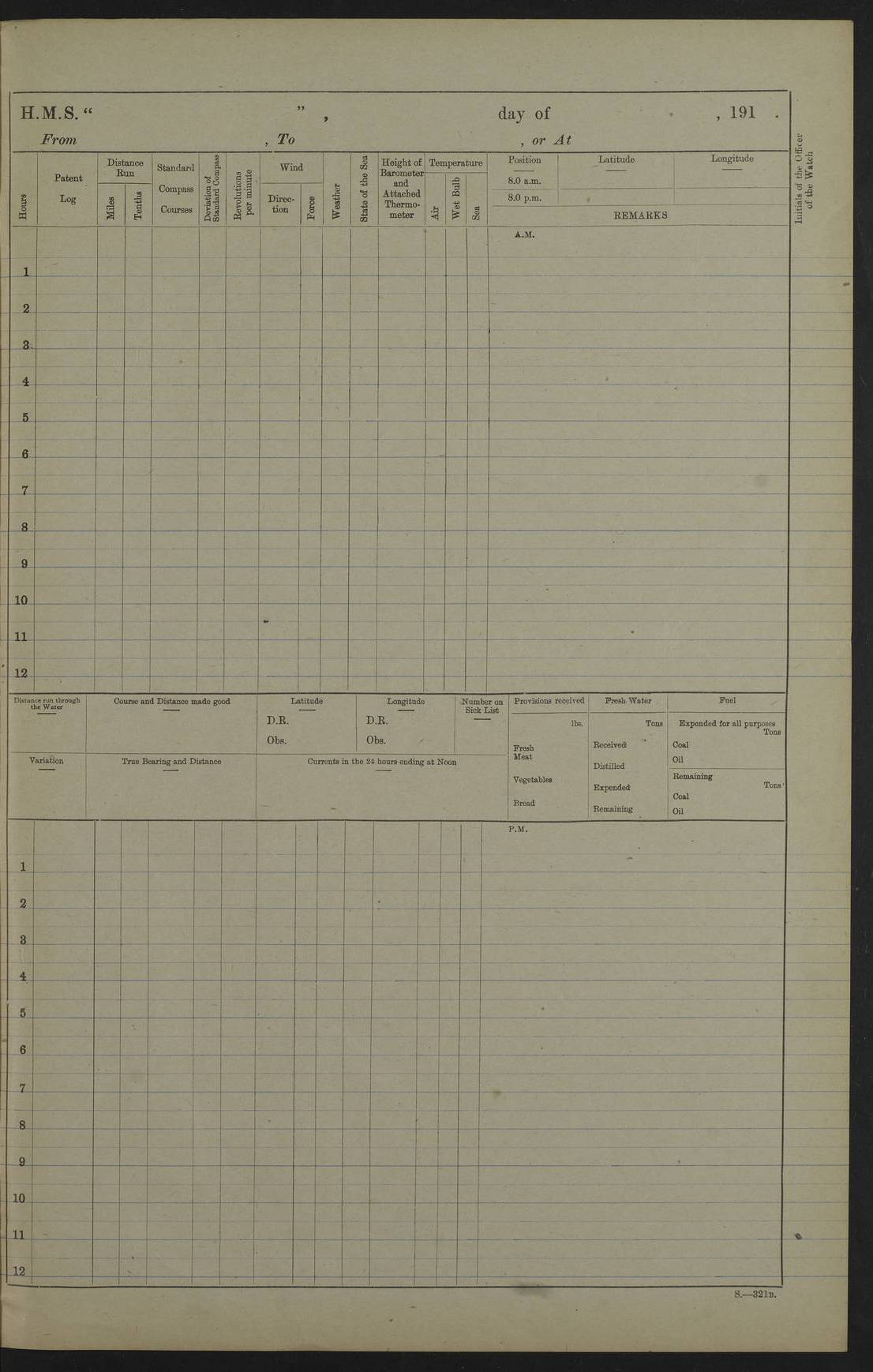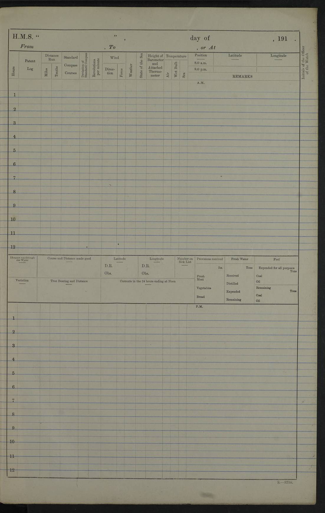 4edebb7b14d0450578000168: (https://s3.amazonaws.com:443/oldweather/ADM53-36589/0003_1.jpg) 1 November 1918 At Malta Lat 35.89, Long 14.52 [Somerset Wharf] 11.15am: Engineers Store Party returned on Board. 0.45pm: Paid Monthly Money. 1.0pm: Mr Goss, Gunner rejoined Ship from RN Hospital. 2.30pm: Gave Special leave to Port Watch untill 7.0am and Port Watch of Boys untill 6.0pm. Hands Made [sic] and Mend Clothes. 2.40pm: Landed liberty Men and Boys. 3.50pm: Provision Boat came alongside. 4.10pm: (4) Recovered Patients rejoined Ship from RN Hospital. 4.30pm: Landed liberty Men and Patrol. 6.0pm: Liberty Boys Returned on Board. 6.30pm: Canteen Party landed untill 10.0pm and Read Warrant No (24). 10.0pm: Canteen Party returned on Board. 11.50pm: Patrol returned on Board. [Provisions received: Fresh Meat 300 lbs, Vegetables 1000 lbs, Bread 450 lbs] 4edebb7c14d0450578000169: (https://s3.amazonaws.com:443/oldweather/ADM53-36589/0004_0.jpg) 2 November 1918 At Malta Lat 35.89, Long 14.52 [Hamilton Wharf] 7.15am: Shifted Berths from Somerset Wharf, to Hamilton Wharf. 8.0am: Tested life Buoys Correct. 8.45am: BW for x Told off Special Parties, Remainder of Hands employed as Requisite, and Landed Picket house Party. 9.10am: Held Court Martial on Board. 10.30am: Court Martial Finished. Noon: Picket House Party returned. 1.20pm: BW for x. Told off Special Parties. Remainder of Hands employed getting in Paymasters Stores and as Requisite. Lost overboard by accident Boat Hooks, Steel, Pattern (345), 2 in Number. 4.20pm: Hands to Fire Stations. 4.35pm: Read Warrant No 25 and gave Special leave to Starboard Watch untill 7.0am. 5.0pm: Landed liberty Men and Victualling Yard Lighter left Ship. 6.30pm: Canteen Party landed untill 10.0pm. [Provisions received: Fresh Meat 260 lbs, Bread 900 lbs] 4edebb7c14d045057800016a: (https://s3.amazonaws.com:443/oldweather/ADM53-36589/0004_1.jpg) 3 November 1918 At Malta Lat 35.89, Long 14.52 [Hamilton Wharf] 9.0am: Landed Church Parties, Wesleyans (14), Presbyterians (10). 9.30am: Divisions. 9.50am: Landed Roman Catholics (15). 10.10am: Discharged (5) Ratings to RN Hospital. 11.35am: All Church Parties returned on Board. 1.0pm: Gave Special leave to Port Watch untill 7.0am and Both Watches of Boys untill 5.30pm. 1.15pm: Landed liberty Men and Boys. 5.30pm: Liberty Boys returned on Board. 6.30pm: Canteen Party landed untill 10.0pm. 8.40pm: Closed B and C Doors. 10.0pm: Canteen Party returned on Board. [Number on sick list: 5] [Provisions received: Fresh Meat 280 lbs] 4edebb7c14d045057800016b: (https://s3.amazonaws.com:443/oldweather/ADM53-36589/0005_0.jpg) 4 November 1918 At Malta Lat 35.89, Long 14.52 [Hamilton Wharf] 6.50am: BW for x Told off Special Parties, remainder of Hands employed as Requisite. 7.0am: Liberty men returned on Board. 8.5am: Provision lighter came alongside. 8.10am: BW for x, Told off Special Parties, remainder of Hands employed Provisioning Ship and as requisite. 8.45am: Landed (1) Carpenter rating for Examination. 3.45pm: (2) Recovered Patients joined Ship from RN Hospital. 4.10pm: Received 8 Bags of Mails from Egmont, and Gave Special leave to Starboard Watch till 7.0am. 5.0pm: Landed Liberty Men and Patrol. 6.0pm: Hands employed getting in and stowing away Provisions. Midnight: Patrol returned on Board. [Weather fine, noon temperature 74F] 4edebb7c14d045057800016c: (https://s3.amazonaws.com:443/oldweather/ADM53-36589/0005_1.jpg) 5 November 1918 At Malta Lat 35.89, Long 14.52 [Hamilton Wharf] 6.45am: BW for x. Told off Special Parties. Remainder of Hands employed getting in and stowing away Provisions. 8.30am: Landed Hospital Party and Picket House Party. 11.0am: Landed (35) Rifles to Naval Ordinance for exchange. Noon: Picket House Party returned. 1.20pm: Landed (2) Ratings for Dental Treatment. 2.25pm: (35) Exchanged Rifles came on Board. 3.40pm: (2) Recovered Patients rejoined Ship from RN Hospital and disinfected Bedding. 4.0pm: Gave Special leave to Port Watch untill 7.0am. Starboard Watch employed stowing Provisions. 4.30pm: Landed Liberty men. Starboard Watch employed stowing away Provisions and Read Warrant No (26). [Provisions received: Fresh Meat 530 lbs, Bread 1000 lbs] 4edebb7c14d045057800016d: (https://s3.amazonaws.com:443/oldweather/ADM53-36589/0006_0.jpg) 6 November 1918 At Malta Lat 35.89, Long 14.52 [Hamilton Wharf] 6.50am: BW for x. Told off Special Parties, Remainder of Port Watch stowing Provisions, Starboard Watch drawing Quarter Deck Awning. 9.0am: Hands employed Provisioning Ship. 4.0pm: Gave Special leave to Starboard Watch untill 7.0am. 4.30pm: Landed liberty Men. Port Watch employed stowing away Provisions. 6.30pm: Canteen Party landed until 10.0pm. 10.0pm: Canteen Party returned on Board. [Number on sick list: 5] [Provisions received: Fresh Meat 250 lbs, Vegetables 1000 lbs, Bread 450 lbs] [Fuel Remaining: Coal 244 tons, Oil 332 tons] 4edebb7c14d045057800016e: (https://s3.amazonaws.com:443/oldweather/ADM53-36589/0006_1.jpg) 7 November 1918 At Malta Lat 35.89, Long 14.52 [No 4 Buoy] 6.30am: BW for x. Told off Special Parties. Remainder of Hands employed prepairing [preparing] Ship to Shift Berths, from Hamilton Wharf to No 4 Buoy. 7.0am: Liberty men returned on Board. 8.50am: Secured Ship to No 4 Buoy and Coal Lighters came alongside. 9.10am: Commenced Coaling Native labour. Hands employed Drawing Stores and as Requisite. 11.50am: Dockyard Parties returned. 1.40pm: BW for x Told off Special Parties, remainder of Hands employed as Requisite. 4.30pm: Gave Special leave to Port Watch untill 7.0am. 4.45pm: Landed liberty men and Patrol and Read Warrant No (27). 7.30pm: Completed Coaling (1481) Tons. 8.40pm: Watch employed sweeping down. 11.50pm: Patrol returned on Board. [Number on sick list: 6] [Provisions received: Fresh Meat 280 lbs, Bread 300 lbs] [Fuel Remaining: Coal 1716 tons, Oil 332 tons] 4edebb7c14d045057800016f: (https://s3.amazonaws.com:443/oldweather/ADM53-36589/0007_0.jpg) 8 November 1918 At Malta Lat 35.89, Long 