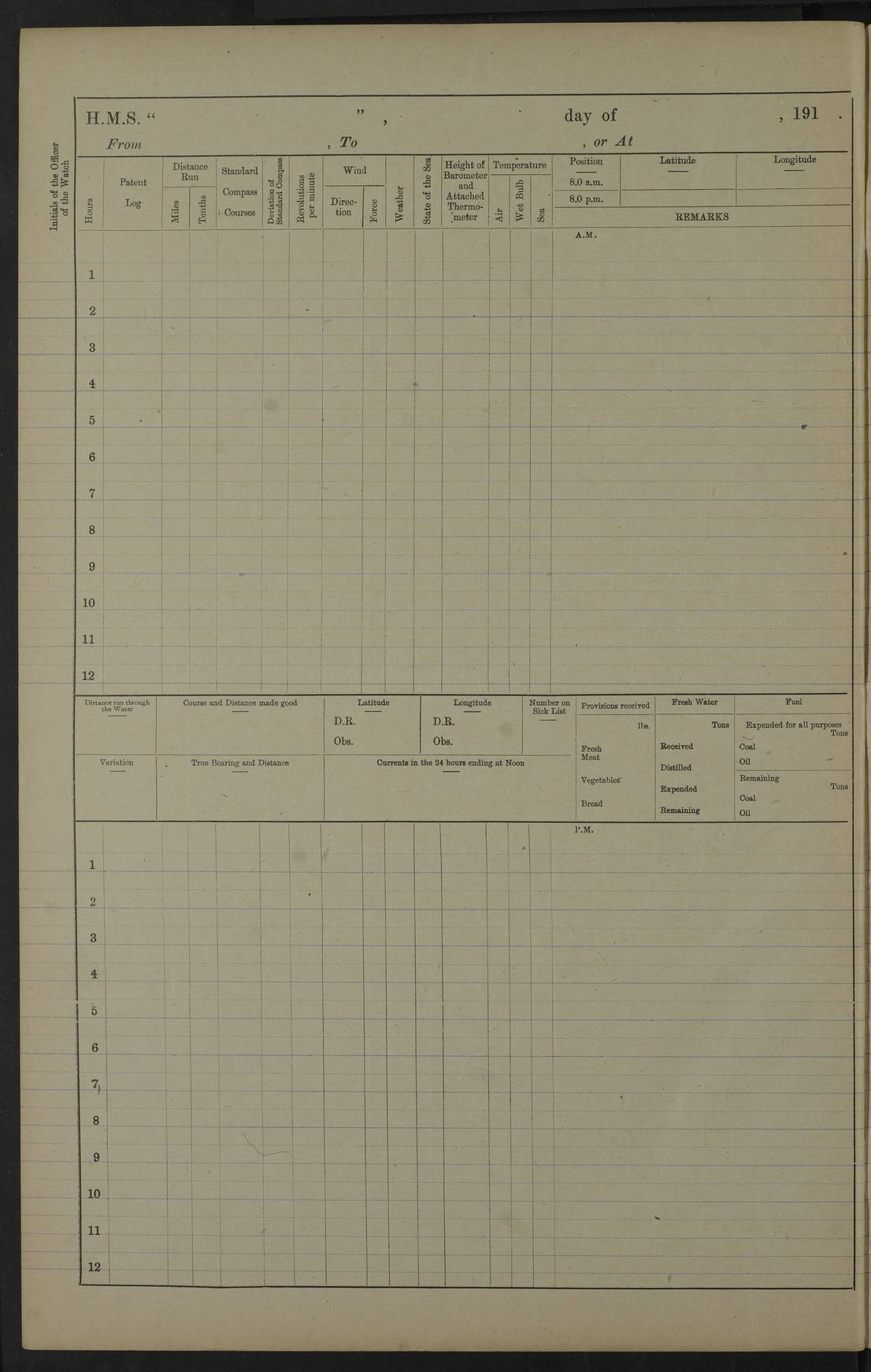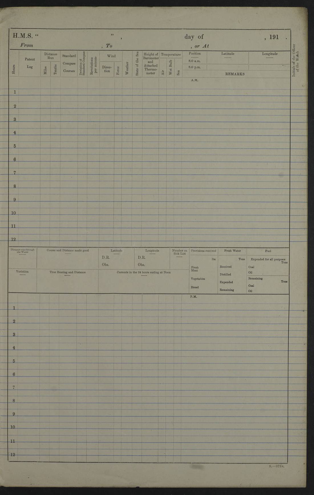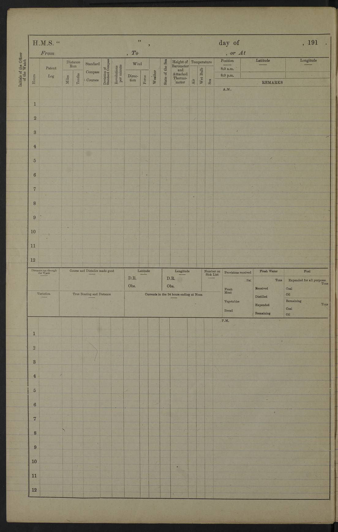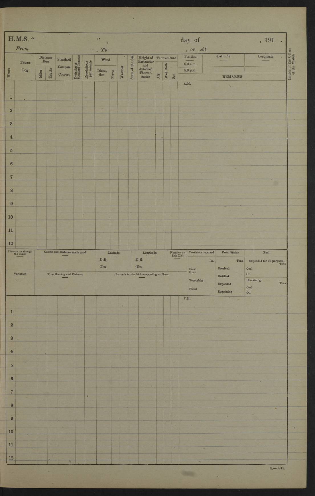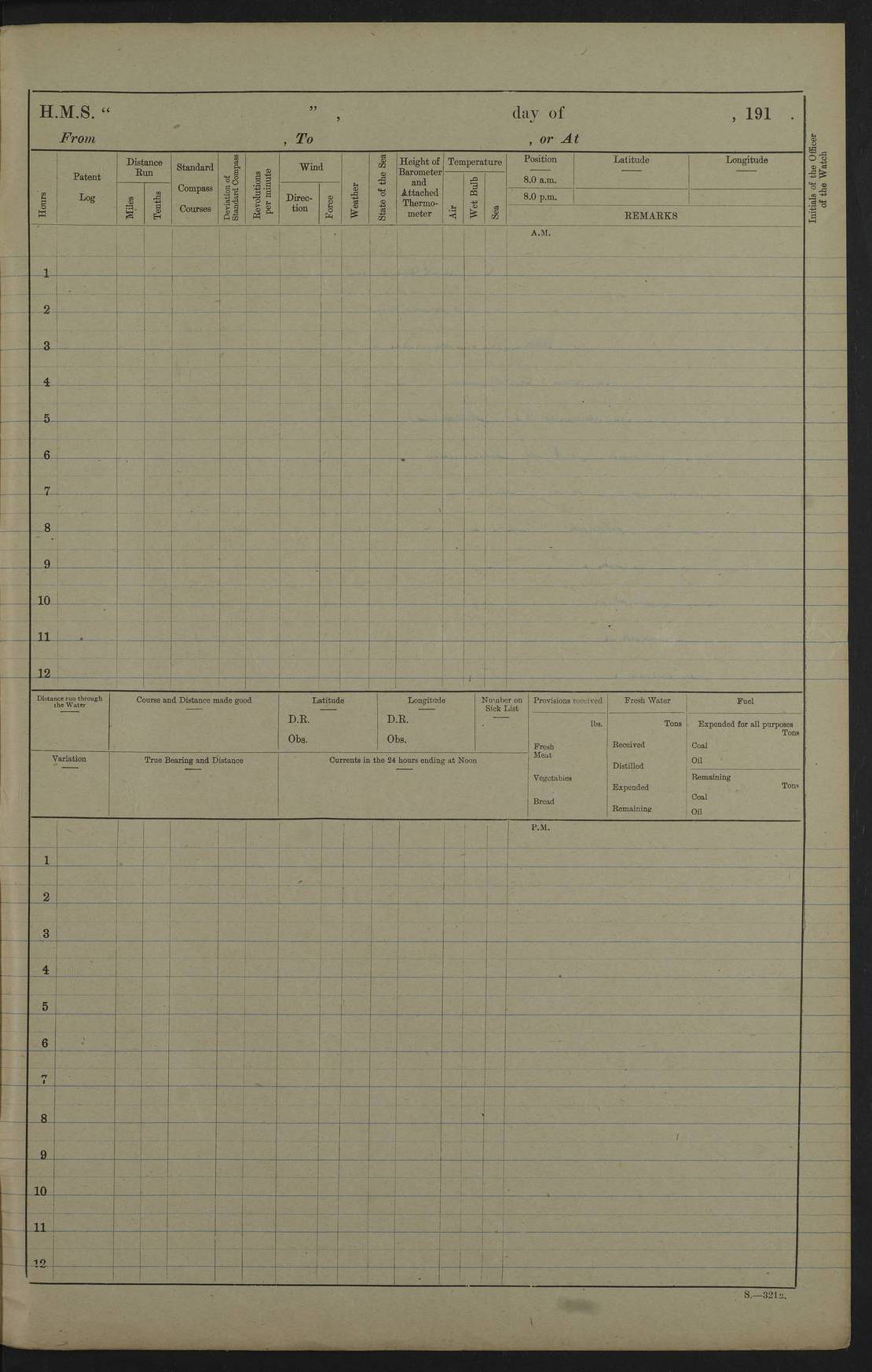 4edebb7b14d0450578000168: (https://s3.amazonaws.com:443/oldweather/ADM53-36589/0003_1.jpg) 1 November 1918 At Malta Lat 35.89, Long 14.52 [Somerset Wharf] 11.15am: Engineers Store Party returned on Board. 0.45pm: Paid Monthly Money. 1.0pm: Mr Goss, Gunner rejoined Ship from RN Hospital. 2.30pm: Gave Special leave to Port Watch untill 7.0am and Port Watch of Boys untill 6.0pm. Hands Made [sic] and Mend Clothes. 2.40pm: Landed liberty Men and Boys. 3.50pm: Provision Boat came alongside. 4.10pm: (4) Recovered Patients rejoined Ship from RN Hospital. 4.30pm: Landed liberty Men and Patrol. 6.0pm: Liberty Boys Returned on Board. 6.30pm: Canteen Party landed untill 10.0pm and Read Warrant No (24). 10.0pm: Canteen Party returned on Board. 11.50pm: Patrol returned on Board. [Provisions received: Fresh Meat 300 lbs, Vegetables 1000 lbs, Bread 450 lbs] 4edebb7c14d0450578000169: (https://s3.amazonaws.com:443/oldweather/ADM53-36589/0004_0.jpg) 2 November 1918 At Malta Lat 35.89, Long 14.52 [Hamilton Wharf] 7.15am: Shifted Berths from Somerset Wharf, to Hamilton Wharf. 8.0am: Tested life Buoys Correct. 8.45am: BW for x Told off Special Parties, Remainder of Hands employed as Requisite, and Landed Picket house Party. 9.10am: Held Court Martial on Board. 10.30am: Court Martial Finished. Noon: Picket House Party returned. 1.20pm: BW for x. Told off Special Parties. Remainder of Hands employed getting in Paymasters Stores and as Requisite. Lost overboard by accident Boat Hooks, Steel, Pattern (345), 2 in Number. 4.20pm: Hands to Fire Stations. 4.35pm: Read Warrant No 25 and gave Special leave to Starboard Watch untill 7.0am. 5.0pm: Landed liberty Men and Victualling Yard Lighter left Ship. 6.30pm: Canteen Party landed untill 10.0pm. [Provisions received: Fresh Meat 260 lbs, Bread 900 lbs] 4edebb7c14d045057800016a: (https://s3.amazonaws.com:443/oldweather/ADM53-36589/0004_1.jpg) 3 November 1918 At Malta Lat 35.89, Long 14.52 [Hamilton Wharf] 9.0am: Landed Church Parties, Wesleyans (14), Presbyterians (10). 9.30am: Divisions. 9.50am: Landed Roman Catholics (15). 10.10am: Discharged (5) Ratings to RN Hospital. 11.35am: All Church Parties returned on Board. 1.0pm: Gave Special leave to Port Watch untill 7.0am and Both Watches of Boys untill 5.30pm. 1.15pm: Landed liberty Men and Boys. 5.30pm: Liberty Boys returned on Board. 6.30pm: Canteen Party landed untill 10.0pm. 8.40pm: Closed B and C Doors. 10.0pm: Canteen Party returned on Board. [Number on sick list: 5] [Provisions received: Fresh Meat 280 lbs] 4edebb7c14d045057800016b: (https://s3.amazonaws.com:443/oldweather/ADM53-36589/0005_0.jpg) 4 November 1918 At Malta Lat 35.89, Long 14.52 [Hamilton Wharf] 6.50am: BW for x Told off Special Parties, remainder of Hands employed as Requisite. 7.0am: Liberty men returned on Board. 8.5am: Provision lighter came alongside. 8.10am: BW for x, Told off Special Parties, remainder of Hands employed Provisioning Ship and as requisite. 8.45am: Landed (1) Carpenter rating for Examination. 3.45pm: (2) Recovered Patients joined Ship from RN Hospital. 4.10pm: Received 8 Bags of Mails from Egmont, and Gave Special leave to Starboard Watch till 7.0am. 5.0pm: Landed Liberty Men and Patrol. 6.0pm: Hands employed getting in and stowing away Provisions. Midnight: Patrol returned on Board. [Weather fine, noon temperature 74F] 4edebb7c14d045057800016c: (https://s3.amazonaws.com:443/oldweather/ADM53-36589/0005_1.jpg) 5 November 1918 At Malta Lat 35.89, Long 14.52 [Hamilton Wharf] 6.45am: BW for x. Told off Special Parties. Remainder of Hands employed getting in and stowing away Provisions. 8.30am: Landed Hospital Party and Picket House Party. 11.0am: Landed (35) Rifles to Naval Ordinance for exchange. Noon: Picket House Party returned. 1.20pm: Landed (2) Ratings for Dental Treatment. 2.25pm: (35) Exchanged Rifles came on Board. 3.40pm: (2) Recovered Patients rejoined Ship from RN Hospital and disinfected Bedding. 4.0pm: Gave Special leave to Port Watch untill 7.0am. Starboard Watch employed stowing Provisions. 4.30pm: Landed Liberty men. Starboard Watch employed stowing away Provisions and Read Warrant No (26). [Provisions received: Fresh Meat 530 lbs, Bread 1000 lbs] 4edebb7c14d045057800016d: (https://s3.amazonaws.com:443/oldweather/ADM53-36589/0006_0.jpg) 6 November 1918 At Malta Lat 35.89, Long 14.52 [Hamilton Wharf] 6.50am: BW for x. Told off Special Parties, Remainder of Port Watch stowing Provisions, Starboard Watch drawing Quarter Deck Awning. 9.0am: Hands employed Provisioning Ship. 4.0pm: Gave Special leave to Starboard Watch untill 7.0am. 4.30pm: Landed liberty Men. Port Watch employed stowing away Provisions. 6.30pm: Canteen Party landed until 10.0pm. 10.0pm: Canteen Party returned on Board. [Number on sick list: 5] [Provisions received: Fresh Meat 250 lbs, Vegetables 1000 lbs, Bread 450 lbs] [Fuel Remaining: Coal 244 tons, Oil 332 tons] 4edebb7c14d045057800016e: (https://s3.amazonaws.com:443/oldweather/ADM53-36589/0006_1.jpg) 7 November 1918 At Malta Lat 35.89, Long 14.52 [No 4 Buoy] 6.30am: BW for x. Told off Special Parties. Remainder of Hands employed prepairing [preparing] Ship to Shift Berths, from Hamilton Wharf to No 4 Buoy. 7.0am: Liberty men returned on Board. 8.50am: Secured Ship to No 4 Buoy and Coal Lighters came alongside. 9.10am: Commenced Coaling Native labour. Hands employed Drawing Stores and as Requisite. 11.50am: Dockyard Parties returned. 1.40pm: BW for x Told off Special Parties, remainder of Hands employed as Requisite. 4.30pm: Gave Special leave to Port Watch untill 7.0am. 4.45pm: Landed liberty men and Patrol and Read Warrant No (27). 7.30pm: Completed Coaling (1481) Tons. 8.40pm: Watch employed sweeping down. 11.50pm: Patrol returned on Board. [Number on sick list: 6] [Provisions received: Fresh Meat 280 lbs, Bread 300 lbs] [Fuel Remaining: Coal 1716 tons, Oil 332 tons] 4edebb7c14d045057800016f: (https://s3.amazonaws.com:443/oldweather/ADM53-36589/0007_0.jpg) 8 November 1918 At Malta Lat 35.89, Long 