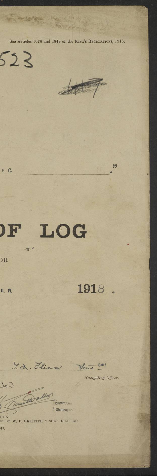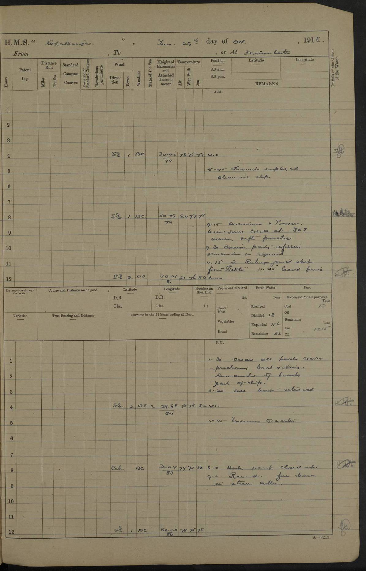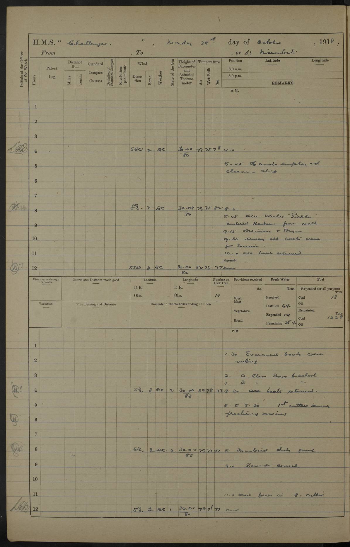 LOGS FOR JULY 1914 CAPTAIN CHARLES P. BEATY-POWNALL LOG BOOK FROM 14TH JULY 1914 TO 13TH SEPTEMBER 1914 4caf8540cadfd3419700d978: (http://oldweather.s3.amazonaws.com/ADM53-69573/ADM53-69573-001_0.jpg) 4caf8540cadfd3419700d979: (http://oldweather.s3.amazonaws.com/ADM53-69573/ADM53-69573-001_1.jpg) 4caf8540cadfd3419700d97a: (http://oldweather.s3.amazonaws.com/ADM53-69573/ADM53-69573-002_0.jpg) 4caf8540cadfd3419700d97b: (http://oldweather.s3.amazonaws.com/ADM53-69573/ADM53-69573-002_1.jpg) 4caf8540cadfd3419700d97c: (http://oldweather.s3.amazonaws.com/ADM53-69573/ADM53-69573-003_0.jpg) 4caf8540cadfd3419700d97d: (http://oldweather.s3.amazonaws.com/ADM53-69573/ADM53-69573-003_1.jpg) 14 July 1914 Devonport. Lat 50.4, Long -4.2 9 am: Read warrants Nos 13, 14, 15 10.45 am: Prisoner discharged to Charybdis. 1.20 pm: Cast off from Northern wall, proceeded through K. lock. 5.25 pm: Made fast alongside No 7 wharf. 7 pm: Lieutenant Geath (?) joined ship 9 pm: R.N.R. Lieutenants Beresford and Cross joined ship 4caf8540cadfd3419700d97e: (http://oldweather.s3.amazonaws.com/ADM53-69573/ADM53-69573-004_0.jpg) 15 July 1914 From Hamaze to Sound or at Devonport. Lat 50.4, Long -4.2 1 on sick list 7 am: Artificer Engineer RNR joined ship 11 am: 22 RFR ratings joined ship 22 R.F.R. ratings joined ship. During afternoon 68 R.F.R. ratings joined. 4.15 pm: 13 R.F.R. ratings joined. 4.45 pm: Assisted by tugs, cast off from wharf, proceeded under steam to No 1 buoy in sound. 5.50 pm: Made fast: swung ship by Eddystone for deviation of compass 7.30 pm: Cast off: proceeded to n. billet 7.52 pm: Came to starboard anchor 6 fathoms. 3 shackles While in sound 97 R.F.R. ratings joined. 4caf8540cadfd3419700d97f: (http://oldweather.s3.amazonaws.com/ADM53-69573/ADM53-69573-004_1.jpg) 16 July 1914 From Plymouth, To Spithead, or at Plymouth Sound Lat 50.33, Long -4.17 3 on sick list 45 RFR men joined during middle watch am: 13 RFR ratings & 3 ABs from Defiance joined pm: 1 E.R.A. joined ship Made weekly payment to active ratings. Discharged to depot 1 seaman rating. 11.0 pm: Weighed: Proceeded as requisite out of sound 11.22 pm: Breakwater Light: abeam 4caf8540cadfd3419700d980: (http://oldweather.s3.amazonaws.com/ADM53-69573/ADM53-69573-005_0.jpg) 17 July 1914 From Plymouth to Spithead Lat 50.5, Long -1.45 6 on sick list 5.20 am Portland Bill Light House: N20E 5.50 am Portland Bill Light House: abeam 7.35 am Durlstone Light House: abeam 9.5 am Needles: abeam 10.15 am Arrived at R.V: Slow both 10.30 am 8th C. Squadr formed single line ahead commd. tactical exercises. 0.50 pm: Formed single line ahead 1.40 pm: Commd tactical exercises at 10 knots Exd. manning and cheering ship 3.30 Stopped 5 ½ miles S86W from Needles 4.30 Procd. S.E. 6 knots in line ahead Courses as reqte for entering Needle Channel 11 Knots. 6.30 Stopped 6.35 Came to Port anchor 6 shackles 10 1/2 fathoms off Burnard Isd. 4caf8540cadfd3419700d981: (http://oldweather.s3.amazonaws.com/ADM53-69573/ADM53-69573-005_1.jpg) 18 July 1914 From Solent, To Spithead, or At Spithead Lat 50.75, Long -1.1 4 on sick list 6.30 am: Weighed: Procd. in line ahead 11 knots. 7.30 am: Stopped: Let go Port anchor: Moored 6 shackles on each 9 ½ fathoms at Spithead in B 23 berth. Remdr. Assembled fleets arrived 5.0 pm: Fired Royal Salute 21 guns. 9.15 - 10.45 pm: Carried out search-light display. 4caf8540cadfd3419700d982: (http://oldweather.s3.amazonaws.com/ADM53-69573/ADM53-69573-006_0.jpg) 19 July 1914 Spithead Lat 50.75, Long -1.1 Number on Sick List 5 10 am: Performed Divine Service 4caf8540cadfd3419700d983: (http://oldweather.s3.amazonaws.com/ADM53-69573/ADM53-69573-006_1.jpg) 20 July 1914 From Spithead, to Weymouth Position at Noon: Lat 50.6, Long -1.06 5 on sick list 9.40 am: Weighed: Procd as regt past the Warner in line ahead. 11.10 am: Passed H.M. the King in Royal Yacht manned Gave three cheers. 11.34 am: C.Squad: WbS 14 knots in line ahead 0.50 pm: Challenger & Isis parted company with flag 3.03 pm: Carried out .303” & 1” practice with 6” gun 6.5 pm: Came to port anchor G3 berth Weymouth Bay 6 shackles 9 fathoms. Discharged to hospital 1 Lieut. R.N.R. 4caf8540cadfd3419700d984: (http://oldweather.s3.amazonaws.com/ADM53-69573/ADM53-69573-007_0.jpg) 21 July 1914 From Weymouth, to Torbay or at sea Position an Noon: Lat 50.56, Long -3.0 3 on sick list 6.45 am: Shortened in to 2 shackles 7.0 am: Weighed: Proceeded as requisite 8.15 am: Portland Bill: abeam 1 ½ miles. Formed line abreast to port. 9.0 am: Took up position for fleet torpedo practice: Abonkin & Juno acting as target ships. Carried out 2 runs 12.0 Stopped: Picked up 2nd torpedo Aboukie and Juno proceeded to Torbay 1.20 pm: Proceeded South-Westly, 10 knots, in company with Isis. Each ship towing target for sub calibre practice vy the other. 5.30 pm: as requisite for entering Torbay 5.35 pm: Came to Port anchor 6 shackles in 7 fathoms 4caf8540cadfd3419700d985: (http://oldweather.s3.amazonaws.com/ADM53-69573/ADM53-69573-007_1.jpg) 22 July 1914 From Torbay, to Weymouth or at Sea Position at Noon: Lat 50.1, Long -2.29 4.15 am: Weighed 4.30 am: Proceeded as requisite 11 knots 4.45 am: Stopped to allow battle fleet to pass ahead 7.15 am: 8th Cruiser squadron took station 2 miles south of Euryalus 8.0 am: 8th Took station S 1/2 W from Euryalus 9.43 am: Sighed enemy (Blue Fleet) E ½ S Carried out P.2 exersise 11.30 am: 8th Cruiser Squadron out of action: Stopped. 1.10 pm: Course Northerly to avoid battle fleet. 2.30 pm: Sighted Shambles Light ship N17E 4.40 pm: Portland Bill: N16E. 1 1/42 miles 6.50 pm: Came to Port anchor 6 shackles 9 ½ fathoms H3 berth Weymouth bay 4caf8540cadfd3419700d986: (http://oldweather.s3.amazonaws.com/ADM53-69573/ADM53-69573-008_0.jpg) 23 July 1914 From Weymouth to Plymouth or at Sea Position at Noon: Lat 50.51, Long -2.59 5.0 am: Weighed. Proceeded in line ahead with ships carrying out battle practice 6.0 am: Portland bill: N16E. 1 mile Courses and speed as requisite carrying out Battle Prac