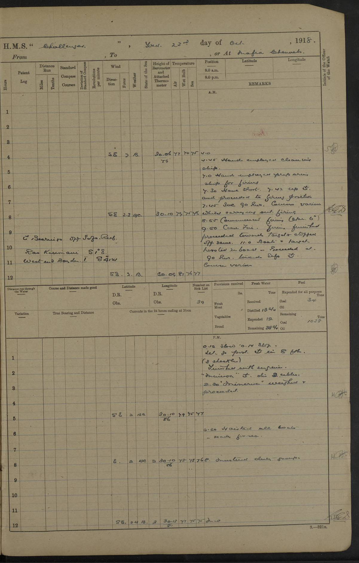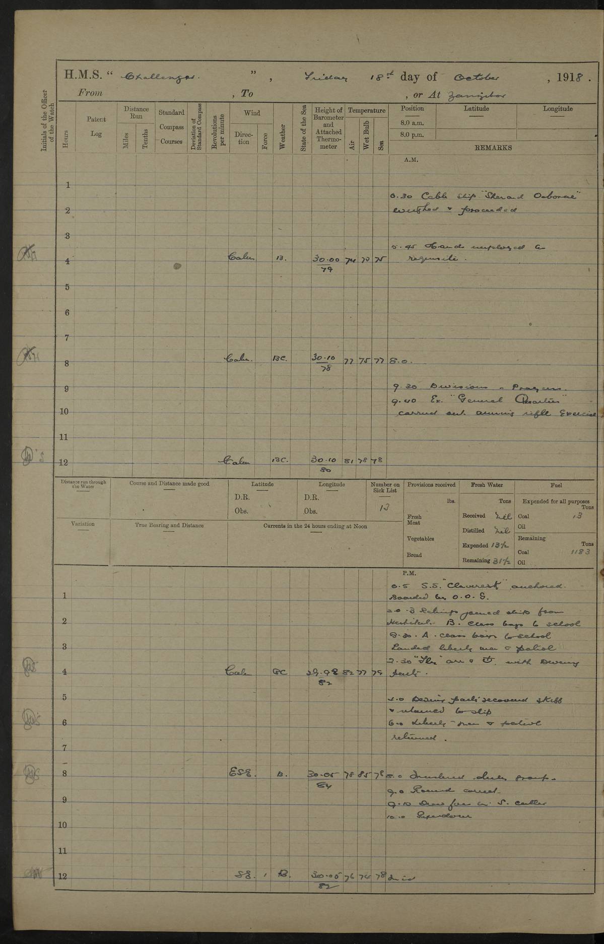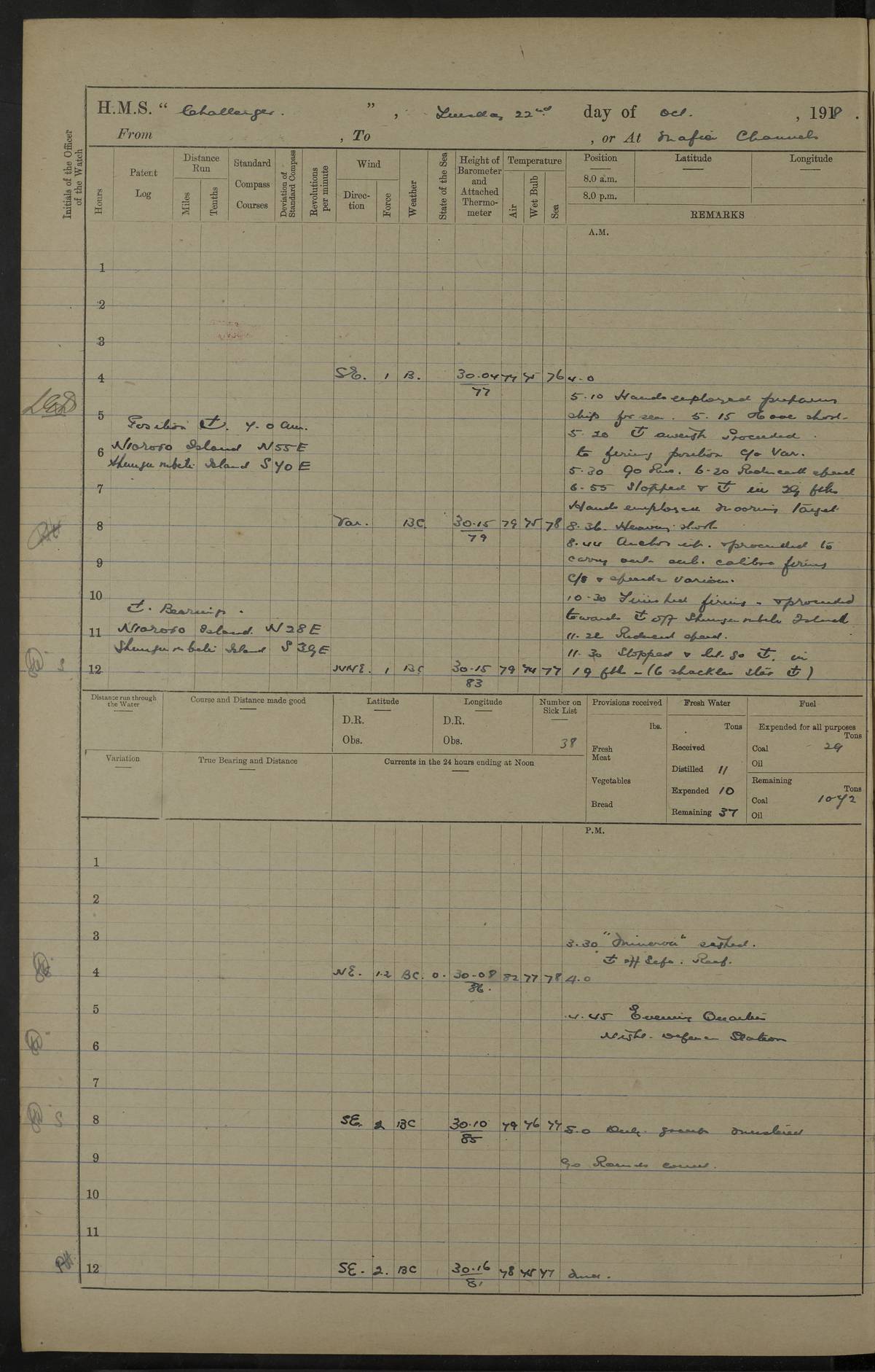 4caf8538cadfd3419700d573: (http://oldweather.s3.amazonaws.com/ADM53-37520/ADM53-37520-0121_1.jpg) 25 October 1916 From Tirene To Kilwa Kisiwani Lat -8.97, Long 39.55 Position at 8 am: Lat -8.05, Long 39.59 Position at Noon: Lat -8.64, Long 39.65 3 on sick list 5.35 am: Weighed and proceeded 90 revolutions. Course as requisite out of Harbour 7.15 am: Ras Kisiwani: abeam N83E 5 cables 2.0 pm: Always Dry: N40W Course as requisite for Kisiwani 2.43 pm: Stopped and came to Port Anchor in 12 ½ fathoms 3 ½ shackles Found in Harbour Talbot, Childers and 2 Transports. 6.0 pm: 4 ratings joned from Talbot 4caf8538cadfd3419700d574: (http://oldweather.s3.amazonaws.com/ADM53-37520/ADM53-37520-0122_0.jpg) 26 October 1916 Kilwa Kisiwani Lat -8.97, Long 39.55 2 on sick list 9.0 am: Landed beach party 9.0 am: Captain and Officers from Talbot holding Court of Inquiry on board 1.40 pm: One rating rejoined from Talbot 4.25 pm: Landed bathing party 6.15 pm: Bathing party returned 6.30 pm: Beach party returned 4caf8538cadfd3419700d575: (http://oldweather.s3.amazonaws.com/ADM53-37520/ADM53-37520-0122_1.jpg) 27 October 1916 Kilwa Kisiwani Lat -8.97, Long 39.55 2 on sick list 11.30 am: Landed beach party 3.0 pm: Huntscliffe sailed 4.20 pm: Talbot sailed 5.30 pm: Beach party returned 5.50 pm: Childers returned 4caf8538cadfd3419700d576: (http://oldweather.s3.amazonaws.com/ADM53-37520/ADM53-37520-0123_0.jpg) 28 October 1916 Kilwa Kisiwani Lat -8.97, Long 39.55 2 on sick list 4caf8538cadfd3419700d577: (http://oldweather.s3.amazonaws.com/ADM53-37520/ADM53-37520-0123_1.jpg) 29 October 1916 Kilwa Kisiwani Lat -8.97, Long 39.55 3 on sick list 5.15 am: Childers sailed towing dhows. 7.30 am: Childers arrived. 8.15 am: Childers sailed escorting Helmuth 8.30 am: Fishing party left ship 10.30 am: Divine Service 11.40 am: Charon arrived. 12.25 pm: Fishing party returned 5.50 pm: "Trent" arrived. 6.45 pm: Received provisions and mails from Trent. 4caf8538cadfd3419700d578: (http://oldweather.s3.amazonaws.com/ADM53-37520/ADM53-37520-0123a_0.jpg) 30 October 1916 Kilwa Kisiwani Lat -8.97, Long 39.55 3 on sick list 4.0 pm Landed bathing party. Landed Gunnery T. C. to embark 3 pounder gun. 4.15 pm: Trent: procd. 6.30 pm: T. C. returned with 3 pounder 4caf8538cadfd3419700d579: (http://oldweather.s3.amazonaws.com/ADM53-37520/ADM53-37520-0123a_1.jpg) 31 October 1916 Kilwa Kisiwani Lat -8.97, Long 39.55 3 on sick list 2.0 pm: Talbot arrived. Received mail 1 rating joined from Talbot 5.35 pm: Talbot sailed LOGS FOR NOVEMBER 1916 4caf8538cadfd3419700d57a: (http://oldweather.s3.amazonaws.com/ADM53-37520/ADM53-37520-0124_0.jpg) 4caf8538cadfd3419700d57b: (http://oldweather.s3.amazonaws.com/ADM53-37520/ADM53-37520-0124_1.jpg) Lieutenant Griffith signed log as navigating officer 4caf8538cadfd3419700d57c: (http://oldweather.s3.amazonaws.com/ADM53-37520/ADM53-37520-0125_0.jpg) 4caf8538cadfd3419700d57d: (http://oldweather.s3.amazonaws.com/ADM53-37520/ADM53-37520-0125_1.jpg) 4caf8538cadfd3419700d57e: (http://oldweather.s3.amazonaws.com/ADM53-37520/ADM53-37520-0126_0.jpg) 4caf8538cadfd3419700d57f: (http://oldweather.s3.amazonaws.com/ADM53-37520/ADM53-37520-0126_1.jpg) 1 November 1916 Kilwa Kisiwani Lat -8.97, Long 39.55 4 on sick list Watch at N.D.Station 8.0 am: Landed Beach party Hands refitting rigging screws Gunnery T.C. at drill. R.M.A at loader 10.15 am: Weighed Port anchor. Let go Starboard anchor 2.10 pm: Charon proceeded. Drew fires in Himalaya’s Steam boat. 3.50 pm: Himalaya arrived. Returned Himalaya's Steam boat 4.0 pm: Landed Bathing party and Gunnery T.C. Ranging cable for survey 4.15 pm: Received beef from Himalaya, 5 boys joined ship 5.5 pm: Beach party returned 5.0 pm: Himalaya proceeded 4caf8538cadfd3419700d580: (http://oldweather.s3.amazonaws.com/ADM53-37520/ADM53-37520-0127_0.jpg) 2 November 1916 Kilwa Kisiwani Lat -8.97, Long 39.55 4 on sick list 6.0 am: Hands cleaning ship and port chain locker, R.M.As and Gunnery T.C. landed for drill 8.0 am: R.M.As and Gunnery T.C. returned 2.30 pm: Barjora arrived 4caf8538cadfd3419700d581: (http://oldweather.s3.amazonaws.com/ADM53-37520/ADM53-37520-0127_1.jpg) 3 November 1916 Kilwa Kisiwani Lat -8.97, Long 39.55 4 on sick list 9.0 am: Fly arrived. 4.15 pm: Fly proceeded 7.10 pm: Charon arrived. 7.50 pm: Charon proceeded. 4caf8538cadfd3419700d582: (http://oldweather.s3.amazonaws.com/ADM53-37520/ADM53-37520-0128_0.jpg) 4 November 1916 Kilwa Kisiwani Lat -8.97, Long 39.55 4 on sick list 9.0 Divisions. Aired Night closing. Tested Lifebuoys found correct. Rigged concert stage. 6.40 pm: Charon arrived. 4caf8538cadfd3419700d583: (http://oldweather.s3.amazonaws.com/ADM53-37520/ADM53-37520-0128_1.jpg) 5 November 1916 Kilwa Kisiwani Lat -8.97, Long 39.55 2 on sick list 8.25 am: Charon proceeded. 10.0 am: Divine Service 3.50 pm: Transport Clan Mac Phee arrived. 5.30 pm: Hyacinth arrived. 5.45 pm: Two marines and one Stoker joined ship 6.10 pm: Charon arrived. Received fresh provisions and mails from Hyacinth 4caf8538cadfd3419700d584: (http://oldweather.s3.amazonaws.com/ADM53-37520/ADM53-37520-0129_0.jpg) 6 November 1916 Kilwa Kisiwani Lat -8.97, Long 39.55 6 am: Hands cleaning ship. Landed beach and demolition parties. Aired beeding 8 – 0 – 0 am: S.B.C. Commander Bridgeman RN joined ship from Hyacinth 9.15 am: Divisions. And Prayers. Bedding inspected. Discharged to Hyacinth 2 ratings for Hospital Simonstown. 11.55 am: Barjora sailed 5.15 pm: Prepared for Night Defence. Landed military mails 5.20 pm: Hyacinth proceeded. One rating joined from Charon. Discharged one rating to Charon. 5.22 pm: Childers proceeded. 5.45 pm: Beach parties and boats returned 4caf8538cadfd3419700d585: (http://oldweather.s3.amazonaws.com/ADM53-37520/ADM53-37520-0129_1.jpg) 7 November 1916 Kilwa Kisiwani Lat -8.97, Long 39.55 2 on sick list 6.20 am: Beach party and demolition party with steam cutter, Dudu, Doris and skiff left ship 6.50 am: Talbot arrived. 8.0 am: Received vegetables and fruit from Talbot 10.30 pm: Echo