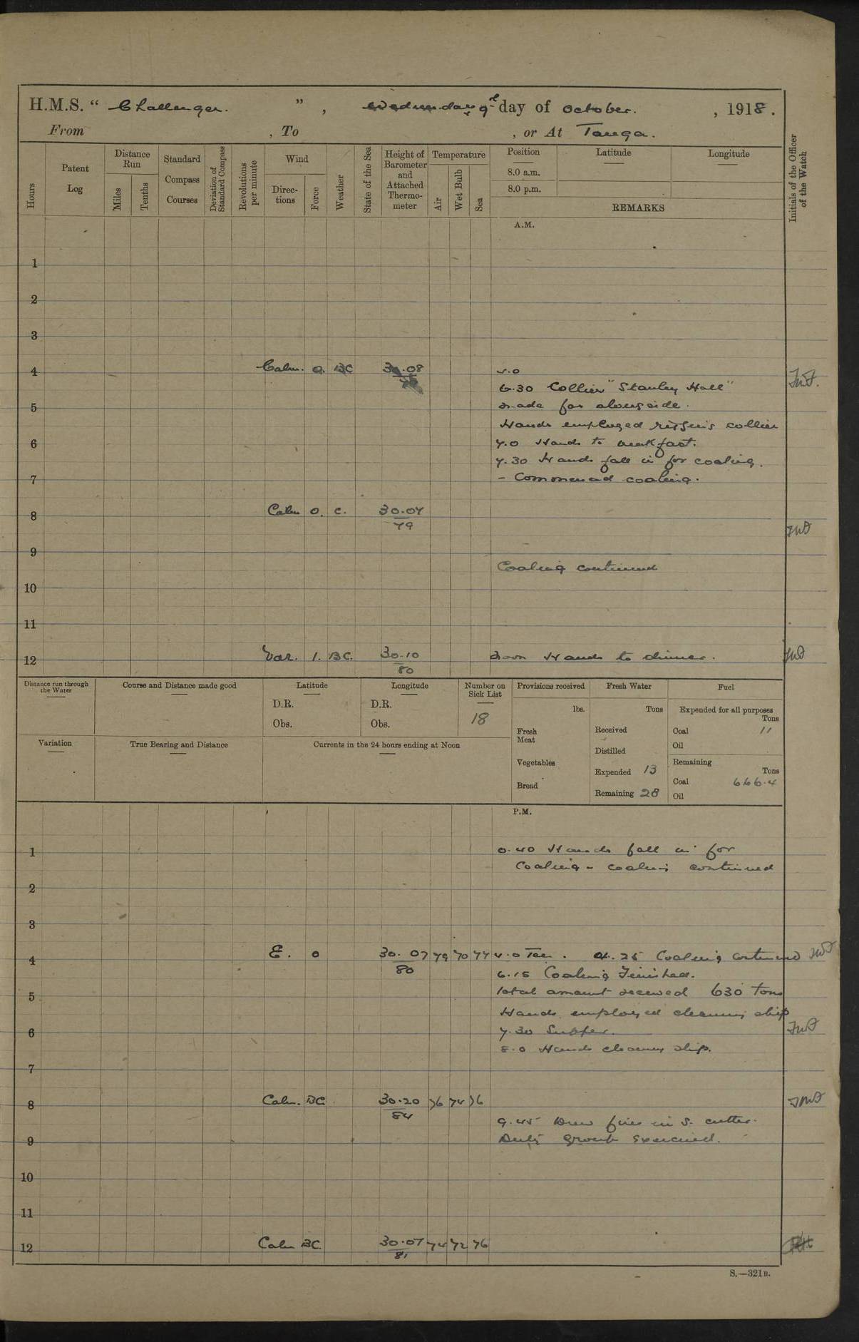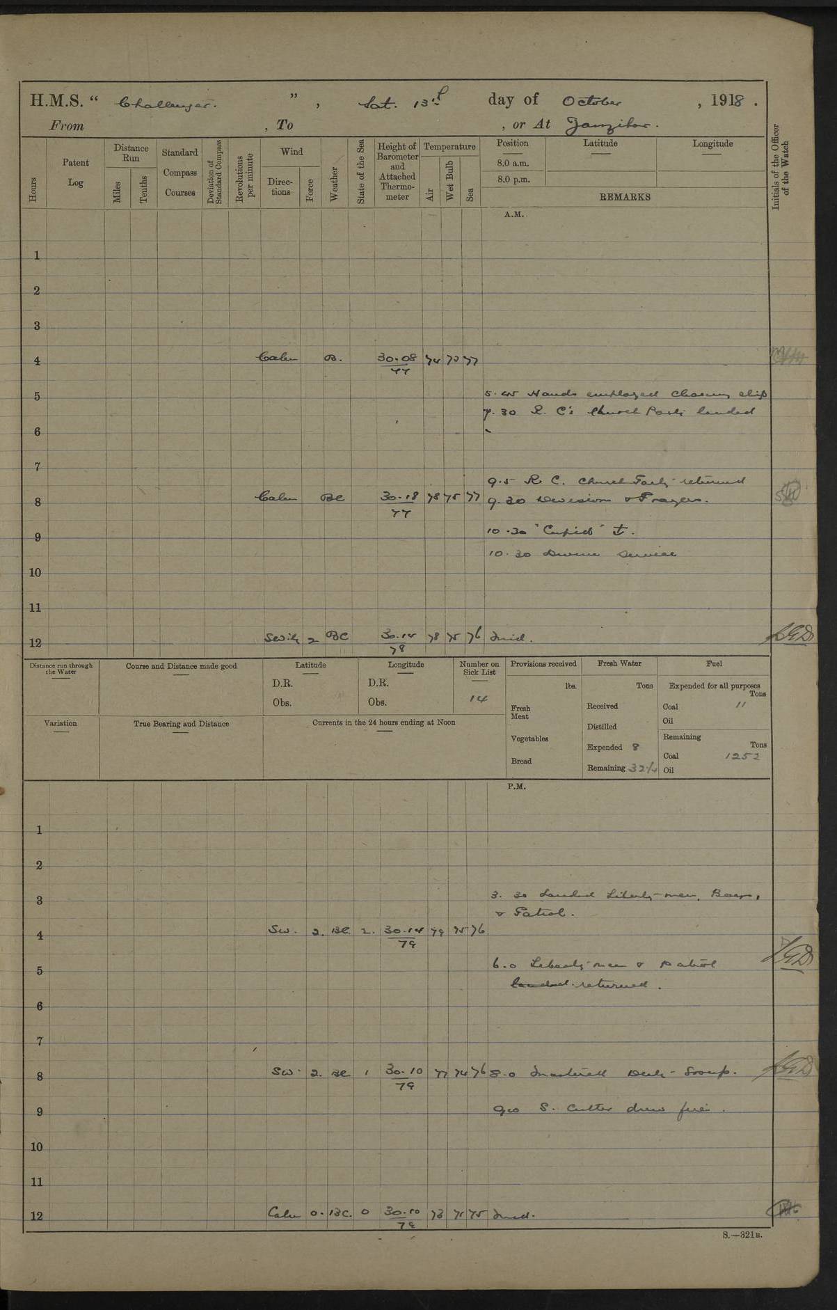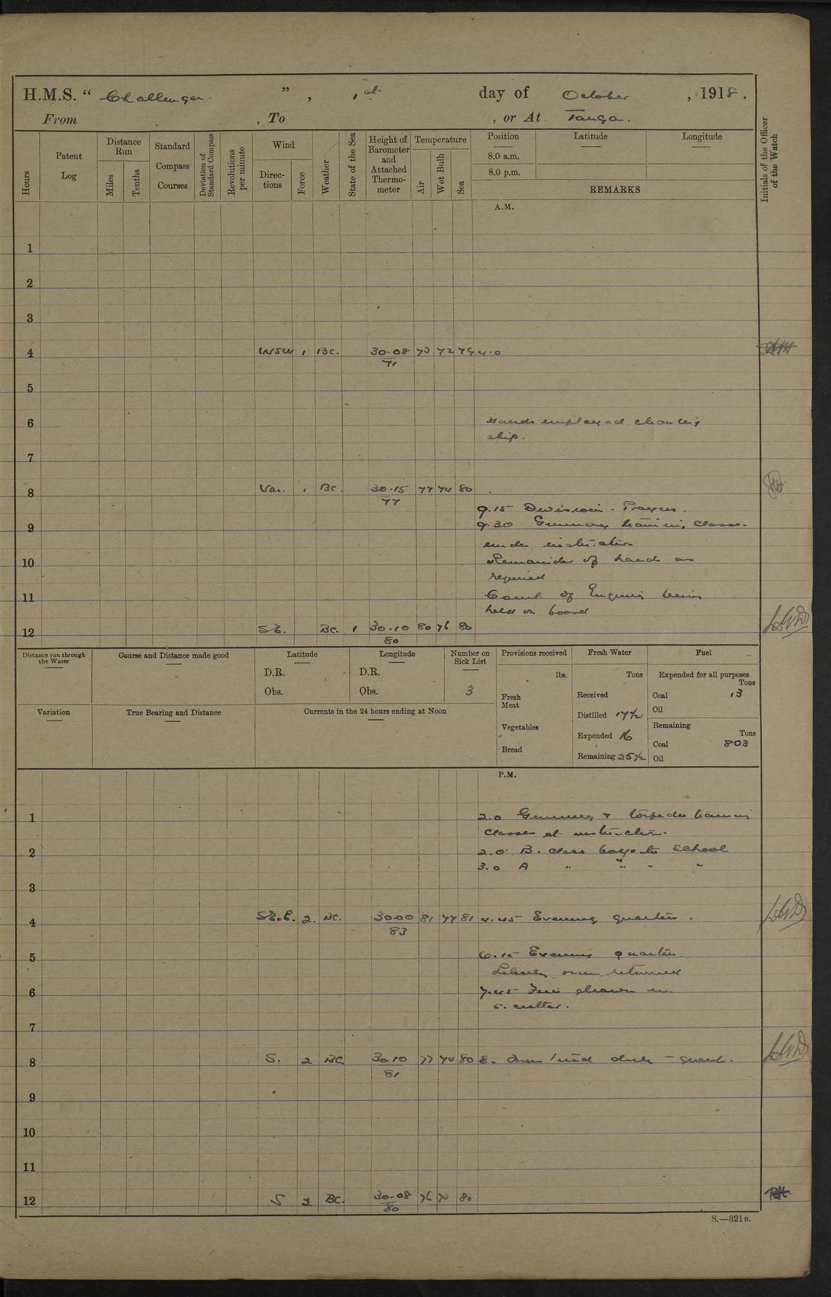 4caf8538cadfd3419700d573: (http://oldweather.s3.amazonaws.com/ADM53-37520/ADM53-37520-0121_1.jpg) 25 October 1916 From Tirene To Kilwa Kisiwani Lat -8.97, Long 39.55 Position at 8 am: Lat -8.05, Long 39.59 Position at Noon: Lat -8.64, Long 39.65 3 on sick list 5.35 am: Weighed and proceeded 90 revolutions. Course as requisite out of Harbour 7.15 am: Ras Kisiwani: abeam N83E 5 cables 2.0 pm: Always Dry: N40W Course as requisite for Kisiwani 2.43 pm: Stopped and came to Port Anchor in 12 ½ fathoms 3 ½ shackles Found in Harbour Talbot, Childers and 2 Transports. 6.0 pm: 4 ratings joned from Talbot 4caf8538cadfd3419700d574: (http://oldweather.s3.amazonaws.com/ADM53-37520/ADM53-37520-0122_0.jpg) 26 October 1916 Kilwa Kisiwani Lat -8.97, Long 39.55 2 on sick list 9.0 am: Landed beach party 9.0 am: Captain and Officers from Talbot holding Court of Inquiry on board 1.40 pm: One rating rejoined from Talbot 4.25 pm: Landed bathing party 6.15 pm: Bathing party returned 6.30 pm: Beach party returned 4caf8538cadfd3419700d575: (http://oldweather.s3.amazonaws.com/ADM53-37520/ADM53-37520-0122_1.jpg) 27 October 1916 Kilwa Kisiwani Lat -8.97, Long 39.55 2 on sick list 11.30 am: Landed beach party 3.0 pm: Huntscliffe sailed 4.20 pm: Talbot sailed 5.30 pm: Beach party returned 5.50 pm: Childers returned 4caf8538cadfd3419700d576: (http://oldweather.s3.amazonaws.com/ADM53-37520/ADM53-37520-0123_0.jpg) 28 October 1916 Kilwa Kisiwani Lat -8.97, Long 39.55 2 on sick list 4caf8538cadfd3419700d577: (http://oldweather.s3.amazonaws.com/ADM53-37520/ADM53-37520-0123_1.jpg) 29 October 1916 Kilwa Kisiwani Lat -8.97, Long 39.55 3 on sick list 5.15 am: Childers sailed towing dhows. 7.30 am: Childers arrived. 8.15 am: Childers sailed escorting Helmuth 8.30 am: Fishing party left ship 10.30 am: Divine Service 11.40 am: Charon arrived. 12.25 pm: Fishing party returned 5.50 pm: "Trent" arrived. 6.45 pm: Received provisions and mails from Trent. 4caf8538cadfd3419700d578: (http://oldweather.s3.amazonaws.com/ADM53-37520/ADM53-37520-0123a_0.jpg) 30 October 1916 Kilwa Kisiwani Lat -8.97, Long 39.55 3 on sick list 4.0 pm Landed bathing party. Landed Gunnery T. C. to embark 3 pounder gun. 4.15 pm: Trent: procd. 6.30 pm: T. C. returned with 3 pounder 4caf8538cadfd3419700d579: (http://oldweather.s3.amazonaws.com/ADM53-37520/ADM53-37520-0123a_1.jpg) 31 October 1916 Kilwa Kisiwani Lat -8.97, Long 39.55 3 on sick list 2.0 pm: Talbot arrived. Received mail 1 rating joined from Talbot 5.35 pm: Talbot sailed LOGS FOR NOVEMBER 1916 4caf8538cadfd3419700d57a: (http://oldweather.s3.amazonaws.com/ADM53-37520/ADM53-37520-0124_0.jpg) 4caf8538cadfd3419700d57b: (http://oldweather.s3.amazonaws.com/ADM53-37520/ADM53-37520-0124_1.jpg) Lieutenant Griffith signed log as navigating officer 4caf8538cadfd3419700d57c: (http://oldweather.s3.amazonaws.com/ADM53-37520/ADM53-37520-0125_0.jpg) 4caf8538cadfd3419700d57d: (http://oldweather.s3.amazonaws.com/ADM53-37520/ADM53-37520-0125_1.jpg) 4caf8538cadfd3419700d57e: (http://oldweather.s3.amazonaws.com/ADM53-37520/ADM53-37520-0126_0.jpg) 4caf8538cadfd3419700d57f: (http://oldweather.s3.amazonaws.com/ADM53-37520/ADM53-37520-0126_1.jpg) 1 November 1916 Kilwa Kisiwani Lat -8.97, Long 39.55 4 on sick list Watch at N.D.Station 8.0 am: Landed Beach party Hands refitting rigging screws Gunnery T.C. at drill. R.M.A at loader 10.15 am: Weighed Port anchor. Let go Starboard anchor 2.10 pm: Charon proceeded. Drew fires in Himalaya’s Steam boat. 3.50 pm: Himalaya arrived. Returned Himalaya's Steam boat 4.0 pm: Landed Bathing party and Gunnery T.C. Ranging cable for survey 4.15 pm: Received beef from Himalaya, 5 boys joined ship 5.5 pm: Beach party returned 5.0 pm: Himalaya proceeded 4caf8538cadfd3419700d580: (http://oldweather.s3.amazonaws.com/ADM53-37520/ADM53-37520-0127_0.jpg) 2 November 1916 Kilwa Kisiwani Lat -8.97, Long 39.55 4 on sick list 6.0 am: Hands cleaning ship and port chain locker, R.M.As and Gunnery T.C. landed for drill 8.0 am: R.M.As and Gunnery T.C. returned 2.30 pm: Barjora arrived 4caf8538cadfd3419700d581: (http://oldweather.s3.amazonaws.com/ADM53-37520/ADM53-37520-0127_1.jpg) 3 November 1916 Kilwa Kisiwani Lat -8.97, Long 39.55 4 on sick list 9.0 am: Fly arrived. 4.15 pm: Fly proceeded 7.10 pm: Charon arrived. 7.50 pm: Charon proceeded. 4caf8538cadfd3419700d582: (http://oldweather.s3.amazonaws.com/ADM53-37520/ADM53-37520-0128_0.jpg) 4 November 1916 Kilwa Kisiwani Lat -8.97, Long 39.55 4 on sick list 9.0 Divisions. Aired Night closing. Tested Lifebuoys found correct. Rigged concert stage. 6.40 pm: Charon arrived. 4caf8538cadfd3419700d583: (http://oldweather.s3.amazonaws.com/ADM53-37520/ADM53-37520-0128_1.jpg) 5 November 1916 Kilwa Kisiwani Lat -8.97, Long 39.55 2 on sick list 8.25 am: Charon proceeded. 10.0 am: Divine Service 3.50 pm: Transport Clan Mac Phee arrived. 5.30 pm: Hyacinth arrived. 5.45 pm: Two marines and one Stoker joined ship 6.10 pm: Charon arrived. Received fresh provisions and mails from Hyacinth 4caf8538cadfd3419700d584: (http://oldweather.s3.amazonaws.com/ADM53-37520/ADM53-37520-0129_0.jpg) 6 November 1916 Kilwa Kisiwani Lat -8.97, Long 39.55 6 am: Hands cleaning ship. Landed beach and demolition parties. Aired beeding 8 – 0 – 0 am: S.B.C. Commander Bridgeman RN joined ship from Hyacinth 9.15 am: Divisions. And Prayers. Bedding inspected. Discharged to Hyacinth 2 ratings for Hospital Simonstown. 11.55 am: Barjora sailed 5.15 pm: Prepared for Night Defence. Landed military mails 5.20 pm: Hyacinth proceeded. One rating joined from Charon. Discharged one rating to Charon. 5.22 pm: Childers proceeded. 5.45 pm: Beach parties and boats returned 4caf8538cadfd3419700d585: (http://oldweather.s3.amazonaws.com/ADM53-37520/ADM53-37520-0129_1.jpg) 7 November 1916 Kilwa Kisiwani Lat -8.97, Long 39.55 2 on sick list 6.20 am: Beach party and demolition party with steam cutter, Dudu, Doris and skiff left ship 6.50 am: Talbot arrived. 8.0 am: Received vegetables and fruit from Talbot 10.30 pm: Echo