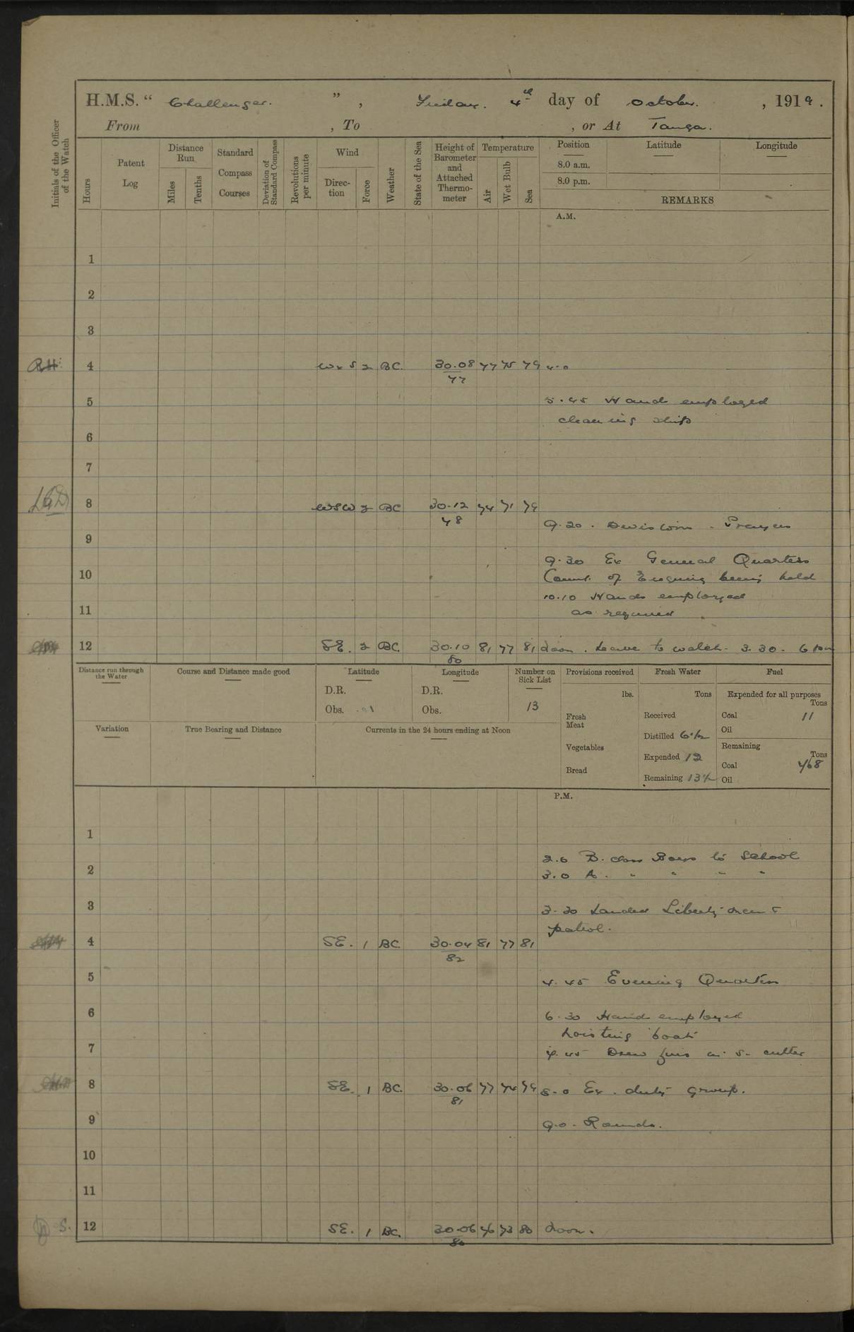 4caf8535cadfd3419700d495: (http://oldweather.s3.amazonaws.com/ADM53-37520/ADM53-37520-0011_1.jpg) 13 April 1916 From Durban to Lindi to Tirene, or at Sea Lat -10.2, Long 40.3 Position at 8 am: Lat -10.71, Long 40.73 Position at Noon: Lat -10.06, Long 40.08 Position at 8 pm: Lat -9.50, Long 39.86 6 on sick list 6.59 am: North extreme Wamizi Island: N83W 7.8 miles 8.0 am: Cape Delgado Light House: N58W 5.8 miles 9.50 am: Ras Ruvura: N80W 6 miles 11.0 am: Ras Sangamku: S.53W 5 miles 11.26 am: Courses and speed as requisite for closing H.M.S. Vengeance. Took station 2 cables on Starboard beam of ditto. H.M.S. Vengeance: flying flag of Commander in Chief. 11.35 am: H.M.S. Thistle close in shore. H.M.S. Pickle in attendance on "Vengeance" 12.3 pm: Stopped. Communicated by boat with H.M.S. Vengeance. 2.30 pm: In Station 4 miles on Starboard beam of Flag. 4.25 pm: Proceeded 102 revolutions. Closed to 2 cables of Flag. 4.45 pm: Stopped. 5.0 pm: Discharged ratings and stores to Vengeance; and 2 ratings and stores to Thistle. 4.50 pm: Ras Kera: S87W 6.2 miles 5.56 pm: Ras Kera: S63W 6 miles 5.55 pm: Proceeded 7.10 pm: Altered course as requisite to close collier S.S. (name not written) and Thistle. Speed as requisite 7.30 pm: Resumed courses N8E 6 knots. Speed as necessary for escorting collier (with defects to machinery). 10 pm: Escorting Collier. "Thistle" in attendance 4caf8535cadfd3419700d496: (http://oldweather.s3.amazonaws.com/ADM53-37520/ADM53-37520-0012_0.jpg) 14 April 1916 From off Lindi to Tirene, or at Tirene Lat -7.86, Long 39.67 Position at 8 pm: Lat -8.66, Long 40.75 5 on sick list 1 am: Escorting collier (defects to machinery) 8.22 am: Eastern extreme Okuza Island: S60W 5.1 miles 9.30 am: Courses as requisite for anchorage to Northward of Ras Kisimani. 8.30 am: H.M.S. Severn: in Kibondo anchorage 9.50 am: <- Mange Reef N13W, <- Kibondo Island N69E, -> Kibondo Island N83E, <- Okuza Island S8W 11.33 am: Ras Kisimani Beacon: East 5 cables. 11.55 am: Stopped. 11.56 am: Came to with starboard Bower in 11 1/2 fathoms (bottom sand and mud) veered to 4 shackles. Collier S.S. Northumbria and H.M.S. Thistle arrived. 12.21 pm: H.M.S. Severn secured alongside. Port watch employed hoisting out stores with "Severn" 2.30 pm: H.M.S. "Severn" cast off. 3.8 pm: Proceeded courses as requisite for proceeding to Sea via South Mafia Channel 3.28 pm: Ras Kisimani Beacon: N83E 5 cables 5.2 pm: Eastern extremity Okuza Island: S87W 5.1 miles 6.11 pm: -> Okuza Island: N37W, <- Mjuni Island: N87W 4caf8535cadfd3419700d497: (http://oldweather.s3.amazonaws.com/ADM53-37520/ADM53-37520-0012_1.jpg) 15 April 1916 From Tirene to Mgau Mwania to Zanzibar, or at Sea Lat -9.9, Long 40.2 Position at Noon: Lat -9.90, Long 40.21 Position at 8 pm: Lat -8.11, Long 40.10 5 on sick list 5 40 am: Sighted H.M.S. Vengeance 5.40 am: Course and speed as requisite for joining flag 5 45 am: Sighted H.M.S. Hyacinth 5 48 am: Sighted H.M.S. Pickle 6.0 am: Ras Mkiya: S55W 12.5 miles 6.35 am: Joined Flag at Rendez Vous. Communicated with Flag by signal. 6.35 am: Ras Mkiya: S42W 5.2 miles 6.58 am: Porceeded to anchorage. Course and speed as requisite 7.44 am: Came to with Starboard Bower in 24 fathoms (bottom sand) veered to 6 shackles. Hyacinth and Vengeance firing on enemy's positions in Mgau Mwania. Challenger firing lydite from position of Supply ship to Leidi village in direct fire. 8.15 am: Opened fire 9.35 am: Ceased fire. 10.0 am: Weighed and proceeded to Rendez Vous. Course and speed as requisite 10.30 am: Stopped. Communicated by boat with Hyacinth and by signal with Flag. 10.50 am: Proceeded 102 revolutions 11.0 am: Ras Mkiga S40W 5.2 9.6 pm: Observed Moresby Light: N32W 10.3 pm: Moresby Light: West 8.3 miles 4caf8535cadfd3419700d498: (http://oldweather.s3.amazonaws.com/ADM53-37520/ADM53-37520-0013_0.jpg) 16 April 1916 From Mgau Mwania to Zanzibar, or at Zanzibar Lat -6.2, Long 39.2 3 on sick list 3.30 am: Chumbe Light: N38W 5.0 am: Courses as requisite for Zanzibar via Southern Pass. 5.23 am: Chumbe Light House: East 1 mile. 6.7 am: Came to with Starboard Bower in 12 fathoms (bottom mud) veered to 4 shackles. 7.15 am: Collier S.S. Anglier secured alonside 10.15 am: Discharged 2 ratings to R.N. Hospital 11.15 am: H.M.S. Vengeance arrived. 12.15 pm: H.M.S. Pickle arrived. 2.0 pm: Discharged one rating to and received one rating from "Vengeance" Discharged one rating to S.S. Barjora for H.M.S. Styx. 3.45 pm: Discharged 8 ratings to "Vengeance" 3.40 pm: H.M.S. Pioneer arrived. 4.10 pm: Discharged 8 ratings to R.N. Barracks 4.30 pm: Received 1 seedie boy from "Hyacinth" 4.50 pm: H.M.S. Vengeance sailed. 4caf8535cadfd3419700d499: (http://oldweather.s3.amazonaws.com/ADM53-37520/ADM53-37520-0013_1.jpg) 17 April 1916 From Zanzibar to Southern patrol Position at Noon: Lat -7.07, Long 39.75 4 on sick list 5.40 am: Weighed and proceeded 90 revolutions. Course as requisite for leaving harbour by Southern Pass: 6.24 am: Chumbe Light House: East 7 cables 2.40 pm: Sighted Moresby Point: S27W 4 28 pm: Moresby point Light House: West 8 miles 5.14 Moresby Point: N47W 4caf8535cadfd3419700d49a: (http://oldweather.s3.amazonaws.com/ADM53-37520/ADM53-37520-0014_0.jpg) 18 April 1916 Southern Patrol German East Africa Position at Noon: Lat -9.93, Long 39.91 4 on sick list 6.43 am: Mgau Mwania entrance: S30W, 617 feet hill: S5W, Cape Paman: S7E, 976 feet hill: N84W 8.0 am: Ras Sangamku: S17E 6.8 miles 10.4 am: Clarkson Point: N77W 9.5 miles 9.15 am: Divisions. Inspected small arm 10.50 am: Stopped. "Hyacinth" closed 1.0 pm: 617 feet hill: S19E, Dark tree: S4 1/2E, Mwentengi Point: S81W, Ras Mzinga: N34 1/2E 4.8 pm: Ras Sangamku: S4W 7 miles 5.40 pm: Northern extreme Mongo Island: S32W 2.7 miles 11.6 pm: Sighted Cape Delgado Light: S19W 4caf8535cadfd3419700d49b: (http://oldweather.s3.amazonaws.com/ADM53-37520/ADM53-37520-0014_1.jpg) 19 April 1916 Southern Patrol German East Africa Lat -10.2, Long 40.2 Position at Noon: Lat -10.16, Long 40.25 3 on sick list 1