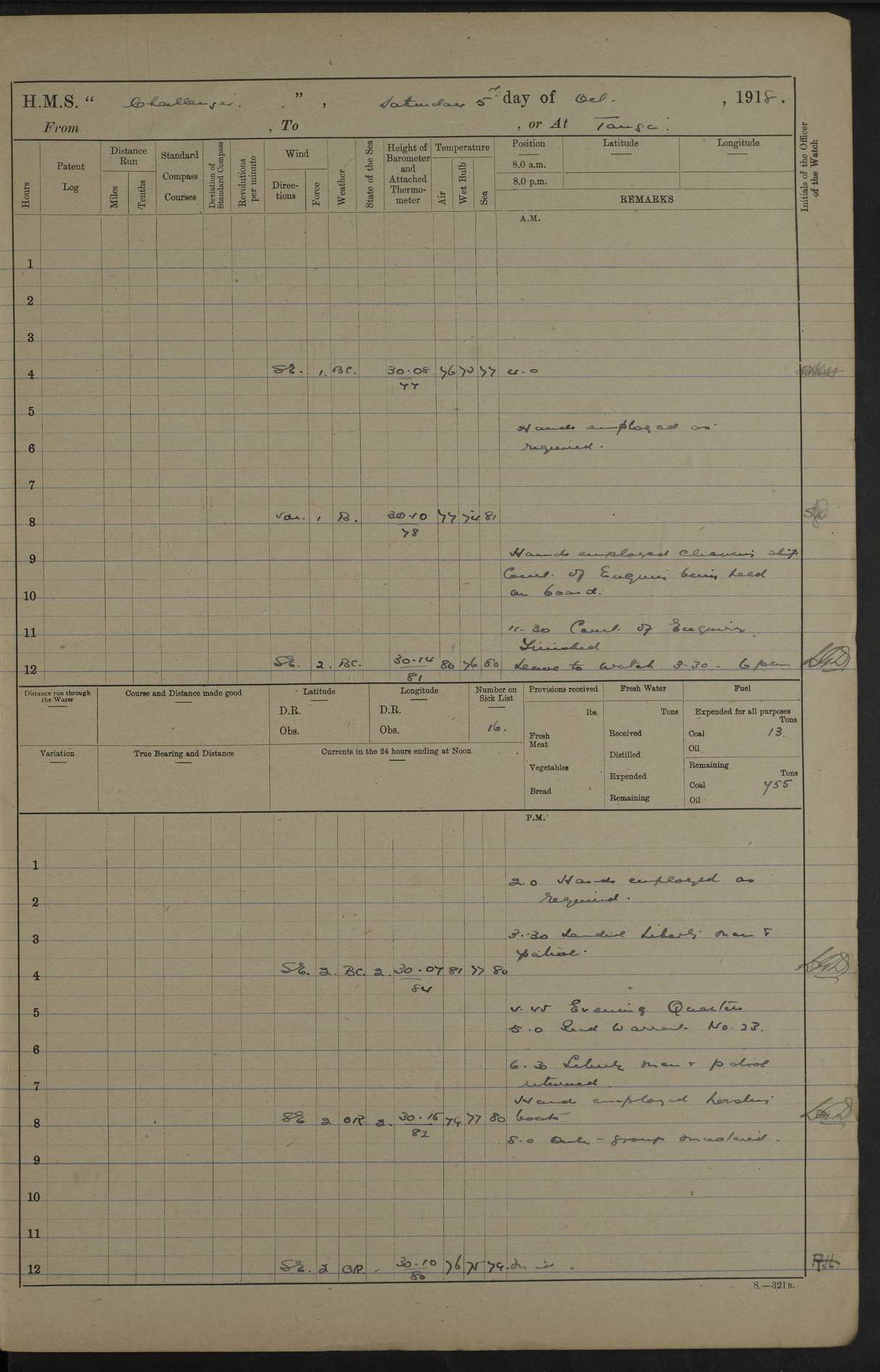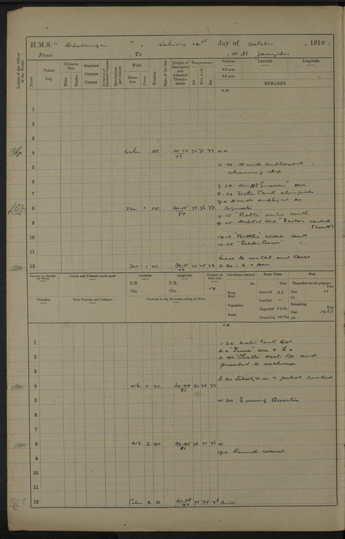 4caf8537cadfd3419700d531: (http://oldweather.s3.amazonaws.com/ADM53-37520/ADM53-37520-0088_1.jpg) 29 August 1916 Zanzibar Lat -6.2, Long 39.2 5 on sick list 5.20 am: Prepared for coaling 5.45 am: Commenced coaling 5.30 am: SS Khalifa sailed 7.35 am: H.M.S. Mersey sailed 8.0 to 8.35 am: Ceased coaling for breakfast 11.40 am: H.M.S. Trent arrived 4.5 to 4.35 pm: Ceased coaling for tea 7.15 pm: Finished coaling received 420 tons 7.35 pm: Collier cast off 4caf8537cadfd3419700d532: (http://oldweather.s3.amazonaws.com/ADM53-37520/ADM53-37520-0089_0.jpg) 30 August 1916 Zanzibar Lat -6.2, Long 39.2 5 on sick list 5.45 am: Cleaning ship 6.45 am: Landed funeral party 9.5 am: H.M.S. Thistle shifted berth 10.5 am: Funeral party returned on board 10.25 am: Discharged marines to H.M.S. Trent 10.50 am: Discharged 3 marines to H.M.S. Talbot 5.0 pm: Evening quarters Sent barge to R.N. Barracks Discharged 3 ratings (boat keepers) to R.N. Barracks 4caf8537cadfd3419700d533: (http://oldweather.s3.amazonaws.com/ADM53-37520/ADM53-37520-0089_1.jpg) 31 August 1916 From Zanzibar to Dar es Salaam, to Bagamoyo, or at Bagamoyo Lat -6.43, Long 38.91 6 on sick list 1.30 am: Weighed and proceeded to sea via Southern Pass. H.M.S. Manica in company. Course and speed as requisite 2.32 am: Chumbe Light House: S86E 1 mile 5.20 am: Sighted H.M.S. Vengance 6.12 am: Proceeded course and speed as requisite for clearing entrance to Dar es Salaam Bay 6.23 am: Ras Kankadya: S68W 5.1 miles 6.30 Action Shelled trenches and positions in vicinity of Mount Upanga. Fired 30 rounds 7.5 am: Outer Makatumbe Light House: S5E 1.9 miles 7.20 Ceased firing 7.25 am: Outer Makatumbe Light House: S2E 2.8 miles 7.25 am: Secured H.M.S. Vengance shelling wreck of "Konig" and West Ferry Point. 10.47 am: Ras Luale: S75W 5.4 miles 11.0 am: Course as requisite for approaching Bagamoyo 11.42 am: Stopped 11.44 am: Came to with Starboard Bower in 5 3/4 fathoms (bottom mud) veered to 3 shackles 12-50 pm: H.M.S. Prattler arrived 12.55 pm: H.M.S. Vengance arrived 1.30 pm: H.M.S. Manica arrived 2.40 pm: H.M.S. Severn arrived 3.40 pm: Discharged 2 officers, 1 Petty Officer and 6 men to H.M.S. Trent 4.20 pm: H.M.S. Trent sailed 6.55 pm: H.M.S. Childers arrived LOGS FOR SEPTEMBER 1916 4caf8537cadfd3419700d534: (http://oldweather.s3.amazonaws.com/ADM53-37520/ADM53-37520-0090_0.jpg) 4caf8537cadfd3419700d535: (http://oldweather.s3.amazonaws.com/ADM53-37520/ADM53-37520-0090_1.jpg) Lt Cdr (N) Cecil G Brooke signed log book 4caf8537cadfd3419700d536: (http://oldweather.s3.amazonaws.com/ADM53-37520/ADM53-37520-0091_0.jpg) 4caf8537cadfd3419700d537: (http://oldweather.s3.amazonaws.com/ADM53-37520/ADM53-37520-0091_1.jpg) 4caf8537cadfd3419700d538: (http://oldweather.s3.amazonaws.com/ADM53-37520/ADM53-37520-0092_0.jpg) barometer error max 0.01 4caf8537cadfd3419700d539: (http://oldweather.s3.amazonaws.com/ADM53-37520/ADM53-37520-0092_1.jpg) 1 September 1916 Bagamoyo Lat -6.43, Long 38.91 5 on sick list 1.55 am: H.M.S. Hyacinth sailed 8.15 am: H.M.S. "Talbot", "Pickle" and " Fly" arrived 12.45 pm: Paid monthly money. Hands mustered by the ledger. 1.15 pm: H.M.S. Mersey proceeded 2.8 pm: H.M.S. Manica arrived 9.5 pm: H.M.S. Fly sailed 11.30 pm: H.M.S. Vengance sailed 4caf8537cadfd3419700d53a: (http://oldweather.s3.amazonaws.com/ADM53-37520/ADM53-37520-0093_0.jpg) 2 September 1916 Bagamoyo Lat -6.43, Long 38.91 5 on sick list 1.30 am: H.M.S. Manica sailed 5.0 am: Transport SS Rajput sailed 11.15 am: H.M.S. Charon arrived 11.0 pm: Weighed and proceeded speed 68 revolutions. Course as requisite "Talbot" 3 1/2 cables astern 4caf8537cadfd3419700d53b: (http://oldweather.s3.amazonaws.com/ADM53-37520/ADM53-37520-0093_1.jpg) 3 September 1916 From Bagamoyo to Dar es Salaam, or at sea Position at Noon: Lat -6.75, Long 39.36 3 on sick list 5.0 am: Course and speed as requisite for remaining off Rendezvous 5.0 am: Sighted 4 whalers inside Dar es Salaam Bay shelling ennemy's positions and endeavouring to draw ennemy's fire 5.10 am: Sighted H.M.S. Vengeance (flag) and Hyacinth to West – North - Westward 5.20 am: Second Division formed astern of first Division. Course and speed as requisite for steaming to S.S.E. outside Daphne Reefs. 5.21 am: Outer Makatumbe Island Light House: S37W 4.6 miles 6.15 am: Outer Makatumbe Island Light House: S61W 0.72 mile 6.25 am: Outer Makatumbe Island Light House: S7W 1.12 mile 6.37 am: Outer Makatumbe Island Light House: S13E 2.2 miles 7.15 am: Outer Makatumbe Island Light House: S4W 2.0 miles 8.15 am: Outer Makatumbe Island Light House: S93W 3.5 miles 6.0 am: Second Division proceeded to Bombardment line Number 12 6.0 am: First Division proceeded to Bombardment line Number 5 Second Division (Challanger and Talbot) shelling gun positions and trenches in vicinity 7.2 am: Squadron ceased fire First Division proceeded into Msasani Bay. Second Division remaining off Makatumbe Island from 2 to 4 miles Noon: Stopped pm: Course and speed as requisite for patrolling of entrance Dar es Salaam Bay 2.40 pm: Outer Makatumbe Island Light House: S75W 3.8 miles 3.10 pm: Outer Makatumbe Island Light House: S43W 2.7 miles 3.30 to 3.50 pm: Course and speed as requisite for proceeding to anchorage 3.55 pm: Came to with Port Bower in 17 fathoms (bottom sand) veered to 6 shackles (Anchored off Outer Makatumbe Island) 5.15 pm: Divine Service 4caf8537cadfd3419700d53c: (http://oldweather.s3.amazonaws.com/ADM53-37520/ADM53-37520-0094_0.jpg) 4 September 1916 Dar es Salaam Bay Lat -6.7, Long 39.3 3 on sick list 5.0 am: Weighed and proceeded. Course and speed as requisite for closing on the Makatumbe Island Light House 5.30 am: Outer Makatumbe Island Light House: S10W 2.8 miles 5.30 am: Stopped off entrance to Dar es Salaam Bay. Hoisted Flag of truce. Sent Sub Lieutenant Ball R.N.R. and Acting Assistant Paymaster Vaughan R.N. to H.M.S. Echo. Echo proceeded into Dar es Salaam Bay with White Flag flying 6.0 am: H.M.S. Vengance (flag), Hyacinth, Talbot, Manica and 4 whalers arrived off ent