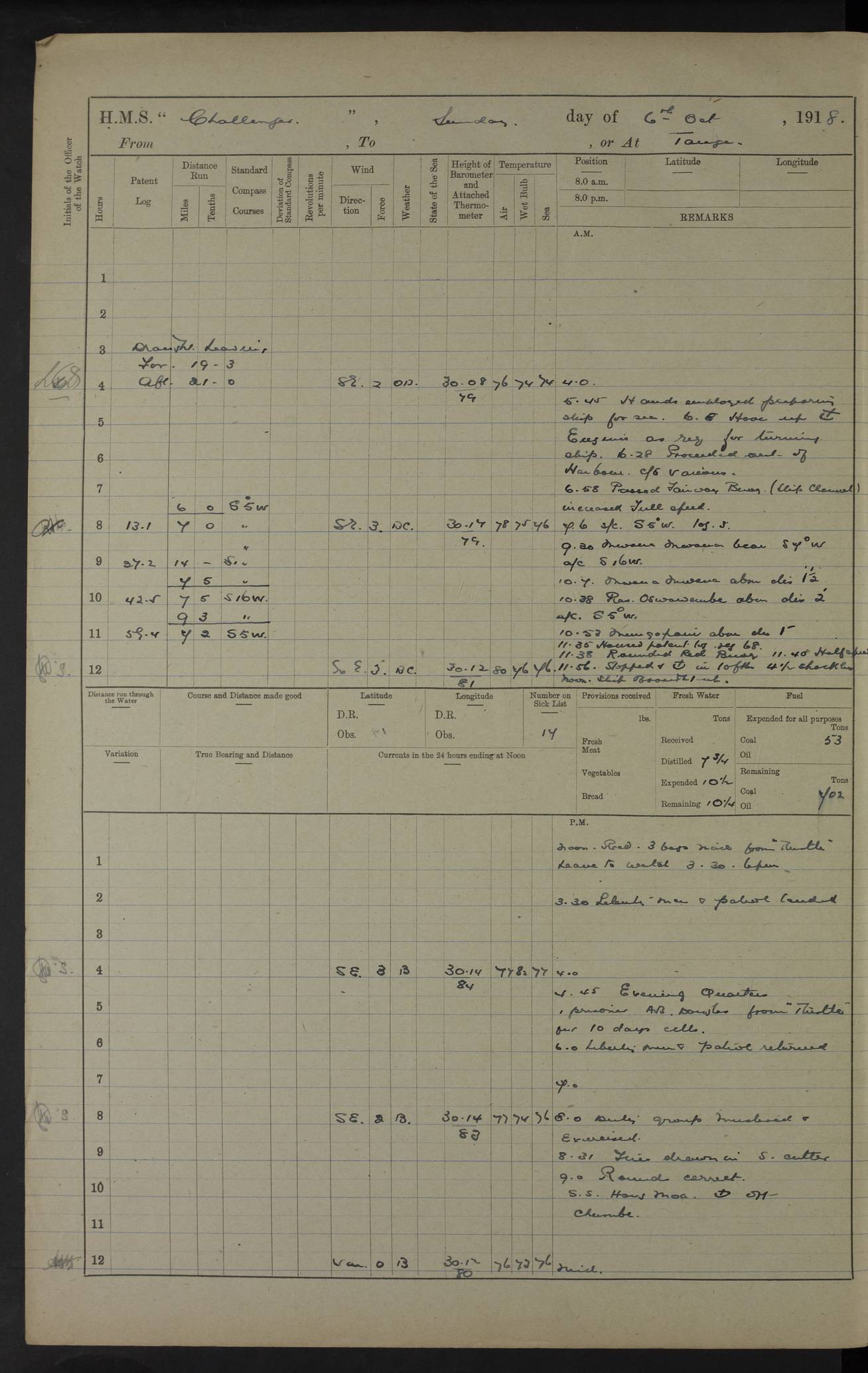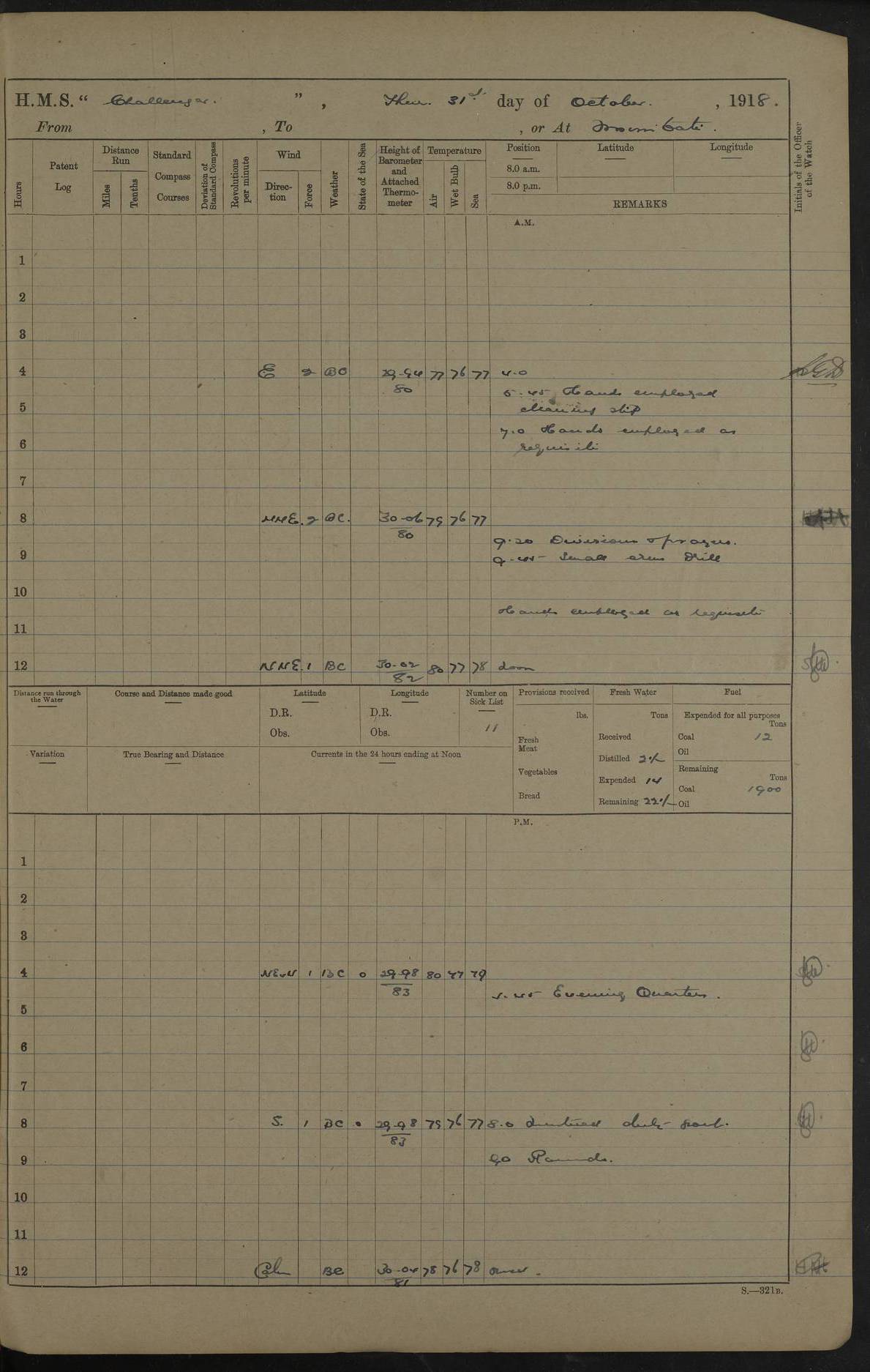 4caf8535cadfd3419700d475: (http://oldweather.s3.amazonaws.com/ADM53-37519/ADM 53-37519-243_1.jpg) 27 March 1916 Simonstown Lat -34.18, Long 18.44 4 on sick list 10.0 am: Discharged 2 ratings to R.N. Hospital. 2.45 pm: Received 2 ratings from R.N. Hospital. 5.20 pm: Received one rating from Detention Quarters 5.0 pm: Divisions Read warrants Nos. 96 and 97. 4caf8535cadfd3419700d476: (http://oldweather.s3.amazonaws.com/ADM53-37519/ADM 53-37519-244_0.jpg) 28 March 1916 Simonstown. Lat -34.18, Long 18.44 3 on sick list 6 am: Cleaning ship and preparing for undocking. 7.35 am: Ship floated. 8 am: Hands employed undocking and shifting ship to coaling wharf. 10.30 am: Secured alongside coaling wharf A. 5.30 pm: One rating received from Detention Quarters. 4caf8535cadfd3419700d477: (http://oldweather.s3.amazonaws.com/ADM53-37519/ADM 53-37519-244_1.jpg) 29 March 1916 Simonstown. Lat -34.18, Long 18.44 4 on sick list 8.30 am: H.M.S. Armadale Castle entered dry dock. 4.0 pm: Evening Quarters Read warrant No. 98. 4caf8535cadfd3419700d478: (http://oldweather.s3.amazonaws.com/ADM53-37519/ADM 53-37519-245_0.jpg) 30 March 1916 Simonstown. Lat -34.18, Long 18.44 4 on sick list 11.0 am: Discharged 1 rating to R.N.Hospital. 4caf8535cadfd3419700d479: (http://oldweather.s3.amazonaws.com/ADM53-37519/ADM 53-37519-245_1.jpg) 31 March 1916 Simonstown. Lat -34.18, Long 18.44 4 on sick list 4caf8535cadfd3419700d47a: (http://oldweather.s3.amazonaws.com/ADM53-37519/ADM 53-37519-246_0.jpg) 4caf8535cadfd3419700d47b: (http://oldweather.s3.amazonaws.com/ADM53-37519/ADM 53-37519-246_1.jpg) 4caf8535cadfd3419700d47c: (http://oldweather.s3.amazonaws.com/ADM53-37519/ADM 53-37519-247_0.jpg) 4caf8535cadfd3419700d47d: (http://oldweather.s3.amazonaws.com/ADM53-37519/ADM 53-37519-247_1.jpg) LOGS FOR APRIL 1916 4caf8535cadfd3419700d480: (http://oldweather.s3.amazonaws.com/ADM53-37520/ADM53-37520-0001_0.jpg) 4caf8535cadfd3419700d481: (http://oldweather.s3.amazonaws.com/ADM53-37520/ADM53-37520-0001_1.jpg) 4caf8535cadfd3419700d482: (http://oldweather.s3.amazonaws.com/ADM53-37520/ADM53-37520-0002_0.jpg) 4caf8535cadfd3419700d483: (http://oldweather.s3.amazonaws.com/ADM53-37520/ADM53-37520-0002_1.jpg) 4caf8535cadfd3419700d484: (http://oldweather.s3.amazonaws.com/ADM53-37520/ADM53-37520-0003_0.jpg) 4caf8535cadfd3419700d485: (http://oldweather.s3.amazonaws.com/ADM53-37520/ADM53-37520-0003_1.jpg) 4caf8535cadfd3419700d486: (http://oldweather.s3.amazonaws.com/ADM53-37520/ADM53-37520-0004_0.jpg) 4caf8535cadfd3419700d487: (http://oldweather.s3.amazonaws.com/ADM53-37520/ADM53-37520-0004_1.jpg) 4caf8535cadfd3419700d488: (http://oldweather.s3.amazonaws.com/ADM53-37520/ADM53-37520-0005_0.jpg) 4caf8535cadfd3419700d489: (http://oldweather.s3.amazonaws.com/ADM53-37520/ADM53-37520-0005_1.jpg) 1 April 1916 Simonstown. Lat -34.18, Long 18.44 2 on sick list am: Discharged 2 ratings to R.N. Hospital. am: Received 1 rating from R.N. Hospital. 4caf8535cadfd3419700d48a: (http://oldweather.s3.amazonaws.com/ADM53-37520/ADM53-37520-0006_0.jpg) 2 April 1916 Simonstown. Lat -34.18, Long 18.44 2 on sick list 9.30 am: Divisions Divine Service. 4caf8535cadfd3419700d48b: (http://oldweather.s3.amazonaws.com/ADM53-37520/ADM53-37520-0006_1.jpg) 3 April 1916 Simonstown. Lat -34.18, Long 18.44 sick list 1 10.45 am: Discharged 3 ratings to R.N. Hospital. 11.45 am: Received 16 ratings from R.N. Dockyard. 2.20 pm: One rating received from R.N. Hospital. 3.0 pm: Exchanged 2 ratings with T.Bs. 3.30 pm: 8 ratings received from R.N. Hospital. 6.20 pm: Received one rating from R.N. Dockyard 4caf8535cadfd3419700d48c: (http://oldweather.s3.amazonaws.com/ADM53-37520/ADM53-37520-0007_0.jpg) 4 April 1916 From Simonstown to Durban Lat -34.0, Long 18.0 Position at Noon: Lat -34.50, Long 18.88 Position at 8 pm: Lat -34.88, Long 20.43 2 on sick list 7.45 am: Ship warped out of bassin 8.15 am: Slipped and proceeded in Simons Bay 8.30 to 9.8 am: Course and engines as requisite for swinging ship 9.35 am: Proceeded to sea. Course as requisite, 97 revolutions 10.33 am: Cape Point Old Light House: S83W 5.3 miles 11.30 am: Cape Hang Klip: N84E 4.5 miles 2.1 pm: Danger Point Light House: N66E 3.8 miles 4.45 pm: Evening Quarters Read Warrants Nos 99, 100 5.36 pm: Cape Agulhar Light House: N45E 7.4 miles 6.28 pm: Cape Agulhar Light House: N15W 7.55 pm: Cape Agulhar Light House: N 54W 7.30 pm: Passed S.S. Knight Dependent 4caf8535cadfd3419700d48d: (http://oldweather.s3.amazonaws.com/ADM53-37520/ADM53-37520-0007_1.jpg) 5 April 1916 From Simonstown to Durban Position at 8 am: Lat -34.48, Long 23.30 Position at Noon: Lat -34.36, Long 24.18 Position at 8 pm: Lat -34.05, Long 24.95 4 on sick list 3.10 pm: Cape St Francis Light: N27E 2.5 miles 5.0 pm: Evening quarters Read Warrants Nos 101, 102, 103, 104, 105 5.59 pm: Cape Recife Light House: N86E 12.6 miles 7 6 pm: Cape Recife Light House: N11W 3.8 miles 7.45 pm: Sighted Bird Island Light: N79E 9.48 pm: Bird Island Light: N1W 5.7 miles 4caf8535cadfd3419700d48e: (http://oldweather.s3.amazonaws.com/ADM53-37520/ADM53-37520-0008_0.jpg) 6 April 1916 From Simonstown to Durban Lat -32.0, Long 29.2 Position at 8 am: Lat -32.50, Long 28.36 Position at Noon: Lat -32.30, Long 28.91 Position at 8 pm: Lat -31.20, Long 30.20 4 on sick list 1.20 am: Great Fish Point Light: N1W 7.8 miles 3.50 am: Sighted East London Light: N47E 5.24 am: Hood Point Light: N16W 9.3 miles 8 18 am: Cape Morgan: N9E 4.3 miles 12.20 pm: Barbie Beacon: N29W 3 miles 3.15 pm: Rame Head: N21W 1.5 miles 4.27 pm: Cape Hermes Light House: N19W 1.6 miles 5.0 Evening quarters Read Warrant No 106 10.0 pm: Sighted Port Shepstone Light: N33E 11.45 pm: Port Shepstone Light: N35W 4caf8535cadfd3419700d48f: (http://oldweather.s3.amazonaws.com/ADM53-37520/ADM53-37520-0008_1.jpg) 7 April 1916 From Simonstown to Durban, or at Durban Lat -29.9, Long 31.0 5 on sick list 2.54 am: Green Point Light: N35W. 4.15 am: Cape Natal Light: N30E 5.20 am: Engines and helm as req awaiting daylight. 5.26 am: Cape Natal Light Ho