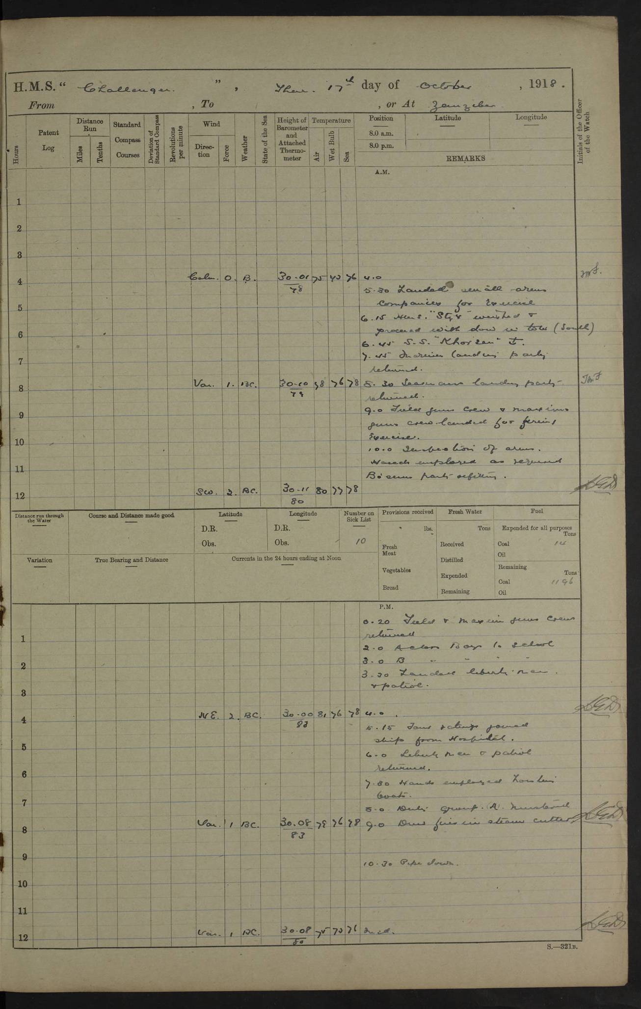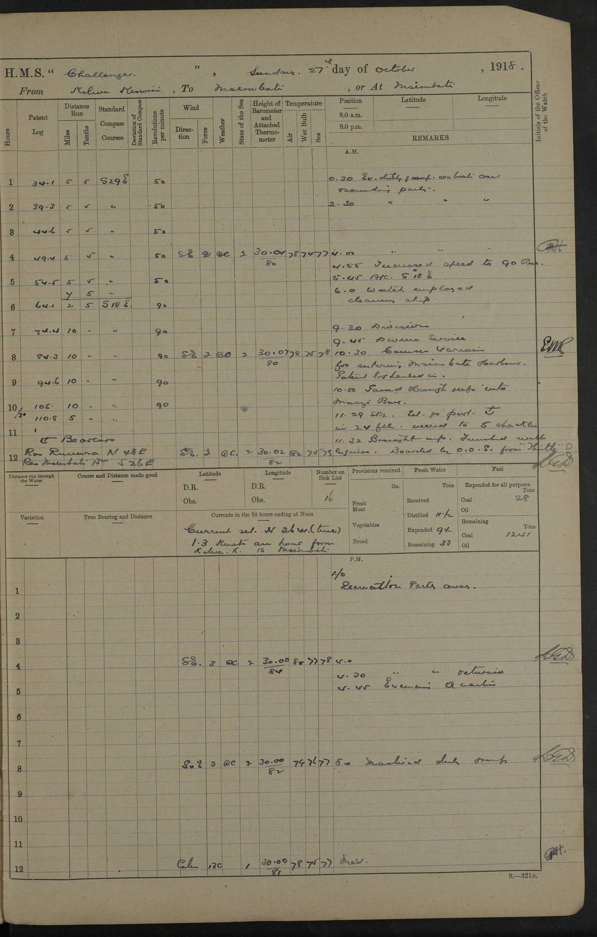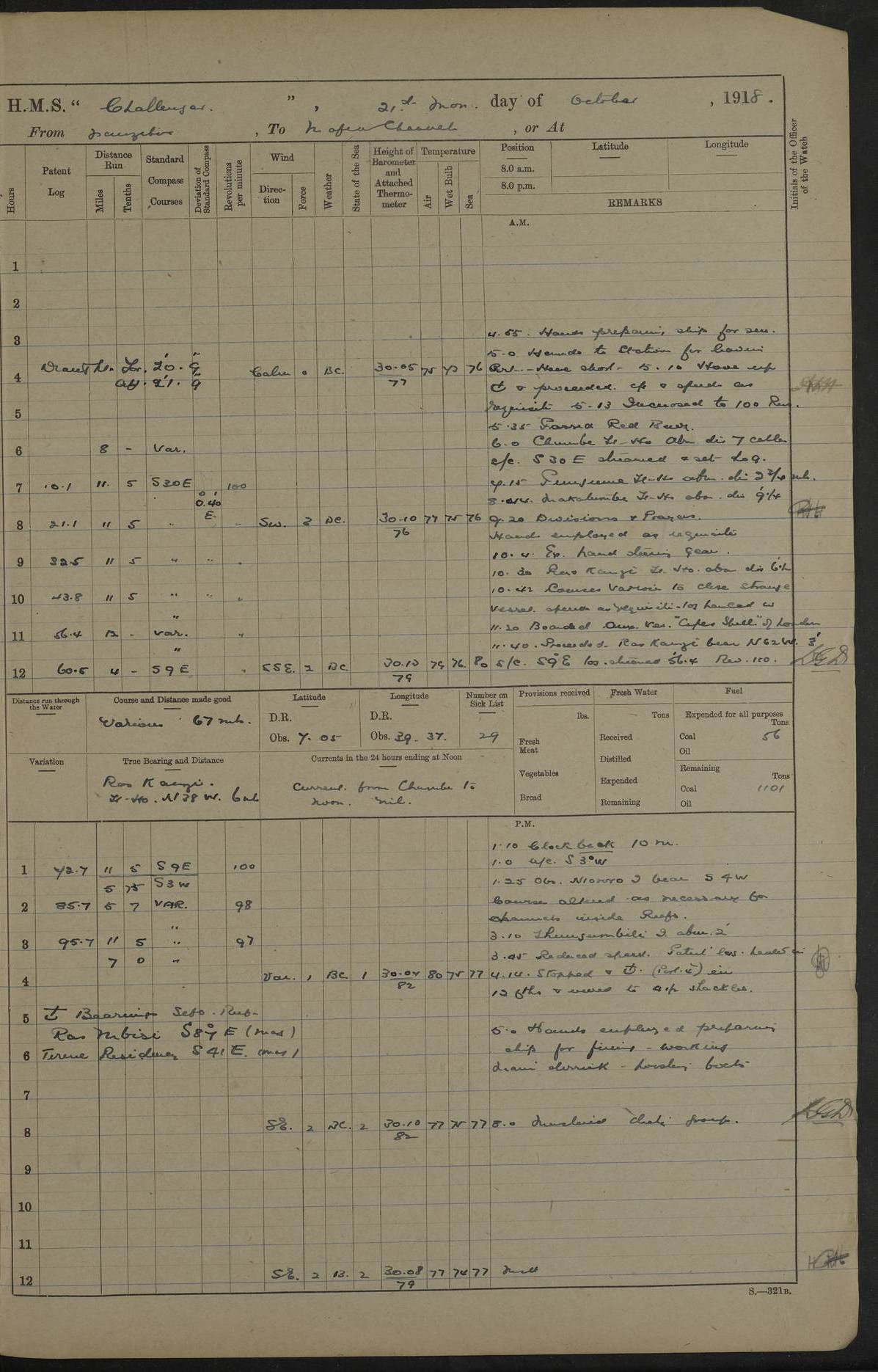 4caf8537cadfd3419700d530: (http://oldweather.s3.amazonaws.com/ADM53-37520/ADM53-37520-0088_0.jpg) 28 August 1916 Patrolling off Dar es Salaam to Zanzibar Position at Noon: Lat -6.60, Long 39.33 6 on sick list 12.15 to 12.50 am: Stopped off Sinda Island approximative position at 12.17 am: N.W. extremity Sinda Island S65W 9 cables. Challenger covering whalers Childers and Echo. Childers and Echo carrying out a reconnaissance in Mboamaji Harbour 5.15 am: Sighted H.M.S. Manica to N.N.W 5.40 am: Stopped. 5.40 am: Sighted H.M.S. Vengeance: N26W 5.55 am: Sighted H.M.S. Trent: S38E 6.0 am: Course and speed for closing entrance to Dar es Salaam Bay. 6.45 am: Action. 7.0 to 7.20 am: Challenger endeavoning to draw enemy's fire. 7.20 am: Vengeance (flag) and Challenger opened fire on enemy's position close to aquarium 7.40 am: Ceased firing. 8.0 am: Course and speed as requisite for patroling off Dar es Salaam. 8.0 am: Vengeance proceeded to Zanzibar. 6.15 am: North extreme Mbudya Island: N89W 6.5 miles 6.48 am: Outer Makatumbe Island Light House: S4W 4.1 miles 7.7 am: Outer Makatumbe Island Light House: S4E 1.9 miles 7.13 am: Outer Makatumbe Island Light House: S16W 1.3 miles 7.41 am: Outer Makatumbe Island Light House: S12E 2.7 miles 1.30 pm: Course as requisite for Zanzibar via Southern Pass. 2.6 pm: Chumbe Light House: N60E 1.2 miles 2.0 pm: Charon and Styx passed steering to Southward. 3.12 pm: Stopped. 3.16 pm: Came to with Starboard Bower in 13 1/2 fathoms (bottom mud) veered to 4 shackles. 5.0 pm: Collier S.S. Queen Alexandria secured alongside. 5.15 pm: Received one rating from R.N. Hospital and one rating from H.M.S. Vengeance.