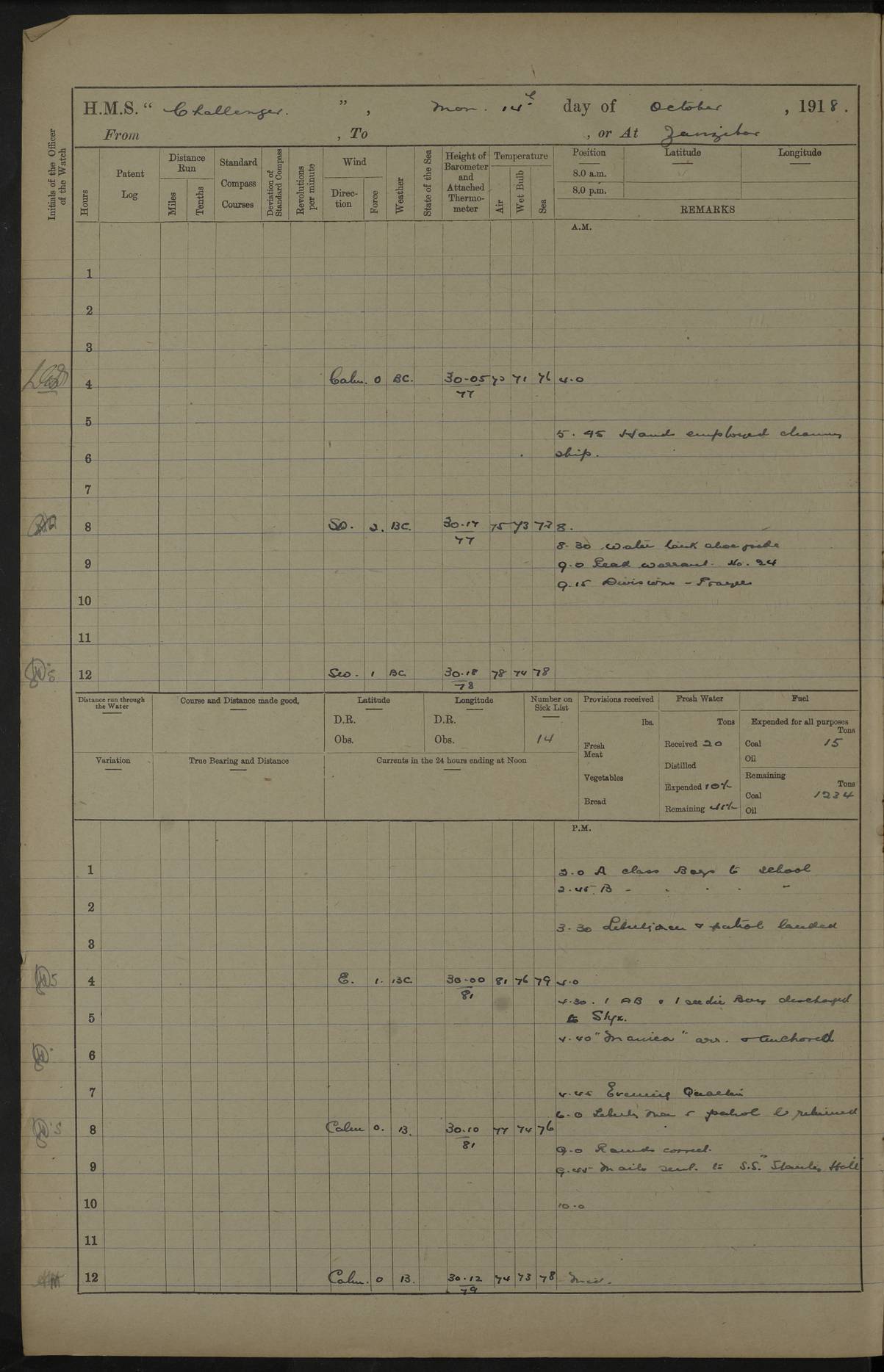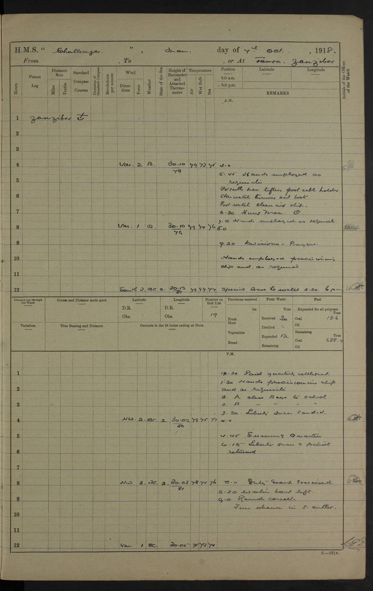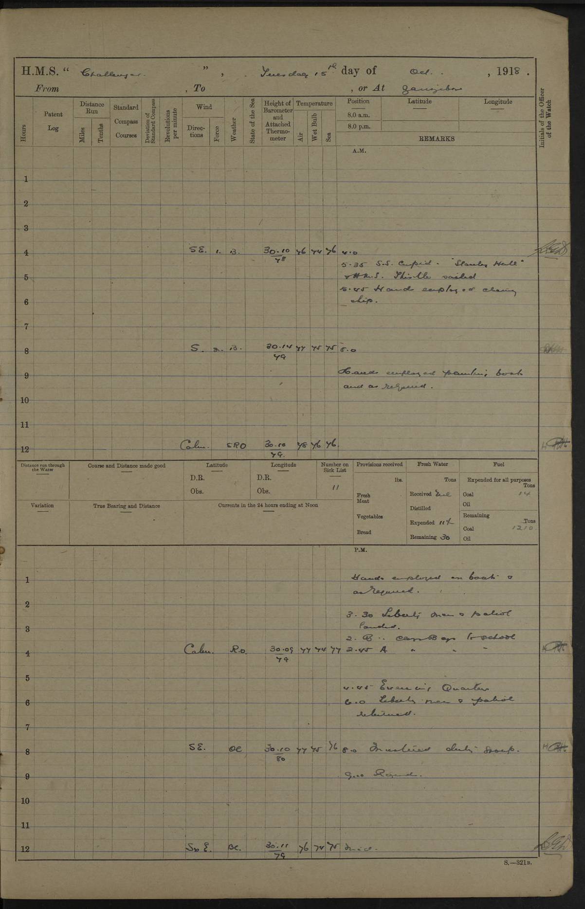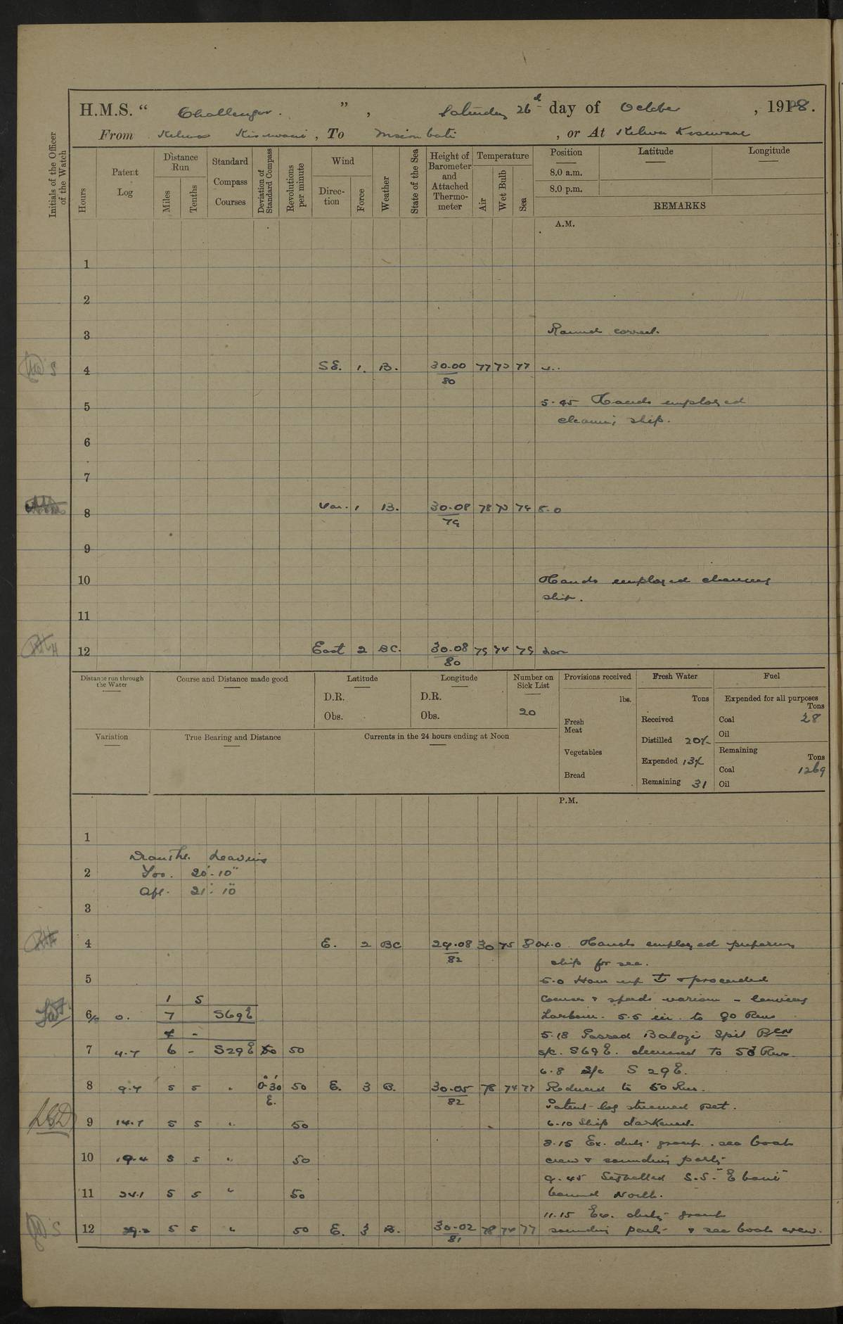 4caf8537cadfd3419700d530: (http://oldweather.s3.amazonaws.com/ADM53-37520/ADM53-37520-0088_0.jpg) 28 August 1916 Patrolling off Dar es Salaam to Zanzibar Position at Noon: Lat -6.60, Long 39.33 6 on sick list 12.15 to 12.50 am: Stopped off Sinda Island approximative position at 12.17 am: N.W. extremity Sinda Island S65W 9 cables. Challenger covering whalers Childers and Echo. Childers and Echo carrying out a reconnaissance in Mboamaji Harbour 5.15 am: Sighted H.M.S. Manica to N.N.W 5.40 am: Stopped. 5.40 am: Sighted H.M.S. Vengeance: N26W 5.55 am: Sighted H.M.S. Trent: S38E 6.0 am: Course and speed for closing entrance to Dar es Salaam Bay. 6.45 am: Action. 7.0 to 7.20 am: Challenger endeavoning to draw enemy's fire. 7.20 am: Vengeance (flag) and Challenger opened fire on enemy's position close to aquarium 7.40 am: Ceased firing. 8.0 am: Course and speed as requisite for patroling off Dar es Salaam. 8.0 am: Vengeance proceeded to Zanzibar. 6.15 am: North extreme Mbudya Island: N89W 6.5 miles 6.48 am: Outer Makatumbe Island Light House: S4W 4.1 miles 7.7 am: Outer Makatumbe Island Light House: S4E 1.9 miles 7.13 am: Outer Makatumbe Island Light House: S16W 1.3 miles 7.41 am: Outer Makatumbe Island Light House: S12E 2.7 miles 1.30 pm: Course as requisite for Zanzibar via Southern Pass. 2.6 pm: Chumbe Light House: N60E 1.2 miles 2.0 pm: Charon and Styx passed steering to Southward. 3.12 pm: Stopped. 3.16 pm: Came to with Starboard Bower in 13 1/2 fathoms (bottom mud) veered to 4 shackles. 5.0 pm: Collier S.S. Queen Alexandria secured alongside. 5.15 pm: Received one rating from R.N. Hospital and one rating from H.M.S. Vengeance.