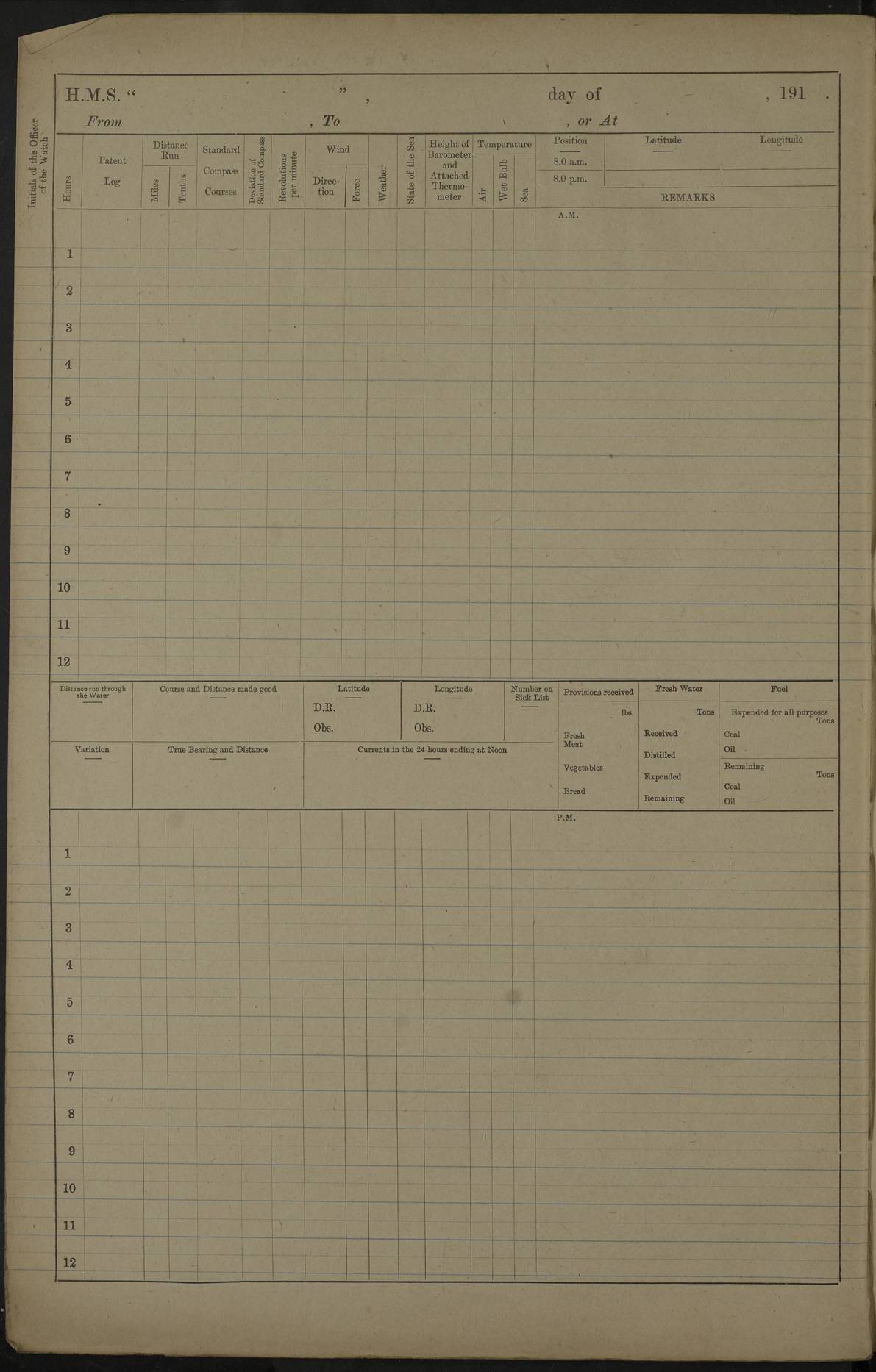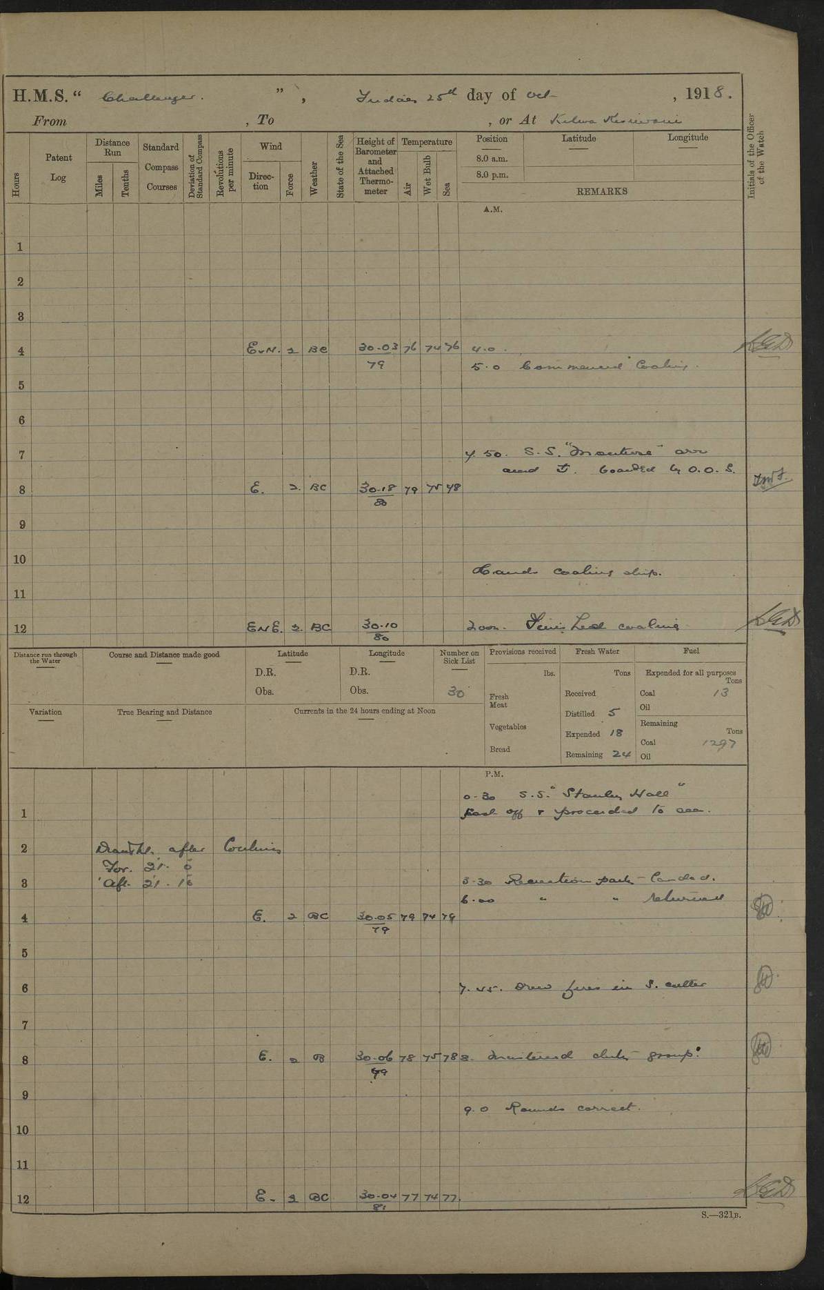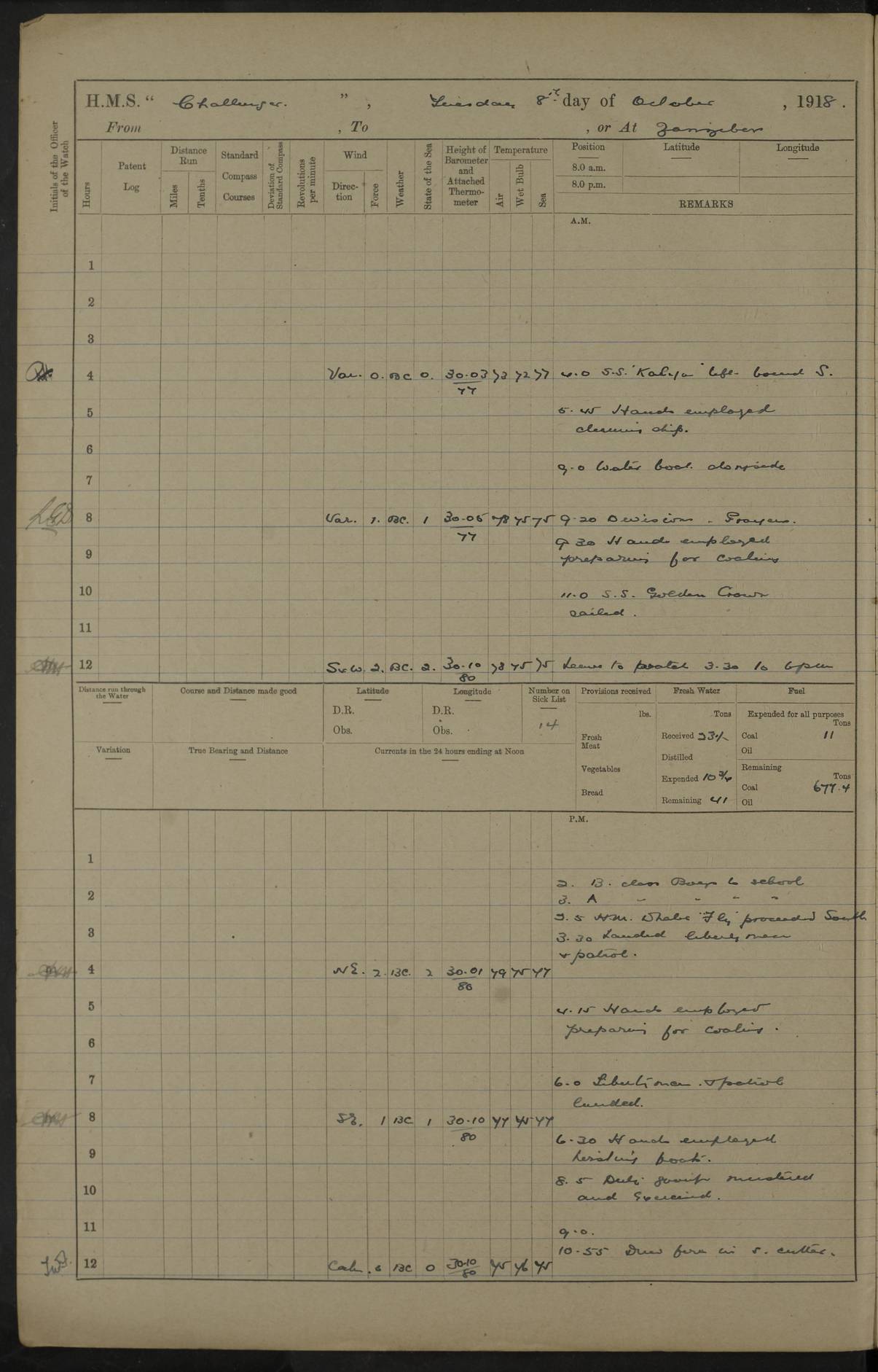 LOGS FOR JUNE 1916 4caf8536cadfd3419700d4ca: (http://oldweather.s3.amazonaws.com/ADM53-37520/ADM53-37520-0038_0.jpg) 4caf8536cadfd3419700d4cb: (http://oldweather.s3.amazonaws.com/ADM53-37520/ADM53-37520-0038_1.jpg) Cecil C Brooke Lieut Cmdr (N) signs log as Navigating Officer 4caf8536cadfd3419700d4cc: (http://oldweather.s3.amazonaws.com/ADM53-37520/ADM53-37520-0039_0.jpg) 4caf8536cadfd3419700d4cd: (http://oldweather.s3.amazonaws.com/ADM53-37520/ADM53-37520-0039_1.jpg) A C Sykes - Captain, signs log 4caf8536cadfd3419700d4ce: (http://oldweather.s3.amazonaws.com/ADM53-37520/ADM53-37520-0040_0.jpg) 4caf8536cadfd3419700d4cf: (http://oldweather.s3.amazonaws.com/ADM53-37520/ADM53-37520-0040_1.jpg) 1 June 1916 From Southern Patrol to Tirene, or at Tirene Lat -7.86, Long 39.67 2 on Sick list 7.30 am: Course as requisite for Tirene anchorage via South Mafia Channel between Sefo Reef and Saleni Bank 8.15 am: Ras Misimani: N9E 6.2 miles 8.48 am: Ras Kisimani Beacon: N83E 6 cables. 9.16 am: Ras Mbisi: N79E 7.9 miles 10.25 am: Came to with Port Bower in 9 fathoms (bottom sand and shell) veered to 4 shackled. 11.5 am: Weighed and proceeded alongside H.M.S. Laconia 11.25 am: Anchored with Port Bower veered as requisite 11.40 am: Secured alongside H.M.S. Laconia 2.15 pm: Received 5 ratings from H.M.S. Laconia 2.30 pm: Discharged 1 rating to H.M.S. Laconia. Sub Lieutenant J.W. Balls R.N.R. joined ship from H.M.S. Laconia. 3.0 pm: H.M.S. Salamander and Rattler arrived. 3.40 pm: Cast off from H.M.S. Laconia and proceeded to anchorage. 3.55 pm: Came to with Port Bower in 9 fathoms (bottom sand) veered to 4 1/2 shackles. 4caf8536cadfd3419700d4d0: (http://oldweather.s3.amazonaws.com/ADM53-37520/ADM53-37520-0041_0.jpg) 2 June 1916 From Tirene to Zanzibar, or at Sea Lat -6.8, Long 39.5 Position at Noon: Lat 6 47 S, 39 30 E 3 on sick list 5.40 am: H.M.S. Laconia sailed. 6.0 am: Weighed and proceeded. Course as requisite for proceeding to sea by North Mafia Channel 7.25 am: Collier S.S. Clifton Hall passed steaming to Southward. 6.37 am: Ras Mbisi: S81E 4.5 miles 7.36 am: Northern extreme Nioro Island 10.43 am: Ras Kanzi Light House: S83W 6.6 miles 1.50 pm: South extreme Pungume Island: N62E 3.2 miles 2.0 pm: Course as requisite for Zanzibar via Southern Pass. 2.56 pm: Chumbe Light House: N70E 7 cables. 4.40 pm: H.M.S. Vengeance (flag) sailed. 5.30 pm: Collier S.S. Barnesholme secured alongside. Lighter with stores for H.M.S. Manica left ship 4caf8536cadfd3419700d4d1: (http://oldweather.s3.amazonaws.com/ADM53-37520/ADM53-37520-0041_1.jpg) 3 June 1916 Zanzibar Lat -6.2, Long 39.2 3 on sick list 4.30 am: H.M.S. Manica: sailed. 5.45 am: Commenced coaling. 6.25 am: Native labour arrived. 9.30 am: Two seedie boys joined ship 1.20 pm: Discharged one rating to R.N. Hospital. 4.50 pm: Complete with coal received 715 tons. 5.15 pm: Collier cast off and anchored. 4caf8536cadfd3419700d4d2: (http://oldweather.s3.amazonaws.com/ADM53-37520/ADM53-37520-0042_0.jpg) 4 June 1916 From Zanzibar, to Dar es Salaam to Kilindini Lat -6.7, Long 39.5 Position at Noon: Lat -6.70, Long 39.51 Position at 8 pm: Lat -5.59, Lont 39.4 3 on sick list 5.5 am: H.M.S. Echo and Childers sailed to Northward. 5.50 am: Weighed and proceeded to sea via Southern Pass, 88 revolutions 6.40 am: Chumbe Light House: East 7 1/2 cables. 7.5 am: Passed Collier S.S. Clifton Hall steaming to Northward. 9.12 am: Course as requisite for entrance to Dar es Salaam Bay. 9.15 am: Hoisted flag of truce and signalled to enemy 9.40 am: Course and speed as requisite awaiting German motor boat. 10.45 am: Discharged 3 cases to German authorities for passage to British prisoners. 8.30 am: North extreme Mbudya Island: S57W 6.8 miles 9.40 am: Outer Makatumbe Island Light House: S3W 2.7 miles 10.30 am: Outer Makatumbe Is Light House: S8W 1.5 mile 10.55 am: Hauled down flag of truce. Sighted Portuguese Cruiser Adamastre steaming to southward 4.35 pm: Chuaka Head: S85W 8.3 miles 5.30 pm: Divine Service. 6.20 pm: Ras Nungwe Light: N61W 7.48 pm: Ras Nungwe Light: S58W 10.2 miles 10.0 pm: Petty Officer Second Class Henry Stevens O.N. 145138 died 4caf8536cadfd3419700d4d3: (http://oldweather.s3.amazonaws.com/ADM53-37520/ADM53-37520-0042_1.jpg) 5 June 1916 From Zanzibar to Kilindini, or at Kilindini Lat -4.96, Long 39.81 7 on sick list 12.3 am:Ras Kegomacha Light: N62E 20 miles 1.57 am: Ras Kegomacha Light: S57E 9.7 miles 6.45 am: Stopped and as requisite for Burial Service. 7.0 am: Committed to the deep the body of the late Petty Officer Second Class Henry Stevens O.N. 145138 Position of Burial: Lat -4.10, Long 39.73 7.10 am: Proceeded Course and speed as requisite for Kilindini Harbour. 8.0 am: Came to with Port Bower in 22 fathoms (bottom mud) veered to 5 shackles. 4caf8536cadfd3419700d4d4: (http://oldweather.s3.amazonaws.com/ADM53-37520/ADM53-37520-0043_0.jpg) 6 June 1916 Kilindini Lat -4.96, Long 39.81 7 on sick list 4caf8536cadfd3419700d4d5: (http://oldweather.s3.amazonaws.com/ADM53-37520/ADM53-37520-0043_1.jpg) 7 June 1916 Kilindini Lat -4.96, Long 39.81 5 on sick list 9.30 am: Received one seedie boy 4.45 pm: Read warrant No 114 Number on Sick List 5 4caf8536cadfd3419700d4d6: (http://oldweather.s3.amazonaws.com/ADM53-37520/ADM53-37520-0044_0.jpg) 8 June 1916 Kilindini Lat -4.96, Long 39.81 5 on sick list 3.45 pm: S.S. Professor sailed. 4caf8536cadfd3419700d4d7: (http://oldweather.s3.amazonaws.com/ADM53-37520/ADM53-37520-0044_1.jpg) 9 June 1916 From Kilindini to Kisiti Island and patrolling, or at Kisiti Island Position at 8 am: Lat -4.31, Long 39.65 Position at 8 pm: Lat -4.86, Long 39.49 5 on sick list 5.53 am: Proceeded. Course and speed as requisite for leaving harbour. 6.20 am: Passed S.S. Montrose entering Kilindini 6.35 am: Passed S.S. Logician entering Kilindini 6.35 am: Ras Serani Light House: N21W 3.2 miles 9.5 am: Southern extreme Chale Islet: N86W 4.8 miles 10.0 am: Sighted H.M.S. Hyacinth to Southward. 10.30 am: Course as requisite for anchorage N.E. of Kisiti Island vi
