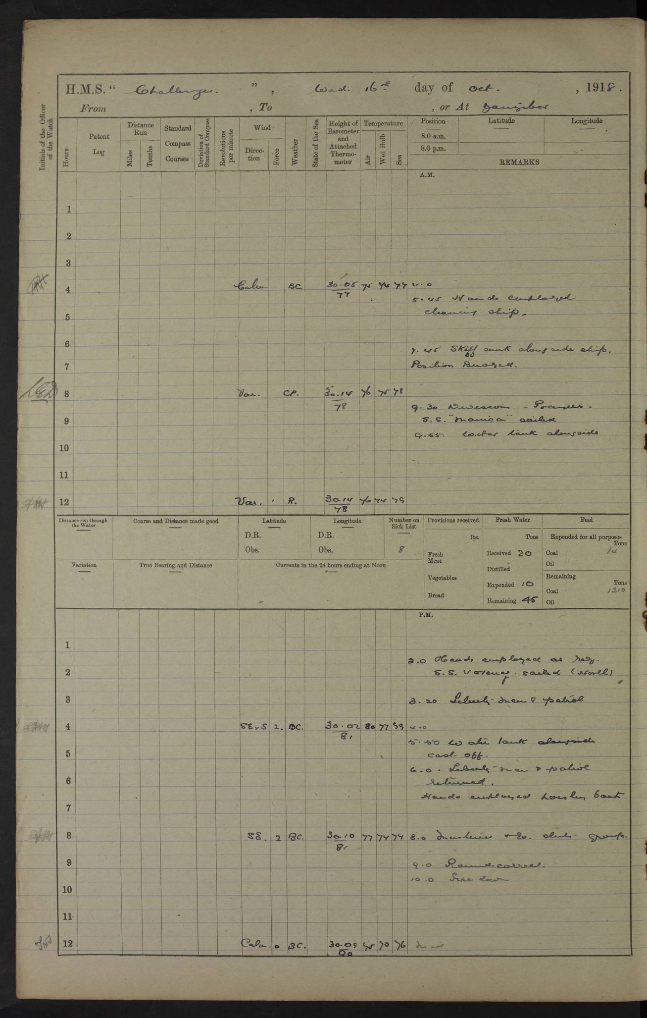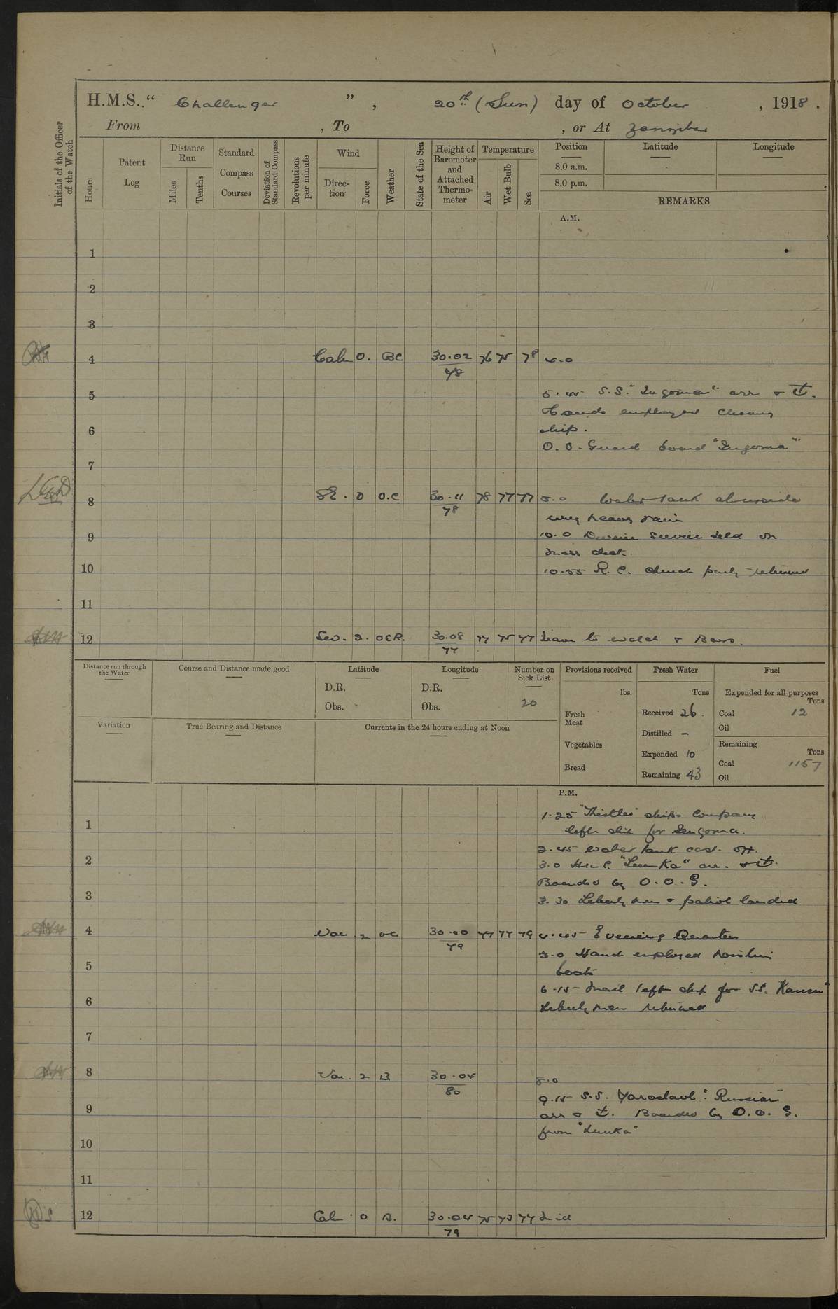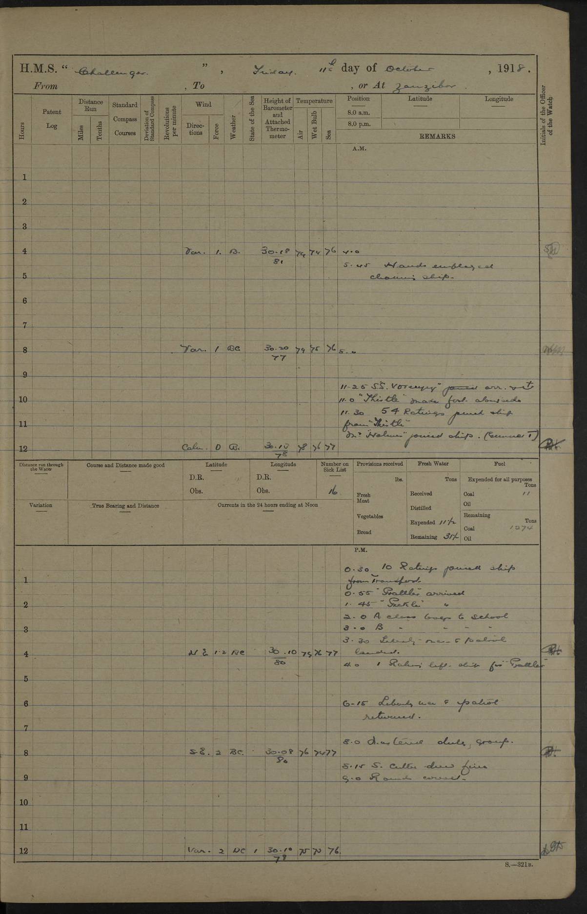 4caf8537cadfd3419700d56a: (http://oldweather.s3.amazonaws.com/ADM53-37520/ADM53-37520-0117_0.jpg) 16 October 1916 Dar es Salaam Lat -6.8, Long 39.3 9 on sick list 5.30 am: Landed R.M.A. for drill Aired Bedding. Working party in Pickle 7.40 am: R.M.A. returned with 12 pounder gun and field carriage and limber 8.14 am: Sailed Pickle 4.45 pm: Evening Quarters Returned 12 pounder gun, and not ammunition to Prattler 5.50 pm: Anchored Pickle 4caf8537cadfd3419700d56b: (http://oldweather.s3.amazonaws.com/ADM53-37520/ADM53-37520-0117_1.jpg) 17 October 1916 Dar es Salaam Lat -6.8, Long 39.3 6 on sick list 6.15 am: Sailed “S.S. Khosrow” 6.45 am: Sailed Pickle Working party employed in Pickle 1.30 pm: Sailed “S.S. Proffessor” 2.18 pm: Arrived "Mersey". 4caf8537cadfd3419700d56c: (http://oldweather.s3.amazonaws.com/ADM53-37520/ADM53-37520-0118_0.jpg) 18 October 1916 Dar es Salaam Lat -6.8, Long 39.3 6 on sick list 5.30 am: Returned 12 pounder 8 cwt gun to Prattler 8.0-0 am: Glasses and Signal Book correct 2 Ratings joined from Prattler. Navigating Party drawing buoys from dockyard. 9.25 am: Arrived “S.S. Pandua” 5.5 pm: 3 Ratings joined from Mersey for Trent 4caf8537cadfd3419700d56d: (http://oldweather.s3.amazonaws.com/ADM53-37520/ADM53-37520-0118_1.jpg) 19 October 1916 From Dar es Salaam to Zanzibar Position at Noon: Lat -6.41, Long 39.25 5 on sick list 6.20 am: Fly arrived and secured alongside 7.0 am: Unmoored. Prepared for sea. Weighed Port anchor 8.0-0 am: Glasses and Signal Book correct Tug Sir D. Hunter turning ship 8.25 am: Weighed proceeded as requisite out of Harbour 9.0 am: Came to Port anchor in 7 fathoms (bottom mud) veered 35 shackles 9.45 am: Weighed and proceeded as requisite 103 rev 12.40 pm: Altered course N40W and as requisite approaching Zanzibar Harbour via Southern Pass 12.50 pm: Chumbe Light House: N53E 1.05 mile 1.35 pm: Stopped. 1.38 pm: Came to Starboard anchor in 11 1/2 fathoms (bottom sand ans shell) veered 4 shackles 3.5 pm: Discharged 3 Ratings to "S.S. Ebani" Hospital Ship 4.0-0 pm: Furled all awnings. Prepared for coaling 5.0 pm: Collier came alongside. Rigged collier 4caf8537cadfd3419700d56e: (http://oldweather.s3.amazonaws.com/ADM53-37520/ADM53-37520-0119_0.jpg) 20 October 1916 Zanzibar Lat -6.2, Long 39.2 5 on sick list 5.35 am: Hands employed coaling ship 2.0 pm: Landed Working Party 2.30 pm: Finished coaling. Received 608 tons 3.35 pm: Collier slipped and anchored 3.20 pm: Arrived "Trent" 3.50 pm: 1 Rating joined from Trent 4caf8537cadfd3419700d56f: (http://oldweather.s3.amazonaws.com/ADM53-37520/ADM53-37520-0119_1.jpg) 21 October 1916 Zanzibar Lat -6.2, Long 39.2 5 on sick list 4.55 am: Sailed Salamander 3.52 pm: Arrived “Hyacinth” 4.30 pm: Read Warrant No 118 5.0 am: Sent Working Party 36 men to Trent. Discharged 1 Rating to Hyacinth. 3 Ratings joined ship from Hyacinth 10.50 Trent Working Party returned 4caf8538cadfd3419700d570: (http://oldweather.s3.amazonaws.com/ADM53-37520/ADM53-37520-0120_0.jpg) 22 October 1916 Zanzibar Lat -6.2, Long 39.2 3 on sick list 7.30 am: Landed RC Church party 9.10 am: RC Church party returned 9.20 am: Sailed “S.S. Persia” 10.10 am: Performed Divine Service. 4.45 pm: Evening Quarters Sent Working Party to Trent. 10.55 pm: Working Party returned. 4caf8538cadfd3419700d571: (http://oldweather.s3.amazonaws.com/ADM53-37520/ADM53-37520-0120_1.jpg) 23 October 1916 Zanzibar Lat -6.2, Long 39.2 2 on sick list 10.30 am: Arrived "S.S. Gaika". 4.30 pm: Evening Quarters 6 Ratings joined ship. 40 ZAR joined ship for passage to Mafia Island 10.15 pm: Discharged Lieutenant Commander Brooke to Trent. 4caf8538cadfd3419700d572: (http://oldweather.s3.amazonaws.com/ADM53-37520/ADM53-37520-0121_0.jpg) 24 October 1916 From Zanzibar to Dar es Salaam, to Tirene anchorage Position at 8 am: Lat -6.77, Long 39.39 Position at Noon: Lat -7.37, Long 39.69 3 on sick list 12.5 am: Weighed and proceeded as requisite out of Harbour by Southern Pass. 1.3 am: Chumbe Light bore East 0.7 mile 1.55 am: Chumbe Light: N22W 4.40 am: Altered course S78W and as requisite for entering Harbour. Reduced 72 revolutions 5.15 am: Stopped. 5.20 am: Came to Starboard Anchor in 7 1/2 fathoms (bottom mud) veered 3 shackles 6.0 am: Pickle alongside. Discharged Ratings to Severn - Ratings joined ship - Lieutenant Griffith (N) joined ship 7.20 am: Weighed and proceeded as requisite out of Harbour 105 Revolutions 9.45 Ras Kanzi: abeam 6.7 miles 12.40 Niororo Island: 180 degrees 7 1/2 miles Course as requisite for Tirene 1.23 pm: Niororo Island: abeam S75E 1.5 miles 2.0 pm: Sighted Mersey and Manica at Tirene 3.17 pm: Stopped and came to Port Anchor in 9 fathoms 2 shackles 3.45 pm: Landed detachment of Z.A.R. 5.45 pm: One rating joined from Mersey.