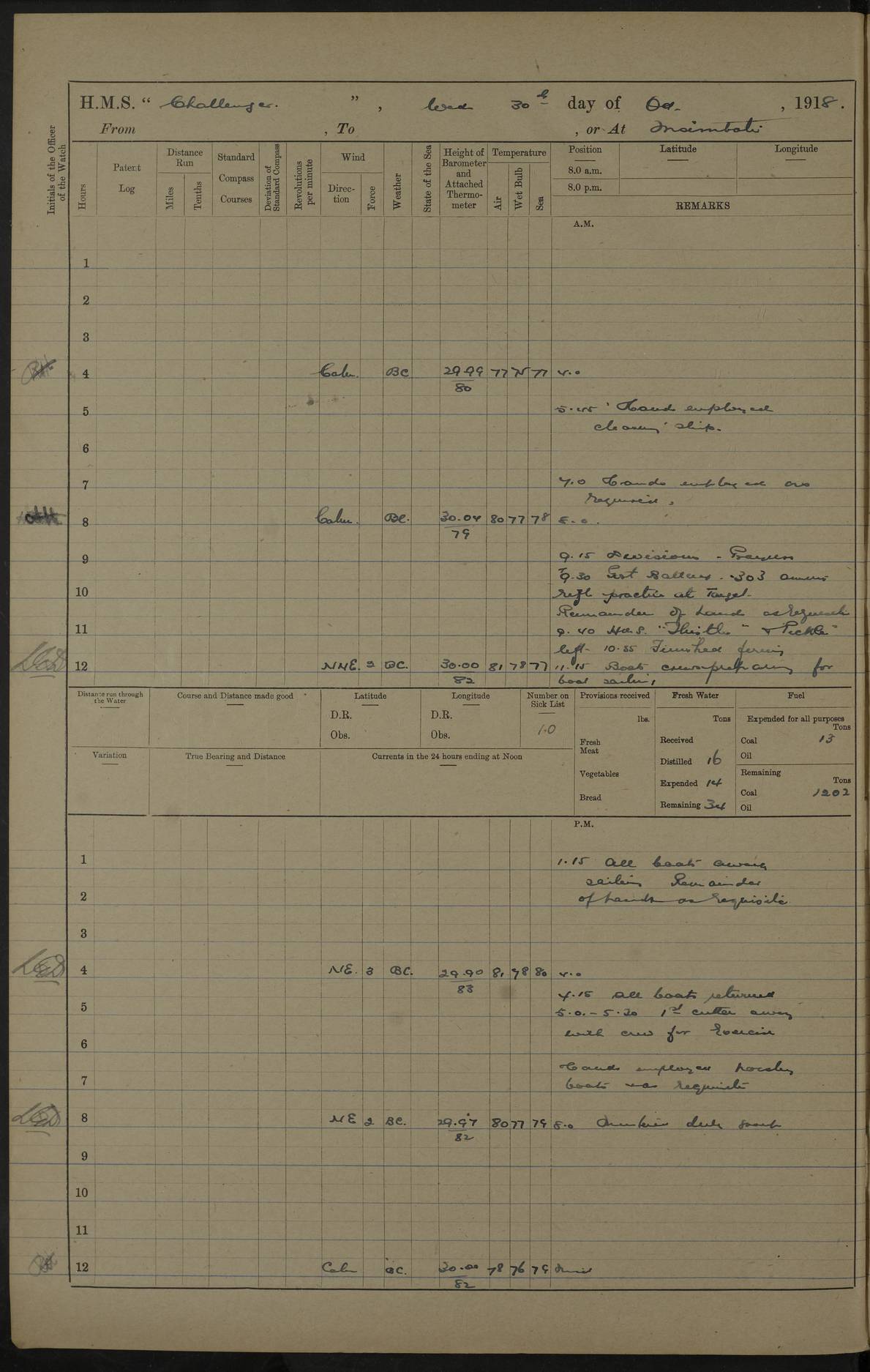 LOGS FOR DECEMBER 1916 4caf8538cadfd3419700d59d: (http://oldweather.s3.amazonaws.com/ADM53-37520/ADM53-37520-0141_1.jpg) Log signed by I Griffith , Lieut, Navigating Officer 4caf8538cadfd3419700d59e: (http://oldweather.s3.amazonaws.com/ADM53-37520/ADM53-37520-0142_0.jpg) 4caf8538cadfd3419700d59f: (http://oldweather.s3.amazonaws.com/ADM53-37520/ADM53-37520-0142_1.jpg) Log signed by AC Sykes, captain 4caf8538cadfd3419700d5a0: (http://oldweather.s3.amazonaws.com/ADM53-37520/ADM53-37520-0143_0.jpg) Error of barometer - 0.005 4caf8538cadfd3419700d5a1: (http://oldweather.s3.amazonaws.com/ADM53-37520/ADM53-37520-0143_1.jpg) 1 December 1916 Kilwa Kisiwani Lat -8.97, Long 39.55 3 on sick list 1.0 am: Burnt searchlights for 10 minutes 3.0 am: Burnt searchlights for 10 minutes 6.20 am: Rinaldo arrived. 11.0 am: Collier Burnholme arrived. Rinaldo alondside collier 12.40 pm: Hands received monthly payment 1.20 pm: First and second pinnace to Burnholme for stores 4.55 pm: Rinaldo sailed 5.20 pm: Collier Burnholme secured alongside. 4caf8538cadfd3419700d5a2: (http://oldweather.s3.amazonaws.com/ADM53-37520/ADM53-37520-0144_0.jpg) 2 December 1916 Kilwa Kisiwani Lat -8.97, Long 39.55 3 on sick list 5.0 am: Commended coaling 6.15 am: Dudu and beach party left ship 11.0 am: Finished coaling, received 402 tons 1.0 pm: Received stores for Challenger, Princess, Echo and Childers 4.0 pm: Burnholme cast off and proceeded out of harbour. 5.30 pm: Prepared Night Defence. Dudu, Doris and beach party returned. Dudu drew fires 10.45 pm: Brunt searchlight for half an hour. Dudu, Doris and beach party returned. 4caf8538cadfd3419700d5a3: (http://oldweather.s3.amazonaws.com/ADM53-37520/ADM53-37520-0144_1.jpg) 3 December 1916 Kilwa Kisiwani Lat -8.97, Long 39.55 4 on sick list 1.30 am: Burnt searchlight for 10 minutes 3.40 am: Burnt searchlight for 10 minutes 6 am: Doris, Dudu left ship with beach party 10.15 am: Divine Service 5.40 pm: Dudu returned and drew fires 6.0 pm: Doris and beach party returned 4caf8538cadfd3419700d5a4: (http://oldweather.s3.amazonaws.com/ADM53-37520/ADM53-37520-0145_0.jpg) 4 December 1916 Kilwa Kisiwani Lat -8.97, Long 39.55 5 on sick list 12.45 am: Burnt searchlight for 10 minutes 3.5 am: Burnt searchlight for 10 minutes 6 am: Doris, Dudu left ship with beach party 8.0 am: Steam Cutter armed left for Tonga Manara 11.40 am: Steam cutter returned 6.5 pm: Dudu returned and drew fires 6.30 pm: Doris and beach party returned 4caf8538cadfd3419700d5a5: (http://oldweather.s3.amazonaws.com/ADM53-37520/ADM53-37520-0145_1.jpg) 5 December 1916 Kilwa Kisiwani Lat -8.97, Long 39.55 5 on sick list 1.0 am: Burnt searchlights for 1/4 hour 3.30 am: Burnt searchlights for 1/4 hour 4.35 pm: Bechuana sailed 5.15 pm: Ingoma sailed 4caf8538cadfd3419700d5a6: (http://oldweather.s3.amazonaws.com/ADM53-37520/ADM53-37520-0146_0.jpg) 6 December 1916 Kilwa Kisiwani Lat -8.97, Long 39.55 6 on sick list 2.30 am: Burnt searchlight 3.30 am: Burnt searchlight 5.45 Cleaning ship Navigation party and diving party rigging boats and laying buoy 10.0 am: Exercised boats under oars and sail 5.40 pm: Huntscliff arrived. 4caf8538cadfd3419700d5a7: (http://oldweather.s3.amazonaws.com/ADM53-37520/ADM53-37520-0146_1.jpg) 7 December 1916 Kilwa Kisiwani Lat -8.97, Long 39.55 6 on sick list 12.55 am: Burnt searchlights for 10 minutes 1.30 am: Burnt searchlights for 10 minutes 9.0 am: Discharged one rating to shore 3.10 pm: Childers alongside received mails 5.5 pm: Childers and Styx proceeded to sea 4caf8538cadfd3419700d5a8: (http://oldweather.s3.amazonaws.com/ADM53-37520/ADM53-37520-0147_0.jpg) 8 December 1916 Kilwa Kisiwani Lat -8.97, Long 39.55 7 on sick list 2.0 am: Burnt searchlight 3.15 am: Burnt searchlight 6.15 am: Doris and Dudu left ship with beach party 4.45 pm: Discharged Mr. Williams acting mate to Barjora for passage 5.10 pm: Barjora sailed 6.15pm: Doris and Dudu returned with beach party 4caf8538cadfd3419700d5a9: (http://oldweather.s3.amazonaws.com/ADM53-37520/ADM53-37520-0147_1.jpg) 9 December 1916 Kilwa Kisiwani Lat -8.97, Long 39.55 8 on sick list 6.20 am: Doris and Dudu left ship with beach party 8.45 am: discharged one rating to Talbot outside Harbour. 11.20 am: Prattler alongside for water 11.30 am: Two cell prisoners joined from Talbot. 1.30 pm: Prattler cast off and sailed 5.0 pm: Dudu returned and drew fires 5.40 pm: Doris returned 4caf8538cadfd3419700d5aa: (http://oldweather.s3.amazonaws.com/ADM53-37520/ADM53-37520-0148_0.jpg) 10 December 1916 Kilwa Kisiwani Lat -8.97, Long 39.55 10 on sick list 7.0 am: Dudu and Doris left with beach party 10.05 am: Divine Service 3.20 Dhow K2 arrived. 4.0 pm: Pickle alongside received provisions 5.15 pm: Pickle proceeded. 5.30 pm: Dudu returned 4caf8538cadfd3419700d5ab: (http://oldweather.s3.amazonaws.com/ADM53-37520/ADM53-37520-0148_1.jpg) 11 December 1916 Kilwa Kisiwani Lat -8.97, Long 39.55 10 on sick list 6 am: Doris and beach party left ship 8.15 am: Glen Cluny arrived. Received 3 bags of mails. 6.0 pm: Doris and beach party returned 4caf8538cadfd3419700d5ac: (http://oldweather.s3.amazonaws.com/ADM53-37520/ADM53-37520-0149_0.jpg) 12 December 1916 Kilwa Kisiwani Lat -8.97, Long 39.55 11 on sick list 6.50 am: Doris, Dudu and beach party left ship 12.50 pm: Glen Cluny sailed 1.5 pm: Dudu returned 6.20 pm: Beach party returned 4caf8538cadfd3419700d5ad: (http://oldweather.s3.amazonaws.com/ADM53-37520/ADM53-37520-0149_1.jpg) 13 December 1916 Kilwa Kisiwani Lat -8.97, Long 39.55 12 on sick list 7.30 am: Montrose arrived 8.10 am: Dudu and beach party left ship 6.30 pm: Dudu returned and drew fires and beach party returned. 4caf8538cadfd3419700d5ae: (http://oldweather.s3.amazonaws.com/ADM53-37520/ADM53-37520-0150_0.jpg) 14 December 1916 Firing off Kilwa Kisiwani Lat -8.97, Long 39.55 13 on sick list 5.55 am: Weighed and proceeded. Course and speed as requisite out of Harbour 6.30 am: Cleared Harbour. Course S40E 7 knots 7.15 am: Sighted whalers 8.0 am: Stopped. Whaler took target in tow 8.