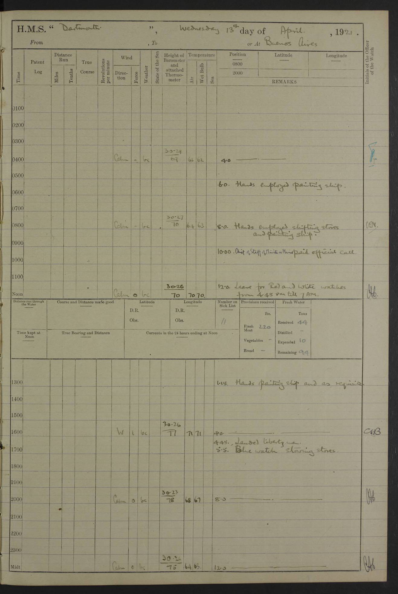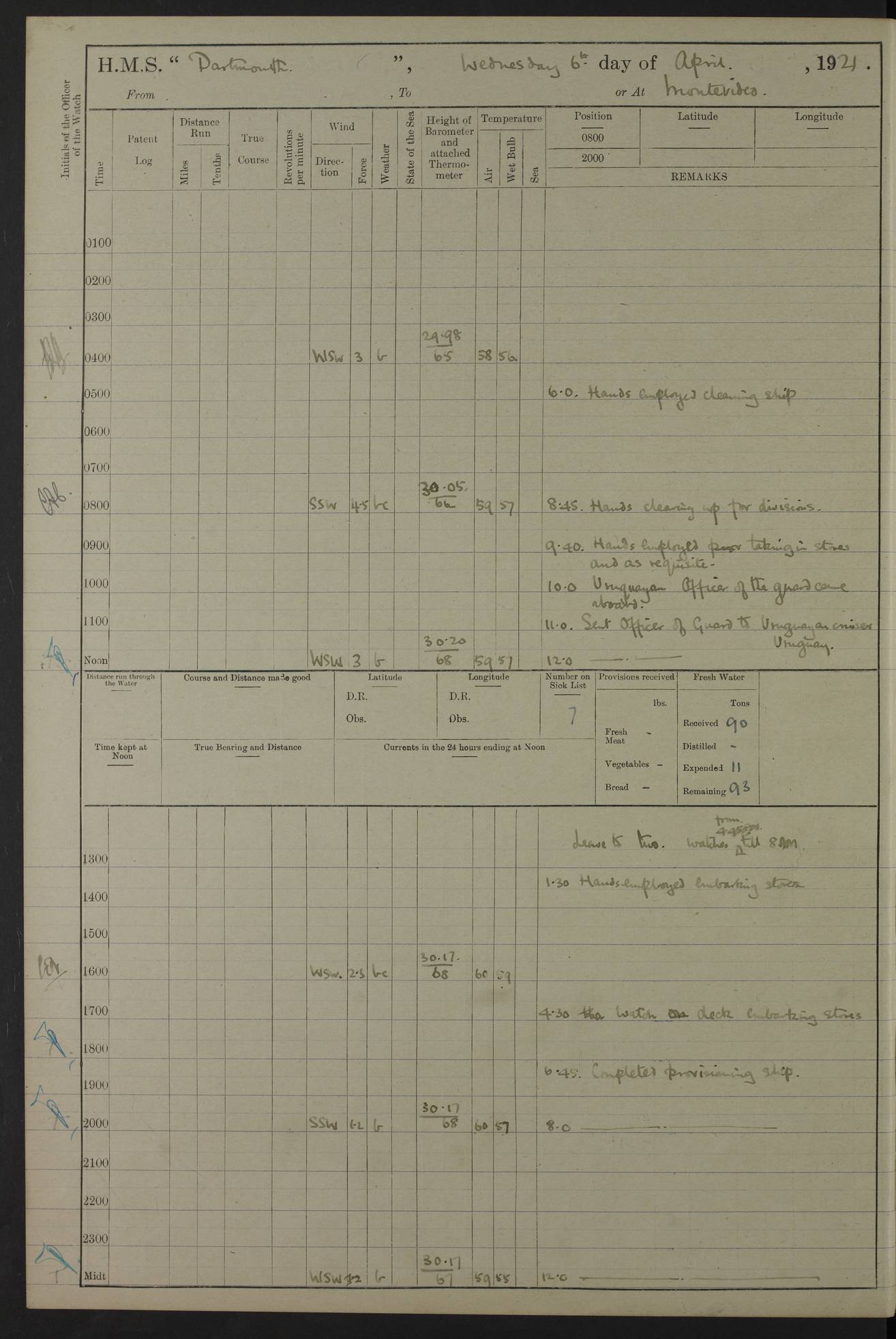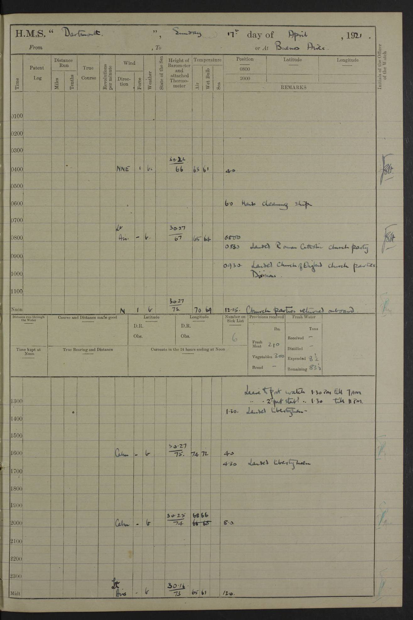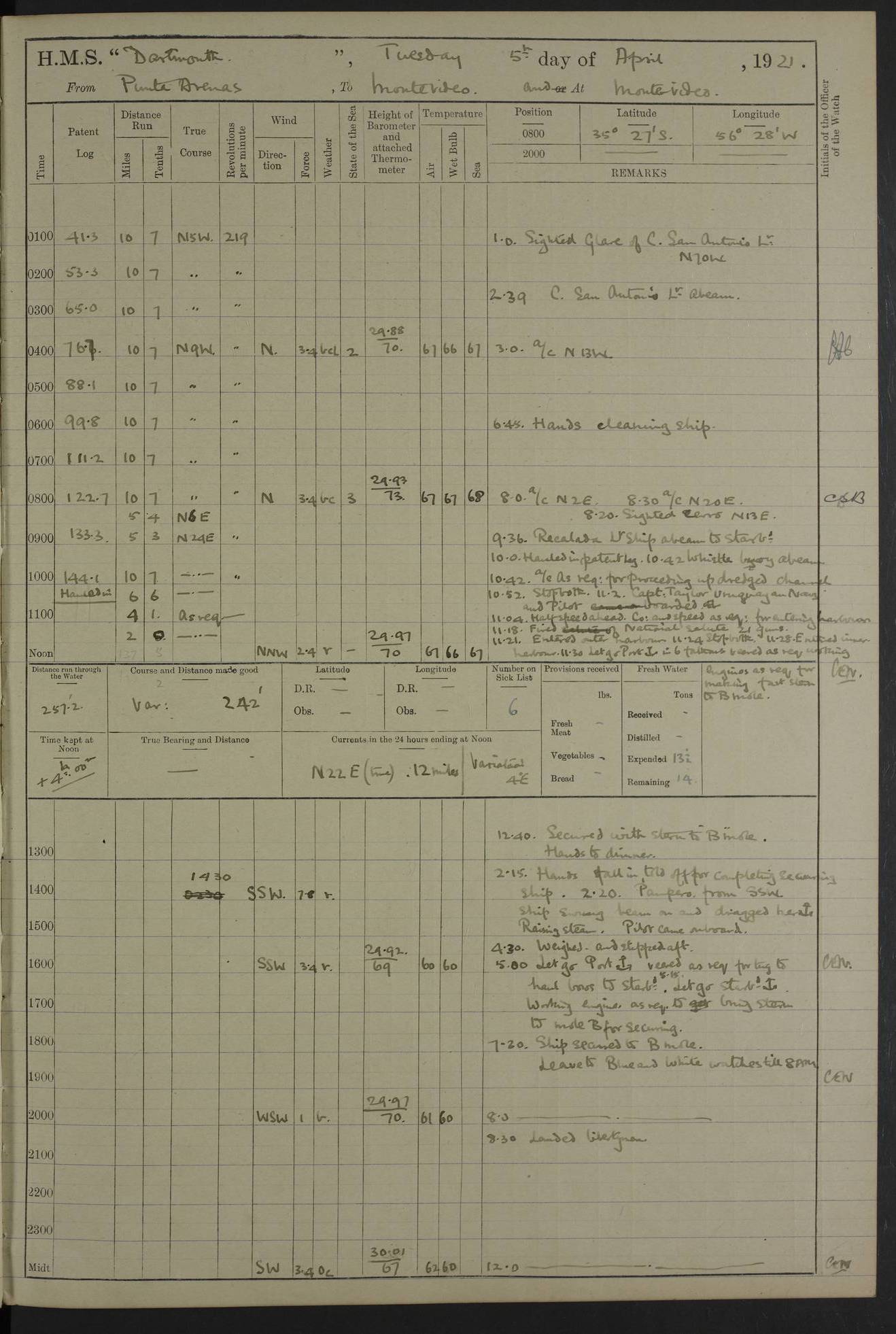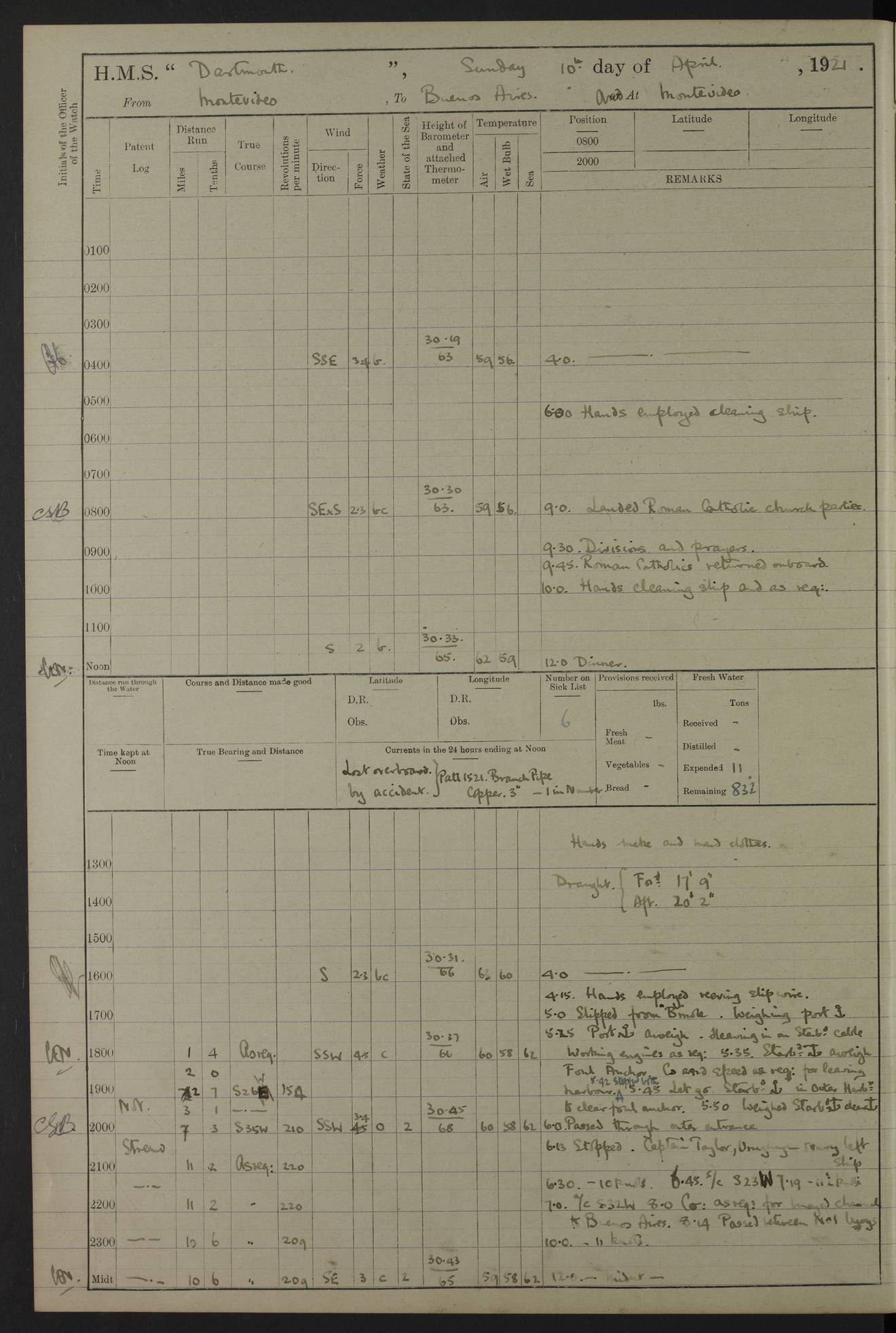 4caf861dcadfd34197013d59: (http://oldweather.s3.amazonaws.com/ADM53-39530/ADM 53-39530-003_1.jpg) 1 April 1920 Buenos Aires Lat -34.59, Long -58.36 5.40am: Hands cleaning ship & rigging stages 6.40am: Hands painting ship 10.00am: Officer of the Guard visited Minister of Marine 4.15pm: Read warrant no 84 6.50pm: Landed concert party 11.20pm: Concert party returned Number on sick list 5 4caf861dcadfd34197013d5a: (http://oldweather.s3.amazonaws.com/ADM53-39530/ADM 53-39530-004_0.jpg) 2 April 1920 Buenos Aires Lat -34.59, Long -58.36 9.45am: Divine Service performed. [Good Friday] 11.00am: Hands to muster for quarterly settlement 1.30pm: Landed libertymen 4.20pm: Landed libertymen & picnic party 10.00pm: Libertymen returned Number on sick list 7 4caf861dcadfd34197013d5b: (http://oldweather.s3.amazonaws.com/ADM53-39530/ADM 53-39530-004_1.jpg) 3 April 1920 Buenos Aires Lat -34.59, Long -58.36 12.05pm: Landed cricket & picnic parties 1.30pm: Gave leave to watch till 12pmLanded libertymen. Hands make & mend clothes 4.30pm: Landed libertymen Midnight: Libertymen returned Number on sick list 8 4caf861dcadfd34197013d5c: (http://oldweather.s3.amazonaws.com/ADM53-39530/ADM 53-39530-005_0.jpg) 4 April 1920 Buenos Aires Lat -34.59, Long -58.36 9.20am: Landed Roman Catholic Church party 10.15am: Divine Service performed 11.00am: Roman Catholic Church party returned 1.30pm: Gave leave to watch till 11pm. Landed libertymen 11.00pm: Libertymen returned Number on sick list 6 4caf861dcadfd34197013d5d: (http://oldweather.s3.amazonaws.com/ADM53-39530/ADM 53-39530-005_1.jpg) 5 April 1920 Buenos Aires Lat -34.59, Long -58.36 5.40am: Seamanship training class ranging cable. Remainder of hands cleaning ship 11.30am: Lost by accident: 1 paint brush 12.45pm: Landed picnic party 2.00pm: Ship open to visitors 4.00pm: Gave leave to watch till 11.15pm 5.00pm: Read warrant no 85 Number on sick list 4 4caf861dcadfd34197013d5e: (http://oldweather.s3.amazonaws.com/ADM53-39530/ADM 53-39530-006_0.jpg) 6 April 1920 Buenos Aires Lat -34.59, Long -58.36 5.40am: Cable & side parties as requisite. Remainder of hands cleaning ship 9.20am: Gunnery & seamanship training classes to instruction 12.45pm: Landed picnic party 1.30pm: Gunner’s & side parties as requisite. Party surveying cable 4.45pm: Gave leave to watch till 12.30am Number on sick list 5 4caf861dcadfd34197013d5f: (http://oldweather.s3.amazonaws.com/ADM53-39530/ADM 53-39530-006_1.jpg) 7 April 1920 Buenos Aires Lat -34.59, Long -58.36 12.30am: Libertymen returned on board 5.40am: Put into jetty & lowered 1st cutter 6.00am: Cable party on foc’sle. Remainder cleaning ship 8.30am: Gunner’s & side parties as requisite. Gunnery training class under instruction 10.00am: Finished surveying cable 12.45pm: Landed picnic party Number on sick list 5 4caf861dcadfd34197013d60: (http://oldweather.s3.amazonaws.com/ADM53-39530/ADM 53-39530-007_0.jpg) 8 April 1920 Buenos Aires Lat -34.59, Long -58.36 Number on sick list 4 4caf861dcadfd34197013d61: (http://oldweather.s3.amazonaws.com/ADM53-39530/ADM 53-39530-007_1.jpg) 9 April 1920 Buenos Aires Lat -34.59, Long -58.36 8.10am: Landed picnic party Number on sick list 4 4caf861dcadfd34197013d62: (http://oldweather.s3.amazonaws.com/ADM53-39530/ADM 53-39530-008_0.jpg) 10 April 1920 Buenos Aires Lat -34.59, Long -58.36 8.30am: Landed picnic party 1.00pm: Hands make & mend clothes Number on sick list 4 4caf861dcadfd34197013d63: (http://oldweather.s3.amazonaws.com/ADM53-39530/ADM 53-39530-008_1.jpg) 11 April 1920 Buenos Aires Lat -34.59, Long -58.36 5.40am: Hauled ship alongside jetty & hoisted 1st cutter 7.20am: 7 ratings left ship for HMS “Yarmouth” 10.00am: Landed Roman Catholic Church parties 11.00am: Roman Catholic Church party returned 11.30am: Church of England Church party landed 12.40pm: Church of England Church party returned Number on sick list 7 4caf861dcadfd34197013d64: (http://oldweather.s3.amazonaws.com/ADM53-39530/ADM 53-39530-009_0.jpg) 12 April 1920 Buenos Aires to Montevideo Lat -35.00, Long -57.17 5.30am: Hands preparing to leave wall 6.15am: Let go all hawsers. Weighed & proceeded in tow of tugs 8.00am: Course as requisite for buoyed channel 8.05am: Dropped pilot 10.30am: Training classes to instruction. Boys to school. Remainder employed in parts of ship 3.35pm: Sighted El Cerro [Fort] N95E 4.25pm: No 2 buoy abeam 6.00pm: Stopped to pick up pilot 6.35pm: Anchored 6.50pm: Middled on swivel 7.25pm: Mr Craddock, Warrant Engineer, joined ship 10.30pm: 6 ratings joined ship from HMS “Southampton” Number on sick list 8 [Middled on swivel is a technique of anchoring.