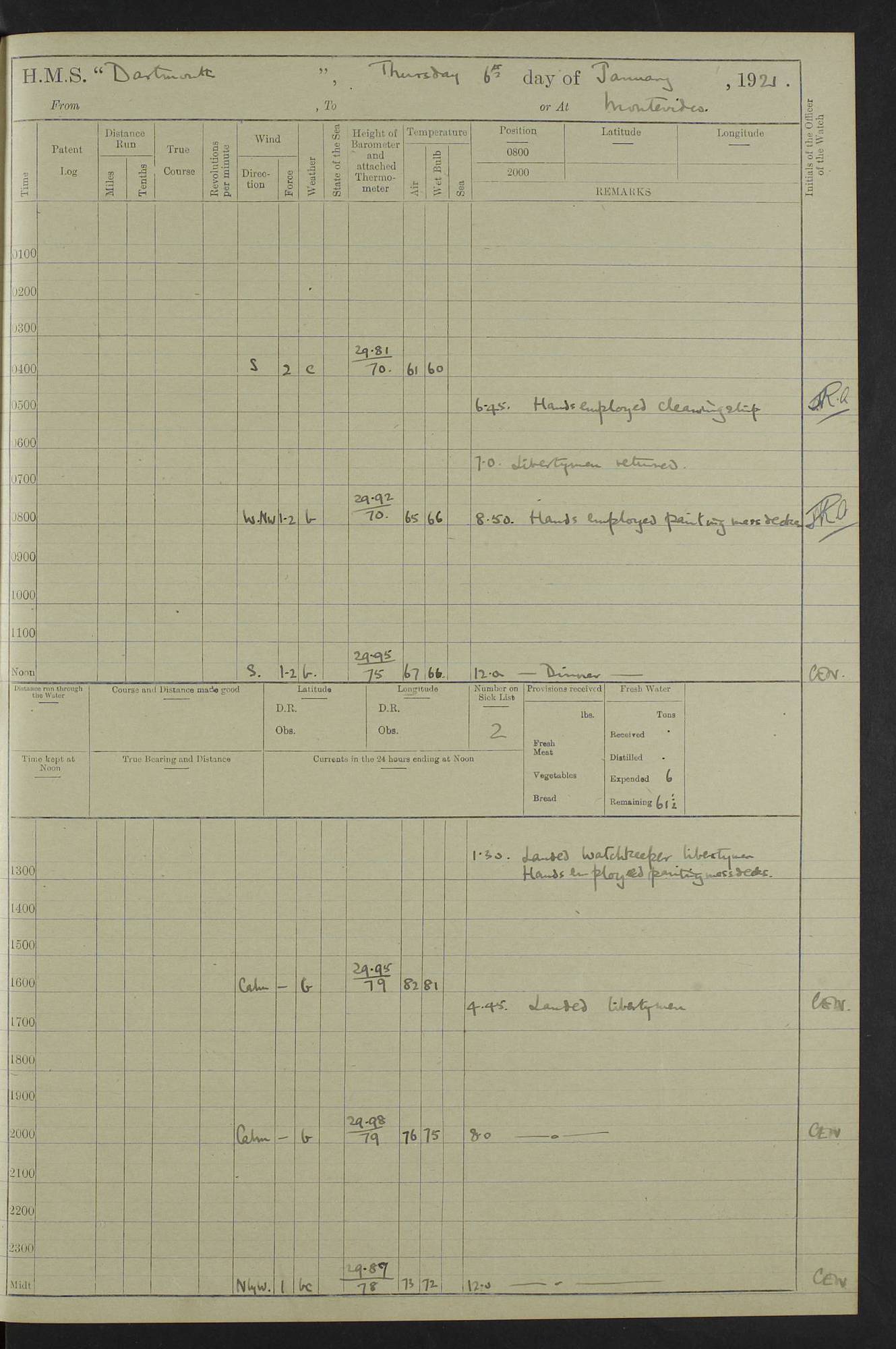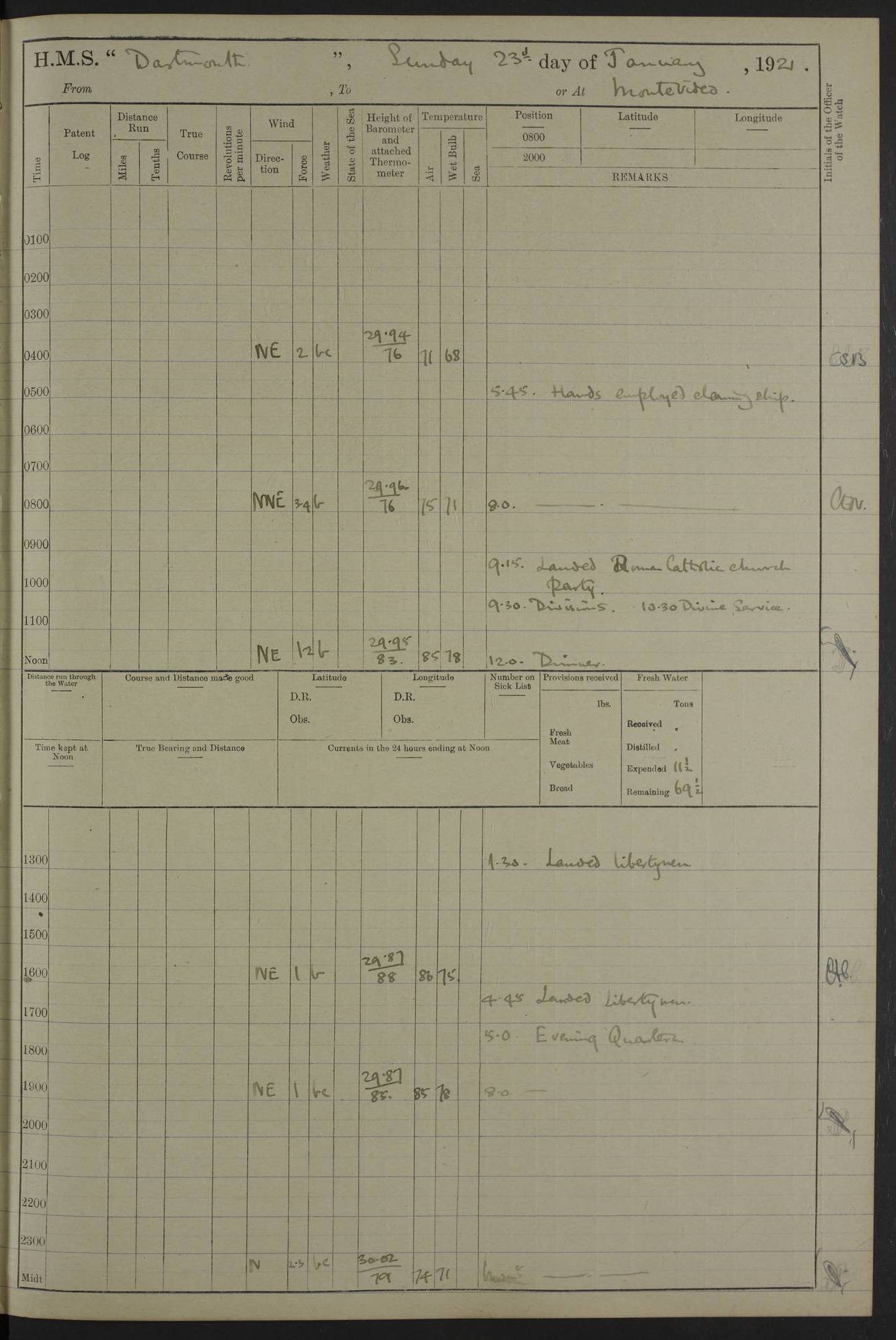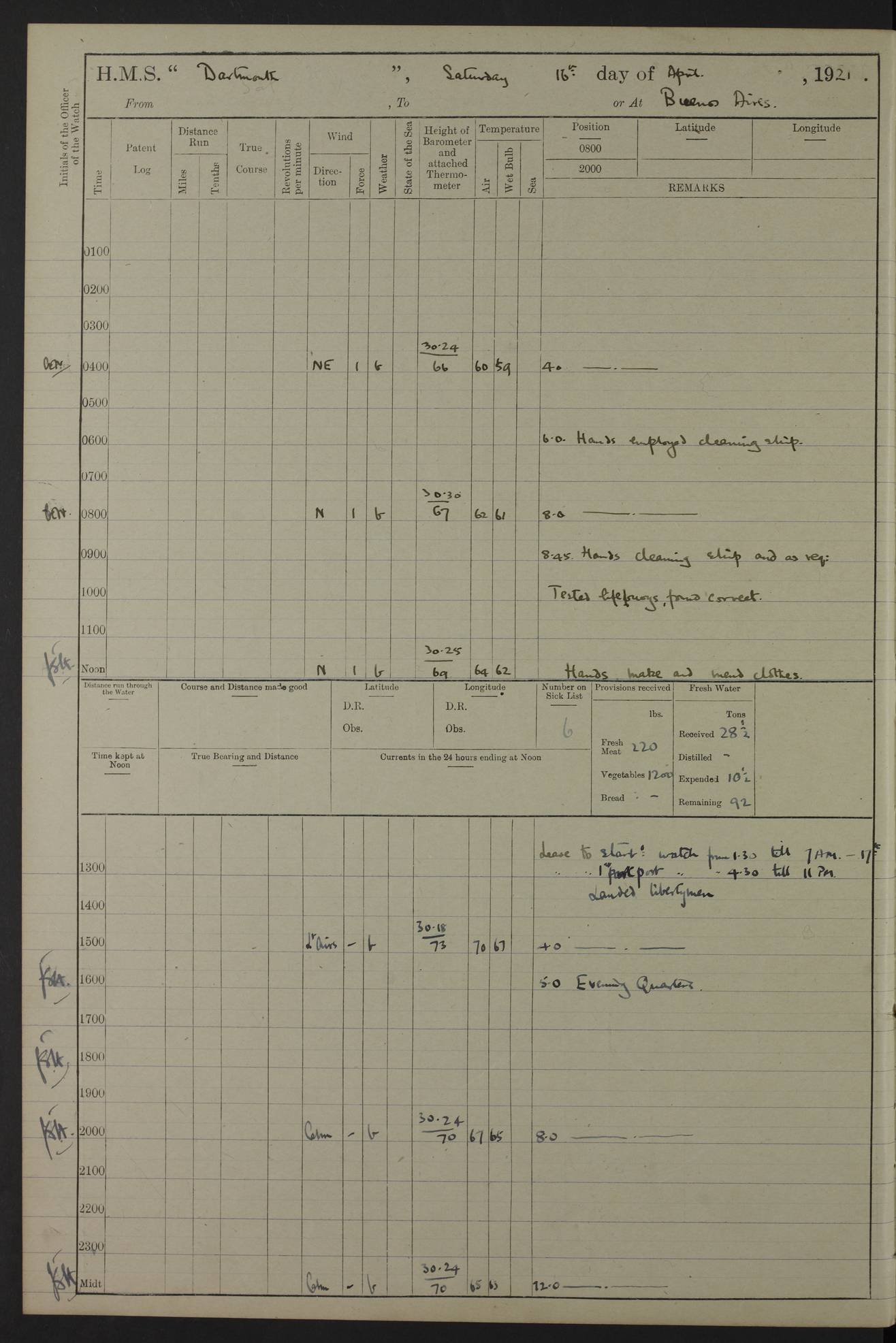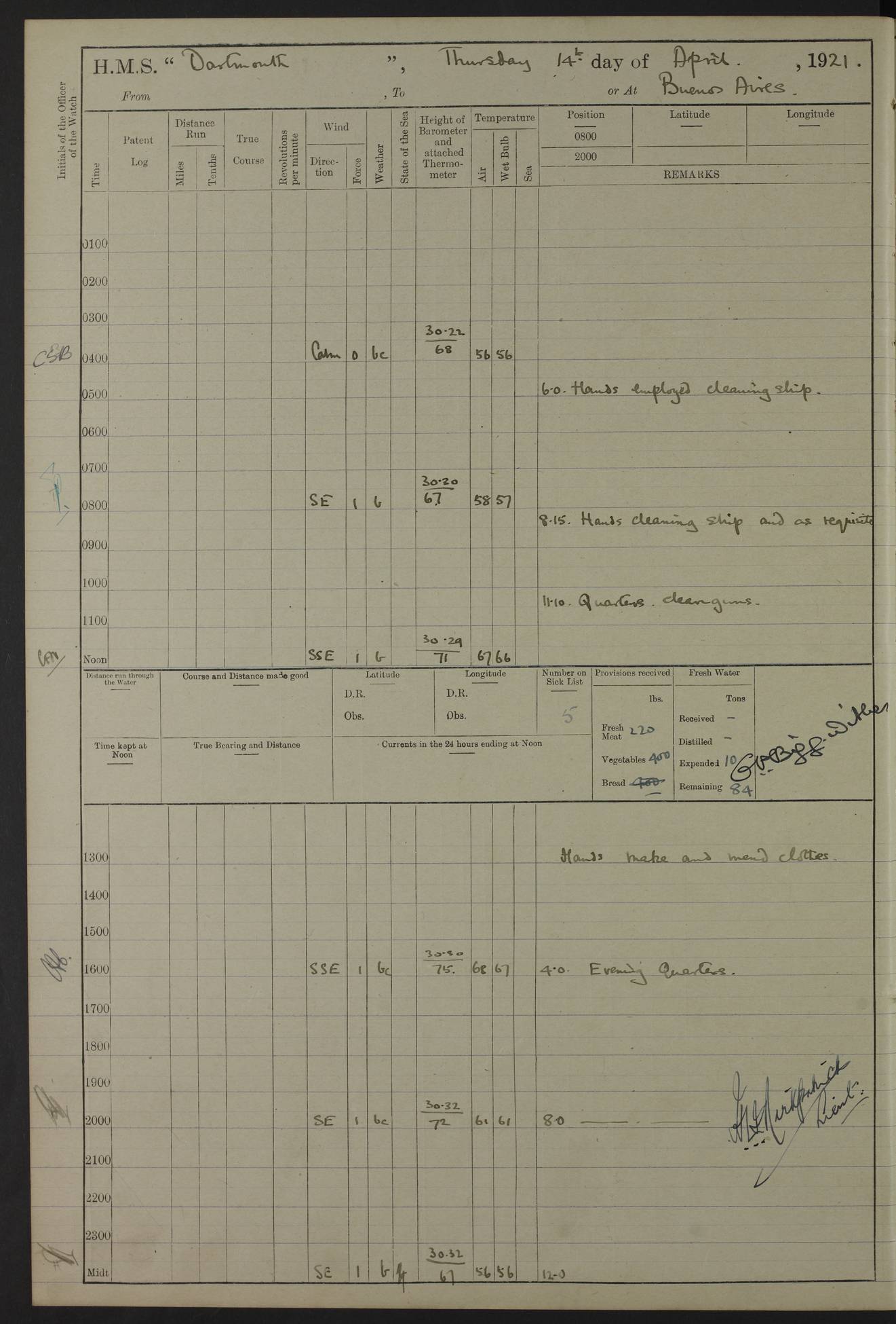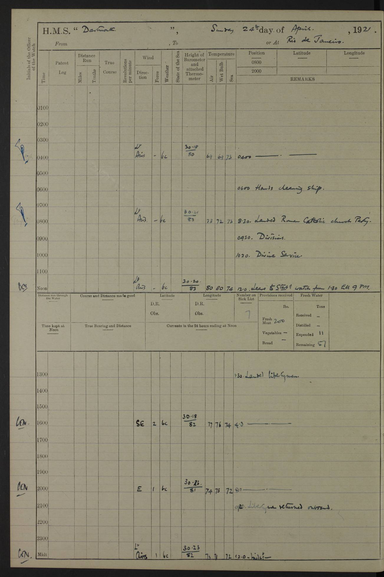 4caf861dcadfd34197013d59: (http://oldweather.s3.amazonaws.com/ADM53-39530/ADM 53-39530-003_1.jpg) 1 April 1920 Buenos Aires Lat -34.59, Long -58.36 5.40am: Hands cleaning ship & rigging stages 6.40am: Hands painting ship 10.00am: Officer of the Guard visited Minister of Marine 4.15pm: Read warrant no 84 6.50pm: Landed concert party 11.20pm: Concert party returned Number on sick list 5 4caf861dcadfd34197013d5a: (http://oldweather.s3.amazonaws.com/ADM53-39530/ADM 53-39530-004_0.jpg) 2 April 1920 Buenos Aires Lat -34.59, Long -58.36 9.45am: Divine Service performed. [Good Friday] 11.00am: Hands to muster for quarterly settlement 1.30pm: Landed libertymen 4.20pm: Landed libertymen & picnic party 10.00pm: Libertymen returned Number on sick list 7 4caf861dcadfd34197013d5b: (http://oldweather.s3.amazonaws.com/ADM53-39530/ADM 53-39530-004_1.jpg) 3 April 1920 Buenos Aires Lat -34.59, Long -58.36 12.05pm: Landed cricket & picnic parties 1.30pm: Gave leave to watch till 12pmLanded libertymen. Hands make & mend clothes 4.30pm: Landed libertymen Midnight: Libertymen returned Number on sick list 8 4caf861dcadfd34197013d5c: (http://oldweather.s3.amazonaws.com/ADM53-39530/ADM 53-39530-005_0.jpg) 4 April 1920 Buenos Aires Lat -34.59, Long -58.36 9.20am: Landed Roman Catholic Church party 10.15am: Divine Service performed 11.00am: Roman Catholic Church party returned 1.30pm: Gave leave to watch till 11pm. Landed libertymen 11.00pm: Libertymen returned Number on sick list 6 4caf861dcadfd34197013d5d: (http://oldweather.s3.amazonaws.com/ADM53-39530/ADM 53-39530-005_1.jpg) 5 April 1920 Buenos Aires Lat -34.59, Long -58.36 5.40am: Seamanship training class ranging cable. Remainder of hands cleaning ship 11.30am: Lost by accident: 1 paint brush 12.45pm: Landed picnic party 2.00pm: Ship open to visitors 4.00pm: Gave leave to watch till 11.15pm 5.00pm: Read warrant no 85 Number on sick list 4 4caf861dcadfd34197013d5e: (http://oldweather.s3.amazonaws.com/ADM53-39530/ADM 53-39530-006_0.jpg) 6 April 1920 Buenos Aires Lat -34.59, Long -58.36 5.40am: Cable & side parties as requisite. Remainder of hands cleaning ship 9.20am: Gunnery & seamanship training classes to instruction 12.45pm: Landed picnic party 1.30pm: Gunner’s & side parties as requisite. Party surveying cable 4.45pm: Gave leave to watch till 12.30am Number on sick list 5 4caf861dcadfd34197013d5f: (http://oldweather.s3.amazonaws.com/ADM53-39530/ADM 53-39530-006_1.jpg) 7 April 1920 Buenos Aires Lat -34.59, Long -58.36 12.30am: Libertymen returned on board 5.40am: Put into jetty & lowered 1st cutter 6.00am: Cable party on foc’sle. Remainder cleaning ship 8.30am: Gunner’s & side parties as requisite. Gunnery training class under instruction 10.00am: Finished surveying cable 12.45pm: Landed picnic party Number on sick list 5 4caf861dcadfd34197013d60: (http://oldweather.s3.amazonaws.com/ADM53-39530/ADM 53-39530-007_0.jpg) 8 April 1920 Buenos Aires Lat -34.59, Long -58.36 Number on sick list 4 4caf861dcadfd34197013d61: (http://oldweather.s3.amazonaws.com/ADM53-39530/ADM 53-39530-007_1.jpg) 9 April 1920 Buenos Aires Lat -34.59, Long -58.36 8.10am: Landed picnic party Number on sick list 4 4caf861dcadfd34197013d62: (http://oldweather.s3.amazonaws.com/ADM53-39530/ADM 53-39530-008_0.jpg) 10 April 1920 Buenos Aires Lat -34.59, Long -58.36 8.30am: Landed picnic party 1.00pm: Hands make & mend clothes Number on sick list 4 4caf861dcadfd34197013d63: (http://oldweather.s3.amazonaws.com/ADM53-39530/ADM 53-39530-008_1.jpg) 11 April 1920 Buenos Aires Lat -34.59, Long -58.36 5.40am: Hauled ship alongside jetty & hoisted 1st cutter 7.20am: 7 ratings left ship for HMS “Yarmouth” 10.00am: Landed Roman Catholic Church parties 11.00am: Roman Catholic Church party returned 11.30am: Church of England Church party landed 12.40pm: Church of England Church party returned Number on sick list 7 4caf861dcadfd34197013d64: (http://oldweather.s3.amazonaws.com/ADM53-39530/ADM 53-39530-009_0.jpg) 12 April 1920 Buenos Aires to Montevideo Lat -35.00, Long -57.17 5.30am: Hands preparing to leave wall 6.15am: Let go all hawsers. Weighed & proceeded in tow of tugs 8.00am: Course as requisite for buoyed channel 8.05am: Dropped pilot 10.30am: Training classes to instruction. Boys to school. Remainder employed in parts of ship 3.35pm: Sighted El Cerro [Fort] N95E 4.25pm: No 2 buoy abeam 6.00pm: Stopped to pick up pilot 6.35pm: Anchored 6.50pm: Middled on swivel 7.25pm: Mr Craddock, Warrant Engineer, joined ship 10.30pm: 6 ratings joined ship from HMS “Southampton” Number on sick list 8 [Middled on swivel is a technique of anchoring.