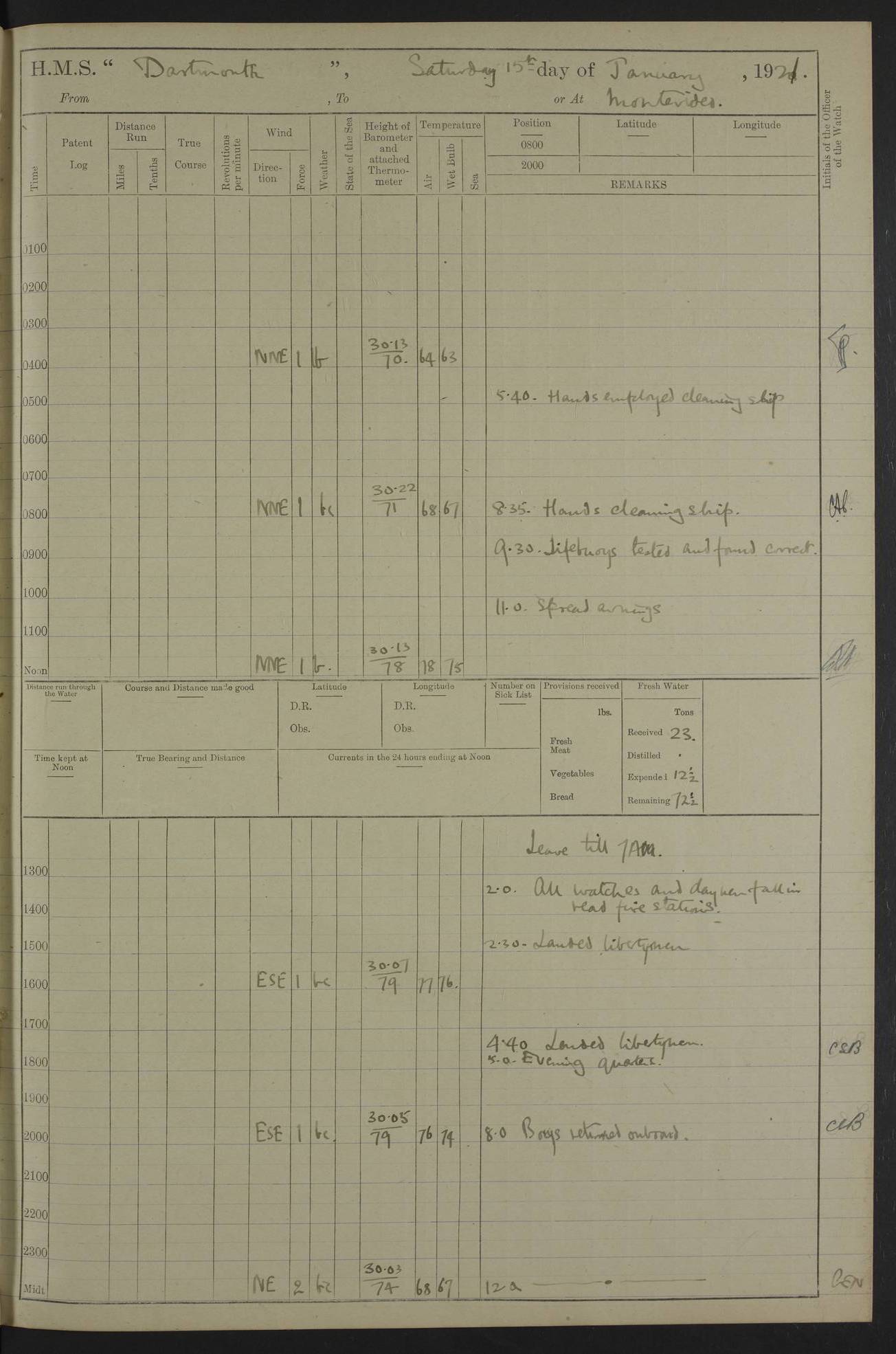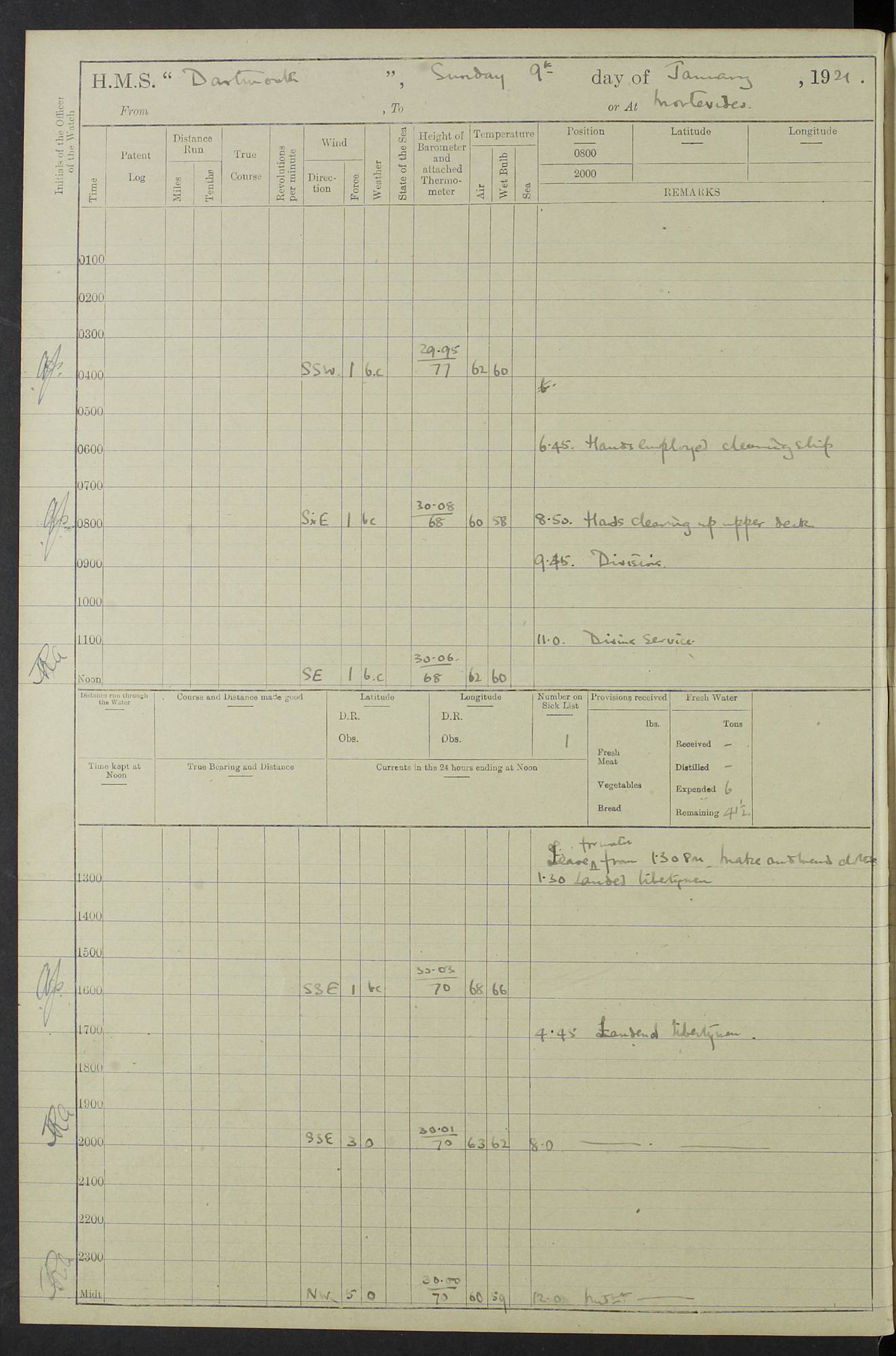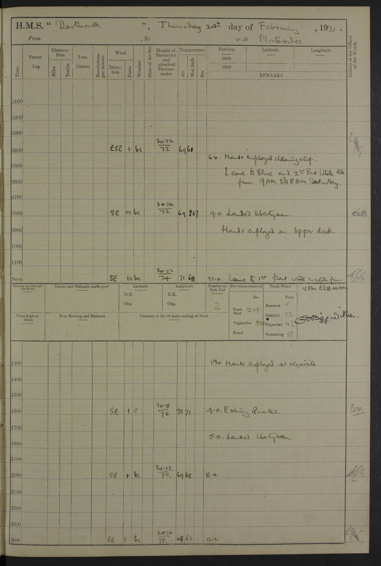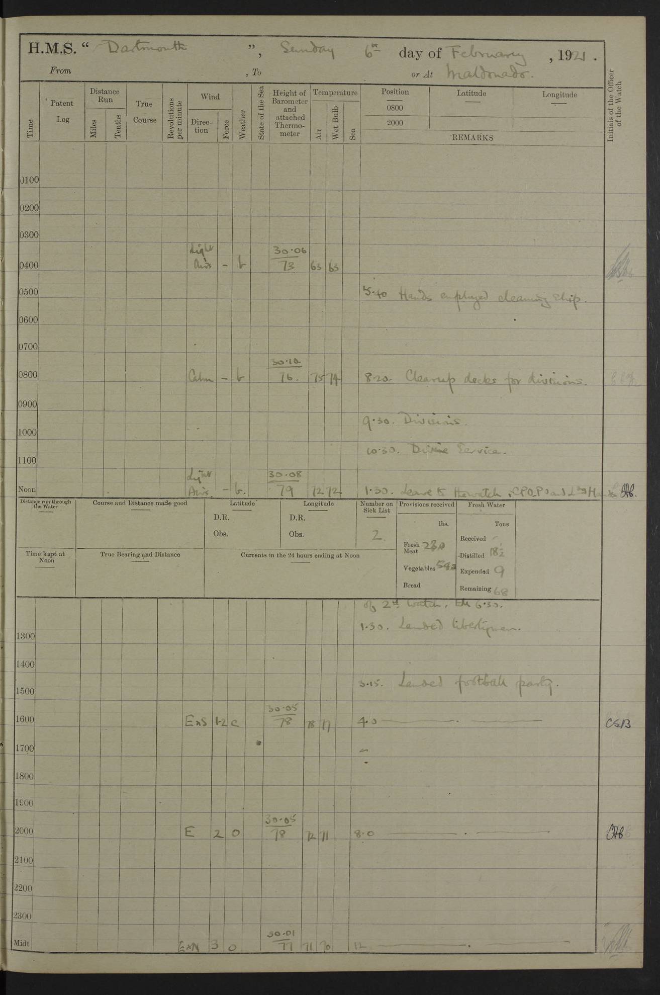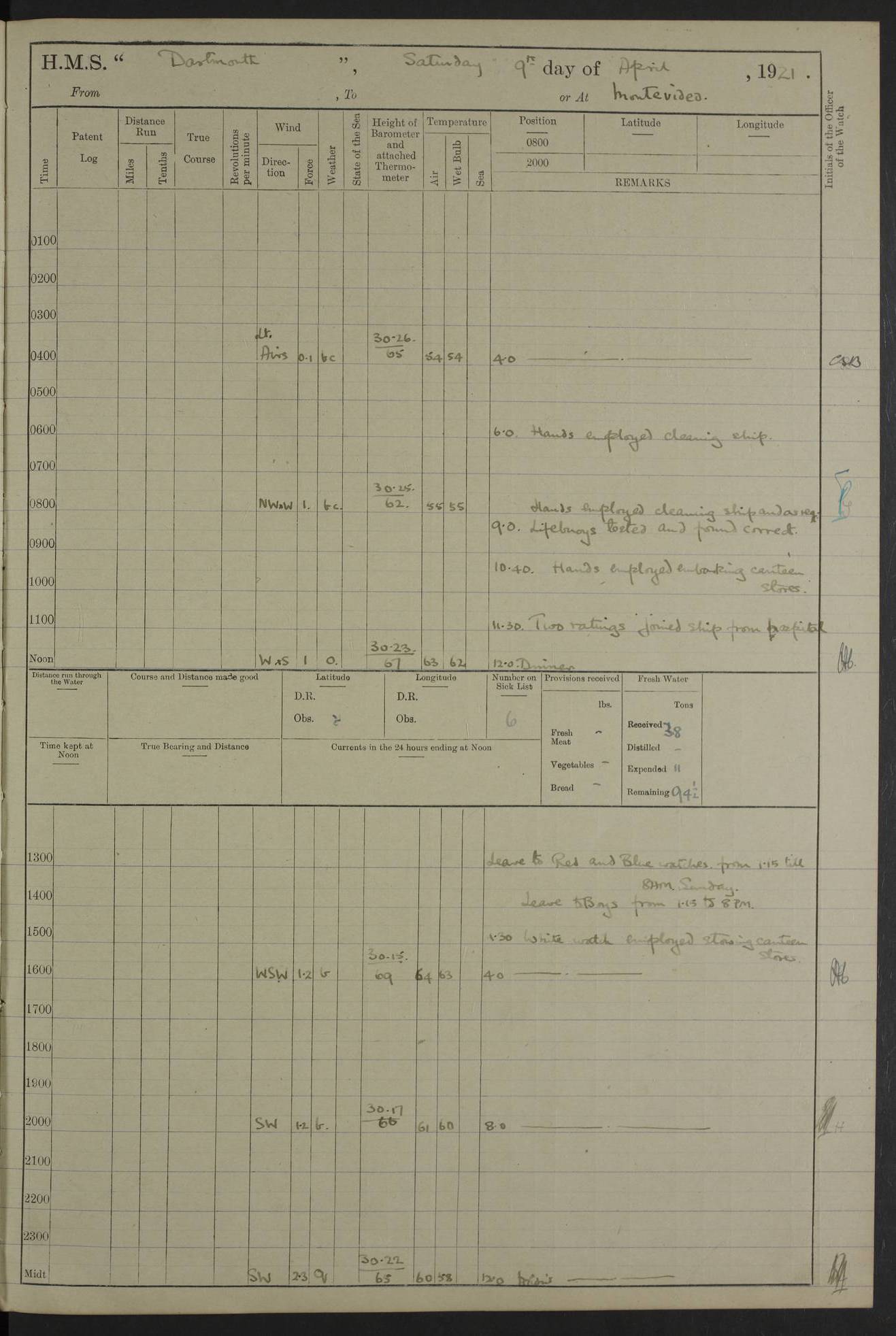 4caf861dcadfd34197013d59: (http://oldweather.s3.amazonaws.com/ADM53-39530/ADM 53-39530-003_1.jpg) 1 April 1920 Buenos Aires Lat -34.59, Long -58.36 5.40am: Hands cleaning ship & rigging stages 6.40am: Hands painting ship 10.00am: Officer of the Guard visited Minister of Marine 4.15pm: Read warrant no 84 6.50pm: Landed concert party 11.20pm: Concert party returned Number on sick list 5 4caf861dcadfd34197013d5a: (http://oldweather.s3.amazonaws.com/ADM53-39530/ADM 53-39530-004_0.jpg) 2 April 1920 Buenos Aires Lat -34.59, Long -58.36 9.45am: Divine Service performed. [Good Friday] 11.00am: Hands to muster for quarterly settlement 1.30pm: Landed libertymen 4.20pm: Landed libertymen & picnic party 10.00pm: Libertymen returned Number on sick list 7 4caf861dcadfd34197013d5b: (http://oldweather.s3.amazonaws.com/ADM53-39530/ADM 53-39530-004_1.jpg) 3 April 1920 Buenos Aires Lat -34.59, Long -58.36 12.05pm: Landed cricket & picnic parties 1.30pm: Gave leave to watch till 12pmLanded libertymen. Hands make & mend clothes 4.30pm: Landed libertymen Midnight: Libertymen returned Number on sick list 8 4caf861dcadfd34197013d5c: (http://oldweather.s3.amazonaws.com/ADM53-39530/ADM 53-39530-005_0.jpg) 4 April 1920 Buenos Aires Lat -34.59, Long -58.36 9.20am: Landed Roman Catholic Church party 10.15am: Divine Service performed 11.00am: Roman Catholic Church party returned 1.30pm: Gave leave to watch till 11pm. Landed libertymen 11.00pm: Libertymen returned Number on sick list 6 4caf861dcadfd34197013d5d: (http://oldweather.s3.amazonaws.com/ADM53-39530/ADM 53-39530-005_1.jpg) 5 April 1920 Buenos Aires Lat -34.59, Long -58.36 5.40am: Seamanship training class ranging cable. Remainder of hands cleaning ship 11.30am: Lost by accident: 1 paint brush 12.45pm: Landed picnic party 2.00pm: Ship open to visitors 4.00pm: Gave leave to watch till 11.15pm 5.00pm: Read warrant no 85 Number on sick list 4 4caf861dcadfd34197013d5e: (http://oldweather.s3.amazonaws.com/ADM53-39530/ADM 53-39530-006_0.jpg) 6 April 1920 Buenos Aires Lat -34.59, Long -58.36 5.40am: Cable & side parties as requisite. Remainder of hands cleaning ship 9.20am: Gunnery & seamanship training classes to instruction 12.45pm: Landed picnic party 1.30pm: Gunner’s & side parties as requisite. Party surveying cable 4.45pm: Gave leave to watch till 12.30am Number on sick list 5 4caf861dcadfd34197013d5f: (http://oldweather.s3.amazonaws.com/ADM53-39530/ADM 53-39530-006_1.jpg) 7 April 1920 Buenos Aires Lat -34.59, Long -58.36 12.30am: Libertymen returned on board 5.40am: Put into jetty & lowered 1st cutter 6.00am: Cable party on foc’sle. Remainder cleaning ship 8.30am: Gunner’s & side parties as requisite. Gunnery training class under instruction 10.00am: Finished surveying cable 12.45pm: Landed picnic party Number on sick list 5 4caf861dcadfd34197013d60: (http://oldweather.s3.amazonaws.com/ADM53-39530/ADM 53-39530-007_0.jpg) 8 April 1920 Buenos Aires Lat -34.59, Long -58.36 Number on sick list 4 4caf861dcadfd34197013d61: (http://oldweather.s3.amazonaws.com/ADM53-39530/ADM 53-39530-007_1.jpg) 9 April 1920 Buenos Aires Lat -34.59, Long -58.36 8.10am: Landed picnic party Number on sick list 4 4caf861dcadfd34197013d62: (http://oldweather.s3.amazonaws.com/ADM53-39530/ADM 53-39530-008_0.jpg) 10 April 1920 Buenos Aires Lat -34.59, Long -58.36 8.30am: Landed picnic party 1.00pm: Hands make & mend clothes Number on sick list 4 4caf861dcadfd34197013d63: (http://oldweather.s3.amazonaws.com/ADM53-39530/ADM 53-39530-008_1.jpg) 11 April 1920 Buenos Aires Lat -34.59, Long -58.36 5.40am: Hauled ship alongside jetty & hoisted 1st cutter 7.20am: 7 ratings left ship for HMS “Yarmouth” 10.00am: Landed Roman Catholic Church parties 11.00am: Roman Catholic Church party returned 11.30am: Church of England Church party landed 12.40pm: Church of England Church party returned Number on sick list 7 4caf861dcadfd34197013d64: (http://oldweather.s3.amazonaws.com/ADM53-39530/ADM 53-39530-009_0.jpg) 12 April 1920 Buenos Aires to Montevideo Lat -35.00, Long -57.17 5.30am: Hands preparing to leave wall 6.15am: Let go all hawsers. Weighed & proceeded in tow of tugs 8.00am: Course as requisite for buoyed channel 8.05am: Dropped pilot 10.30am: Training classes to instruction. Boys to school. Remainder employed in parts of ship 3.35pm: Sighted El Cerro [Fort] N95E 4.25pm: No 2 buoy abeam 6.00pm: Stopped to pick up pilot 6.35pm: Anchored 6.50pm: Middled on swivel 7.25pm: Mr Craddock, Warrant Engineer, joined ship 10.30pm: 6 ratings joined ship from HMS “Southampton” Number on sick list 8 [Middled on swivel is a technique of anchoring.