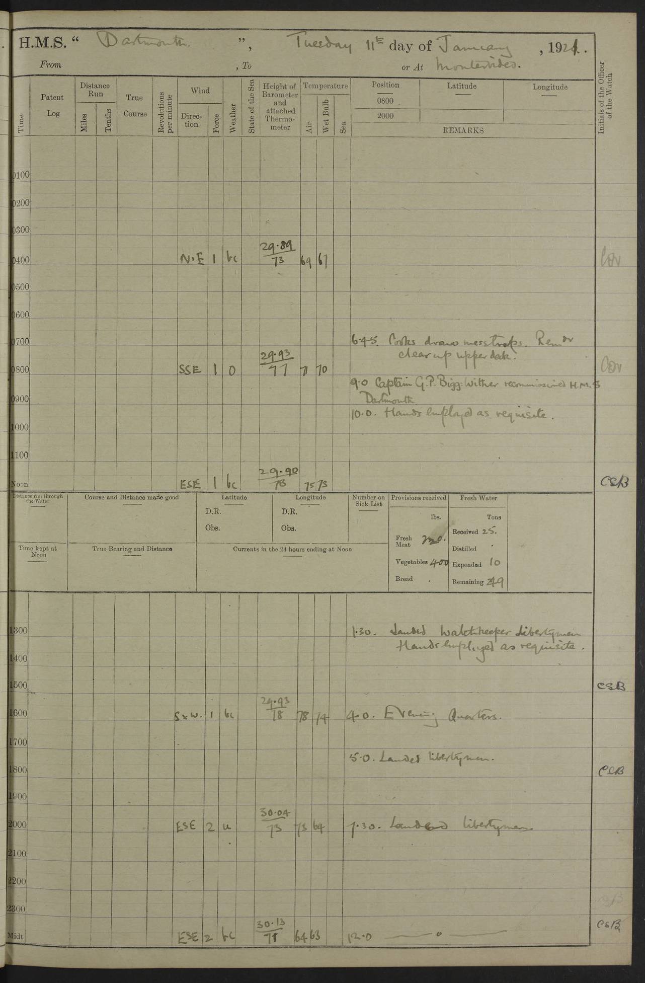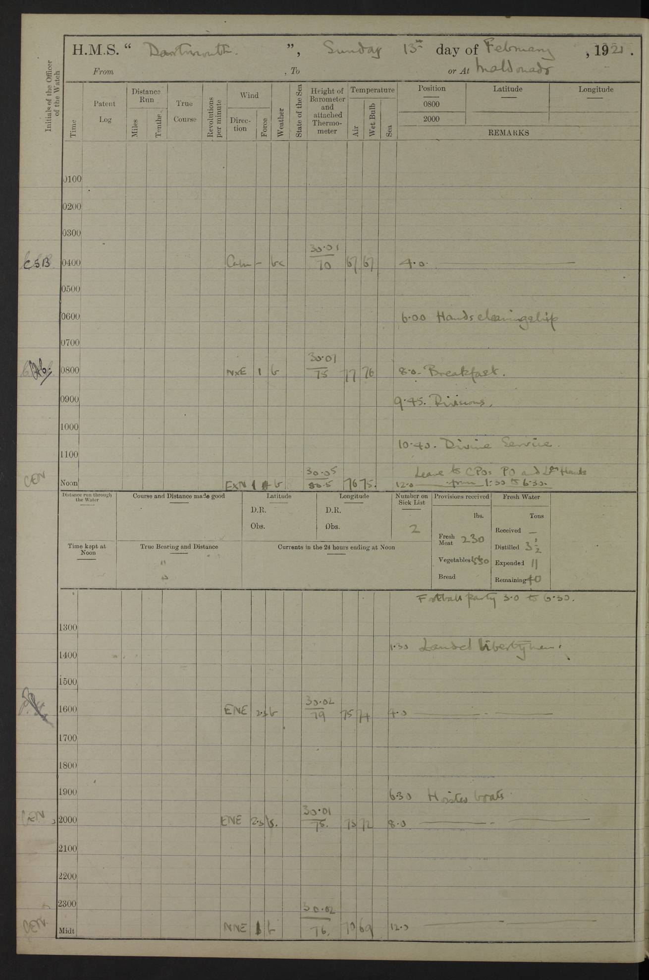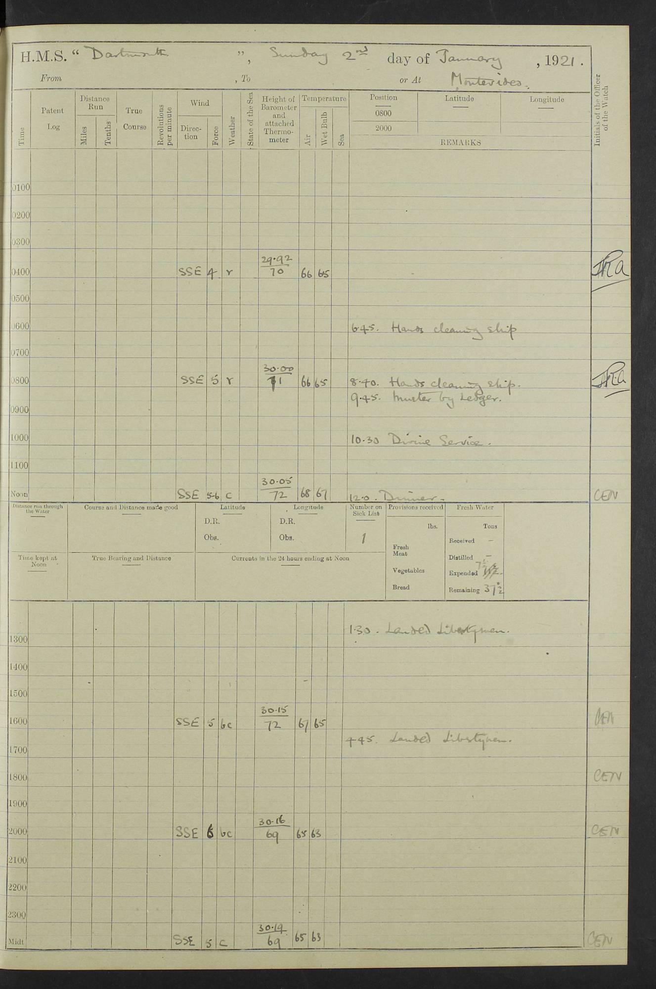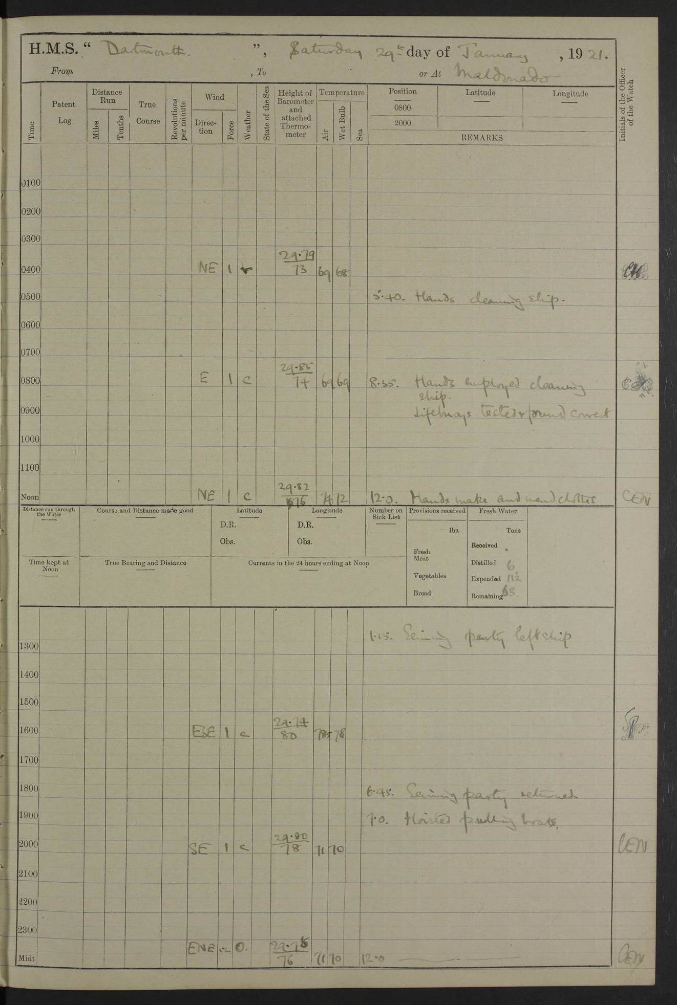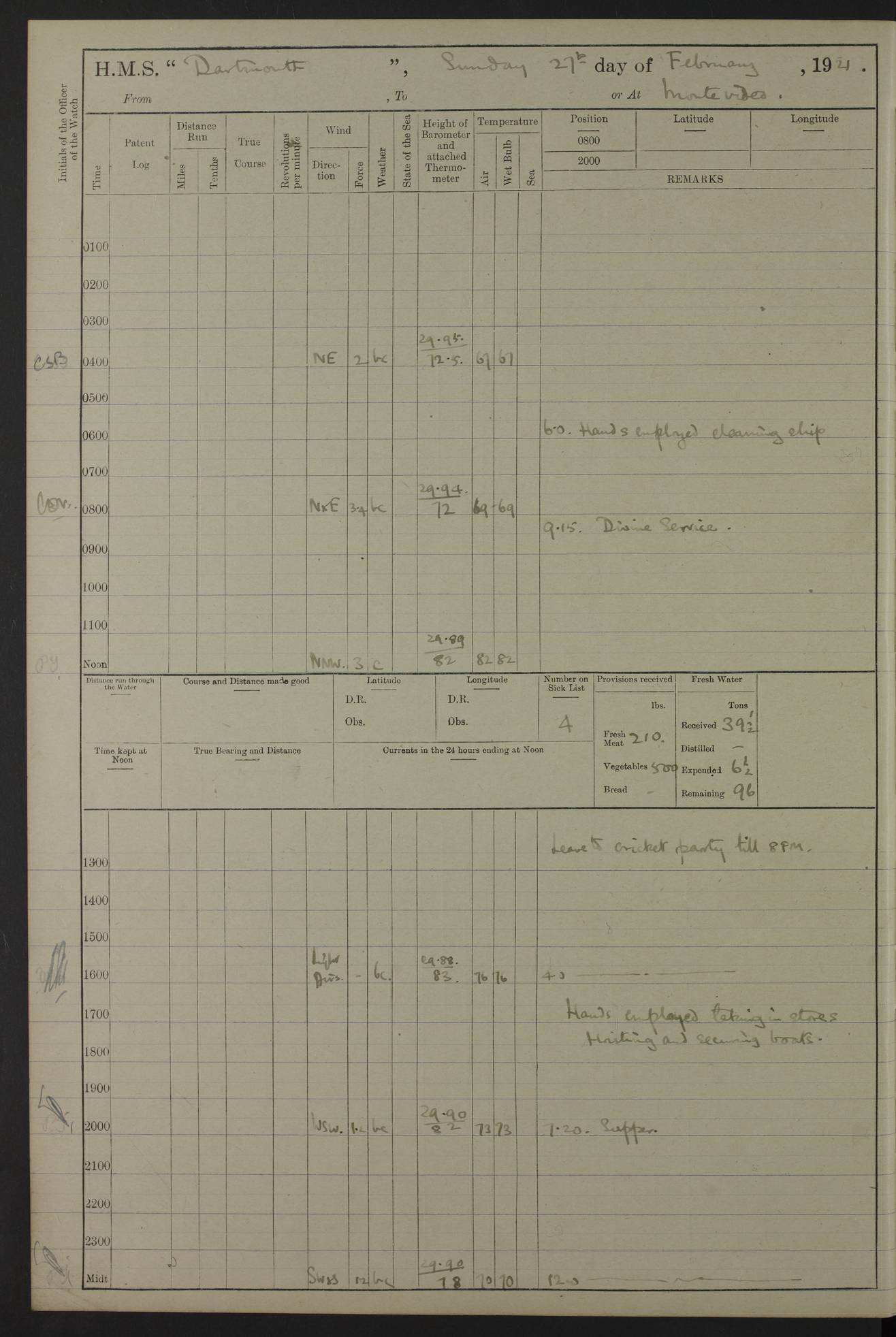 4caf861dcadfd34197013d59: (http://oldweather.s3.amazonaws.com/ADM53-39530/ADM 53-39530-003_1.jpg) 1 April 1920 Buenos Aires Lat -34.59, Long -58.36 5.40am: Hands cleaning ship & rigging stages 6.40am: Hands painting ship 10.00am: Officer of the Guard visited Minister of Marine 4.15pm: Read warrant no 84 6.50pm: Landed concert party 11.20pm: Concert party returned Number on sick list 5 4caf861dcadfd34197013d5a: (http://oldweather.s3.amazonaws.com/ADM53-39530/ADM 53-39530-004_0.jpg) 2 April 1920 Buenos Aires Lat -34.59, Long -58.36 9.45am: Divine Service performed. [Good Friday] 11.00am: Hands to muster for quarterly settlement 1.30pm: Landed libertymen 4.20pm: Landed libertymen & picnic party 10.00pm: Libertymen returned Number on sick list 7 4caf861dcadfd34197013d5b: (http://oldweather.s3.amazonaws.com/ADM53-39530/ADM 53-39530-004_1.jpg) 3 April 1920 Buenos Aires Lat -34.59, Long -58.36 12.05pm: Landed cricket & picnic parties 1.30pm: Gave leave to watch till 12pmLanded libertymen. Hands make & mend clothes 4.30pm: Landed libertymen Midnight: Libertymen returned Number on sick list 8 4caf861dcadfd34197013d5c: (http://oldweather.s3.amazonaws.com/ADM53-39530/ADM 53-39530-005_0.jpg) 4 April 1920 Buenos Aires Lat -34.59, Long -58.36 9.20am: Landed Roman Catholic Church party 10.15am: Divine Service performed 11.00am: Roman Catholic Church party returned 1.30pm: Gave leave to watch till 11pm. Landed libertymen 11.00pm: Libertymen returned Number on sick list 6 4caf861dcadfd34197013d5d: (http://oldweather.s3.amazonaws.com/ADM53-39530/ADM 53-39530-005_1.jpg) 5 April 1920 Buenos Aires Lat -34.59, Long -58.36 5.40am: Seamanship training class ranging cable. Remainder of hands cleaning ship 11.30am: Lost by accident: 1 paint brush 12.45pm: Landed picnic party 2.00pm: Ship open to visitors 4.00pm: Gave leave to watch till 11.15pm 5.00pm: Read warrant no 85 Number on sick list 4 4caf861dcadfd34197013d5e: (http://oldweather.s3.amazonaws.com/ADM53-39530/ADM 53-39530-006_0.jpg) 6 April 1920 Buenos Aires Lat -34.59, Long -58.36 5.40am: Cable & side parties as requisite. Remainder of hands cleaning ship 9.20am: Gunnery & seamanship training classes to instruction 12.45pm: Landed picnic party 1.30pm: Gunner’s & side parties as requisite. Party surveying cable 4.45pm: Gave leave to watch till 12.30am Number on sick list 5 4caf861dcadfd34197013d5f: (http://oldweather.s3.amazonaws.com/ADM53-39530/ADM 53-39530-006_1.jpg) 7 April 1920 Buenos Aires Lat -34.59, Long -58.36 12.30am: Libertymen returned on board 5.40am: Put into jetty & lowered 1st cutter 6.00am: Cable party on foc’sle. Remainder cleaning ship 8.30am: Gunner’s & side parties as requisite. Gunnery training class under instruction 10.00am: Finished surveying cable 12.45pm: Landed picnic party Number on sick list 5 4caf861dcadfd34197013d60: (http://oldweather.s3.amazonaws.com/ADM53-39530/ADM 53-39530-007_0.jpg) 8 April 1920 Buenos Aires Lat -34.59, Long -58.36 Number on sick list 4 4caf861dcadfd34197013d61: (http://oldweather.s3.amazonaws.com/ADM53-39530/ADM 53-39530-007_1.jpg) 9 April 1920 Buenos Aires Lat -34.59, Long -58.36 8.10am: Landed picnic party Number on sick list 4 4caf861dcadfd34197013d62: (http://oldweather.s3.amazonaws.com/ADM53-39530/ADM 53-39530-008_0.jpg) 10 April 1920 Buenos Aires Lat -34.59, Long -58.36 8.30am: Landed picnic party 1.00pm: Hands make & mend clothes Number on sick list 4 4caf861dcadfd34197013d63: (http://oldweather.s3.amazonaws.com/ADM53-39530/ADM 53-39530-008_1.jpg) 11 April 1920 Buenos Aires Lat -34.59, Long -58.36 5.40am: Hauled ship alongside jetty & hoisted 1st cutter 7.20am: 7 ratings left ship for HMS “Yarmouth” 10.00am: Landed Roman Catholic Church parties 11.00am: Roman Catholic Church party returned 11.30am: Church of England Church party landed 12.40pm: Church of England Church party returned Number on sick list 7 4caf861dcadfd34197013d64: (http://oldweather.s3.amazonaws.com/ADM53-39530/ADM 53-39530-009_0.jpg) 12 April 1920 Buenos Aires to Montevideo Lat -35.00, Long -57.17 5.30am: Hands preparing to leave wall 6.15am: Let go all hawsers. Weighed & proceeded in tow of tugs 8.00am: Course as requisite for buoyed channel 8.05am: Dropped pilot 10.30am: Training classes to instruction. Boys to school. Remainder employed in parts of ship 3.35pm: Sighted El Cerro [Fort] N95E 4.25pm: No 2 buoy abeam 6.00pm: Stopped to pick up pilot 6.35pm: Anchored 6.50pm: Middled on swivel 7.25pm: Mr Craddock, Warrant Engineer, joined ship 10.30pm: 6 ratings joined ship from HMS “Southampton” Number on sick list 8 [Middled on swivel is a technique of anchoring.