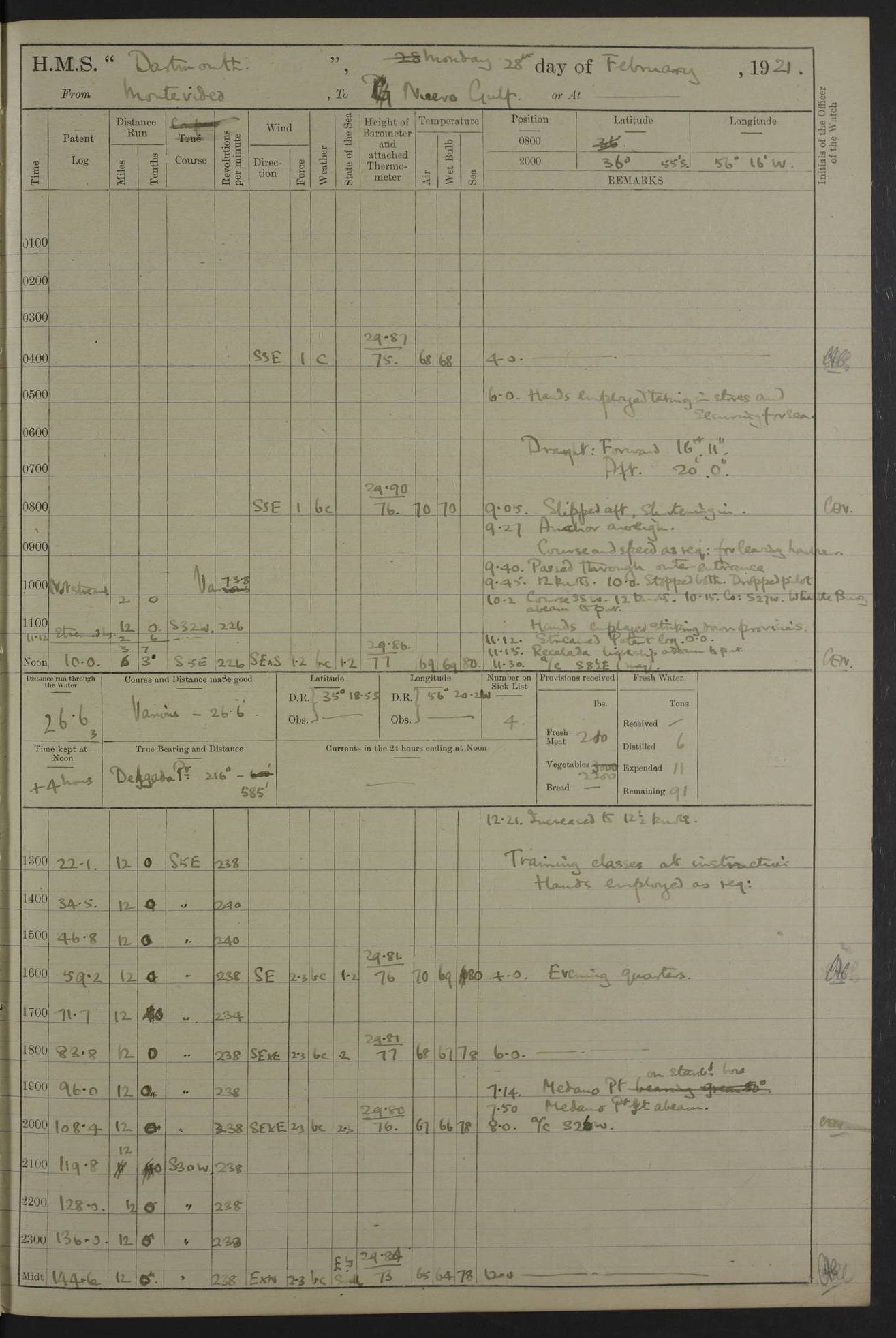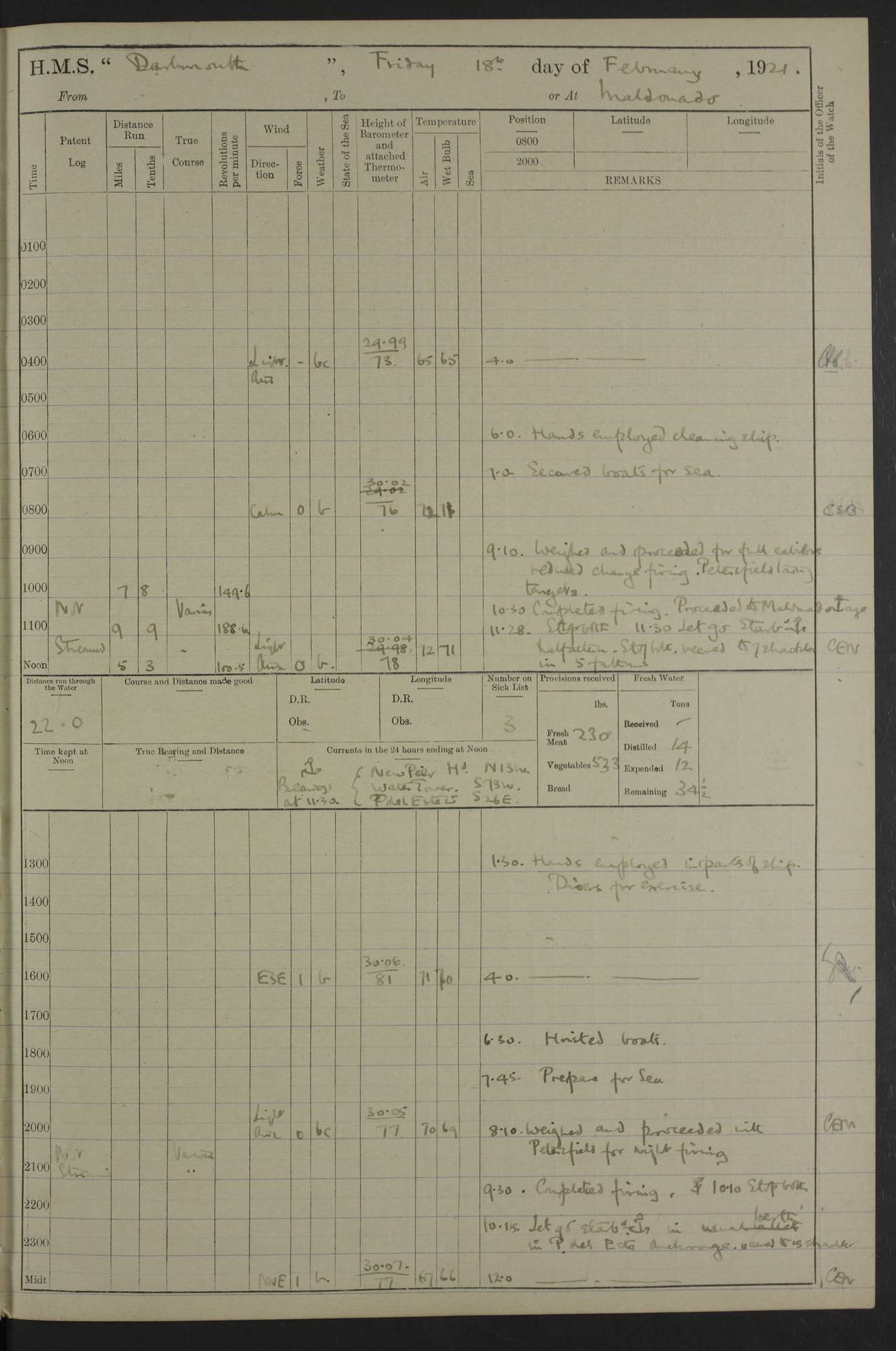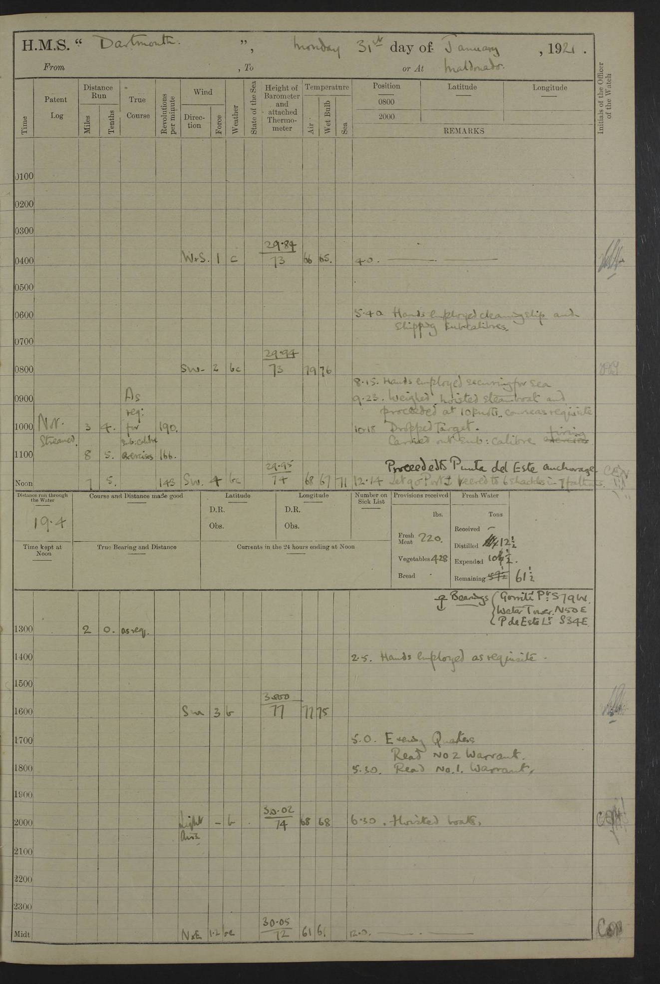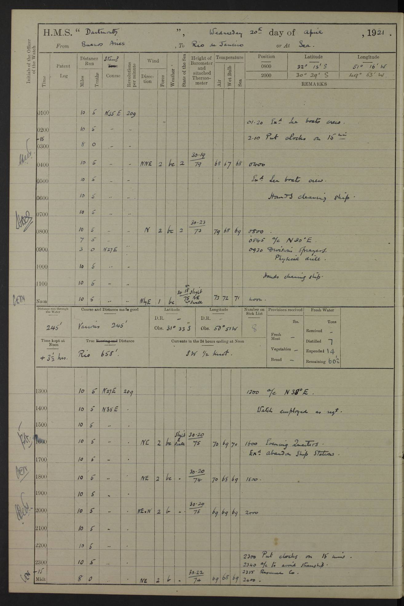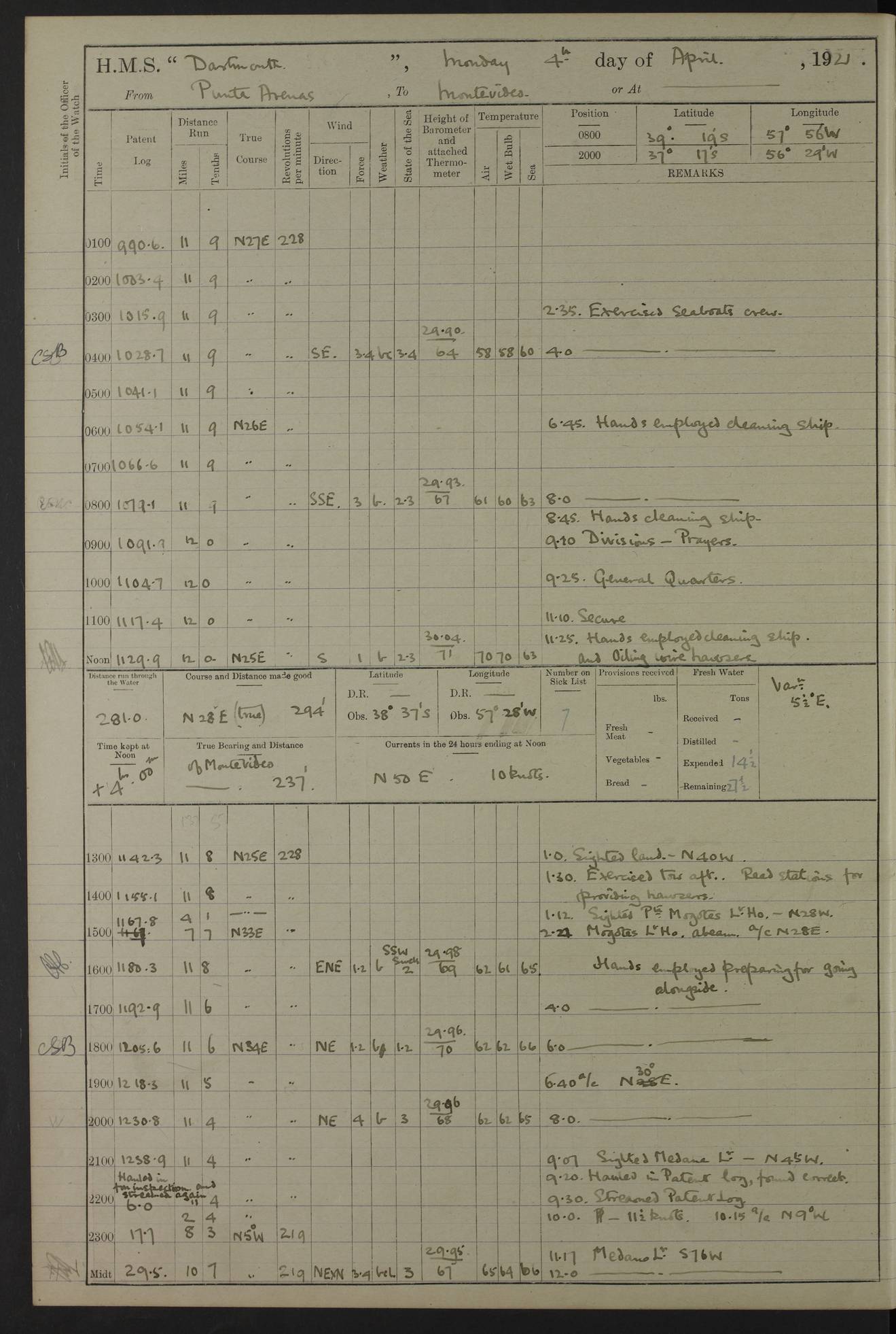to that. 4caf861dcadfd34197013d65: (http://oldweather.s3.amazonaws.com/ADM53-39530/ADM 53-39530-009_1.jpg) 13 April 1920 Montevideo Lat -34.90, Long -56.22 5.45am: Hands preparing for coaling 6.00am: First lighter secured alongside 6.50am: Commenced coaling 2.48pm: Finished coaling, received 810 tons of coal 3.45pm: 1 Petty Officer Telegraphist joined ship from HMS “Southampton”. Hands cleaning ship Number on sick list 8 4caf861dcadfd34197013d66: (http://oldweather.s3.amazonaws.com/ADM53-39530/ADM 53-39530-010_0.jpg) 14 April 1920 Montevideo Lat -34.90, Long -56.22 9.30am: 1 officer & 3 ratings to flagship for medical survey 1.30pm: Hands spreading awnings. Received practice ammunition from flagship 6.30pm: Paymaster [?] Midshipman Bennett lent from HMS “Southampton” Number on sick list 8 4caf861dcadfd34197013d67: (http://oldweather.s3.amazonaws.com/ADM53-39530/ADM 53-39530-010_1.jpg) 15 April 1920 Montevideo to Maldonado Lat -35.17, Long -56.33 8.30am: Boats crews securing boats for sea 9.57am: Weighed & proceeded 10.55am: Stopped. Dropped off pilot 11.00am: Proceeded on station, 5’ of starboard beam of flag 11.20am: Course & speed as requisite for gunnery exercises 4.00pm: Station astern of flag, 2½ cables 5.44pm: Anchored Number on sick list 7 4caf861dcadfd34197013d68: (http://oldweather.s3.amazonaws.com/ADM53-39530/ADM 53-39530-011_0.jpg) 16 April 1920 Maldonado Lat -34.95, Long -54.96 5.40am: Torpedo men as requisite. Remainder of hands cleaning ship 6.15am: Fired three torpedoes from port tube 10.00am: At ‘lower anchor’. Weighed by hand 1.00pm: Training classes at instruction 4.00pm: Quarters. Read warrant no 86 5.00pm: Hands to bathe Number on sick list 5 4caf861dcadfd34197013d69: (http://oldweather.s3.amazonaws.com/ADM53-39530/ADM 53-39530-011_1.jpg) 17 April 1920 Maldonado Lat -34.95, Long -54.96 5.40am: Concert party rigging stage 7.40am: Hands to bathe 1.00pm: Hands make & mend clothes 5.00pm: Evening Quarters. Hands to bathe 5.50pm: Libertymen returned 6.00pm: Closed B & C doors 8.20pm: Concert party from HMS “Southampton” came on board. Held concert on Quarter Deck 11.00pm: “Southampton’s” concert party left ship Number on sick list 4 4caf861dcadfd34197013d6a: (http://oldweather.s3.amazonaws.com/ADM53-39530/ADM 53-39530-012_0.jpg) 18 April 1920 Maldonado Lat -34.95, Long -54.96 5.40am: Hands unrigging concert stage & cleaning ship 10.50am: Divine Service held 11.40am: Hands to bathe 5.00pm: Hands to bathe Number on sick list 5 4caf861dcadfd34197013d6b: (http://oldweather.s3.amazonaws.com/ADM53-39530/ADM 53-39530-012_1.jpg) 19 April 1920 Maldonado Lat -34.94, Long -54.97 7.30am: Hands to bathe 9.12am: Weighed & proceeded as requisite for carrying out sub-calibre firing 10.50am: Anchored 1.30pm: Training classes at instruction 5.00pm: Hands to bathe 6.00pm: Read warrant no 87 Number on sick list 5 4caf861dcadfd34197013d6c: (http://oldweather.s3.amazonaws.com/ADM53-39530/ADM 53-39530-013_0.jpg) 20 April 1920 Maldonado Lat -35.00, Long -55.15 [est] 5.40am: Gunner’s & torpedo party as requisite. Remainder cleaning ship 8.50am: Exercised ‘Action Stations’ 9.04am: Weighed & proceeded. Took station ahead of flag, 1 mile. Course & speed as requisite for spreading 9.57am: Opened fire 10.19am: Ceased fire & secured. Course & speed as requisite for “Southampton’s” firing 11.45am: Stopped 12.46pm: Proceeded 1.30pm: Gunner’s party as requisite. Remainder employed preparing paravanes for running 1.40pm: Fired torpedo from starboard tube 3.00pm: Anchored Number on sick list 5 4caf861dcadfd34197013d6d: (http://oldweather.s3.amazonaws.com/ADM53-39530/ADM 53-39530-013_1.jpg) 21 April 1920 Maldonado Lat -34.95, Long -54.96 9.30am: Prepare to tow aft 9.40am: Out collision mat 9.50am: Let go starboard anchor 9.51am: Rig hand capstan & weigh by hand 10.18am: Replaced gear Number on sick list 4 4caf861dcadfd34197013d6e: (http://oldweather.s3.amazonaws.com/ADM53-39530/ADM 53-39530-014_0.jpg) 22 April 1920 Maldonado Lat -35.00, Long -55.15 [est] 5.40am: Torpedo & gunnery parties as requisite. Remainder of hands cleaning ship 9.01am: Weighed port anchor & proceeded, course & speed as requisite for carrying out gunnery & torpedo exercises Noon: Stopped both engines 12.45pm: Proceeded as requisite for torpedo firing 2.45pm: Fired torpedo. As requisite for laying out target & anchoring 3.51pm: Anchored 5.55pm: Weighed & proceeded as requisite for night firing 6.40pm: Anchored Number on sick list 4 4caf861dcadfd34197013d6f: (http://oldweather.s3.amazonaws.com/ADM53-39530/ADM 53-39530-014_1.jpg) 23 April 1920 Maldonado Lat -34.95, Long -54.96 6.00am: Gunner’s & side parties as requisite 7.30am: Hands to bathe 10.30am: Divers to examination 3.00pm: Torpedo parties as requisite. All boats away sailing 5.40pm: Hoisted boats 5.55pm: Weighed & proceeded as requisite for torpedo firing 6.16pm: Fired torpedo 7.31pm: Anchored Number on sick list 5 4caf861dcadfd34197013d70: (http://oldweather.s3.amazonaws.com/ADM53-39530/ADM 53-39530-015_0.jpg) 24 April 1920 Maldonado Lat -34.95, Long -54.96 1.00pm: Hands make & mend clothes 1.30pm: Landed libertymen & bathing party 3.45pm: Bathing party returned 5.10pm: Hands to bathe Number on sick list 5 4caf861dcadfd34197013d71: (http://oldweather.s3.amazonaws.com/ADM53-39530/ADM 53-39530-015_1.jpg) 25 April 1920 Maldonado Lat -34.95, Long -54.96 9.30am: Hands muster by the ledger 10.00am: Read ‘Articles of War’ 10.20am: Divine Service held 1.00pm: Gave leave to watch & boys till 5.30pm 1.30pm: Landed libertymen 5.15pm: Hands to bathe Number on sick list 4 4caf861dcadfd34197013d72: (http://oldweather.s3.amazonaws.com/ADM53-39530/ADM 53-39530-016_0.jpg) 26 April 1920 Maldonado to Rio Grande do Sul Lat -35.07, Long -54.83 5.40am: Torpedo party as requisite. Boats securing for sea 9.02am: Weighed & proceeded as requisite for firing torpedo 11.10am: ‘Out paravanes’ 12.45pm: San José Ignacio Light N20E [Uruguay Lat -34.8, Long-54.6] 