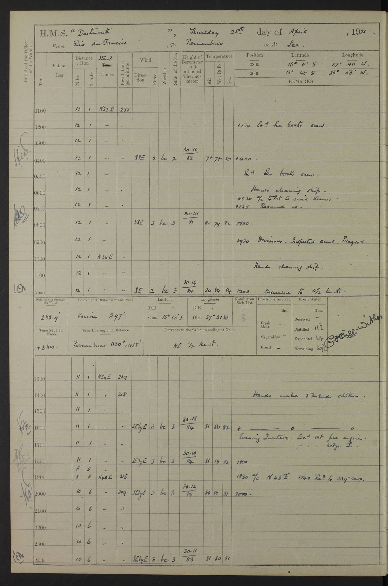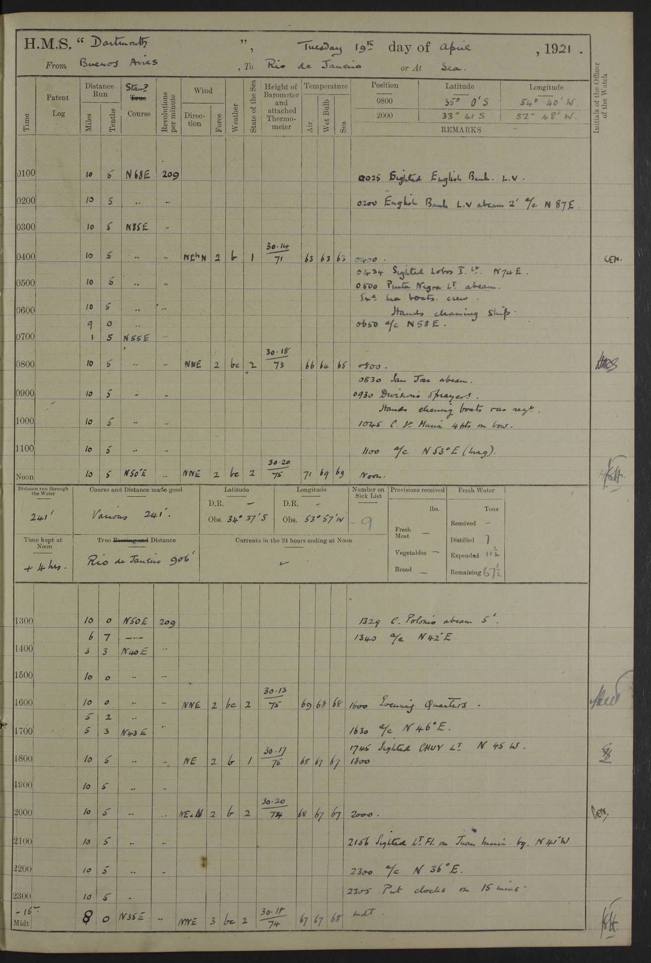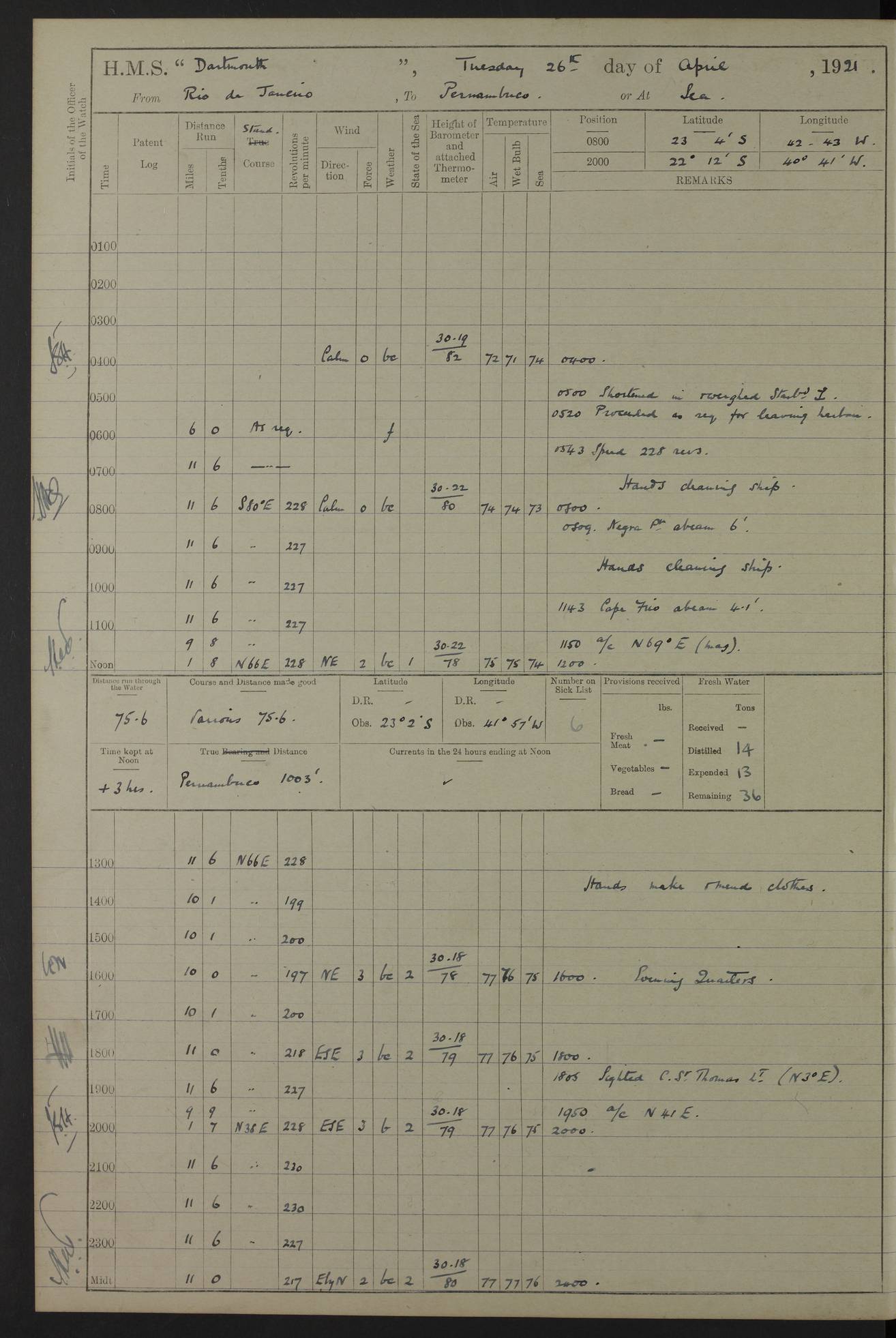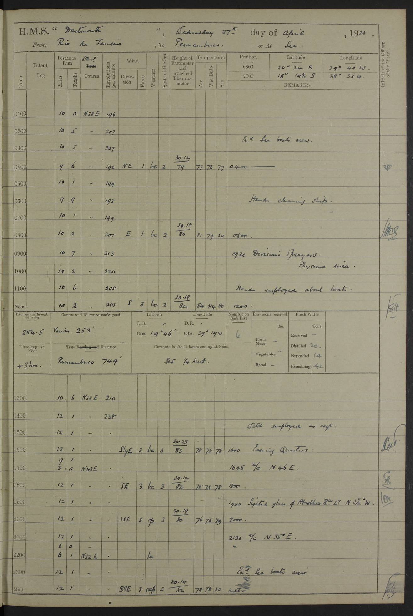 to that. 4caf861dcadfd34197013d65: (http://oldweather.s3.amazonaws.com/ADM53-39530/ADM 53-39530-009_1.jpg) 13 April 1920 Montevideo Lat -34.90, Long -56.22 5.45am: Hands preparing for coaling 6.00am: First lighter secured alongside 6.50am: Commenced coaling 2.48pm: Finished coaling, received 810 tons of coal 3.45pm: 1 Petty Officer Telegraphist joined ship from HMS “Southampton”. Hands cleaning ship Number on sick list 8 4caf861dcadfd34197013d66: (http://oldweather.s3.amazonaws.com/ADM53-39530/ADM 53-39530-010_0.jpg) 14 April 1920 Montevideo Lat -34.90, Long -56.22 9.30am: 1 officer & 3 ratings to flagship for medical survey 1.30pm: Hands spreading awnings. Received practice ammunition from flagship 6.30pm: Paymaster [?] Midshipman Bennett lent from HMS “Southampton” Number on sick list 8 4caf861dcadfd34197013d67: (http://oldweather.s3.amazonaws.com/ADM53-39530/ADM 53-39530-010_1.jpg) 15 April 1920 Montevideo to Maldonado Lat -35.17, Long -56.33 8.30am: Boats crews securing boats for sea 9.57am: Weighed & proceeded 10.55am: Stopped. Dropped off pilot 11.00am: Proceeded on station, 5’ of starboard beam of flag 11.20am: Course & speed as requisite for gunnery exercises 4.00pm: Station astern of flag, 2½ cables 5.44pm: Anchored Number on sick list 7 4caf861dcadfd34197013d68: (http://oldweather.s3.amazonaws.com/ADM53-39530/ADM 53-39530-011_0.jpg) 16 April 1920 Maldonado Lat -34.95, Long -54.96 5.40am: Torpedo men as requisite. Remainder of hands cleaning ship 6.15am: Fired three torpedoes from port tube 10.00am: At ‘lower anchor’. Weighed by hand 1.00pm: Training classes at instruction 4.00pm: Quarters. Read warrant no 86 5.00pm: Hands to bathe Number on sick list 5 4caf861dcadfd34197013d69: (http://oldweather.s3.amazonaws.com/ADM53-39530/ADM 53-39530-011_1.jpg) 17 April 1920 Maldonado Lat -34.95, Long -54.96 5.40am: Concert party rigging stage 7.40am: Hands to bathe 1.00pm: Hands make & mend clothes 5.00pm: Evening Quarters. Hands to bathe 5.50pm: Libertymen returned 6.00pm: Closed B & C doors 8.20pm: Concert party from HMS “Southampton” came on board. Held concert on Quarter Deck 11.00pm: “Southampton’s” concert party left ship Number on sick list 4 4caf861dcadfd34197013d6a: (http://oldweather.s3.amazonaws.com/ADM53-39530/ADM 53-39530-012_0.jpg) 18 April 1920 Maldonado Lat -34.95, Long -54.96 5.40am: Hands unrigging concert stage & cleaning ship 10.50am: Divine Service held 11.40am: Hands to bathe 5.00pm: Hands to bathe Number on sick list 5 4caf861dcadfd34197013d6b: (http://oldweather.s3.amazonaws.com/ADM53-39530/ADM 53-39530-012_1.jpg) 19 April 1920 Maldonado Lat -34.94, Long -54.97 7.30am: Hands to bathe 9.12am: Weighed & proceeded as requisite for carrying out sub-calibre firing 10.50am: Anchored 1.30pm: Training classes at instruction 5.00pm: Hands to bathe 6.00pm: Read warrant no 87 Number on sick list 5 4caf861dcadfd34197013d6c: (http://oldweather.s3.amazonaws.com/ADM53-39530/ADM 53-39530-013_0.jpg) 20 April 1920 Maldonado Lat -35.00, Long -55.15 [est] 5.40am: Gunner’s & torpedo party as requisite. Remainder cleaning ship 8.50am: Exercised ‘Action Stations’ 9.04am: Weighed & proceeded. Took station ahead of flag, 1 mile. Course & speed as requisite for spreading 9.57am: Opened fire 10.19am: Ceased fire & secured. Course & speed as requisite for “Southampton’s” firing 11.45am: Stopped 12.46pm: Proceeded 1.30pm: Gunner’s party as requisite. Remainder employed preparing paravanes for running 1.40pm: Fired torpedo from starboard tube 3.00pm: Anchored Number on sick list 5 4caf861dcadfd34197013d6d: (http://oldweather.s3.amazonaws.com/ADM53-39530/ADM 53-39530-013_1.jpg) 21 April 1920 Maldonado Lat -34.95, Long -54.96 9.30am: Prepare to tow aft 9.40am: Out collision mat 9.50am: Let go starboard anchor 9.51am: Rig hand capstan & weigh by hand 10.18am: Replaced gear Number on sick list 4 4caf861dcadfd34197013d6e: (http://oldweather.s3.amazonaws.com/ADM53-39530/ADM 53-39530-014_0.jpg) 22 April 1920 Maldonado Lat -35.00, Long -55.15 [est] 5.40am: Torpedo & gunnery parties as requisite. Remainder of hands cleaning ship 9.01am: Weighed port anchor & proceeded, course & speed as requisite for carrying out gunnery & torpedo exercises Noon: Stopped both engines 12.45pm: Proceeded as requisite for torpedo firing 2.45pm: Fired torpedo. As requisite for laying out target & anchoring 3.51pm: Anchored 5.55pm: Weighed & proceeded as requisite for night firing 6.40pm: Anchored Number on sick list 4 4caf861dcadfd34197013d6f: (http://oldweather.s3.amazonaws.com/ADM53-39530/ADM 53-39530-014_1.jpg) 23 April 1920 Maldonado Lat -34.95, Long -54.96 6.00am: Gunner’s & side parties as requisite 7.30am: Hands to bathe 10.30am: Divers to examination 3.00pm: Torpedo parties as requisite. All boats away sailing 5.40pm: Hoisted boats 5.55pm: Weighed & proceeded as requisite for torpedo firing 6.16pm: Fired torpedo 7.31pm: Anchored Number on sick list 5 4caf861dcadfd34197013d70: (http://oldweather.s3.amazonaws.com/ADM53-39530/ADM 53-39530-015_0.jpg) 24 April 1920 Maldonado Lat -34.95, Long -54.96 1.00pm: Hands make & mend clothes 1.30pm: Landed libertymen & bathing party 3.45pm: Bathing party returned 5.10pm: Hands to bathe Number on sick list 5 4caf861dcadfd34197013d71: (http://oldweather.s3.amazonaws.com/ADM53-39530/ADM 53-39530-015_1.jpg) 25 April 1920 Maldonado Lat -34.95, Long -54.96 9.30am: Hands muster by the ledger 10.00am: Read ‘Articles of War’ 10.20am: Divine Service held 1.00pm: Gave leave to watch & boys till 5.30pm 1.30pm: Landed libertymen 5.15pm: Hands to bathe Number on sick list 4 4caf861dcadfd34197013d72: (http://oldweather.s3.amazonaws.com/ADM53-39530/ADM 53-39530-016_0.jpg) 26 April 1920 Maldonado to Rio Grande do Sul Lat -35.07, Long -54.83 5.40am: Torpedo party as requisite. Boats securing for sea 9.02am: Weighed & proceeded as requisite for firing torpedo 11.10am: ‘Out paravanes’ 12.45pm: San José Ignacio Light N20E [Uruguay Lat -34.8, Long-54.6] 