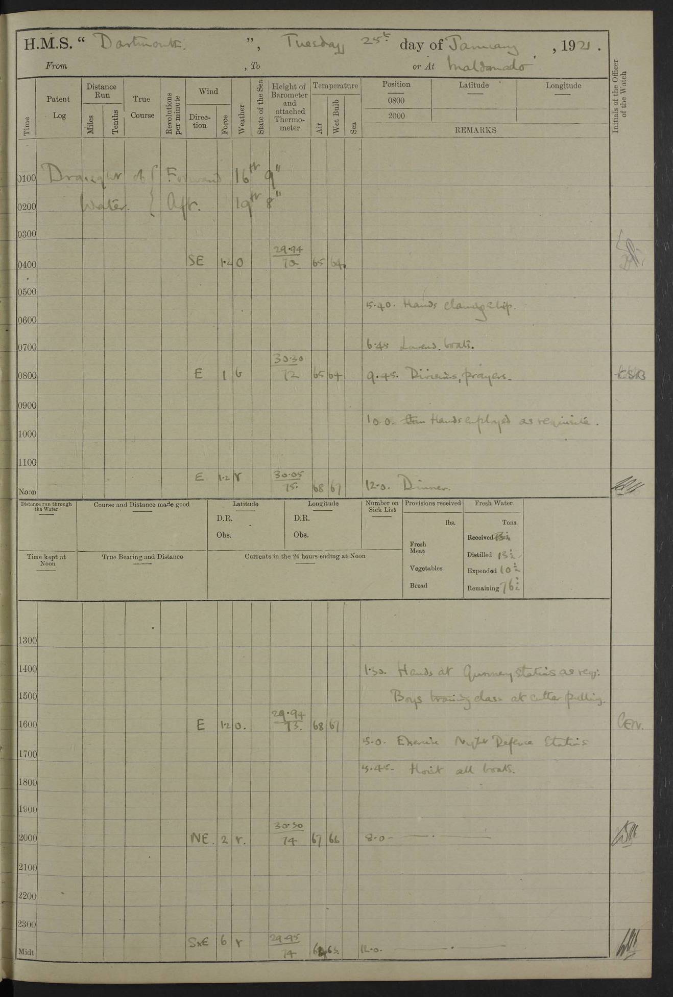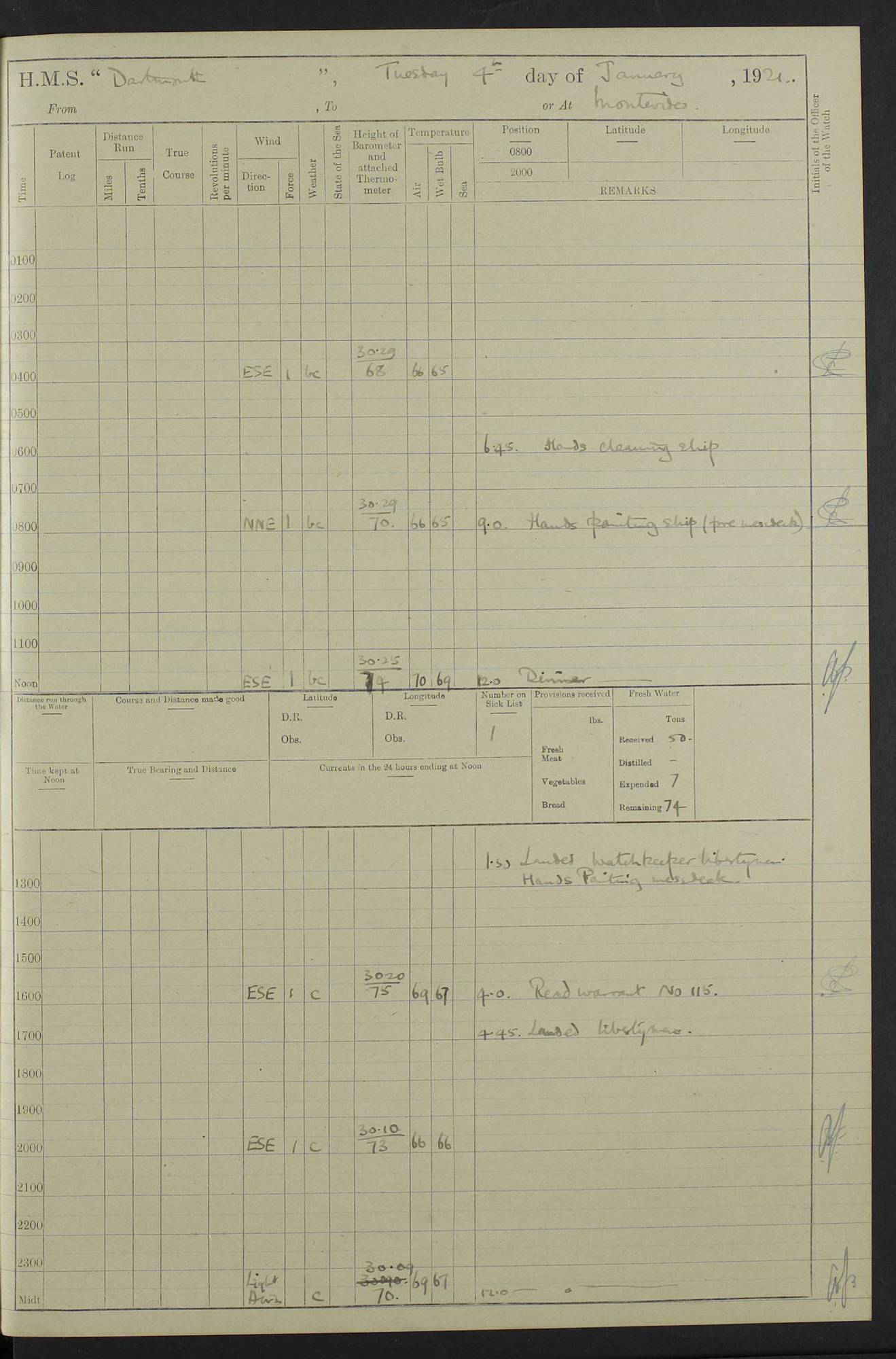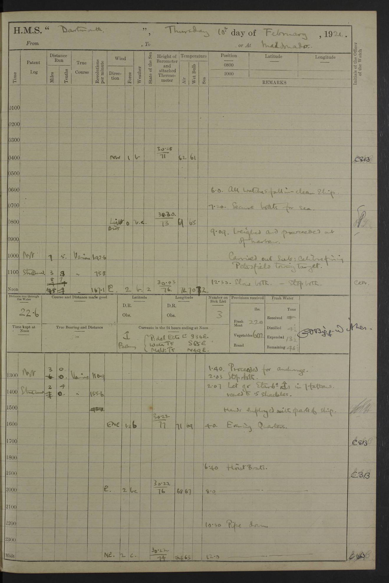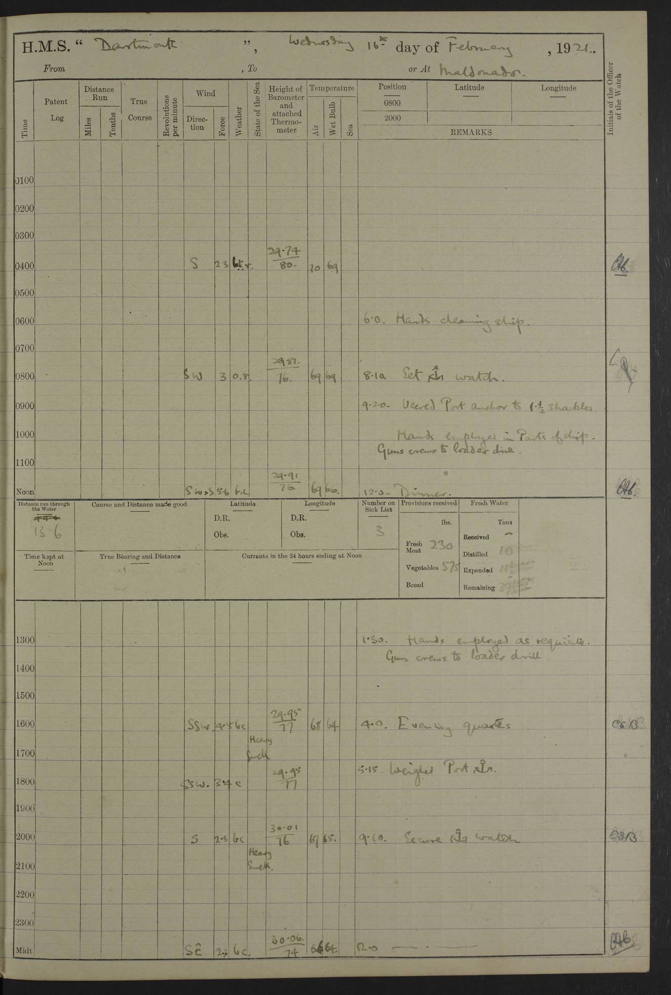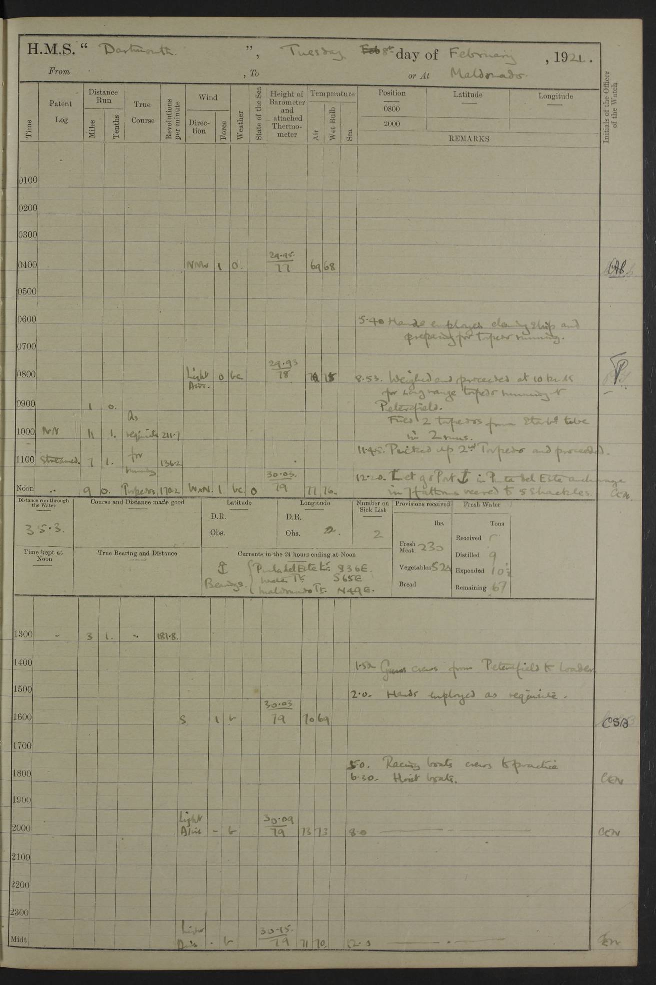to that. 4caf861dcadfd34197013d65: (http://oldweather.s3.amazonaws.com/ADM53-39530/ADM 53-39530-009_1.jpg) 13 April 1920 Montevideo Lat -34.90, Long -56.22 5.45am: Hands preparing for coaling 6.00am: First lighter secured alongside 6.50am: Commenced coaling 2.48pm: Finished coaling, received 810 tons of coal 3.45pm: 1 Petty Officer Telegraphist joined ship from HMS “Southampton”. Hands cleaning ship Number on sick list 8 4caf861dcadfd34197013d66: (http://oldweather.s3.amazonaws.com/ADM53-39530/ADM 53-39530-010_0.jpg) 14 April 1920 Montevideo Lat -34.90, Long -56.22 9.30am: 1 officer & 3 ratings to flagship for medical survey 1.30pm: Hands spreading awnings. Received practice ammunition from flagship 6.30pm: Paymaster [?] Midshipman Bennett lent from HMS “Southampton” Number on sick list 8 4caf861dcadfd34197013d67: (http://oldweather.s3.amazonaws.com/ADM53-39530/ADM 53-39530-010_1.jpg) 15 April 1920 Montevideo to Maldonado Lat -35.17, Long -56.33 8.30am: Boats crews securing boats for sea 9.57am: Weighed & proceeded 10.55am: Stopped. Dropped off pilot 11.00am: Proceeded on station, 5’ of starboard beam of flag 11.20am: Course & speed as requisite for gunnery exercises 4.00pm: Station astern of flag, 2½ cables 5.44pm: Anchored Number on sick list 7 4caf861dcadfd34197013d68: (http://oldweather.s3.amazonaws.com/ADM53-39530/ADM 53-39530-011_0.jpg) 16 April 1920 Maldonado Lat -34.95, Long -54.96 5.40am: Torpedo men as requisite. Remainder of hands cleaning ship 6.15am: Fired three torpedoes from port tube 10.00am: At ‘lower anchor’. Weighed by hand 1.00pm: Training classes at instruction 4.00pm: Quarters. Read warrant no 86 5.00pm: Hands to bathe Number on sick list 5 4caf861dcadfd34197013d69: (http://oldweather.s3.amazonaws.com/ADM53-39530/ADM 53-39530-011_1.jpg) 17 April 1920 Maldonado Lat -34.95, Long -54.96 5.40am: Concert party rigging stage 7.40am: Hands to bathe 1.00pm: Hands make & mend clothes 5.00pm: Evening Quarters. Hands to bathe 5.50pm: Libertymen returned 6.00pm: Closed B & C doors 8.20pm: Concert party from HMS “Southampton” came on board. Held concert on Quarter Deck 11.00pm: “Southampton’s” concert party left ship Number on sick list 4 4caf861dcadfd34197013d6a: (http://oldweather.s3.amazonaws.com/ADM53-39530/ADM 53-39530-012_0.jpg) 18 April 1920 Maldonado Lat -34.95, Long -54.96 5.40am: Hands unrigging concert stage & cleaning ship 10.50am: Divine Service held 11.40am: Hands to bathe 5.00pm: Hands to bathe Number on sick list 5 4caf861dcadfd34197013d6b: (http://oldweather.s3.amazonaws.com/ADM53-39530/ADM 53-39530-012_1.jpg) 19 April 1920 Maldonado Lat -34.94, Long -54.97 7.30am: Hands to bathe 9.12am: Weighed & proceeded as requisite for carrying out sub-calibre firing 10.50am: Anchored 1.30pm: Training classes at instruction 5.00pm: Hands to bathe 6.00pm: Read warrant no 87 Number on sick list 5 4caf861dcadfd34197013d6c: (http://oldweather.s3.amazonaws.com/ADM53-39530/ADM 53-39530-013_0.jpg) 20 April 1920 Maldonado Lat -35.00, Long -55.15 [est] 5.40am: Gunner’s & torpedo party as requisite. Remainder cleaning ship 8.50am: Exercised ‘Action Stations’ 9.04am: Weighed & proceeded. Took station ahead of flag, 1 mile. Course & speed as requisite for spreading 9.57am: Opened fire 10.19am: Ceased fire & secured. Course & speed as requisite for “Southampton’s” firing 11.45am: Stopped 12.46pm: Proceeded 1.30pm: Gunner’s party as requisite. Remainder employed preparing paravanes for running 1.40pm: Fired torpedo from starboard tube 3.00pm: Anchored Number on sick list 5 4caf861dcadfd34197013d6d: (http://oldweather.s3.amazonaws.com/ADM53-39530/ADM 53-39530-013_1.jpg) 21 April 1920 Maldonado Lat -34.95, Long -54.96 9.30am: Prepare to tow aft 9.40am: Out collision mat 9.50am: Let go starboard anchor 9.51am: Rig hand capstan & weigh by hand 10.18am: Replaced gear Number on sick list 4 4caf861dcadfd34197013d6e: (http://oldweather.s3.amazonaws.com/ADM53-39530/ADM 53-39530-014_0.jpg) 22 April 1920 Maldonado Lat -35.00, Long -55.15 [est] 5.40am: Torpedo & gunnery parties as requisite. Remainder of hands cleaning ship 9.01am: Weighed port anchor & proceeded, course & speed as requisite for carrying out gunnery & torpedo exercises Noon: Stopped both engines 12.45pm: Proceeded as requisite for torpedo firing 2.45pm: Fired torpedo. As requisite for laying out target & anchoring 3.51pm: Anchored 5.55pm: Weighed & proceeded as requisite for night firing 6.40pm: Anchored Number on sick list 4 4caf861dcadfd34197013d6f: (http://oldweather.s3.amazonaws.com/ADM53-39530/ADM 53-39530-014_1.jpg) 23 April 1920 Maldonado Lat -34.95, Long -54.96 6.00am: Gunner’s & side parties as requisite 7.30am: Hands to bathe 10.30am: Divers to examination 3.00pm: Torpedo parties as requisite. All boats away sailing 5.40pm: Hoisted boats 5.55pm: Weighed & proceeded as requisite for torpedo firing 6.16pm: Fired torpedo 7.31pm: Anchored Number on sick list 5 4caf861dcadfd34197013d70: (http://oldweather.s3.amazonaws.com/ADM53-39530/ADM 53-39530-015_0.jpg) 24 April 1920 Maldonado Lat -34.95, Long -54.96 1.00pm: Hands make & mend clothes 1.30pm: Landed libertymen & bathing party 3.45pm: Bathing party returned 5.10pm: Hands to bathe Number on sick list 5 4caf861dcadfd34197013d71: (http://oldweather.s3.amazonaws.com/ADM53-39530/ADM 53-39530-015_1.jpg) 25 April 1920 Maldonado Lat -34.95, Long -54.96 9.30am: Hands muster by the ledger 10.00am: Read ‘Articles of War’ 10.20am: Divine Service held 1.00pm: Gave leave to watch & boys till 5.30pm 1.30pm: Landed libertymen 5.15pm: Hands to bathe Number on sick list 4 4caf861dcadfd34197013d72: (http://oldweather.s3.amazonaws.com/ADM53-39530/ADM 53-39530-016_0.jpg) 26 April 1920 Maldonado to Rio Grande do Sul Lat -35.07, Long -54.83 5.40am: Torpedo party as requisite. Boats securing for sea 9.02am: Weighed & proceeded as requisite for firing torpedo 11.10am: ‘Out paravanes’ 12.45pm: San José Ignacio Light N20E [Uruguay Lat -34.8, Long-54.6] 
