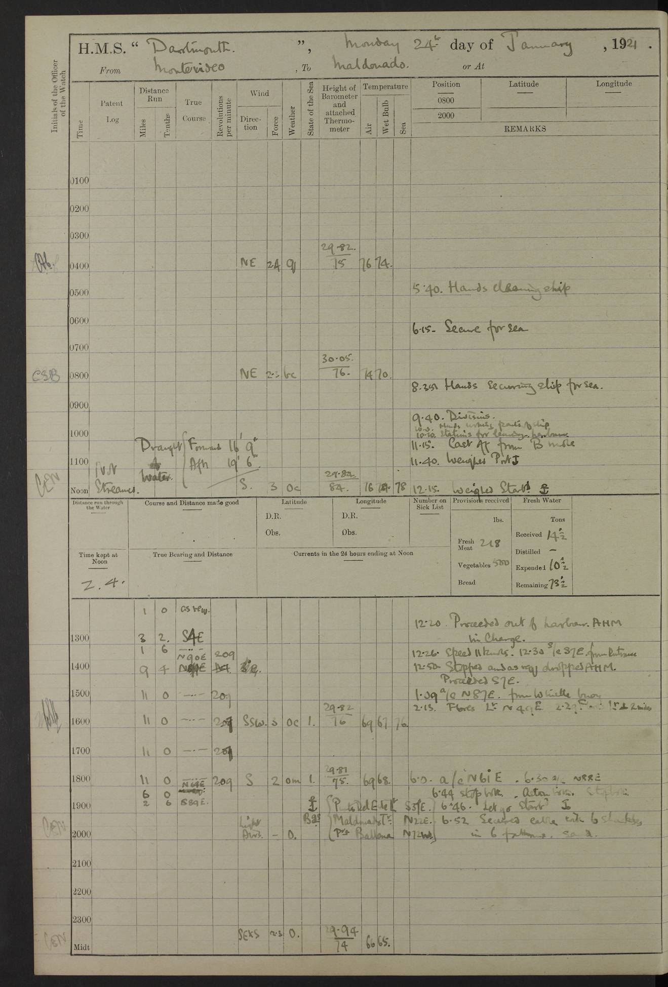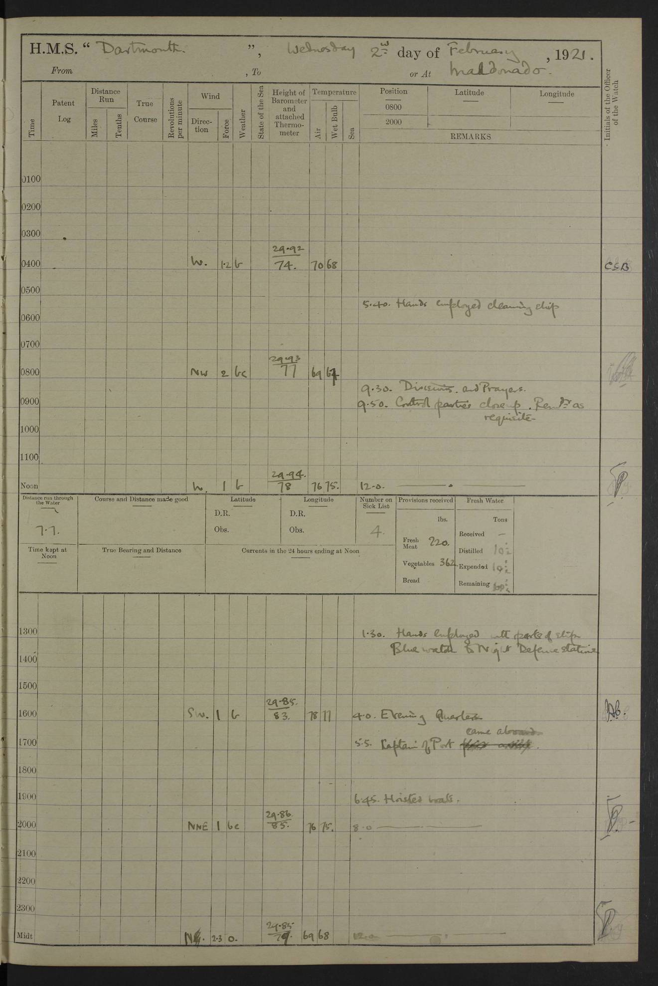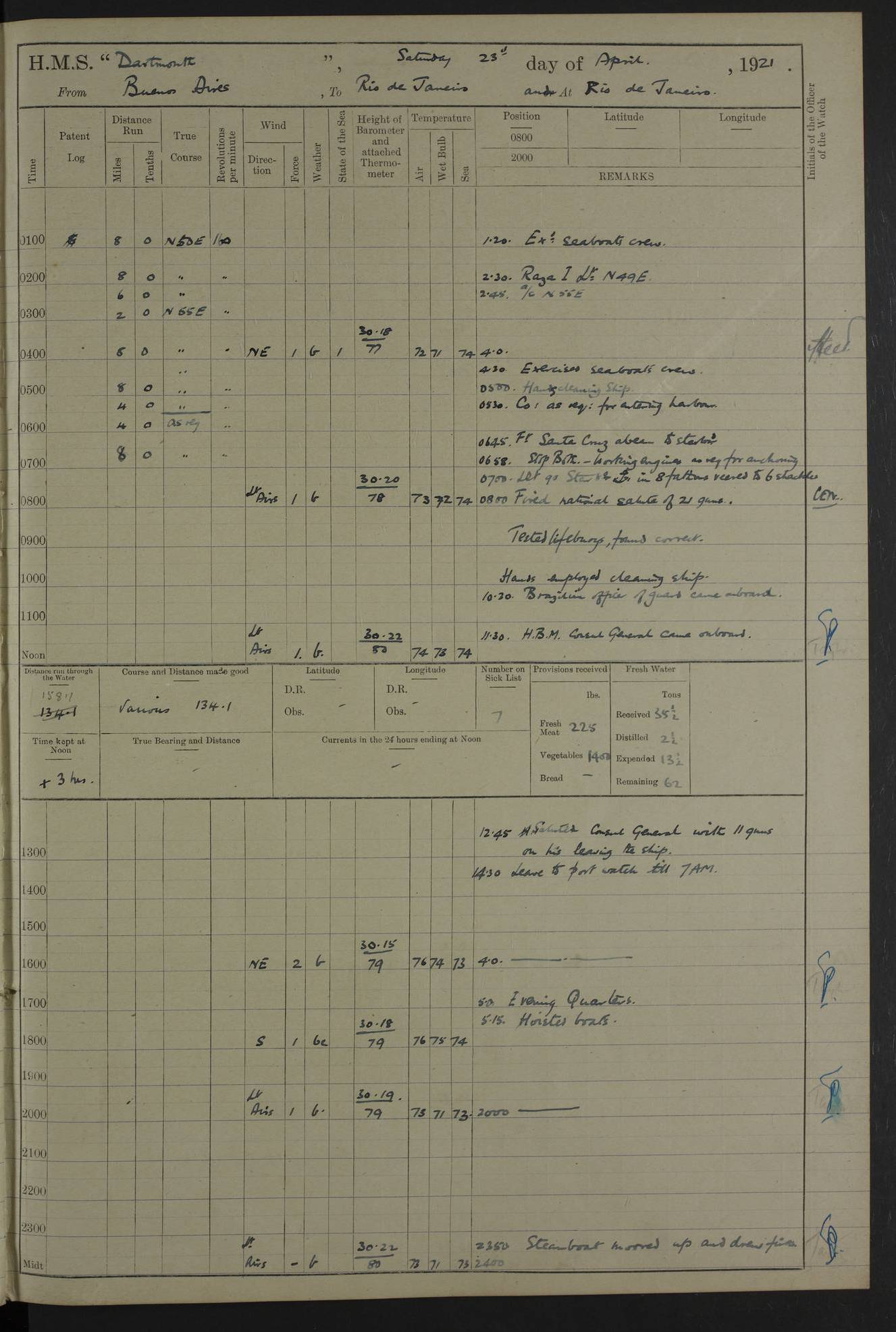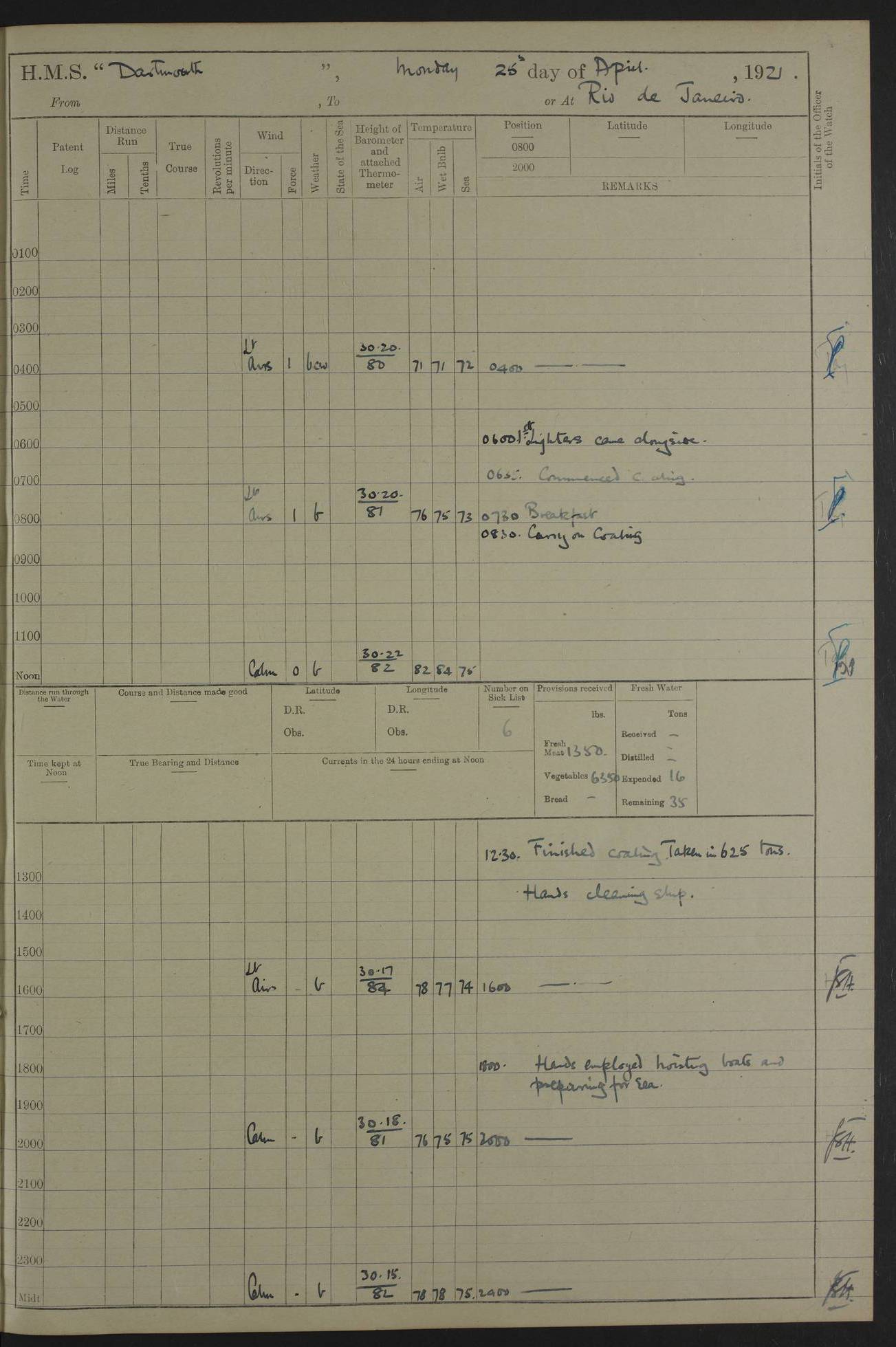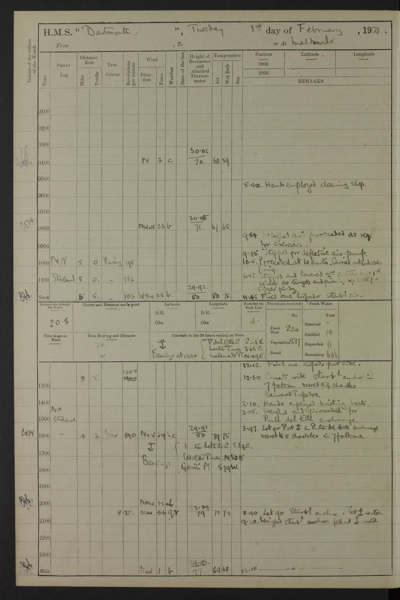 to that. 4caf861dcadfd34197013d65: (http://oldweather.s3.amazonaws.com/ADM53-39530/ADM 53-39530-009_1.jpg) 13 April 1920 Montevideo Lat -34.90, Long -56.22 5.45am: Hands preparing for coaling 6.00am: First lighter secured alongside 6.50am: Commenced coaling 2.48pm: Finished coaling, received 810 tons of coal 3.45pm: 1 Petty Officer Telegraphist joined ship from HMS “Southampton”. Hands cleaning ship Number on sick list 8 4caf861dcadfd34197013d66: (http://oldweather.s3.amazonaws.com/ADM53-39530/ADM 53-39530-010_0.jpg) 14 April 1920 Montevideo Lat -34.90, Long -56.22 9.30am: 1 officer & 3 ratings to flagship for medical survey 1.30pm: Hands spreading awnings. Received practice ammunition from flagship 6.30pm: Paymaster [?] Midshipman Bennett lent from HMS “Southampton” Number on sick list 8 4caf861dcadfd34197013d67: (http://oldweather.s3.amazonaws.com/ADM53-39530/ADM 53-39530-010_1.jpg) 15 April 1920 Montevideo to Maldonado Lat -35.17, Long -56.33 8.30am: Boats crews securing boats for sea 9.57am: Weighed & proceeded 10.55am: Stopped. Dropped off pilot 11.00am: Proceeded on station, 5’ of starboard beam of flag 11.20am: Course & speed as requisite for gunnery exercises 4.00pm: Station astern of flag, 2½ cables 5.44pm: Anchored Number on sick list 7 4caf861dcadfd34197013d68: (http://oldweather.s3.amazonaws.com/ADM53-39530/ADM 53-39530-011_0.jpg) 16 April 1920 Maldonado Lat -34.95, Long -54.96 5.40am: Torpedo men as requisite. Remainder of hands cleaning ship 6.15am: Fired three torpedoes from port tube 10.00am: At ‘lower anchor’. Weighed by hand 1.00pm: Training classes at instruction 4.00pm: Quarters. Read warrant no 86 5.00pm: Hands to bathe Number on sick list 5 4caf861dcadfd34197013d69: (http://oldweather.s3.amazonaws.com/ADM53-39530/ADM 53-39530-011_1.jpg) 17 April 1920 Maldonado Lat -34.95, Long -54.96 5.40am: Concert party rigging stage 7.40am: Hands to bathe 1.00pm: Hands make & mend clothes 5.00pm: Evening Quarters. Hands to bathe 5.50pm: Libertymen returned 6.00pm: Closed B & C doors 8.20pm: Concert party from HMS “Southampton” came on board. Held concert on Quarter Deck 11.00pm: “Southampton’s” concert party left ship Number on sick list 4 4caf861dcadfd34197013d6a: (http://oldweather.s3.amazonaws.com/ADM53-39530/ADM 53-39530-012_0.jpg) 18 April 1920 Maldonado Lat -34.95, Long -54.96 5.40am: Hands unrigging concert stage & cleaning ship 10.50am: Divine Service held 11.40am: Hands to bathe 5.00pm: Hands to bathe Number on sick list 5 4caf861dcadfd34197013d6b: (http://oldweather.s3.amazonaws.com/ADM53-39530/ADM 53-39530-012_1.jpg) 19 April 1920 Maldonado Lat -34.94, Long -54.97 7.30am: Hands to bathe 9.12am: Weighed & proceeded as requisite for carrying out sub-calibre firing 10.50am: Anchored 1.30pm: Training classes at instruction 5.00pm: Hands to bathe 6.00pm: Read warrant no 87 Number on sick list 5 4caf861dcadfd34197013d6c: (http://oldweather.s3.amazonaws.com/ADM53-39530/ADM 53-39530-013_0.jpg) 20 April 1920 Maldonado Lat -35.00, Long -55.15 [est] 5.40am: Gunner’s & torpedo party as requisite. Remainder cleaning ship 8.50am: Exercised ‘Action Stations’ 9.04am: Weighed & proceeded. Took station ahead of flag, 1 mile. Course & speed as requisite for spreading 9.57am: Opened fire 10.19am: Ceased fire & secured. Course & speed as requisite for “Southampton’s” firing 11.45am: Stopped 12.46pm: Proceeded 1.30pm: Gunner’s party as requisite. Remainder employed preparing paravanes for running 1.40pm: Fired torpedo from starboard tube 3.00pm: Anchored Number on sick list 5 4caf861dcadfd34197013d6d: (http://oldweather.s3.amazonaws.com/ADM53-39530/ADM 53-39530-013_1.jpg) 21 April 1920 Maldonado Lat -34.95, Long -54.96 9.30am: Prepare to tow aft 9.40am: Out collision mat 9.50am: Let go starboard anchor 9.51am: Rig hand capstan & weigh by hand 10.18am: Replaced gear Number on sick list 4 4caf861dcadfd34197013d6e: (http://oldweather.s3.amazonaws.com/ADM53-39530/ADM 53-39530-014_0.jpg) 22 April 1920 Maldonado Lat -35.00, Long -55.15 [est] 5.40am: Torpedo & gunnery parties as requisite. Remainder of hands cleaning ship 9.01am: Weighed port anchor & proceeded, course & speed as requisite for carrying out gunnery & torpedo exercises Noon: Stopped both engines 12.45pm: Proceeded as requisite for torpedo firing 2.45pm: Fired torpedo. As requisite for laying out target & anchoring 3.51pm: Anchored 5.55pm: Weighed & proceeded as requisite for night firing 6.40pm: Anchored Number on sick list 4 4caf861dcadfd34197013d6f: (http://oldweather.s3.amazonaws.com/ADM53-39530/ADM 53-39530-014_1.jpg) 23 April 1920 Maldonado Lat -34.95, Long -54.96 6.00am: Gunner’s & side parties as requisite 7.30am: Hands to bathe 10.30am: Divers to examination 3.00pm: Torpedo parties as requisite. All boats away sailing 5.40pm: Hoisted boats 5.55pm: Weighed & proceeded as requisite for torpedo firing 6.16pm: Fired torpedo 7.31pm: Anchored Number on sick list 5 4caf861dcadfd34197013d70: (http://oldweather.s3.amazonaws.com/ADM53-39530/ADM 53-39530-015_0.jpg) 24 April 1920 Maldonado Lat -34.95, Long -54.96 1.00pm: Hands make & mend clothes 1.30pm: Landed libertymen & bathing party 3.45pm: Bathing party returned 5.10pm: Hands to bathe Number on sick list 5 4caf861dcadfd34197013d71: (http://oldweather.s3.amazonaws.com/ADM53-39530/ADM 53-39530-015_1.jpg) 25 April 1920 Maldonado Lat -34.95, Long -54.96 9.30am: Hands muster by the ledger 10.00am: Read ‘Articles of War’ 10.20am: Divine Service held 1.00pm: Gave leave to watch & boys till 5.30pm 1.30pm: Landed libertymen 5.15pm: Hands to bathe Number on sick list 4 4caf861dcadfd34197013d72: (http://oldweather.s3.amazonaws.com/ADM53-39530/ADM 53-39530-016_0.jpg) 26 April 1920 Maldonado to Rio Grande do Sul Lat -35.07, Long -54.83 5.40am: Torpedo party as requisite. Boats securing for sea 9.02am: Weighed & proceeded as requisite for firing torpedo 11.10am: ‘Out paravanes’ 12.45pm: San José Ignacio Light N20E [Uruguay Lat -34.8, Long-54.6] 