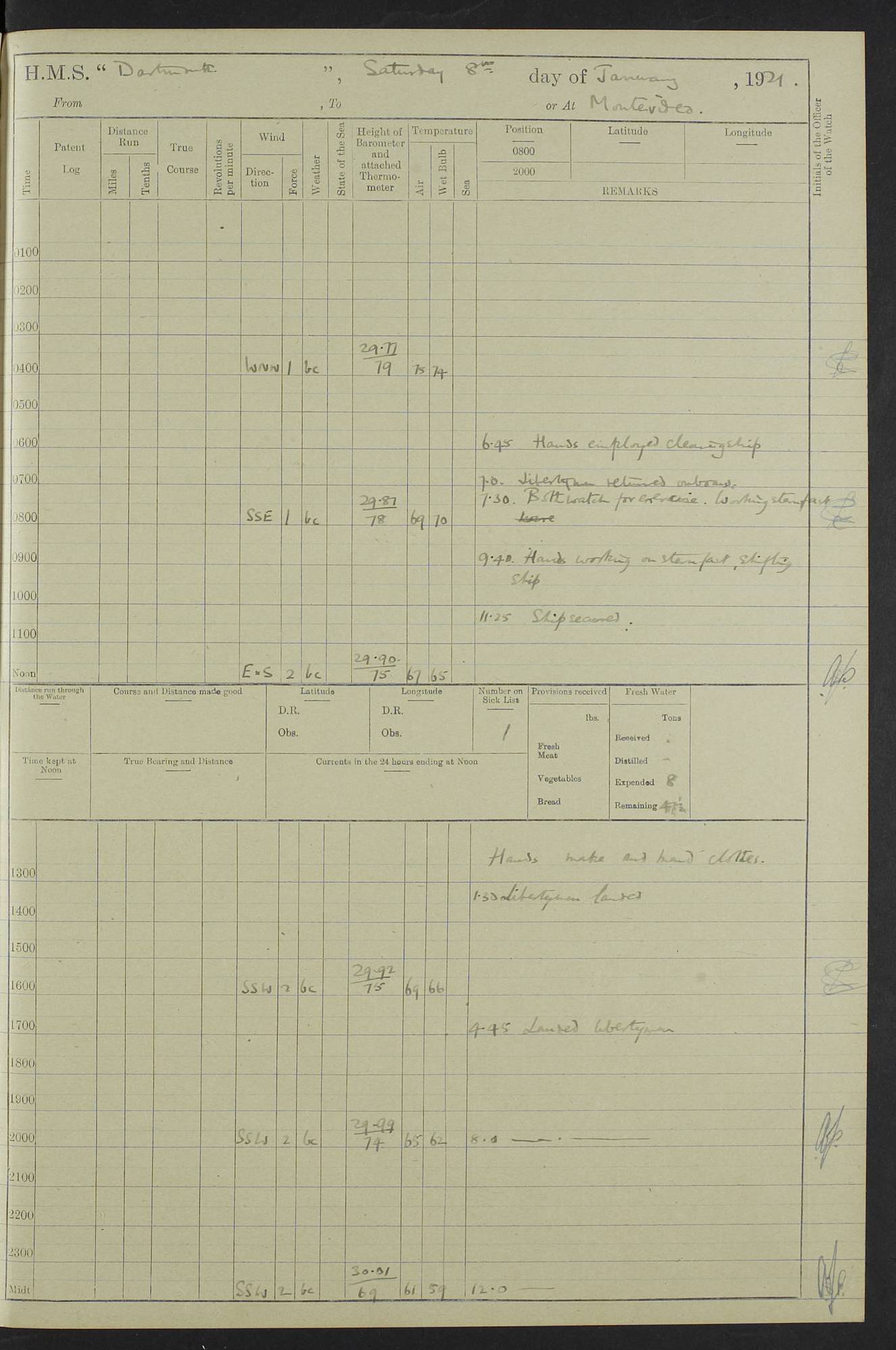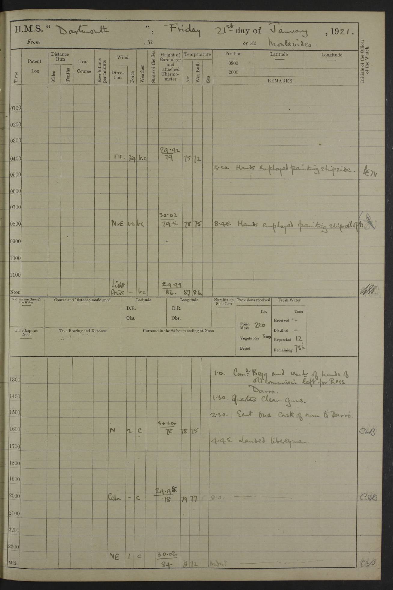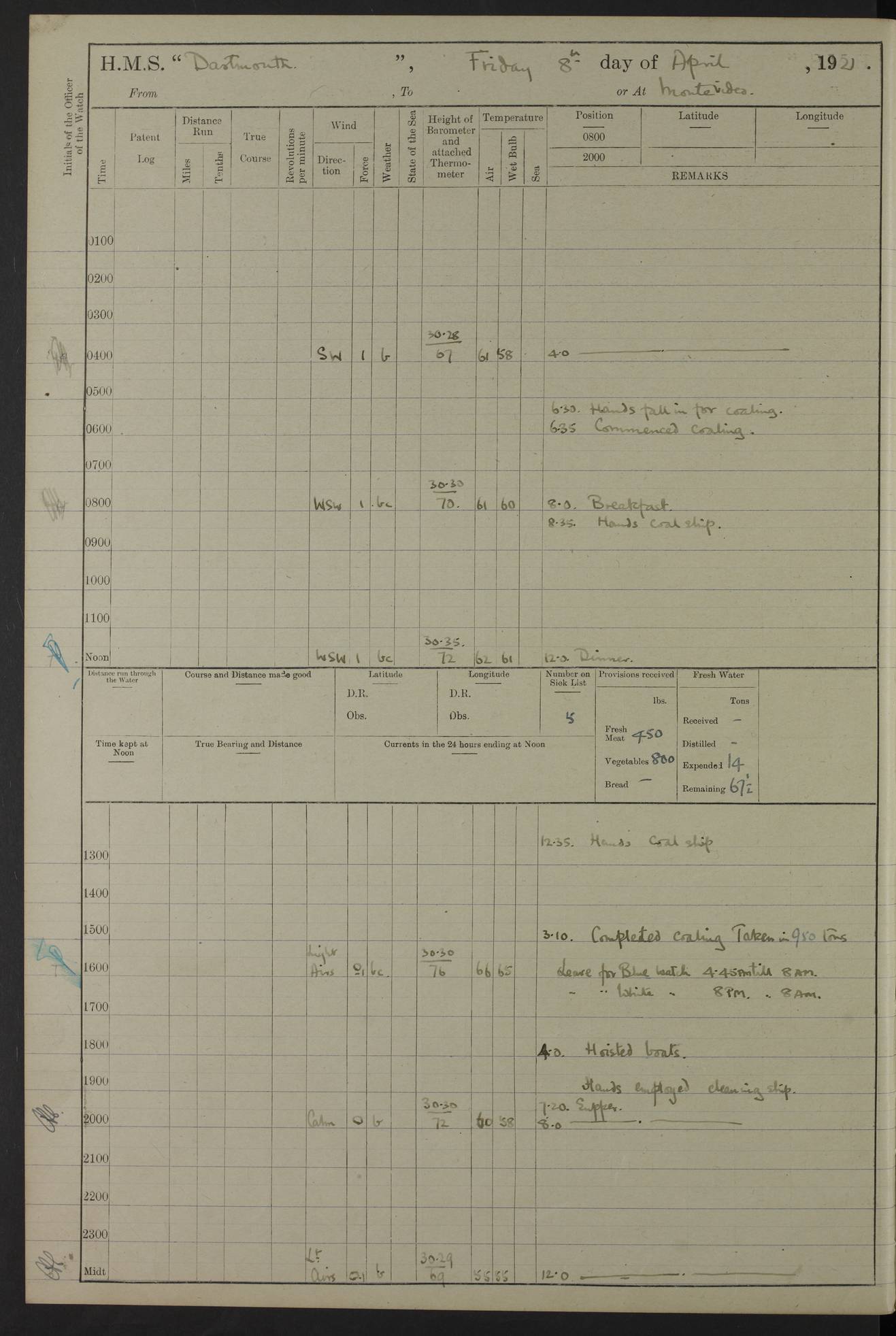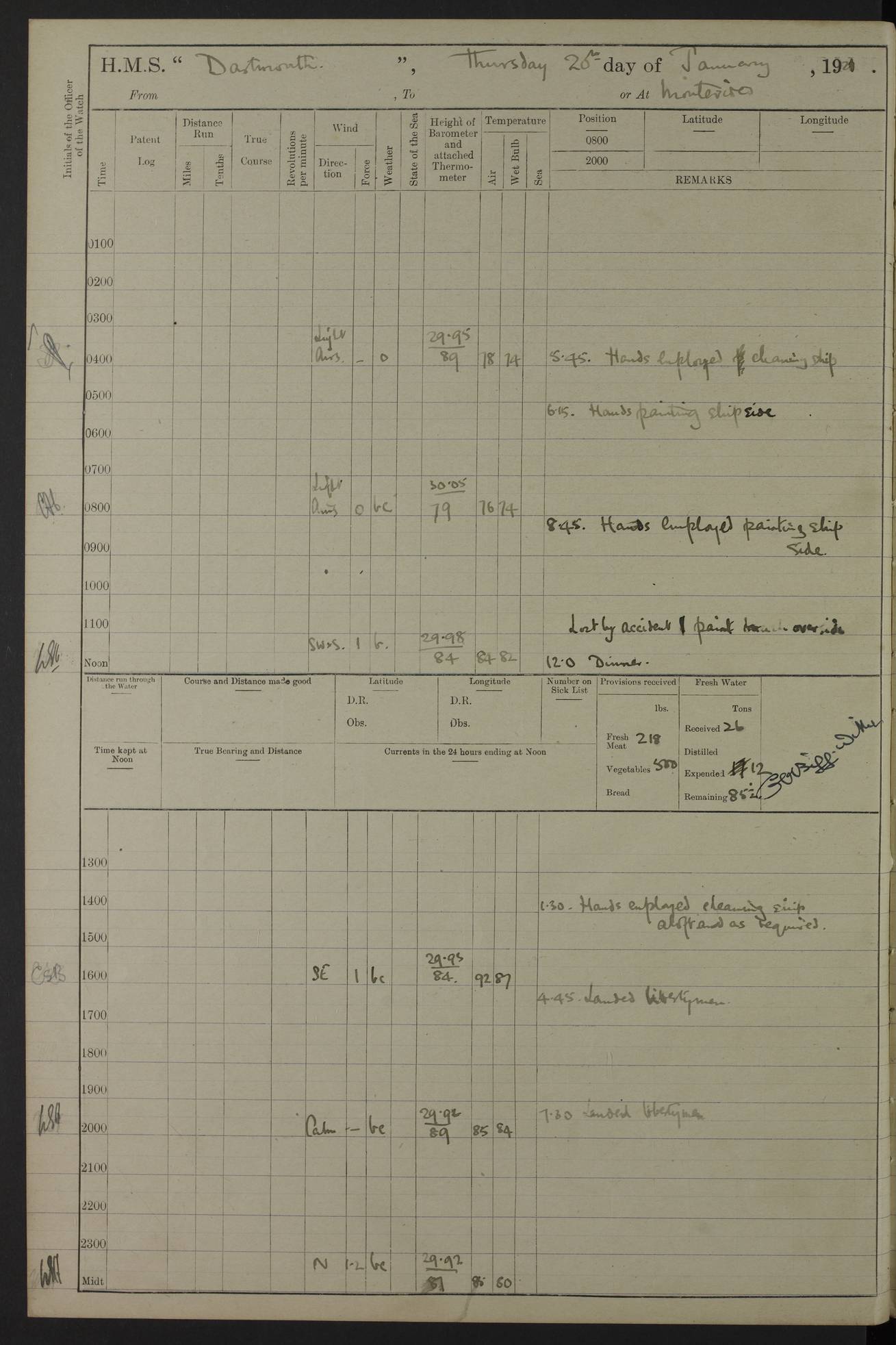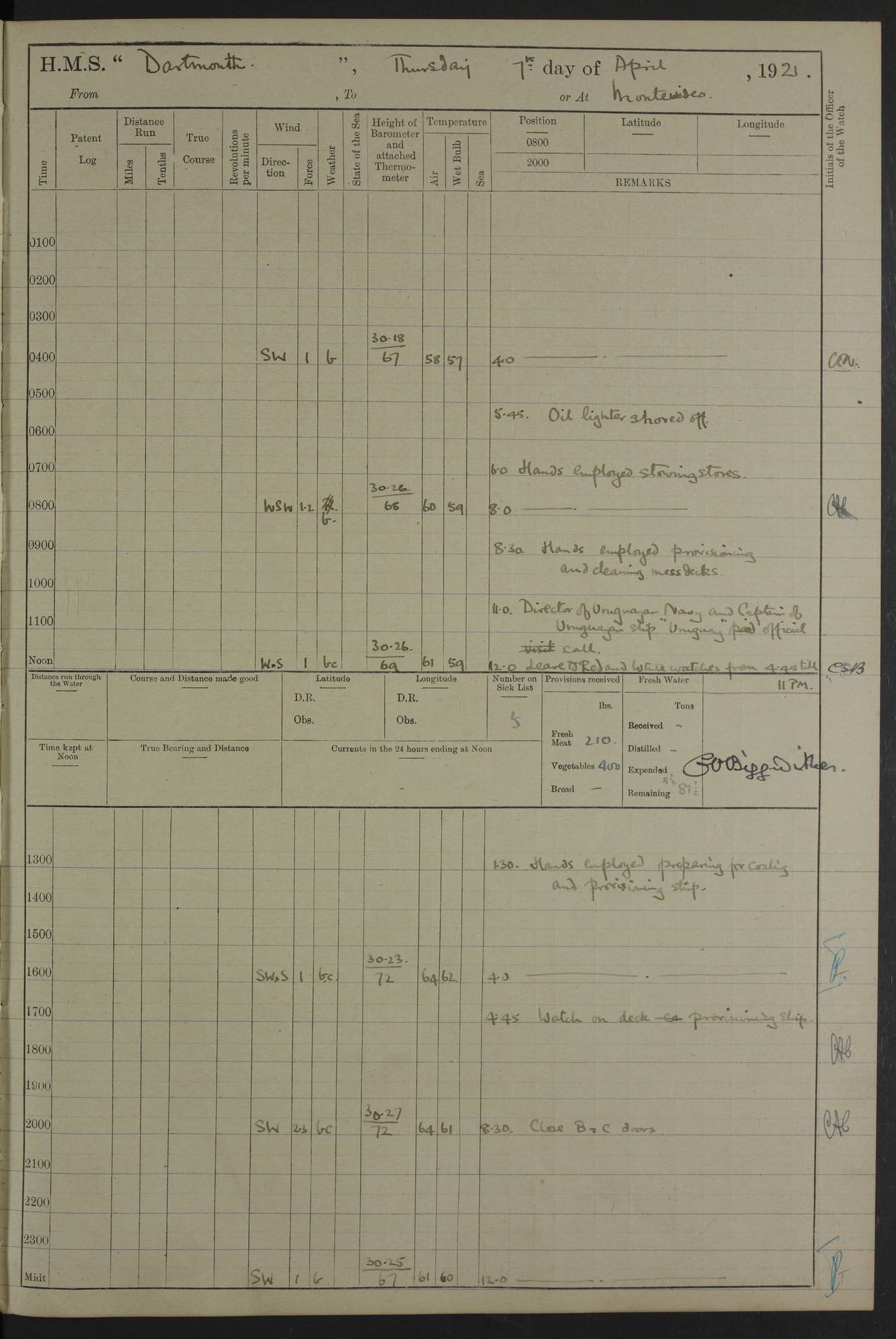 4caf861ccadfd34197013d30: (http://oldweather.s3.amazonaws.com/ADM53-39529/ADM 53-39529-003_0.jpg) Weather Instruments Mercurial barometer, Adie A641, cistern 15 feet above sea Air Temperature Thermometers, screened on forebridge, Negretti & Zambra AM 10484, 10485 Sea Temperature Thermometer, Negretti & Zambra AM 10487 4caf861ccadfd34197013d31: (http://oldweather.s3.amazonaws.com/ADM53-39529/ADM 53-39529-003_1.jpg) 1 March 1920 Montevideo Lat -34.90, Long -56.22 8.00am: Fresh water tanker alongside 8.20am: Hands provisioning ship 11.45am: Five ratings joined ship from England 5.00pm: Hands to bathe Number on sick list 3 [A local overnight leave rota is continuing.] 4caf861ccadfd34197013d32: (http://oldweather.s3.amazonaws.com/ADM53-39529/ADM 53-39529-004_0.jpg) 2 March 1920 Montevideo Lat -34.90, Long -56.22 5.40am: Hands provisioning ship 5.00pm: Stokers to evening Quarters. Hands to bathe Number on sick list 3 4caf861ccadfd34197013d33: (http://oldweather.s3.amazonaws.com/ADM53-39529/ADM 53-39529-004_1.jpg) 3 March 1920 Montevideo Lat -34.90, Long -56.22 5.40am: Hands cleaning ship. Gunners party getting up Lyddite shell 5.00pm: Stokers to Evening Quarters Number on sick list 3 4caf861ccadfd34197013d34: (http://oldweather.s3.amazonaws.com/ADM53-39529/ADM 53-39529-005_0.jpg) 4 March 1920 Montevideo Lat -34.90, Long -56.22 7.30am: Boom & side parties as requisite. Remainder getting in stores 4.00pm: Evening Quarters. Read warrant no 73 5.30pm: Landed patrol 7.25pm: Patrol returned on board Number on sick list 3 4caf861ccadfd34197013d35: (http://oldweather.s3.amazonaws.com/ADM53-39529/ADM 53-39529-005_1.jpg) 5 March 1920 Montevideo Lat -34.90, Long -56.22 Hands cleaning ship’s side Number on sick list 4 4caf861ccadfd34197013d36: (http://oldweather.s3.amazonaws.com/ADM53-39529/ADM 53-39529-006_0.jpg) 6 March 1920 Montevideo Lat -34.90, Long -56.22 9.00am: Discharged 1 Petty Officer to SS “Thorpe Grange”. Hands painting ship’s side 1.00pm: Hands make & mend clothes 5.00pm: Evening Quarters. Read warrant no 74 Number on sick list 4 [SS “Thorpe Grang”e, 4110 tons, was originally built for Thomas Mayo & Co by the London & Glasgow Shipbuilding Co and named “Indramayo”. She was sold to Houlder Bros in 1901 and renamed “Thorpe Grange”. In 1925 she was the first ship to unload a cargo of chilled meat at Southampton. In 1930 she was scrapped.] 4caf861ccadfd34197013d37: (http://oldweather.s3.amazonaws.com/ADM53-39529/ADM 53-39529-006_1.jpg) 7 March 1920 Montevideo Lat -34.90, Long -56.22 9.00am: Landed hospital party 9.10am: Landed cricket & picnic parties 10.05am: Landed Roman Catholics 10.30am: Performed Divine Service 11.20am: Roman Catholic Church party & hospital party returned on board 6.10pm: Picnic & cricket parties returned on board Number on sick list 7 4caf861ccadfd34197013d38: (http://oldweather.s3.amazonaws.com/ADM53-39529/ADM 53-39529-007_0.jpg) 8 March 1920 Montevideo Lat -34.90, Long -56.22 3.30am: Gave leave to starboard watch from 4.45pm to 7am Thursday & leave to 1st part of port watch till 10pm 4.00am: Evening Quarters. Read warrants nos. 75 & 76 Number on sick list 8 4caf861ccadfd34197013d39: (http://oldweather.s3.amazonaws.com/ADM53-39529/ADM 53-39529-007_1.jpg) 9 March 1920 Montevideo Lat -34.90, Long -56.22 8.20am: Hands employed getting in canteen stores 9.00am: Landed picnic party 4.15pm: Evening Quarters. Read warrant no 77 5.00pm: Gave leave to part of watch till 10.30pm Number on sick list 10 4caf861ccadfd34197013d3a: (http://oldweather.s3.amazonaws.com/ADM53-39529/ADM 53-39529-008_0.jpg) 10 March 1920 Montevideo Lat -34.90, Long -56.22 11.00am: Gave leave to 1st part of port watch from 4.45pm till 10.30pm 2.00pm: 1 Engine Room Artificer, 1 Private Royal Marine Light Infantry & 4 stokers joined ship from SS “Highland Rover” taking passage & for HMS “Yarmouth” 5.00am: Hands to bathe Number on sick list 6 [SS “Highland Rover”, 7244 tons, was launched in 1910 for the Nelson Line. She was bought by Royal Mail in 1913 for service on the South America route.] 4caf861ccadfd34197013d3b: (http://oldweather.s3.amazonaws.com/ADM53-39529/ADM 53-39529-008_1.jpg) 11 March 1920 Montevideo Lat -34.90, Long -56.22 8.30am: Landed patrol 9.15am: Patrol returned with 4 absentees 11.00am: Lost by accident: 1 oil hand lamp pattern no 3275 1.00pm: Gave leave to port watch from 4.45pm to 7am Sunday & to 1st part of starboard watch till 10.30pm 5.12pm: Hands to bathe Number on sick list 6 4caf861ccadfd34197013d3c: (http://oldweather.s3.amazonaws.com/ADM53-39529/ADM 53-39529-009_0.jpg) 12 March 1920 Montevideo Lat -34.90, Long -56.22 9.00am: Landed picnic party 12.15pm: Steam cutter sunk 12.30pm: SS “Crema” fouled ship port side aft & caused damage on port side of ship 1.15pm: Hoisted 1st whaler & 1st cutter 1.30pm: SS “Crema” fouled ship, starboard side abreast foremost funnel & caused damage to davits, stanchions, & 1st cutter 3.15pm: Starboard watch employed clearing up upper deck 4.00pm: Watch employed preparing for diving 6.30pm: Finished diving for the night 7.00pm: 1 Yeoman of Signals joined ship for HMS “Yarmouth” Number on sick list 6 [The only “Crema” I can trace was an Italian freighter of 1684 tons which was sunk in 1943.] 4caf861ccadfd34197013d3d: (http://oldweather.s3.amazonaws.com/ADM53-39529/ADM 53-39529-009_1.jpg) 13 March 1920 Montevideo Lat -34.90, Long -56.22 5.40am: Diving party rigging boat 8.25am: Diving party as requisite. Remainder of hands raising steam cutter 9.00am: Landed hospital party 1.45pm: Hospital party returned on board 2.10pm: Watch bailing out steam cutter 4.00pm: Hoisted steam cutter & 1st whaler. Gave leave to part of watch from 4.45pm to 10.30pm 5.00pm: Part of watch raising steam cutter Number on sick list 6 4caf861ccadfd34197013d3e: (http://oldweather.s3.amazonaws.com/ADM53-39529/ADM 53-39529-009a_0.jpg) 14 March 1920 Montevideo Lat -34.90, Long -56.22 10.00am: Landed church parties 11.30am: Roman Catholic Ch