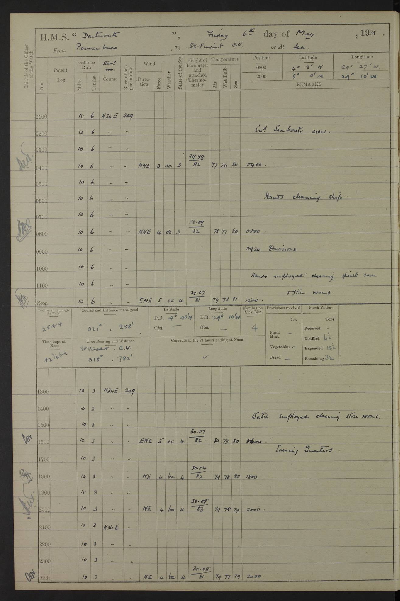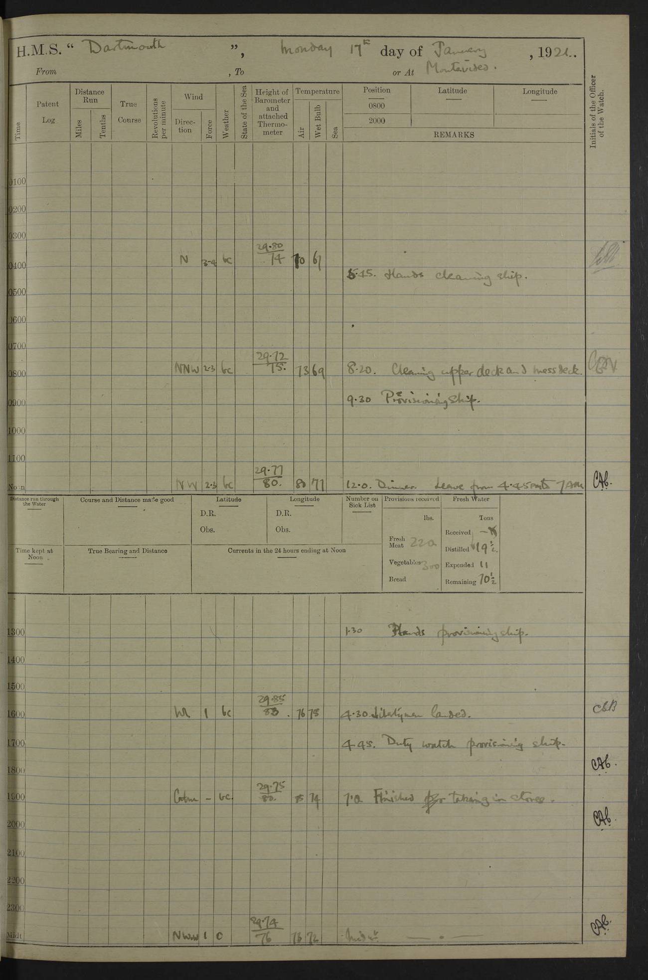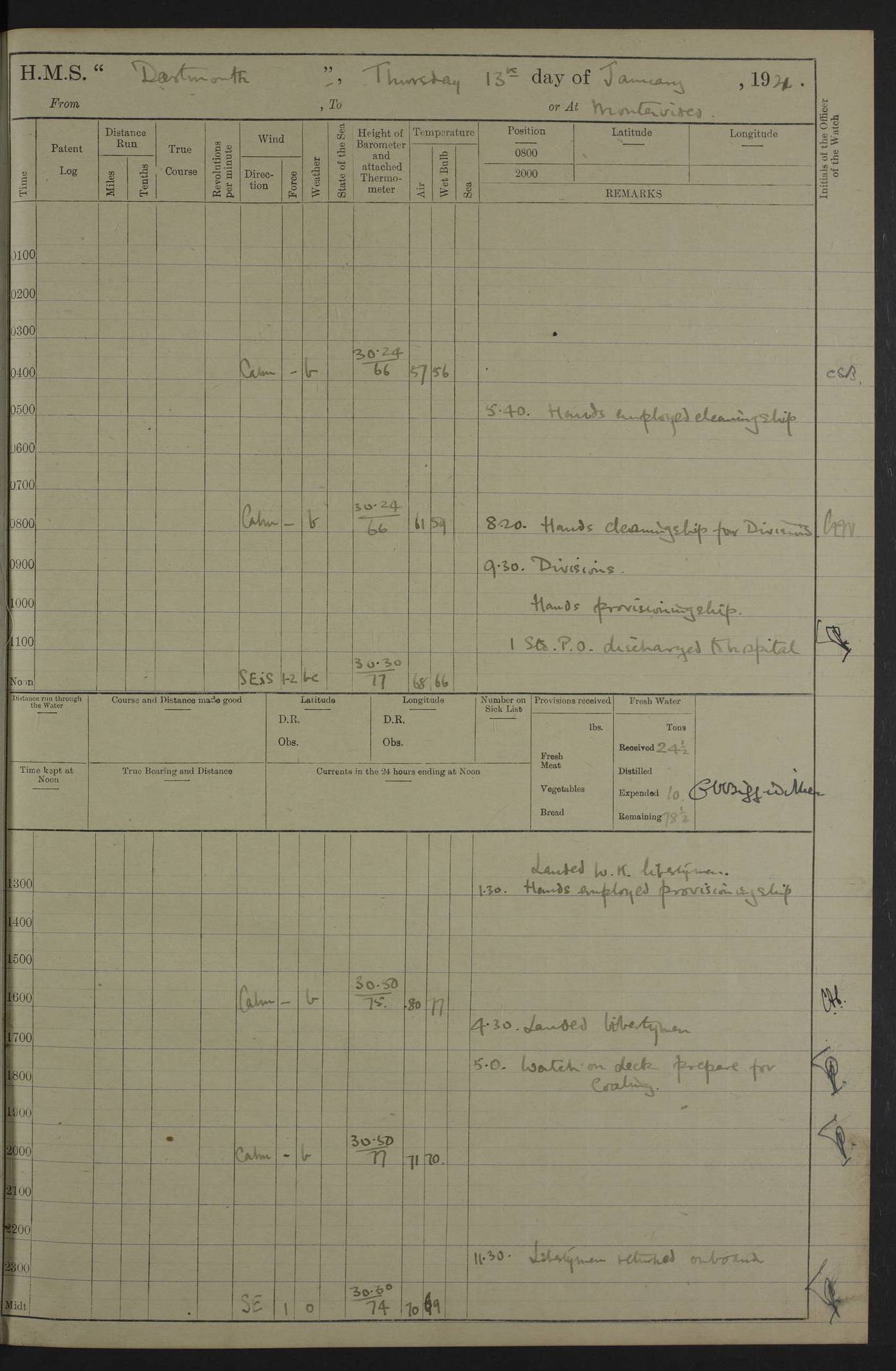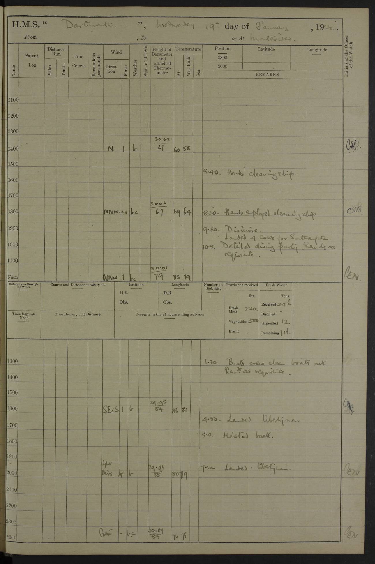 4caf861ccadfd34197013d30: (http://oldweather.s3.amazonaws.com/ADM53-39529/ADM 53-39529-003_0.jpg) Weather Instruments Mercurial barometer, Adie A641, cistern 15 feet above sea Air Temperature Thermometers, screened on forebridge, Negretti & Zambra AM 10484, 10485 Sea Temperature Thermometer, Negretti & Zambra AM 10487 4caf861ccadfd34197013d31: (http://oldweather.s3.amazonaws.com/ADM53-39529/ADM 53-39529-003_1.jpg) 1 March 1920 Montevideo Lat -34.90, Long -56.22 8.00am: Fresh water tanker alongside 8.20am: Hands provisioning ship 11.45am: Five ratings joined ship from England 5.00pm: Hands to bathe Number on sick list 3 [A local overnight leave rota is continuing.] 4caf861ccadfd34197013d32: (http://oldweather.s3.amazonaws.com/ADM53-39529/ADM 53-39529-004_0.jpg) 2 March 1920 Montevideo Lat -34.90, Long -56.22 5.40am: Hands provisioning ship 5.00pm: Stokers to evening Quarters. Hands to bathe Number on sick list 3 4caf861ccadfd34197013d33: (http://oldweather.s3.amazonaws.com/ADM53-39529/ADM 53-39529-004_1.jpg) 3 March 1920 Montevideo Lat -34.90, Long -56.22 5.40am: Hands cleaning ship. Gunners party getting up Lyddite shell 5.00pm: Stokers to Evening Quarters Number on sick list 3 4caf861ccadfd34197013d34: (http://oldweather.s3.amazonaws.com/ADM53-39529/ADM 53-39529-005_0.jpg) 4 March 1920 Montevideo Lat -34.90, Long -56.22 7.30am: Boom & side parties as requisite. Remainder getting in stores 4.00pm: Evening Quarters. Read warrant no 73 5.30pm: Landed patrol 7.25pm: Patrol returned on board Number on sick list 3 4caf861ccadfd34197013d35: (http://oldweather.s3.amazonaws.com/ADM53-39529/ADM 53-39529-005_1.jpg) 5 March 1920 Montevideo Lat -34.90, Long -56.22 Hands cleaning ship’s side Number on sick list 4 4caf861ccadfd34197013d36: (http://oldweather.s3.amazonaws.com/ADM53-39529/ADM 53-39529-006_0.jpg) 6 March 1920 Montevideo Lat -34.90, Long -56.22 9.00am: Discharged 1 Petty Officer to SS “Thorpe Grange”. Hands painting ship’s side 1.00pm: Hands make & mend clothes 5.00pm: Evening Quarters. Read warrant no 74 Number on sick list 4 [SS “Thorpe Grang”e, 4110 tons, was originally built for Thomas Mayo & Co by the London & Glasgow Shipbuilding Co and named “Indramayo”. She was sold to Houlder Bros in 1901 and renamed “Thorpe Grange”. In 1925 she was the first ship to unload a cargo of chilled meat at Southampton. In 1930 she was scrapped.] 4caf861ccadfd34197013d37: (http://oldweather.s3.amazonaws.com/ADM53-39529/ADM 53-39529-006_1.jpg) 7 March 1920 Montevideo Lat -34.90, Long -56.22 9.00am: Landed hospital party 9.10am: Landed cricket & picnic parties 10.05am: Landed Roman Catholics 10.30am: Performed Divine Service 11.20am: Roman Catholic Church party & hospital party returned on board 6.10pm: Picnic & cricket parties returned on board Number on sick list 7 4caf861ccadfd34197013d38: (http://oldweather.s3.amazonaws.com/ADM53-39529/ADM 53-39529-007_0.jpg) 8 March 1920 Montevideo Lat -34.90, Long -56.22 3.30am: Gave leave to starboard watch from 4.45pm to 7am Thursday & leave to 1st part of port watch till 10pm 4.00am: Evening Quarters. Read warrants nos. 75 & 76 Number on sick list 8 4caf861ccadfd34197013d39: (http://oldweather.s3.amazonaws.com/ADM53-39529/ADM 53-39529-007_1.jpg) 9 March 1920 Montevideo Lat -34.90, Long -56.22 8.20am: Hands employed getting in canteen stores 9.00am: Landed picnic party 4.15pm: Evening Quarters. Read warrant no 77 5.00pm: Gave leave to part of watch till 10.30pm Number on sick list 10 4caf861ccadfd34197013d3a: (http://oldweather.s3.amazonaws.com/ADM53-39529/ADM 53-39529-008_0.jpg) 10 March 1920 Montevideo Lat -34.90, Long -56.22 11.00am: Gave leave to 1st part of port watch from 4.45pm till 10.30pm 2.00pm: 1 Engine Room Artificer, 1 Private Royal Marine Light Infantry & 4 stokers joined ship from SS “Highland Rover” taking passage & for HMS “Yarmouth” 5.00am: Hands to bathe Number on sick list 6 [SS “Highland Rover”, 7244 tons, was launched in 1910 for the Nelson Line. She was bought by Royal Mail in 1913 for service on the South America route.] 4caf861ccadfd34197013d3b: (http://oldweather.s3.amazonaws.com/ADM53-39529/ADM 53-39529-008_1.jpg) 11 March 1920 Montevideo Lat -34.90, Long -56.22 8.30am: Landed patrol 9.15am: Patrol returned with 4 absentees 11.00am: Lost by accident: 1 oil hand lamp pattern no 3275 1.00pm: Gave leave to port watch from 4.45pm to 7am Sunday & to 1st part of starboard watch till 10.30pm 5.12pm: Hands to bathe Number on sick list 6 4caf861ccadfd34197013d3c: (http://oldweather.s3.amazonaws.com/ADM53-39529/ADM 53-39529-009_0.jpg) 12 March 1920 Montevideo Lat -34.90, Long -56.22 9.00am: Landed picnic party 12.15pm: Steam cutter sunk 12.30pm: SS “Crema” fouled ship port side aft & caused damage on port side of ship 1.15pm: Hoisted 1st whaler & 1st cutter 1.30pm: SS “Crema” fouled ship, starboard side abreast foremost funnel & caused damage to davits, stanchions, & 1st cutter 3.15pm: Starboard watch employed clearing up upper deck 4.00pm: Watch employed preparing for diving 6.30pm: Finished diving for the night 7.00pm: 1 Yeoman of Signals joined ship for HMS “Yarmouth” Number on sick list 6 [The only “Crema” I can trace was an Italian freighter of 1684 tons which was sunk in 1943.] 4caf861ccadfd34197013d3d: (http://oldweather.s3.amazonaws.com/ADM53-39529/ADM 53-39529-009_1.jpg) 13 March 1920 Montevideo Lat -34.90, Long -56.22 5.40am: Diving party rigging boat 8.25am: Diving party as requisite. Remainder of hands raising steam cutter 9.00am: Landed hospital party 1.45pm: Hospital party returned on board 2.10pm: Watch bailing out steam cutter 4.00pm: Hoisted steam cutter & 1st whaler. Gave leave to part of watch from 4.45pm to 10.30pm 5.00pm: Part of watch raising steam cutter Number on sick list 6 4caf861ccadfd34197013d3e: (http://oldweather.s3.amazonaws.com/ADM53-39529/ADM 53-39529-009a_0.jpg) 14 March 1920 Montevideo Lat -34.90, Long -56.22 10.00am: Landed church parties 11.30am: Roman Catholic Ch