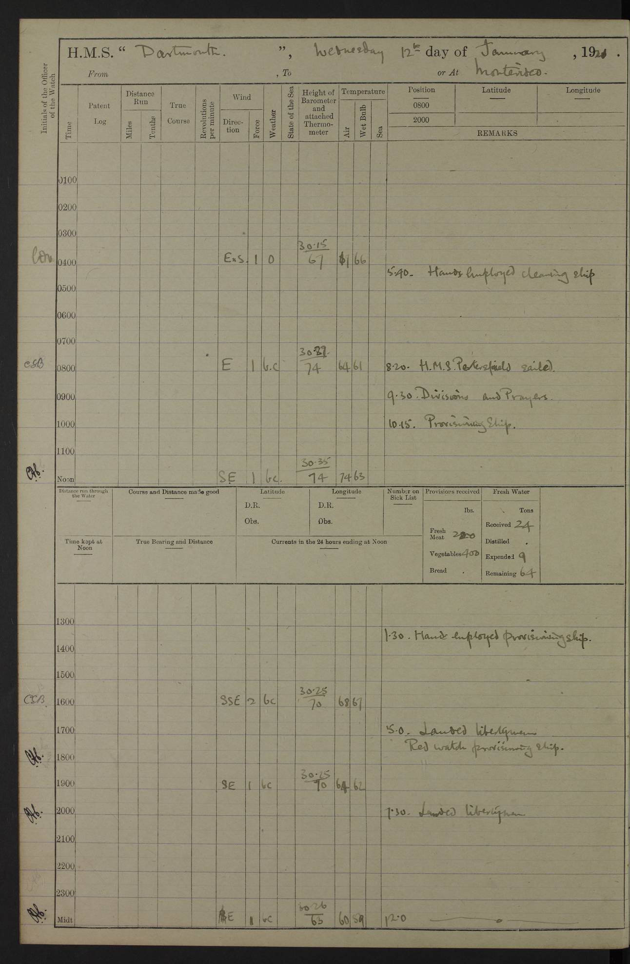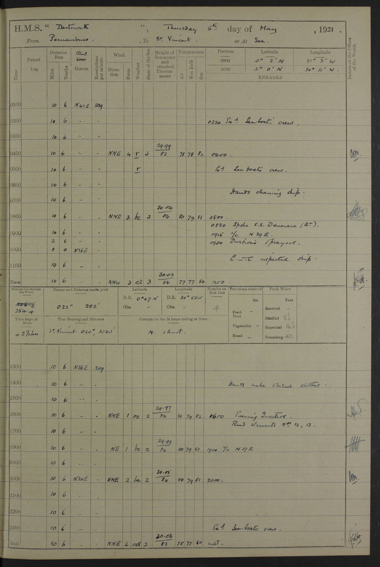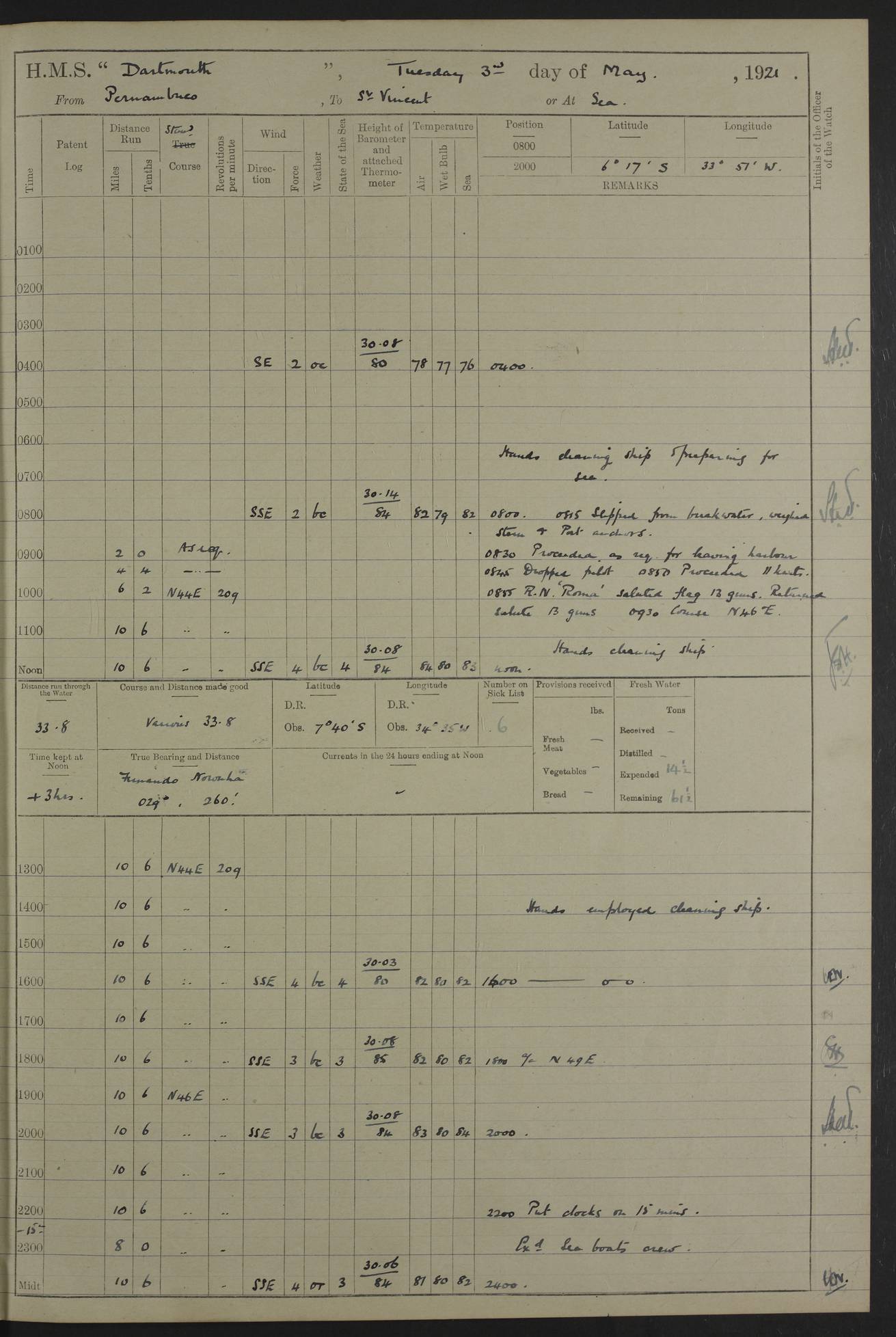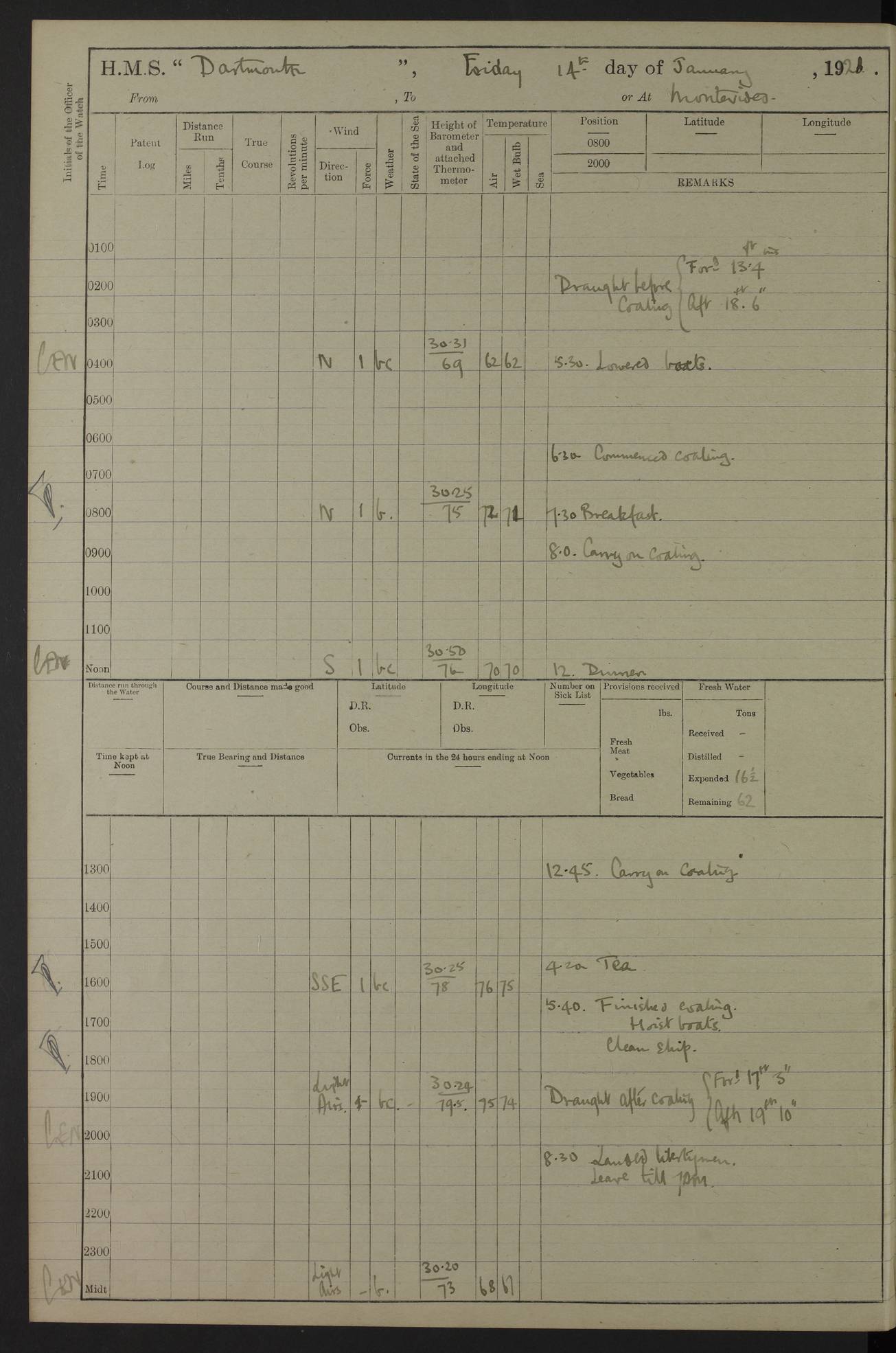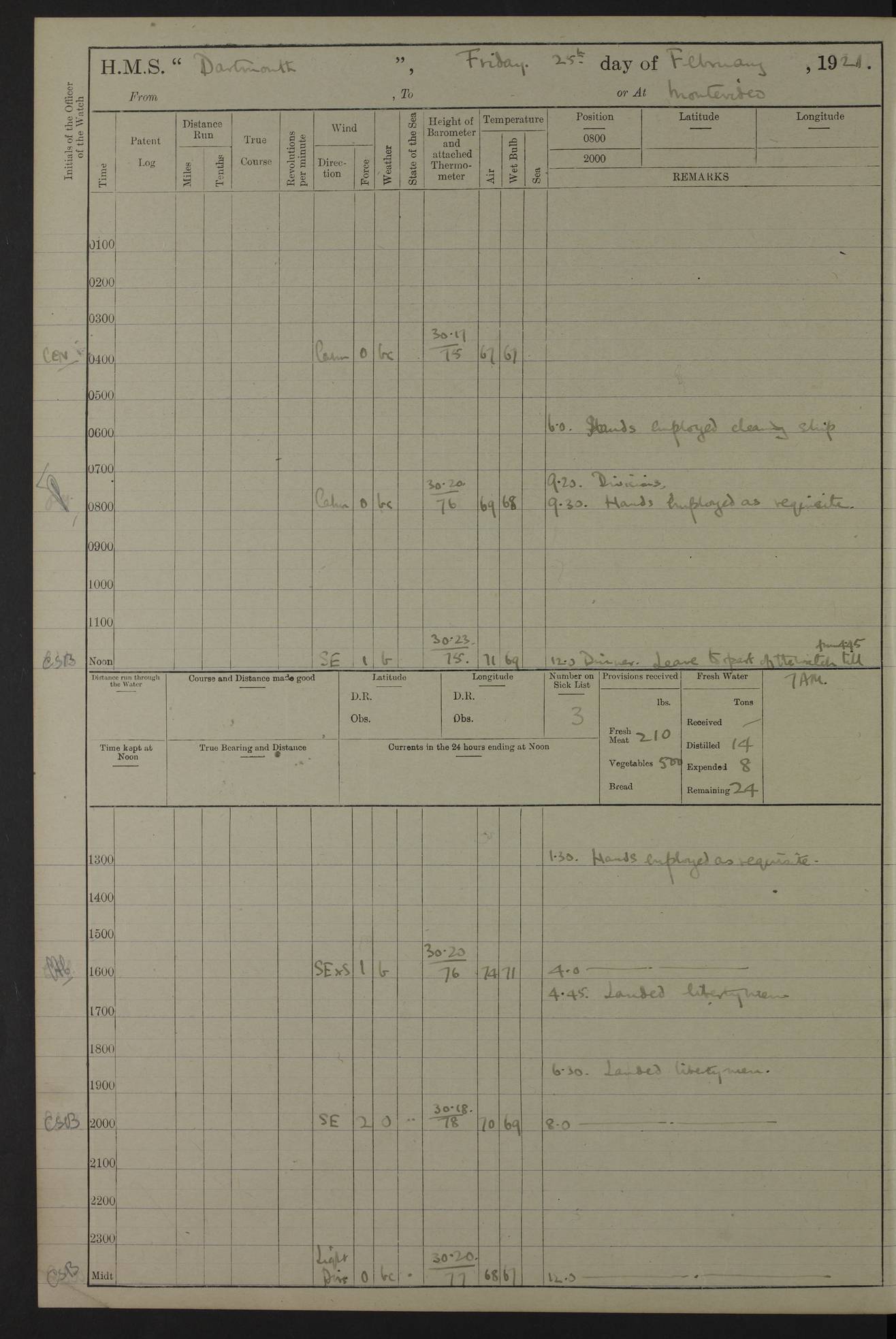 4caf861ccadfd34197013d30: (http://oldweather.s3.amazonaws.com/ADM53-39529/ADM 53-39529-003_0.jpg) Weather Instruments Mercurial barometer, Adie A641, cistern 15 feet above sea Air Temperature Thermometers, screened on forebridge, Negretti & Zambra AM 10484, 10485 Sea Temperature Thermometer, Negretti & Zambra AM 10487 4caf861ccadfd34197013d31: (http://oldweather.s3.amazonaws.com/ADM53-39529/ADM 53-39529-003_1.jpg) 1 March 1920 Montevideo Lat -34.90, Long -56.22 8.00am: Fresh water tanker alongside 8.20am: Hands provisioning ship 11.45am: Five ratings joined ship from England 5.00pm: Hands to bathe Number on sick list 3 [A local overnight leave rota is continuing.] 4caf861ccadfd34197013d32: (http://oldweather.s3.amazonaws.com/ADM53-39529/ADM 53-39529-004_0.jpg) 2 March 1920 Montevideo Lat -34.90, Long -56.22 5.40am: Hands provisioning ship 5.00pm: Stokers to evening Quarters. Hands to bathe Number on sick list 3 4caf861ccadfd34197013d33: (http://oldweather.s3.amazonaws.com/ADM53-39529/ADM 53-39529-004_1.jpg) 3 March 1920 Montevideo Lat -34.90, Long -56.22 5.40am: Hands cleaning ship. Gunners party getting up Lyddite shell 5.00pm: Stokers to Evening Quarters Number on sick list 3 4caf861ccadfd34197013d34: (http://oldweather.s3.amazonaws.com/ADM53-39529/ADM 53-39529-005_0.jpg) 4 March 1920 Montevideo Lat -34.90, Long -56.22 7.30am: Boom & side parties as requisite. Remainder getting in stores 4.00pm: Evening Quarters. Read warrant no 73 5.30pm: Landed patrol 7.25pm: Patrol returned on board Number on sick list 3 4caf861ccadfd34197013d35: (http://oldweather.s3.amazonaws.com/ADM53-39529/ADM 53-39529-005_1.jpg) 5 March 1920 Montevideo Lat -34.90, Long -56.22 Hands cleaning ship’s side Number on sick list 4 4caf861ccadfd34197013d36: (http://oldweather.s3.amazonaws.com/ADM53-39529/ADM 53-39529-006_0.jpg) 6 March 1920 Montevideo Lat -34.90, Long -56.22 9.00am: Discharged 1 Petty Officer to SS “Thorpe Grange”. Hands painting ship’s side 1.00pm: Hands make & mend clothes 5.00pm: Evening Quarters. Read warrant no 74 Number on sick list 4 [SS “Thorpe Grang”e, 4110 tons, was originally built for Thomas Mayo & Co by the London & Glasgow Shipbuilding Co and named “Indramayo”. She was sold to Houlder Bros in 1901 and renamed “Thorpe Grange”. In 1925 she was the first ship to unload a cargo of chilled meat at Southampton. In 1930 she was scrapped.] 4caf861ccadfd34197013d37: (http://oldweather.s3.amazonaws.com/ADM53-39529/ADM 53-39529-006_1.jpg) 7 March 1920 Montevideo Lat -34.90, Long -56.22 9.00am: Landed hospital party 9.10am: Landed cricket & picnic parties 10.05am: Landed Roman Catholics 10.30am: Performed Divine Service 11.20am: Roman Catholic Church party & hospital party returned on board 6.10pm: Picnic & cricket parties returned on board Number on sick list 7 4caf861ccadfd34197013d38: (http://oldweather.s3.amazonaws.com/ADM53-39529/ADM 53-39529-007_0.jpg) 8 March 1920 Montevideo Lat -34.90, Long -56.22 3.30am: Gave leave to starboard watch from 4.45pm to 7am Thursday & leave to 1st part of port watch till 10pm 4.00am: Evening Quarters. Read warrants nos. 75 & 76 Number on sick list 8 4caf861ccadfd34197013d39: (http://oldweather.s3.amazonaws.com/ADM53-39529/ADM 53-39529-007_1.jpg) 9 March 1920 Montevideo Lat -34.90, Long -56.22 8.20am: Hands employed getting in canteen stores 9.00am: Landed picnic party 4.15pm: Evening Quarters. Read warrant no 77 5.00pm: Gave leave to part of watch till 10.30pm Number on sick list 10 4caf861ccadfd34197013d3a: (http://oldweather.s3.amazonaws.com/ADM53-39529/ADM 53-39529-008_0.jpg) 10 March 1920 Montevideo Lat -34.90, Long -56.22 11.00am: Gave leave to 1st part of port watch from 4.45pm till 10.30pm 2.00pm: 1 Engine Room Artificer, 1 Private Royal Marine Light Infantry & 4 stokers joined ship from SS “Highland Rover” taking passage & for HMS “Yarmouth” 5.00am: Hands to bathe Number on sick list 6 [SS “Highland Rover”, 7244 tons, was launched in 1910 for the Nelson Line. She was bought by Royal Mail in 1913 for service on the South America route.] 4caf861ccadfd34197013d3b: (http://oldweather.s3.amazonaws.com/ADM53-39529/ADM 53-39529-008_1.jpg) 11 March 1920 Montevideo Lat -34.90, Long -56.22 8.30am: Landed patrol 9.15am: Patrol returned with 4 absentees 11.00am: Lost by accident: 1 oil hand lamp pattern no 3275 1.00pm: Gave leave to port watch from 4.45pm to 7am Sunday & to 1st part of starboard watch till 10.30pm 5.12pm: Hands to bathe Number on sick list 6 4caf861ccadfd34197013d3c: (http://oldweather.s3.amazonaws.com/ADM53-39529/ADM 53-39529-009_0.jpg) 12 March 1920 Montevideo Lat -34.90, Long -56.22 9.00am: Landed picnic party 12.15pm: Steam cutter sunk 12.30pm: SS “Crema” fouled ship port side aft & caused damage on port side of ship 1.15pm: Hoisted 1st whaler & 1st cutter 1.30pm: SS “Crema” fouled ship, starboard side abreast foremost funnel & caused damage to davits, stanchions, & 1st cutter 3.15pm: Starboard watch employed clearing up upper deck 4.00pm: Watch employed preparing for diving 6.30pm: Finished diving for the night 7.00pm: 1 Yeoman of Signals joined ship for HMS “Yarmouth” Number on sick list 6 [The only “Crema” I can trace was an Italian freighter of 1684 tons which was sunk in 1943.] 4caf861ccadfd34197013d3d: (http://oldweather.s3.amazonaws.com/ADM53-39529/ADM 53-39529-009_1.jpg) 13 March 1920 Montevideo Lat -34.90, Long -56.22 5.40am: Diving party rigging boat 8.25am: Diving party as requisite. Remainder of hands raising steam cutter 9.00am: Landed hospital party 1.45pm: Hospital party returned on board 2.10pm: Watch bailing out steam cutter 4.00pm: Hoisted steam cutter & 1st whaler. Gave leave to part of watch from 4.45pm to 10.30pm 5.00pm: Part of watch raising steam cutter Number on sick list 6 4caf861ccadfd34197013d3e: (http://oldweather.s3.amazonaws.com/ADM53-39529/ADM 53-39529-009a_0.jpg) 14 March 1920 Montevideo Lat -34.90, Long -56.22 10.00am: Landed church parties 11.30am: Roman Catholic Ch