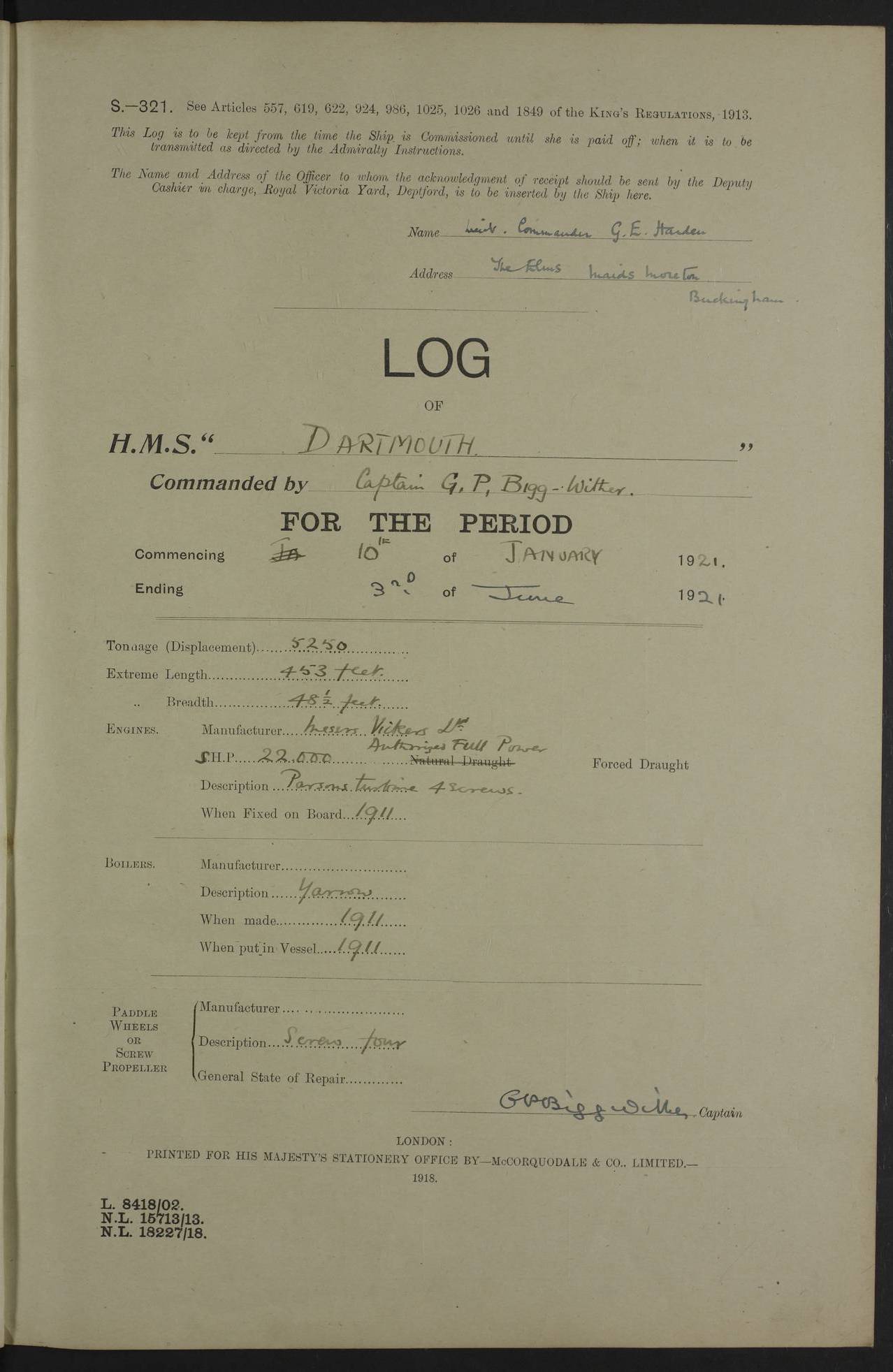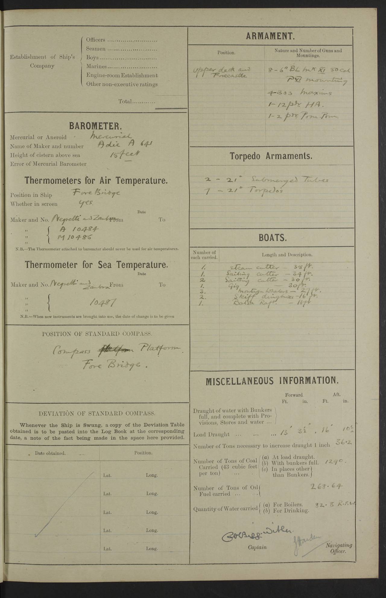 LOGS FOR SEPTEMBER 1913 4caf8612cadfd341970138ce: (http://oldweather.s3.amazonaws.com/ADM53-39478/ADM 53-39478-001_0.jpg) 4caf8612cadfd341970138cf: (http://oldweather.s3.amazonaws.com/ADM53-39478/ADM 53-39478-001_1.jpg) 4caf8612cadfd341970138d0: (http://oldweather.s3.amazonaws.com/ADM53-39478/ADM 53-39478-003_0.jpg) 4caf8612cadfd341970138d1: (http://oldweather.s3.amazonaws.com/ADM53-39478/ADM 53-39478-003_1.jpg) 4caf8612cadfd341970138d2: (http://oldweather.s3.amazonaws.com/ADM53-39478/ADM 53-39478-004_0.jpg) 4caf8612cadfd341970138d3: (http://oldweather.s3.amazonaws.com/ADM53-39478/ADM 53-39478-004_1.jpg) 4caf8612cadfd341970138d4: (http://oldweather.s3.amazonaws.com/ADM53-39478/ADM 53-39478-005_0.jpg) 4caf8612cadfd341970138d5: (http://oldweather.s3.amazonaws.com/ADM53-39478/ADM 53-39478-005_1.jpg) Establishment Officers 20 Seamen 104 Boys 22 Marines 29 Engine Room 177 Other non-executive 63 Total 395 Barometer Mercurial C Casella A19 Height of cistern above sea 16 ft Thermometers Air screened on fore bridge, J Hicks 904, 905 Water Negretta & Zamba 9517 Armament 8 6" Mk XI on P VI mountings Torpedo 2 21" broadside submerged tubes Boats 1 Sailing cutter 34 ft 2 Sailing cutter 30 ft 3 Whalers 27 ft 2 Gigs 30 ft 1 Steam cutter 35 ft 2 Skiff dinghies 16 ft 1 Balsa raft 13½ ft Miscellaneous Draught of water with bunkers full and complete With provisions, stores & water Fore 16’ 3" Aft 19’ 5" Load draught Fore 16’ 3" Aft 19’ 5" Number of tons to increase draught by 1" 36.2 No of tons of coal, 43 cubic feet per ton Load draught 650 tons Bunkers full 1290 tons Other than bunkers Nil Tons of oil fuel carried 252 Water: for boilers 106.18 tons for drinking 106 tons 4caf8612cadfd341970138d6: (http://oldweather.s3.amazonaws.com/ADM53-39478/ADM 53-39478-006_0.jpg) 2 September 1913 Devonport, No 2 buoy Lat 50.38, Long -4.19 9.00am: Commissioned ship 6.35pm: HMS “Indefatigable” proceeded up harbour 7.05pm: HMS “Hannibal” proceeded up harbour 9.30pm: Sub Lt Titty joined ship for passage to HMS “Pelorus” [HMS “Indefatigable”, a battlecruiser of 18500 tons, was launched at Devonport Dockyard in 1909. She was sunk during the Battle of Jutland in 1916. HMS “Hannibal”, a cruiser of 15000 tons, was launched in 1896 at Pembroke Dock. She became a troopship and was sold in 1920. She is part of the Old Weather fleet. HMS “Pelorus”, a 2,200 ton cruiser, was launched at Sheerness Dockyard in 1896 and sold in 1920. She is part of the Old Weather fleet.] 4caf8612cadfd341970138d7: (http://oldweather.s3.amazonaws.com/ADM53-39478/ADM 53-39478-006_1.jpg) 3 September 1913 Devonport, No 2 buoy Lat 50.38, Long -4.19 1.65am: Hailed guard boat 1.00pm: Discharged 1 stoker & 2 Able Seamen to hospital 7.45pm: 1 cook’s mate joined ship Number on sick list 1 4caf8612cadfd341970138d8: (http://oldweather.s3.amazonaws.com/ADM53-39478/ADM 53-39478-007_0.jpg) 4 September 1913 Devonport, No 2 buoy Lat 50.38, Long -4.19 7.40am: HMS “Majestic” proceeded out of harbour Number on sick list 2 [HMS “Majestic”, a pre-dreadnought battleship of 15000 tons, was launched at Portsmouth Dockyard in 1895 and torpedoed and sunk in May 1915.] 4caf8612cadfd341970138d9: (http://oldweather.s3.amazonaws.com/ADM53-39478/ADM 53-39478-007_1.jpg) 5 September 1913 Devonport, No 2 Buoy, and No 4 Basin Lat 50.384, Long -4.185 7.30am: Sent party of 40 men to dockyard to secure ship 8.00am: Slipped. Proceeded in charge of tug to No 4 basin 9.00am: Hands returning torpedoes to dockyard 1.00pm: Discharged 1 stoker and 1 boy to hospital 2.55pm: 1 Stoker Petty Officer joined ship 4.20pm: 1 Able Seaman joined ship 9.20pm: 7 ratings joined ship for passage Number on sick list 1 4caf8612cadfd341970138da: (http://oldweather.s3.amazonaws.com/ADM53-39478/ADM 53-39478-008_0.jpg) 6 September 1913 Devonport, No 4 basin Lat 50.384, Long -4.185 1.00pm: Hands make & mend clothes. Gave special leave to Port Watch from 1.30 pm to 6am: Monday morning, to 2nd part Starboard Watch till 6.45am: Sunday, Boys to 8 pm Number on sick list 1 4caf8612cadfd341970138db: (http://oldweather.s3.amazonaws.com/ADM53-39478/ADM 53-39478-008_1.jpg) 7 September 1913 Devonport, No 4 basin Lat 50.384, Long -4.185 8.30am: Landed church parties: 17 Roman Catholics, 6 Presbyterians, 8 Wesleyans 9.30am: Divisions. Sent Church of England party (40) to Dockyard Chapel 1.00pm: Gave special leave Starboard Watch till 6.45 am Number on sick list 1 4caf8612cadfd341970138dc: (http://oldweather.s3.amazonaws.com/ADM53-39478/ADM 53-39478-009_0.jpg) 8 September 1913 Devonport, No 4 basin Lat 50.384, Long -4.185 9.00am: Hands scraping side of ship & clearing forehold of flour 4.30pm: Gave special leave to Starboard Watch & 2nd part of Port Watch from 5.20 pm till 6.45 am Number on sick list 1 4caf8612cadfd341970138dd: (http://oldweather.s3.amazonaws.com/ADM53-39478/ADM 53-39478-009_1.jpg) 9 September 1913 Devonport, No 4 basin Lat 50.384, Long -4.185 9.00am: Hands employed clearing forehold of flour and scraping ship’s side 1.35pm: Discharged 1 Leading Stoker to RN Barracks 3.20pm: 1 stoker joined ship from RN hospital Number on sick list 2 4caf8612cadfd341970138de: (http://oldweather.s3.amazonaws.com/ADM53-39478/ADM 53-39478-010_0.jpg) 10 September 1913 Devonport, No 4 basin Lat 50.384, Long -4.185 7.30am: HMS “Triumph” proceeded out of harbour 10.00am: I Yeoman & 3 signal ratings landed for helio exercise 10.30am: 1 Engine Room Artificer and 2 stokers joined ship Number on sick list 2 [HMS “Triumph”, a pre-dreadnought battleship of 12500 tons and built to Chilean specifications, was launched at the Vickers yard in 1903. She was purchased from the Chileans during construction and sank after a torpedo strike in May 1915.] 4caf8612cadfd341970138df: (http://oldweather.s3.amazonaws.com/ADM53-39478/ADM 53-39478-010_1.jpg) 11 September 1913 Devonport, No 4 basin Lat 50.384, Long -4.185 3.30pm: 1 Able Seaman joined ship from hospital 6.05pm: Lieut A.N.Y. Dane joined ship Numb