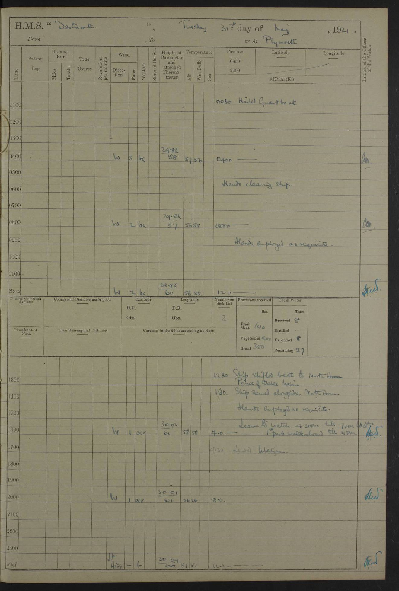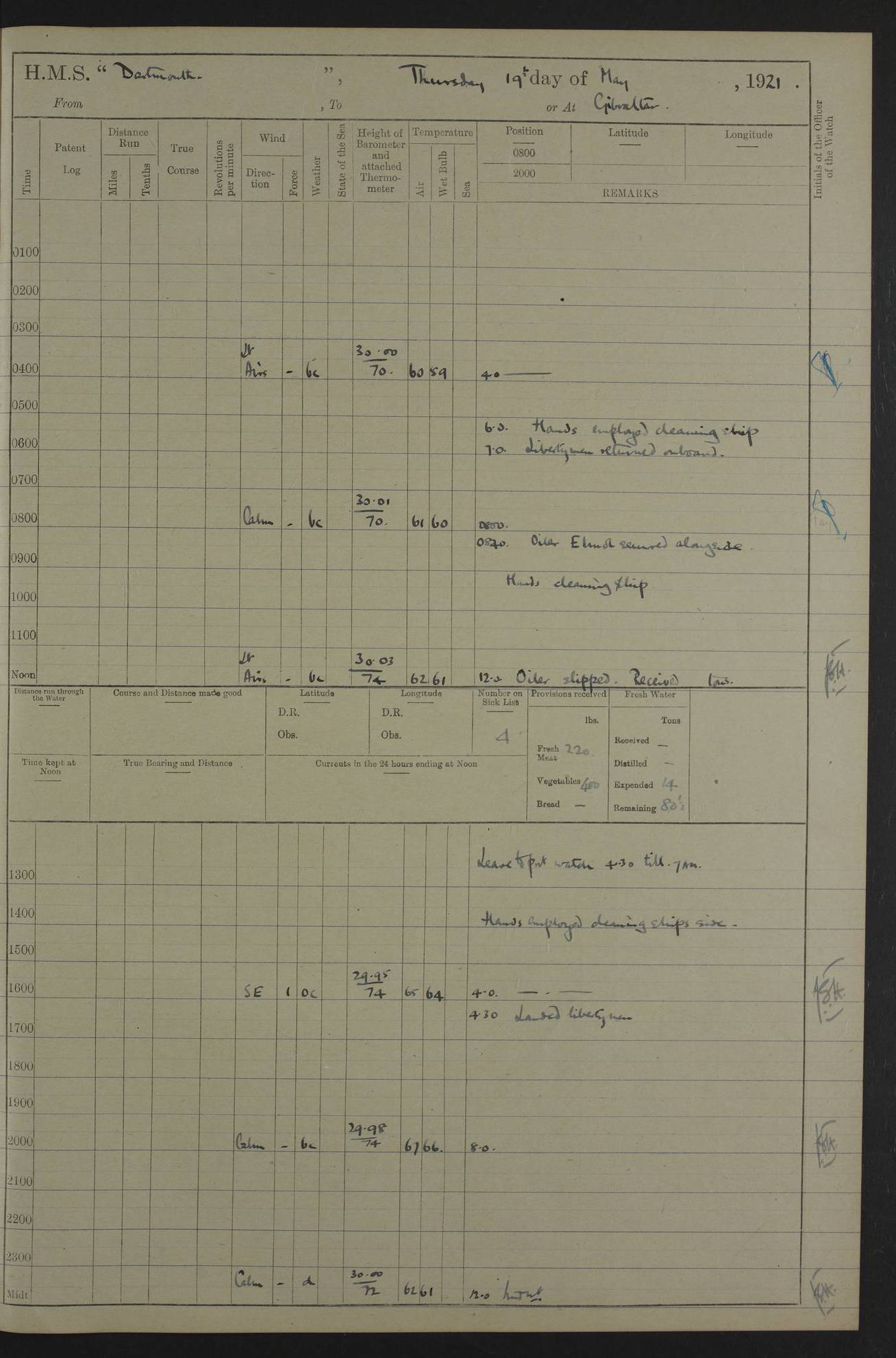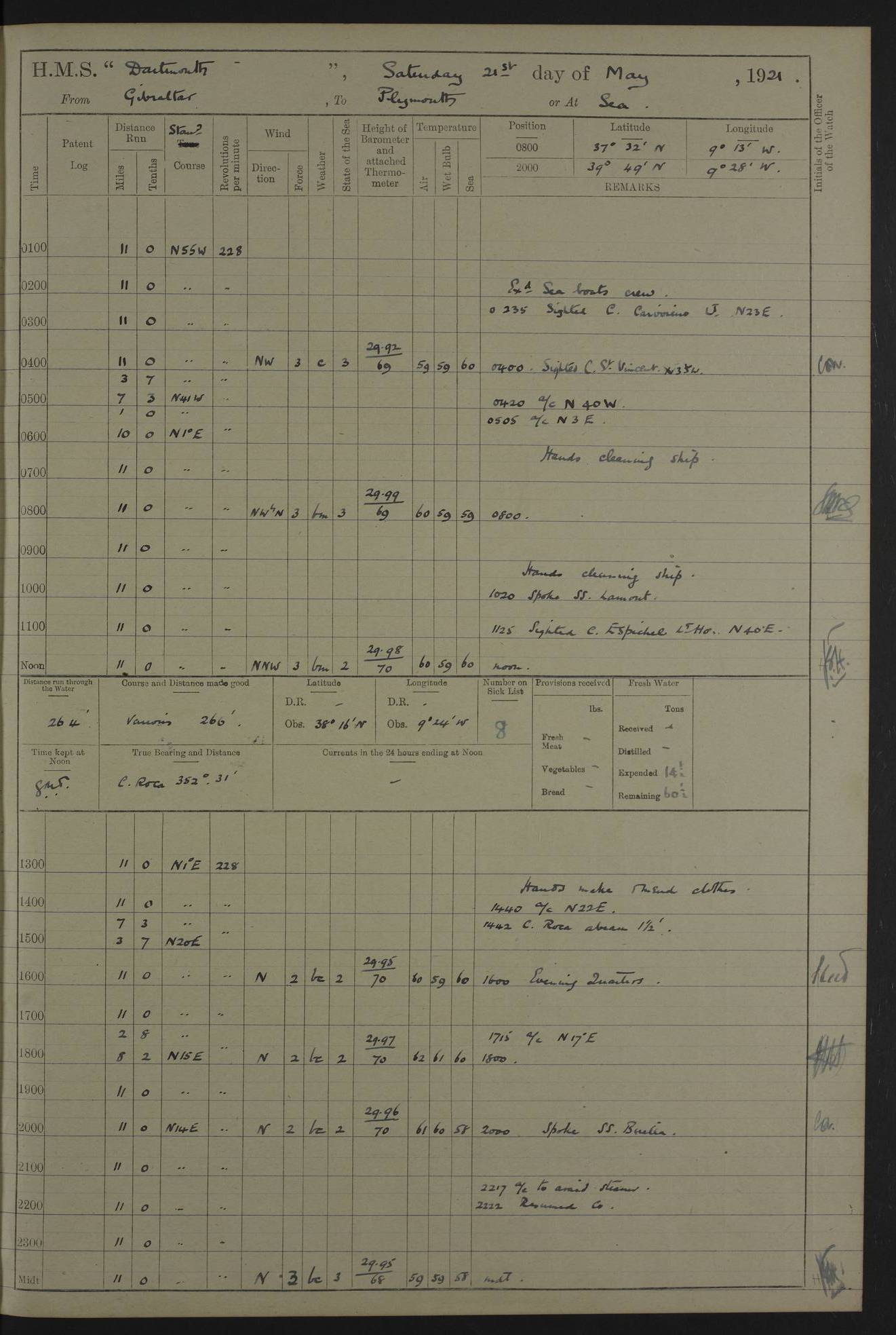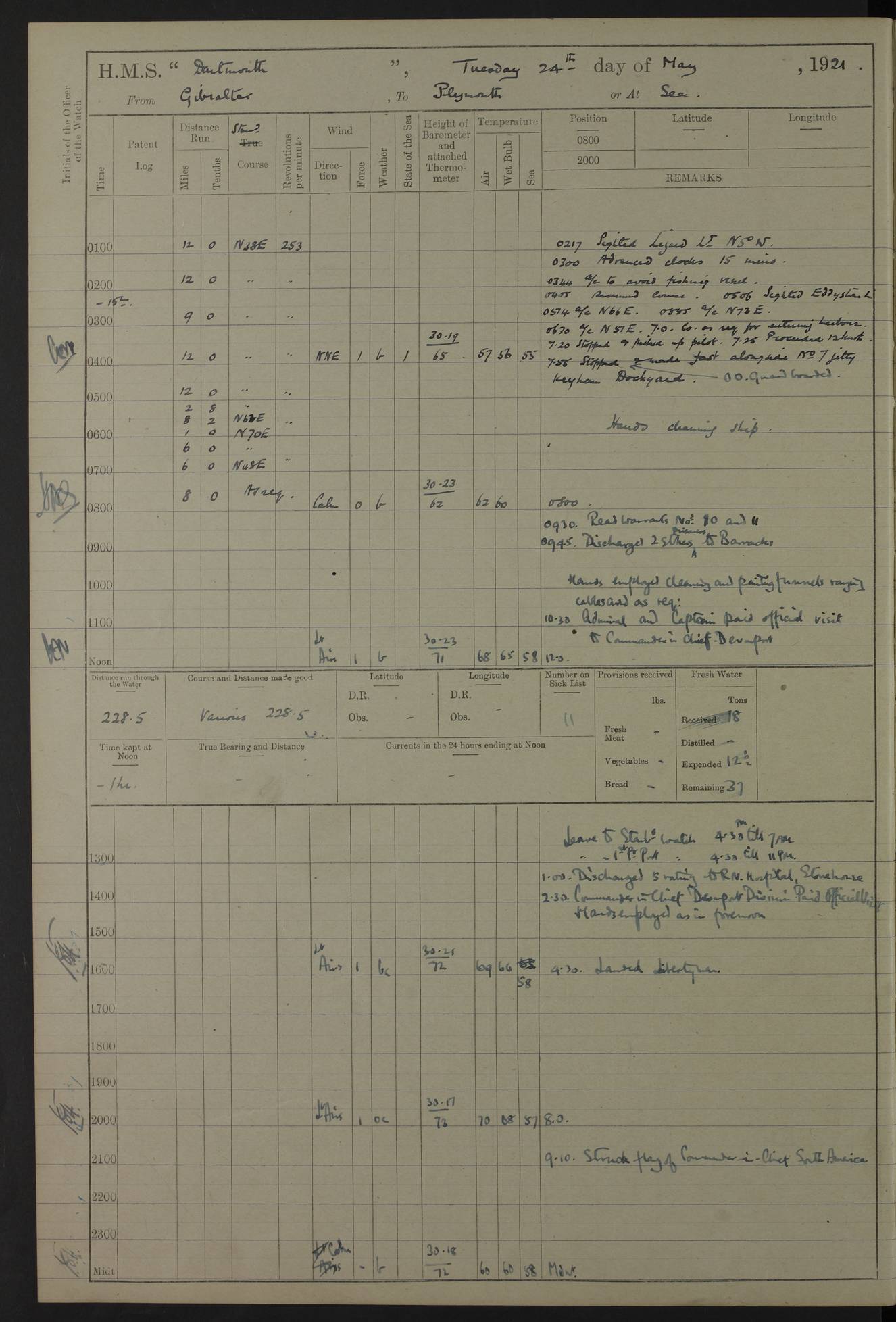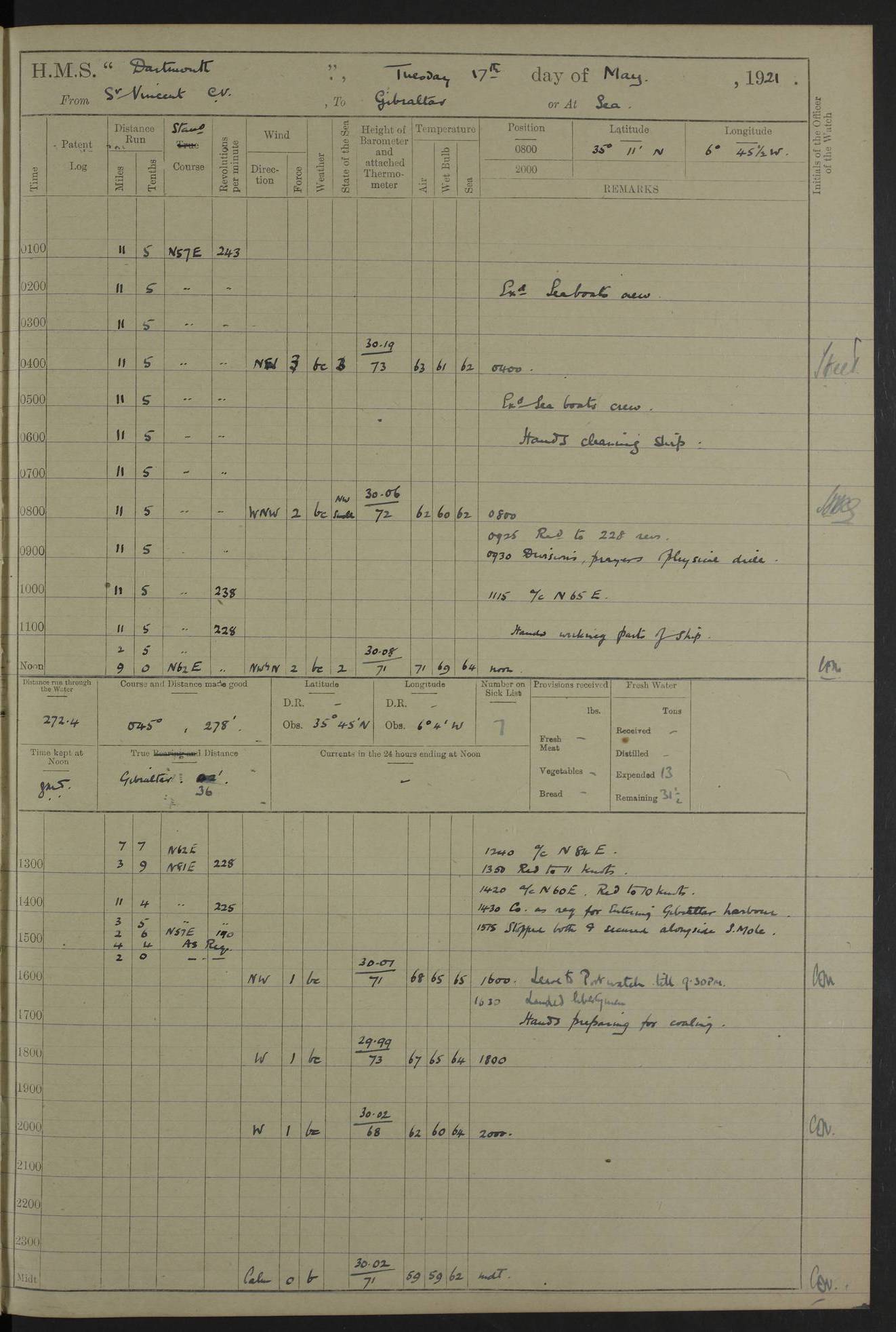 LOGS FOR APRIL 1919 4caf8619cadfd34197013b9a: (http://oldweather.s3.amazonaws.com/ADM53-39518/ADM 53-39518-001_0.jpg) 4caf8619cadfd34197013b9b: (http://oldweather.s3.amazonaws.com/ADM53-39518/ADM 53-39518-001_1.jpg) 4caf8619cadfd34197013b9c: (http://oldweather.s3.amazonaws.com/ADM53-39518/ADM 53-39518-002_0.jpg) 4caf8619cadfd34197013b9d: (http://oldweather.s3.amazonaws.com/ADM53-39518/ADM 53-39518-002_1.jpg) 4caf8619cadfd34197013b9e: (http://oldweather.s3.amazonaws.com/ADM53-39518/ADM 53-39518-003_0.jpg) 4caf8619cadfd34197013b9f: (http://oldweather.s3.amazonaws.com/ADM53-39518/ADM 53-39518-003_1.jpg) 24 April 1919 Gibraltar Lat 36.140, Long -5.365 9.00am: Captain H.W.W. Hope C.B., D.S.O., R.N. commissioned ship for service on South American Station 11.00am: Hands provisioning ship 3.50pm: Lost by accident: 5½ pints Rum whilst transporting ullage cask Number on sick list 1 [Captain Hope seems to have commanded HMS Repulse in 1925. From there he wrote ‘Orders for Officers of Watches’, a copy of which is in the New South Wales archives. He became an Admiral and died in Wales in 1966.] 4caf8619cadfd34197013ba0: (http://oldweather.s3.amazonaws.com/ADM53-39518/ADM 53-39518-004_0.jpg) 25 April 1919 Gibraltar Lat 36.140, Long -5.365 8.10am: “Dartmouth's” crew transferred from “Glasgow” to “Dartmouth”. “Dartmouth’s” care & maintenance party transferred to “Cormorant”. Hands stowing bags & hammocks 11.00am: Read stations for and exercised Fire Quarters 1.50pm: Hands cleaning ship 5.30pm: Discharged 1 Private, Royal Marine Light Infantry, to “Cormorant”. 1 Private, Royal Marine Light Infantry, joined ship from “Cormorant” Number on sick list 1 [HMS “Glasgow” was a cruiser of 4800 tons, launched in 1909 at Fairfield’s yard at Govan on the Clyde. She was sold in 1927 and is part of the Old Weather fleet. HMS “Cormorant” was a sloop of 1150 tons, launched in 1877 at Chatham Dockyard. She had a wooden hull on an iron frame and became a ‘receiving ship’ at Gibraltar in 1889 where unassigned sailors could be accommodated. She was scrapped in 1949.] 4caf8619cadfd34197013ba1: (http://oldweather.s3.amazonaws.com/ADM53-39518/ADM 53-39518-004_1.jpg) 26 April 1919 Gibraltar Lat 36.1275, Long -5.3545 7.20am: Tugs came alongside 8.20am: Ship berthed in no 3 berth 9.20am: Hands cleaning ship’s bottom & drawing new awnings 11.00am: Carried out tilt test for director 1.00pm: Hands make & mend clothes. Leave to the watch from 1.30pm to 7am 5.00pm: Landed funeral party 8.20pm: Funeral party returned Number on sick list 2 4caf8619cadfd34197013ba2: (http://oldweather.s3.amazonaws.com/ADM53-39518/ADM 53-39518-005_0.jpg) 27 April 1919 Gibraltar Lat 36.1275, Long -5.3545 8.15am: Landed Roman Catholic Church Party 9.35am: Landed Non-Conformist Church Parties 10.30am: Carried out tilt test 1.00pm: Gave leave to watch from 1.30pm to 7am 4.30pm: Discharged 2 Engine Room Artificers & 1 Chief Stoker to “Anenome” 7.00pm: Boys returned on board [HMS “Anenome” was a sloop of 1200 tons, launched in 1915 by Swan Hunter and finally sold in 1922.] 4caf8619cadfd34197013ba3: (http://oldweather.s3.amazonaws.com/ADM53-39518/ADM 53-39518-005_1.jpg) 28 April 1919 Gibraltar Lat 36.13, Long -5.36 7.30am: Landed working party to transfer stores from “Glasgow” to victualling yard 8.45am: Undocked ship. Berthed alongside South Mole 11.20am: Commenced coaling (native labour). Signalmen & Bosun’s party rigging dressing lines. Party clearing sailroom 7.00pm: Brazilian light cruiser “Bahia” & 3 destroyers sailed 11.00pm: Finished coaling [“Bahia”, a cruiser of ~3,400 tons, was launched in 1909 by Armstrong Whitworth. She was sunk by an explosion in 1945 with the loss of most of her crew.] 4caf8619cadfd34197013ba4: (http://oldweather.s3.amazonaws.com/ADM53-39518/ADM 53-39518-005a_0.jpg) 29 April 1919 Gibraltar Lat 36.1300, Long -5.3555 8.10am: Tugs came alongside & shifted ship 8.25am: Secured alongside “Glasgow” at Main Wharf. Hands cleaning ship. Director party carrying out tests 10.00am: Took in lubricating oil. Parties stowing ship 11.00am: Discharged 1 Engine Room Artificer to “Cyclamen” 1.00pm: Gave leave to stokers of Port Watch, 1.30pm till 7am. Hands employed spreading Forecastle & Aft Deck awnings 3.40pm: Furled forecastle awnings 5.00pm: Gave leave to watch till 7am [HMS “Cyclamen” was a sloop, launched in 1916 by Lobnitz & Co, Renfrew. She was sold in 1932. She is part of the Old Weather fleet.] 4caf8619cadfd34197013ba5: (http://oldweather.s3.amazonaws.com/ADM53-39518/ADM 53-39518-005a_1.jpg) 30 April 1919 Gibraltar Lat 36.1300, Long -5.3555 8.30am: Hands painting ship 11.00am: Commenced basin trial 11.45am: Finished basin trial (satisfactory) [Captain continuing rota of local leave.] LOGS FOR MAY 1919 4caf8619cadfd34197013ba6: (http://oldweather.s3.amazonaws.com/ADM53-39518/ADM 53-39518-006_0.jpg) 1 May 1919 Gibraltar Lat 36.1300, Long -5.3555 8.30am: Hands painting ship, getting accommodation ladder from dockyard & taking in canteen stores 1.30pm: Port watch getting in provisions & stationery 4caf8619cadfd34197013ba7: (http://oldweather.s3.amazonaws.com/ADM53-39518/ADM 53-39518-006_1.jpg) 2 May 1919 Gibraltar Lat 36.1300, Long -5.3555 7.40am: Ammunition lighter came alongside 8.05am: Hands ammunitioning ship 4.30pm: Lost overboard by accident: 1 box fuzes 5.15pm: Party drawing & stowing kedge anchor 5.30pm: Read warrant no 1 4caf8619cadfd34197013ba8: (http://oldweather.s3.amazonaws.com/ADM53-39518/ADM 53-39518-007_0.jpg) 3 May 1919 Gibraltar Lat 36.1300, Long -5.3555 5.40am: Hands striking down ammunition 7.40am: Hands striking down ammunition & fuzing Lyddite 8.00am: Divers down for box of fuzes 9.30am: Recovered box of fuzes 1.00pm: Hands make & mend clothes Number on sick list 2 4caf8619cadfd34197013ba9: (http://oldweather.s3.amazonaws.com/ADM53-39518/ADM 53-39518-007_1.jpg) 4 May 1919 Gibraltar Lat 36.1300, Long -5.3555 8.10am: Landed Roman Catholic