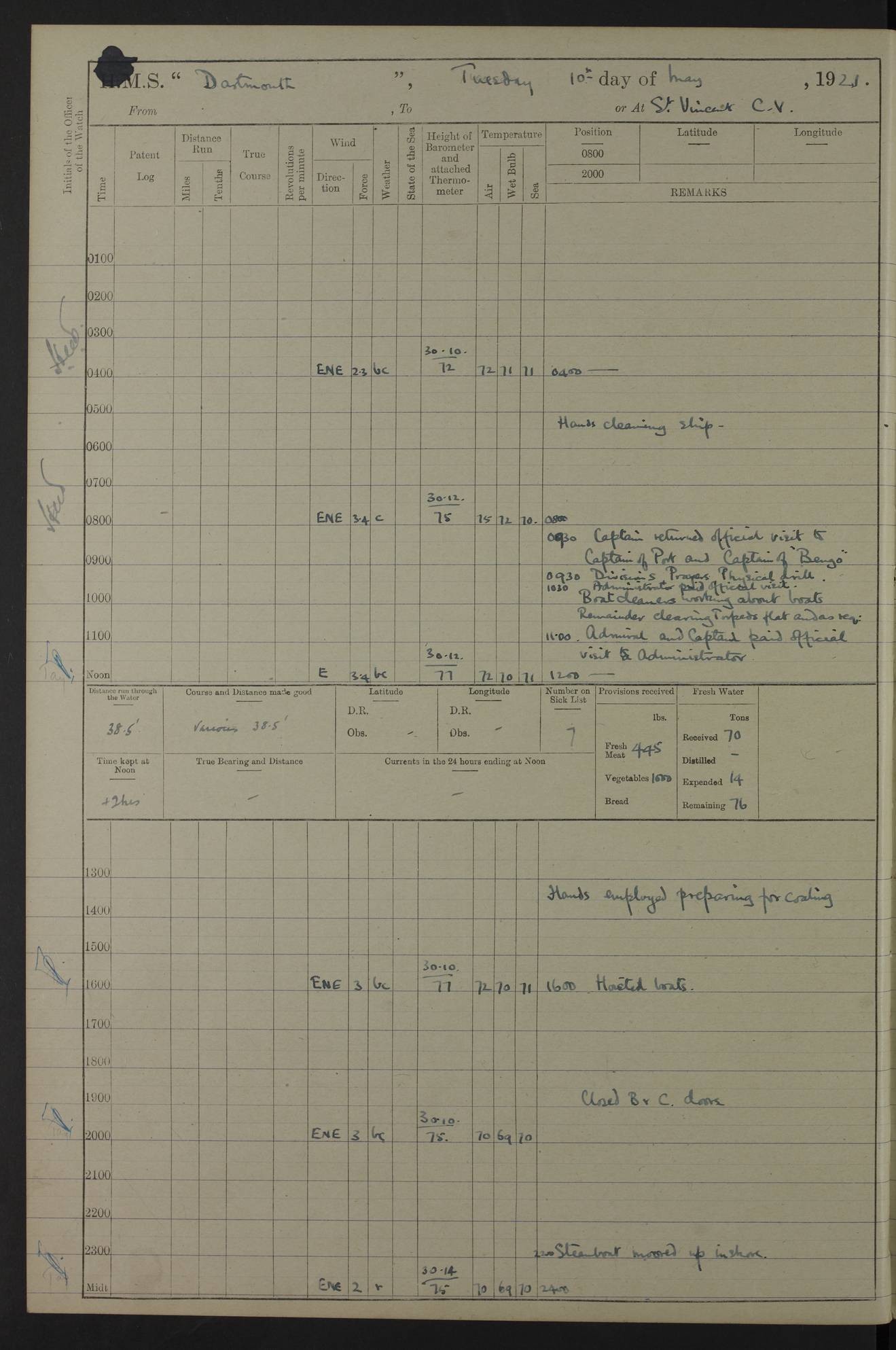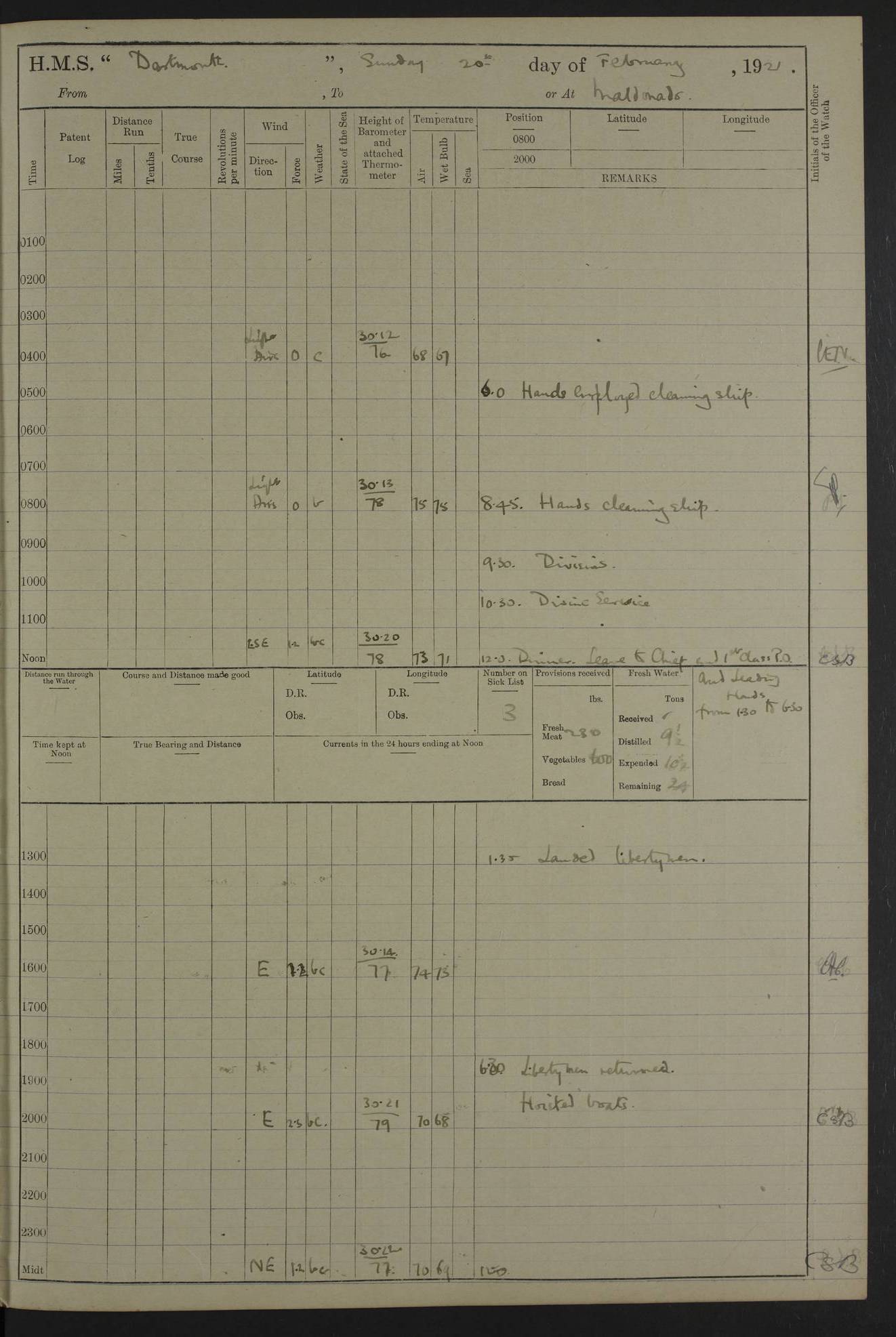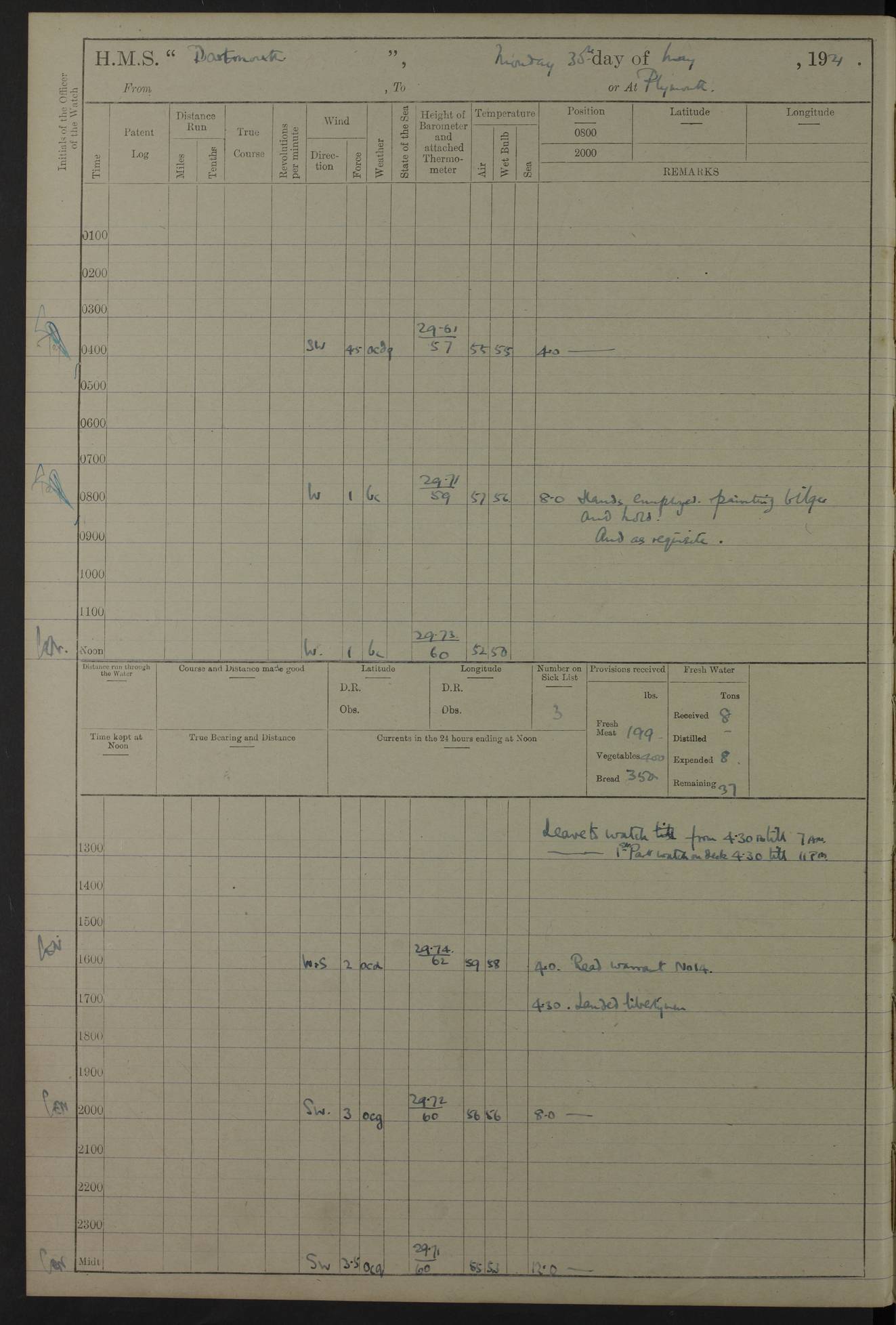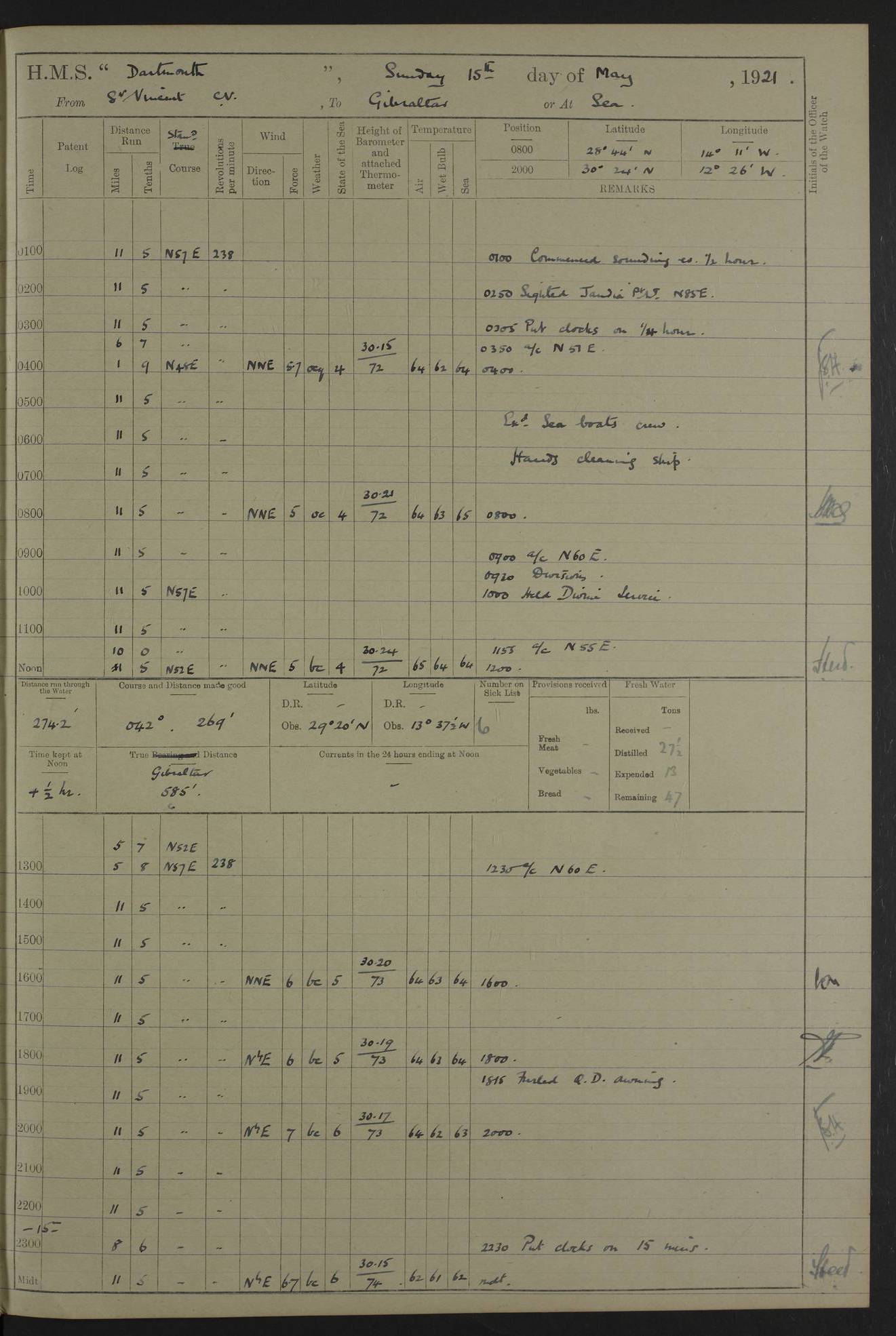 LOGS FOR APRIL 1919 4caf8619cadfd34197013b9a: (http://oldweather.s3.amazonaws.com/ADM53-39518/ADM 53-39518-001_0.jpg) 4caf8619cadfd34197013b9b: (http://oldweather.s3.amazonaws.com/ADM53-39518/ADM 53-39518-001_1.jpg) 4caf8619cadfd34197013b9c: (http://oldweather.s3.amazonaws.com/ADM53-39518/ADM 53-39518-002_0.jpg) 4caf8619cadfd34197013b9d: (http://oldweather.s3.amazonaws.com/ADM53-39518/ADM 53-39518-002_1.jpg) 4caf8619cadfd34197013b9e: (http://oldweather.s3.amazonaws.com/ADM53-39518/ADM 53-39518-003_0.jpg) 4caf8619cadfd34197013b9f: (http://oldweather.s3.amazonaws.com/ADM53-39518/ADM 53-39518-003_1.jpg) 24 April 1919 Gibraltar Lat 36.140, Long -5.365 9.00am: Captain H.W.W. Hope C.B., D.S.O., R.N. commissioned ship for service on South American Station 11.00am: Hands provisioning ship 3.50pm: Lost by accident: 5½ pints Rum whilst transporting ullage cask Number on sick list 1 [Captain Hope seems to have commanded HMS Repulse in 1925. From there he wrote ‘Orders for Officers of Watches’, a copy of which is in the New South Wales archives. He became an Admiral and died in Wales in 1966.] 4caf8619cadfd34197013ba0: (http://oldweather.s3.amazonaws.com/ADM53-39518/ADM 53-39518-004_0.jpg) 25 April 1919 Gibraltar Lat 36.140, Long -5.365 8.10am: “Dartmouth's” crew transferred from “Glasgow” to “Dartmouth”. “Dartmouth’s” care & maintenance party transferred to “Cormorant”. Hands stowing bags & hammocks 11.00am: Read stations for and exercised Fire Quarters 1.50pm: Hands cleaning ship 5.30pm: Discharged 1 Private, Royal Marine Light Infantry, to “Cormorant”. 1 Private, Royal Marine Light Infantry, joined ship from “Cormorant” Number on sick list 1 [HMS “Glasgow” was a cruiser of 4800 tons, launched in 1909 at Fairfield’s yard at Govan on the Clyde. She was sold in 1927 and is part of the Old Weather fleet. HMS “Cormorant” was a sloop of 1150 tons, launched in 1877 at Chatham Dockyard. She had a wooden hull on an iron frame and became a ‘receiving ship’ at Gibraltar in 1889 where unassigned sailors could be accommodated. She was scrapped in 1949.] 4caf8619cadfd34197013ba1: (http://oldweather.s3.amazonaws.com/ADM53-39518/ADM 53-39518-004_1.jpg) 26 April 1919 Gibraltar Lat 36.1275, Long -5.3545 7.20am: Tugs came alongside 8.20am: Ship berthed in no 3 berth 9.20am: Hands cleaning ship’s bottom & drawing new awnings 11.00am: Carried out tilt test for director 1.00pm: Hands make & mend clothes. Leave to the watch from 1.30pm to 7am 5.00pm: Landed funeral party 8.20pm: Funeral party returned Number on sick list 2 4caf8619cadfd34197013ba2: (http://oldweather.s3.amazonaws.com/ADM53-39518/ADM 53-39518-005_0.jpg) 27 April 1919 Gibraltar Lat 36.1275, Long -5.3545 8.15am: Landed Roman Catholic Church Party 9.35am: Landed Non-Conformist Church Parties 10.30am: Carried out tilt test 1.00pm: Gave leave to watch from 1.30pm to 7am 4.30pm: Discharged 2 Engine Room Artificers & 1 Chief Stoker to “Anenome” 7.00pm: Boys returned on board [HMS “Anenome” was a sloop of 1200 tons, launched in 1915 by Swan Hunter and finally sold in 1922.] 4caf8619cadfd34197013ba3: (http://oldweather.s3.amazonaws.com/ADM53-39518/ADM 53-39518-005_1.jpg) 28 April 1919 Gibraltar Lat 36.13, Long -5.36 7.30am: Landed working party to transfer stores from “Glasgow” to victualling yard 8.45am: Undocked ship. Berthed alongside South Mole 11.20am: Commenced coaling (native labour). Signalmen & Bosun’s party rigging dressing lines. Party clearing sailroom 7.00pm: Brazilian light cruiser “Bahia” & 3 destroyers sailed 11.00pm: Finished coaling [“Bahia”, a cruiser of ~3,400 tons, was launched in 1909 by Armstrong Whitworth. She was sunk by an explosion in 1945 with the loss of most of her crew.] 4caf8619cadfd34197013ba4: (http://oldweather.s3.amazonaws.com/ADM53-39518/ADM 53-39518-005a_0.jpg) 29 April 1919 Gibraltar Lat 36.1300, Long -5.3555 8.10am: Tugs came alongside & shifted ship 8.25am: Secured alongside “Glasgow” at Main Wharf. Hands cleaning ship. Director party carrying out tests 10.00am: Took in lubricating oil. Parties stowing ship 11.00am: Discharged 1 Engine Room Artificer to “Cyclamen” 1.00pm: Gave leave to stokers of Port Watch, 1.30pm till 7am. Hands employed spreading Forecastle & Aft Deck awnings 3.40pm: Furled forecastle awnings 5.00pm: Gave leave to watch till 7am [HMS “Cyclamen” was a sloop, launched in 1916 by Lobnitz & Co, Renfrew. She was sold in 1932. She is part of the Old Weather fleet.] 4caf8619cadfd34197013ba5: (http://oldweather.s3.amazonaws.com/ADM53-39518/ADM 53-39518-005a_1.jpg) 30 April 1919 Gibraltar Lat 36.1300, Long -5.3555 8.30am: Hands painting ship 11.00am: Commenced basin trial 11.45am: Finished basin trial (satisfactory) [Captain continuing rota of local leave.] LOGS FOR MAY 1919 4caf8619cadfd34197013ba6: (http://oldweather.s3.amazonaws.com/ADM53-39518/ADM 53-39518-006_0.jpg) 1 May 1919 Gibraltar Lat 36.1300, Long -5.3555 8.30am: Hands painting ship, getting accommodation ladder from dockyard & taking in canteen stores 1.30pm: Port watch getting in provisions & stationery 4caf8619cadfd34197013ba7: (http://oldweather.s3.amazonaws.com/ADM53-39518/ADM 53-39518-006_1.jpg) 2 May 1919 Gibraltar Lat 36.1300, Long -5.3555 7.40am: Ammunition lighter came alongside 8.05am: Hands ammunitioning ship 4.30pm: Lost overboard by accident: 1 box fuzes 5.15pm: Party drawing & stowing kedge anchor 5.30pm: Read warrant no 1 4caf8619cadfd34197013ba8: (http://oldweather.s3.amazonaws.com/ADM53-39518/ADM 53-39518-007_0.jpg) 3 May 1919 Gibraltar Lat 36.1300, Long -5.3555 5.40am: Hands striking down ammunition 7.40am: Hands striking down ammunition & fuzing Lyddite 8.00am: Divers down for box of fuzes 9.30am: Recovered box of fuzes 1.00pm: Hands make & mend clothes Number on sick list 2 4caf8619cadfd34197013ba9: (http://oldweather.s3.amazonaws.com/ADM53-39518/ADM 53-39518-007_1.jpg) 4 May 1919 Gibraltar Lat 36.1300, Long -5.3555 8.10am: Landed Roman Catholic