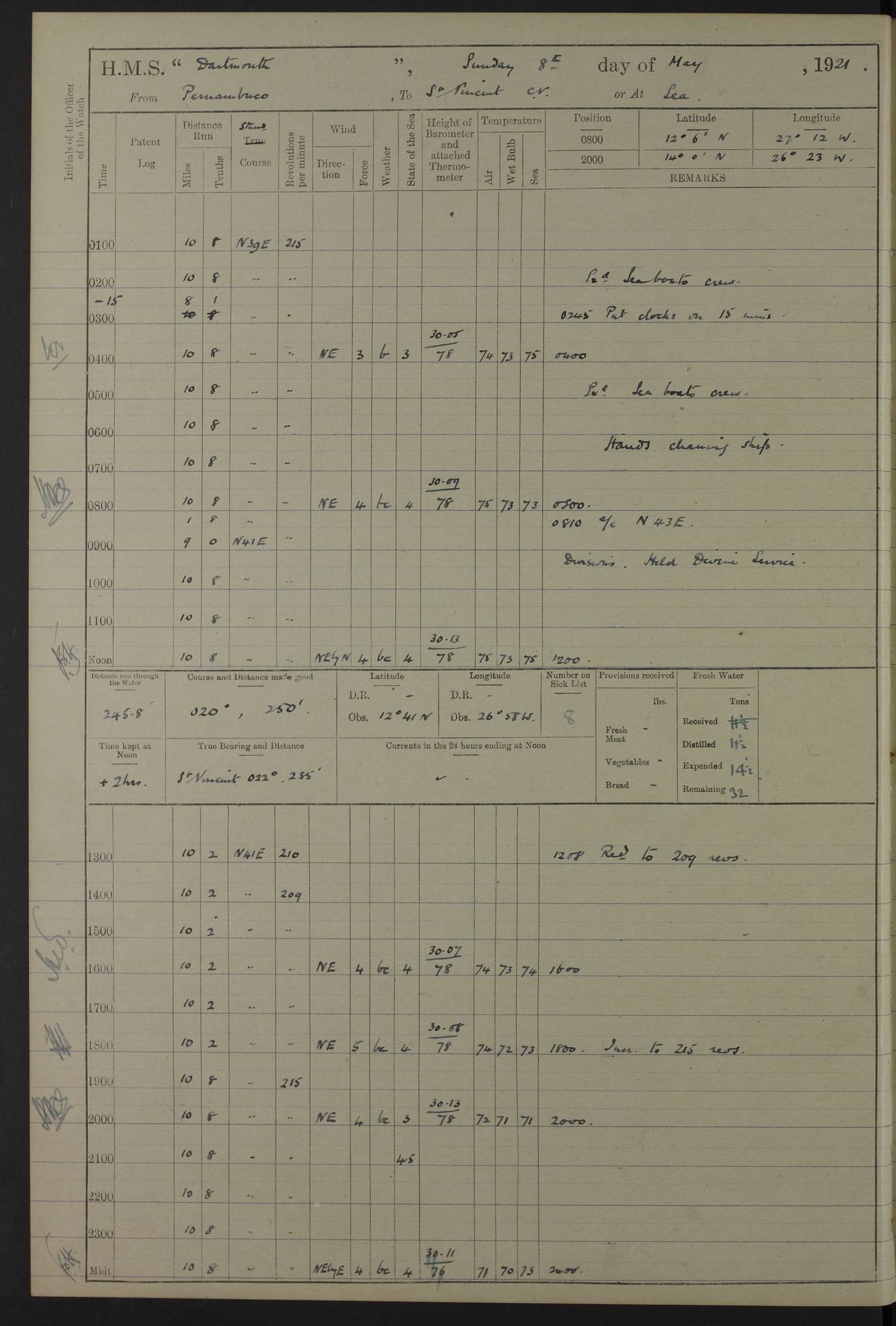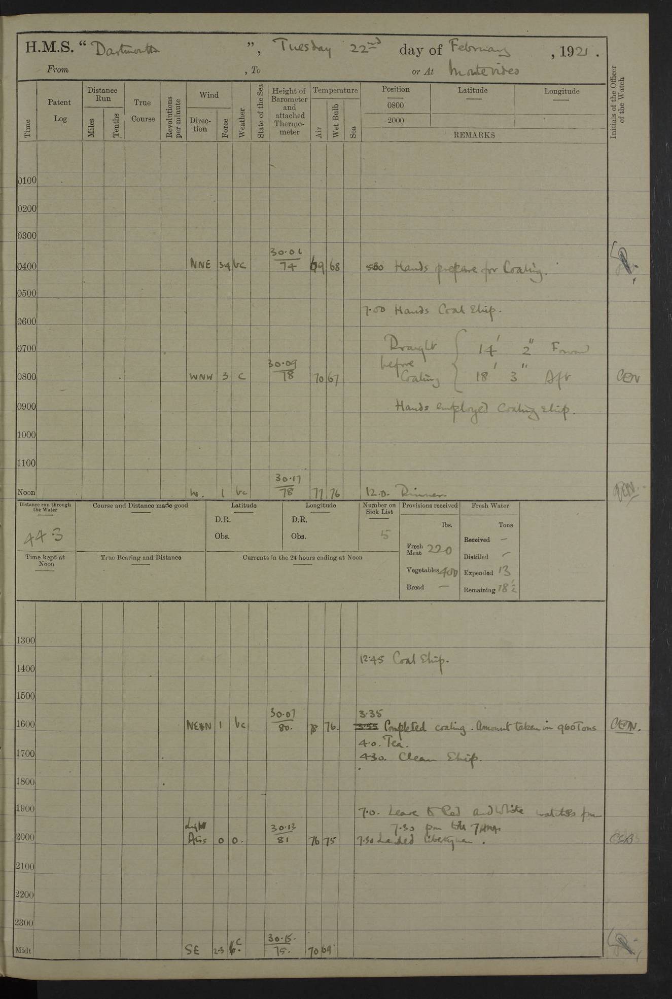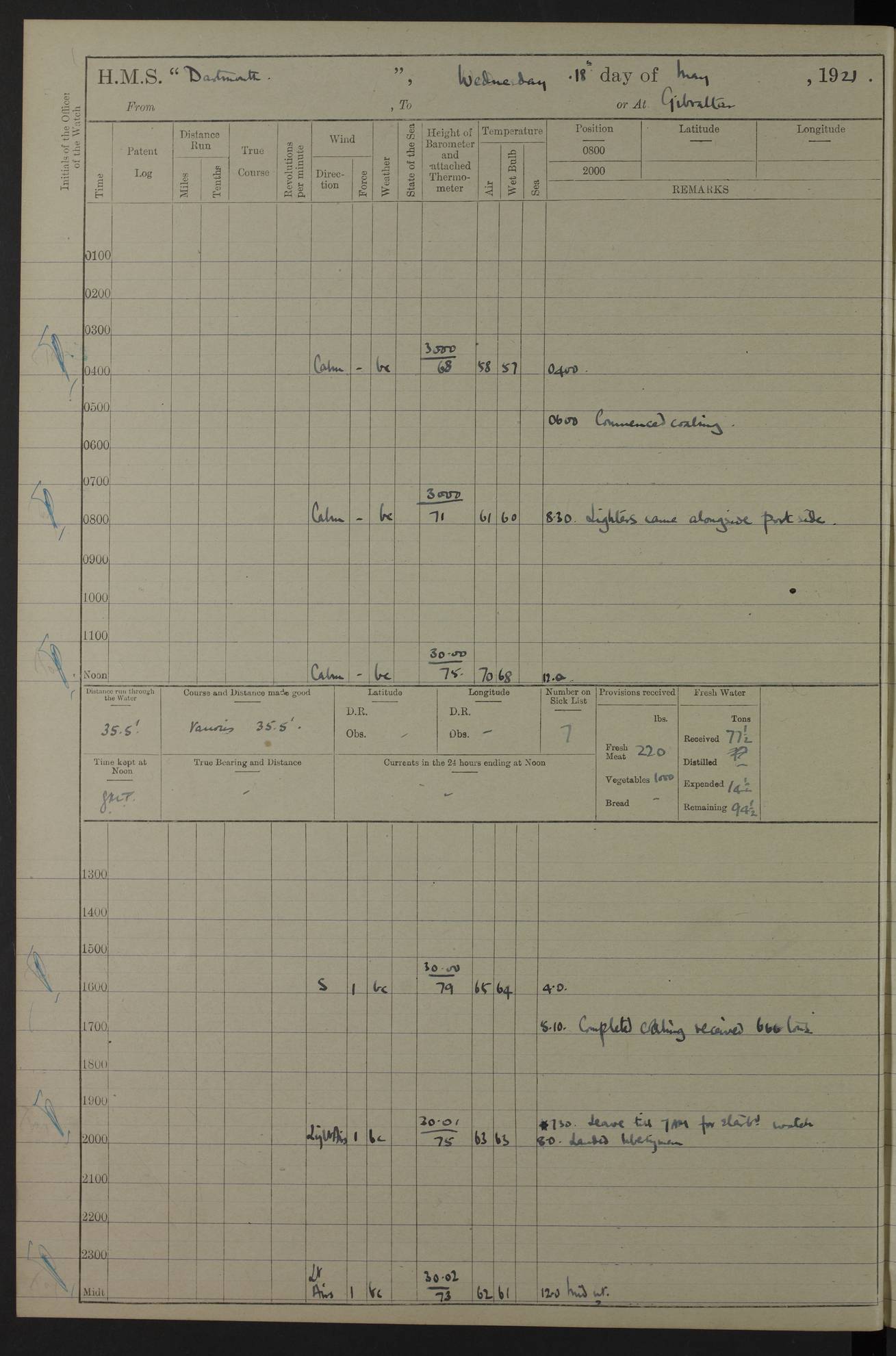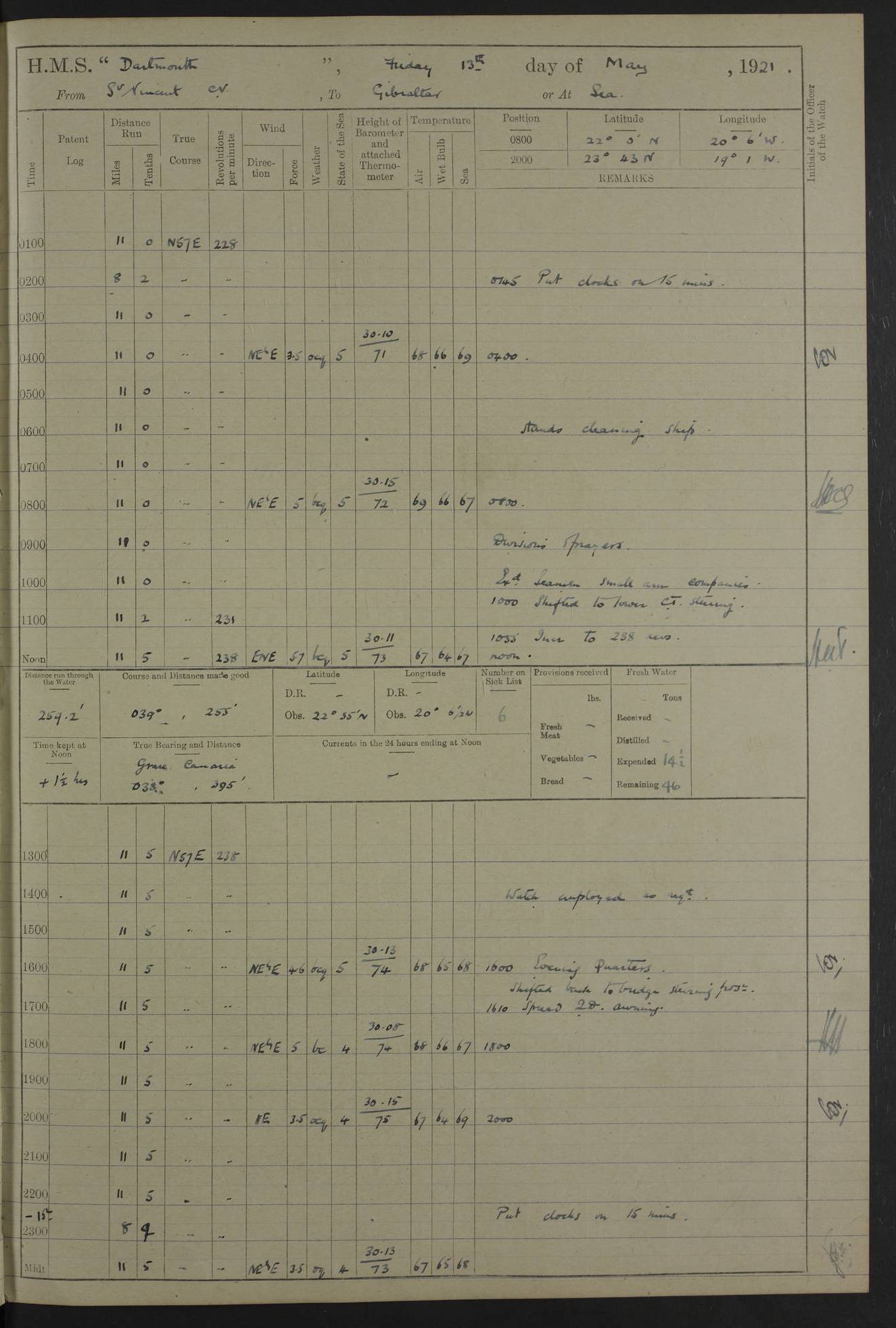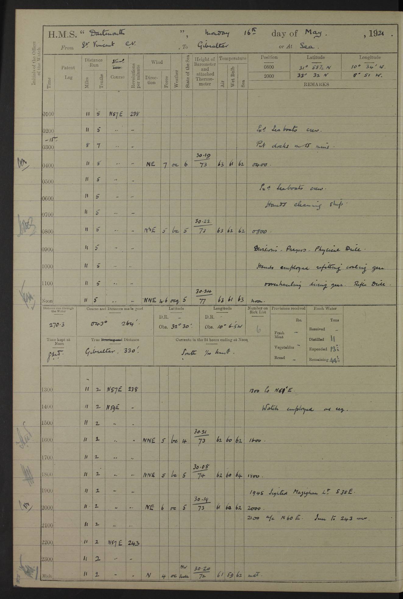 LOGS FOR APRIL 1919 4caf8619cadfd34197013b9a: (http://oldweather.s3.amazonaws.com/ADM53-39518/ADM 53-39518-001_0.jpg) 4caf8619cadfd34197013b9b: (http://oldweather.s3.amazonaws.com/ADM53-39518/ADM 53-39518-001_1.jpg) 4caf8619cadfd34197013b9c: (http://oldweather.s3.amazonaws.com/ADM53-39518/ADM 53-39518-002_0.jpg) 4caf8619cadfd34197013b9d: (http://oldweather.s3.amazonaws.com/ADM53-39518/ADM 53-39518-002_1.jpg) 4caf8619cadfd34197013b9e: (http://oldweather.s3.amazonaws.com/ADM53-39518/ADM 53-39518-003_0.jpg) 4caf8619cadfd34197013b9f: (http://oldweather.s3.amazonaws.com/ADM53-39518/ADM 53-39518-003_1.jpg) 24 April 1919 Gibraltar Lat 36.140, Long -5.365 9.00am: Captain H.W.W. Hope C.B., D.S.O., R.N. commissioned ship for service on South American Station 11.00am: Hands provisioning ship 3.50pm: Lost by accident: 5½ pints Rum whilst transporting ullage cask Number on sick list 1 [Captain Hope seems to have commanded HMS Repulse in 1925. From there he wrote ‘Orders for Officers of Watches’, a copy of which is in the New South Wales archives. He became an Admiral and died in Wales in 1966.] 4caf8619cadfd34197013ba0: (http://oldweather.s3.amazonaws.com/ADM53-39518/ADM 53-39518-004_0.jpg) 25 April 1919 Gibraltar Lat 36.140, Long -5.365 8.10am: “Dartmouth's” crew transferred from “Glasgow” to “Dartmouth”. “Dartmouth’s” care & maintenance party transferred to “Cormorant”. Hands stowing bags & hammocks 11.00am: Read stations for and exercised Fire Quarters 1.50pm: Hands cleaning ship 5.30pm: Discharged 1 Private, Royal Marine Light Infantry, to “Cormorant”. 1 Private, Royal Marine Light Infantry, joined ship from “Cormorant” Number on sick list 1 [HMS “Glasgow” was a cruiser of 4800 tons, launched in 1909 at Fairfield’s yard at Govan on the Clyde. She was sold in 1927 and is part of the Old Weather fleet. HMS “Cormorant” was a sloop of 1150 tons, launched in 1877 at Chatham Dockyard. She had a wooden hull on an iron frame and became a ‘receiving ship’ at Gibraltar in 1889 where unassigned sailors could be accommodated. She was scrapped in 1949.] 4caf8619cadfd34197013ba1: (http://oldweather.s3.amazonaws.com/ADM53-39518/ADM 53-39518-004_1.jpg) 26 April 1919 Gibraltar Lat 36.1275, Long -5.3545 7.20am: Tugs came alongside 8.20am: Ship berthed in no 3 berth 9.20am: Hands cleaning ship’s bottom & drawing new awnings 11.00am: Carried out tilt test for director 1.00pm: Hands make & mend clothes. Leave to the watch from 1.30pm to 7am 5.00pm: Landed funeral party 8.20pm: Funeral party returned Number on sick list 2 4caf8619cadfd34197013ba2: (http://oldweather.s3.amazonaws.com/ADM53-39518/ADM 53-39518-005_0.jpg) 27 April 1919 Gibraltar Lat 36.1275, Long -5.3545 8.15am: Landed Roman Catholic Church Party 9.35am: Landed Non-Conformist Church Parties 10.30am: Carried out tilt test 1.00pm: Gave leave to watch from 1.30pm to 7am 4.30pm: Discharged 2 Engine Room Artificers & 1 Chief Stoker to “Anenome” 7.00pm: Boys returned on board [HMS “Anenome” was a sloop of 1200 tons, launched in 1915 by Swan Hunter and finally sold in 1922.] 4caf8619cadfd34197013ba3: (http://oldweather.s3.amazonaws.com/ADM53-39518/ADM 53-39518-005_1.jpg) 28 April 1919 Gibraltar Lat 36.13, Long -5.36 7.30am: Landed working party to transfer stores from “Glasgow” to victualling yard 8.45am: Undocked ship. Berthed alongside South Mole 11.20am: Commenced coaling (native labour). Signalmen & Bosun’s party rigging dressing lines. Party clearing sailroom 7.00pm: Brazilian light cruiser “Bahia” & 3 destroyers sailed 11.00pm: Finished coaling [“Bahia”, a cruiser of ~3,400 tons, was launched in 1909 by Armstrong Whitworth. She was sunk by an explosion in 1945 with the loss of most of her crew.] 4caf8619cadfd34197013ba4: (http://oldweather.s3.amazonaws.com/ADM53-39518/ADM 53-39518-005a_0.jpg) 29 April 1919 Gibraltar Lat 36.1300, Long -5.3555 8.10am: Tugs came alongside & shifted ship 8.25am: Secured alongside “Glasgow” at Main Wharf. Hands cleaning ship. Director party carrying out tests 10.00am: Took in lubricating oil. Parties stowing ship 11.00am: Discharged 1 Engine Room Artificer to “Cyclamen” 1.00pm: Gave leave to stokers of Port Watch, 1.30pm till 7am. Hands employed spreading Forecastle & Aft Deck awnings 3.40pm: Furled forecastle awnings 5.00pm: Gave leave to watch till 7am [HMS “Cyclamen” was a sloop, launched in 1916 by Lobnitz & Co, Renfrew. She was sold in 1932. She is part of the Old Weather fleet.] 4caf8619cadfd34197013ba5: (http://oldweather.s3.amazonaws.com/ADM53-39518/ADM 53-39518-005a_1.jpg) 30 April 1919 Gibraltar Lat 36.1300, Long -5.3555 8.30am: Hands painting ship 11.00am: Commenced basin trial 11.45am: Finished basin trial (satisfactory) [Captain continuing rota of local leave.] LOGS FOR MAY 1919 4caf8619cadfd34197013ba6: (http://oldweather.s3.amazonaws.com/ADM53-39518/ADM 53-39518-006_0.jpg) 1 May 1919 Gibraltar Lat 36.1300, Long -5.3555 8.30am: Hands painting ship, getting accommodation ladder from dockyard & taking in canteen stores 1.30pm: Port watch getting in provisions & stationery 4caf8619cadfd34197013ba7: (http://oldweather.s3.amazonaws.com/ADM53-39518/ADM 53-39518-006_1.jpg) 2 May 1919 Gibraltar Lat 36.1300, Long -5.3555 7.40am: Ammunition lighter came alongside 8.05am: Hands ammunitioning ship 4.30pm: Lost overboard by accident: 1 box fuzes 5.15pm: Party drawing & stowing kedge anchor 5.30pm: Read warrant no 1 4caf8619cadfd34197013ba8: (http://oldweather.s3.amazonaws.com/ADM53-39518/ADM 53-39518-007_0.jpg) 3 May 1919 Gibraltar Lat 36.1300, Long -5.3555 5.40am: Hands striking down ammunition 7.40am: Hands striking down ammunition & fuzing Lyddite 8.00am: Divers down for box of fuzes 9.30am: Recovered box of fuzes 1.00pm: Hands make & mend clothes Number on sick list 2 4caf8619cadfd34197013ba9: (http://oldweather.s3.amazonaws.com/ADM53-39518/ADM 53-39518-007_1.jpg) 4 May 1919 Gibraltar Lat 36.1300, Long -5.3555 8.10am: Landed Roman Catholic
