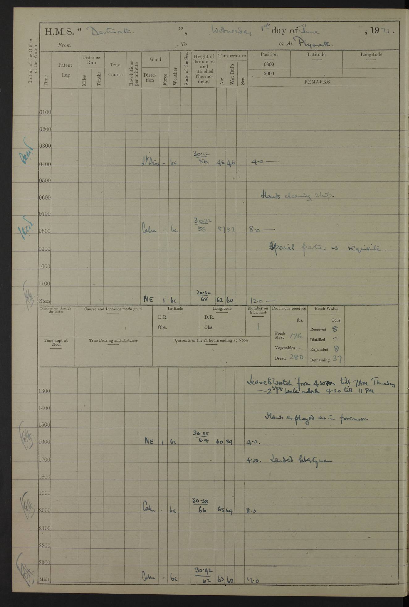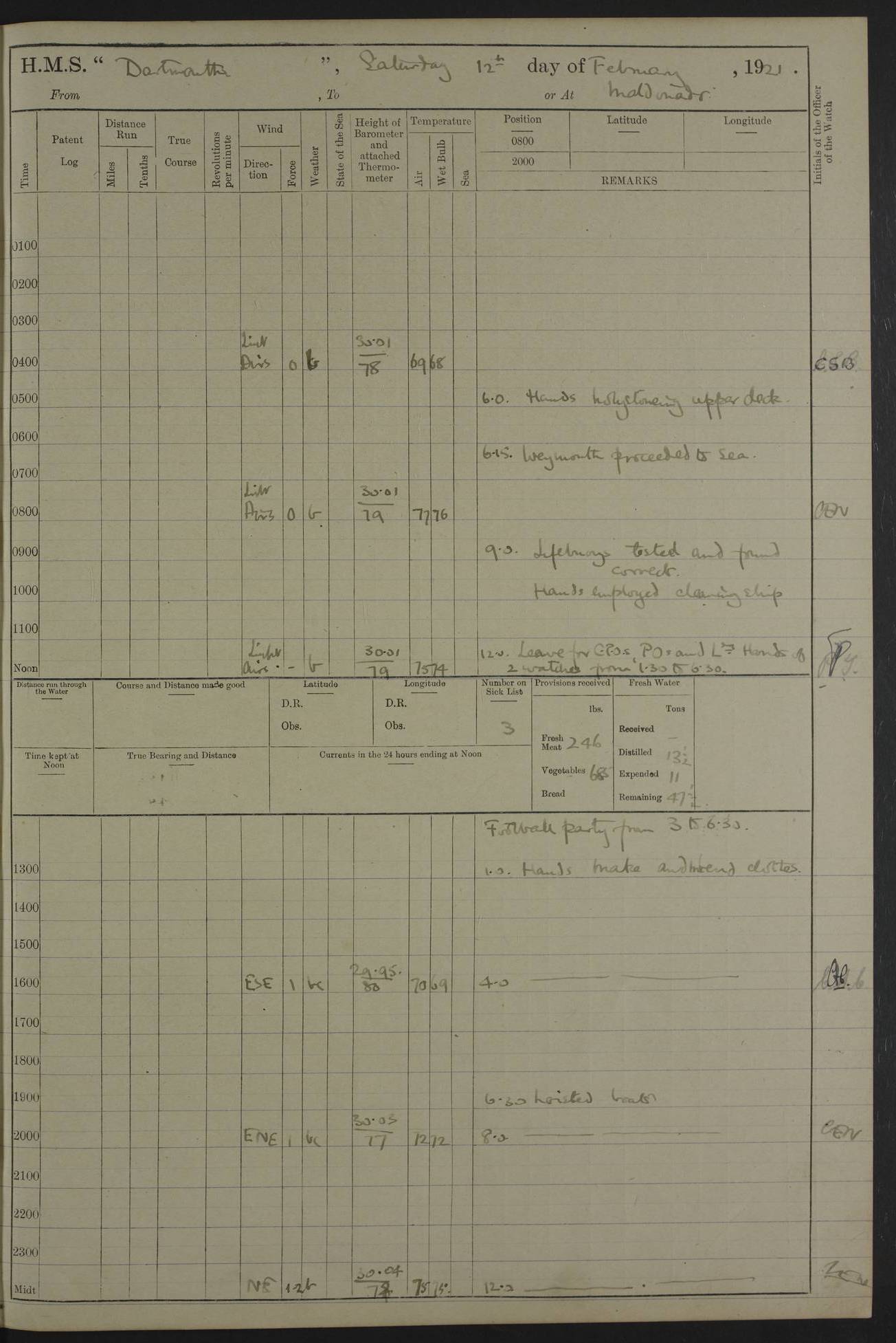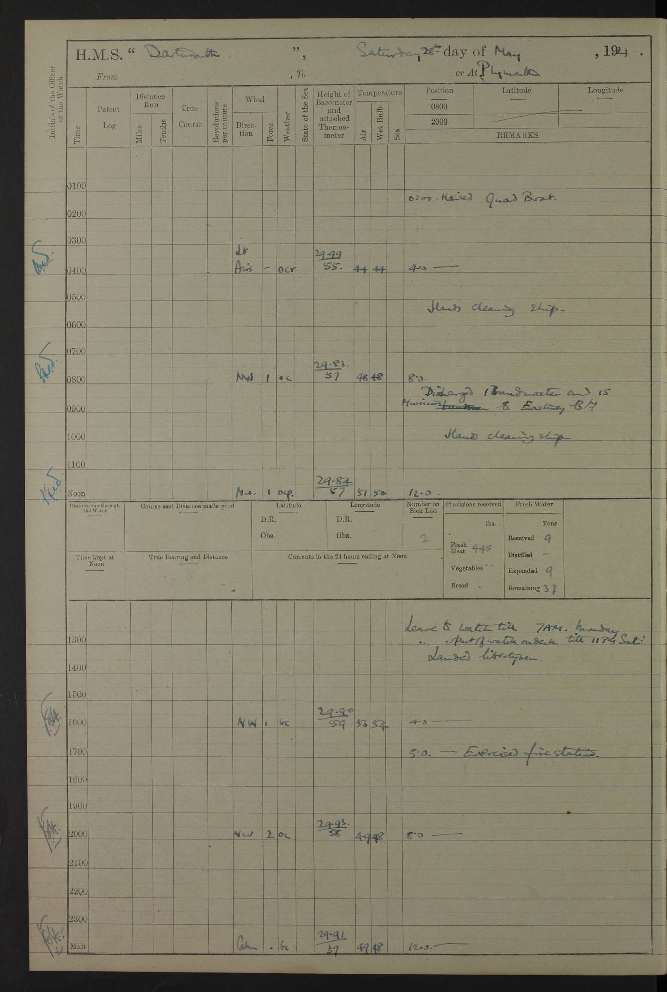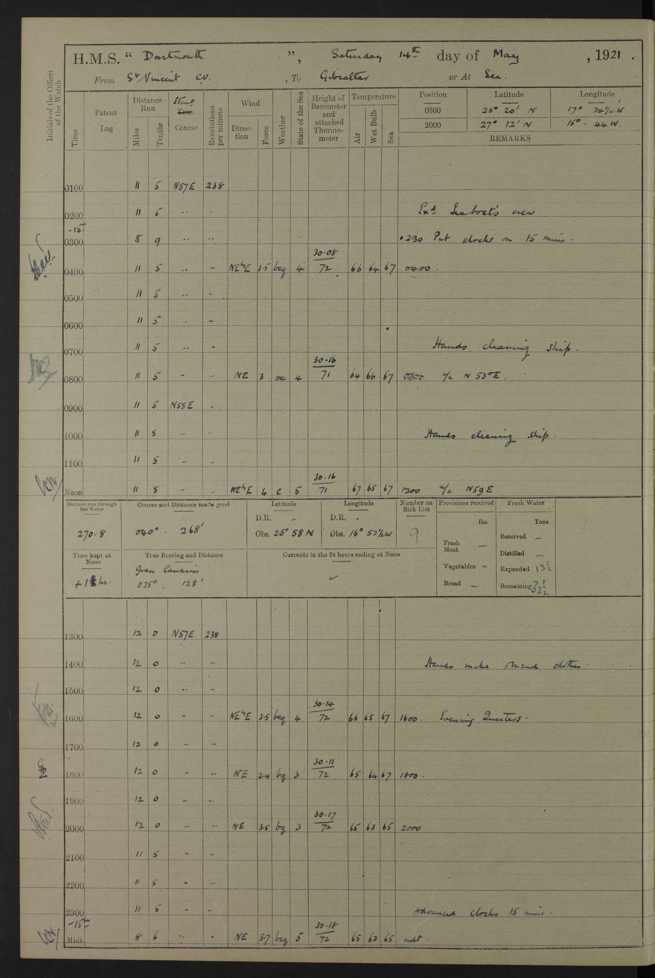 LOGS FOR APRIL 1919 4caf8619cadfd34197013b9a: (http://oldweather.s3.amazonaws.com/ADM53-39518/ADM 53-39518-001_0.jpg) 4caf8619cadfd34197013b9b: (http://oldweather.s3.amazonaws.com/ADM53-39518/ADM 53-39518-001_1.jpg) 4caf8619cadfd34197013b9c: (http://oldweather.s3.amazonaws.com/ADM53-39518/ADM 53-39518-002_0.jpg) 4caf8619cadfd34197013b9d: (http://oldweather.s3.amazonaws.com/ADM53-39518/ADM 53-39518-002_1.jpg) 4caf8619cadfd34197013b9e: (http://oldweather.s3.amazonaws.com/ADM53-39518/ADM 53-39518-003_0.jpg) 4caf8619cadfd34197013b9f: (http://oldweather.s3.amazonaws.com/ADM53-39518/ADM 53-39518-003_1.jpg) 24 April 1919 Gibraltar Lat 36.140, Long -5.365 9.00am: Captain H.W.W. Hope C.B., D.S.O., R.N. commissioned ship for service on South American Station 11.00am: Hands provisioning ship 3.50pm: Lost by accident: 5½ pints Rum whilst transporting ullage cask Number on sick list 1 [Captain Hope seems to have commanded HMS Repulse in 1925. From there he wrote ‘Orders for Officers of Watches’, a copy of which is in the New South Wales archives. He became an Admiral and died in Wales in 1966.] 4caf8619cadfd34197013ba0: (http://oldweather.s3.amazonaws.com/ADM53-39518/ADM 53-39518-004_0.jpg) 25 April 1919 Gibraltar Lat 36.140, Long -5.365 8.10am: “Dartmouth's” crew transferred from “Glasgow” to “Dartmouth”. “Dartmouth’s” care & maintenance party transferred to “Cormorant”. Hands stowing bags & hammocks 11.00am: Read stations for and exercised Fire Quarters 1.50pm: Hands cleaning ship 5.30pm: Discharged 1 Private, Royal Marine Light Infantry, to “Cormorant”. 1 Private, Royal Marine Light Infantry, joined ship from “Cormorant” Number on sick list 1 [HMS “Glasgow” was a cruiser of 4800 tons, launched in 1909 at Fairfield’s yard at Govan on the Clyde. She was sold in 1927 and is part of the Old Weather fleet. HMS “Cormorant” was a sloop of 1150 tons, launched in 1877 at Chatham Dockyard. She had a wooden hull on an iron frame and became a ‘receiving ship’ at Gibraltar in 1889 where unassigned sailors could be accommodated. She was scrapped in 1949.] 4caf8619cadfd34197013ba1: (http://oldweather.s3.amazonaws.com/ADM53-39518/ADM 53-39518-004_1.jpg) 26 April 1919 Gibraltar Lat 36.1275, Long -5.3545 7.20am: Tugs came alongside 8.20am: Ship berthed in no 3 berth 9.20am: Hands cleaning ship’s bottom & drawing new awnings 11.00am: Carried out tilt test for director 1.00pm: Hands make & mend clothes. Leave to the watch from 1.30pm to 7am 5.00pm: Landed funeral party 8.20pm: Funeral party returned Number on sick list 2 4caf8619cadfd34197013ba2: (http://oldweather.s3.amazonaws.com/ADM53-39518/ADM 53-39518-005_0.jpg) 27 April 1919 Gibraltar Lat 36.1275, Long -5.3545 8.15am: Landed Roman Catholic Church Party 9.35am: Landed Non-Conformist Church Parties 10.30am: Carried out tilt test 1.00pm: Gave leave to watch from 1.30pm to 7am 4.30pm: Discharged 2 Engine Room Artificers & 1 Chief Stoker to “Anenome” 7.00pm: Boys returned on board [HMS “Anenome” was a sloop of 1200 tons, launched in 1915 by Swan Hunter and finally sold in 1922.] 4caf8619cadfd34197013ba3: (http://oldweather.s3.amazonaws.com/ADM53-39518/ADM 53-39518-005_1.jpg) 28 April 1919 Gibraltar Lat 36.13, Long -5.36 7.30am: Landed working party to transfer stores from “Glasgow” to victualling yard 8.45am: Undocked ship. Berthed alongside South Mole 11.20am: Commenced coaling (native labour). Signalmen & Bosun’s party rigging dressing lines. Party clearing sailroom 7.00pm: Brazilian light cruiser “Bahia” & 3 destroyers sailed 11.00pm: Finished coaling [“Bahia”, a cruiser of ~3,400 tons, was launched in 1909 by Armstrong Whitworth. She was sunk by an explosion in 1945 with the loss of most of her crew.] 4caf8619cadfd34197013ba4: (http://oldweather.s3.amazonaws.com/ADM53-39518/ADM 53-39518-005a_0.jpg) 29 April 1919 Gibraltar Lat 36.1300, Long -5.3555 8.10am: Tugs came alongside & shifted ship 8.25am: Secured alongside “Glasgow” at Main Wharf. Hands cleaning ship. Director party carrying out tests 10.00am: Took in lubricating oil. Parties stowing ship 11.00am: Discharged 1 Engine Room Artificer to “Cyclamen” 1.00pm: Gave leave to stokers of Port Watch, 1.30pm till 7am. Hands employed spreading Forecastle & Aft Deck awnings 3.40pm: Furled forecastle awnings 5.00pm: Gave leave to watch till 7am [HMS “Cyclamen” was a sloop, launched in 1916 by Lobnitz & Co, Renfrew. She was sold in 1932. She is part of the Old Weather fleet.] 4caf8619cadfd34197013ba5: (http://oldweather.s3.amazonaws.com/ADM53-39518/ADM 53-39518-005a_1.jpg) 30 April 1919 Gibraltar Lat 36.1300, Long -5.3555 8.30am: Hands painting ship 11.00am: Commenced basin trial 11.45am: Finished basin trial (satisfactory) [Captain continuing rota of local leave.] LOGS FOR MAY 1919 4caf8619cadfd34197013ba6: (http://oldweather.s3.amazonaws.com/ADM53-39518/ADM 53-39518-006_0.jpg) 1 May 1919 Gibraltar Lat 36.1300, Long -5.3555 8.30am: Hands painting ship, getting accommodation ladder from dockyard & taking in canteen stores 1.30pm: Port watch getting in provisions & stationery 4caf8619cadfd34197013ba7: (http://oldweather.s3.amazonaws.com/ADM53-39518/ADM 53-39518-006_1.jpg) 2 May 1919 Gibraltar Lat 36.1300, Long -5.3555 7.40am: Ammunition lighter came alongside 8.05am: Hands ammunitioning ship 4.30pm: Lost overboard by accident: 1 box fuzes 5.15pm: Party drawing & stowing kedge anchor 5.30pm: Read warrant no 1 4caf8619cadfd34197013ba8: (http://oldweather.s3.amazonaws.com/ADM53-39518/ADM 53-39518-007_0.jpg) 3 May 1919 Gibraltar Lat 36.1300, Long -5.3555 5.40am: Hands striking down ammunition 7.40am: Hands striking down ammunition & fuzing Lyddite 8.00am: Divers down for box of fuzes 9.30am: Recovered box of fuzes 1.00pm: Hands make & mend clothes Number on sick list 2 4caf8619cadfd34197013ba9: (http://oldweather.s3.amazonaws.com/ADM53-39518/ADM 53-39518-007_1.jpg) 4 May 1919 Gibraltar Lat 36.1300, Long -5.3555 8.10am: Landed Roman Catholic