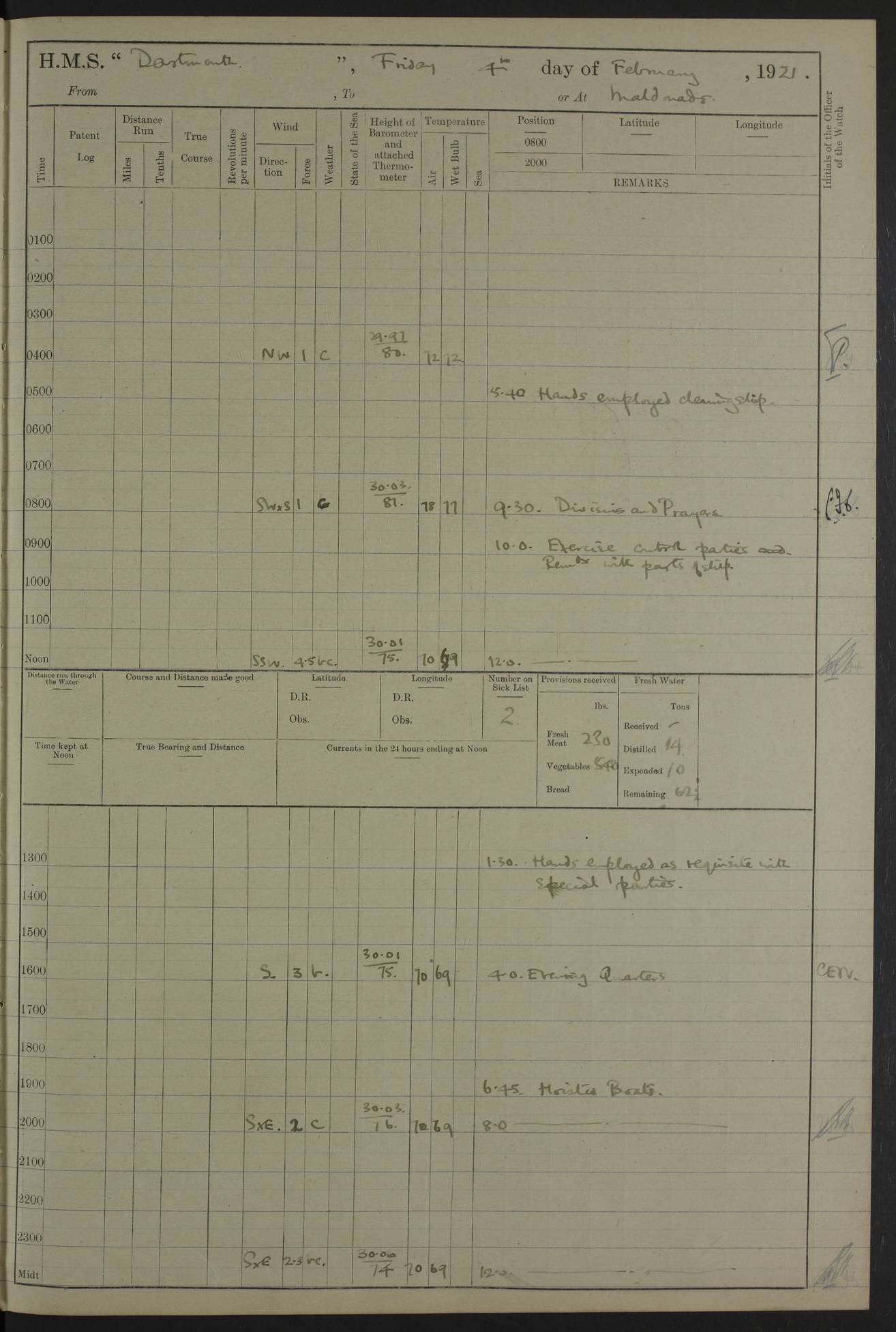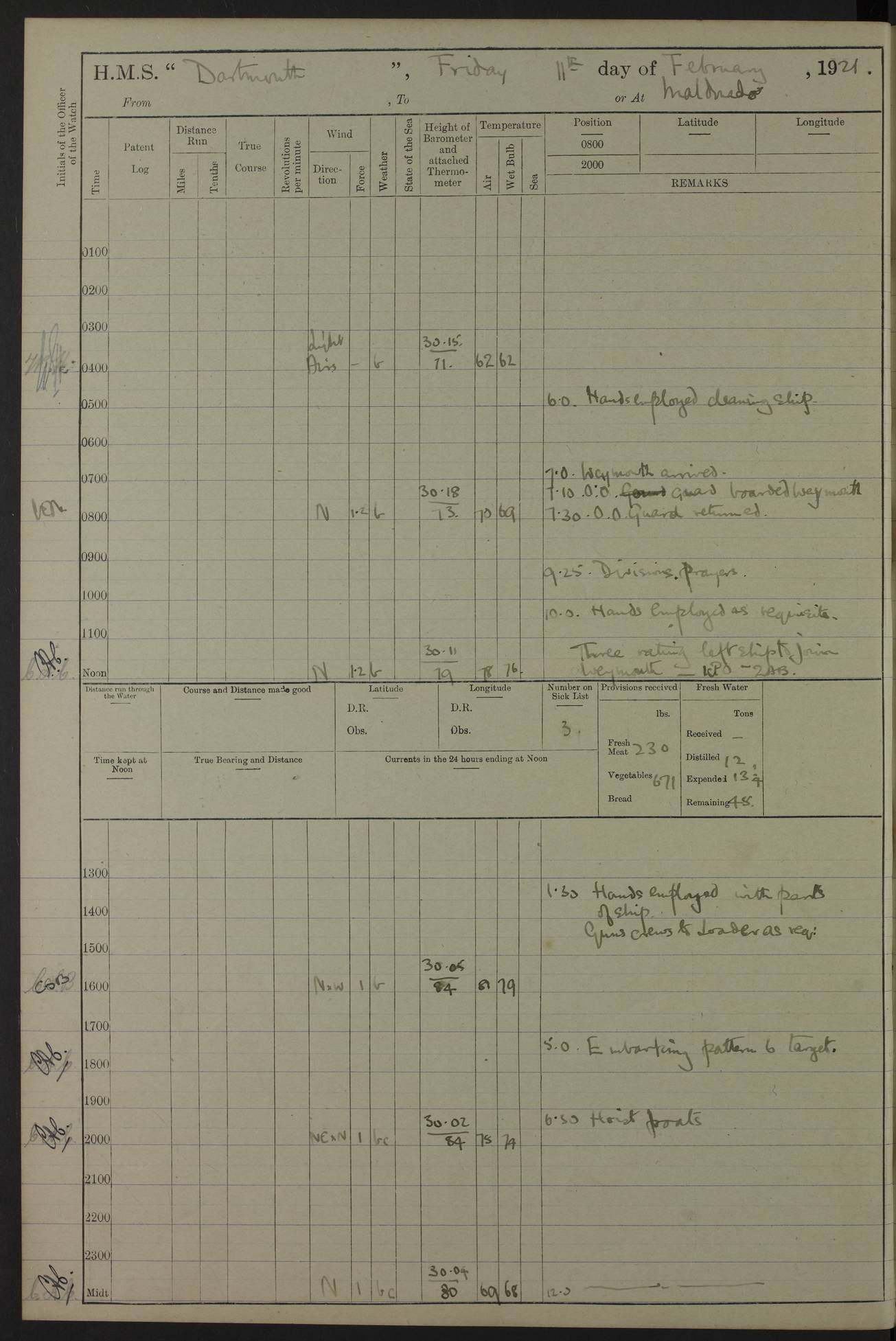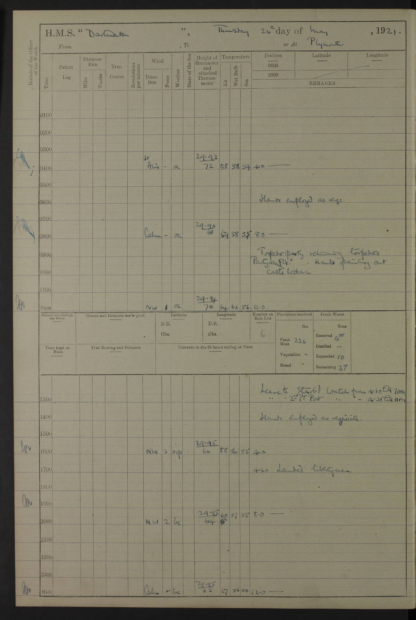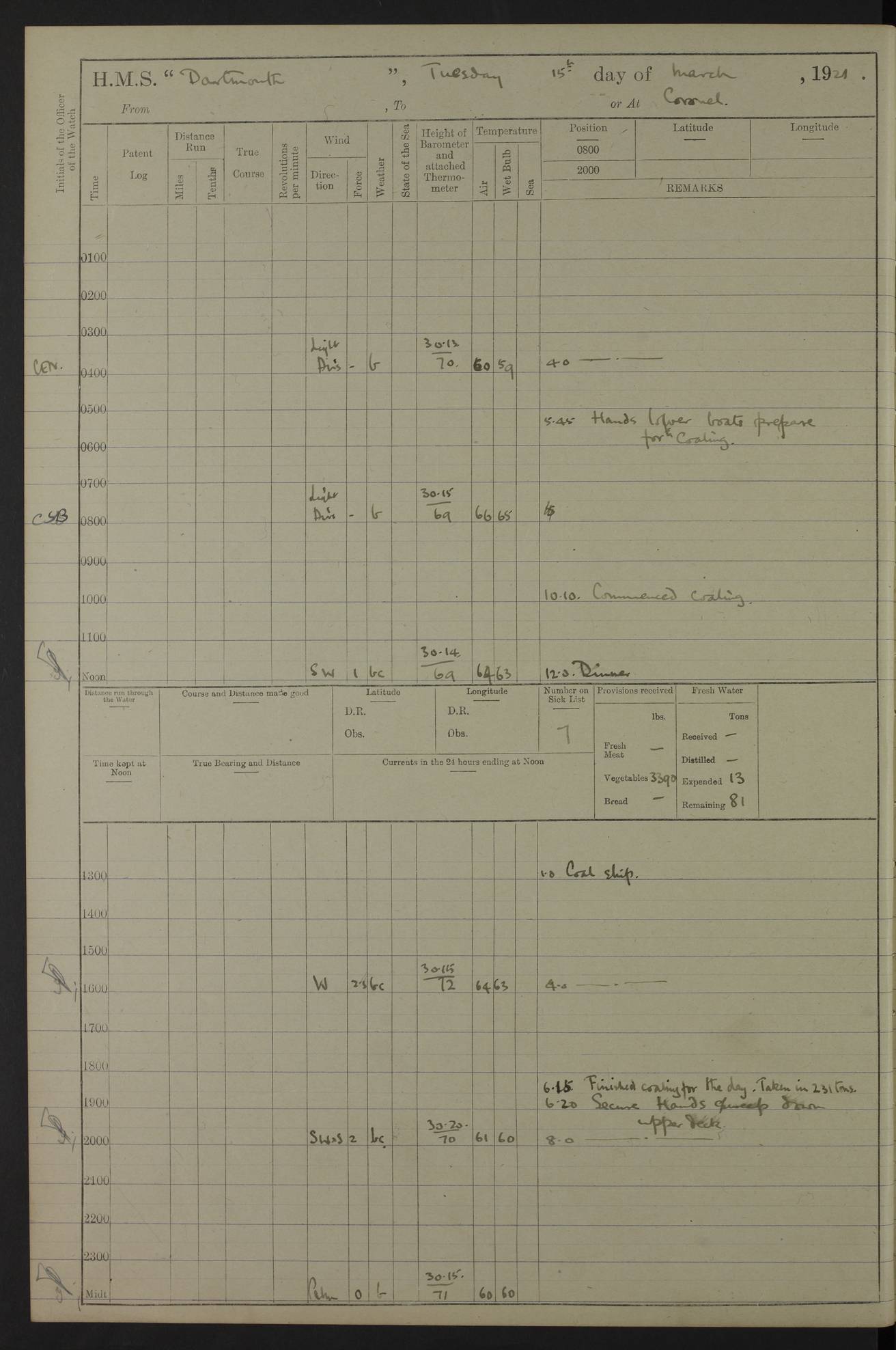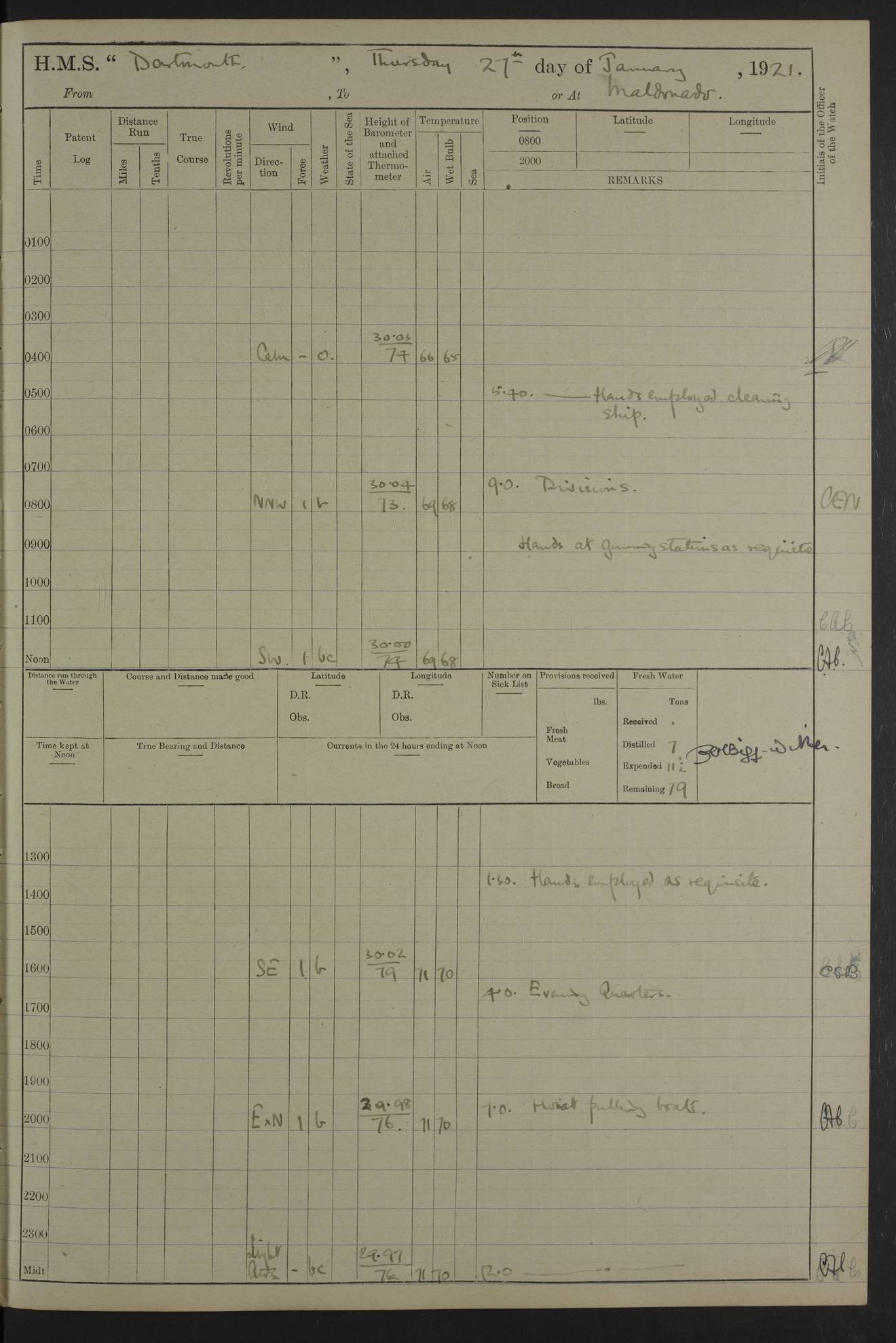 LOGS FOR APRIL 1919 4caf8619cadfd34197013b9a: (http://oldweather.s3.amazonaws.com/ADM53-39518/ADM 53-39518-001_0.jpg) 4caf8619cadfd34197013b9b: (http://oldweather.s3.amazonaws.com/ADM53-39518/ADM 53-39518-001_1.jpg) 4caf8619cadfd34197013b9c: (http://oldweather.s3.amazonaws.com/ADM53-39518/ADM 53-39518-002_0.jpg) 4caf8619cadfd34197013b9d: (http://oldweather.s3.amazonaws.com/ADM53-39518/ADM 53-39518-002_1.jpg) 4caf8619cadfd34197013b9e: (http://oldweather.s3.amazonaws.com/ADM53-39518/ADM 53-39518-003_0.jpg) 4caf8619cadfd34197013b9f: (http://oldweather.s3.amazonaws.com/ADM53-39518/ADM 53-39518-003_1.jpg) 24 April 1919 Gibraltar Lat 36.140, Long -5.365 9.00am: Captain H.W.W. Hope C.B., D.S.O., R.N. commissioned ship for service on South American Station 11.00am: Hands provisioning ship 3.50pm: Lost by accident: 5½ pints Rum whilst transporting ullage cask Number on sick list 1 [Captain Hope seems to have commanded HMS Repulse in 1925. From there he wrote ‘Orders for Officers of Watches’, a copy of which is in the New South Wales archives. He became an Admiral and died in Wales in 1966.] 4caf8619cadfd34197013ba0: (http://oldweather.s3.amazonaws.com/ADM53-39518/ADM 53-39518-004_0.jpg) 25 April 1919 Gibraltar Lat 36.140, Long -5.365 8.10am: “Dartmouth's” crew transferred from “Glasgow” to “Dartmouth”. “Dartmouth’s” care & maintenance party transferred to “Cormorant”. Hands stowing bags & hammocks 11.00am: Read stations for and exercised Fire Quarters 1.50pm: Hands cleaning ship 5.30pm: Discharged 1 Private, Royal Marine Light Infantry, to “Cormorant”. 1 Private, Royal Marine Light Infantry, joined ship from “Cormorant” Number on sick list 1 [HMS “Glasgow” was a cruiser of 4800 tons, launched in 1909 at Fairfield’s yard at Govan on the Clyde. She was sold in 1927 and is part of the Old Weather fleet. HMS “Cormorant” was a sloop of 1150 tons, launched in 1877 at Chatham Dockyard. She had a wooden hull on an iron frame and became a ‘receiving ship’ at Gibraltar in 1889 where unassigned sailors could be accommodated. She was scrapped in 1949.] 4caf8619cadfd34197013ba1: (http://oldweather.s3.amazonaws.com/ADM53-39518/ADM 53-39518-004_1.jpg) 26 April 1919 Gibraltar Lat 36.1275, Long -5.3545 7.20am: Tugs came alongside 8.20am: Ship berthed in no 3 berth 9.20am: Hands cleaning ship’s bottom & drawing new awnings 11.00am: Carried out tilt test for director 1.00pm: Hands make & mend clothes. Leave to the watch from 1.30pm to 7am 5.00pm: Landed funeral party 8.20pm: Funeral party returned Number on sick list 2 4caf8619cadfd34197013ba2: (http://oldweather.s3.amazonaws.com/ADM53-39518/ADM 53-39518-005_0.jpg) 27 April 1919 Gibraltar Lat 36.1275, Long -5.3545 8.15am: Landed Roman Catholic Church Party 9.35am: Landed Non-Conformist Church Parties 10.30am: Carried out tilt test 1.00pm: Gave leave to watch from 1.30pm to 7am 4.30pm: Discharged 2 Engine Room Artificers & 1 Chief Stoker to “Anenome” 7.00pm: Boys returned on board [HMS “Anenome” was a sloop of 1200 tons, launched in 1915 by Swan Hunter and finally sold in 1922.] 4caf8619cadfd34197013ba3: (http://oldweather.s3.amazonaws.com/ADM53-39518/ADM 53-39518-005_1.jpg) 28 April 1919 Gibraltar Lat 36.13, Long -5.36 7.30am: Landed working party to transfer stores from “Glasgow” to victualling yard 8.45am: Undocked ship. Berthed alongside South Mole 11.20am: Commenced coaling (native labour). Signalmen & Bosun’s party rigging dressing lines. Party clearing sailroom 7.00pm: Brazilian light cruiser “Bahia” & 3 destroyers sailed 11.00pm: Finished coaling [“Bahia”, a cruiser of ~3,400 tons, was launched in 1909 by Armstrong Whitworth. She was sunk by an explosion in 1945 with the loss of most of her crew.] 4caf8619cadfd34197013ba4: (http://oldweather.s3.amazonaws.com/ADM53-39518/ADM 53-39518-005a_0.jpg) 29 April 1919 Gibraltar Lat 36.1300, Long -5.3555 8.10am: Tugs came alongside & shifted ship 8.25am: Secured alongside “Glasgow” at Main Wharf. Hands cleaning ship. Director party carrying out tests 10.00am: Took in lubricating oil. Parties stowing ship 11.00am: Discharged 1 Engine Room Artificer to “Cyclamen” 1.00pm: Gave leave to stokers of Port Watch, 1.30pm till 7am. Hands employed spreading Forecastle & Aft Deck awnings 3.40pm: Furled forecastle awnings 5.00pm: Gave leave to watch till 7am [HMS “Cyclamen” was a sloop, launched in 1916 by Lobnitz & Co, Renfrew. She was sold in 1932. She is part of the Old Weather fleet.] 4caf8619cadfd34197013ba5: (http://oldweather.s3.amazonaws.com/ADM53-39518/ADM 53-39518-005a_1.jpg) 30 April 1919 Gibraltar Lat 36.1300, Long -5.3555 8.30am: Hands painting ship 11.00am: Commenced basin trial 11.45am: Finished basin trial (satisfactory) [Captain continuing rota of local leave.] LOGS FOR MAY 1919 4caf8619cadfd34197013ba6: (http://oldweather.s3.amazonaws.com/ADM53-39518/ADM 53-39518-006_0.jpg) 1 May 1919 Gibraltar Lat 36.1300, Long -5.3555 8.30am: Hands painting ship, getting accommodation ladder from dockyard & taking in canteen stores 1.30pm: Port watch getting in provisions & stationery 4caf8619cadfd34197013ba7: (http://oldweather.s3.amazonaws.com/ADM53-39518/ADM 53-39518-006_1.jpg) 2 May 1919 Gibraltar Lat 36.1300, Long -5.3555 7.40am: Ammunition lighter came alongside 8.05am: Hands ammunitioning ship 4.30pm: Lost overboard by accident: 1 box fuzes 5.15pm: Party drawing & stowing kedge anchor 5.30pm: Read warrant no 1 4caf8619cadfd34197013ba8: (http://oldweather.s3.amazonaws.com/ADM53-39518/ADM 53-39518-007_0.jpg) 3 May 1919 Gibraltar Lat 36.1300, Long -5.3555 5.40am: Hands striking down ammunition 7.40am: Hands striking down ammunition & fuzing Lyddite 8.00am: Divers down for box of fuzes 9.30am: Recovered box of fuzes 1.00pm: Hands make & mend clothes Number on sick list 2 4caf8619cadfd34197013ba9: (http://oldweather.s3.amazonaws.com/ADM53-39518/ADM 53-39518-007_1.jpg) 4 May 1919 Gibraltar Lat 36.1300, Long -5.3555 8.10am: Landed Roman Catholic