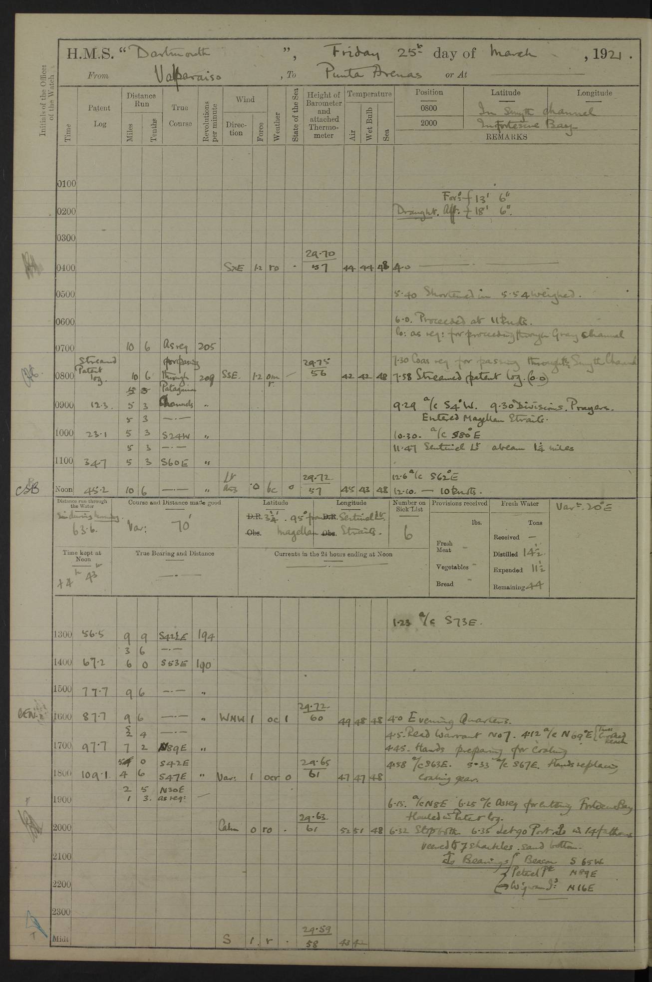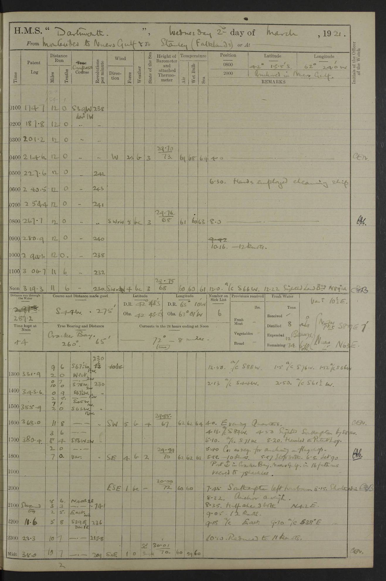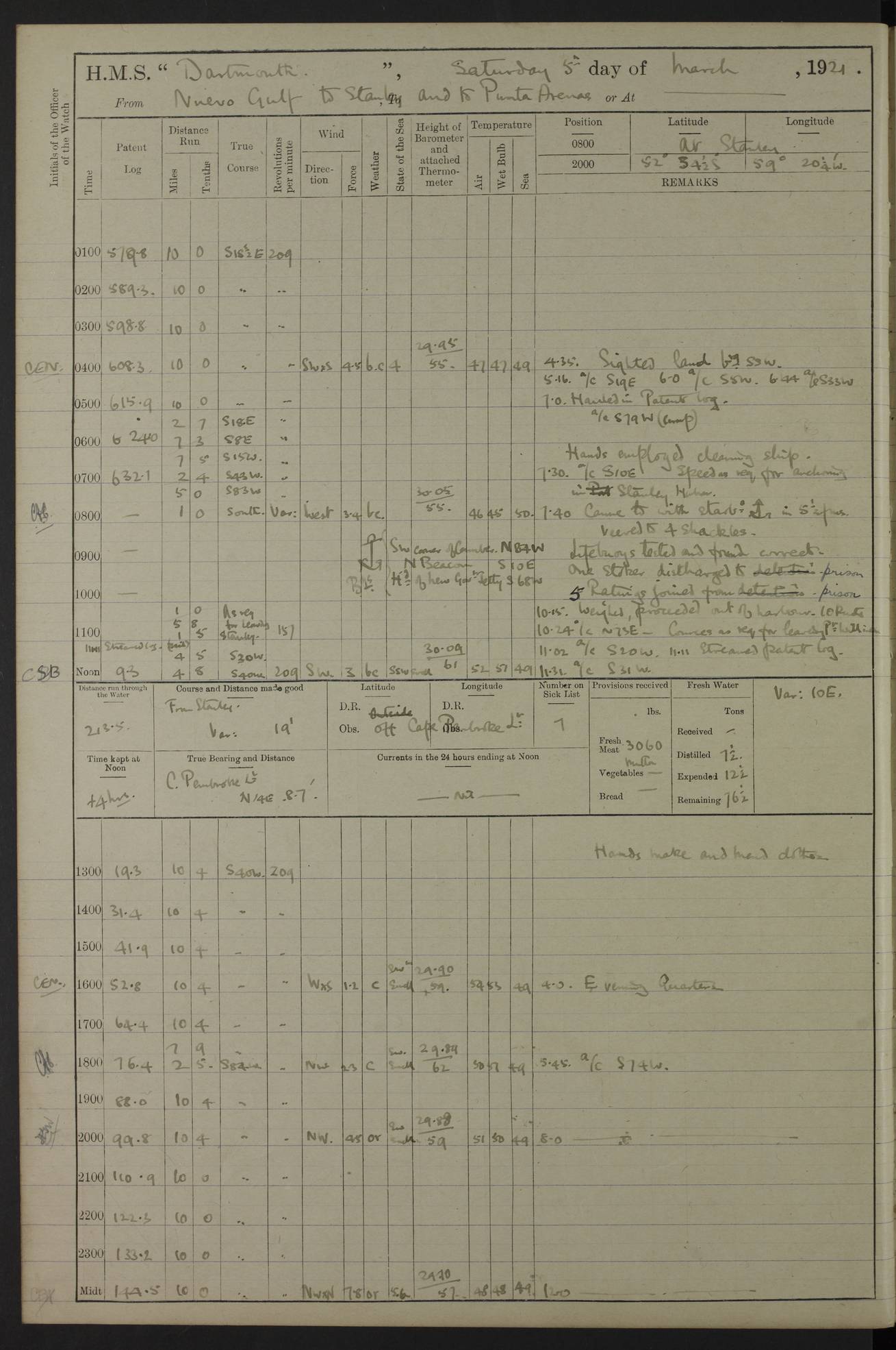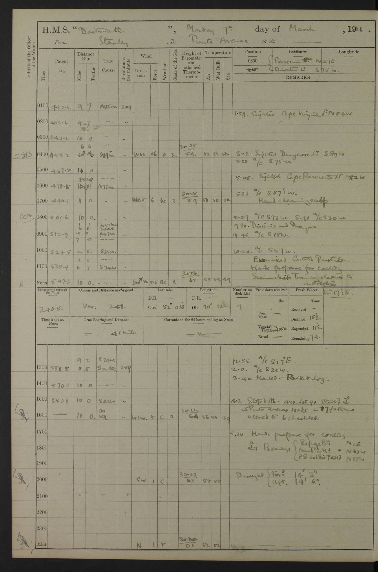 In calm weather the difference in distance run per ton of coal at 9, 10, 11 or 12 knots is not appreciable. Against a head sea 12¼ knots was the best & most economical speed under the conditions in which it was used Signed: GA Bigg Withers Captain Counter signed: Read Admiral Allen J Hunt C.B. C.S.I, Commander in Chief South America, HMS Southampton NOVEMBER 1920 not included LOGS FOR DECEMBER 1920 4caf8620cadfd34197013e6c: (http://oldweather.s3.amazonaws.com/ADM53-39538/ADM 53-39538-001_0.jpg) 4caf8620cadfd34197013e6d: (http://oldweather.s3.amazonaws.com/ADM53-39538/ADM 53-39538-001_1.jpg) 4caf8620cadfd34197013e6e: (http://oldweather.s3.amazonaws.com/ADM53-39538/ADM 53-39538-002_0.jpg) 4caf8620cadfd34197013e6f: (http://oldweather.s3.amazonaws.com/ADM53-39538/ADM 53-39538-002_1.jpg) [A repeat of the fuel data transcribed in October plus] 20.12.20 for ½ hour; speed 16 miles per hour; coal consumption 8 tons per hour; covering 2 miles per ton of coal. Reason for exceeding: carrying out ‘Throw off’ firing with HMS “Weymouth” 4caf8620cadfd34197013e70: (http://oldweather.s3.amazonaws.com/ADM53-39538/ADM 53-39538-003_0.jpg) [Repeat of identification of meteorological instruments.] 4caf8620cadfd34197013e71: (http://oldweather.s3.amazonaws.com/ADM53-39538/ADM 53-39538-003_1.jpg) 1 December 1920 Port Stanley Lat -51.69, Long -57.85 5.40am: Hands employed rigging stages 9.55am: Received Captain of “Reina Regente” on board Noon: Fired salute of 21 guns & dressed ship overall, Queen Alexandra’s birthday 1.30pm: Hands painting ship’s side & receiving ammunition on board Number on sick list 5 [The “Reina Regente” was a Spanish cruiser of ~5300 tons, launched by Arsenal del Ferrol in 1906 and ‘discarded’ in 1926.] 4caf8620cadfd34197013e72: (http://oldweather.s3.amazonaws.com/ADM53-39538/ADM 53-39538-004_0.jpg) 2 December 1920 Port Stanley Lat -51.69, Long -57.85 5.40am: Stokers working party cleaning ammunition lighter. Hands painting ship 8.03am: Picquet boat returned & moored up in camber Noon: Hands make & mend clothes Number on sick list 5 4caf8620cadfd34197013e73: (http://oldweather.s3.amazonaws.com/ADM53-39538/ADM 53-39538-004_1.jpg) 3 December 1920 Port Stanley to Darwin Lat -51.66, Long -57.72 [est] 5.40am: Hands cleaning ship. Divers examining underwater fittings 8.20am: Hands preparing for leaving harbour 9.45am: Swivel off & weighing port anchor 11.25am: Starboard anchor away 11.30am: Slow ahead both 11.39am: Naval Point abeam 12.05pm: Cape Pembroke Light House abeam 12.40pm: Hands dumping ammunition overboard 5.52pm: Anchored Number on sick list 5 [Navy Point is a narrow spit of land dividing Port Stanley from Port William. Cape Pembroke lighthouse is on the most easterly point of the Falkland Islands at Lat -51.7, Long -57.7. This lighthouse was the second on the Cape and functioned until it was put out of action during the Argentinian invasion and not fully restored.] 4caf8620cadfd34197013e74: (http://oldweather.s3.amazonaws.com/ADM53-39538/ADM 53-39538-005_0.jpg) 4 December 1920 Port Darwin Lat -51.82, Long -58.95 5.40am: Hands cleaning ship. Landed surveying party Noon: Piped leave to watch Number on sick list 5 [Port Darwin, usually now known as Darwin, was named after Charles Darwin who visited the spot during the 2nd voyage of the “Beagle”. It lies on the part of East Falkland known as Lafonia. The Battle of Goose Green was fought nearby.] 4caf8620cadfd34197013e75: (http://oldweather.s3.amazonaws.com/ADM53-39538/ADM 53-39538-005_1.jpg) 5 December 1920 Port Darwin Lat -51.82, Long -58.95 10.00am: Rig Church 10.50am: Hands attend Divine Service Noon: Piped leave to watch Number on sick list 5 4caf8620cadfd34197013e76: (http://oldweather.s3.amazonaws.com/ADM53-39538/ADM 53-39538-006_0.jpg) 6 December 1920 Port Darwin Lat -51.82, Long -58.95 9.40am: Special parties as detailed. Training classes. Remainder of hands at parts of ship Number on sick list 5 4caf8620cadfd34197013e77: (http://oldweather.s3.amazonaws.com/ADM53-39538/ADM 53-39538-006_1.jpg) 7 December 1920 Port Darwin Lat -51.82, Long -58.95 1.30pm: Hands preparing ship for sea. Special parties as detailed 4.00pm: Evening Quarters. Read warrant no 114 6.25pm: Anchor away 6.32pm: Half speed ahead Number on sick list 6 4caf8620cadfd34197013e78: (http://oldweather.s3.amazonaws.com/ADM53-39538/ADM 53-39538-007_0.jpg) 8 December 1920 Port Darwin to Dungeness, Magellan Straits Lat -52.68, Long -61.88 8.00am: Position: Lat -52.68, Long -60.97 10.15am: Streamed paravanes 11.35am: Paravanes replaced in stowing position Noon: Hands make & mend clothes 8.00pm: Stopped port engine. Positions: Lat -52.73, Long -63.57 9.37pm: Stopped starboard engine, ahead port engine 11.55pm: Half speed ahead starboard engine Number on sick list 6 4caf8620cadfd34197013e79: (http://oldweather.s3.amazonaws.com/ADM53-39538/ADM 53-39538-007_1.jpg) 9 December 1920 Port Darwin to Dungeness, Magellan Straits Lat -52.68, Long -67.33 8.00am: Lat -52.72, Long -66.55 9.30am: Divisions. Exercised Small Arms Companies 3.00pm: Sighted land on port bow 3.55pm: Sighted Cape Virgins & Dungeness Light House 5.44pm: Anchored. Anchor bearings: Cape Virgins N2E, Dungeness S45W, Cliff Hill N72W Number on sick list 6 [Cape Virgins or Cabo Virgenes is in Argentina at Lat -52.3, Long -68.35. It was named by Ferdinand Magellan as he entered the Strait which bears his name on 21st Oct 1520, the Feast Day of St Ursula and the Eleven Thousand Virgins. Punta Dungeness Lighthouse is in Chile at Lat -52.4, Long -68.4] 4caf8620cadfd34197013e7a: (http://oldweather.s3.amazonaws.com/ADM53-39538/ADM 53-39538-008_0.jpg) 10 December 1920 From Dungeness to Punta Arenas (Sandy Point) Lat -52.70, Long -70.30 [est] 4.40am: Hands to station for weighing anchor 4.57am: Anchor aweigh, half speed ahead both 9.30am: Training classes to instruction. Special parties as detailed. Remainder in parts of ship 11.55am: Decreased to 190 revs, course as requisite for passing through 1