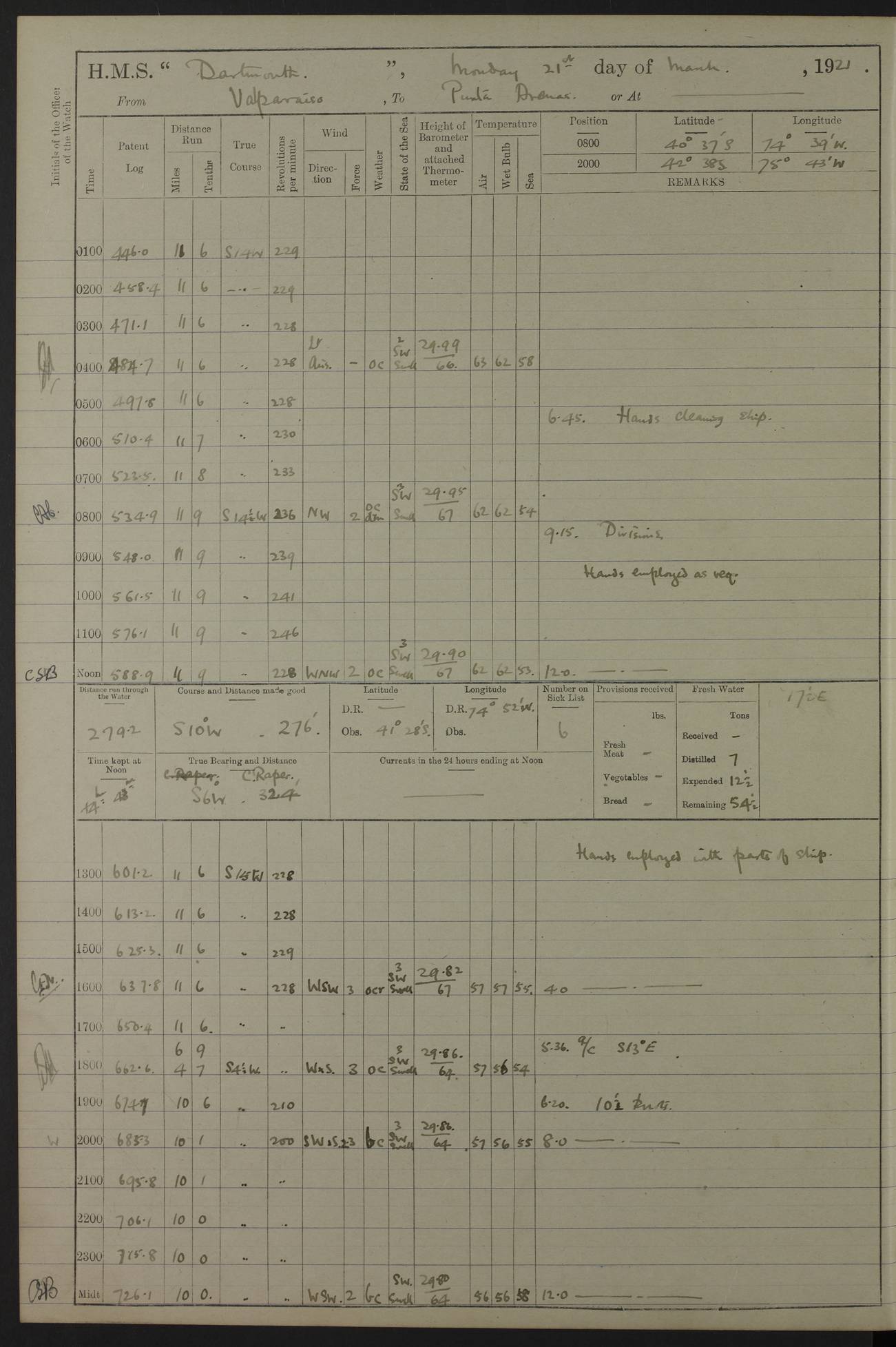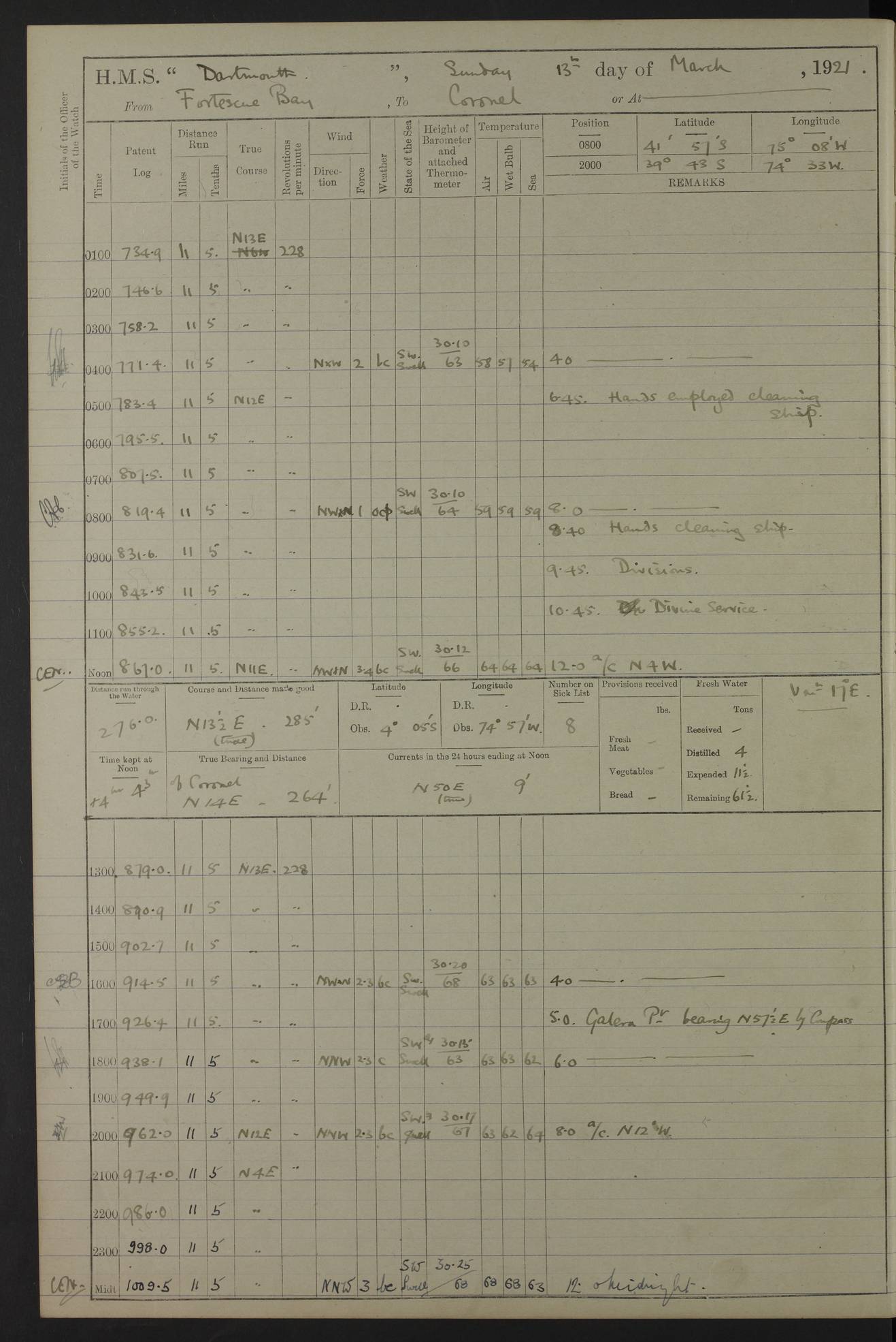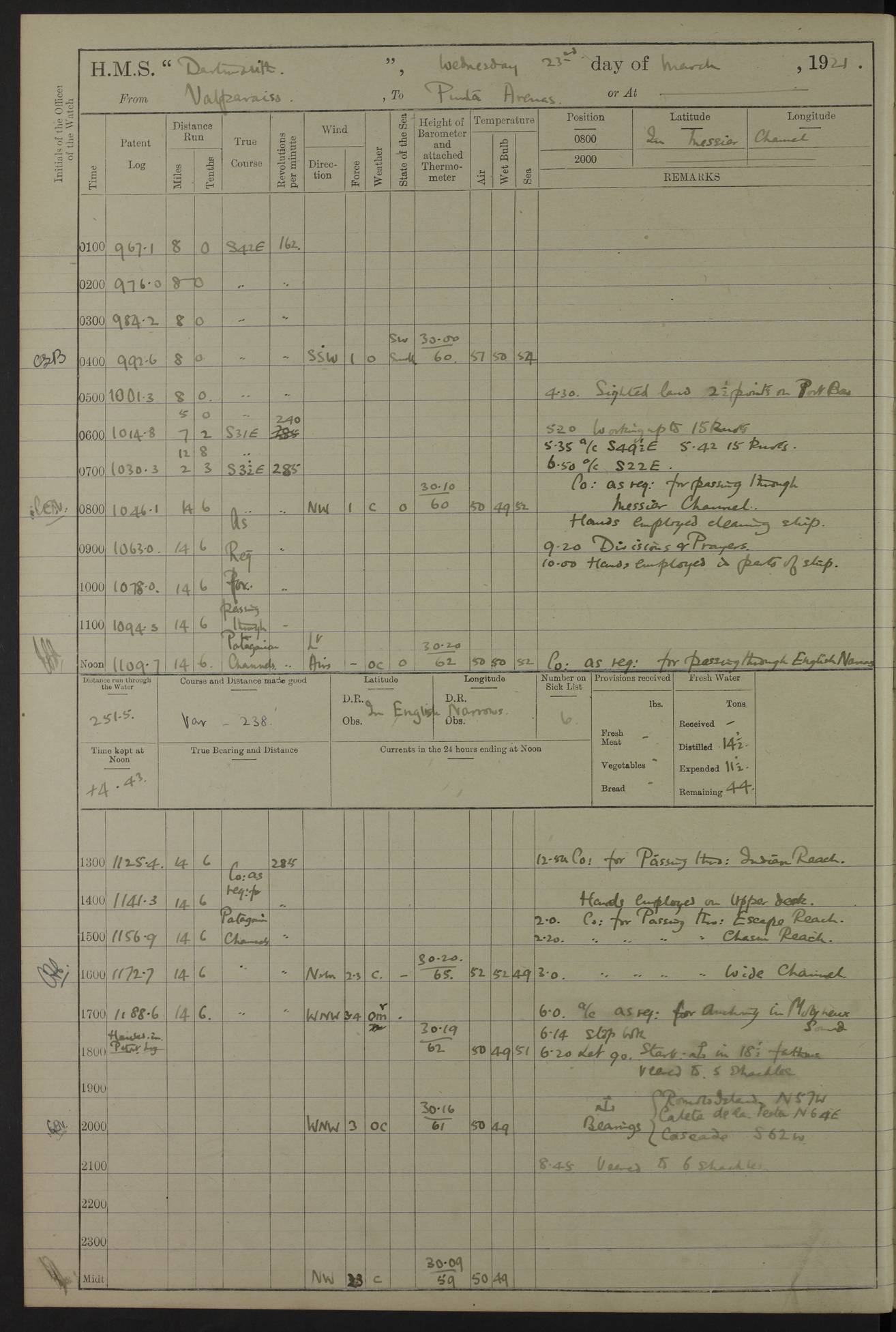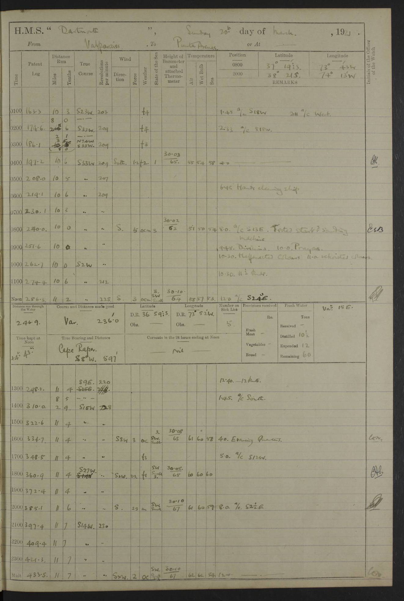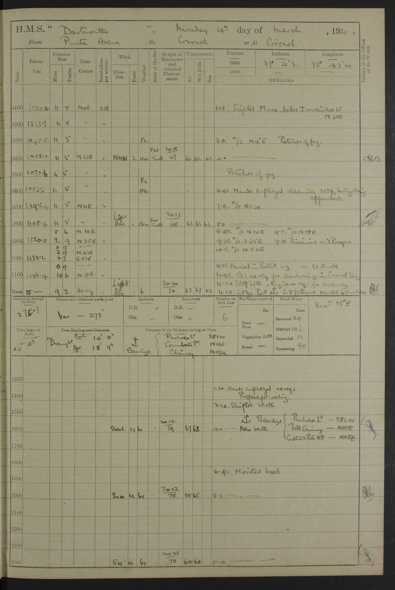 In calm weather the difference in distance run per ton of coal at 9, 10, 11 or 12 knots is not appreciable. Against a head sea 12¼ knots was the best & most economical speed under the conditions in which it was used Signed: GA Bigg Withers Captain Counter signed: Read Admiral Allen J Hunt C.B. C.S.I, Commander in Chief South America, HMS Southampton NOVEMBER 1920 not included LOGS FOR DECEMBER 1920 4caf8620cadfd34197013e6c: (http://oldweather.s3.amazonaws.com/ADM53-39538/ADM 53-39538-001_0.jpg) 4caf8620cadfd34197013e6d: (http://oldweather.s3.amazonaws.com/ADM53-39538/ADM 53-39538-001_1.jpg) 4caf8620cadfd34197013e6e: (http://oldweather.s3.amazonaws.com/ADM53-39538/ADM 53-39538-002_0.jpg) 4caf8620cadfd34197013e6f: (http://oldweather.s3.amazonaws.com/ADM53-39538/ADM 53-39538-002_1.jpg) [A repeat of the fuel data transcribed in October plus] 20.12.20 for ½ hour; speed 16 miles per hour; coal consumption 8 tons per hour; covering 2 miles per ton of coal. Reason for exceeding: carrying out ‘Throw off’ firing with HMS “Weymouth” 4caf8620cadfd34197013e70: (http://oldweather.s3.amazonaws.com/ADM53-39538/ADM 53-39538-003_0.jpg) [Repeat of identification of meteorological instruments.] 4caf8620cadfd34197013e71: (http://oldweather.s3.amazonaws.com/ADM53-39538/ADM 53-39538-003_1.jpg) 1 December 1920 Port Stanley Lat -51.69, Long -57.85 5.40am: Hands employed rigging stages 9.55am: Received Captain of “Reina Regente” on board Noon: Fired salute of 21 guns & dressed ship overall, Queen Alexandra’s birthday 1.30pm: Hands painting ship’s side & receiving ammunition on board Number on sick list 5 [The “Reina Regente” was a Spanish cruiser of ~5300 tons, launched by Arsenal del Ferrol in 1906 and ‘discarded’ in 1926.] 4caf8620cadfd34197013e72: (http://oldweather.s3.amazonaws.com/ADM53-39538/ADM 53-39538-004_0.jpg) 2 December 1920 Port Stanley Lat -51.69, Long -57.85 5.40am: Stokers working party cleaning ammunition lighter. Hands painting ship 8.03am: Picquet boat returned & moored up in camber Noon: Hands make & mend clothes Number on sick list 5 4caf8620cadfd34197013e73: (http://oldweather.s3.amazonaws.com/ADM53-39538/ADM 53-39538-004_1.jpg) 3 December 1920 Port Stanley to Darwin Lat -51.66, Long -57.72 [est] 5.40am: Hands cleaning ship. Divers examining underwater fittings 8.20am: Hands preparing for leaving harbour 9.45am: Swivel off & weighing port anchor 11.25am: Starboard anchor away 11.30am: Slow ahead both 11.39am: Naval Point abeam 12.05pm: Cape Pembroke Light House abeam 12.40pm: Hands dumping ammunition overboard 5.52pm: Anchored Number on sick list 5 [Navy Point is a narrow spit of land dividing Port Stanley from Port William. Cape Pembroke lighthouse is on the most easterly point of the Falkland Islands at Lat -51.7, Long -57.7. This lighthouse was the second on the Cape and functioned until it was put out of action during the Argentinian invasion and not fully restored.] 4caf8620cadfd34197013e74: (http://oldweather.s3.amazonaws.com/ADM53-39538/ADM 53-39538-005_0.jpg) 4 December 1920 Port Darwin Lat -51.82, Long -58.95 5.40am: Hands cleaning ship. Landed surveying party Noon: Piped leave to watch Number on sick list 5 [Port Darwin, usually now known as Darwin, was named after Charles Darwin who visited the spot during the 2nd voyage of the “Beagle”. It lies on the part of East Falkland known as Lafonia. The Battle of Goose Green was fought nearby.] 4caf8620cadfd34197013e75: (http://oldweather.s3.amazonaws.com/ADM53-39538/ADM 53-39538-005_1.jpg) 5 December 1920 Port Darwin Lat -51.82, Long -58.95 10.00am: Rig Church 10.50am: Hands attend Divine Service Noon: Piped leave to watch Number on sick list 5 4caf8620cadfd34197013e76: (http://oldweather.s3.amazonaws.com/ADM53-39538/ADM 53-39538-006_0.jpg) 6 December 1920 Port Darwin Lat -51.82, Long -58.95 9.40am: Special parties as detailed. Training classes. Remainder of hands at parts of ship Number on sick list 5 4caf8620cadfd34197013e77: (http://oldweather.s3.amazonaws.com/ADM53-39538/ADM 53-39538-006_1.jpg) 7 December 1920 Port Darwin Lat -51.82, Long -58.95 1.30pm: Hands preparing ship for sea. Special parties as detailed 4.00pm: Evening Quarters. Read warrant no 114 6.25pm: Anchor away 6.32pm: Half speed ahead Number on sick list 6 4caf8620cadfd34197013e78: (http://oldweather.s3.amazonaws.com/ADM53-39538/ADM 53-39538-007_0.jpg) 8 December 1920 Port Darwin to Dungeness, Magellan Straits Lat -52.68, Long -61.88 8.00am: Position: Lat -52.68, Long -60.97 10.15am: Streamed paravanes 11.35am: Paravanes replaced in stowing position Noon: Hands make & mend clothes 8.00pm: Stopped port engine. Positions: Lat -52.73, Long -63.57 9.37pm: Stopped starboard engine, ahead port engine 11.55pm: Half speed ahead starboard engine Number on sick list 6 4caf8620cadfd34197013e79: (http://oldweather.s3.amazonaws.com/ADM53-39538/ADM 53-39538-007_1.jpg) 9 December 1920 Port Darwin to Dungeness, Magellan Straits Lat -52.68, Long -67.33 8.00am: Lat -52.72, Long -66.55 9.30am: Divisions. Exercised Small Arms Companies 3.00pm: Sighted land on port bow 3.55pm: Sighted Cape Virgins & Dungeness Light House 5.44pm: Anchored. Anchor bearings: Cape Virgins N2E, Dungeness S45W, Cliff Hill N72W Number on sick list 6 [Cape Virgins or Cabo Virgenes is in Argentina at Lat -52.3, Long -68.35. It was named by Ferdinand Magellan as he entered the Strait which bears his name on 21st Oct 1520, the Feast Day of St Ursula and the Eleven Thousand Virgins. Punta Dungeness Lighthouse is in Chile at Lat -52.4, Long -68.4] 4caf8620cadfd34197013e7a: (http://oldweather.s3.amazonaws.com/ADM53-39538/ADM 53-39538-008_0.jpg) 10 December 1920 From Dungeness to Punta Arenas (Sandy Point) Lat -52.70, Long -70.30 [est] 4.40am: Hands to station for weighing anchor 4.57am: Anchor aweigh, half speed ahead both 9.30am: Training classes to instruction. Special parties as detailed. Remainder in parts of ship 11.55am: Decreased to 190 revs, course as requisite for passing through 1