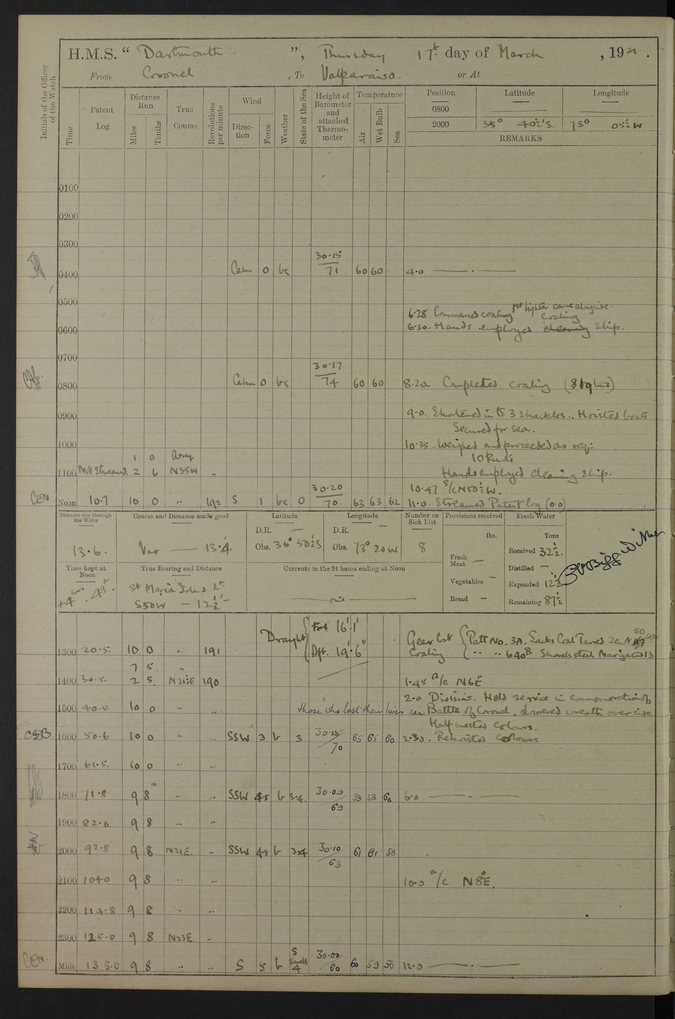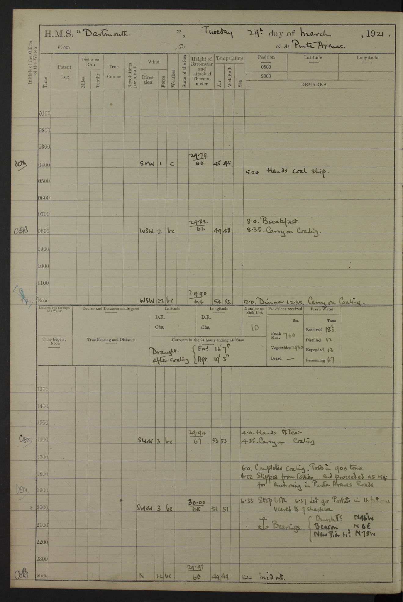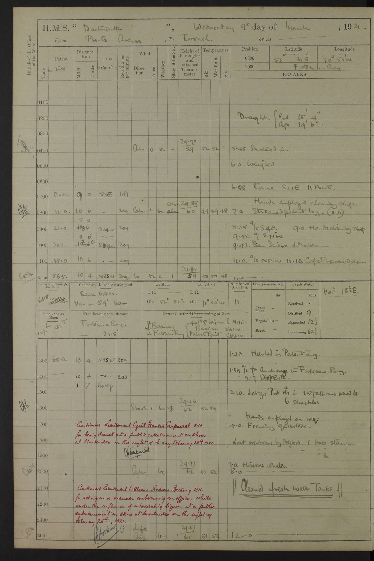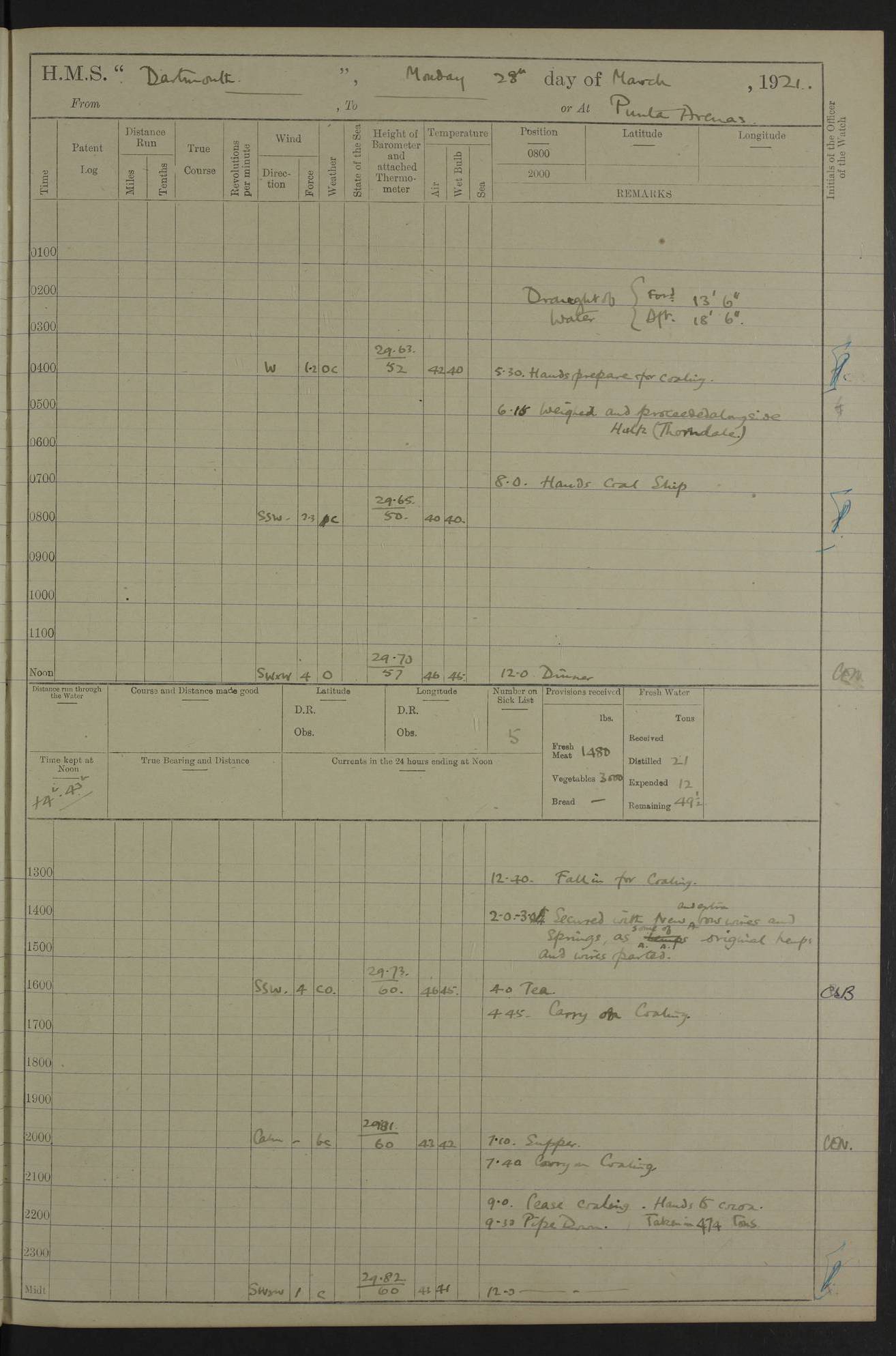 In calm weather the difference in distance run per ton of coal at 9, 10, 11 or 12 knots is not appreciable. Against a head sea 12¼ knots was the best & most economical speed under the conditions in which it was used Signed: GA Bigg Withers Captain Counter signed: Read Admiral Allen J Hunt C.B. C.S.I, Commander in Chief South America, HMS Southampton NOVEMBER 1920 not included LOGS FOR DECEMBER 1920 4caf8620cadfd34197013e6c: (http://oldweather.s3.amazonaws.com/ADM53-39538/ADM 53-39538-001_0.jpg) 4caf8620cadfd34197013e6d: (http://oldweather.s3.amazonaws.com/ADM53-39538/ADM 53-39538-001_1.jpg) 4caf8620cadfd34197013e6e: (http://oldweather.s3.amazonaws.com/ADM53-39538/ADM 53-39538-002_0.jpg) 4caf8620cadfd34197013e6f: (http://oldweather.s3.amazonaws.com/ADM53-39538/ADM 53-39538-002_1.jpg) [A repeat of the fuel data transcribed in October plus] 20.12.20 for ½ hour; speed 16 miles per hour; coal consumption 8 tons per hour; covering 2 miles per ton of coal. Reason for exceeding: carrying out ‘Throw off’ firing with HMS “Weymouth” 4caf8620cadfd34197013e70: (http://oldweather.s3.amazonaws.com/ADM53-39538/ADM 53-39538-003_0.jpg) [Repeat of identification of meteorological instruments.] 4caf8620cadfd34197013e71: (http://oldweather.s3.amazonaws.com/ADM53-39538/ADM 53-39538-003_1.jpg) 1 December 1920 Port Stanley Lat -51.69, Long -57.85 5.40am: Hands employed rigging stages 9.55am: Received Captain of “Reina Regente” on board Noon: Fired salute of 21 guns & dressed ship overall, Queen Alexandra’s birthday 1.30pm: Hands painting ship’s side & receiving ammunition on board Number on sick list 5 [The “Reina Regente” was a Spanish cruiser of ~5300 tons, launched by Arsenal del Ferrol in 1906 and ‘discarded’ in 1926.] 4caf8620cadfd34197013e72: (http://oldweather.s3.amazonaws.com/ADM53-39538/ADM 53-39538-004_0.jpg) 2 December 1920 Port Stanley Lat -51.69, Long -57.85 5.40am: Stokers working party cleaning ammunition lighter. Hands painting ship 8.03am: Picquet boat returned & moored up in camber Noon: Hands make & mend clothes Number on sick list 5 4caf8620cadfd34197013e73: (http://oldweather.s3.amazonaws.com/ADM53-39538/ADM 53-39538-004_1.jpg) 3 December 1920 Port Stanley to Darwin Lat -51.66, Long -57.72 [est] 5.40am: Hands cleaning ship. Divers examining underwater fittings 8.20am: Hands preparing for leaving harbour 9.45am: Swivel off & weighing port anchor 11.25am: Starboard anchor away 11.30am: Slow ahead both 11.39am: Naval Point abeam 12.05pm: Cape Pembroke Light House abeam 12.40pm: Hands dumping ammunition overboard 5.52pm: Anchored Number on sick list 5 [Navy Point is a narrow spit of land dividing Port Stanley from Port William. Cape Pembroke lighthouse is on the most easterly point of the Falkland Islands at Lat -51.7, Long -57.7. This lighthouse was the second on the Cape and functioned until it was put out of action during the Argentinian invasion and not fully restored.] 4caf8620cadfd34197013e74: (http://oldweather.s3.amazonaws.com/ADM53-39538/ADM 53-39538-005_0.jpg) 4 December 1920 Port Darwin Lat -51.82, Long -58.95 5.40am: Hands cleaning ship. Landed surveying party Noon: Piped leave to watch Number on sick list 5 [Port Darwin, usually now known as Darwin, was named after Charles Darwin who visited the spot during the 2nd voyage of the “Beagle”. It lies on the part of East Falkland known as Lafonia. The Battle of Goose Green was fought nearby.] 4caf8620cadfd34197013e75: (http://oldweather.s3.amazonaws.com/ADM53-39538/ADM 53-39538-005_1.jpg) 5 December 1920 Port Darwin Lat -51.82, Long -58.95 10.00am: Rig Church 10.50am: Hands attend Divine Service Noon: Piped leave to watch Number on sick list 5 4caf8620cadfd34197013e76: (http://oldweather.s3.amazonaws.com/ADM53-39538/ADM 53-39538-006_0.jpg) 6 December 1920 Port Darwin Lat -51.82, Long -58.95 9.40am: Special parties as detailed. Training classes. Remainder of hands at parts of ship Number on sick list 5 4caf8620cadfd34197013e77: (http://oldweather.s3.amazonaws.com/ADM53-39538/ADM 53-39538-006_1.jpg) 7 December 1920 Port Darwin Lat -51.82, Long -58.95 1.30pm: Hands preparing ship for sea. Special parties as detailed 4.00pm: Evening Quarters. Read warrant no 114 6.25pm: Anchor away 6.32pm: Half speed ahead Number on sick list 6 4caf8620cadfd34197013e78: (http://oldweather.s3.amazonaws.com/ADM53-39538/ADM 53-39538-007_0.jpg) 8 December 1920 Port Darwin to Dungeness, Magellan Straits Lat -52.68, Long -61.88 8.00am: Position: Lat -52.68, Long -60.97 10.15am: Streamed paravanes 11.35am: Paravanes replaced in stowing position Noon: Hands make & mend clothes 8.00pm: Stopped port engine. Positions: Lat -52.73, Long -63.57 9.37pm: Stopped starboard engine, ahead port engine 11.55pm: Half speed ahead starboard engine Number on sick list 6 4caf8620cadfd34197013e79: (http://oldweather.s3.amazonaws.com/ADM53-39538/ADM 53-39538-007_1.jpg) 9 December 1920 Port Darwin to Dungeness, Magellan Straits Lat -52.68, Long -67.33 8.00am: Lat -52.72, Long -66.55 9.30am: Divisions. Exercised Small Arms Companies 3.00pm: Sighted land on port bow 3.55pm: Sighted Cape Virgins & Dungeness Light House 5.44pm: Anchored. Anchor bearings: Cape Virgins N2E, Dungeness S45W, Cliff Hill N72W Number on sick list 6 [Cape Virgins or Cabo Virgenes is in Argentina at Lat -52.3, Long -68.35. It was named by Ferdinand Magellan as he entered the Strait which bears his name on 21st Oct 1520, the Feast Day of St Ursula and the Eleven Thousand Virgins. Punta Dungeness Lighthouse is in Chile at Lat -52.4, Long -68.4] 4caf8620cadfd34197013e7a: (http://oldweather.s3.amazonaws.com/ADM53-39538/ADM 53-39538-008_0.jpg) 10 December 1920 From Dungeness to Punta Arenas (Sandy Point) Lat -52.70, Long -70.30 [est] 4.40am: Hands to station for weighing anchor 4.57am: Anchor aweigh, half speed ahead both 9.30am: Training classes to instruction. Special parties as detailed. Remainder in parts of ship 11.55am: Decreased to 190 revs, course as requisite for passing through 1