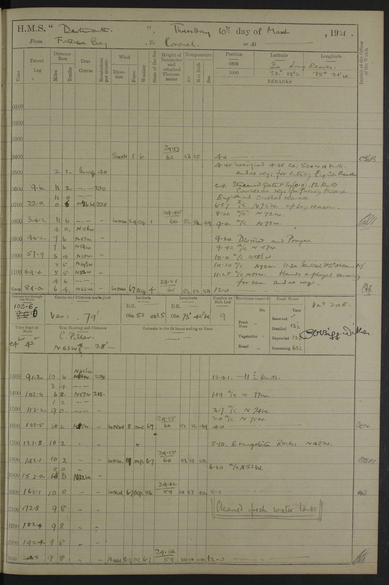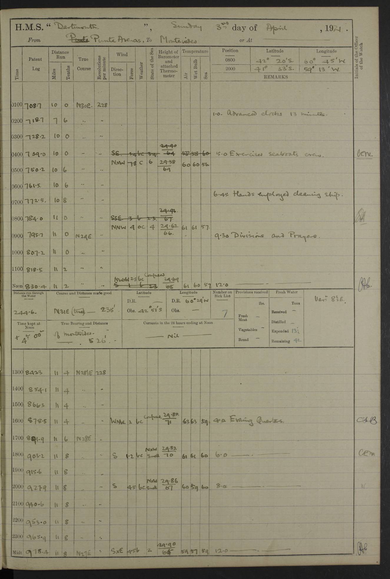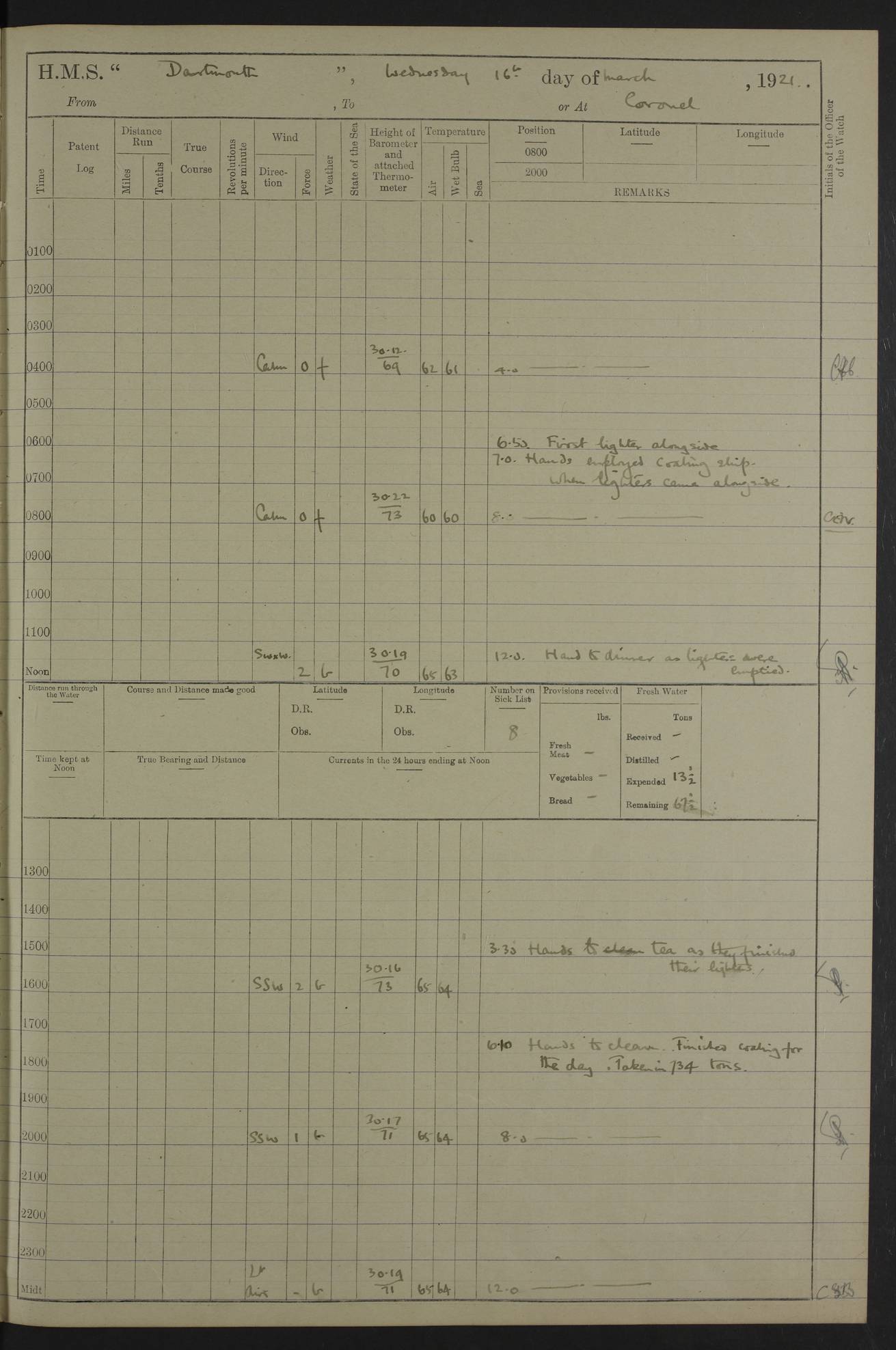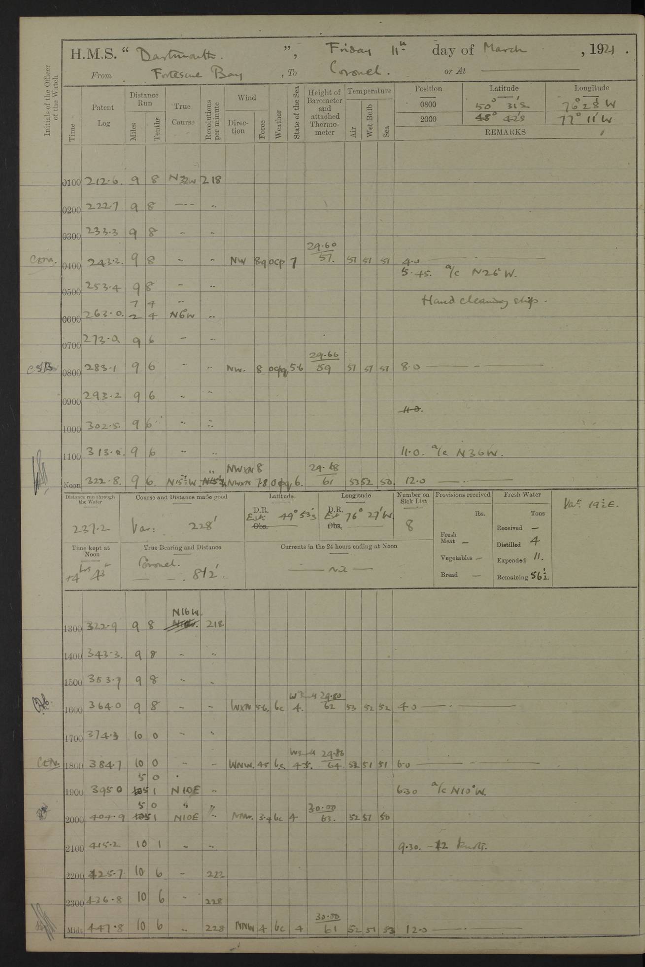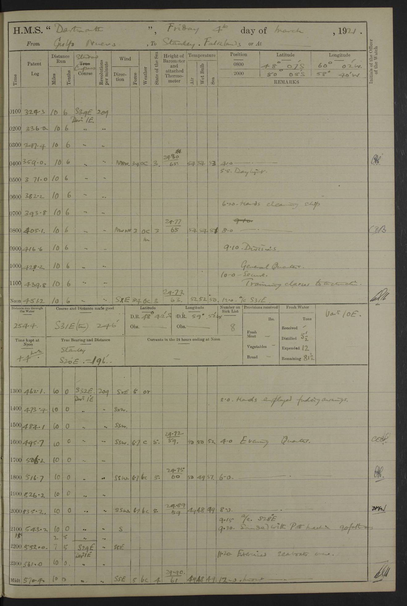 In calm weather the difference in distance run per ton of coal at 9, 10, 11 or 12 knots is not appreciable. Against a head sea 12¼ knots was the best & most economical speed under the conditions in which it was used Signed: GA Bigg Withers Captain Counter signed: Read Admiral Allen J Hunt C.B. C.S.I, Commander in Chief South America, HMS Southampton NOVEMBER 1920 not included LOGS FOR DECEMBER 1920 4caf8620cadfd34197013e6c: (http://oldweather.s3.amazonaws.com/ADM53-39538/ADM 53-39538-001_0.jpg) 4caf8620cadfd34197013e6d: (http://oldweather.s3.amazonaws.com/ADM53-39538/ADM 53-39538-001_1.jpg) 4caf8620cadfd34197013e6e: (http://oldweather.s3.amazonaws.com/ADM53-39538/ADM 53-39538-002_0.jpg) 4caf8620cadfd34197013e6f: (http://oldweather.s3.amazonaws.com/ADM53-39538/ADM 53-39538-002_1.jpg) [A repeat of the fuel data transcribed in October plus] 20.12.20 for ½ hour; speed 16 miles per hour; coal consumption 8 tons per hour; covering 2 miles per ton of coal. Reason for exceeding: carrying out ‘Throw off’ firing with HMS “Weymouth” 4caf8620cadfd34197013e70: (http://oldweather.s3.amazonaws.com/ADM53-39538/ADM 53-39538-003_0.jpg) [Repeat of identification of meteorological instruments.] 4caf8620cadfd34197013e71: (http://oldweather.s3.amazonaws.com/ADM53-39538/ADM 53-39538-003_1.jpg) 1 December 1920 Port Stanley Lat -51.69, Long -57.85 5.40am: Hands employed rigging stages 9.55am: Received Captain of “Reina Regente” on board Noon: Fired salute of 21 guns & dressed ship overall, Queen Alexandra’s birthday 1.30pm: Hands painting ship’s side & receiving ammunition on board Number on sick list 5 [The “Reina Regente” was a Spanish cruiser of ~5300 tons, launched by Arsenal del Ferrol in 1906 and ‘discarded’ in 1926.] 4caf8620cadfd34197013e72: (http://oldweather.s3.amazonaws.com/ADM53-39538/ADM 53-39538-004_0.jpg) 2 December 1920 Port Stanley Lat -51.69, Long -57.85 5.40am: Stokers working party cleaning ammunition lighter. Hands painting ship 8.03am: Picquet boat returned & moored up in camber Noon: Hands make & mend clothes Number on sick list 5 4caf8620cadfd34197013e73: (http://oldweather.s3.amazonaws.com/ADM53-39538/ADM 53-39538-004_1.jpg) 3 December 1920 Port Stanley to Darwin Lat -51.66, Long -57.72 [est] 5.40am: Hands cleaning ship. Divers examining underwater fittings 8.20am: Hands preparing for leaving harbour 9.45am: Swivel off & weighing port anchor 11.25am: Starboard anchor away 11.30am: Slow ahead both 11.39am: Naval Point abeam 12.05pm: Cape Pembroke Light House abeam 12.40pm: Hands dumping ammunition overboard 5.52pm: Anchored Number on sick list 5 [Navy Point is a narrow spit of land dividing Port Stanley from Port William. Cape Pembroke lighthouse is on the most easterly point of the Falkland Islands at Lat -51.7, Long -57.7. This lighthouse was the second on the Cape and functioned until it was put out of action during the Argentinian invasion and not fully restored.] 4caf8620cadfd34197013e74: (http://oldweather.s3.amazonaws.com/ADM53-39538/ADM 53-39538-005_0.jpg) 4 December 1920 Port Darwin Lat -51.82, Long -58.95 5.40am: Hands cleaning ship. Landed surveying party Noon: Piped leave to watch Number on sick list 5 [Port Darwin, usually now known as Darwin, was named after Charles Darwin who visited the spot during the 2nd voyage of the “Beagle”. It lies on the part of East Falkland known as Lafonia. The Battle of Goose Green was fought nearby.] 4caf8620cadfd34197013e75: (http://oldweather.s3.amazonaws.com/ADM53-39538/ADM 53-39538-005_1.jpg) 5 December 1920 Port Darwin Lat -51.82, Long -58.95 10.00am: Rig Church 10.50am: Hands attend Divine Service Noon: Piped leave to watch Number on sick list 5 4caf8620cadfd34197013e76: (http://oldweather.s3.amazonaws.com/ADM53-39538/ADM 53-39538-006_0.jpg) 6 December 1920 Port Darwin Lat -51.82, Long -58.95 9.40am: Special parties as detailed. Training classes. Remainder of hands at parts of ship Number on sick list 5 4caf8620cadfd34197013e77: (http://oldweather.s3.amazonaws.com/ADM53-39538/ADM 53-39538-006_1.jpg) 7 December 1920 Port Darwin Lat -51.82, Long -58.95 1.30pm: Hands preparing ship for sea. Special parties as detailed 4.00pm: Evening Quarters. Read warrant no 114 6.25pm: Anchor away 6.32pm: Half speed ahead Number on sick list 6 4caf8620cadfd34197013e78: (http://oldweather.s3.amazonaws.com/ADM53-39538/ADM 53-39538-007_0.jpg) 8 December 1920 Port Darwin to Dungeness, Magellan Straits Lat -52.68, Long -61.88 8.00am: Position: Lat -52.68, Long -60.97 10.15am: Streamed paravanes 11.35am: Paravanes replaced in stowing position Noon: Hands make & mend clothes 8.00pm: Stopped port engine. Positions: Lat -52.73, Long -63.57 9.37pm: Stopped starboard engine, ahead port engine 11.55pm: Half speed ahead starboard engine Number on sick list 6 4caf8620cadfd34197013e79: (http://oldweather.s3.amazonaws.com/ADM53-39538/ADM 53-39538-007_1.jpg) 9 December 1920 Port Darwin to Dungeness, Magellan Straits Lat -52.68, Long -67.33 8.00am: Lat -52.72, Long -66.55 9.30am: Divisions. Exercised Small Arms Companies 3.00pm: Sighted land on port bow 3.55pm: Sighted Cape Virgins & Dungeness Light House 5.44pm: Anchored. Anchor bearings: Cape Virgins N2E, Dungeness S45W, Cliff Hill N72W Number on sick list 6 [Cape Virgins or Cabo Virgenes is in Argentina at Lat -52.3, Long -68.35. It was named by Ferdinand Magellan as he entered the Strait which bears his name on 21st Oct 1520, the Feast Day of St Ursula and the Eleven Thousand Virgins. Punta Dungeness Lighthouse is in Chile at Lat -52.4, Long -68.4] 4caf8620cadfd34197013e7a: (http://oldweather.s3.amazonaws.com/ADM53-39538/ADM 53-39538-008_0.jpg) 10 December 1920 From Dungeness to Punta Arenas (Sandy Point) Lat -52.70, Long -70.30 [est] 4.40am: Hands to station for weighing anchor 4.57am: Anchor aweigh, half speed ahead both 9.30am: Training classes to instruction. Special parties as detailed. Remainder in parts of ship 11.55am: Decreased to 190 revs, course as requisite for passing through 1