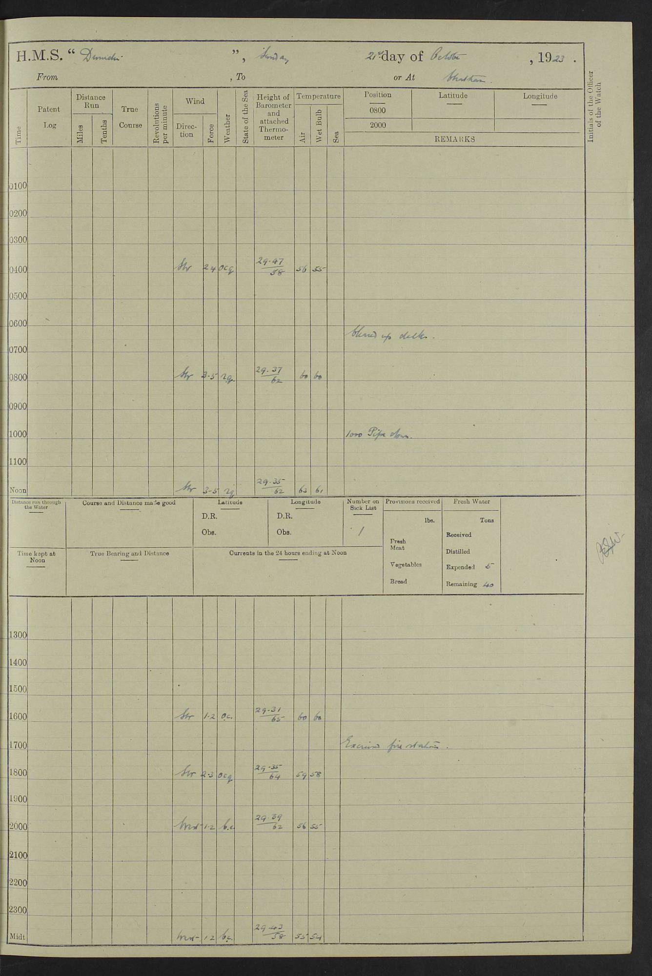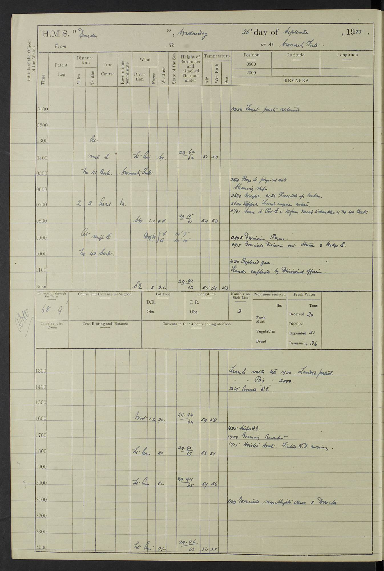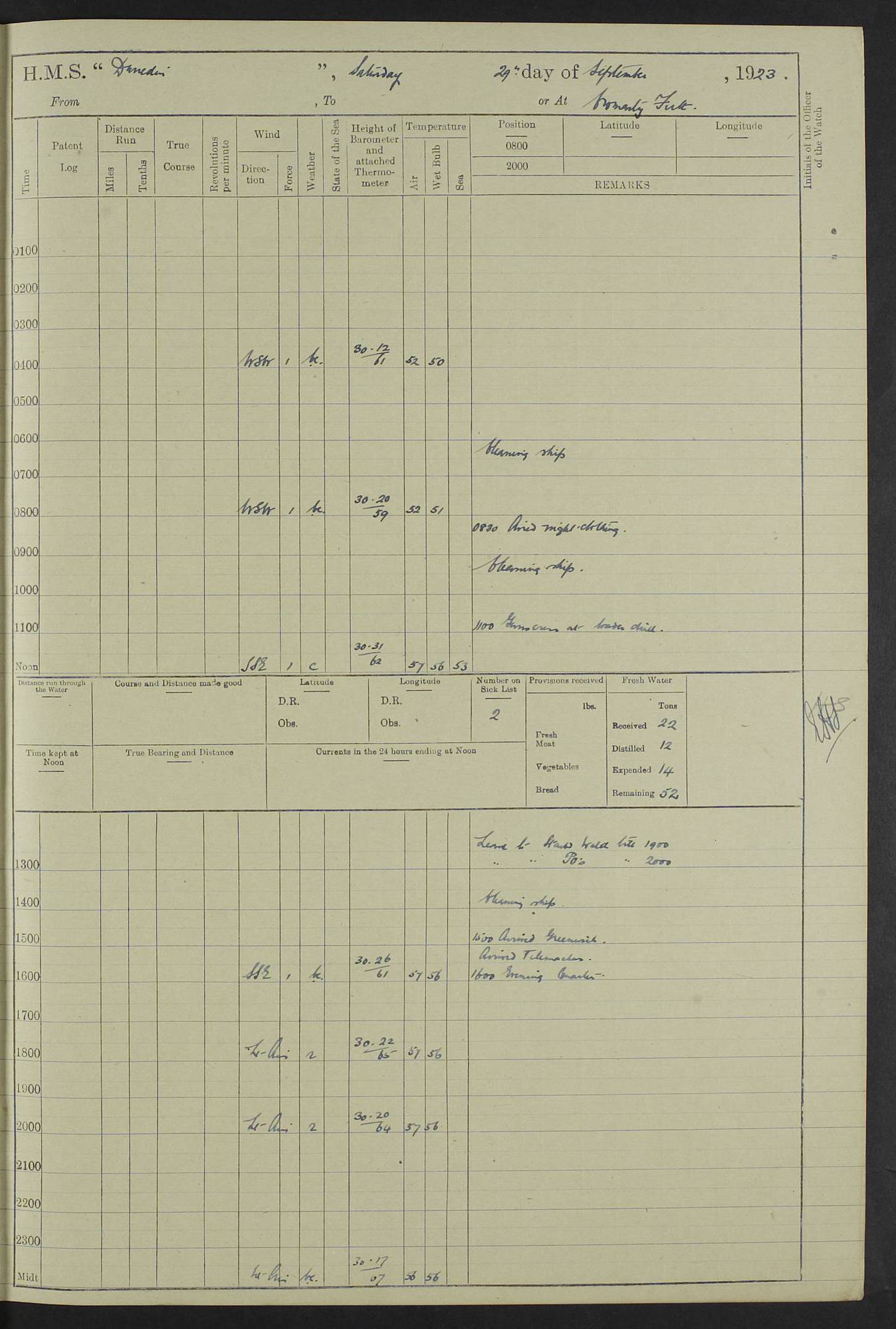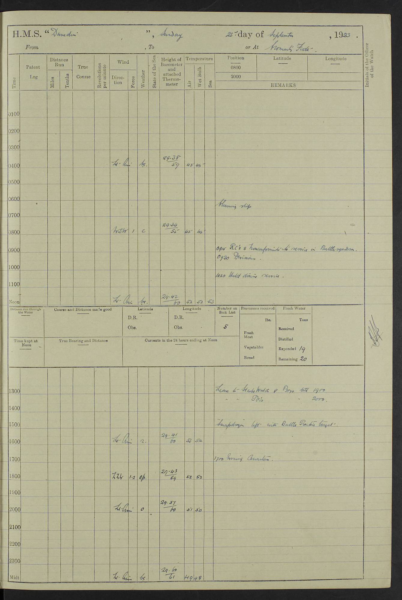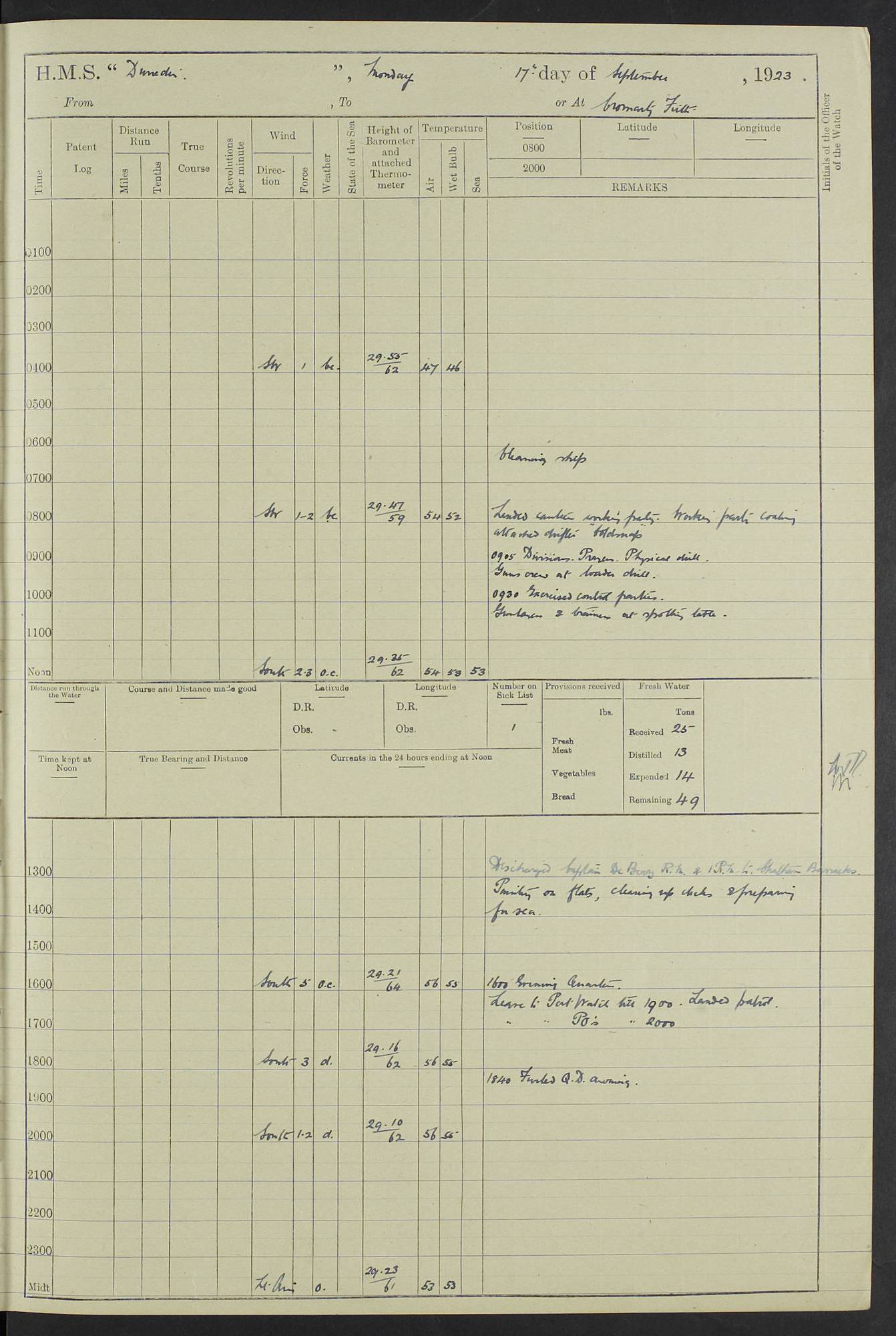 (Maps prepared using Journey Plotter, developed by Maikel. The Plots can only be approximate. They are made by joining-up positions on successive days, and sometimes positions are not given. There will therefore be occasions when the ship appears to have travelled overland) LOG BOOK – 23RD SEPTEMBER 1920 TO 13TH SEPTEMBER 1921 4caf8d9dcadfd3419703bde2: (http://oldweather.s3.amazonaws.com/ADM53-76345/ADM53-76345_0.jpg) Left front cover of Ship’s Log. 4caf8d9dcadfd3419703bde3: (http://oldweather.s3.amazonaws.com/ADM53-76345/ADM53-76345_1.jpg) Right front cover of Ship’s Log. 4caf8d97cadfd3419703bc6a: (http://oldweather.s3.amazonaws.com/ADM53-76345/ADM53-76345-002_0.jpg) 4caf8d97cadfd3419703bc6b: (http://oldweather.s3.amazonaws.com/ADM53-76345/ADM53-76345-002_1.jpg) 4caf8d97cadfd3419703bc6c: (http://oldweather.s3.amazonaws.com/ADM53-76345/ADM53-76345-003_0.jpg) 4caf8d97cadfd3419703bc6d: (http://oldweather.s3.amazonaws.com/ADM53-76345/ADM53-76345-003_1.jpg) 4caf8d97cadfd3419703bc6e: (http://oldweather.s3.amazonaws.com/ADM53-76345/ADM53-76345-004_0.jpg) Blank pages. 4caf8d97cadfd3419703bc6f: (http://oldweather.s3.amazonaws.com/ADM53-76345/ADM53-76345-004_1.jpg) S.- 321. See Articles 557, 619, 622, 924, 1025, 1026 and 1849 of the King’s Regulations, 1913. This Log is to be kept from the time the Ship is Commissioned until she is paid off; when it is to be transmitted as directed by the Admiralty Instructions. The Name and Address of the Officer to whom the acknowledgement of receipt should be sent by the Deputy Cashier in charge, Royal Victoria Yard, Deptford, is to be inserted here. Name: Commander’s Office. Address: H.M.S. Dunedin. c/o G.P.O. London. LOG of H.M.S. “Dunedin” Commanded by Captain C. Wrightson C.B.E. (till 31.3.21). Captain H.S. Monroe D.S.O. (from 31.3.21). FOR THE PERIOD Commencing: Thursday 23rd of September 1920. Ending: Tuesday 13th of September 1921. Tonnage (Displacement): 4,650 Extreme Length: 472ft 3 ins Extreme Breadth: 46 ft 0.3/8” Engines: Manufacturer: Messes R & W Hawthorn Leslie & Co Ltd. Newcastle on Tyne. I.H.P: 40.000 Forced Draught. Description: Turbine (Geared). When Fixed on Board: 1918 – 1919. Boilers: Manufacturer: Messes R & W Hawthorn Leslie & Co Ltd. Newcastle on Tyne. Description: Small tube Improved Yarrow. When made: 1918. When put in vessel: 1918. Paddle Wheels or Screw Propeller: Manufacturer: Manganese Bronze Co. Description: Solid 3 Blades Turbadium Bronze, Pitch 14 ft 3 in. General State of Repair: Satisfactory. R. Alison [?], Lieut Com (W) on paying off 30th August 1923. L. 8418/02. N.L. 15713/13. Where Built Sir W.G. Armstrong Whitworth & Co Ltd. N.L. 18227/18. Armstrong Naval Yard, High Walker, Newcastle on Tyne. Sta. 127/10. Commenced building November 1917, Launched 19 November 1918. N.L. 22782/19. Completed September 1919. 4caf8d98cadfd3419703bc70: (http://oldweather.s3.amazonaws.com/ADM53-76345/ADM53-76345-005_0.jpg) Directions (See King’s Regulations 1913, Articles 1025 and 1849). 1. King’s Regulations. 2. Figures to indicate the Force of the Wind. 3. Letters to denote the State of the Weather. 4. Scale of Fog Intensity. 5. Sea Disturbance Scale 4caf8d98cadfd3419703bc71: (http://oldweather.s3.amazonaws.com/ADM53-76345/ADM53-76345-005_1.jpg) Establishment of Ship’s Company Officers 23 Seamen 187 Boys 36 Marines 46 Engine-room Establishment 105 Other non-executive ratings 44 Total 441 ARMAMENT Position Forecastle: 6” Calibre XII on C.P. XIV mounting. Superstructure: Four 6” Calibre XII on C.P. XIV mountings. Superstructure: Two 3” QF Calibre High Angle mountings, Quarterdeck: 6” Calibre XII on C.P. XIV mountings. Torpedo Armaments Four above water 21” triple tubes. BAROMETER Mercurial or Aneroid: Mercurial. Name of Maker and number: J. Hitchins 101 A747. Height of cistern above sea: 13ft. Error of Mercurial Barometer: Nil at 30.00. Thermometers for Air Temperature. Position on Ship: On fore bridge. Whether in screen: Yes. Maker and No. Negretti & Zambra From: 7.10.19 To: Sept. 1921. Negretti & Zambra No. 10499 Negretti & Zambra No 10391 From: 7.10.19 To: Sept. 1921. Thermometer for Sea Temperature. A. Harper & Sons 7.10.19 POSITION OF STANDARD COMPASS. Manoeuvring Platform. (Fore bridge) BOATS Number of each carried: 1 x 30ft. motor boat. 2 x 32ft. cutters. 1 x 30ft gig. 2 x 27ft whalers. 2 x 16 ft dinghies. MISCELLANEOUS INFORMATION Draught of water with Bunkers full, and complete with provisions, Stores and water: Forward 16 ft 1 inch; Aft 16 ft 11 inches. Number of Tons necessary to increase draught 1 inch: 35.6. Number of Tons of Coal Carried: 16. Number of Tons of Oil Fuel carried: 1127. Quantity of Water Carried (a) For Boilers: 157 tons. (b) For Drinking: 56½ tons. LOGS FOR SEPTEMBER 1920 4caf8d98cadfd3419703bc72: (http://oldweather.s3.amazonaws.com/ADM53-76345/ADM53-76345-006_0.jpg) 23 September 1920 At Copenhagen. Lat 55.694, Long 12.603 4.00am: Signal books correct. am: Hands employed cleaning ship. 8.00am: Signal books correct. am: Sent coaling party to S.S. “Volo”. am: X & Y 6” guns crews at loader drill, remainder of hands employed as requisite. am: Coaling party returned. Noon: Signal books correct. 1.15pm: Sent coaling party to S.S. “Volo”. pm: 1 Rating joined ship from hospital. pm: Boys & training classes under instruction, remainder of hands employed as requisite. 3.00pm: U.S.S. “Gilmer” arrived. [Gilmer, U.S. Destroyer, Flush Decker, launched 18/7/19, Guns: 4 x 5”, 51 cal.,1 x 3”, 23 cal. AA, 12 x 21” TT’s in 4 triple deck mountings. Disp: 1,215 tons, SHP: 26,000 = 35 knots. Jane’s Fighting Ships 1919. Image]. 4.00pm: Signal books correct. pm: Coaling party returned. 8.00pm: Signal books correct. Midnight: Signal books correct. 4caf8d98cadfd3419703bc73: (http://oldweather.s3.amazonaws.com/ADM53-76345/ADM53-76345-006_1.jpg) 24 September 1920 At Copenhagen. Lat 55.694, Long 12.603 4.00am: Signal books correct. am: Hands employed cleaning ship. 6.15am: U.S.S. “Sh