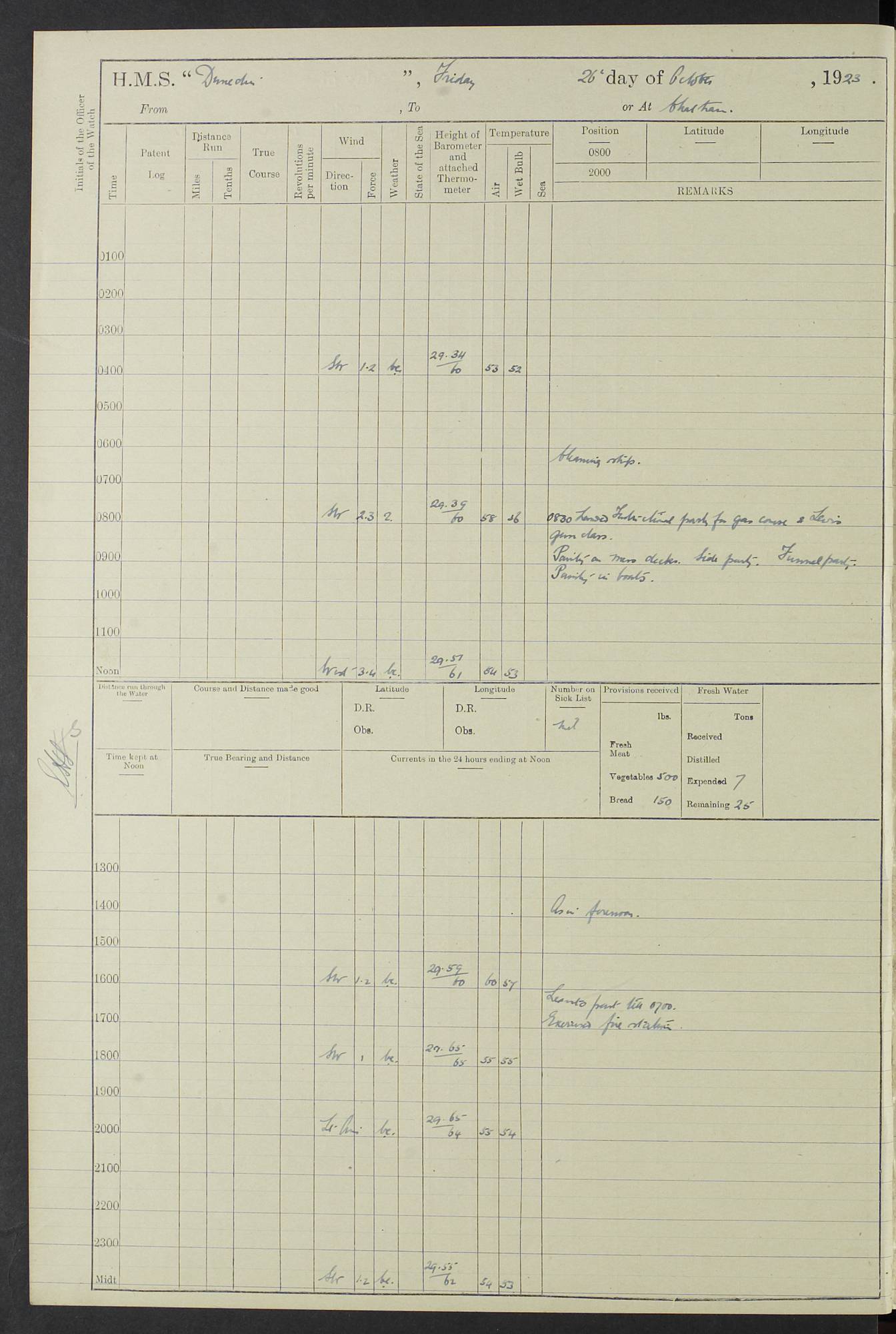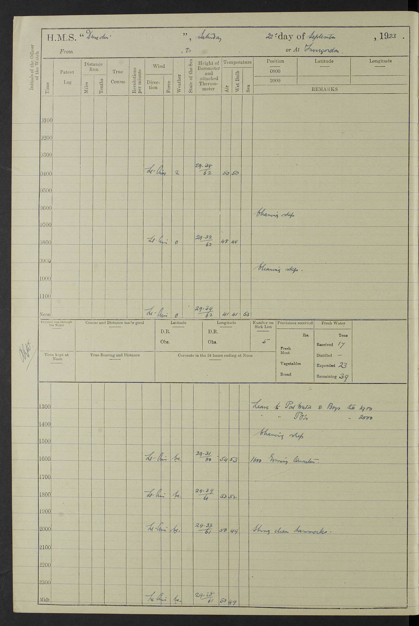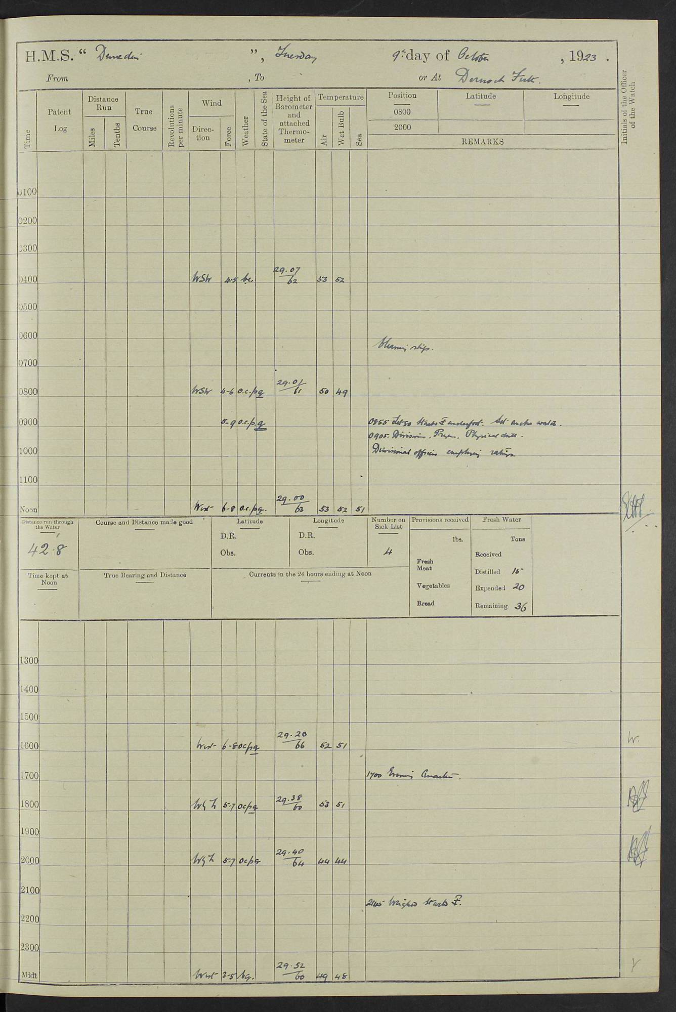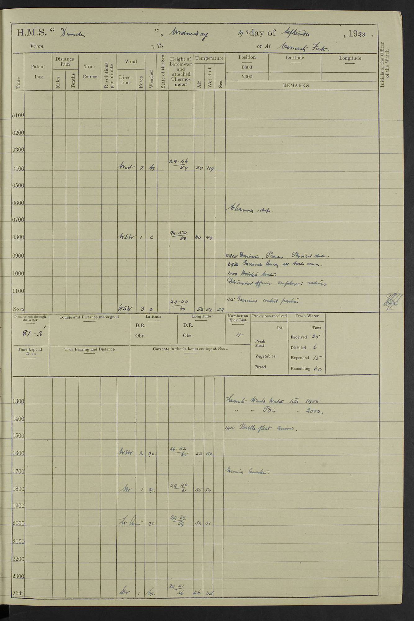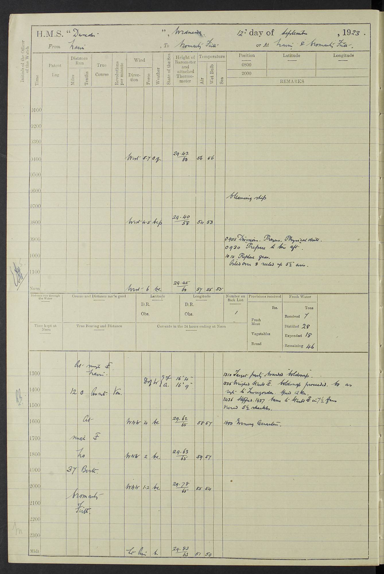 (Maps prepared using Journey Plotter, developed by Maikel. The Plots can only be approximate. They are made by joining-up positions on successive days, and sometimes positions are not given. There will therefore be occasions when the ship appears to have travelled overland) LOG BOOK – 23RD SEPTEMBER 1920 TO 13TH SEPTEMBER 1921 4caf8d9dcadfd3419703bde2: (http://oldweather.s3.amazonaws.com/ADM53-76345/ADM53-76345_0.jpg) Left front cover of Ship’s Log. 4caf8d9dcadfd3419703bde3: (http://oldweather.s3.amazonaws.com/ADM53-76345/ADM53-76345_1.jpg) Right front cover of Ship’s Log. 4caf8d97cadfd3419703bc6a: (http://oldweather.s3.amazonaws.com/ADM53-76345/ADM53-76345-002_0.jpg) 4caf8d97cadfd3419703bc6b: (http://oldweather.s3.amazonaws.com/ADM53-76345/ADM53-76345-002_1.jpg) 4caf8d97cadfd3419703bc6c: (http://oldweather.s3.amazonaws.com/ADM53-76345/ADM53-76345-003_0.jpg) 4caf8d97cadfd3419703bc6d: (http://oldweather.s3.amazonaws.com/ADM53-76345/ADM53-76345-003_1.jpg) 4caf8d97cadfd3419703bc6e: (http://oldweather.s3.amazonaws.com/ADM53-76345/ADM53-76345-004_0.jpg) Blank pages. 4caf8d97cadfd3419703bc6f: (http://oldweather.s3.amazonaws.com/ADM53-76345/ADM53-76345-004_1.jpg) S.- 321. See Articles 557, 619, 622, 924, 1025, 1026 and 1849 of the King’s Regulations, 1913. This Log is to be kept from the time the Ship is Commissioned until she is paid off; when it is to be transmitted as directed by the Admiralty Instructions. The Name and Address of the Officer to whom the acknowledgement of receipt should be sent by the Deputy Cashier in charge, Royal Victoria Yard, Deptford, is to be inserted here. Name: Commander’s Office. Address: H.M.S. Dunedin. c/o G.P.O. London. LOG of H.M.S. “Dunedin” Commanded by Captain C. Wrightson C.B.E. (till 31.3.21). Captain H.S. Monroe D.S.O. (from 31.3.21). FOR THE PERIOD Commencing: Thursday 23rd of September 1920. Ending: Tuesday 13th of September 1921. Tonnage (Displacement): 4,650 Extreme Length: 472ft 3 ins Extreme Breadth: 46 ft 0.3/8” Engines: Manufacturer: Messes R & W Hawthorn Leslie & Co Ltd. Newcastle on Tyne. I.H.P: 40.000 Forced Draught. Description: Turbine (Geared). When Fixed on Board: 1918 – 1919. Boilers: Manufacturer: Messes R & W Hawthorn Leslie & Co Ltd. Newcastle on Tyne. Description: Small tube Improved Yarrow. When made: 1918. When put in vessel: 1918. Paddle Wheels or Screw Propeller: Manufacturer: Manganese Bronze Co. Description: Solid 3 Blades Turbadium Bronze, Pitch 14 ft 3 in. General State of Repair: Satisfactory. R. Alison [?], Lieut Com (W) on paying off 30th August 1923. L. 8418/02. N.L. 15713/13. Where Built Sir W.G. Armstrong Whitworth & Co Ltd. N.L. 18227/18. Armstrong Naval Yard, High Walker, Newcastle on Tyne. Sta. 127/10. Commenced building November 1917, Launched 19 November 1918. N.L. 22782/19. Completed September 1919. 4caf8d98cadfd3419703bc70: (http://oldweather.s3.amazonaws.com/ADM53-76345/ADM53-76345-005_0.jpg) Directions (See King’s Regulations 1913, Articles 1025 and 1849). 1. King’s Regulations. 2. Figures to indicate the Force of the Wind. 3. Letters to denote the State of the Weather. 4. Scale of Fog Intensity. 5. Sea Disturbance Scale 4caf8d98cadfd3419703bc71: (http://oldweather.s3.amazonaws.com/ADM53-76345/ADM53-76345-005_1.jpg) Establishment of Ship’s Company Officers 23 Seamen 187 Boys 36 Marines 46 Engine-room Establishment 105 Other non-executive ratings 44 Total 441 ARMAMENT Position Forecastle: 6” Calibre XII on C.P. XIV mounting. Superstructure: Four 6” Calibre XII on C.P. XIV mountings. Superstructure: Two 3” QF Calibre High Angle mountings, Quarterdeck: 6” Calibre XII on C.P. XIV mountings. Torpedo Armaments Four above water 21” triple tubes. BAROMETER Mercurial or Aneroid: Mercurial. Name of Maker and number: J. Hitchins 101 A747. Height of cistern above sea: 13ft. Error of Mercurial Barometer: Nil at 30.00. Thermometers for Air Temperature. Position on Ship: On fore bridge. Whether in screen: Yes. Maker and No. Negretti & Zambra From: 7.10.19 To: Sept. 1921. Negretti & Zambra No. 10499 Negretti & Zambra No 10391 From: 7.10.19 To: Sept. 1921. Thermometer for Sea Temperature. A. Harper & Sons 7.10.19 POSITION OF STANDARD COMPASS. Manoeuvring Platform. (Fore bridge) BOATS Number of each carried: 1 x 30ft. motor boat. 2 x 32ft. cutters. 1 x 30ft gig. 2 x 27ft whalers. 2 x 16 ft dinghies. MISCELLANEOUS INFORMATION Draught of water with Bunkers full, and complete with provisions, Stores and water: Forward 16 ft 1 inch; Aft 16 ft 11 inches. Number of Tons necessary to increase draught 1 inch: 35.6. Number of Tons of Coal Carried: 16. Number of Tons of Oil Fuel carried: 1127. Quantity of Water Carried (a) For Boilers: 157 tons. (b) For Drinking: 56½ tons. LOGS FOR SEPTEMBER 1920 4caf8d98cadfd3419703bc72: (http://oldweather.s3.amazonaws.com/ADM53-76345/ADM53-76345-006_0.jpg) 23 September 1920 At Copenhagen. Lat 55.694, Long 12.603 4.00am: Signal books correct. am: Hands employed cleaning ship. 8.00am: Signal books correct. am: Sent coaling party to S.S. “Volo”. am: X & Y 6” guns crews at loader drill, remainder of hands employed as requisite. am: Coaling party returned. Noon: Signal books correct. 1.15pm: Sent coaling party to S.S. “Volo”. pm: 1 Rating joined ship from hospital. pm: Boys & training classes under instruction, remainder of hands employed as requisite. 3.00pm: U.S.S. “Gilmer” arrived. [Gilmer, U.S. Destroyer, Flush Decker, launched 18/7/19, Guns: 4 x 5”, 51 cal.,1 x 3”, 23 cal. AA, 12 x 21” TT’s in 4 triple deck mountings. Disp: 1,215 tons, SHP: 26,000 = 35 knots. Jane’s Fighting Ships 1919. Image]. 4.00pm: Signal books correct. pm: Coaling party returned. 8.00pm: Signal books correct. Midnight: Signal books correct. 4caf8d98cadfd3419703bc73: (http://oldweather.s3.amazonaws.com/ADM53-76345/ADM53-76345-006_1.jpg) 24 September 1920 At Copenhagen. Lat 55.694, Long 12.603 4.00am: Signal books correct. am: Hands employed cleaning ship. 6.15am: U.S.S. “Sh