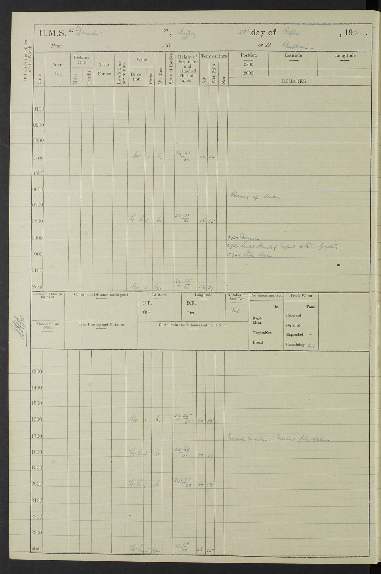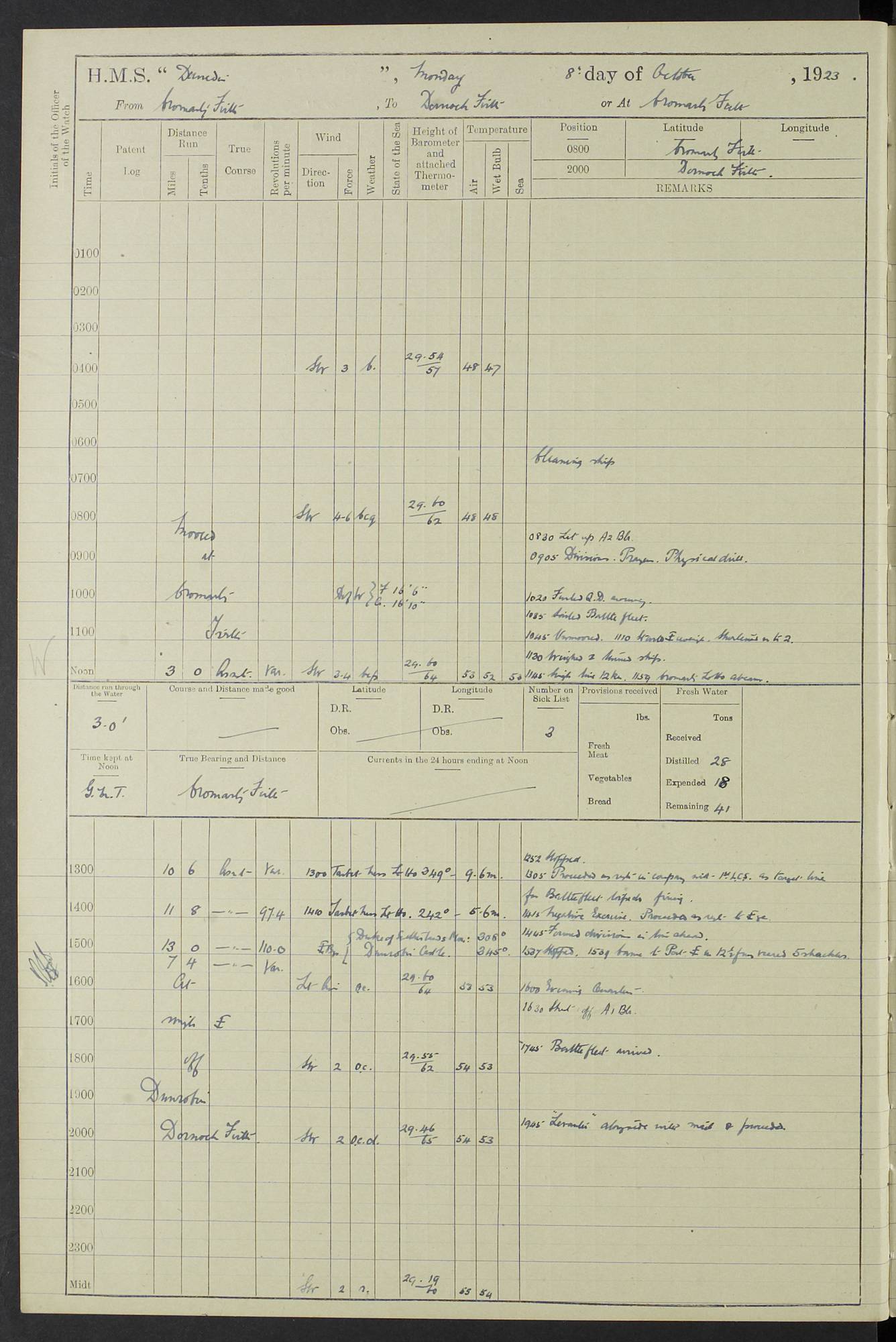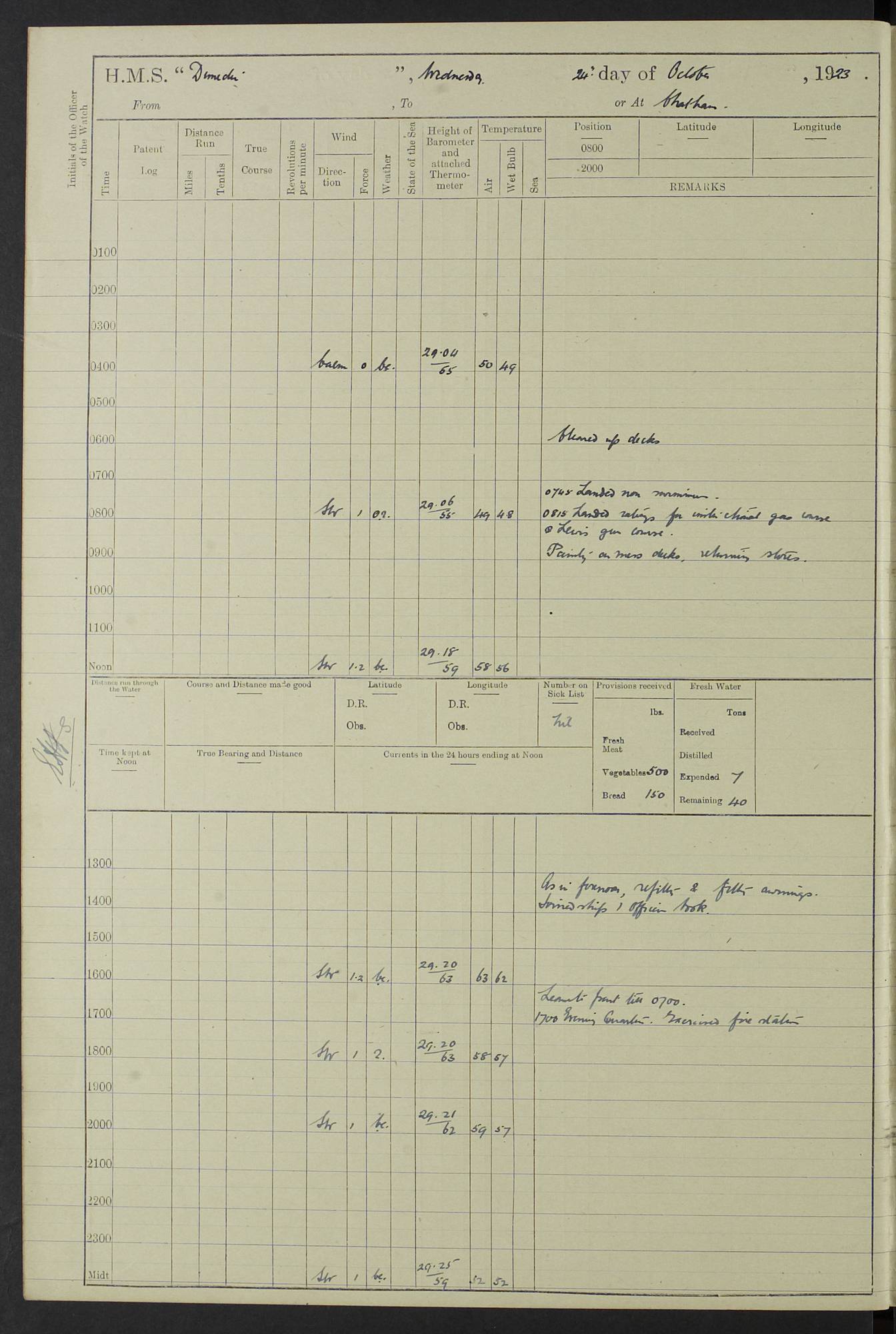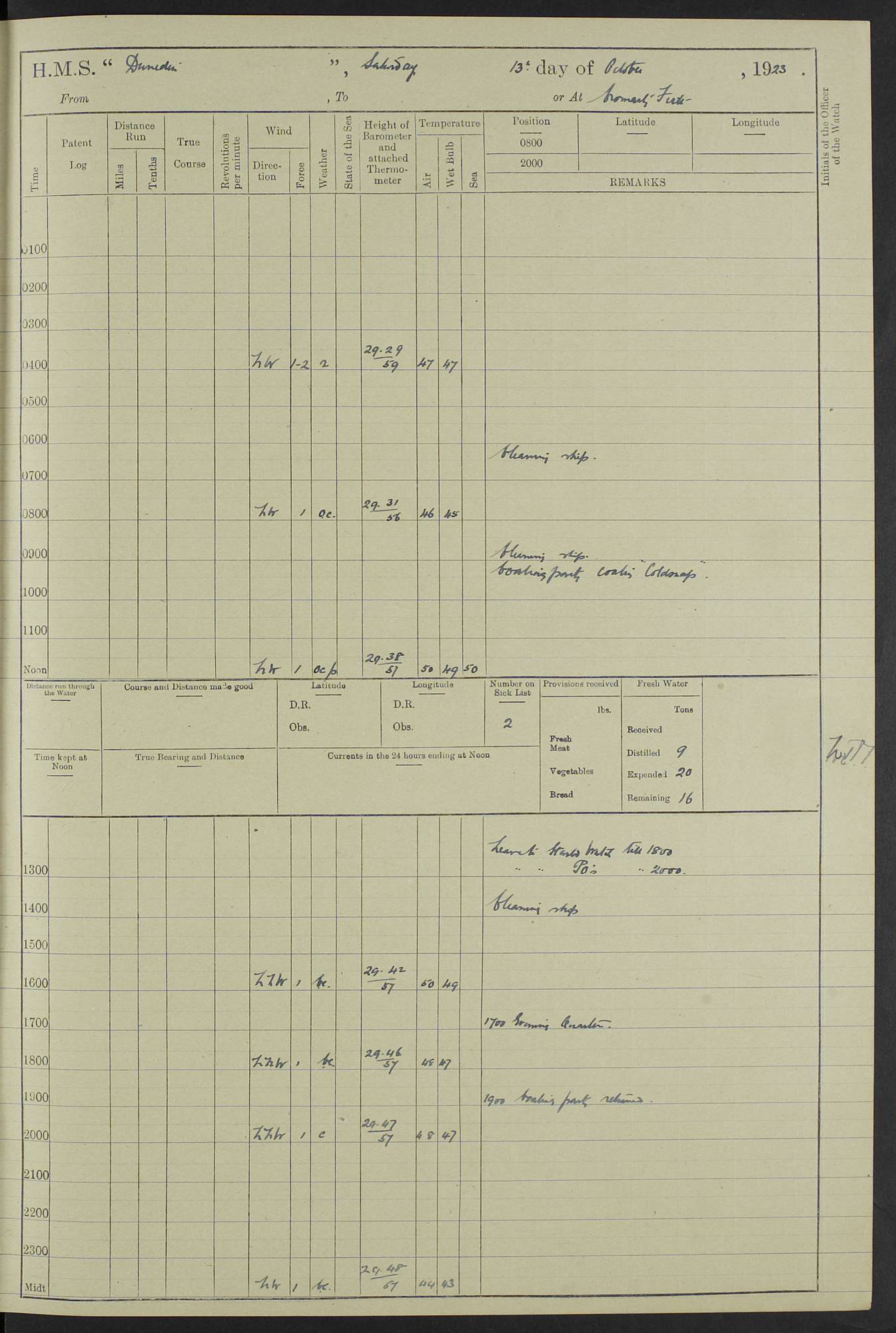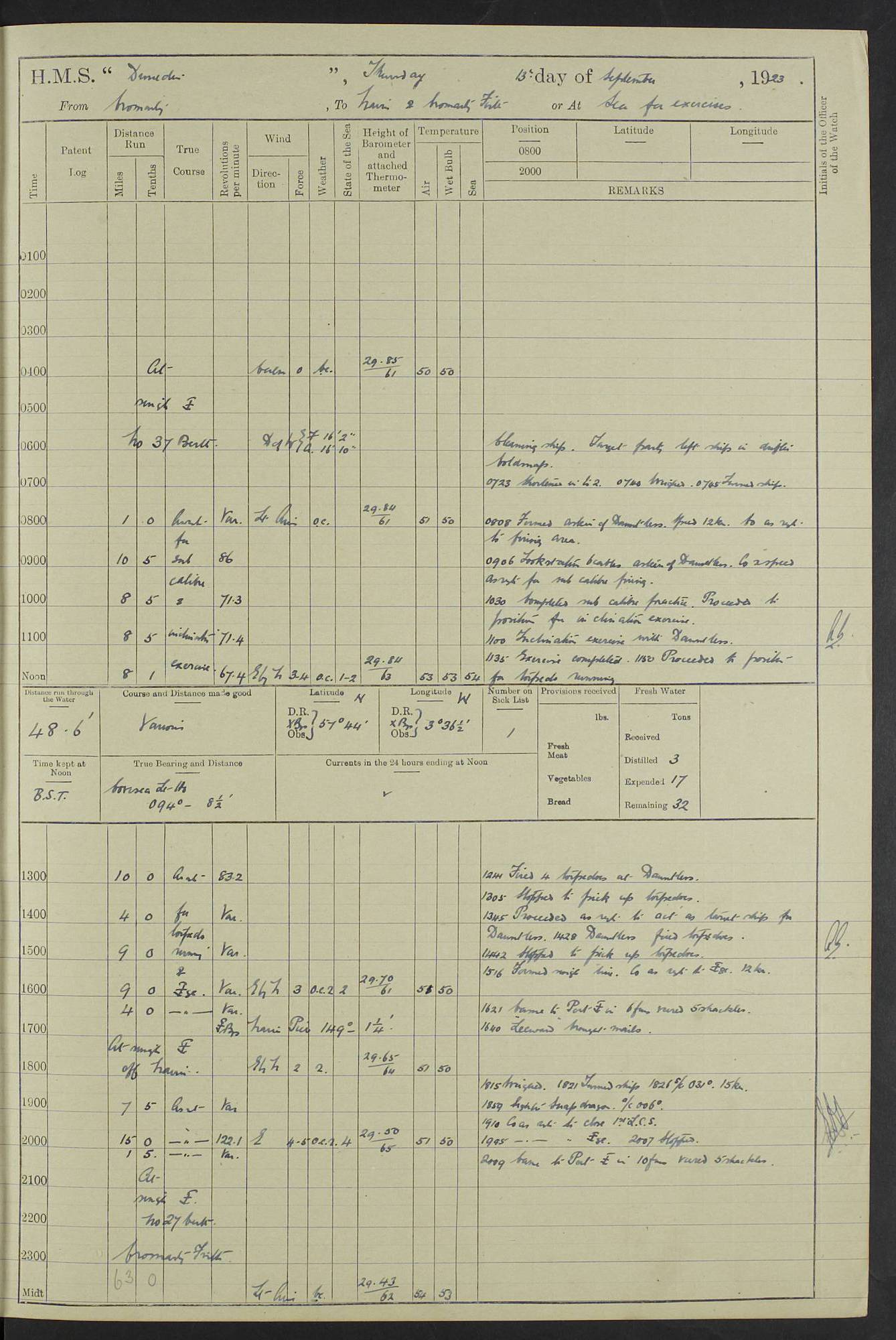 (Maps prepared using Journey Plotter, developed by Maikel. The Plots can only be approximate. They are made by joining-up positions on successive days, and sometimes positions are not given. There will therefore be occasions when the ship appears to have travelled overland) LOG BOOK – 23RD SEPTEMBER 1920 TO 13TH SEPTEMBER 1921 4caf8d9dcadfd3419703bde2: (http://oldweather.s3.amazonaws.com/ADM53-76345/ADM53-76345_0.jpg) Left front cover of Ship’s Log. 4caf8d9dcadfd3419703bde3: (http://oldweather.s3.amazonaws.com/ADM53-76345/ADM53-76345_1.jpg) Right front cover of Ship’s Log. 4caf8d97cadfd3419703bc6a: (http://oldweather.s3.amazonaws.com/ADM53-76345/ADM53-76345-002_0.jpg) 4caf8d97cadfd3419703bc6b: (http://oldweather.s3.amazonaws.com/ADM53-76345/ADM53-76345-002_1.jpg) 4caf8d97cadfd3419703bc6c: (http://oldweather.s3.amazonaws.com/ADM53-76345/ADM53-76345-003_0.jpg) 4caf8d97cadfd3419703bc6d: (http://oldweather.s3.amazonaws.com/ADM53-76345/ADM53-76345-003_1.jpg) 4caf8d97cadfd3419703bc6e: (http://oldweather.s3.amazonaws.com/ADM53-76345/ADM53-76345-004_0.jpg) Blank pages. 4caf8d97cadfd3419703bc6f: (http://oldweather.s3.amazonaws.com/ADM53-76345/ADM53-76345-004_1.jpg) S.- 321. See Articles 557, 619, 622, 924, 1025, 1026 and 1849 of the King’s Regulations, 1913. This Log is to be kept from the time the Ship is Commissioned until she is paid off; when it is to be transmitted as directed by the Admiralty Instructions. The Name and Address of the Officer to whom the acknowledgement of receipt should be sent by the Deputy Cashier in charge, Royal Victoria Yard, Deptford, is to be inserted here. Name: Commander’s Office. Address: H.M.S. Dunedin. c/o G.P.O. London. LOG of H.M.S. “Dunedin” Commanded by Captain C. Wrightson C.B.E. (till 31.3.21). Captain H.S. Monroe D.S.O. (from 31.3.21). FOR THE PERIOD Commencing: Thursday 23rd of September 1920. Ending: Tuesday 13th of September 1921. Tonnage (Displacement): 4,650 Extreme Length: 472ft 3 ins Extreme Breadth: 46 ft 0.3/8” Engines: Manufacturer: Messes R & W Hawthorn Leslie & Co Ltd. Newcastle on Tyne. I.H.P: 40.000 Forced Draught. Description: Turbine (Geared). When Fixed on Board: 1918 – 1919. Boilers: Manufacturer: Messes R & W Hawthorn Leslie & Co Ltd. Newcastle on Tyne. Description: Small tube Improved Yarrow. When made: 1918. When put in vessel: 1918. Paddle Wheels or Screw Propeller: Manufacturer: Manganese Bronze Co. Description: Solid 3 Blades Turbadium Bronze, Pitch 14 ft 3 in. General State of Repair: Satisfactory. R. Alison [?], Lieut Com (W) on paying off 30th August 1923. L. 8418/02. N.L. 15713/13. Where Built Sir W.G. Armstrong Whitworth & Co Ltd. N.L. 18227/18. Armstrong Naval Yard, High Walker, Newcastle on Tyne. Sta. 127/10. Commenced building November 1917, Launched 19 November 1918. N.L. 22782/19. Completed September 1919. 4caf8d98cadfd3419703bc70: (http://oldweather.s3.amazonaws.com/ADM53-76345/ADM53-76345-005_0.jpg) Directions (See King’s Regulations 1913, Articles 1025 and 1849). 1. King’s Regulations. 2. Figures to indicate the Force of the Wind. 3. Letters to denote the State of the Weather. 4. Scale of Fog Intensity. 5. Sea Disturbance Scale 4caf8d98cadfd3419703bc71: (http://oldweather.s3.amazonaws.com/ADM53-76345/ADM53-76345-005_1.jpg) Establishment of Ship’s Company Officers 23 Seamen 187 Boys 36 Marines 46 Engine-room Establishment 105 Other non-executive ratings 44 Total 441 ARMAMENT Position Forecastle: 6” Calibre XII on C.P. XIV mounting. Superstructure: Four 6” Calibre XII on C.P. XIV mountings. Superstructure: Two 3” QF Calibre High Angle mountings, Quarterdeck: 6” Calibre XII on C.P. XIV mountings. Torpedo Armaments Four above water 21” triple tubes. BAROMETER Mercurial or Aneroid: Mercurial. Name of Maker and number: J. Hitchins 101 A747. Height of cistern above sea: 13ft. Error of Mercurial Barometer: Nil at 30.00. Thermometers for Air Temperature. Position on Ship: On fore bridge. Whether in screen: Yes. Maker and No. Negretti & Zambra From: 7.10.19 To: Sept. 1921. Negretti & Zambra No. 10499 Negretti & Zambra No 10391 From: 7.10.19 To: Sept. 1921. Thermometer for Sea Temperature. A. Harper & Sons 7.10.19 POSITION OF STANDARD COMPASS. Manoeuvring Platform. (Fore bridge) BOATS Number of each carried: 1 x 30ft. motor boat. 2 x 32ft. cutters. 1 x 30ft gig. 2 x 27ft whalers. 2 x 16 ft dinghies. MISCELLANEOUS INFORMATION Draught of water with Bunkers full, and complete with provisions, Stores and water: Forward 16 ft 1 inch; Aft 16 ft 11 inches. Number of Tons necessary to increase draught 1 inch: 35.6. Number of Tons of Coal Carried: 16. Number of Tons of Oil Fuel carried: 1127. Quantity of Water Carried (a) For Boilers: 157 tons. (b) For Drinking: 56½ tons. LOGS FOR SEPTEMBER 1920 4caf8d98cadfd3419703bc72: (http://oldweather.s3.amazonaws.com/ADM53-76345/ADM53-76345-006_0.jpg) 23 September 1920 At Copenhagen. Lat 55.694, Long 12.603 4.00am: Signal books correct. am: Hands employed cleaning ship. 8.00am: Signal books correct. am: Sent coaling party to S.S. “Volo”. am: X & Y 6” guns crews at loader drill, remainder of hands employed as requisite. am: Coaling party returned. Noon: Signal books correct. 1.15pm: Sent coaling party to S.S. “Volo”. pm: 1 Rating joined ship from hospital. pm: Boys & training classes under instruction, remainder of hands employed as requisite. 3.00pm: U.S.S. “Gilmer” arrived. [Gilmer, U.S. Destroyer, Flush Decker, launched 18/7/19, Guns: 4 x 5”, 51 cal.,1 x 3”, 23 cal. AA, 12 x 21” TT’s in 4 triple deck mountings. Disp: 1,215 tons, SHP: 26,000 = 35 knots. Jane’s Fighting Ships 1919. Image]. 4.00pm: Signal books correct. pm: Coaling party returned. 8.00pm: Signal books correct. Midnight: Signal books correct. 4caf8d98cadfd3419703bc73: (http://oldweather.s3.amazonaws.com/ADM53-76345/ADM53-76345-006_1.jpg) 24 September 1920 At Copenhagen. Lat 55.694, Long 12.603 4.00am: Signal books correct. am: Hands employed cleaning ship. 6.15am: U.S.S. “Sh