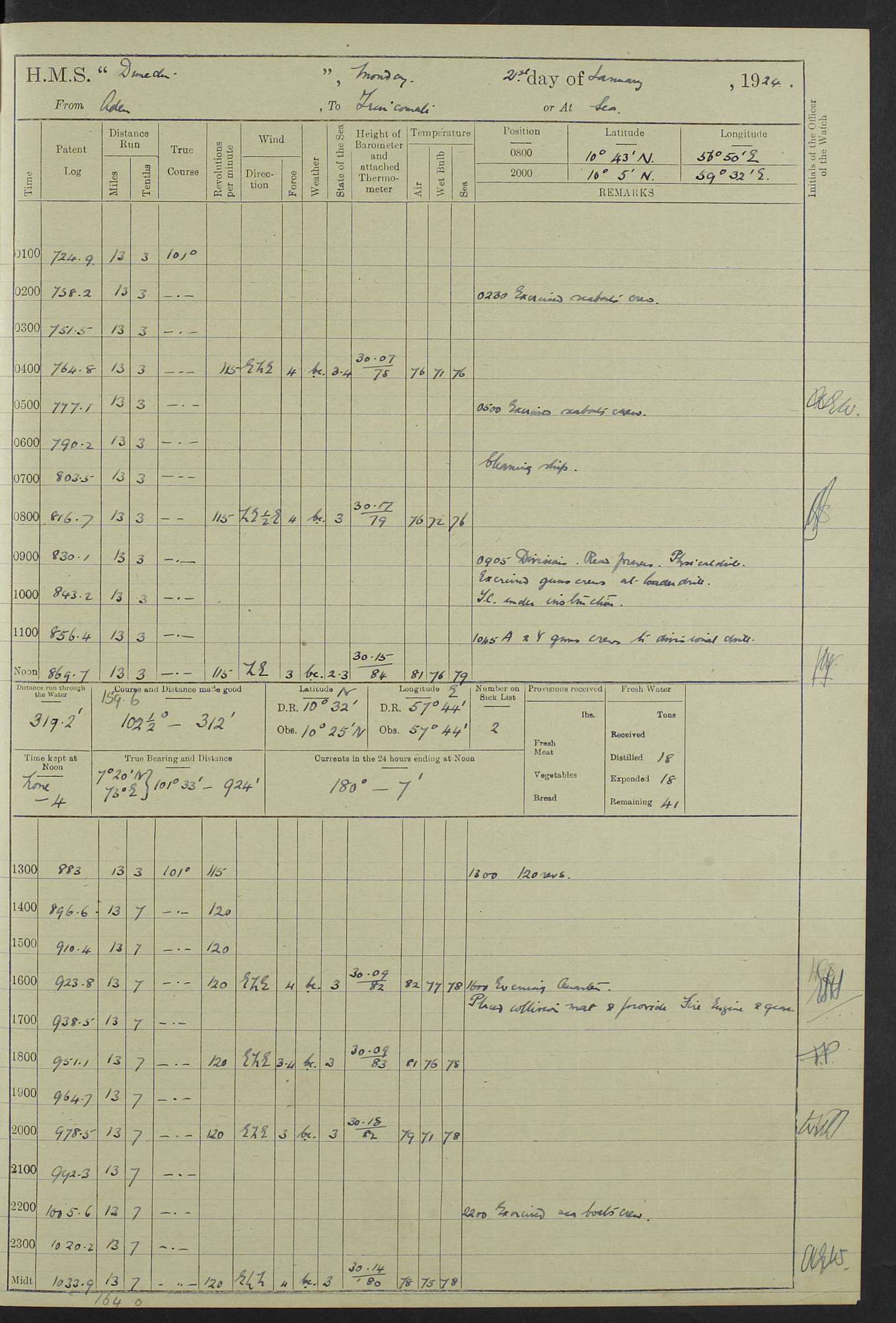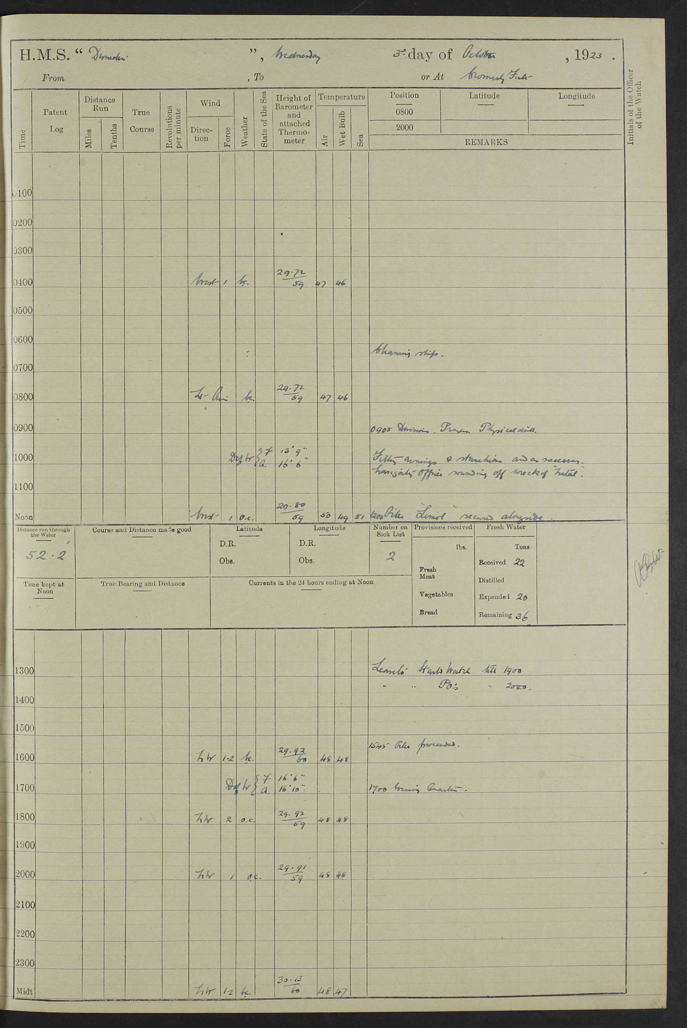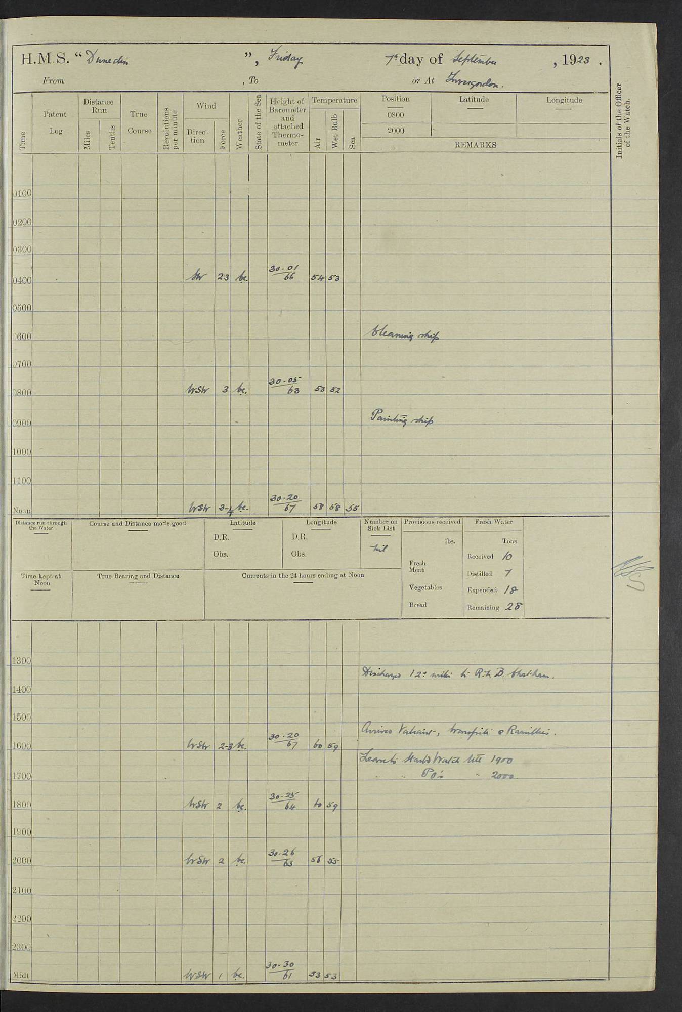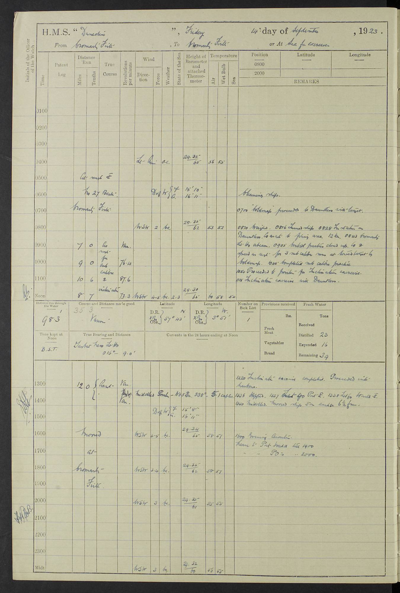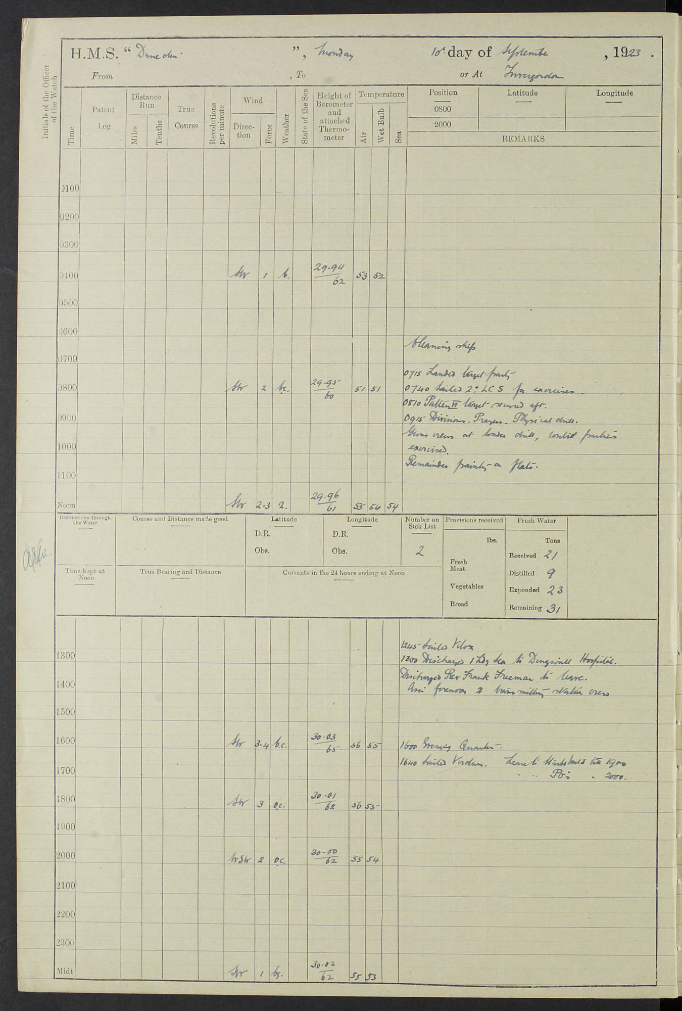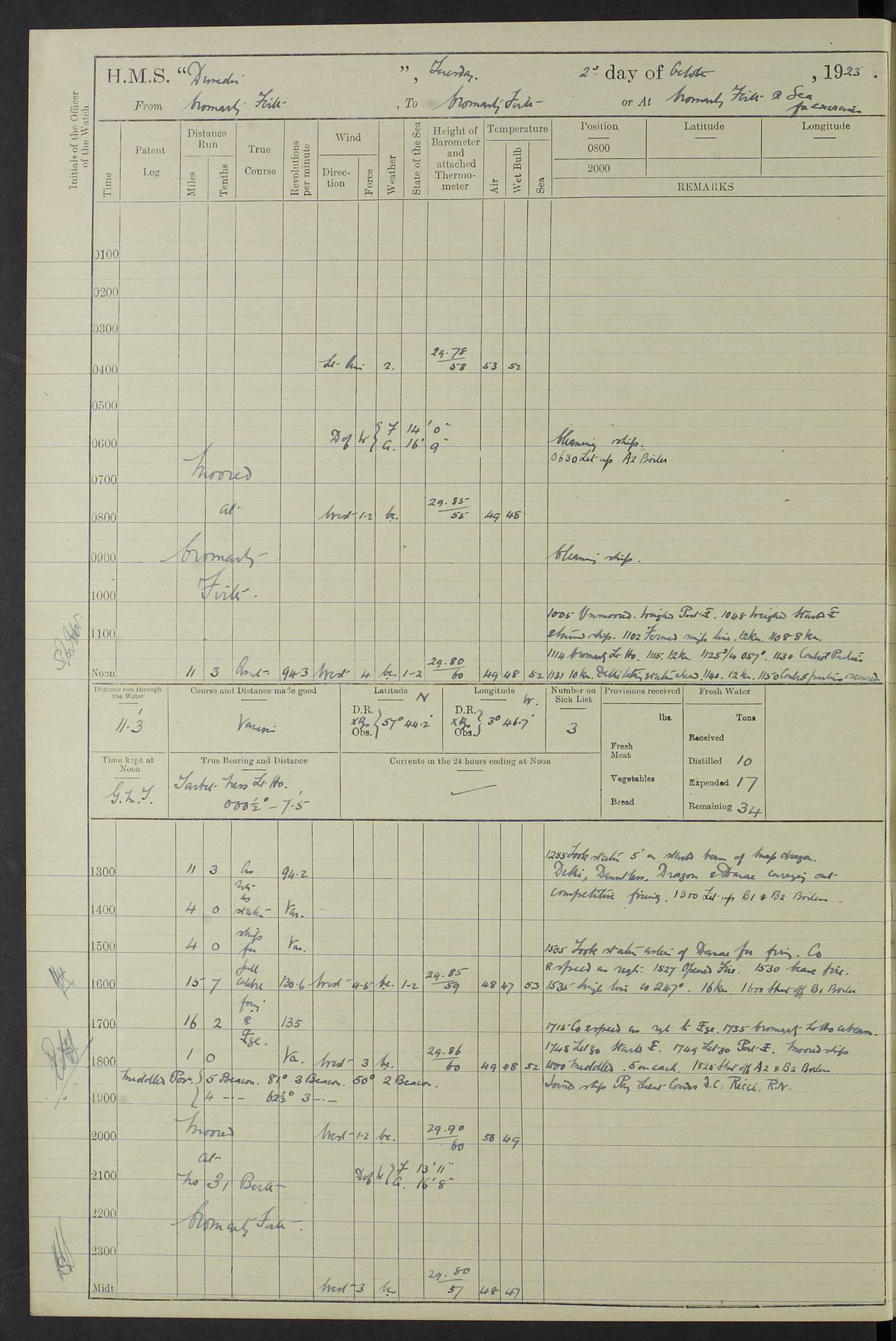(Maps prepared using Journey Plotter, developed by Maikel. The Plots can only be approximate. They are made by joining-up positions on successive days, and sometimes positions are not given. There will therefore be occasions when the ship appears to have travelled overland) LOG BOOK – 23RD SEPTEMBER 1920 TO 13TH SEPTEMBER 1921 4caf8d9dcadfd3419703bde2: (http://oldweather.s3.amazonaws.com/ADM53-76345/ADM53-76345_0.jpg) Left front cover of Ship’s Log. 4caf8d9dcadfd3419703bde3: (http://oldweather.s3.amazonaws.com/ADM53-76345/ADM53-76345_1.jpg) Right front cover of Ship’s Log. 4caf8d97cadfd3419703bc6a: (http://oldweather.s3.amazonaws.com/ADM53-76345/ADM53-76345-002_0.jpg) 4caf8d97cadfd3419703bc6b: (http://oldweather.s3.amazonaws.com/ADM53-76345/ADM53-76345-002_1.jpg) 4caf8d97cadfd3419703bc6c: (http://oldweather.s3.amazonaws.com/ADM53-76345/ADM53-76345-003_0.jpg) 4caf8d97cadfd3419703bc6d: (http://oldweather.s3.amazonaws.com/ADM53-76345/ADM53-76345-003_1.jpg) 4caf8d97cadfd3419703bc6e: (http://oldweather.s3.amazonaws.com/ADM53-76345/ADM53-76345-004_0.jpg) Blank pages. 4caf8d97cadfd3419703bc6f: (http://oldweather.s3.amazonaws.com/ADM53-76345/ADM53-76345-004_1.jpg) S.- 321. See Articles 557, 619, 622, 924, 1025, 1026 and 1849 of the King’s Regulations, 1913. This Log is to be kept from the time the Ship is Commissioned until she is paid off; when it is to be transmitted as directed by the Admiralty Instructions. The Name and Address of the Officer to whom the acknowledgement of receipt should be sent by the Deputy Cashier in charge, Royal Victoria Yard, Deptford, is to be inserted here. Name: Commander’s Office. Address: H.M.S. Dunedin. c/o G.P.O. London. LOG of H.M.S. “Dunedin” Commanded by Captain C. Wrightson C.B.E. (till 31.3.21). Captain H.S. Monroe D.S.O. (from 31.3.21). FOR THE PERIOD Commencing: Thursday 23rd of September 1920. Ending: Tuesday 13th of September 1921. Tonnage (Displacement): 4,650 Extreme Length: 472ft 3 ins Extreme Breadth: 46 ft 0.3/8” Engines: Manufacturer: Messes R & W Hawthorn Leslie & Co Ltd. Newcastle on Tyne. I.H.P: 40.000 Forced Draught. Description: Turbine (Geared). When Fixed on Board: 1918 – 1919. Boilers: Manufacturer: Messes R & W Hawthorn Leslie & Co Ltd. Newcastle on Tyne. Description: Small tube Improved Yarrow. When made: 1918. When put in vessel: 1918. Paddle Wheels or Screw Propeller: Manufacturer: Manganese Bronze Co. Description: Solid 3 Blades Turbadium Bronze, Pitch 14 ft 3 in. General State of Repair: Satisfactory. R. Alison [?], Lieut Com (W) on paying off 30th August 1923. L. 8418/02. N.L. 15713/13. Where Built Sir W.G. Armstrong Whitworth & Co Ltd. N.L. 18227/18. Armstrong Naval Yard, High Walker, Newcastle on Tyne. Sta. 127/10. Commenced building November 1917, Launched 19 November 1918. N.L. 22782/19. Completed September 1919. 4caf8d98cadfd3419703bc70: (http://oldweather.s3.amazonaws.com/ADM53-76345/ADM53-76345-005_0.jpg) Directions (See King’s Regulations 1913, Articles 1025 and 1849). 1. King’s Regulations. 2. Figures to indicate the Force of the Wind. 3. Letters to denote the State of the Weather. 4. Scale of Fog Intensity. 5. Sea Disturbance Scale 4caf8d98cadfd3419703bc71: (http://oldweather.s3.amazonaws.com/ADM53-76345/ADM53-76345-005_1.jpg) Establishment of Ship’s Company Officers 23 Seamen 187 Boys 36 Marines 46 Engine-room Establishment 105 Other non-executive ratings 44 Total 441 ARMAMENT Position Forecastle: 6” Calibre XII on C.P. XIV mounting. Superstructure: Four 6” Calibre XII on C.P. XIV mountings. Superstructure: Two 3” QF Calibre High Angle mountings, Quarterdeck: 6” Calibre XII on C.P. XIV mountings. Torpedo Armaments Four above water 21” triple tubes. BAROMETER Mercurial or Aneroid: Mercurial. Name of Maker and number: J. Hitchins 101 A747. Height of cistern above sea: 13ft. Error of Mercurial Barometer: Nil at 30.00. Thermometers for Air Temperature. Position on Ship: On fore bridge. Whether in screen: Yes. Maker and No. Negretti & Zambra From: 7.10.19 To: Sept. 1921. Negretti & Zambra No. 10499 Negretti & Zambra No 10391 From: 7.10.19 To: Sept. 1921. Thermometer for Sea Temperature. A. Harper & Sons 7.10.19 POSITION OF STANDARD COMPASS. Manoeuvring Platform. (Fore bridge) BOATS Number of each carried: 1 x 30ft. motor boat. 2 x 32ft. cutters. 1 x 30ft gig. 2 x 27ft whalers. 2 x 16 ft dinghies. MISCELLANEOUS INFORMATION Draught of water with Bunkers full, and complete with provisions, Stores and water: Forward 16 ft 1 inch; Aft 16 ft 11 inches. Number of Tons necessary to increase draught 1 inch: 35.6. Number of Tons of Coal Carried: 16. Number of Tons of Oil Fuel carried: 1127. Quantity of Water Carried (a) For Boilers: 157 tons. (b) For Drinking: 56½ tons. LOGS FOR SEPTEMBER 1920 4caf8d98cadfd3419703bc72: (http://oldweather.s3.amazonaws.com/ADM53-76345/ADM53-76345-006_0.jpg) 23 September 1920 At Copenhagen. Lat 55.694, Long 12.603 4.00am: Signal books correct. am: Hands employed cleaning ship. 8.00am: Signal books correct. am: Sent coaling party to S.S. “Volo”. am: X & Y 6” guns crews at loader drill, remainder of hands employed as requisite. am: Coaling party returned. Noon: Signal books correct. 1.15pm: Sent coaling party to S.S. “Volo”. pm: 1 Rating joined ship from hospital. pm: Boys & training classes under instruction, remainder of hands employed as requisite. 3.00pm: U.S.S. “Gilmer” arrived. [Gilmer, U.S. Destroyer, Flush Decker, launched 18/7/19, Guns: 4 x 5”, 51 cal.,1 x 3”, 23 cal. AA, 12 x 21” TT’s in 4 triple deck mountings. Disp: 1,215 tons, SHP: 26,000 = 35 knots. Jane’s Fighting Ships 1919. Image]. 4.00pm: Signal books correct. pm: Coaling party returned. 8.00pm: Signal books correct. Midnight: Signal books correct. 4caf8d98cadfd3419703bc73: (http://oldweather.s3.amazonaws.com/ADM53-76345/ADM53-76345-006_1.jpg) 24 September 1920 At Copenhagen. Lat 55.694, Long 12.603 4.00am: Signal books correct. am: Hands employed cleaning ship. 6.15am: U.S.S. “Sh