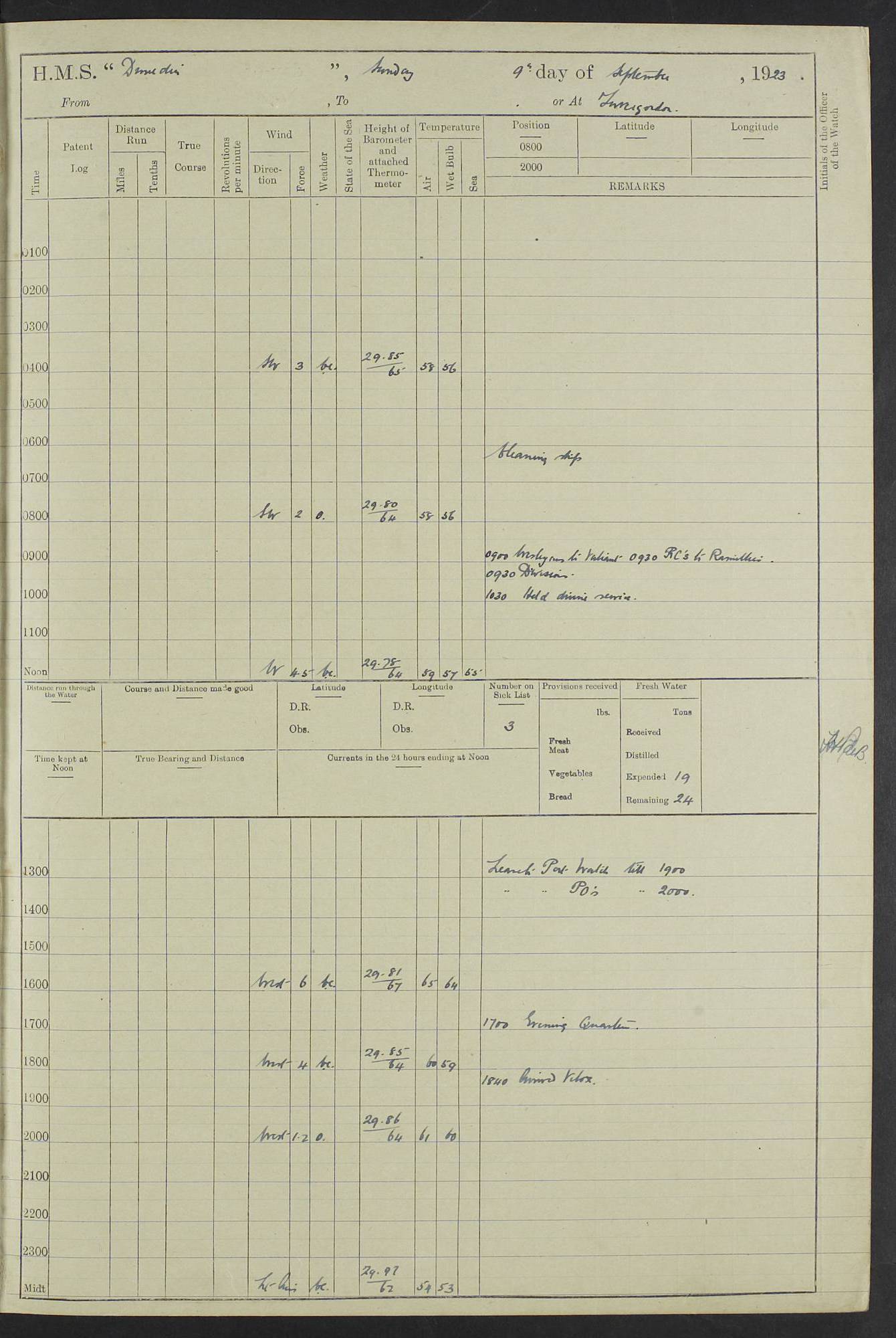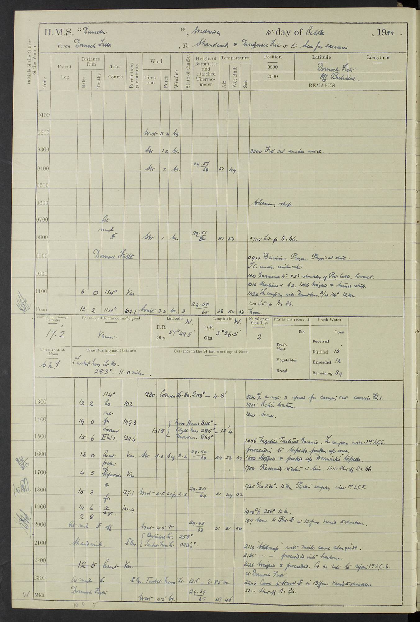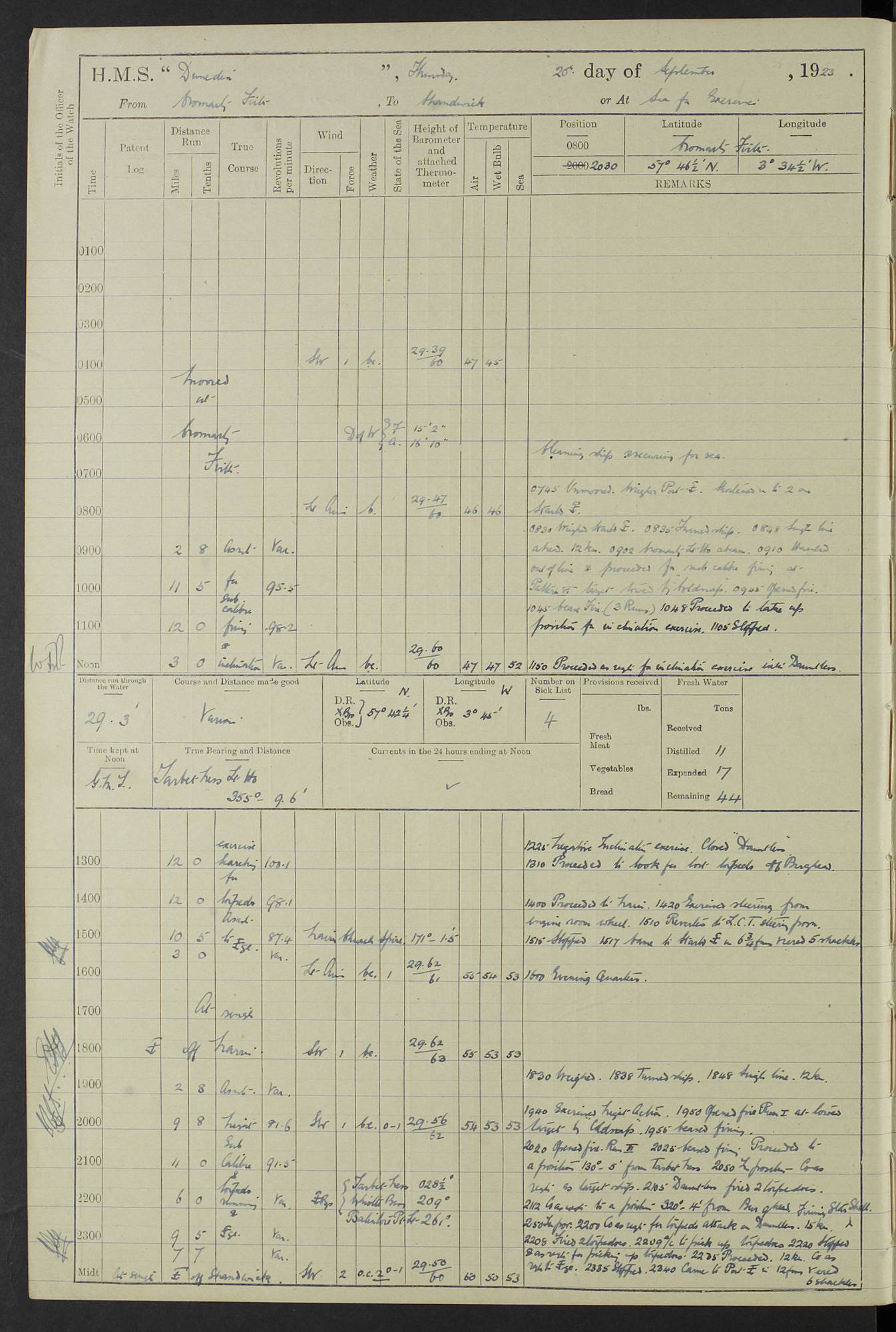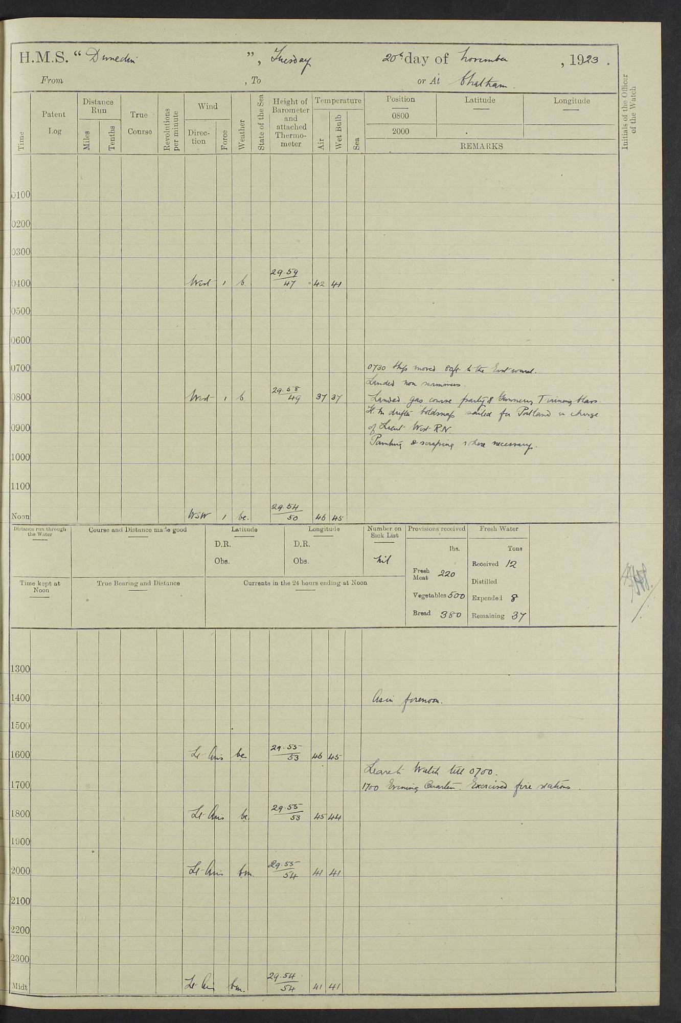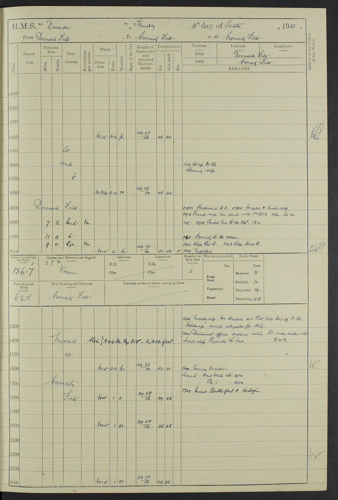 (Maps prepared using Journey Plotter, developed by Maikel. The Plots can only be approximate. They are made by joining-up positions on successive days, and sometimes positions are not given. There will therefore be occasions when the ship appears to have travelled overland) LOG BOOK – 23RD SEPTEMBER 1920 TO 13TH SEPTEMBER 1921 4caf8d9dcadfd3419703bde2: (http://oldweather.s3.amazonaws.com/ADM53-76345/ADM53-76345_0.jpg) Left front cover of Ship’s Log. 4caf8d9dcadfd3419703bde3: (http://oldweather.s3.amazonaws.com/ADM53-76345/ADM53-76345_1.jpg) Right front cover of Ship’s Log. 4caf8d97cadfd3419703bc6a: (http://oldweather.s3.amazonaws.com/ADM53-76345/ADM53-76345-002_0.jpg) 4caf8d97cadfd3419703bc6b: (http://oldweather.s3.amazonaws.com/ADM53-76345/ADM53-76345-002_1.jpg) 4caf8d97cadfd3419703bc6c: (http://oldweather.s3.amazonaws.com/ADM53-76345/ADM53-76345-003_0.jpg) 4caf8d97cadfd3419703bc6d: (http://oldweather.s3.amazonaws.com/ADM53-76345/ADM53-76345-003_1.jpg) 4caf8d97cadfd3419703bc6e: (http://oldweather.s3.amazonaws.com/ADM53-76345/ADM53-76345-004_0.jpg) Blank pages. 4caf8d97cadfd3419703bc6f: (http://oldweather.s3.amazonaws.com/ADM53-76345/ADM53-76345-004_1.jpg) S.- 321. See Articles 557, 619, 622, 924, 1025, 1026 and 1849 of the King’s Regulations, 1913. This Log is to be kept from the time the Ship is Commissioned until she is paid off; when it is to be transmitted as directed by the Admiralty Instructions. The Name and Address of the Officer to whom the acknowledgement of receipt should be sent by the Deputy Cashier in charge, Royal Victoria Yard, Deptford, is to be inserted here. Name: Commander’s Office. Address: H.M.S. Dunedin. c/o G.P.O. London. LOG of H.M.S. “Dunedin” Commanded by Captain C. Wrightson C.B.E. (till 31.3.21). Captain H.S. Monroe D.S.O. (from 31.3.21). FOR THE PERIOD Commencing: Thursday 23rd of September 1920. Ending: Tuesday 13th of September 1921. Tonnage (Displacement): 4,650 Extreme Length: 472ft 3 ins Extreme Breadth: 46 ft 0.3/8” Engines: Manufacturer: Messes R & W Hawthorn Leslie & Co Ltd. Newcastle on Tyne. I.H.P: 40.000 Forced Draught. Description: Turbine (Geared). When Fixed on Board: 1918 – 1919. Boilers: Manufacturer: Messes R & W Hawthorn Leslie & Co Ltd. Newcastle on Tyne. Description: Small tube Improved Yarrow. When made: 1918. When put in vessel: 1918. Paddle Wheels or Screw Propeller: Manufacturer: Manganese Bronze Co. Description: Solid 3 Blades Turbadium Bronze, Pitch 14 ft 3 in. General State of Repair: Satisfactory. R. Alison [?], Lieut Com (W) on paying off 30th August 1923. L. 8418/02. N.L. 15713/13. Where Built Sir W.G. Armstrong Whitworth & Co Ltd. N.L. 18227/18. Armstrong Naval Yard, High Walker, Newcastle on Tyne. Sta. 127/10. Commenced building November 1917, Launched 19 November 1918. N.L. 22782/19. Completed September 1919. 4caf8d98cadfd3419703bc70: (http://oldweather.s3.amazonaws.com/ADM53-76345/ADM53-76345-005_0.jpg) Directions (See King’s Regulations 1913, Articles 1025 and 1849). 1. King’s Regulations. 2. Figures to indicate the Force of the Wind. 3. Letters to denote the State of the Weather. 4. Scale of Fog Intensity. 5. Sea Disturbance Scale 4caf8d98cadfd3419703bc71: (http://oldweather.s3.amazonaws.com/ADM53-76345/ADM53-76345-005_1.jpg) Establishment of Ship’s Company Officers 23 Seamen 187 Boys 36 Marines 46 Engine-room Establishment 105 Other non-executive ratings 44 Total 441 ARMAMENT Position Forecastle: 6” Calibre XII on C.P. XIV mounting. Superstructure: Four 6” Calibre XII on C.P. XIV mountings. Superstructure: Two 3” QF Calibre High Angle mountings, Quarterdeck: 6” Calibre XII on C.P. XIV mountings. Torpedo Armaments Four above water 21” triple tubes. BAROMETER Mercurial or Aneroid: Mercurial. Name of Maker and number: J. Hitchins 101 A747. Height of cistern above sea: 13ft. Error of Mercurial Barometer: Nil at 30.00. Thermometers for Air Temperature. Position on Ship: On fore bridge. Whether in screen: Yes. Maker and No. Negretti & Zambra From: 7.10.19 To: Sept. 1921. Negretti & Zambra No. 10499 Negretti & Zambra No 10391 From: 7.10.19 To: Sept. 1921. Thermometer for Sea Temperature. A. Harper & Sons 7.10.19 POSITION OF STANDARD COMPASS. Manoeuvring Platform. (Fore bridge) BOATS Number of each carried: 1 x 30ft. motor boat. 2 x 32ft. cutters. 1 x 30ft gig. 2 x 27ft whalers. 2 x 16 ft dinghies. MISCELLANEOUS INFORMATION Draught of water with Bunkers full, and complete with provisions, Stores and water: Forward 16 ft 1 inch; Aft 16 ft 11 inches. Number of Tons necessary to increase draught 1 inch: 35.6. Number of Tons of Coal Carried: 16. Number of Tons of Oil Fuel carried: 1127. Quantity of Water Carried (a) For Boilers: 157 tons. (b) For Drinking: 56½ tons. LOGS FOR SEPTEMBER 1920 4caf8d98cadfd3419703bc72: (http://oldweather.s3.amazonaws.com/ADM53-76345/ADM53-76345-006_0.jpg) 23 September 1920 At Copenhagen. Lat 55.694, Long 12.603 4.00am: Signal books correct. am: Hands employed cleaning ship. 8.00am: Signal books correct. am: Sent coaling party to S.S. “Volo”. am: X & Y 6” guns crews at loader drill, remainder of hands employed as requisite. am: Coaling party returned. Noon: Signal books correct. 1.15pm: Sent coaling party to S.S. “Volo”. pm: 1 Rating joined ship from hospital. pm: Boys & training classes under instruction, remainder of hands employed as requisite. 3.00pm: U.S.S. “Gilmer” arrived. [Gilmer, U.S. Destroyer, Flush Decker, launched 18/7/19, Guns: 4 x 5”, 51 cal.,1 x 3”, 23 cal. AA, 12 x 21” TT’s in 4 triple deck mountings. Disp: 1,215 tons, SHP: 26,000 = 35 knots. Jane’s Fighting Ships 1919. Image]. 4.00pm: Signal books correct. pm: Coaling party returned. 8.00pm: Signal books correct. Midnight: Signal books correct. 4caf8d98cadfd3419703bc73: (http://oldweather.s3.amazonaws.com/ADM53-76345/ADM53-76345-006_1.jpg) 24 September 1920 At Copenhagen. Lat 55.694, Long 12.603 4.00am: Signal books correct. am: Hands employed cleaning ship. 6.15am: U.S.S. “Sh