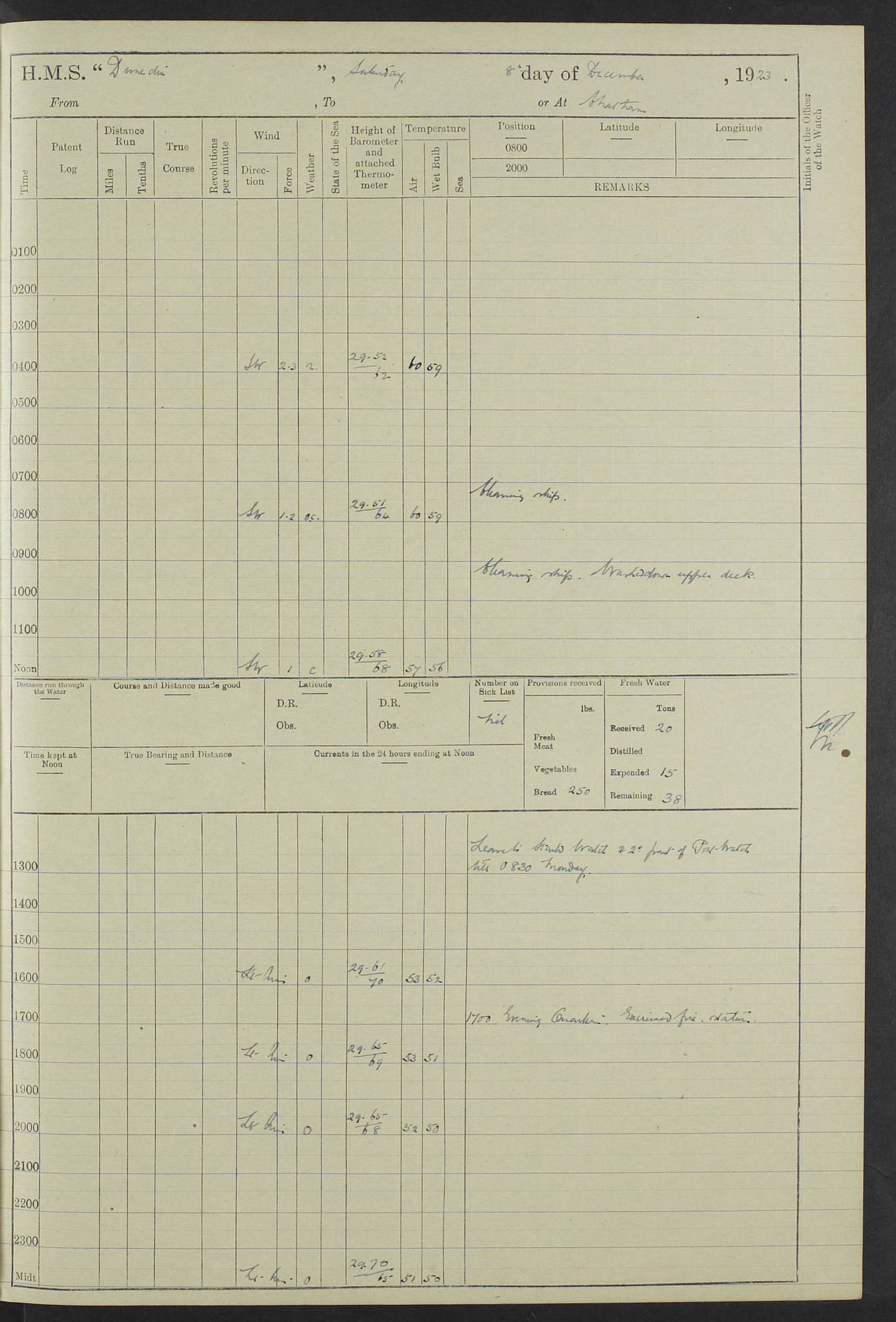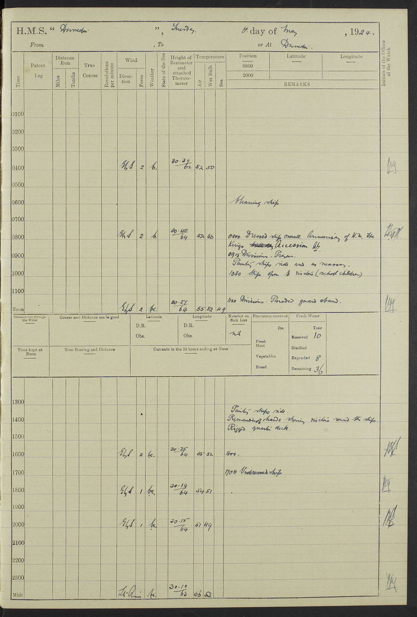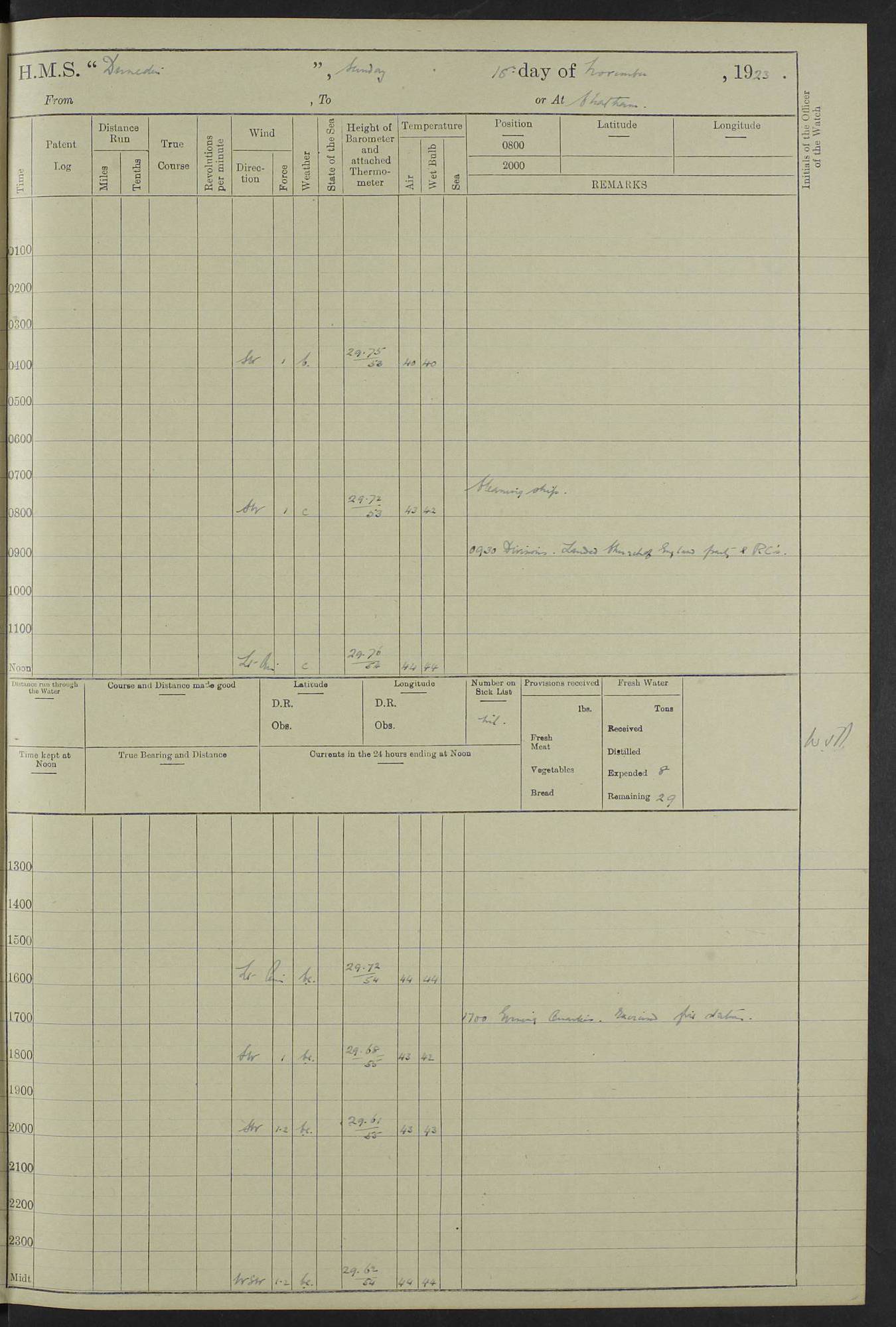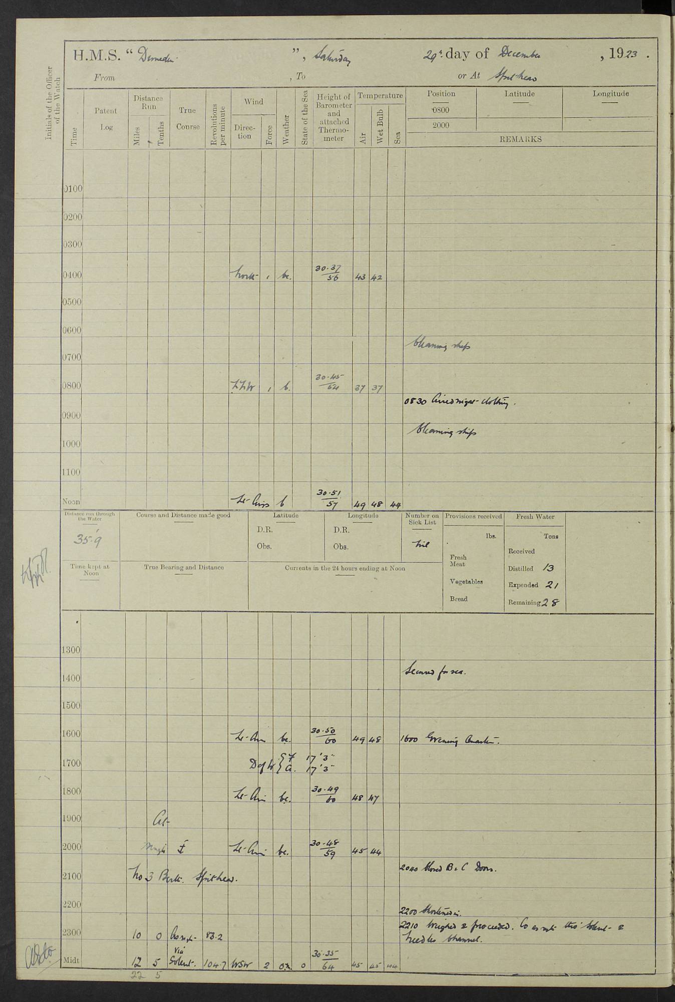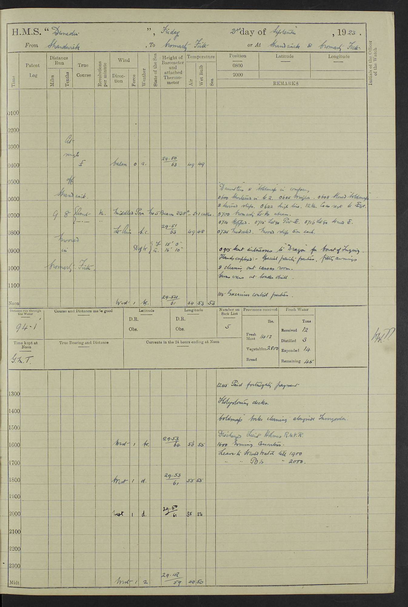 (Maps prepared using Journey Plotter, developed by Maikel. The Plots can only be approximate. They are made by joining-up positions on successive days, and sometimes positions are not given. There will therefore be occasions when the ship appears to have travelled overland) LOG BOOK – 23RD SEPTEMBER 1920 TO 13TH SEPTEMBER 1921 4caf8d9dcadfd3419703bde2: (http://oldweather.s3.amazonaws.com/ADM53-76345/ADM53-76345_0.jpg) Left front cover of Ship’s Log. 4caf8d9dcadfd3419703bde3: (http://oldweather.s3.amazonaws.com/ADM53-76345/ADM53-76345_1.jpg) Right front cover of Ship’s Log. 4caf8d97cadfd3419703bc6a: (http://oldweather.s3.amazonaws.com/ADM53-76345/ADM53-76345-002_0.jpg) 4caf8d97cadfd3419703bc6b: (http://oldweather.s3.amazonaws.com/ADM53-76345/ADM53-76345-002_1.jpg) 4caf8d97cadfd3419703bc6c: (http://oldweather.s3.amazonaws.com/ADM53-76345/ADM53-76345-003_0.jpg) 4caf8d97cadfd3419703bc6d: (http://oldweather.s3.amazonaws.com/ADM53-76345/ADM53-76345-003_1.jpg) 4caf8d97cadfd3419703bc6e: (http://oldweather.s3.amazonaws.com/ADM53-76345/ADM53-76345-004_0.jpg) Blank pages. 4caf8d97cadfd3419703bc6f: (http://oldweather.s3.amazonaws.com/ADM53-76345/ADM53-76345-004_1.jpg) S.- 321. See Articles 557, 619, 622, 924, 1025, 1026 and 1849 of the King’s Regulations, 1913. This Log is to be kept from the time the Ship is Commissioned until she is paid off; when it is to be transmitted as directed by the Admiralty Instructions. The Name and Address of the Officer to whom the acknowledgement of receipt should be sent by the Deputy Cashier in charge, Royal Victoria Yard, Deptford, is to be inserted here. Name: Commander’s Office. Address: H.M.S. Dunedin. c/o G.P.O. London. LOG of H.M.S. “Dunedin” Commanded by Captain C. Wrightson C.B.E. (till 31.3.21). Captain H.S. Monroe D.S.O. (from 31.3.21). FOR THE PERIOD Commencing: Thursday 23rd of September 1920. Ending: Tuesday 13th of September 1921. Tonnage (Displacement): 4,650 Extreme Length: 472ft 3 ins Extreme Breadth: 46 ft 0.3/8” Engines: Manufacturer: Messes R & W Hawthorn Leslie & Co Ltd. Newcastle on Tyne. I.H.P: 40.000 Forced Draught. Description: Turbine (Geared). When Fixed on Board: 1918 – 1919. Boilers: Manufacturer: Messes R & W Hawthorn Leslie & Co Ltd. Newcastle on Tyne. Description: Small tube Improved Yarrow. When made: 1918. When put in vessel: 1918. Paddle Wheels or Screw Propeller: Manufacturer: Manganese Bronze Co. Description: Solid 3 Blades Turbadium Bronze, Pitch 14 ft 3 in. General State of Repair: Satisfactory. R. Alison [?], Lieut Com (W) on paying off 30th August 1923. L. 8418/02. N.L. 15713/13. Where Built Sir W.G. Armstrong Whitworth & Co Ltd. N.L. 18227/18. Armstrong Naval Yard, High Walker, Newcastle on Tyne. Sta. 127/10. Commenced building November 1917, Launched 19 November 1918. N.L. 22782/19. Completed September 1919. 4caf8d98cadfd3419703bc70: (http://oldweather.s3.amazonaws.com/ADM53-76345/ADM53-76345-005_0.jpg) Directions (See King’s Regulations 1913, Articles 1025 and 1849). 1. King’s Regulations. 2. Figures to indicate the Force of the Wind. 3. Letters to denote the State of the Weather. 4. Scale of Fog Intensity. 5. Sea Disturbance Scale 4caf8d98cadfd3419703bc71: (http://oldweather.s3.amazonaws.com/ADM53-76345/ADM53-76345-005_1.jpg) Establishment of Ship’s Company Officers 23 Seamen 187 Boys 36 Marines 46 Engine-room Establishment 105 Other non-executive ratings 44 Total 441 ARMAMENT Position Forecastle: 6” Calibre XII on C.P. XIV mounting. Superstructure: Four 6” Calibre XII on C.P. XIV mountings. Superstructure: Two 3” QF Calibre High Angle mountings, Quarterdeck: 6” Calibre XII on C.P. XIV mountings. Torpedo Armaments Four above water 21” triple tubes. BAROMETER Mercurial or Aneroid: Mercurial. Name of Maker and number: J. Hitchins 101 A747. Height of cistern above sea: 13ft. Error of Mercurial Barometer: Nil at 30.00. Thermometers for Air Temperature. Position on Ship: On fore bridge. Whether in screen: Yes. Maker and No. Negretti & Zambra From: 7.10.19 To: Sept. 1921. Negretti & Zambra No. 10499 Negretti & Zambra No 10391 From: 7.10.19 To: Sept. 1921. Thermometer for Sea Temperature. A. Harper & Sons 7.10.19 POSITION OF STANDARD COMPASS. Manoeuvring Platform. (Fore bridge) BOATS Number of each carried: 1 x 30ft. motor boat. 2 x 32ft. cutters. 1 x 30ft gig. 2 x 27ft whalers. 2 x 16 ft dinghies. MISCELLANEOUS INFORMATION Draught of water with Bunkers full, and complete with provisions, Stores and water: Forward 16 ft 1 inch; Aft 16 ft 11 inches. Number of Tons necessary to increase draught 1 inch: 35.6. Number of Tons of Coal Carried: 16. Number of Tons of Oil Fuel carried: 1127. Quantity of Water Carried (a) For Boilers: 157 tons. (b) For Drinking: 56½ tons. LOGS FOR SEPTEMBER 1920 4caf8d98cadfd3419703bc72: (http://oldweather.s3.amazonaws.com/ADM53-76345/ADM53-76345-006_0.jpg) 23 September 1920 At Copenhagen. Lat 55.694, Long 12.603 4.00am: Signal books correct. am: Hands employed cleaning ship. 8.00am: Signal books correct. am: Sent coaling party to S.S. “Volo”. am: X & Y 6” guns crews at loader drill, remainder of hands employed as requisite. am: Coaling party returned. Noon: Signal books correct. 1.15pm: Sent coaling party to S.S. “Volo”. pm: 1 Rating joined ship from hospital. pm: Boys & training classes under instruction, remainder of hands employed as requisite. 3.00pm: U.S.S. “Gilmer” arrived. [Gilmer, U.S. Destroyer, Flush Decker, launched 18/7/19, Guns: 4 x 5”, 51 cal.,1 x 3”, 23 cal. AA, 12 x 21” TT’s in 4 triple deck mountings. Disp: 1,215 tons, SHP: 26,000 = 35 knots. Jane’s Fighting Ships 1919. Image]. 4.00pm: Signal books correct. pm: Coaling party returned. 8.00pm: Signal books correct. Midnight: Signal books correct. 4caf8d98cadfd3419703bc73: (http://oldweather.s3.amazonaws.com/ADM53-76345/ADM53-76345-006_1.jpg) 24 September 1920 At Copenhagen. Lat 55.694, Long 12.603 4.00am: Signal books correct. am: Hands employed cleaning ship. 6.15am: U.S.S. “Sh