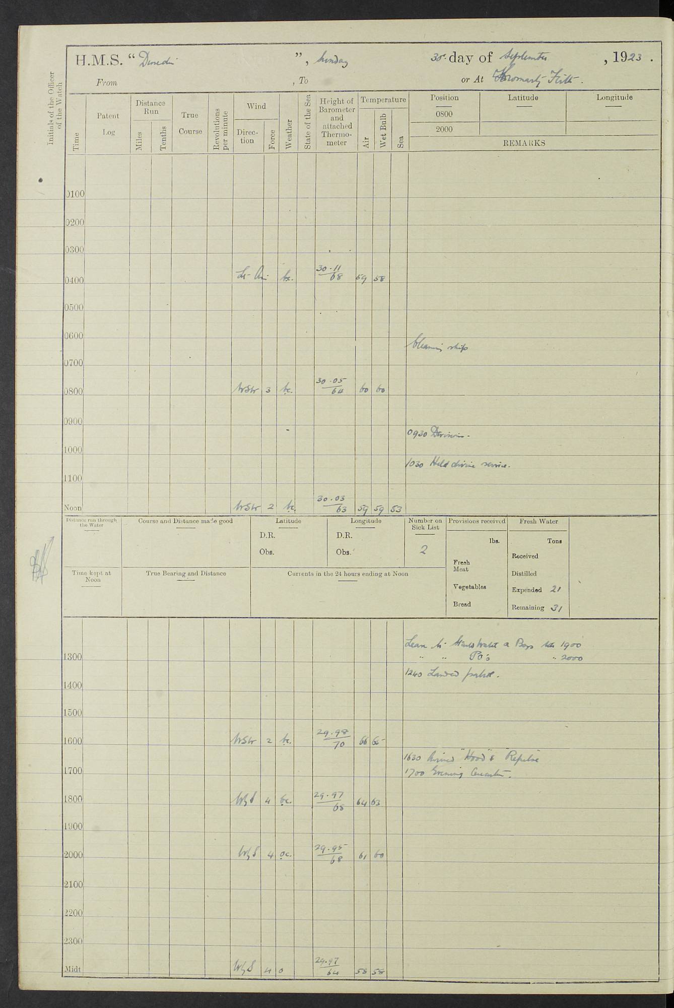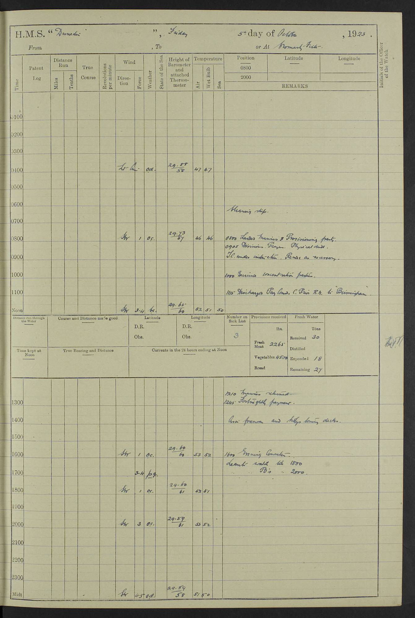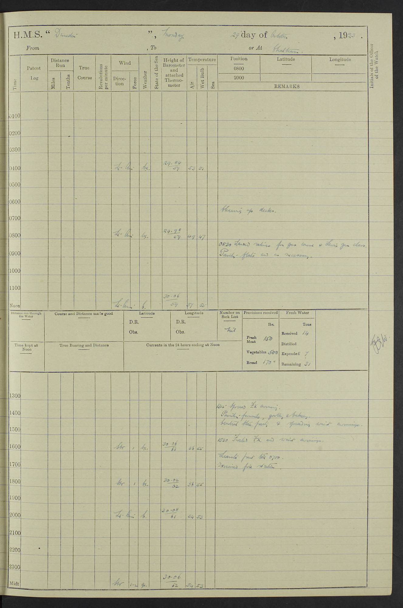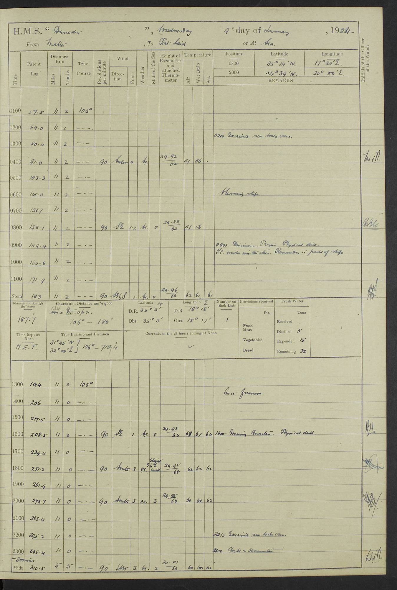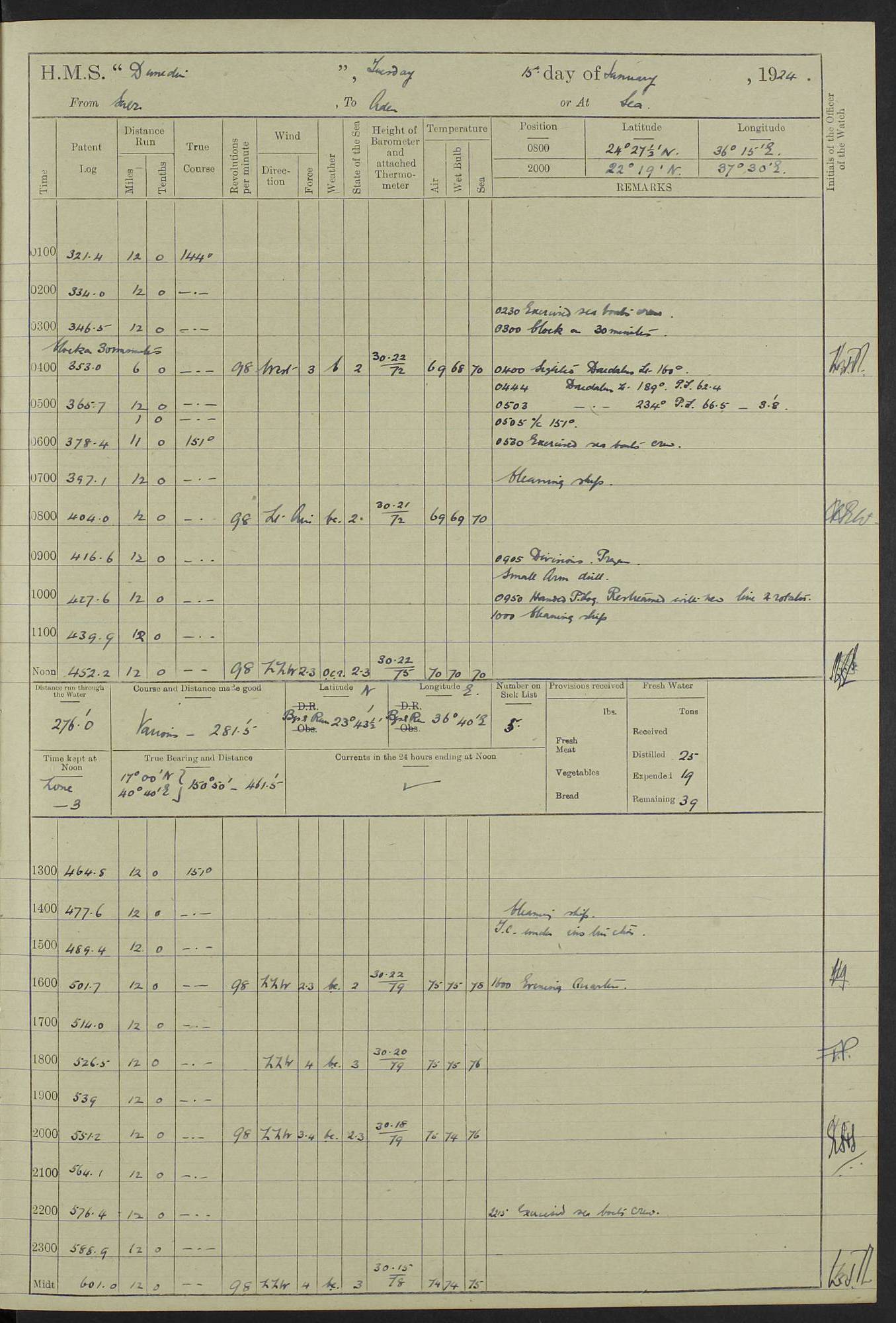 (Maps prepared using Journey Plotter, developed by Maikel. The Plots can only be approximate. They are made by joining-up positions on successive days, and sometimes positions are not given. There will therefore be occasions when the ship appears to have travelled overland) LOG BOOK – 23RD SEPTEMBER 1920 TO 13TH SEPTEMBER 1921 4caf8d9dcadfd3419703bde2: (http://oldweather.s3.amazonaws.com/ADM53-76345/ADM53-76345_0.jpg) Left front cover of Ship’s Log. 4caf8d9dcadfd3419703bde3: (http://oldweather.s3.amazonaws.com/ADM53-76345/ADM53-76345_1.jpg) Right front cover of Ship’s Log. 4caf8d97cadfd3419703bc6a: (http://oldweather.s3.amazonaws.com/ADM53-76345/ADM53-76345-002_0.jpg) 4caf8d97cadfd3419703bc6b: (http://oldweather.s3.amazonaws.com/ADM53-76345/ADM53-76345-002_1.jpg) 4caf8d97cadfd3419703bc6c: (http://oldweather.s3.amazonaws.com/ADM53-76345/ADM53-76345-003_0.jpg) 4caf8d97cadfd3419703bc6d: (http://oldweather.s3.amazonaws.com/ADM53-76345/ADM53-76345-003_1.jpg) 4caf8d97cadfd3419703bc6e: (http://oldweather.s3.amazonaws.com/ADM53-76345/ADM53-76345-004_0.jpg) Blank pages. 4caf8d97cadfd3419703bc6f: (http://oldweather.s3.amazonaws.com/ADM53-76345/ADM53-76345-004_1.jpg) S.- 321. See Articles 557, 619, 622, 924, 1025, 1026 and 1849 of the King’s Regulations, 1913. This Log is to be kept from the time the Ship is Commissioned until she is paid off; when it is to be transmitted as directed by the Admiralty Instructions. The Name and Address of the Officer to whom the acknowledgement of receipt should be sent by the Deputy Cashier in charge, Royal Victoria Yard, Deptford, is to be inserted here. Name: Commander’s Office. Address: H.M.S. Dunedin. c/o G.P.O. London. LOG of H.M.S. “Dunedin” Commanded by Captain C. Wrightson C.B.E. (till 31.3.21). Captain H.S. Monroe D.S.O. (from 31.3.21). FOR THE PERIOD Commencing: Thursday 23rd of September 1920. Ending: Tuesday 13th of September 1921. Tonnage (Displacement): 4,650 Extreme Length: 472ft 3 ins Extreme Breadth: 46 ft 0.3/8” Engines: Manufacturer: Messes R & W Hawthorn Leslie & Co Ltd. Newcastle on Tyne. I.H.P: 40.000 Forced Draught. Description: Turbine (Geared). When Fixed on Board: 1918 – 1919. Boilers: Manufacturer: Messes R & W Hawthorn Leslie & Co Ltd. Newcastle on Tyne. Description: Small tube Improved Yarrow. When made: 1918. When put in vessel: 1918. Paddle Wheels or Screw Propeller: Manufacturer: Manganese Bronze Co. Description: Solid 3 Blades Turbadium Bronze, Pitch 14 ft 3 in. General State of Repair: Satisfactory. R. Alison [?], Lieut Com (W) on paying off 30th August 1923. L. 8418/02. N.L. 15713/13. Where Built Sir W.G. Armstrong Whitworth & Co Ltd. N.L. 18227/18. Armstrong Naval Yard, High Walker, Newcastle on Tyne. Sta. 127/10. Commenced building November 1917, Launched 19 November 1918. N.L. 22782/19. Completed September 1919. 4caf8d98cadfd3419703bc70: (http://oldweather.s3.amazonaws.com/ADM53-76345/ADM53-76345-005_0.jpg) Directions (See King’s Regulations 1913, Articles 1025 and 1849). 1. King’s Regulations. 2. Figures to indicate the Force of the Wind. 3. Letters to denote the State of the Weather. 4. Scale of Fog Intensity. 5. Sea Disturbance Scale 4caf8d98cadfd3419703bc71: (http://oldweather.s3.amazonaws.com/ADM53-76345/ADM53-76345-005_1.jpg) Establishment of Ship’s Company Officers 23 Seamen 187 Boys 36 Marines 46 Engine-room Establishment 105 Other non-executive ratings 44 Total 441 ARMAMENT Position Forecastle: 6” Calibre XII on C.P. XIV mounting. Superstructure: Four 6” Calibre XII on C.P. XIV mountings. Superstructure: Two 3” QF Calibre High Angle mountings, Quarterdeck: 6” Calibre XII on C.P. XIV mountings. Torpedo Armaments Four above water 21” triple tubes. BAROMETER Mercurial or Aneroid: Mercurial. Name of Maker and number: J. Hitchins 101 A747. Height of cistern above sea: 13ft. Error of Mercurial Barometer: Nil at 30.00. Thermometers for Air Temperature. Position on Ship: On fore bridge. Whether in screen: Yes. Maker and No. Negretti & Zambra From: 7.10.19 To: Sept. 1921. Negretti & Zambra No. 10499 Negretti & Zambra No 10391 From: 7.10.19 To: Sept. 1921. Thermometer for Sea Temperature. A. Harper & Sons 7.10.19 POSITION OF STANDARD COMPASS. Manoeuvring Platform. (Fore bridge) BOATS Number of each carried: 1 x 30ft. motor boat. 2 x 32ft. cutters. 1 x 30ft gig. 2 x 27ft whalers. 2 x 16 ft dinghies. MISCELLANEOUS INFORMATION Draught of water with Bunkers full, and complete with provisions, Stores and water: Forward 16 ft 1 inch; Aft 16 ft 11 inches. Number of Tons necessary to increase draught 1 inch: 35.6. Number of Tons of Coal Carried: 16. Number of Tons of Oil Fuel carried: 1127. Quantity of Water Carried (a) For Boilers: 157 tons. (b) For Drinking: 56½ tons. LOGS FOR SEPTEMBER 1920 4caf8d98cadfd3419703bc72: (http://oldweather.s3.amazonaws.com/ADM53-76345/ADM53-76345-006_0.jpg) 23 September 1920 At Copenhagen. Lat 55.694, Long 12.603 4.00am: Signal books correct. am: Hands employed cleaning ship. 8.00am: Signal books correct. am: Sent coaling party to S.S. “Volo”. am: X & Y 6” guns crews at loader drill, remainder of hands employed as requisite. am: Coaling party returned. Noon: Signal books correct. 1.15pm: Sent coaling party to S.S. “Volo”. pm: 1 Rating joined ship from hospital. pm: Boys & training classes under instruction, remainder of hands employed as requisite. 3.00pm: U.S.S. “Gilmer” arrived. [Gilmer, U.S. Destroyer, Flush Decker, launched 18/7/19, Guns: 4 x 5”, 51 cal.,1 x 3”, 23 cal. AA, 12 x 21” TT’s in 4 triple deck mountings. Disp: 1,215 tons, SHP: 26,000 = 35 knots. Jane’s Fighting Ships 1919. Image]. 4.00pm: Signal books correct. pm: Coaling party returned. 8.00pm: Signal books correct. Midnight: Signal books correct. 4caf8d98cadfd3419703bc73: (http://oldweather.s3.amazonaws.com/ADM53-76345/ADM53-76345-006_1.jpg) 24 September 1920 At Copenhagen. Lat 55.694, Long 12.603 4.00am: Signal books correct. am: Hands employed cleaning ship. 6.15am: U.S.S. “Sh