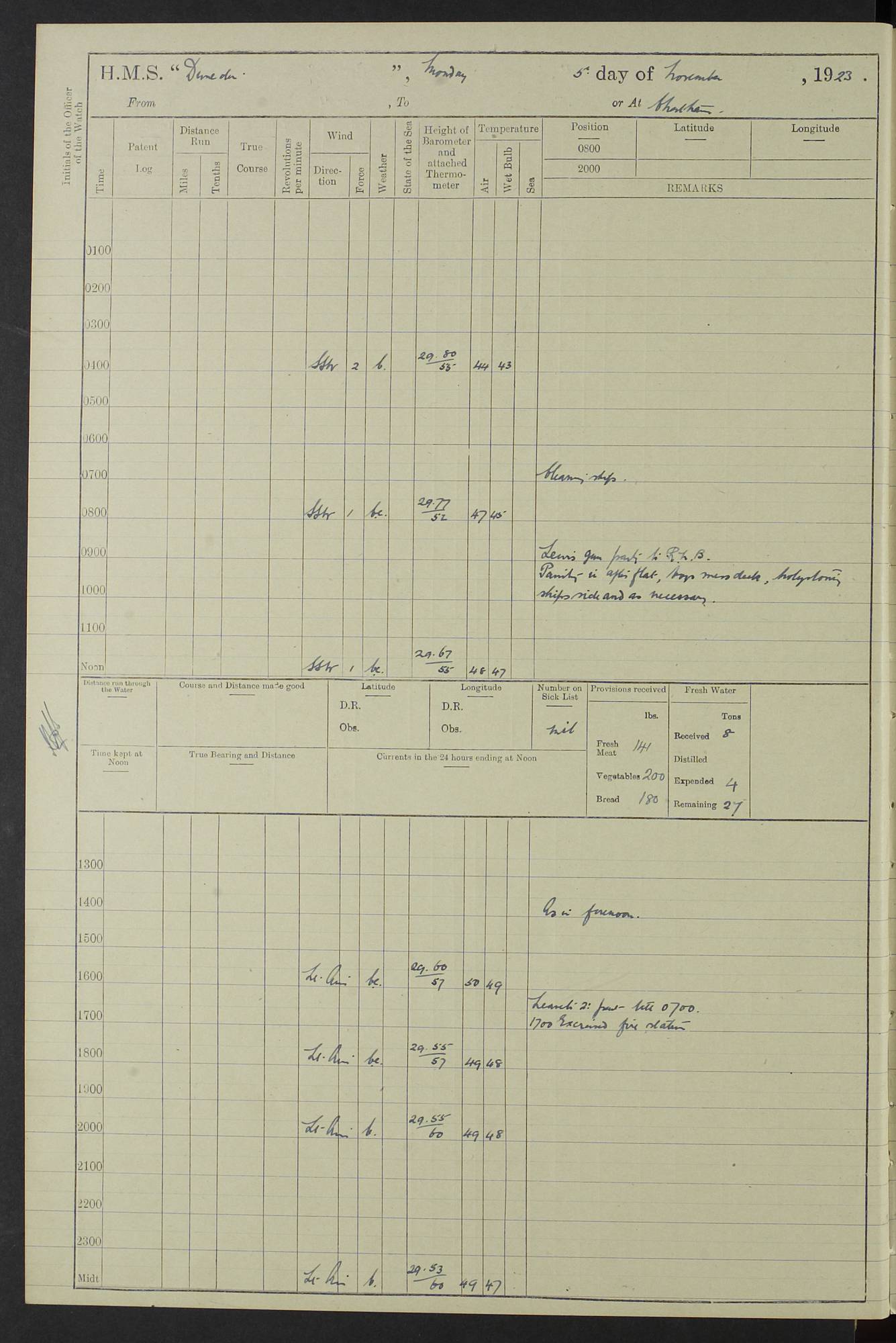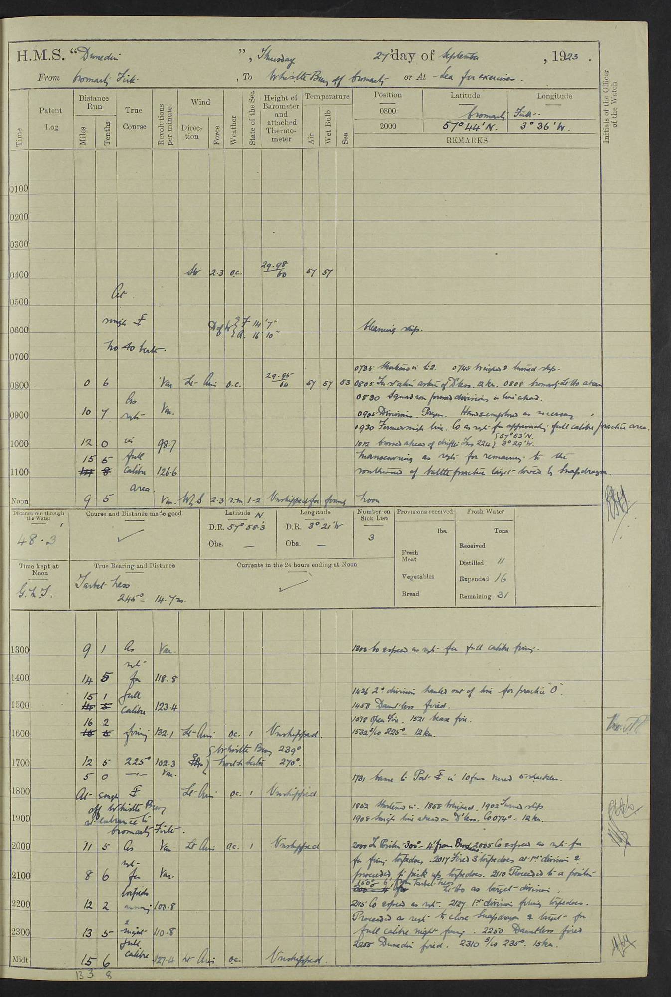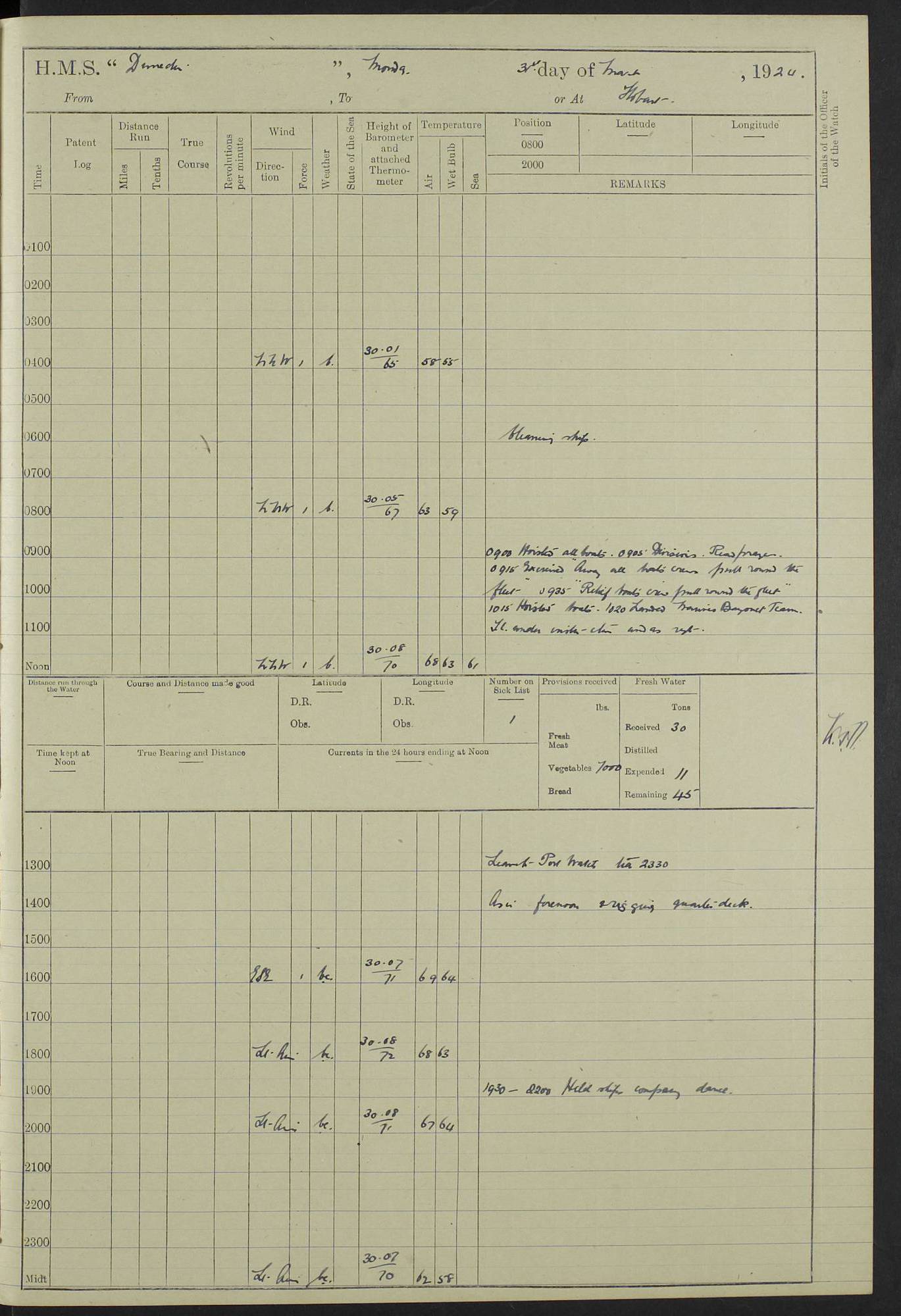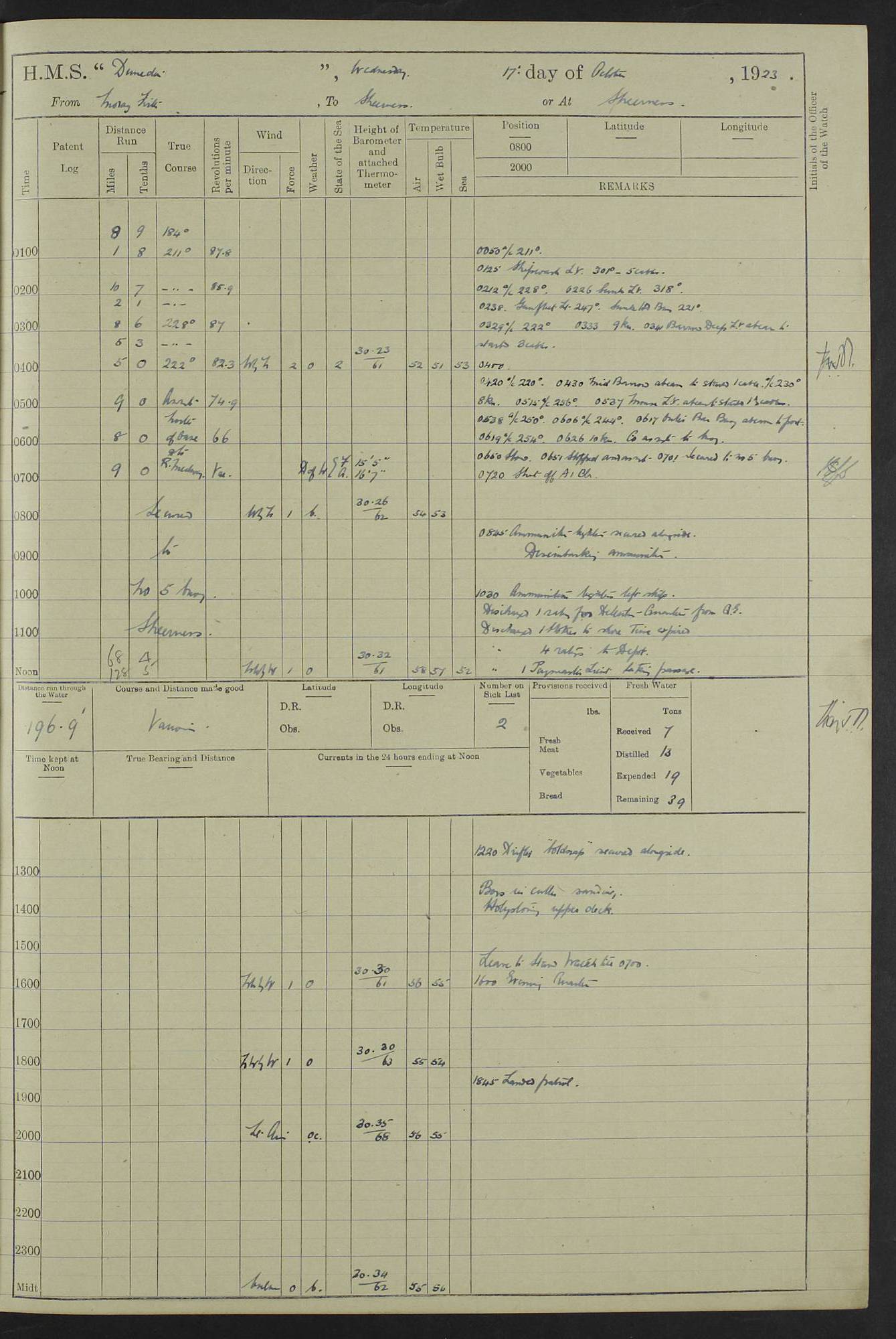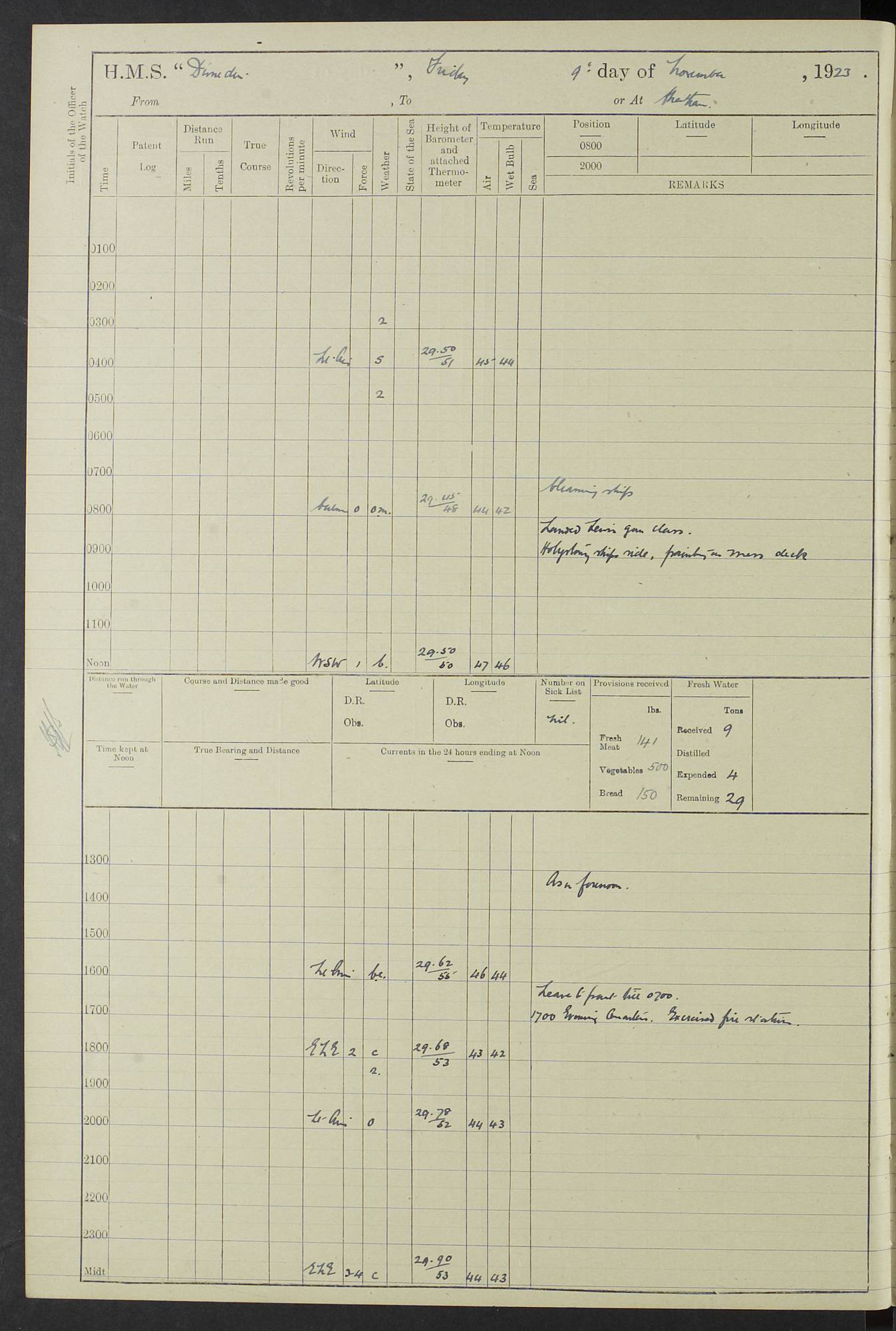 (Maps prepared using Journey Plotter, developed by Maikel. The Plots can only be approximate. They are made by joining-up positions on successive days, and sometimes positions are not given. There will therefore be occasions when the ship appears to have travelled overland) LOG BOOK – 23RD SEPTEMBER 1920 TO 13TH SEPTEMBER 1921 4caf8d9dcadfd3419703bde2: (http://oldweather.s3.amazonaws.com/ADM53-76345/ADM53-76345_0.jpg) Left front cover of Ship’s Log. 4caf8d9dcadfd3419703bde3: (http://oldweather.s3.amazonaws.com/ADM53-76345/ADM53-76345_1.jpg) Right front cover of Ship’s Log. 4caf8d97cadfd3419703bc6a: (http://oldweather.s3.amazonaws.com/ADM53-76345/ADM53-76345-002_0.jpg) 4caf8d97cadfd3419703bc6b: (http://oldweather.s3.amazonaws.com/ADM53-76345/ADM53-76345-002_1.jpg) 4caf8d97cadfd3419703bc6c: (http://oldweather.s3.amazonaws.com/ADM53-76345/ADM53-76345-003_0.jpg) 4caf8d97cadfd3419703bc6d: (http://oldweather.s3.amazonaws.com/ADM53-76345/ADM53-76345-003_1.jpg) 4caf8d97cadfd3419703bc6e: (http://oldweather.s3.amazonaws.com/ADM53-76345/ADM53-76345-004_0.jpg) Blank pages. 4caf8d97cadfd3419703bc6f: (http://oldweather.s3.amazonaws.com/ADM53-76345/ADM53-76345-004_1.jpg) S.- 321. See Articles 557, 619, 622, 924, 1025, 1026 and 1849 of the King’s Regulations, 1913. This Log is to be kept from the time the Ship is Commissioned until she is paid off; when it is to be transmitted as directed by the Admiralty Instructions. The Name and Address of the Officer to whom the acknowledgement of receipt should be sent by the Deputy Cashier in charge, Royal Victoria Yard, Deptford, is to be inserted here. Name: Commander’s Office. Address: H.M.S. Dunedin. c/o G.P.O. London. LOG of H.M.S. “Dunedin” Commanded by Captain C. Wrightson C.B.E. (till 31.3.21). Captain H.S. Monroe D.S.O. (from 31.3.21). FOR THE PERIOD Commencing: Thursday 23rd of September 1920. Ending: Tuesday 13th of September 1921. Tonnage (Displacement): 4,650 Extreme Length: 472ft 3 ins Extreme Breadth: 46 ft 0.3/8” Engines: Manufacturer: Messes R & W Hawthorn Leslie & Co Ltd. Newcastle on Tyne. I.H.P: 40.000 Forced Draught. Description: Turbine (Geared). When Fixed on Board: 1918 – 1919. Boilers: Manufacturer: Messes R & W Hawthorn Leslie & Co Ltd. Newcastle on Tyne. Description: Small tube Improved Yarrow. When made: 1918. When put in vessel: 1918. Paddle Wheels or Screw Propeller: Manufacturer: Manganese Bronze Co. Description: Solid 3 Blades Turbadium Bronze, Pitch 14 ft 3 in. General State of Repair: Satisfactory. R. Alison [?], Lieut Com (W) on paying off 30th August 1923. L. 8418/02. N.L. 15713/13. Where Built Sir W.G. Armstrong Whitworth & Co Ltd. N.L. 18227/18. Armstrong Naval Yard, High Walker, Newcastle on Tyne. Sta. 127/10. Commenced building November 1917, Launched 19 November 1918. N.L. 22782/19. Completed September 1919. 4caf8d98cadfd3419703bc70: (http://oldweather.s3.amazonaws.com/ADM53-76345/ADM53-76345-005_0.jpg) Directions (See King’s Regulations 1913, Articles 1025 and 1849). 1. King’s Regulations. 2. Figures to indicate the Force of the Wind. 3. Letters to denote the State of the Weather. 4. Scale of Fog Intensity. 5. Sea Disturbance Scale 4caf8d98cadfd3419703bc71: (http://oldweather.s3.amazonaws.com/ADM53-76345/ADM53-76345-005_1.jpg) Establishment of Ship’s Company Officers 23 Seamen 187 Boys 36 Marines 46 Engine-room Establishment 105 Other non-executive ratings 44 Total 441 ARMAMENT Position Forecastle: 6” Calibre XII on C.P. XIV mounting. Superstructure: Four 6” Calibre XII on C.P. XIV mountings. Superstructure: Two 3” QF Calibre High Angle mountings, Quarterdeck: 6” Calibre XII on C.P. XIV mountings. Torpedo Armaments Four above water 21” triple tubes. BAROMETER Mercurial or Aneroid: Mercurial. Name of Maker and number: J. Hitchins 101 A747. Height of cistern above sea: 13ft. Error of Mercurial Barometer: Nil at 30.00. Thermometers for Air Temperature. Position on Ship: On fore bridge. Whether in screen: Yes. Maker and No. Negretti & Zambra From: 7.10.19 To: Sept. 1921. Negretti & Zambra No. 10499 Negretti & Zambra No 10391 From: 7.10.19 To: Sept. 1921. Thermometer for Sea Temperature. A. Harper & Sons 7.10.19 POSITION OF STANDARD COMPASS. Manoeuvring Platform. (Fore bridge) BOATS Number of each carried: 1 x 30ft. motor boat. 2 x 32ft. cutters. 1 x 30ft gig. 2 x 27ft whalers. 2 x 16 ft dinghies. MISCELLANEOUS INFORMATION Draught of water with Bunkers full, and complete with provisions, Stores and water: Forward 16 ft 1 inch; Aft 16 ft 11 inches. Number of Tons necessary to increase draught 1 inch: 35.6. Number of Tons of Coal Carried: 16. Number of Tons of Oil Fuel carried: 1127. Quantity of Water Carried (a) For Boilers: 157 tons. (b) For Drinking: 56½ tons. LOGS FOR SEPTEMBER 1920 4caf8d98cadfd3419703bc72: (http://oldweather.s3.amazonaws.com/ADM53-76345/ADM53-76345-006_0.jpg) 23 September 1920 At Copenhagen. Lat 55.694, Long 12.603 4.00am: Signal books correct. am: Hands employed cleaning ship. 8.00am: Signal books correct. am: Sent coaling party to S.S. “Volo”. am: X & Y 6” guns crews at loader drill, remainder of hands employed as requisite. am: Coaling party returned. Noon: Signal books correct. 1.15pm: Sent coaling party to S.S. “Volo”. pm: 1 Rating joined ship from hospital. pm: Boys & training classes under instruction, remainder of hands employed as requisite. 3.00pm: U.S.S. “Gilmer” arrived. [Gilmer, U.S. Destroyer, Flush Decker, launched 18/7/19, Guns: 4 x 5”, 51 cal.,1 x 3”, 23 cal. AA, 12 x 21” TT’s in 4 triple deck mountings. Disp: 1,215 tons, SHP: 26,000 = 35 knots. Jane’s Fighting Ships 1919. Image]. 4.00pm: Signal books correct. pm: Coaling party returned. 8.00pm: Signal books correct. Midnight: Signal books correct. 4caf8d98cadfd3419703bc73: (http://oldweather.s3.amazonaws.com/ADM53-76345/ADM53-76345-006_1.jpg) 24 September 1920 At Copenhagen. Lat 55.694, Long 12.603 4.00am: Signal books correct. am: Hands employed cleaning ship. 6.15am: U.S.S. “Sh