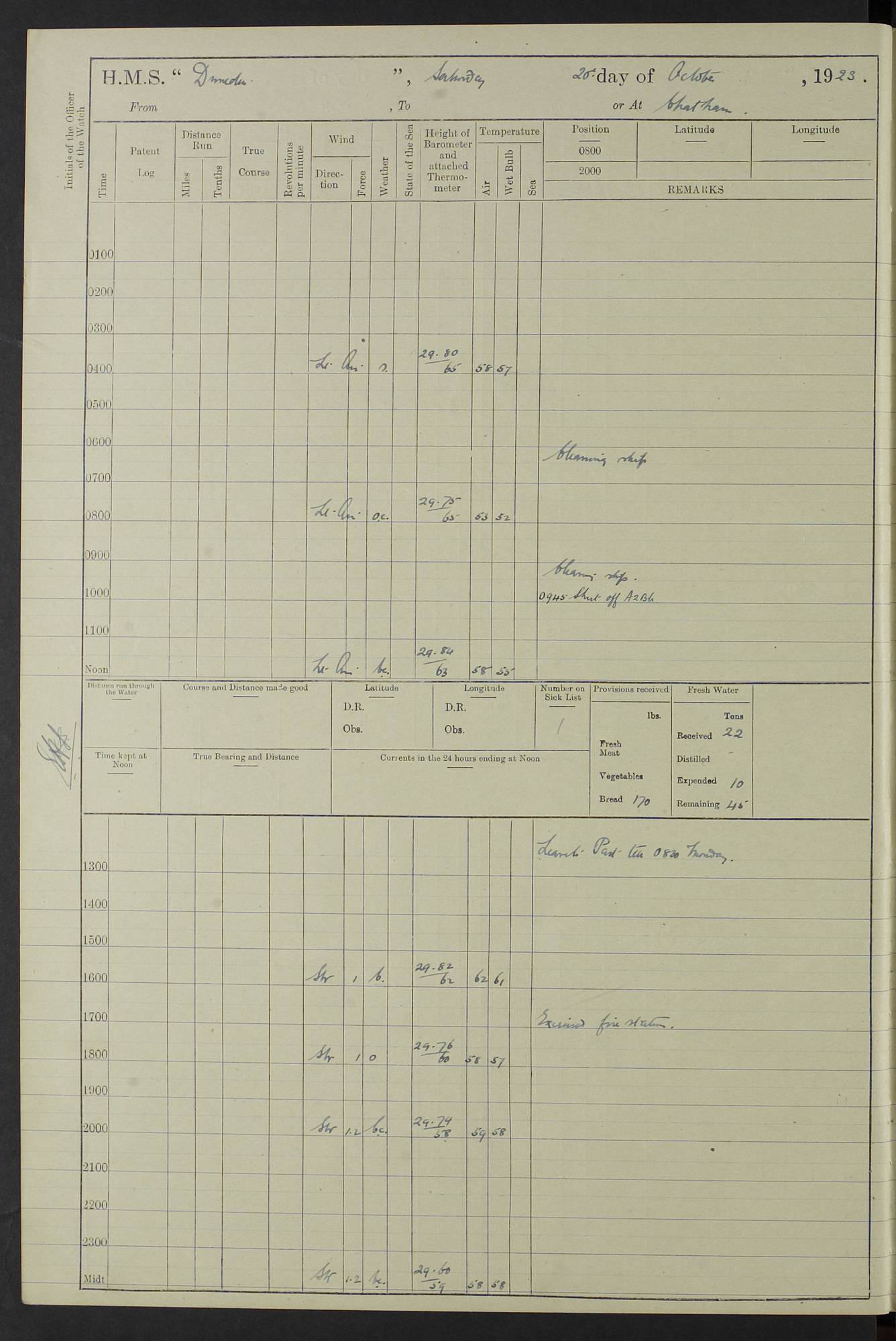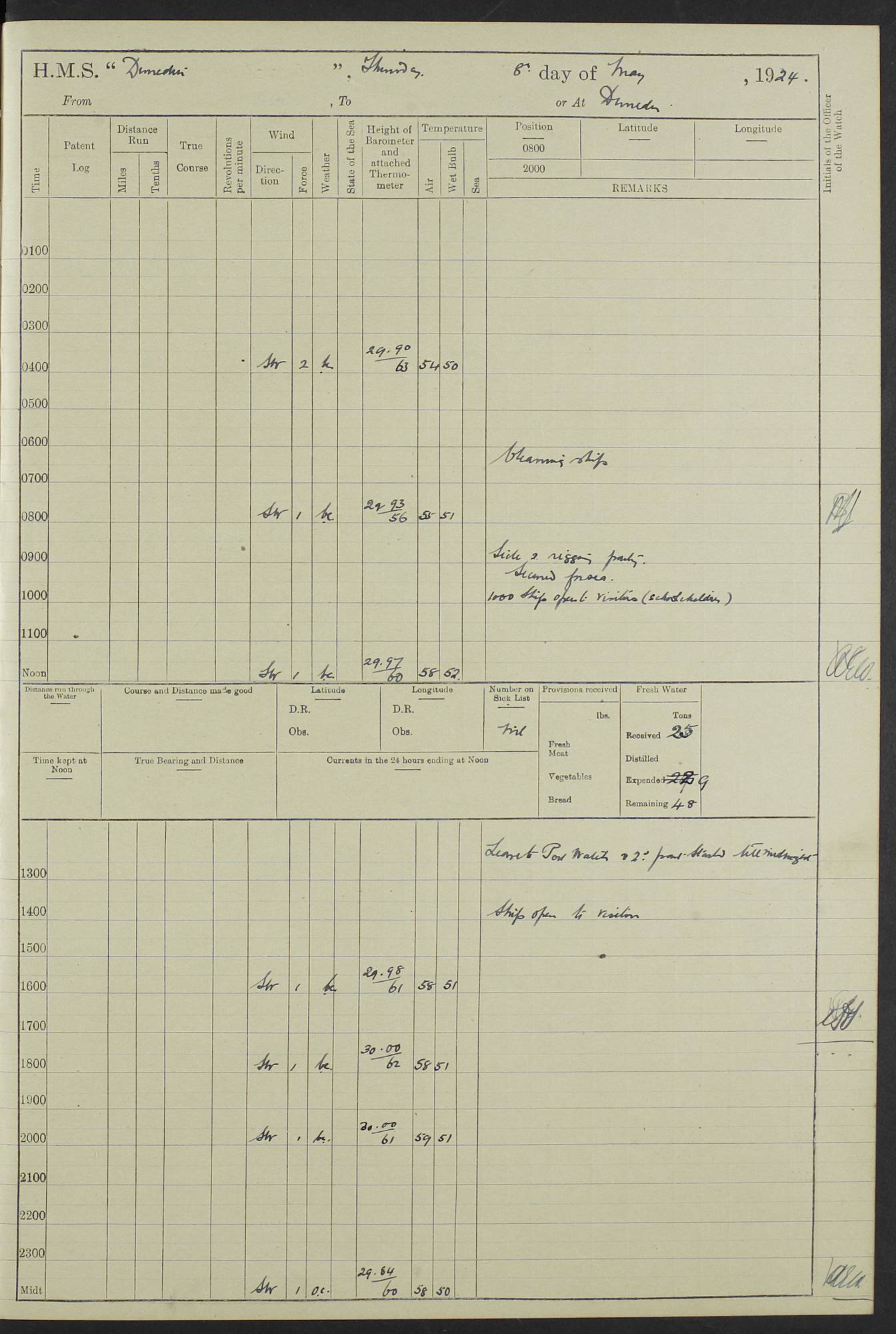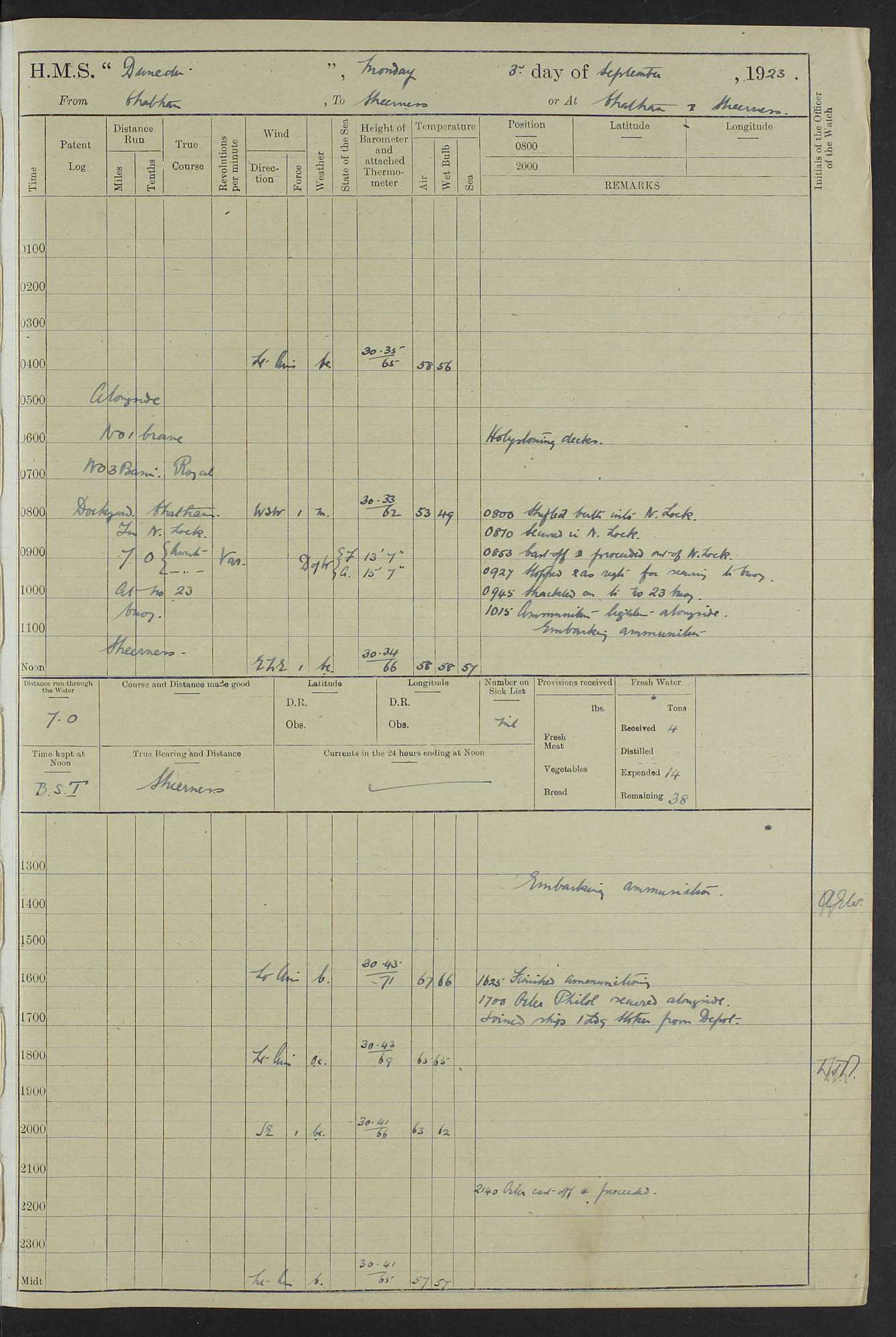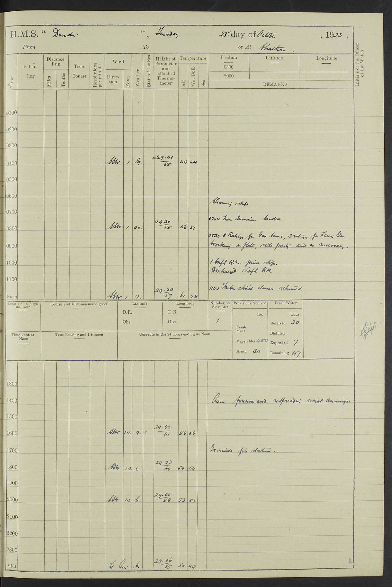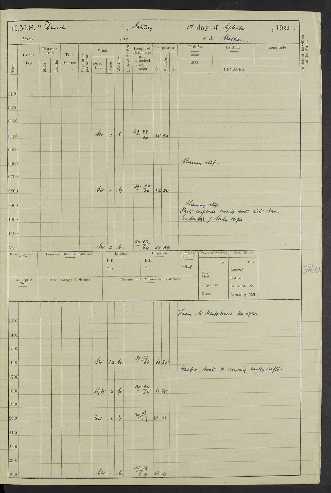 (Maps prepared using Journey Plotter, developed by Maikel. The Plots can only be approximate. They are made by joining-up positions on successive days, and sometimes positions are not given. There will therefore be occasions when the ship appears to have travelled overland) LOG BOOK – 23RD SEPTEMBER 1920 TO 13TH SEPTEMBER 1921 4caf8d9dcadfd3419703bde2: (http://oldweather.s3.amazonaws.com/ADM53-76345/ADM53-76345_0.jpg) Left front cover of Ship’s Log. 4caf8d9dcadfd3419703bde3: (http://oldweather.s3.amazonaws.com/ADM53-76345/ADM53-76345_1.jpg) Right front cover of Ship’s Log. 4caf8d97cadfd3419703bc6a: (http://oldweather.s3.amazonaws.com/ADM53-76345/ADM53-76345-002_0.jpg) 4caf8d97cadfd3419703bc6b: (http://oldweather.s3.amazonaws.com/ADM53-76345/ADM53-76345-002_1.jpg) 4caf8d97cadfd3419703bc6c: (http://oldweather.s3.amazonaws.com/ADM53-76345/ADM53-76345-003_0.jpg) 4caf8d97cadfd3419703bc6d: (http://oldweather.s3.amazonaws.com/ADM53-76345/ADM53-76345-003_1.jpg) 4caf8d97cadfd3419703bc6e: (http://oldweather.s3.amazonaws.com/ADM53-76345/ADM53-76345-004_0.jpg) Blank pages. 4caf8d97cadfd3419703bc6f: (http://oldweather.s3.amazonaws.com/ADM53-76345/ADM53-76345-004_1.jpg) S.- 321. See Articles 557, 619, 622, 924, 1025, 1026 and 1849 of the King’s Regulations, 1913. This Log is to be kept from the time the Ship is Commissioned until she is paid off; when it is to be transmitted as directed by the Admiralty Instructions. The Name and Address of the Officer to whom the acknowledgement of receipt should be sent by the Deputy Cashier in charge, Royal Victoria Yard, Deptford, is to be inserted here. Name: Commander’s Office. Address: H.M.S. Dunedin. c/o G.P.O. London. LOG of H.M.S. “Dunedin” Commanded by Captain C. Wrightson C.B.E. (till 31.3.21). Captain H.S. Monroe D.S.O. (from 31.3.21). FOR THE PERIOD Commencing: Thursday 23rd of September 1920. Ending: Tuesday 13th of September 1921. Tonnage (Displacement): 4,650 Extreme Length: 472ft 3 ins Extreme Breadth: 46 ft 0.3/8” Engines: Manufacturer: Messes R & W Hawthorn Leslie & Co Ltd. Newcastle on Tyne. I.H.P: 40.000 Forced Draught. Description: Turbine (Geared). When Fixed on Board: 1918 – 1919. Boilers: Manufacturer: Messes R & W Hawthorn Leslie & Co Ltd. Newcastle on Tyne. Description: Small tube Improved Yarrow. When made: 1918. When put in vessel: 1918. Paddle Wheels or Screw Propeller: Manufacturer: Manganese Bronze Co. Description: Solid 3 Blades Turbadium Bronze, Pitch 14 ft 3 in. General State of Repair: Satisfactory. R. Alison [?], Lieut Com (W) on paying off 30th August 1923. L. 8418/02. N.L. 15713/13. Where Built Sir W.G. Armstrong Whitworth & Co Ltd. N.L. 18227/18. Armstrong Naval Yard, High Walker, Newcastle on Tyne. Sta. 127/10. Commenced building November 1917, Launched 19 November 1918. N.L. 22782/19. Completed September 1919. 4caf8d98cadfd3419703bc70: (http://oldweather.s3.amazonaws.com/ADM53-76345/ADM53-76345-005_0.jpg) Directions (See King’s Regulations 1913, Articles 1025 and 1849). 1. King’s Regulations. 2. Figures to indicate the Force of the Wind. 3. Letters to denote the State of the Weather. 4. Scale of Fog Intensity. 5. Sea Disturbance Scale 4caf8d98cadfd3419703bc71: (http://oldweather.s3.amazonaws.com/ADM53-76345/ADM53-76345-005_1.jpg) Establishment of Ship’s Company Officers 23 Seamen 187 Boys 36 Marines 46 Engine-room Establishment 105 Other non-executive ratings 44 Total 441 ARMAMENT Position Forecastle: 6” Calibre XII on C.P. XIV mounting. Superstructure: Four 6” Calibre XII on C.P. XIV mountings. Superstructure: Two 3” QF Calibre High Angle mountings, Quarterdeck: 6” Calibre XII on C.P. XIV mountings. Torpedo Armaments Four above water 21” triple tubes. BAROMETER Mercurial or Aneroid: Mercurial. Name of Maker and number: J. Hitchins 101 A747. Height of cistern above sea: 13ft. Error of Mercurial Barometer: Nil at 30.00. Thermometers for Air Temperature. Position on Ship: On fore bridge. Whether in screen: Yes. Maker and No. Negretti & Zambra From: 7.10.19 To: Sept. 1921. Negretti & Zambra No. 10499 Negretti & Zambra No 10391 From: 7.10.19 To: Sept. 1921. Thermometer for Sea Temperature. A. Harper & Sons 7.10.19 POSITION OF STANDARD COMPASS. Manoeuvring Platform. (Fore bridge) BOATS Number of each carried: 1 x 30ft. motor boat. 2 x 32ft. cutters. 1 x 30ft gig. 2 x 27ft whalers. 2 x 16 ft dinghies. MISCELLANEOUS INFORMATION Draught of water with Bunkers full, and complete with provisions, Stores and water: Forward 16 ft 1 inch; Aft 16 ft 11 inches. Number of Tons necessary to increase draught 1 inch: 35.6. Number of Tons of Coal Carried: 16. Number of Tons of Oil Fuel carried: 1127. Quantity of Water Carried (a) For Boilers: 157 tons. (b) For Drinking: 56½ tons. LOGS FOR SEPTEMBER 1920 4caf8d98cadfd3419703bc72: (http://oldweather.s3.amazonaws.com/ADM53-76345/ADM53-76345-006_0.jpg) 23 September 1920 At Copenhagen. Lat 55.694, Long 12.603 4.00am: Signal books correct. am: Hands employed cleaning ship. 8.00am: Signal books correct. am: Sent coaling party to S.S. “Volo”. am: X & Y 6” guns crews at loader drill, remainder of hands employed as requisite. am: Coaling party returned. Noon: Signal books correct. 1.15pm: Sent coaling party to S.S. “Volo”. pm: 1 Rating joined ship from hospital. pm: Boys & training classes under instruction, remainder of hands employed as requisite. 3.00pm: U.S.S. “Gilmer” arrived. [Gilmer, U.S. Destroyer, Flush Decker, launched 18/7/19, Guns: 4 x 5”, 51 cal.,1 x 3”, 23 cal. AA, 12 x 21” TT’s in 4 triple deck mountings. Disp: 1,215 tons, SHP: 26,000 = 35 knots. Jane’s Fighting Ships 1919. Image]. 4.00pm: Signal books correct. pm: Coaling party returned. 8.00pm: Signal books correct. Midnight: Signal books correct. 4caf8d98cadfd3419703bc73: (http://oldweather.s3.amazonaws.com/ADM53-76345/ADM53-76345-006_1.jpg) 24 September 1920 At Copenhagen. Lat 55.694, Long 12.603 4.00am: Signal books correct. am: Hands employed cleaning ship. 6.15am: U.S.S. “Sh