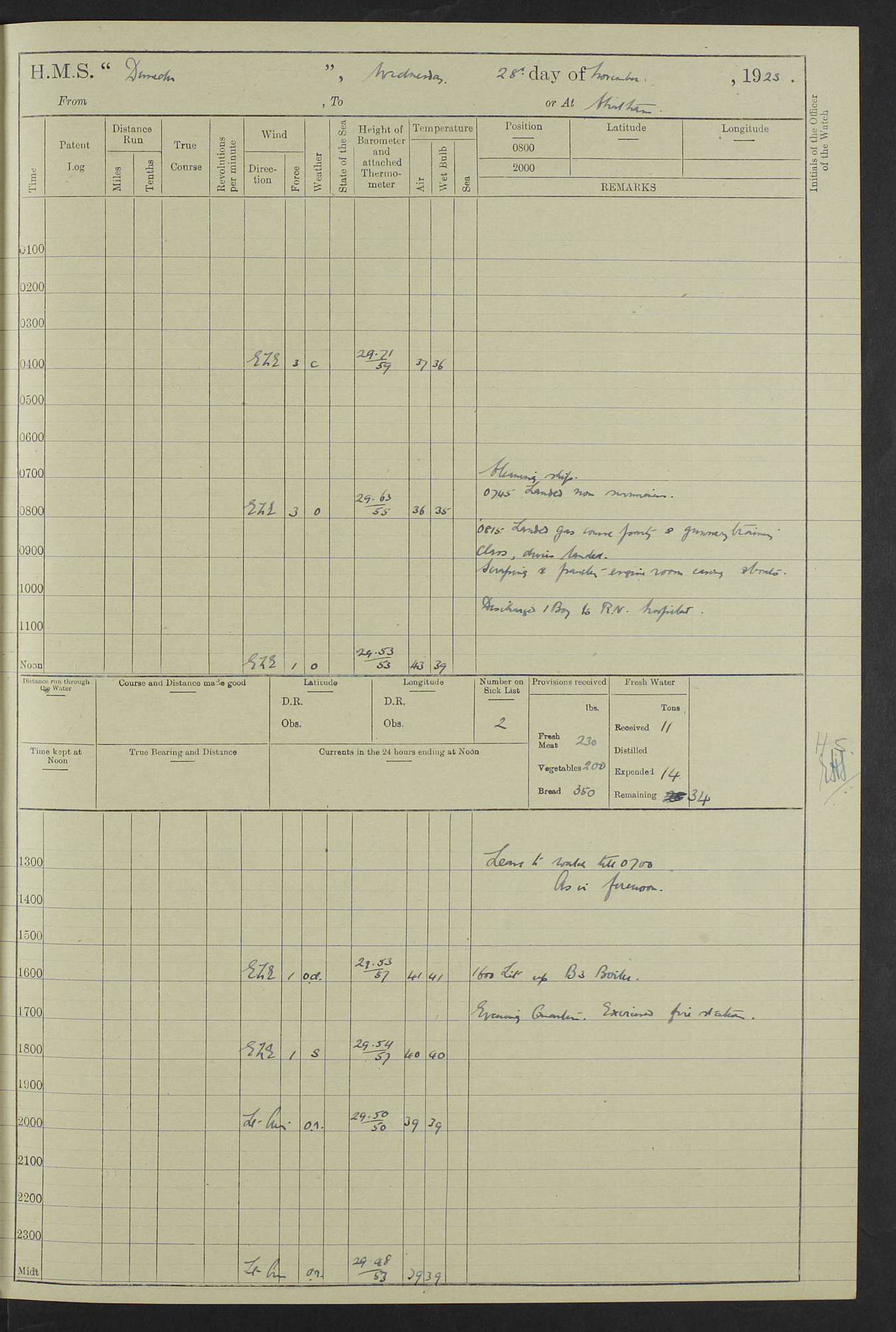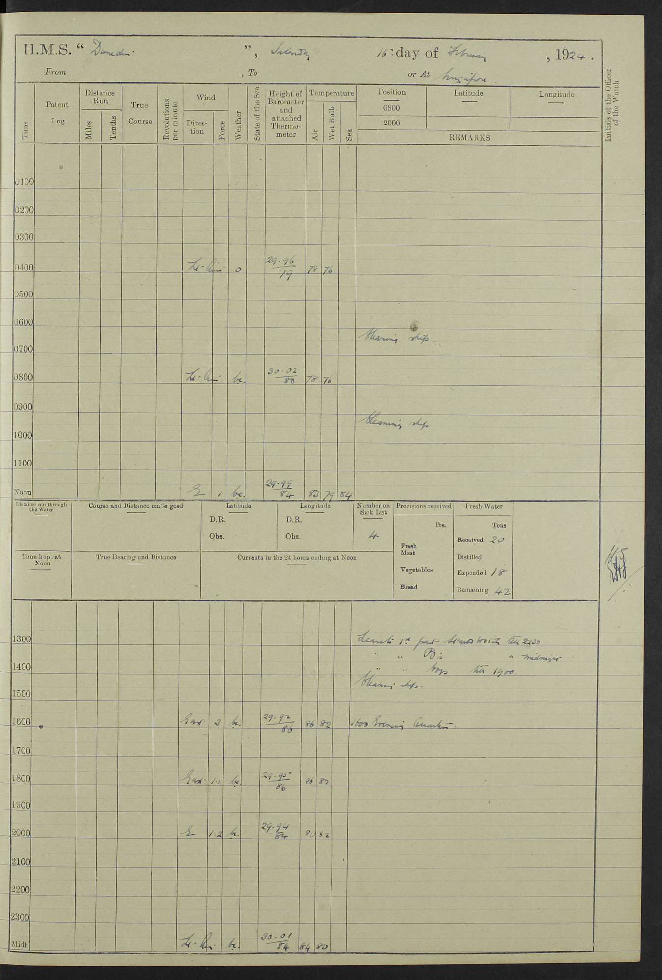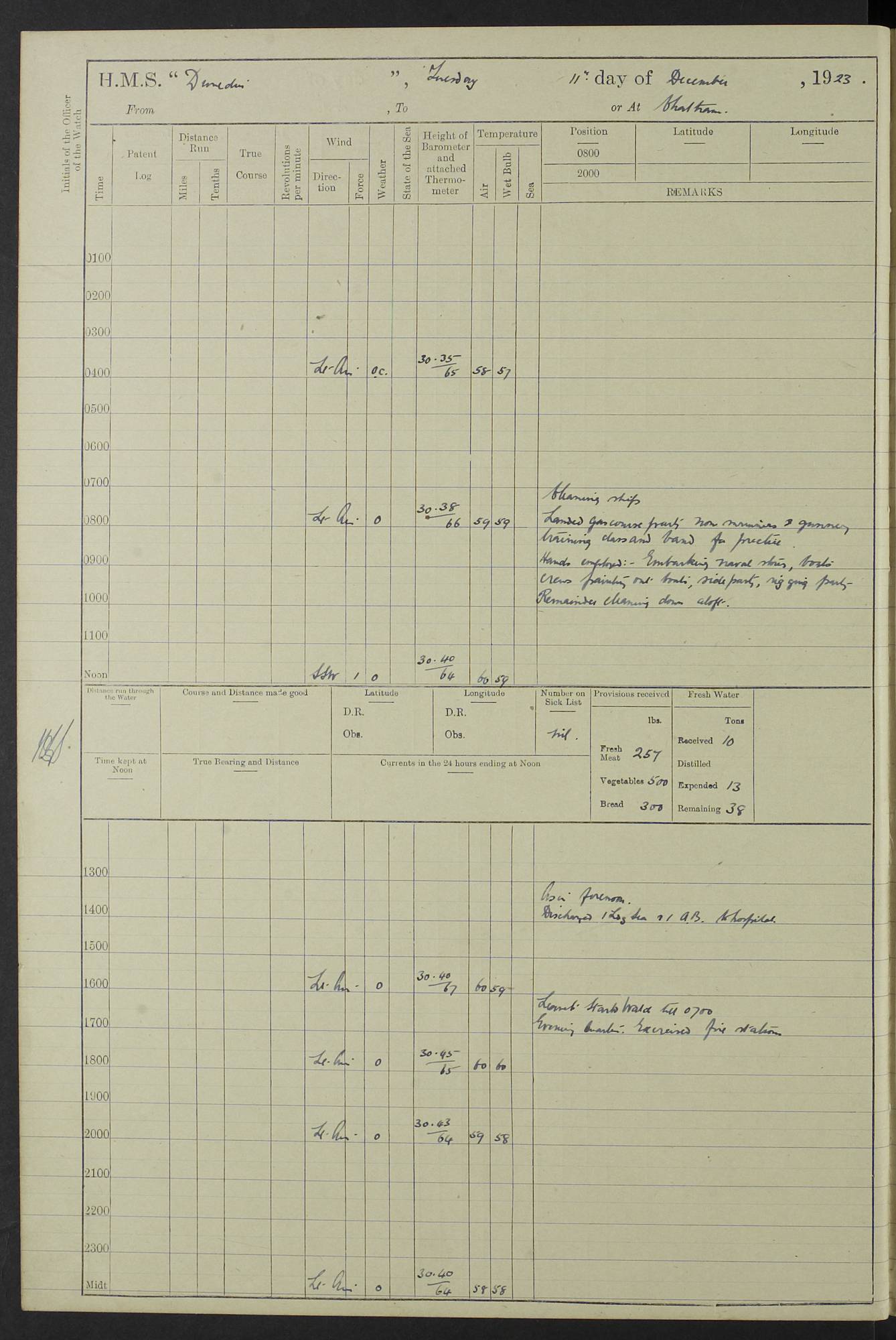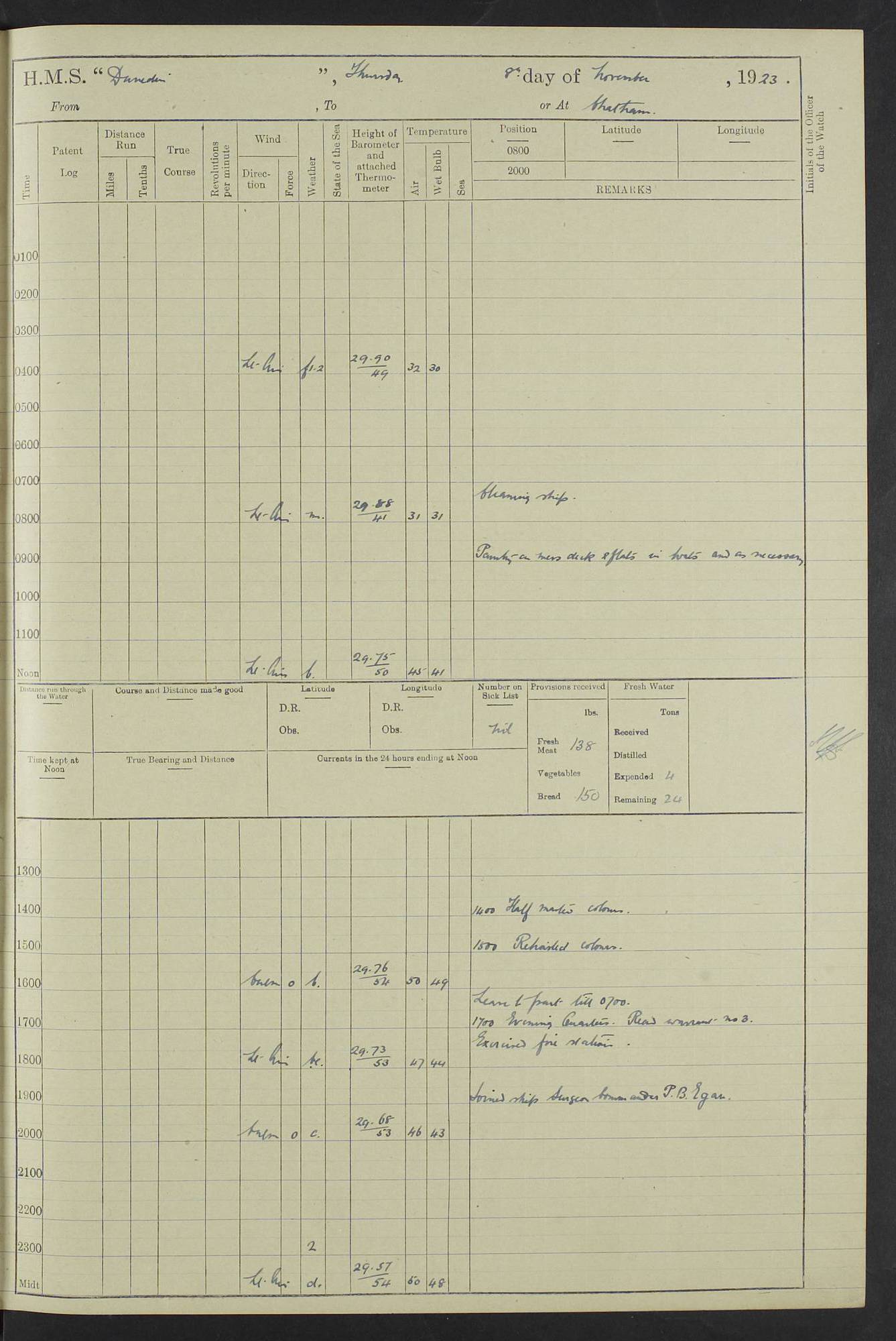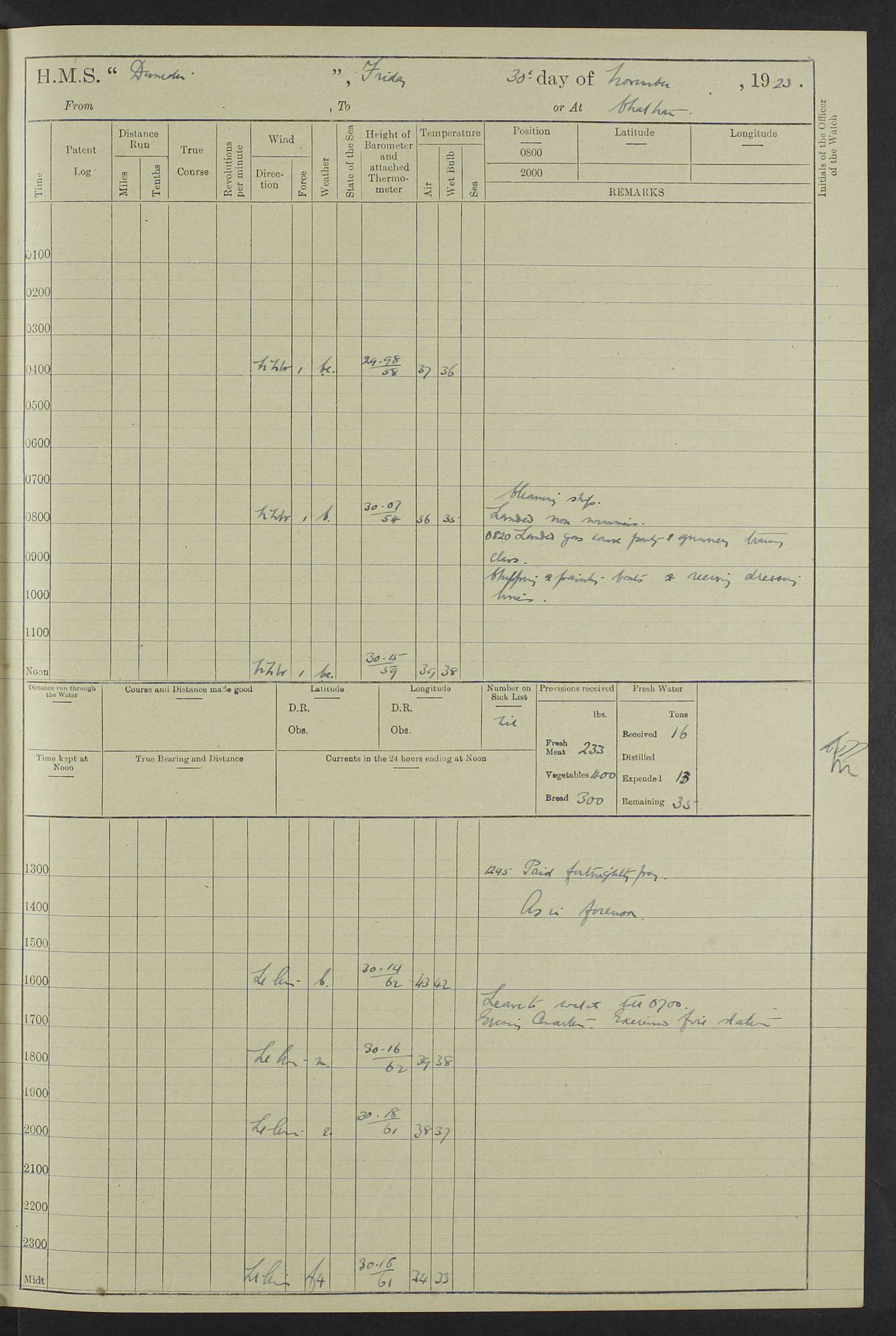 (Maps prepared using Journey Plotter, developed by Maikel. The Plots can only be approximate. They are made by joining-up positions on successive days, and sometimes positions are not given. There will therefore be occasions when the ship appears to have travelled overland) LOG BOOK – 23RD SEPTEMBER 1920 TO 13TH SEPTEMBER 1921 4caf8d9dcadfd3419703bde2: (http://oldweather.s3.amazonaws.com/ADM53-76345/ADM53-76345_0.jpg) Left front cover of Ship’s Log. 4caf8d9dcadfd3419703bde3: (http://oldweather.s3.amazonaws.com/ADM53-76345/ADM53-76345_1.jpg) Right front cover of Ship’s Log. 4caf8d97cadfd3419703bc6a: (http://oldweather.s3.amazonaws.com/ADM53-76345/ADM53-76345-002_0.jpg) 4caf8d97cadfd3419703bc6b: (http://oldweather.s3.amazonaws.com/ADM53-76345/ADM53-76345-002_1.jpg) 4caf8d97cadfd3419703bc6c: (http://oldweather.s3.amazonaws.com/ADM53-76345/ADM53-76345-003_0.jpg) 4caf8d97cadfd3419703bc6d: (http://oldweather.s3.amazonaws.com/ADM53-76345/ADM53-76345-003_1.jpg) 4caf8d97cadfd3419703bc6e: (http://oldweather.s3.amazonaws.com/ADM53-76345/ADM53-76345-004_0.jpg) Blank pages. 4caf8d97cadfd3419703bc6f: (http://oldweather.s3.amazonaws.com/ADM53-76345/ADM53-76345-004_1.jpg) S.- 321. See Articles 557, 619, 622, 924, 1025, 1026 and 1849 of the King’s Regulations, 1913. This Log is to be kept from the time the Ship is Commissioned until she is paid off; when it is to be transmitted as directed by the Admiralty Instructions. The Name and Address of the Officer to whom the acknowledgement of receipt should be sent by the Deputy Cashier in charge, Royal Victoria Yard, Deptford, is to be inserted here. Name: Commander’s Office. Address: H.M.S. Dunedin. c/o G.P.O. London. LOG of H.M.S. “Dunedin” Commanded by Captain C. Wrightson C.B.E. (till 31.3.21). Captain H.S. Monroe D.S.O. (from 31.3.21). FOR THE PERIOD Commencing: Thursday 23rd of September 1920. Ending: Tuesday 13th of September 1921. Tonnage (Displacement): 4,650 Extreme Length: 472ft 3 ins Extreme Breadth: 46 ft 0.3/8” Engines: Manufacturer: Messes R & W Hawthorn Leslie & Co Ltd. Newcastle on Tyne. I.H.P: 40.000 Forced Draught. Description: Turbine (Geared). When Fixed on Board: 1918 – 1919. Boilers: Manufacturer: Messes R & W Hawthorn Leslie & Co Ltd. Newcastle on Tyne. Description: Small tube Improved Yarrow. When made: 1918. When put in vessel: 1918. Paddle Wheels or Screw Propeller: Manufacturer: Manganese Bronze Co. Description: Solid 3 Blades Turbadium Bronze, Pitch 14 ft 3 in. General State of Repair: Satisfactory. R. Alison [?], Lieut Com (W) on paying off 30th August 1923. L. 8418/02. N.L. 15713/13. Where Built Sir W.G. Armstrong Whitworth & Co Ltd. N.L. 18227/18. Armstrong Naval Yard, High Walker, Newcastle on Tyne. Sta. 127/10. Commenced building November 1917, Launched 19 November 1918. N.L. 22782/19. Completed September 1919. 4caf8d98cadfd3419703bc70: (http://oldweather.s3.amazonaws.com/ADM53-76345/ADM53-76345-005_0.jpg) Directions (See King’s Regulations 1913, Articles 1025 and 1849). 1. King’s Regulations. 2. Figures to indicate the Force of the Wind. 3. Letters to denote the State of the Weather. 4. Scale of Fog Intensity. 5. Sea Disturbance Scale 4caf8d98cadfd3419703bc71: (http://oldweather.s3.amazonaws.com/ADM53-76345/ADM53-76345-005_1.jpg) Establishment of Ship’s Company Officers 23 Seamen 187 Boys 36 Marines 46 Engine-room Establishment 105 Other non-executive ratings 44 Total 441 ARMAMENT Position Forecastle: 6” Calibre XII on C.P. XIV mounting. Superstructure: Four 6” Calibre XII on C.P. XIV mountings. Superstructure: Two 3” QF Calibre High Angle mountings, Quarterdeck: 6” Calibre XII on C.P. XIV mountings. Torpedo Armaments Four above water 21” triple tubes. BAROMETER Mercurial or Aneroid: Mercurial. Name of Maker and number: J. Hitchins 101 A747. Height of cistern above sea: 13ft. Error of Mercurial Barometer: Nil at 30.00. Thermometers for Air Temperature. Position on Ship: On fore bridge. Whether in screen: Yes. Maker and No. Negretti & Zambra From: 7.10.19 To: Sept. 1921. Negretti & Zambra No. 10499 Negretti & Zambra No 10391 From: 7.10.19 To: Sept. 1921. Thermometer for Sea Temperature. A. Harper & Sons 7.10.19 POSITION OF STANDARD COMPASS. Manoeuvring Platform. (Fore bridge) BOATS Number of each carried: 1 x 30ft. motor boat. 2 x 32ft. cutters. 1 x 30ft gig. 2 x 27ft whalers. 2 x 16 ft dinghies. MISCELLANEOUS INFORMATION Draught of water with Bunkers full, and complete with provisions, Stores and water: Forward 16 ft 1 inch; Aft 16 ft 11 inches. Number of Tons necessary to increase draught 1 inch: 35.6. Number of Tons of Coal Carried: 16. Number of Tons of Oil Fuel carried: 1127. Quantity of Water Carried (a) For Boilers: 157 tons. (b) For Drinking: 56½ tons. LOGS FOR SEPTEMBER 1920 4caf8d98cadfd3419703bc72: (http://oldweather.s3.amazonaws.com/ADM53-76345/ADM53-76345-006_0.jpg) 23 September 1920 At Copenhagen. Lat 55.694, Long 12.603 4.00am: Signal books correct. am: Hands employed cleaning ship. 8.00am: Signal books correct. am: Sent coaling party to S.S. “Volo”. am: X & Y 6” guns crews at loader drill, remainder of hands employed as requisite. am: Coaling party returned. Noon: Signal books correct. 1.15pm: Sent coaling party to S.S. “Volo”. pm: 1 Rating joined ship from hospital. pm: Boys & training classes under instruction, remainder of hands employed as requisite. 3.00pm: U.S.S. “Gilmer” arrived. [Gilmer, U.S. Destroyer, Flush Decker, launched 18/7/19, Guns: 4 x 5”, 51 cal.,1 x 3”, 23 cal. AA, 12 x 21” TT’s in 4 triple deck mountings. Disp: 1,215 tons, SHP: 26,000 = 35 knots. Jane’s Fighting Ships 1919. Image]. 4.00pm: Signal books correct. pm: Coaling party returned. 8.00pm: Signal books correct. Midnight: Signal books correct. 4caf8d98cadfd3419703bc73: (http://oldweather.s3.amazonaws.com/ADM53-76345/ADM53-76345-006_1.jpg) 24 September 1920 At Copenhagen. Lat 55.694, Long 12.603 4.00am: Signal books correct. am: Hands employed cleaning ship. 6.15am: U.S.S. “Sh