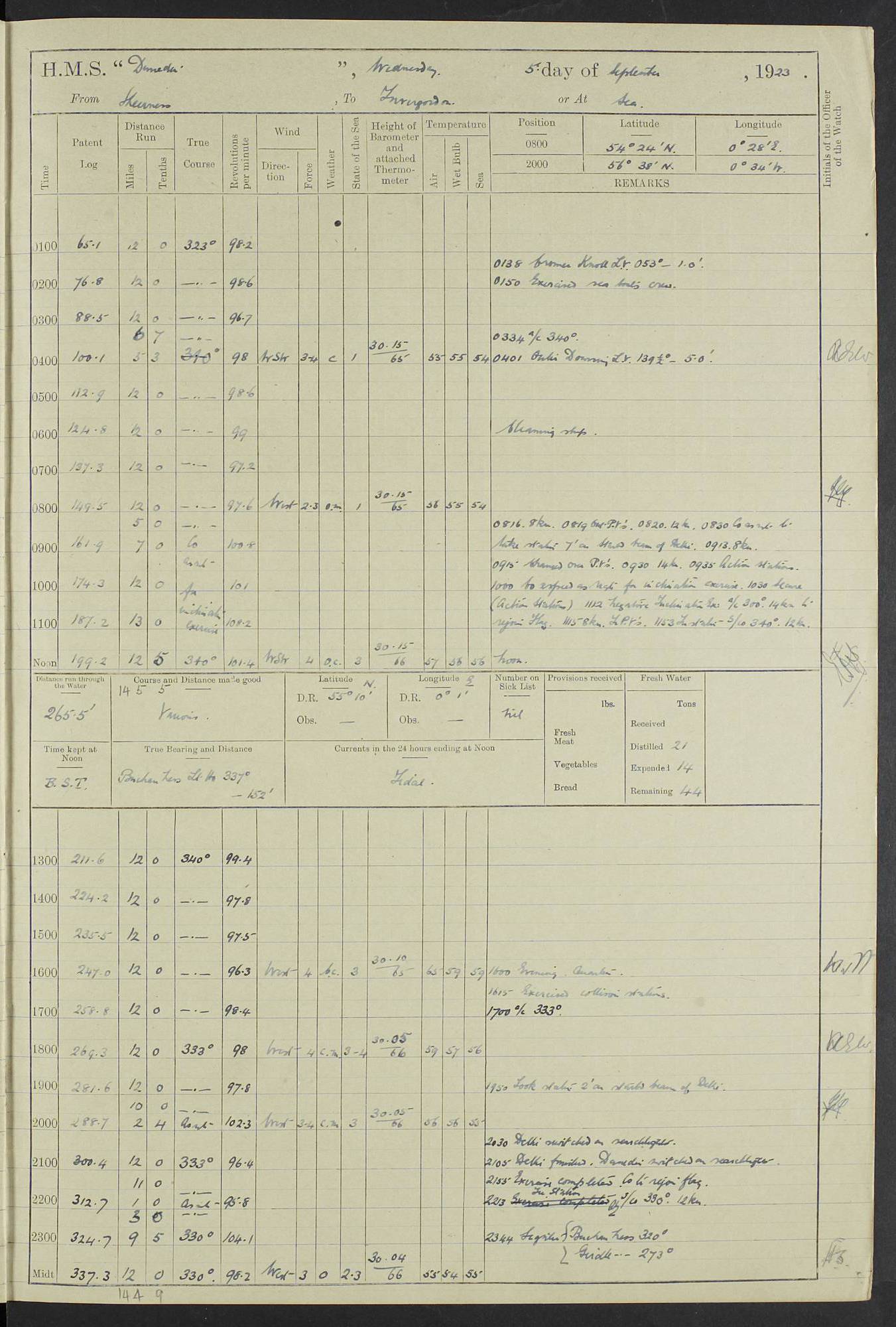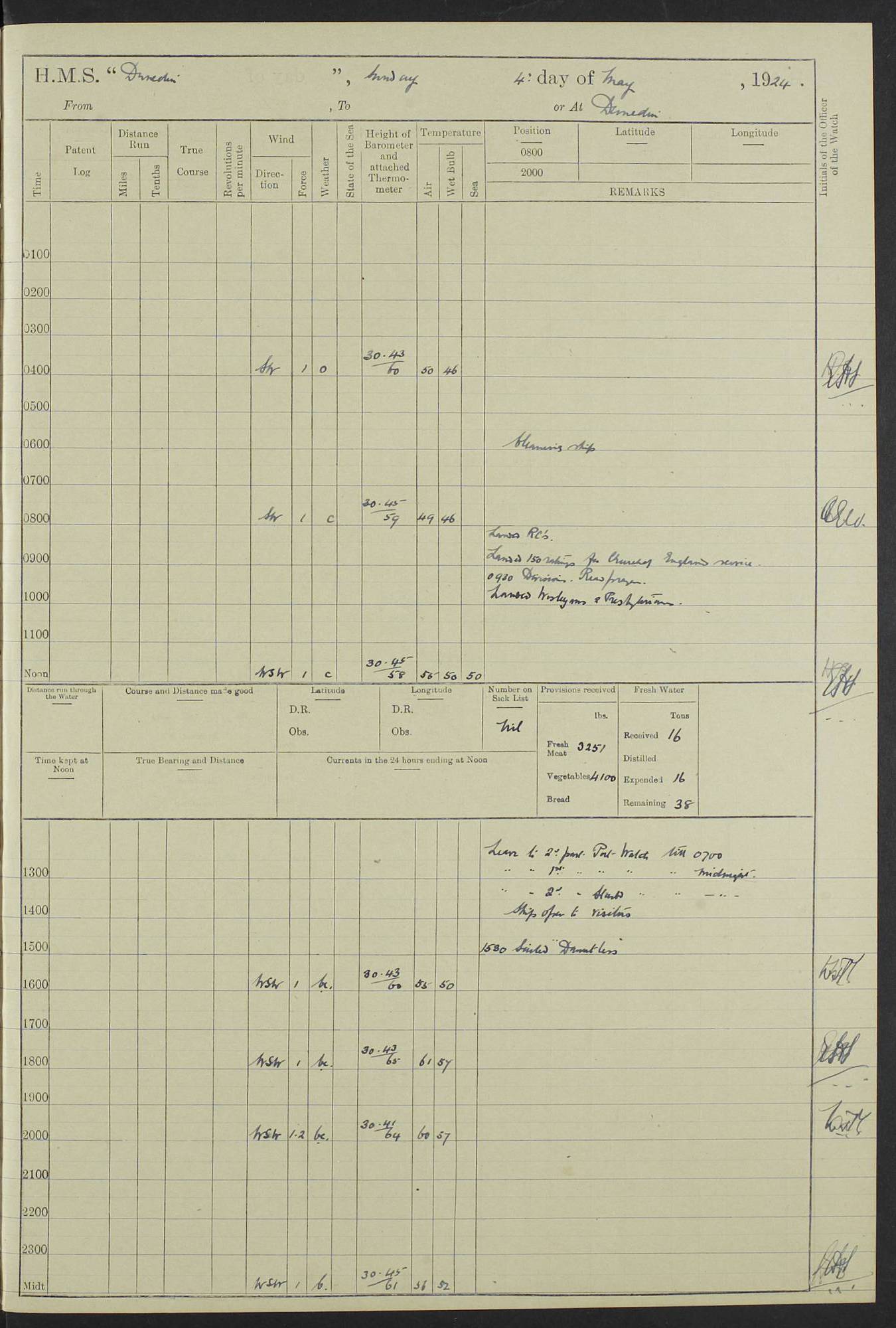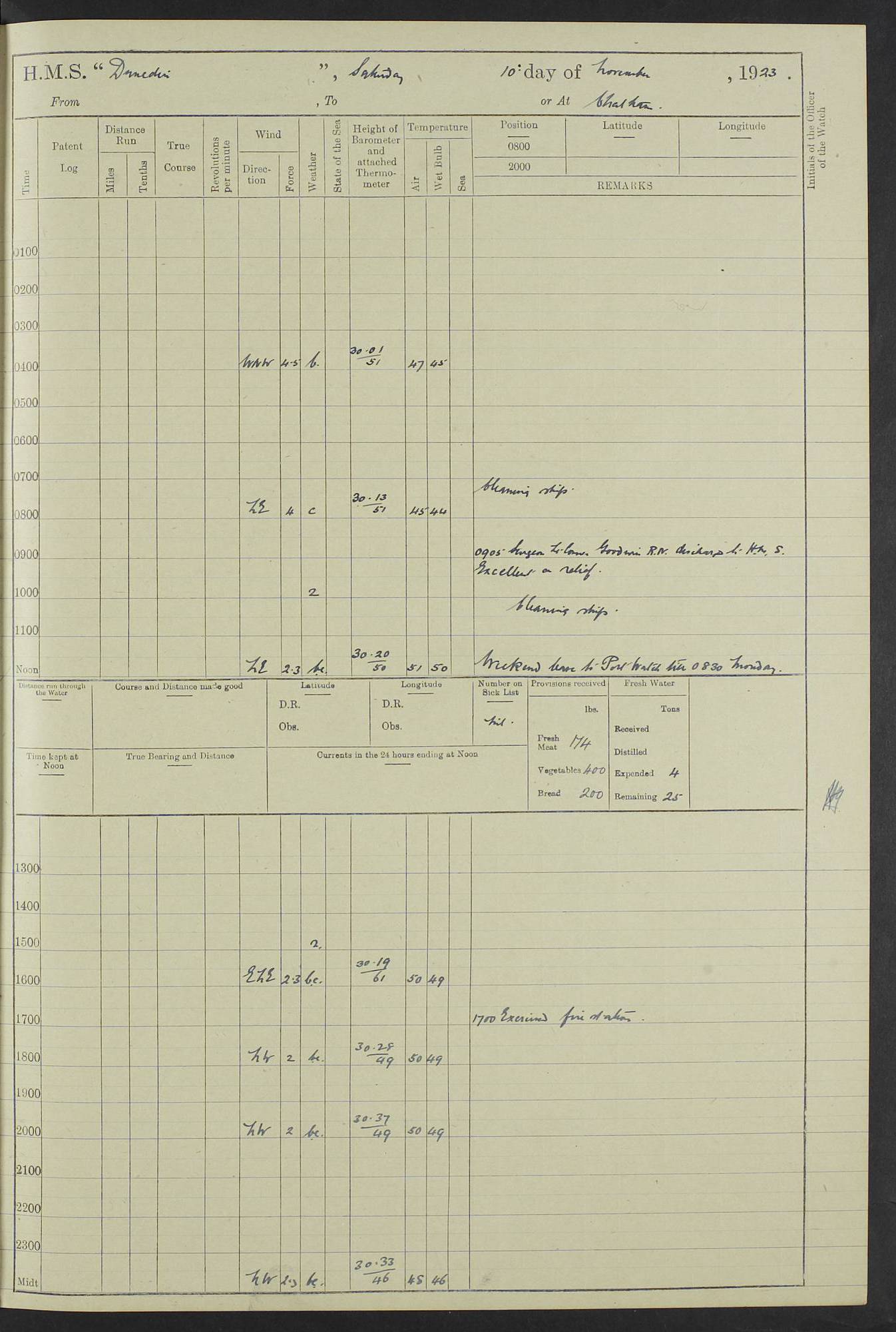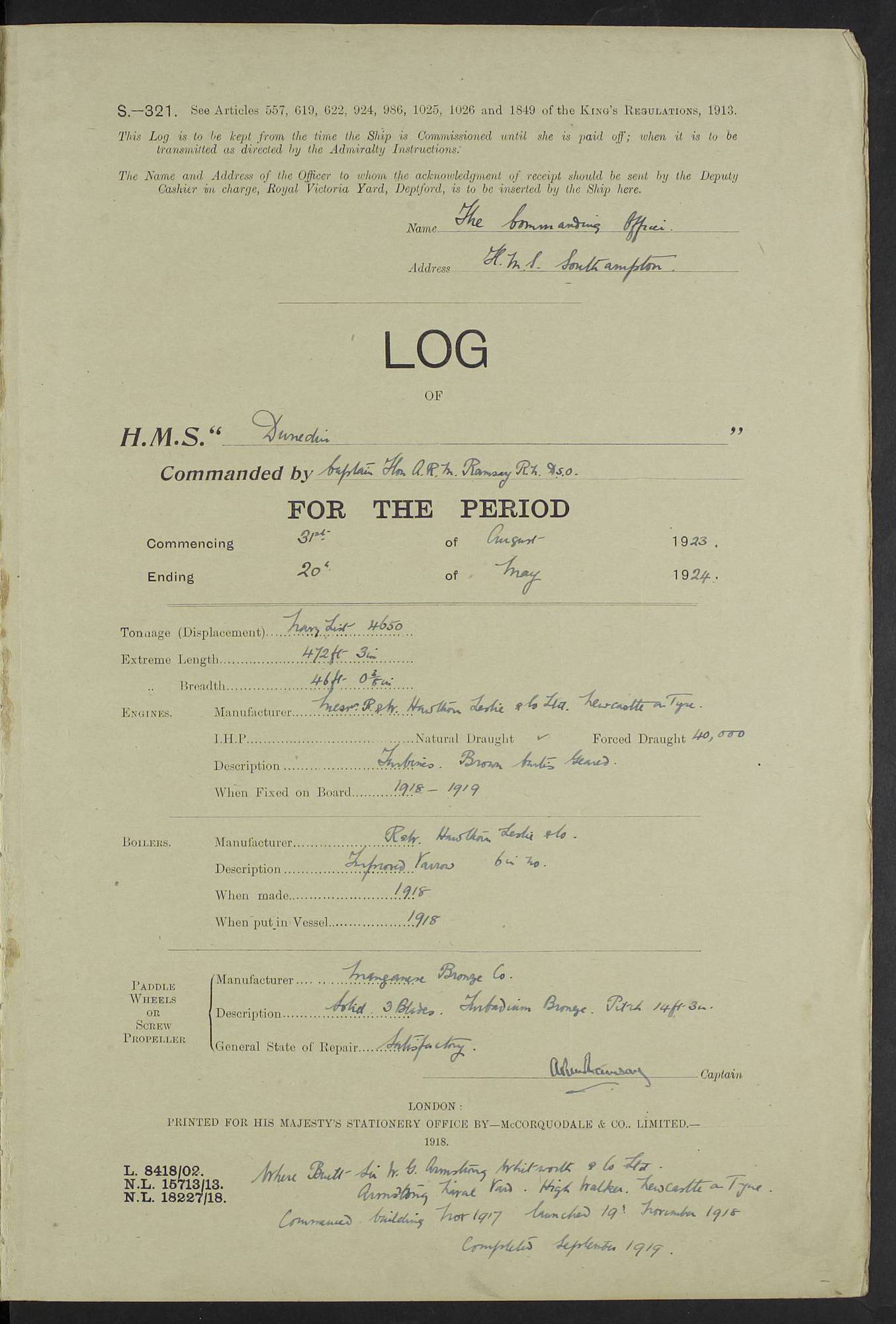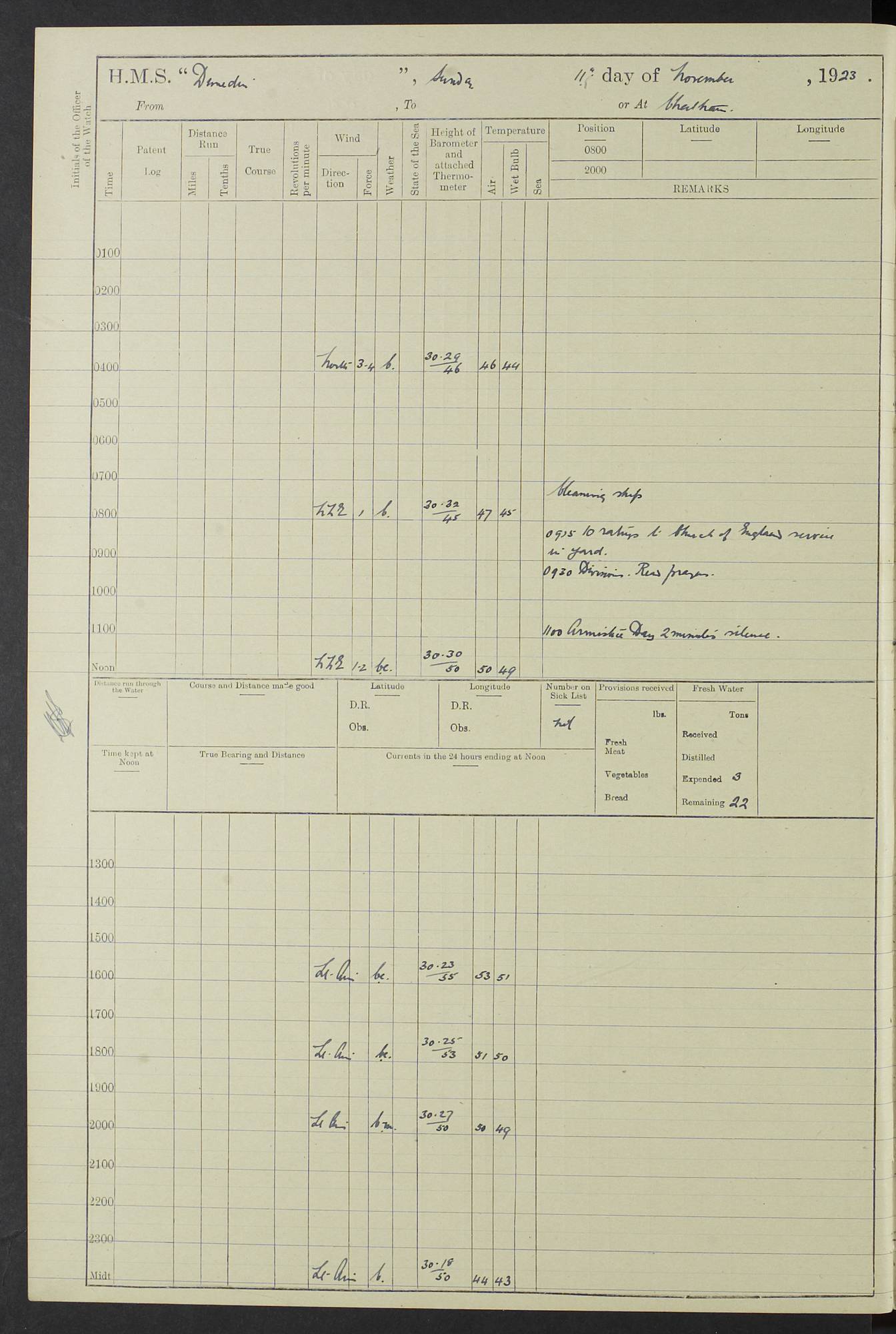 (Maps prepared using Journey Plotter, developed by Maikel. The Plots can only be approximate. They are made by joining-up positions on successive days, and sometimes positions are not given. There will therefore be occasions when the ship appears to have travelled overland) LOG BOOK – 23RD SEPTEMBER 1920 TO 13TH SEPTEMBER 1921 4caf8d9dcadfd3419703bde2: (http://oldweather.s3.amazonaws.com/ADM53-76345/ADM53-76345_0.jpg) Left front cover of Ship’s Log. 4caf8d9dcadfd3419703bde3: (http://oldweather.s3.amazonaws.com/ADM53-76345/ADM53-76345_1.jpg) Right front cover of Ship’s Log. 4caf8d97cadfd3419703bc6a: (http://oldweather.s3.amazonaws.com/ADM53-76345/ADM53-76345-002_0.jpg) 4caf8d97cadfd3419703bc6b: (http://oldweather.s3.amazonaws.com/ADM53-76345/ADM53-76345-002_1.jpg) 4caf8d97cadfd3419703bc6c: (http://oldweather.s3.amazonaws.com/ADM53-76345/ADM53-76345-003_0.jpg) 4caf8d97cadfd3419703bc6d: (http://oldweather.s3.amazonaws.com/ADM53-76345/ADM53-76345-003_1.jpg) 4caf8d97cadfd3419703bc6e: (http://oldweather.s3.amazonaws.com/ADM53-76345/ADM53-76345-004_0.jpg) Blank pages. 4caf8d97cadfd3419703bc6f: (http://oldweather.s3.amazonaws.com/ADM53-76345/ADM53-76345-004_1.jpg) S.- 321. See Articles 557, 619, 622, 924, 1025, 1026 and 1849 of the King’s Regulations, 1913. This Log is to be kept from the time the Ship is Commissioned until she is paid off; when it is to be transmitted as directed by the Admiralty Instructions. The Name and Address of the Officer to whom the acknowledgement of receipt should be sent by the Deputy Cashier in charge, Royal Victoria Yard, Deptford, is to be inserted here. Name: Commander’s Office. Address: H.M.S. Dunedin. c/o G.P.O. London. LOG of H.M.S. “Dunedin” Commanded by Captain C. Wrightson C.B.E. (till 31.3.21). Captain H.S. Monroe D.S.O. (from 31.3.21). FOR THE PERIOD Commencing: Thursday 23rd of September 1920. Ending: Tuesday 13th of September 1921. Tonnage (Displacement): 4,650 Extreme Length: 472ft 3 ins Extreme Breadth: 46 ft 0.3/8” Engines: Manufacturer: Messes R & W Hawthorn Leslie & Co Ltd. Newcastle on Tyne. I.H.P: 40.000 Forced Draught. Description: Turbine (Geared). When Fixed on Board: 1918 – 1919. Boilers: Manufacturer: Messes R & W Hawthorn Leslie & Co Ltd. Newcastle on Tyne. Description: Small tube Improved Yarrow. When made: 1918. When put in vessel: 1918. Paddle Wheels or Screw Propeller: Manufacturer: Manganese Bronze Co. Description: Solid 3 Blades Turbadium Bronze, Pitch 14 ft 3 in. General State of Repair: Satisfactory. R. Alison [?], Lieut Com (W) on paying off 30th August 1923. L. 8418/02. N.L. 15713/13. Where Built Sir W.G. Armstrong Whitworth & Co Ltd. N.L. 18227/18. Armstrong Naval Yard, High Walker, Newcastle on Tyne. Sta. 127/10. Commenced building November 1917, Launched 19 November 1918. N.L. 22782/19. Completed September 1919. 4caf8d98cadfd3419703bc70: (http://oldweather.s3.amazonaws.com/ADM53-76345/ADM53-76345-005_0.jpg) Directions (See King’s Regulations 1913, Articles 1025 and 1849). 1. King’s Regulations. 2. Figures to indicate the Force of the Wind. 3. Letters to denote the State of the Weather. 4. Scale of Fog Intensity. 5. Sea Disturbance Scale 4caf8d98cadfd3419703bc71: (http://oldweather.s3.amazonaws.com/ADM53-76345/ADM53-76345-005_1.jpg) Establishment of Ship’s Company Officers 23 Seamen 187 Boys 36 Marines 46 Engine-room Establishment 105 Other non-executive ratings 44 Total 441 ARMAMENT Position Forecastle: 6” Calibre XII on C.P. XIV mounting. Superstructure: Four 6” Calibre XII on C.P. XIV mountings. Superstructure: Two 3” QF Calibre High Angle mountings, Quarterdeck: 6” Calibre XII on C.P. XIV mountings. Torpedo Armaments Four above water 21” triple tubes. BAROMETER Mercurial or Aneroid: Mercurial. Name of Maker and number: J. Hitchins 101 A747. Height of cistern above sea: 13ft. Error of Mercurial Barometer: Nil at 30.00. Thermometers for Air Temperature. Position on Ship: On fore bridge. Whether in screen: Yes. Maker and No. Negretti & Zambra From: 7.10.19 To: Sept. 1921. Negretti & Zambra No. 10499 Negretti & Zambra No 10391 From: 7.10.19 To: Sept. 1921. Thermometer for Sea Temperature. A. Harper & Sons 7.10.19 POSITION OF STANDARD COMPASS. Manoeuvring Platform. (Fore bridge) BOATS Number of each carried: 1 x 30ft. motor boat. 2 x 32ft. cutters. 1 x 30ft gig. 2 x 27ft whalers. 2 x 16 ft dinghies. MISCELLANEOUS INFORMATION Draught of water with Bunkers full, and complete with provisions, Stores and water: Forward 16 ft 1 inch; Aft 16 ft 11 inches. Number of Tons necessary to increase draught 1 inch: 35.6. Number of Tons of Coal Carried: 16. Number of Tons of Oil Fuel carried: 1127. Quantity of Water Carried (a) For Boilers: 157 tons. (b) For Drinking: 56½ tons. LOGS FOR SEPTEMBER 1920 4caf8d98cadfd3419703bc72: (http://oldweather.s3.amazonaws.com/ADM53-76345/ADM53-76345-006_0.jpg) 23 September 1920 At Copenhagen. Lat 55.694, Long 12.603 4.00am: Signal books correct. am: Hands employed cleaning ship. 8.00am: Signal books correct. am: Sent coaling party to S.S. “Volo”. am: X & Y 6” guns crews at loader drill, remainder of hands employed as requisite. am: Coaling party returned. Noon: Signal books correct. 1.15pm: Sent coaling party to S.S. “Volo”. pm: 1 Rating joined ship from hospital. pm: Boys & training classes under instruction, remainder of hands employed as requisite. 3.00pm: U.S.S. “Gilmer” arrived. [Gilmer, U.S. Destroyer, Flush Decker, launched 18/7/19, Guns: 4 x 5”, 51 cal.,1 x 3”, 23 cal. AA, 12 x 21” TT’s in 4 triple deck mountings. Disp: 1,215 tons, SHP: 26,000 = 35 knots. Jane’s Fighting Ships 1919. Image]. 4.00pm: Signal books correct. pm: Coaling party returned. 8.00pm: Signal books correct. Midnight: Signal books correct. 4caf8d98cadfd3419703bc73: (http://oldweather.s3.amazonaws.com/ADM53-76345/ADM53-76345-006_1.jpg) 24 September 1920 At Copenhagen. Lat 55.694, Long 12.603 4.00am: Signal books correct. am: Hands employed cleaning ship. 6.15am: U.S.S. “Sh