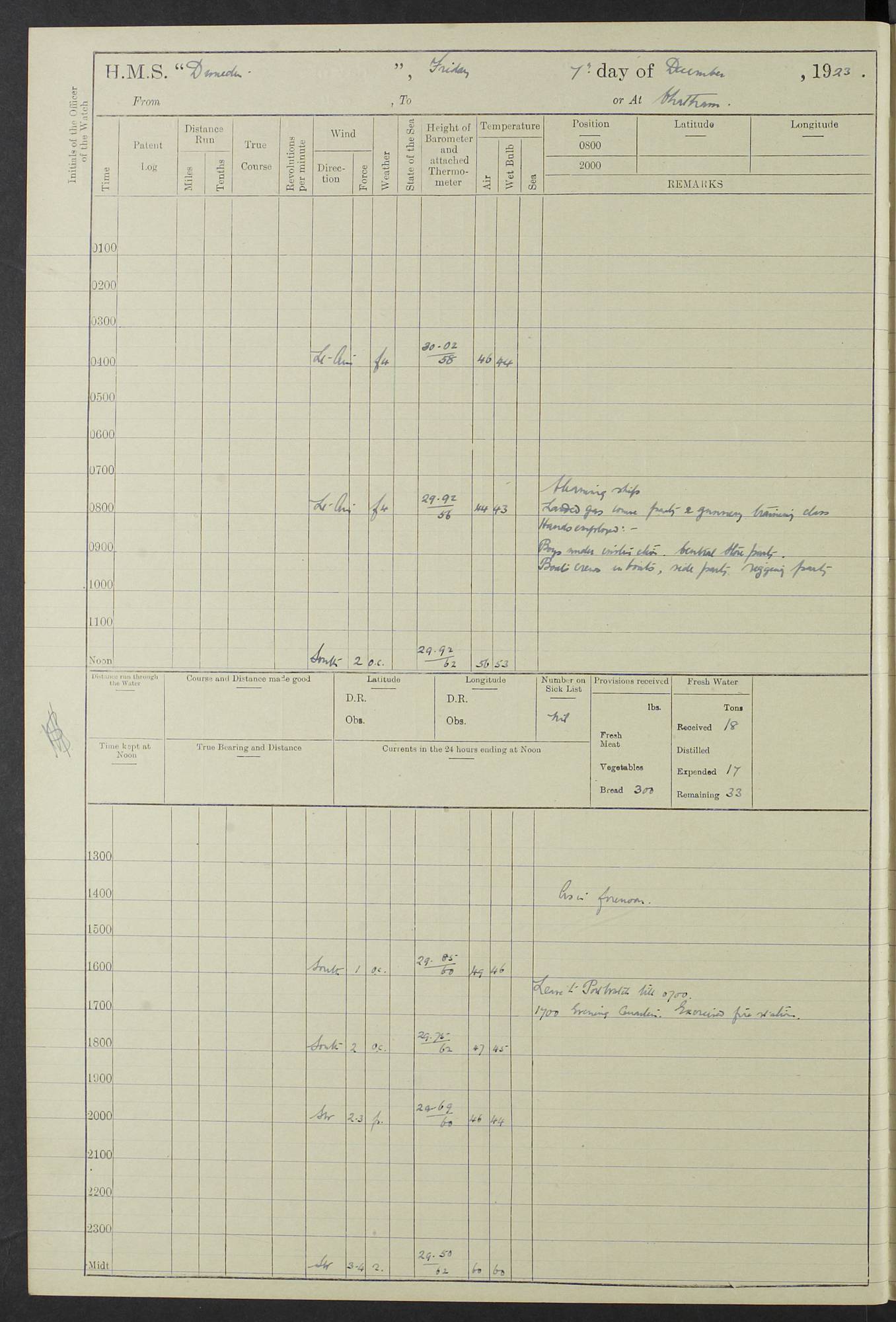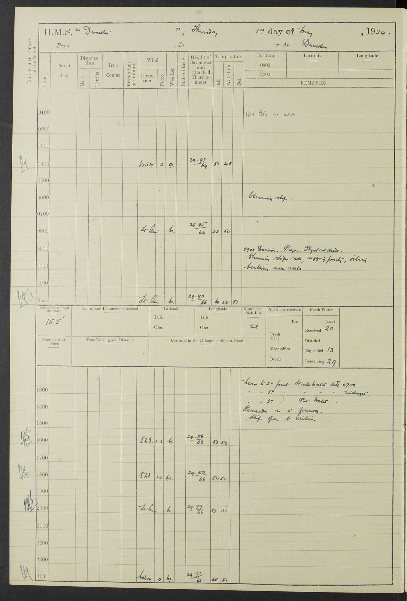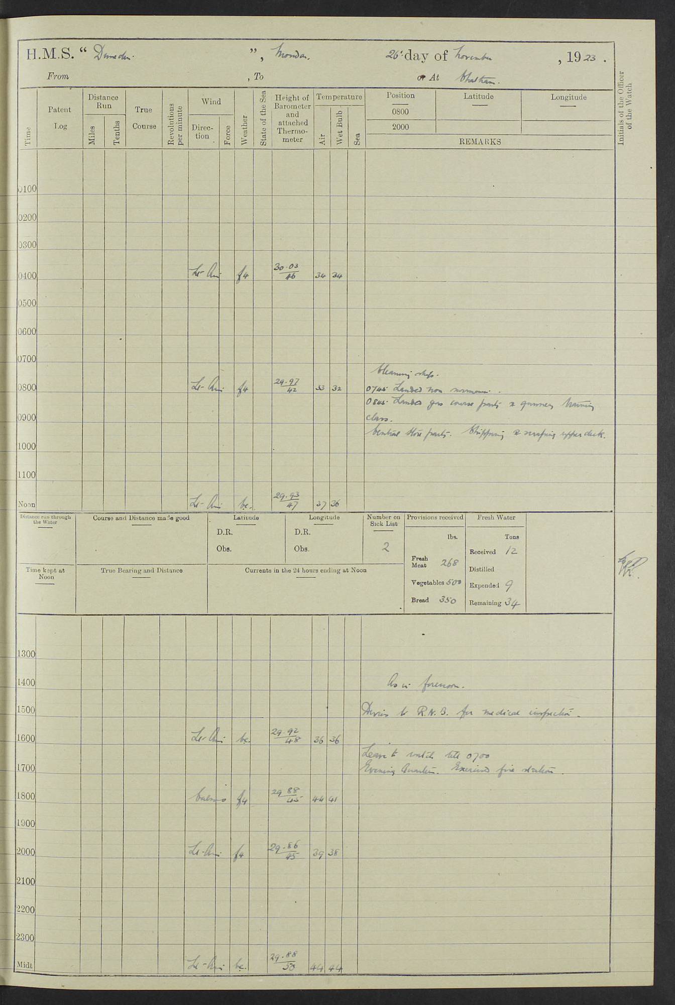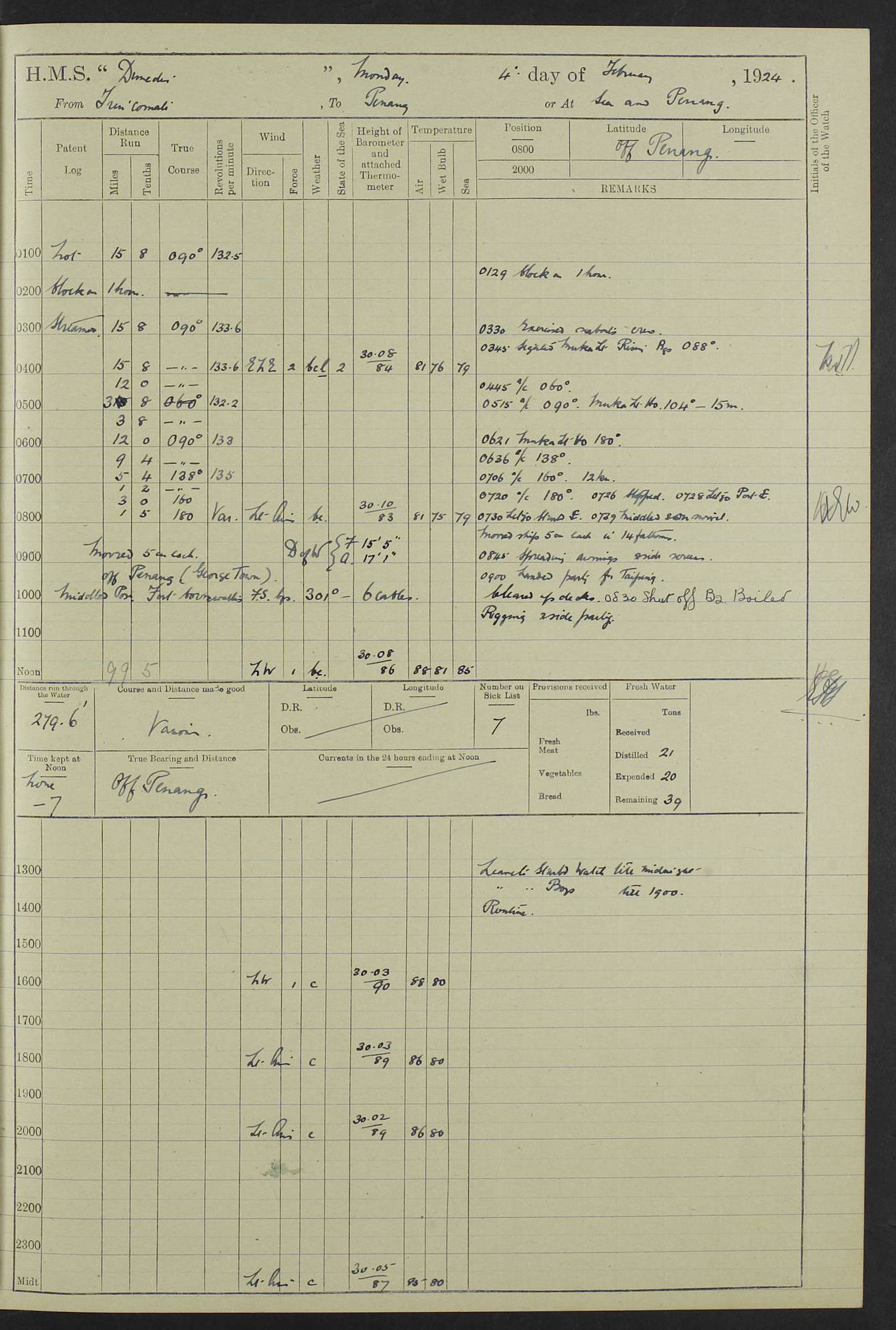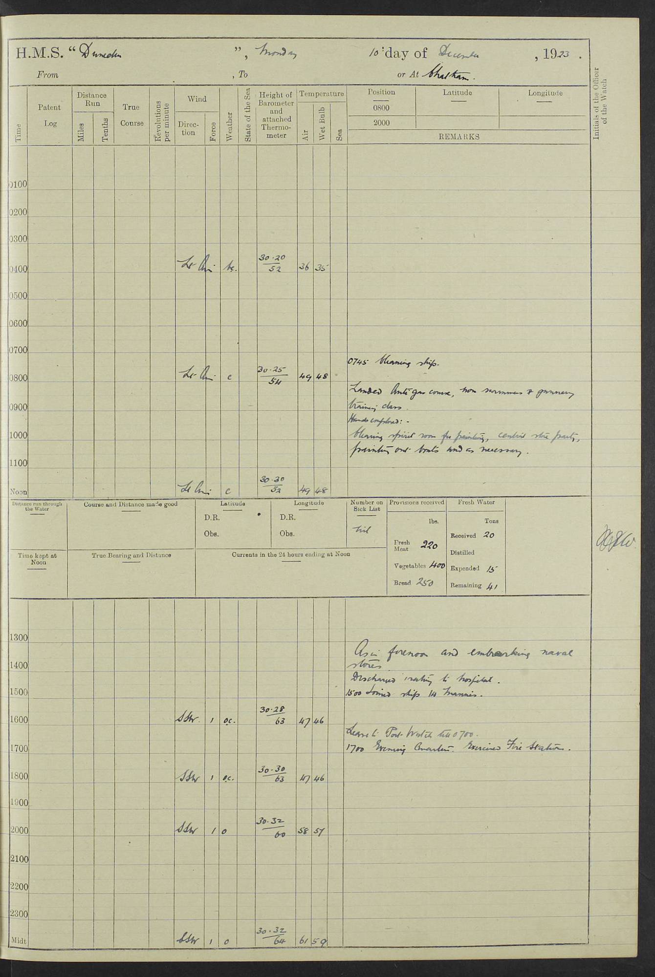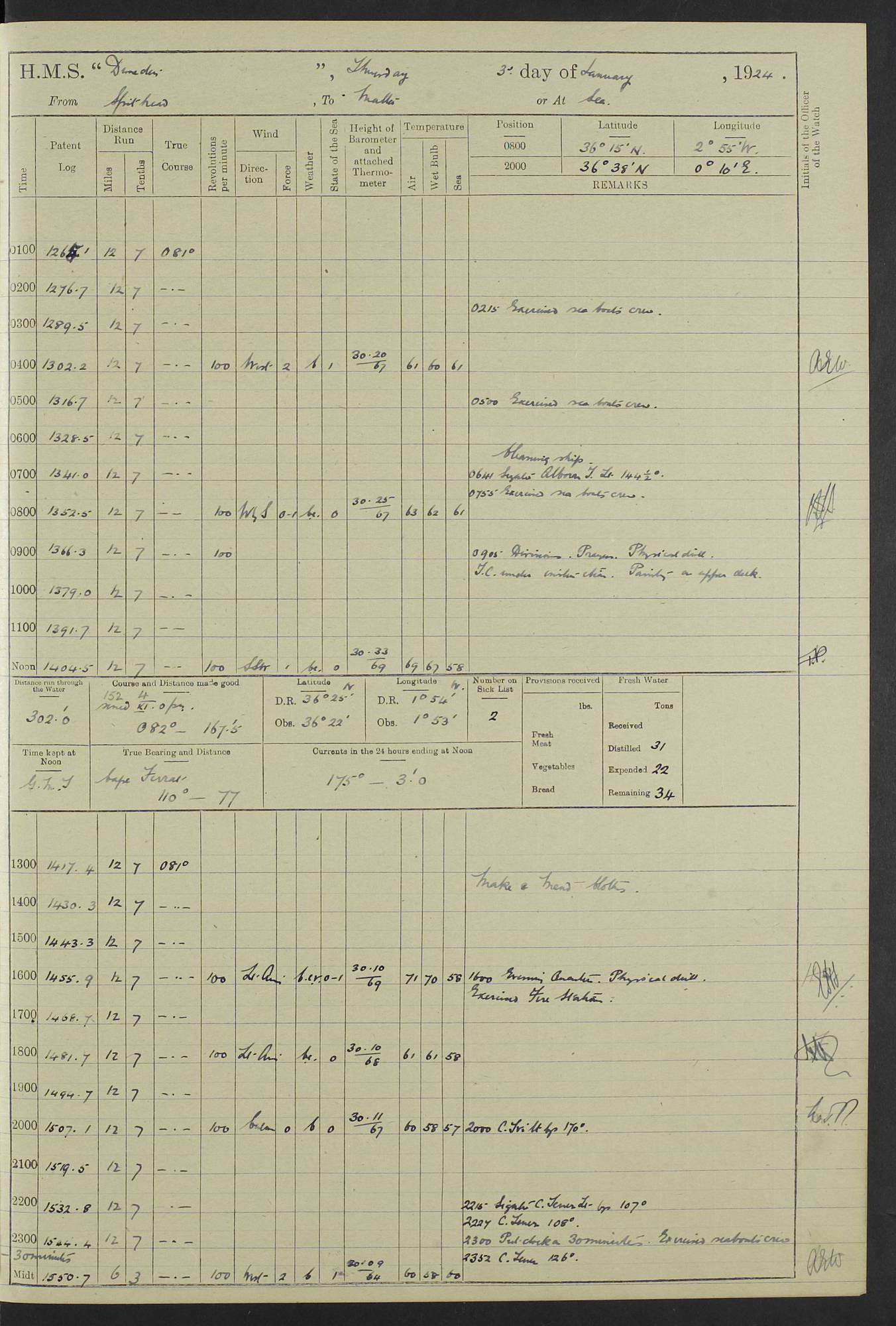 (Maps prepared using Journey Plotter, developed by Maikel. The Plots can only be approximate. They are made by joining-up positions on successive days, and sometimes positions are not given. There will therefore be occasions when the ship appears to have travelled overland) LOG BOOK – 23RD SEPTEMBER 1920 TO 13TH SEPTEMBER 1921 4caf8d9dcadfd3419703bde2: (http://oldweather.s3.amazonaws.com/ADM53-76345/ADM53-76345_0.jpg) Left front cover of Ship’s Log. 4caf8d9dcadfd3419703bde3: (http://oldweather.s3.amazonaws.com/ADM53-76345/ADM53-76345_1.jpg) Right front cover of Ship’s Log. 4caf8d97cadfd3419703bc6a: (http://oldweather.s3.amazonaws.com/ADM53-76345/ADM53-76345-002_0.jpg) 4caf8d97cadfd3419703bc6b: (http://oldweather.s3.amazonaws.com/ADM53-76345/ADM53-76345-002_1.jpg) 4caf8d97cadfd3419703bc6c: (http://oldweather.s3.amazonaws.com/ADM53-76345/ADM53-76345-003_0.jpg) 4caf8d97cadfd3419703bc6d: (http://oldweather.s3.amazonaws.com/ADM53-76345/ADM53-76345-003_1.jpg) 4caf8d97cadfd3419703bc6e: (http://oldweather.s3.amazonaws.com/ADM53-76345/ADM53-76345-004_0.jpg) Blank pages. 4caf8d97cadfd3419703bc6f: (http://oldweather.s3.amazonaws.com/ADM53-76345/ADM53-76345-004_1.jpg) S.- 321. See Articles 557, 619, 622, 924, 1025, 1026 and 1849 of the King’s Regulations, 1913. This Log is to be kept from the time the Ship is Commissioned until she is paid off; when it is to be transmitted as directed by the Admiralty Instructions. The Name and Address of the Officer to whom the acknowledgement of receipt should be sent by the Deputy Cashier in charge, Royal Victoria Yard, Deptford, is to be inserted here. Name: Commander’s Office. Address: H.M.S. Dunedin. c/o G.P.O. London. LOG of H.M.S. “Dunedin” Commanded by Captain C. Wrightson C.B.E. (till 31.3.21). Captain H.S. Monroe D.S.O. (from 31.3.21). FOR THE PERIOD Commencing: Thursday 23rd of September 1920. Ending: Tuesday 13th of September 1921. Tonnage (Displacement): 4,650 Extreme Length: 472ft 3 ins Extreme Breadth: 46 ft 0.3/8” Engines: Manufacturer: Messes R & W Hawthorn Leslie & Co Ltd. Newcastle on Tyne. I.H.P: 40.000 Forced Draught. Description: Turbine (Geared). When Fixed on Board: 1918 – 1919. Boilers: Manufacturer: Messes R & W Hawthorn Leslie & Co Ltd. Newcastle on Tyne. Description: Small tube Improved Yarrow. When made: 1918. When put in vessel: 1918. Paddle Wheels or Screw Propeller: Manufacturer: Manganese Bronze Co. Description: Solid 3 Blades Turbadium Bronze, Pitch 14 ft 3 in. General State of Repair: Satisfactory. R. Alison [?], Lieut Com (W) on paying off 30th August 1923. L. 8418/02. N.L. 15713/13. Where Built Sir W.G. Armstrong Whitworth & Co Ltd. N.L. 18227/18. Armstrong Naval Yard, High Walker, Newcastle on Tyne. Sta. 127/10. Commenced building November 1917, Launched 19 November 1918. N.L. 22782/19. Completed September 1919. 4caf8d98cadfd3419703bc70: (http://oldweather.s3.amazonaws.com/ADM53-76345/ADM53-76345-005_0.jpg) Directions (See King’s Regulations 1913, Articles 1025 and 1849). 1. King’s Regulations. 2. Figures to indicate the Force of the Wind. 3. Letters to denote the State of the Weather. 4. Scale of Fog Intensity. 5. Sea Disturbance Scale 4caf8d98cadfd3419703bc71: (http://oldweather.s3.amazonaws.com/ADM53-76345/ADM53-76345-005_1.jpg) Establishment of Ship’s Company Officers 23 Seamen 187 Boys 36 Marines 46 Engine-room Establishment 105 Other non-executive ratings 44 Total 441 ARMAMENT Position Forecastle: 6” Calibre XII on C.P. XIV mounting. Superstructure: Four 6” Calibre XII on C.P. XIV mountings. Superstructure: Two 3” QF Calibre High Angle mountings, Quarterdeck: 6” Calibre XII on C.P. XIV mountings. Torpedo Armaments Four above water 21” triple tubes. BAROMETER Mercurial or Aneroid: Mercurial. Name of Maker and number: J. Hitchins 101 A747. Height of cistern above sea: 13ft. Error of Mercurial Barometer: Nil at 30.00. Thermometers for Air Temperature. Position on Ship: On fore bridge. Whether in screen: Yes. Maker and No. Negretti & Zambra From: 7.10.19 To: Sept. 1921. Negretti & Zambra No. 10499 Negretti & Zambra No 10391 From: 7.10.19 To: Sept. 1921. Thermometer for Sea Temperature. A. Harper & Sons 7.10.19 POSITION OF STANDARD COMPASS. Manoeuvring Platform. (Fore bridge) BOATS Number of each carried: 1 x 30ft. motor boat. 2 x 32ft. cutters. 1 x 30ft gig. 2 x 27ft whalers. 2 x 16 ft dinghies. MISCELLANEOUS INFORMATION Draught of water with Bunkers full, and complete with provisions, Stores and water: Forward 16 ft 1 inch; Aft 16 ft 11 inches. Number of Tons necessary to increase draught 1 inch: 35.6. Number of Tons of Coal Carried: 16. Number of Tons of Oil Fuel carried: 1127. Quantity of Water Carried (a) For Boilers: 157 tons. (b) For Drinking: 56½ tons. LOGS FOR SEPTEMBER 1920 4caf8d98cadfd3419703bc72: (http://oldweather.s3.amazonaws.com/ADM53-76345/ADM53-76345-006_0.jpg) 23 September 1920 At Copenhagen. Lat 55.694, Long 12.603 4.00am: Signal books correct. am: Hands employed cleaning ship. 8.00am: Signal books correct. am: Sent coaling party to S.S. “Volo”. am: X & Y 6” guns crews at loader drill, remainder of hands employed as requisite. am: Coaling party returned. Noon: Signal books correct. 1.15pm: Sent coaling party to S.S. “Volo”. pm: 1 Rating joined ship from hospital. pm: Boys & training classes under instruction, remainder of hands employed as requisite. 3.00pm: U.S.S. “Gilmer” arrived. [Gilmer, U.S. Destroyer, Flush Decker, launched 18/7/19, Guns: 4 x 5”, 51 cal.,1 x 3”, 23 cal. AA, 12 x 21” TT’s in 4 triple deck mountings. Disp: 1,215 tons, SHP: 26,000 = 35 knots. Jane’s Fighting Ships 1919. Image]. 4.00pm: Signal books correct. pm: Coaling party returned. 8.00pm: Signal books correct. Midnight: Signal books correct. 4caf8d98cadfd3419703bc73: (http://oldweather.s3.amazonaws.com/ADM53-76345/ADM53-76345-006_1.jpg) 24 September 1920 At Copenhagen. Lat 55.694, Long 12.603 4.00am: Signal books correct. am: Hands employed cleaning ship. 6.15am: U.S.S. “Sh